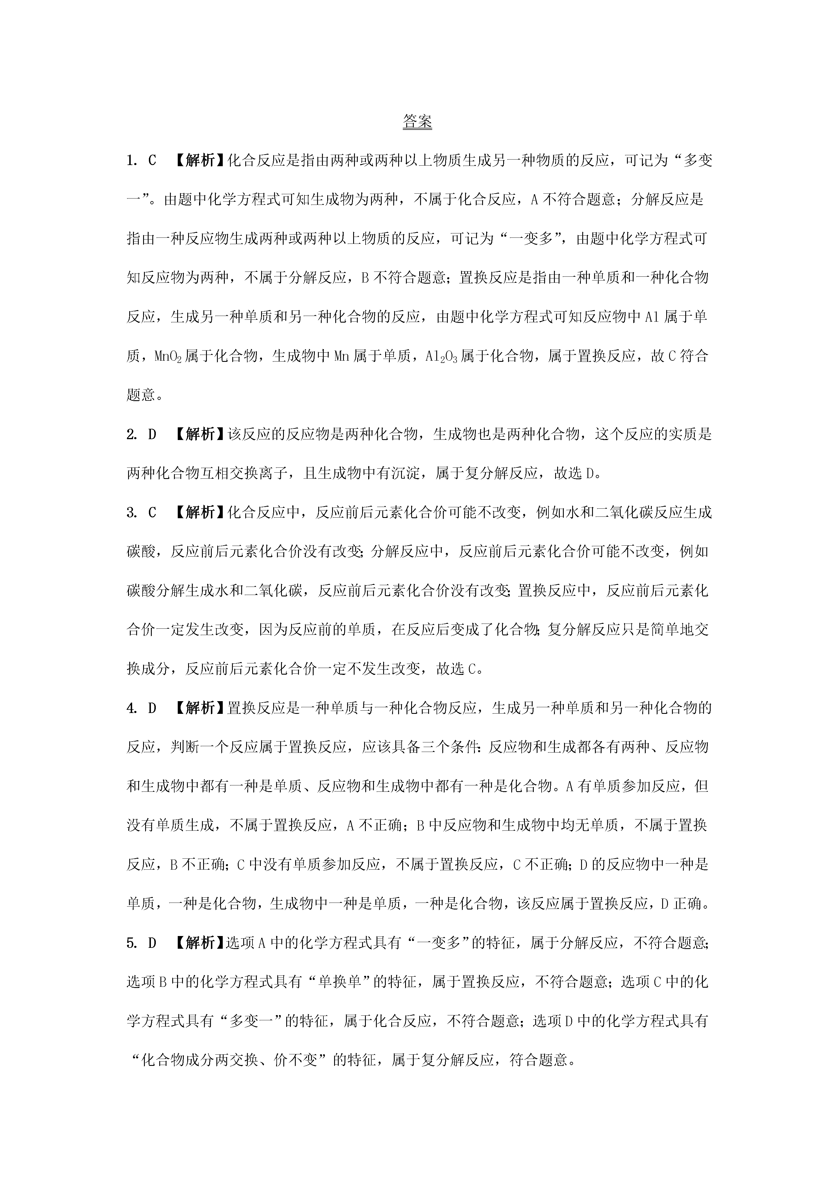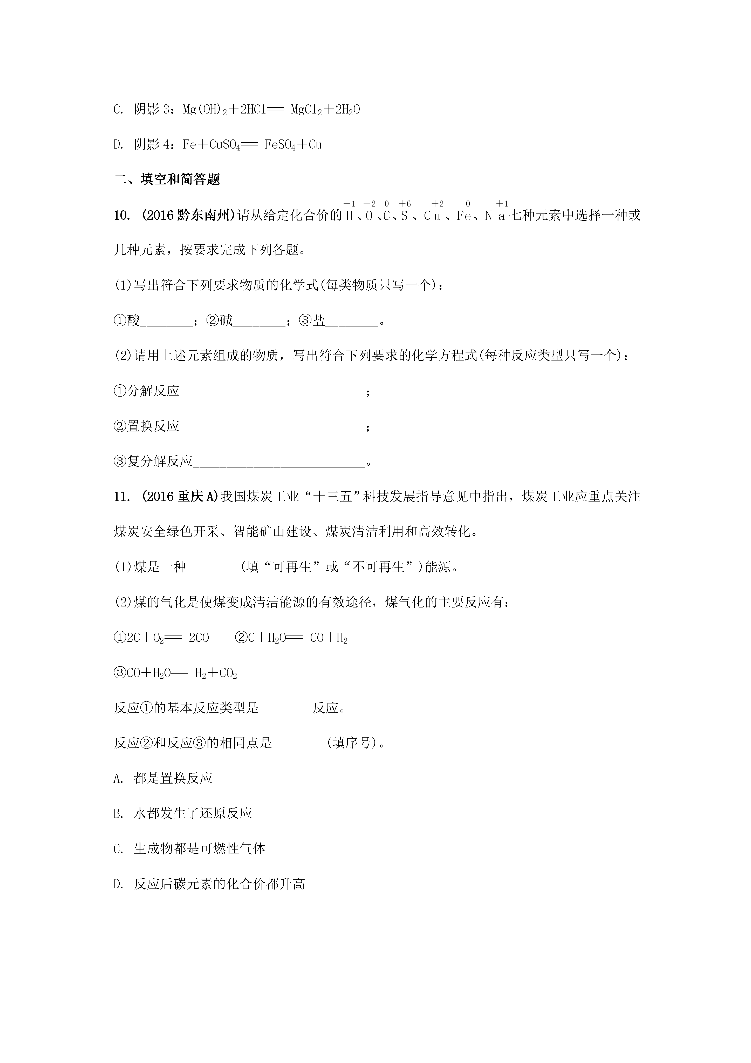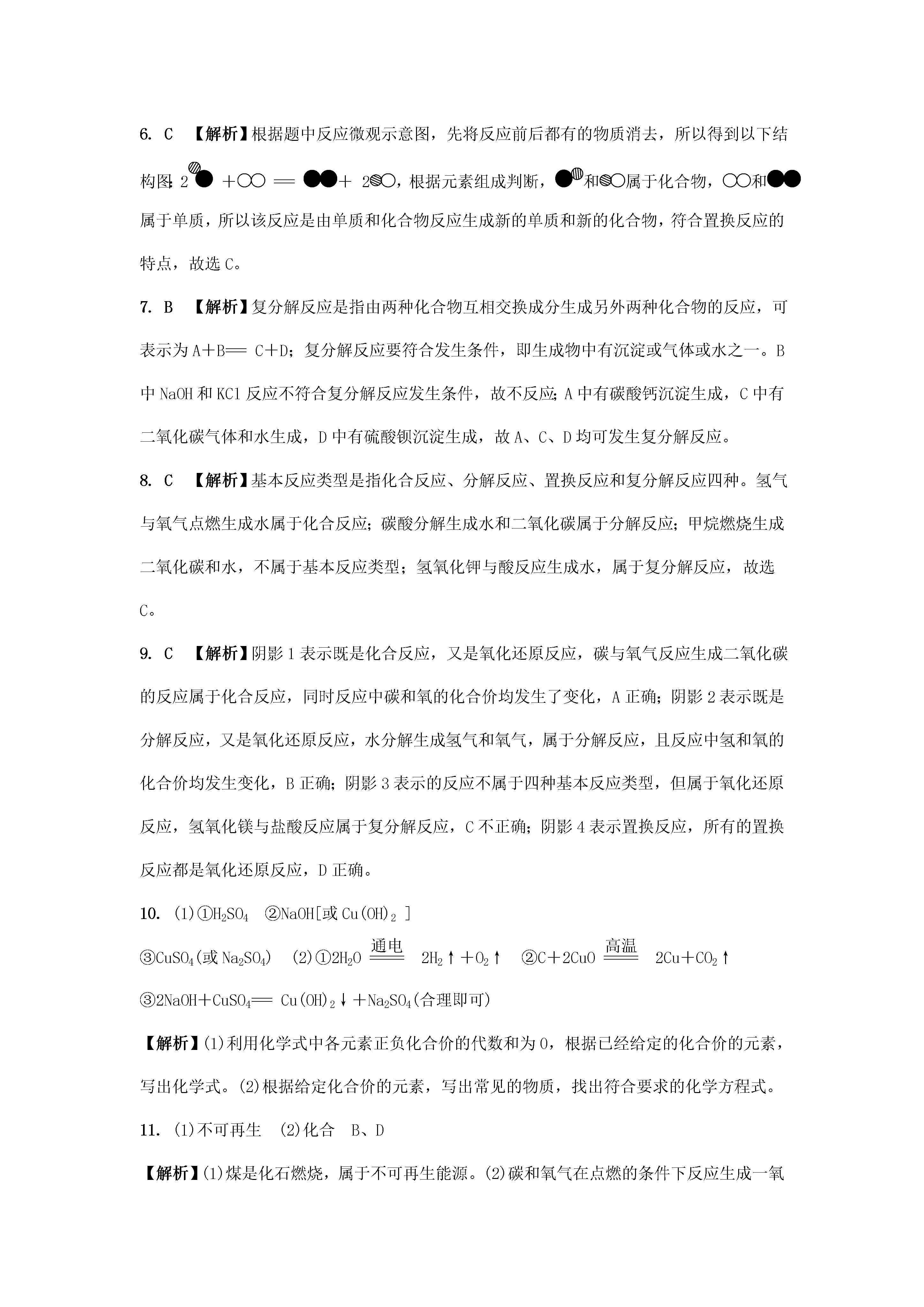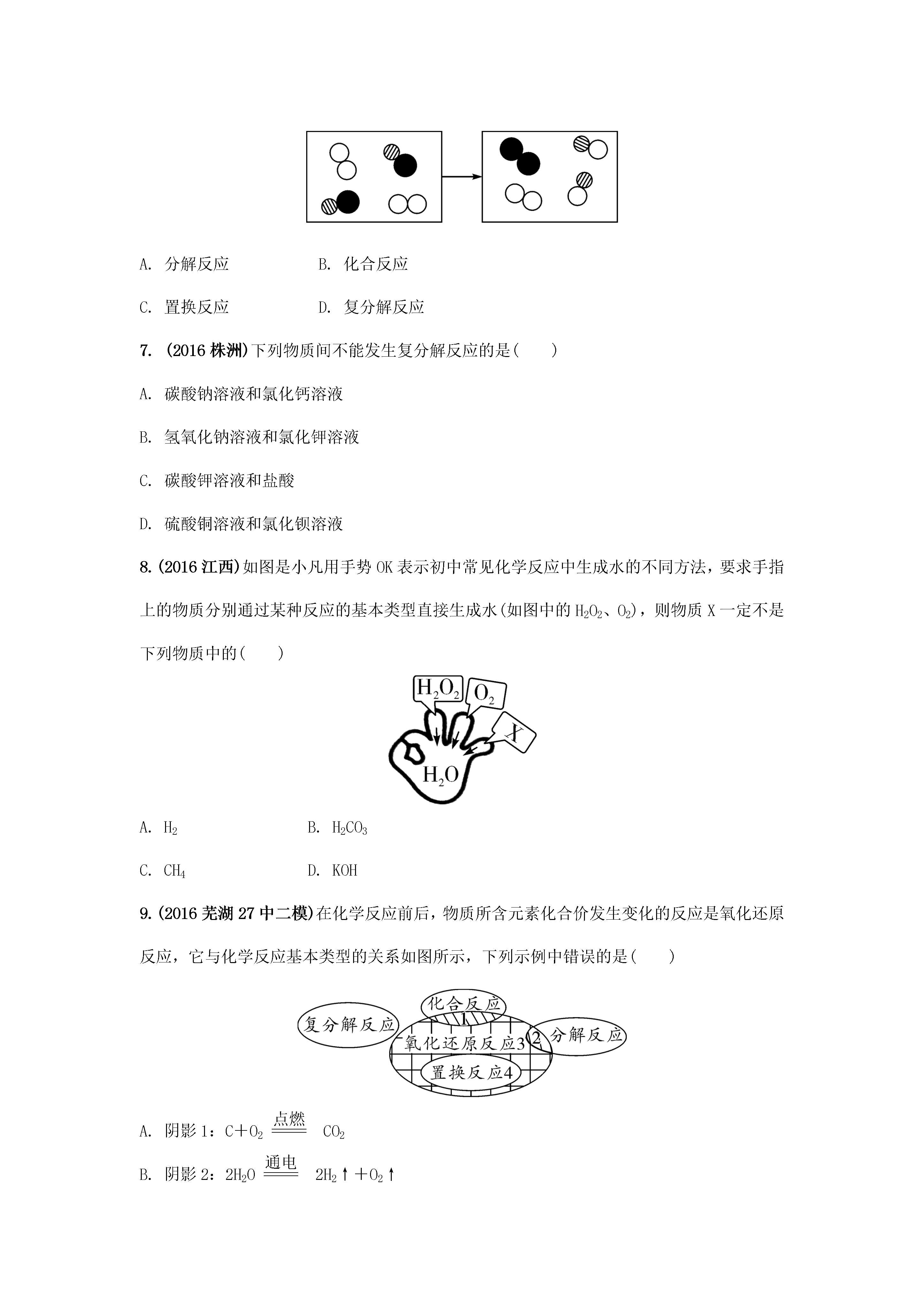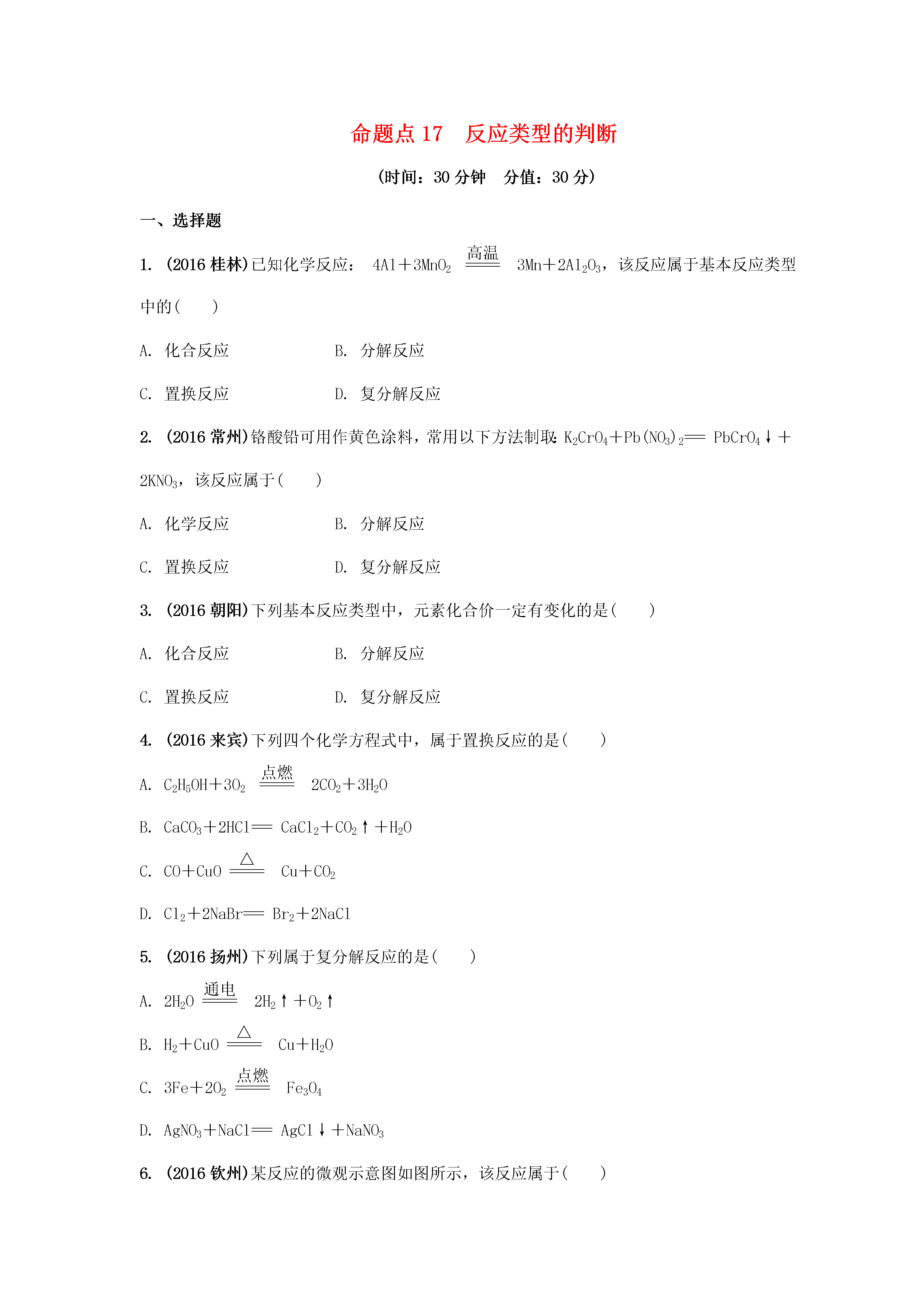 命题点17反应类型的判断(时间:30分钟分值:30分)一、选择题1.(2016桂林)已知化学反应:4Al+3MnO2eq\o(=====,\s\up7(高温))3Mn+2Al2O3,该反应属于基本反应类型中的()A.化合反应B.分解反应C.置换反应D.复分解反应2.(2016常州)铬酸铅可用作黄色涂料,常用以下方法制取:K2CrO4+Pb(NO3)2===PbCrO4↓+2KNO3,该反应属于()A.化学反应B.分解反应C.置换反应D.复分解反应3.(2016朝阳)下列基本反应类型中,元素化合价一定有变化的是()A.化合反应B.分解反应C.置换反应D.复分解反应4.(2016来宾)下列四个化学方程式中,属于置换反应的是()A.C2H5OH+3O2eq\o(=====,\s\up7(点燃))2CO2+3H2OB.CaCO3+2HCl===CaCl2+CO2↑+H2OC.CO+CuOeq\o(=====,\s\up7(△))Cu+CO2D.Cl2+2NaBr===Br2+2NaCl5.(2016扬州)下列属于复分解反应的是()A.2H2Oeq\o(=====,\s\up7(通电))2H2↑+O2↑B.H2+CuOeq\o(=====,\s\up7(△))Cu+H2OC.3Fe+2O2eq\o(=====,\s\up7(点燃))Fe3O4D.AgNO3+NaCl===AgCl↓+NaNO36.(2016钦州)某反应的微观示意图如图所示,该反应属于()A.分解反应B.化合反应C.置换反应D.复分解反应7.(2016株洲)下列物质间不能发生复分解反应的是()A.碳酸钠溶液和氯化钙溶液B.氢氧化钠溶液和氯化钾溶液C.碳酸钾溶液和盐酸D.硫酸铜溶液和氯化钡溶液8.(2016江西)如图是小凡用手势OK表示初中常见化学反应中生成水的不同方法,要求手指上的物质分别通过某种反应的基本类型直接生成水(如图中的H2O2、O2),则物质X一定不是下列物质中的()A.H2B.H2CO3C.CH4D.KOH9.(2016芜湖27中二模)在化学反应前后,物质所含元素化合价发生变化的反应是氧化还原反应,它与化学反应基本类型的关系如图所示,下列示例中错误的是()A.阴影1:C+O2eq\o(=====,\s\up7(点燃))CO2B.阴影2:2H2Oeq\o(=====,\s\up7(通电))2H2↑+O2↑C.阴影3:Mg(OH)2+2HCl===MgCl2+2H2OD.阴影4:Fe+CuSO4===FeSO4+Cu二、填空和简答题10.(2016黔东南州)请从给定化合价的eq\o(H,\s\up6(+1))、eq\o(O,\s\up6(-2))、eq\o(C,\s\up6(0))、eq\o(S,\s\up6(+6))、Ceq\o(u,\s\up6(+2))、Feq\o(e,\s\up6(0))、Neq\o(a,\s\up6(+1))七种元素中选择一种或几种元素,按要求完成下列各题。(1)写出符合下列要求物质的化学式(每类物质只写一个):①酸________;②碱________;③盐________。(2)请用上述元素组成的物质,写出符合下列要求的化学方程式(每种反应类型只写一个):①分解反应____________________________;②置换反应____________________________;③复分解反应__________________________。11.(2016重庆A)我国煤炭工业“十三五”科技发展指导意见中指出,煤炭工业应重点关注煤炭安全绿色开采、智能矿山建设、煤炭清洁利用和高效转化。(1)煤是一种________(填“可再生”或“不可再生”)能源。(2)煤的气化是使煤变成清洁能源的有效途径,煤气化的主要反应有:①2C+O2===2CO②C+H2O===CO+H2③CO+H2O===H2+CO2反应①的基本反应类型是________反应。反应②和反应③的相同点是________(填序号)。A.都是置换反应B.水都发生了还原反应C.生成物都是可燃性气体D.反应后碳元素的化合价都升高答案1.C【解析】化合反应是指由两种或两种以上物质生成另一种物质的反应,可记为“多变一”。由题中化学方程式可知生成物为两种,不属于化合反应,A不符合题意;分解反应是指由一种反应物生成两种或两种以上物质的反应,可记为“一变多”,由题中化学方程式可知反应物为两种,不属于分解反应,B不符合题意;置换反应是指由一种单质和一种化合物反应,生成另一种