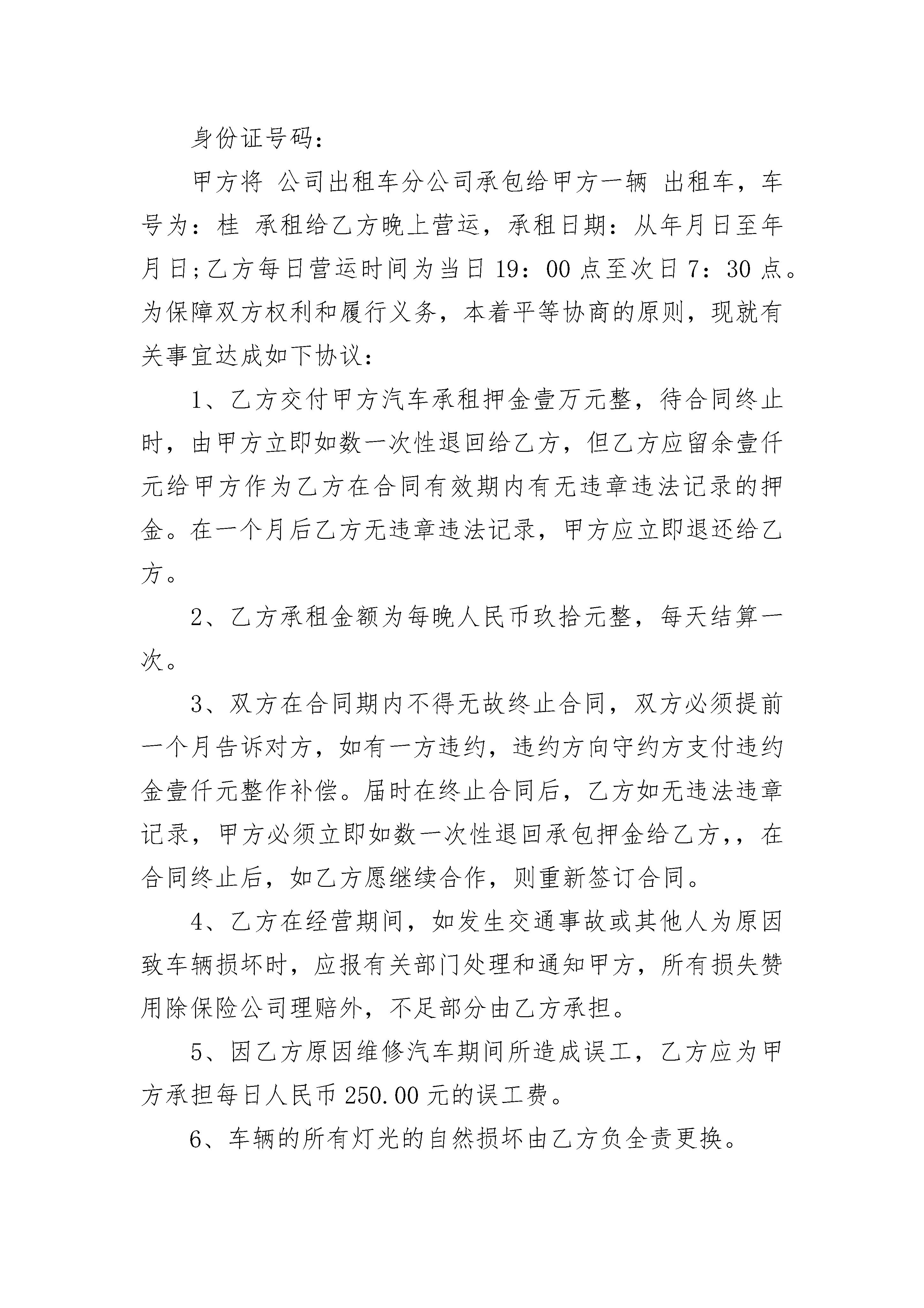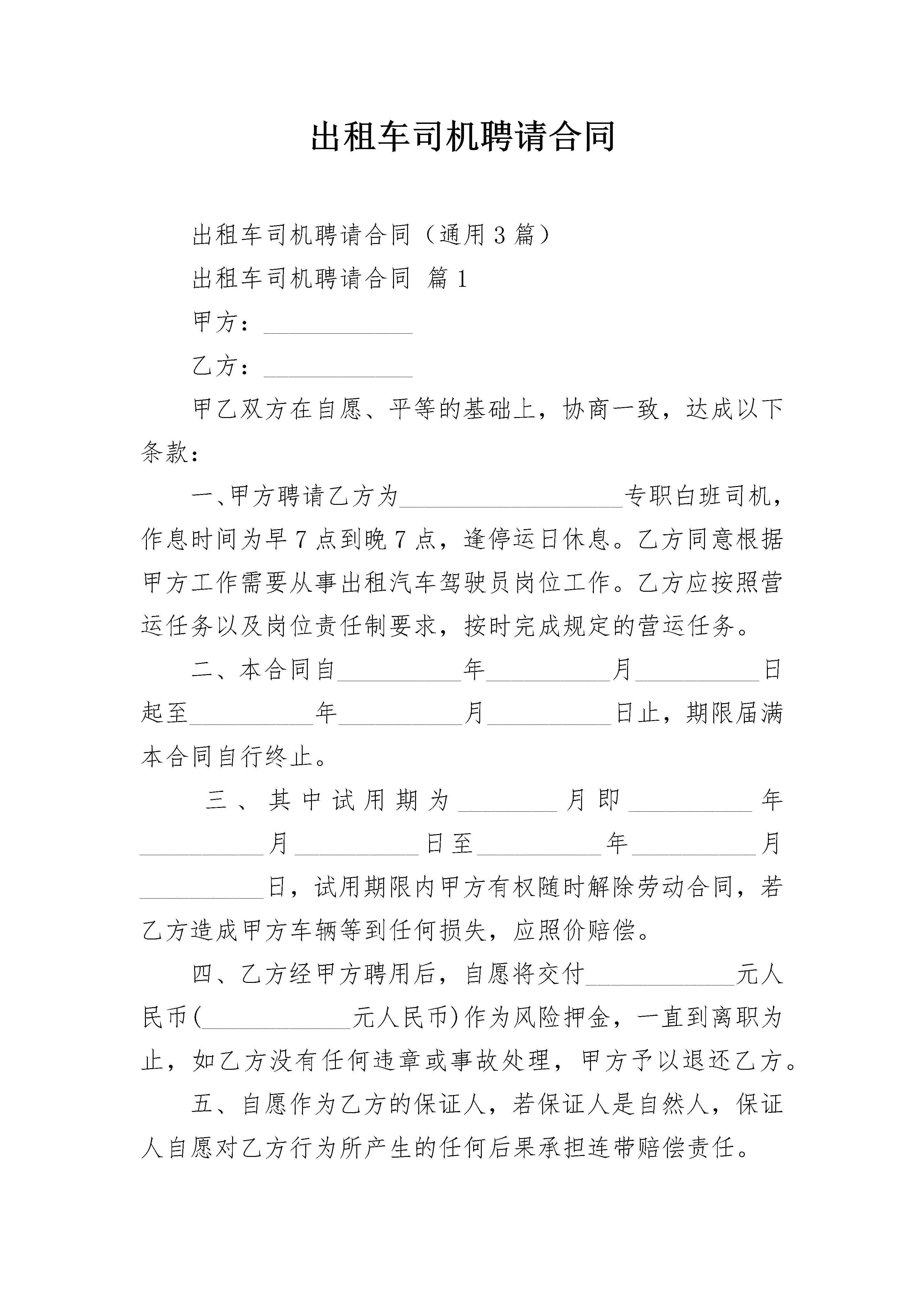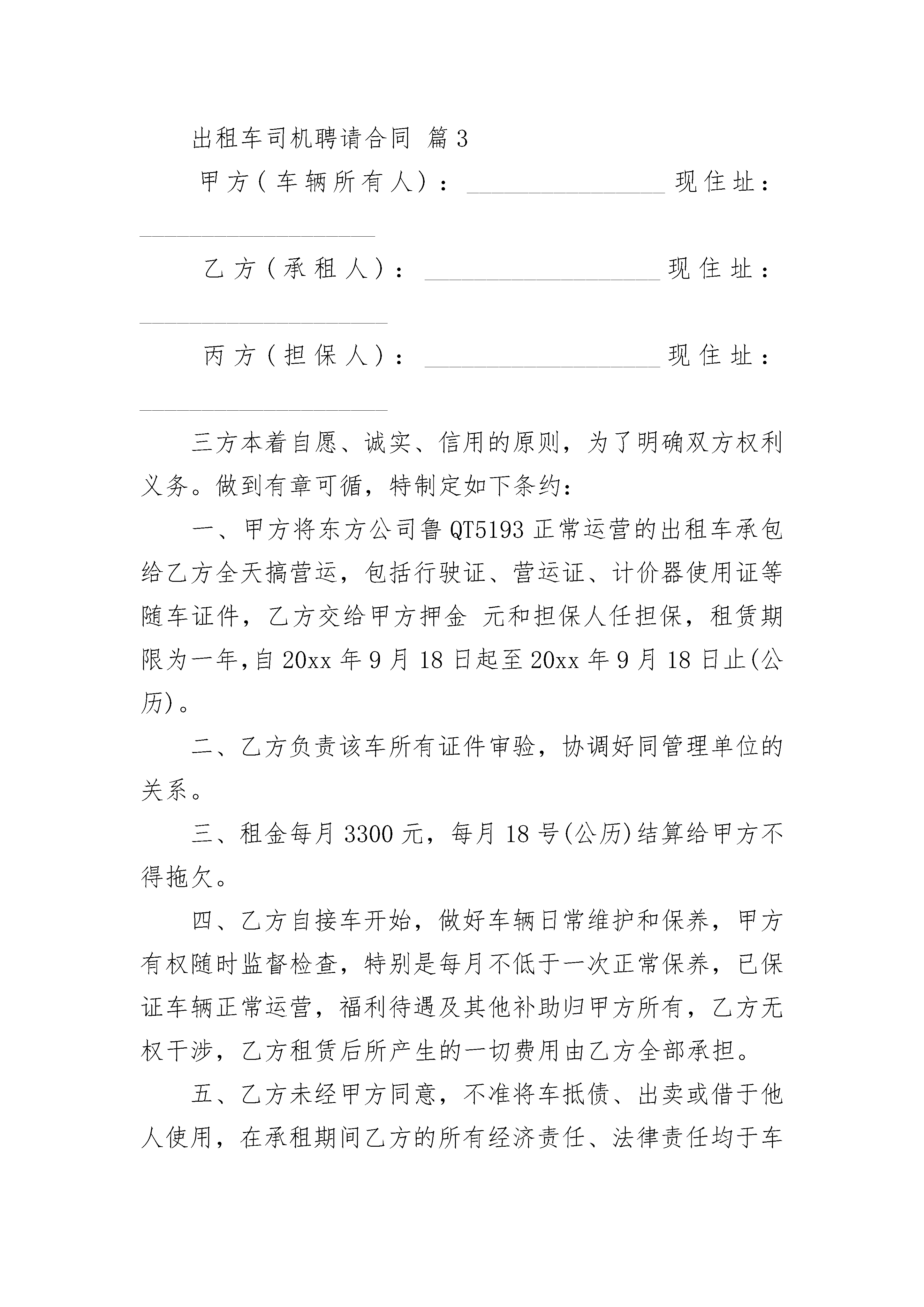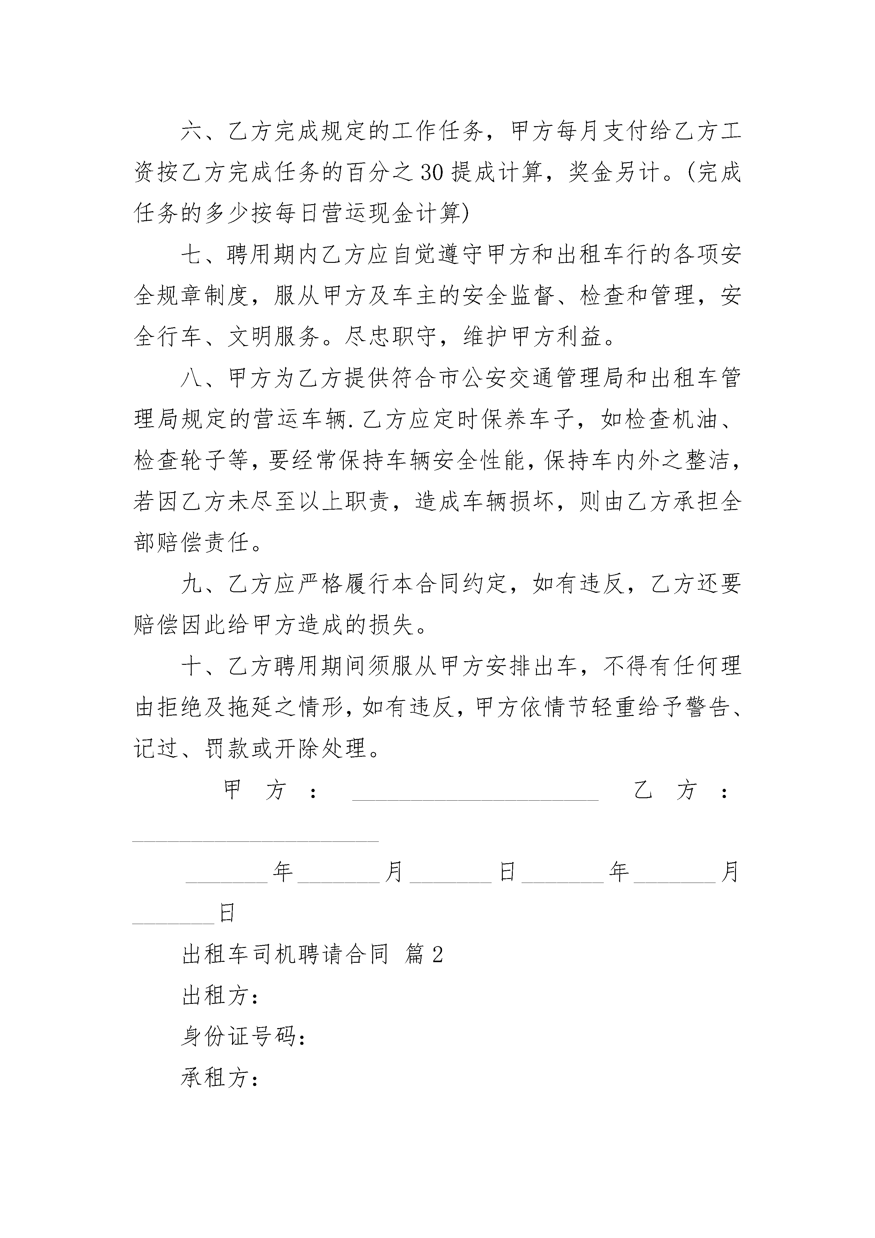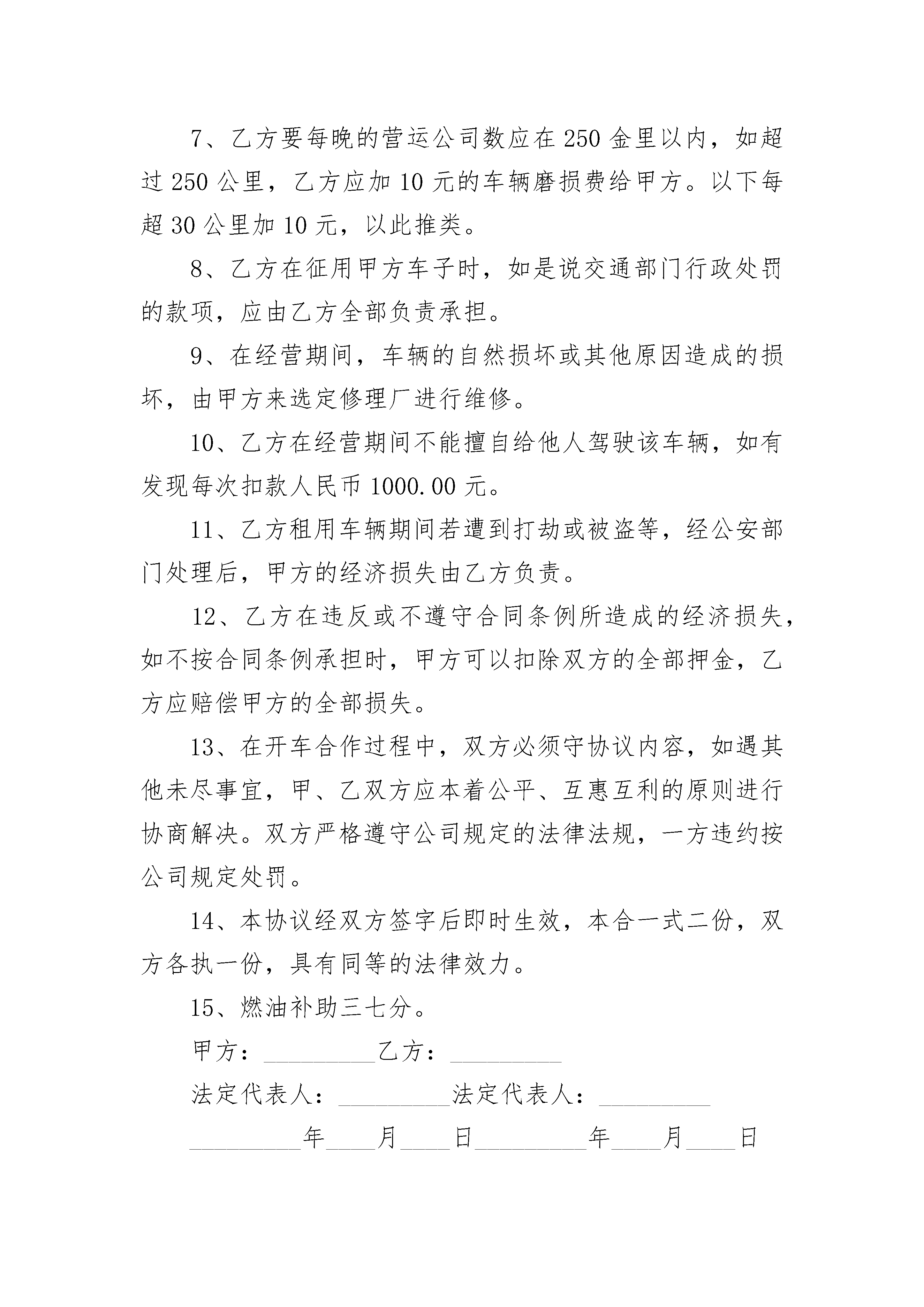 出租车司机聘请合同出租车司机聘请合同(通用3篇)出租车司机聘请合同篇1甲方:____________乙方:____________甲乙双方在自愿、平等的基础上,协商一致,达成以下条款:一、甲方聘请乙方为__________________专职白班司机,作息时间为早7点到晚7点,逢停运日休息。乙方同意根据甲方工作需要从事出租汽车驾驶员岗位工作。乙方应按照营运任务以及岗位责任制要求,按时完成规定的营运任务。二、本合同自__________年__________月__________日起至__________年__________月__________日止,期限届满本合同自行终止。三、其中试用期为________月即__________年__________月__________日至__________年__________月__________日,试用期限内甲方有权随时解除劳动合同,若乙方造成甲方车辆等到任何损失,应照价赔偿。四、乙方经甲方聘用后,自愿将交付____________元人民币(____________元人民币)作为风险押金,一直到离职为止,如乙方没有任何违章或事故处理,甲方予以退还乙方。五、自愿作为乙方的保证人,若保证人是自然人,保证人自愿对乙方行为所产生的任何后果承担连带赔偿责任。六、乙方完成规定的工作任务,甲方每月支付给乙方工资按乙方完成任务的百分之30提成计算,奖金另计。(完成任务的多少按每日营运现金计算)七、聘用期内乙方应自觉遵守甲方和出租车行的各项安全规章制度,服从甲方及车主的安全监督、检查和管理,安全行车、文明服务。尽忠职守,维护甲方利益。八、甲方为乙方提供符合市公安交通管理局和出租车管理局规定的营运车辆.乙方应定时保养车子,如检查机油、检查轮子等,要经常保持车辆安全性能,保持车内外之整洁,若因乙方未尽至以上职责,造成车辆损坏,则由乙方承担全部赔偿责任。九、乙方应严格履行本合同约定,如有违反,乙方还要赔偿因此给甲方造成的损失。十、乙方聘用期间须服从甲方安排出车,不得有任何理由拒绝及拖延之情形,如有违反,甲方依情节轻重给予警告、记过、罚款或开除处理。甲方:_____________________乙方:____________________________年_______月_______日_______年_______月_______日出租车司机聘请合同篇2出租方:身份证号码:承租方:身份证号码:甲方将公司出租车分公司承包给甲方一辆出租车,车号为:桂承租给乙方晚上营运,承租日期:从年月日至年月日;乙方每日营运时间为当日19:00点至次日7:30点。为保障双方权利和履行义务,本着平等协商的原则,现就有关事宜达成如下协议:1、乙方交付甲方汽车承租押金壹万元整,待合同终止时,由甲方立即如数一次性退回给乙方,但乙方应留余壹仟元给甲方作为乙方在合同有效期内有无违章违法记录的押金。在一个月后乙方无违章违法记录,甲方应立即退还给乙方。2、乙方承租金额为每晚人民币玖拾元整,每天结算一次。3、双方在合同期内不得无故终止合同,双方必须提前一个月告诉对方,如有一方违约,违约方向守约方支付违约金壹仟元整作补偿。届时在终止合同后,乙方如无违法违章记录,甲方必须立即如数一次性退回承包押金给乙方,,在合同终止后,如乙方愿继续合作,则重新签订合同。4、乙方在经营期间,如发生交通事故或其他人为原因致车辆损坏时,应报有关部门处理和通知甲方,所有损失赞用除保险公司理赔外,不足部分由乙方承担。5、因乙方原因维修汽车期间所造成误工,乙方应为甲方承担每日人民币250.00元的误工费。6、车辆的所有灯光的自然损坏由乙方负全责更换。7、乙方要每晚的营运公司数应在250金里以内,如超过250公里,乙方应加10元的车辆磨损费给甲方。以下每超30公里加10元,以此推类。8、乙方在征用甲方车子时,如是说交通部门行政处罚的款项,应由乙方全部负责承担。9、在经营期间,车辆的自然损坏或其他原因造成的损坏,由甲方来选定修理厂进行维修。10、乙方在经营期间不能擅自给他人驾驶该车辆,如有发现每次扣款人民币1000.00元。11、乙方租用车辆期间若遭到打劫或被盗等,经公安部门处理后,甲方的经济损失由乙方负责。12、乙方在违反或不遵守合同条例所造成的经济损失,如不按合同条例承担时,甲方可以扣除双方的全部押金,乙方应赔偿甲方的全部损失。13、在开车合作过程中,双方必须守协议内容,如遇其他未尽事宜,甲、乙双方应本着公平、互惠互利的原则进行协商解决。双方严格遵守公司规定的法律法规,一方违约按公司规定处罚。14、本协议经双方签字后即时生效,本合一式二份,双方各执一份,具有同等的法律效力。15、燃油补助三七分。甲方:_________乙方:_________法定代表人:______
