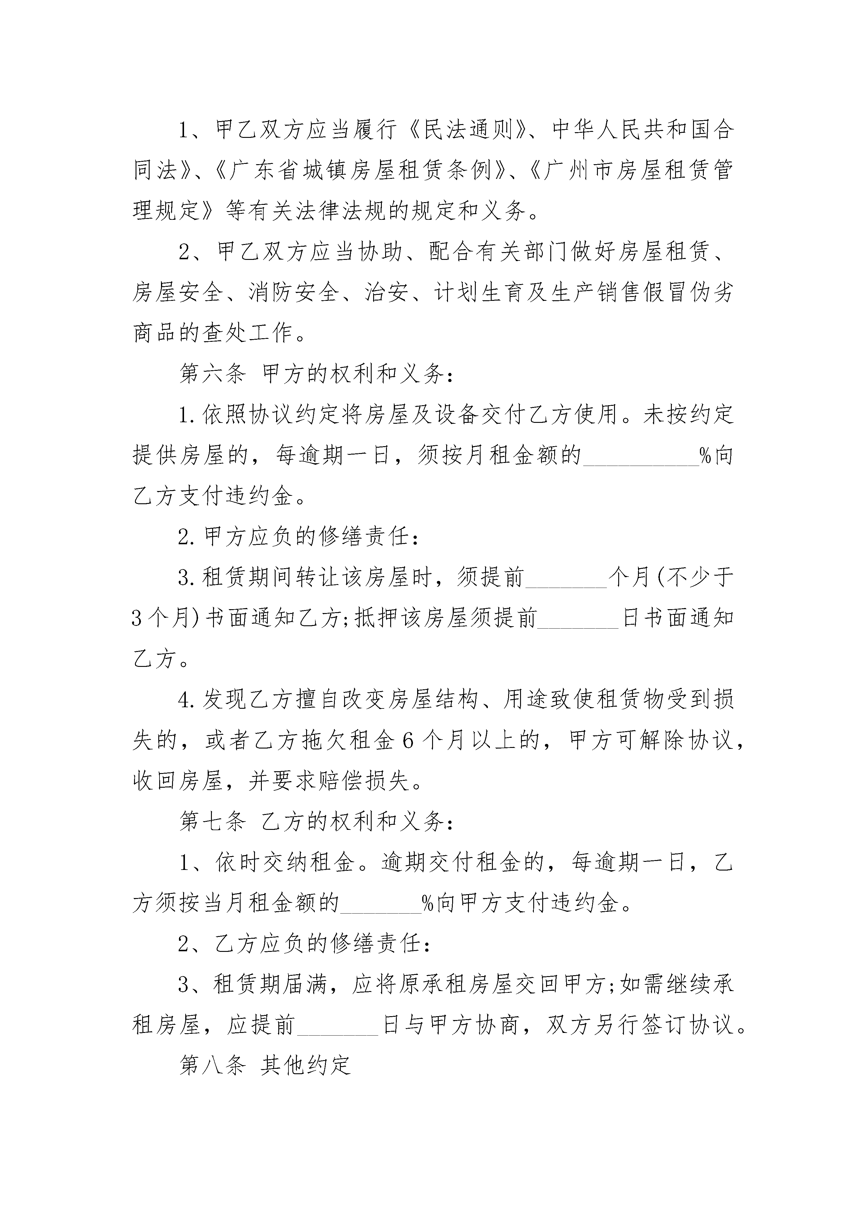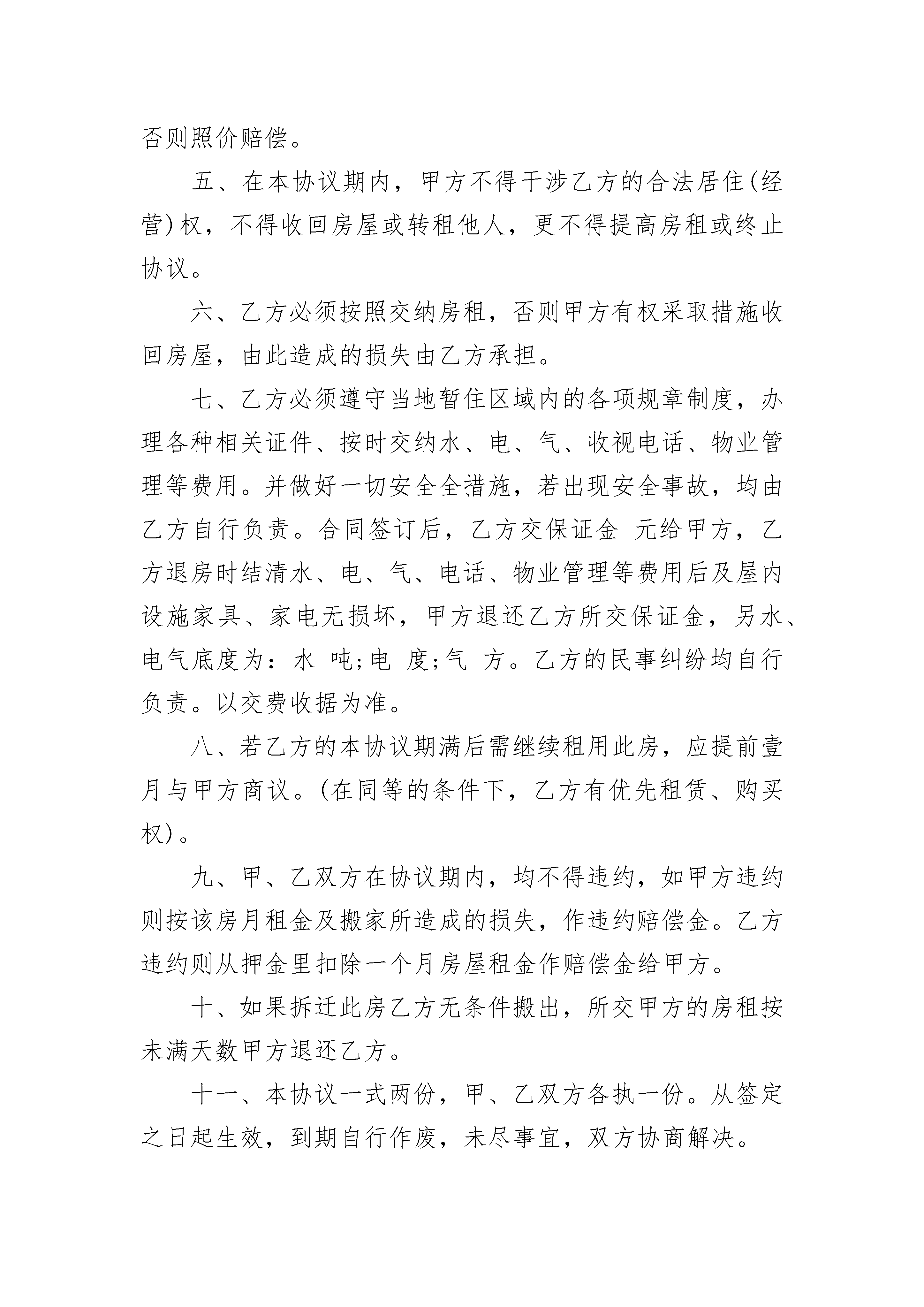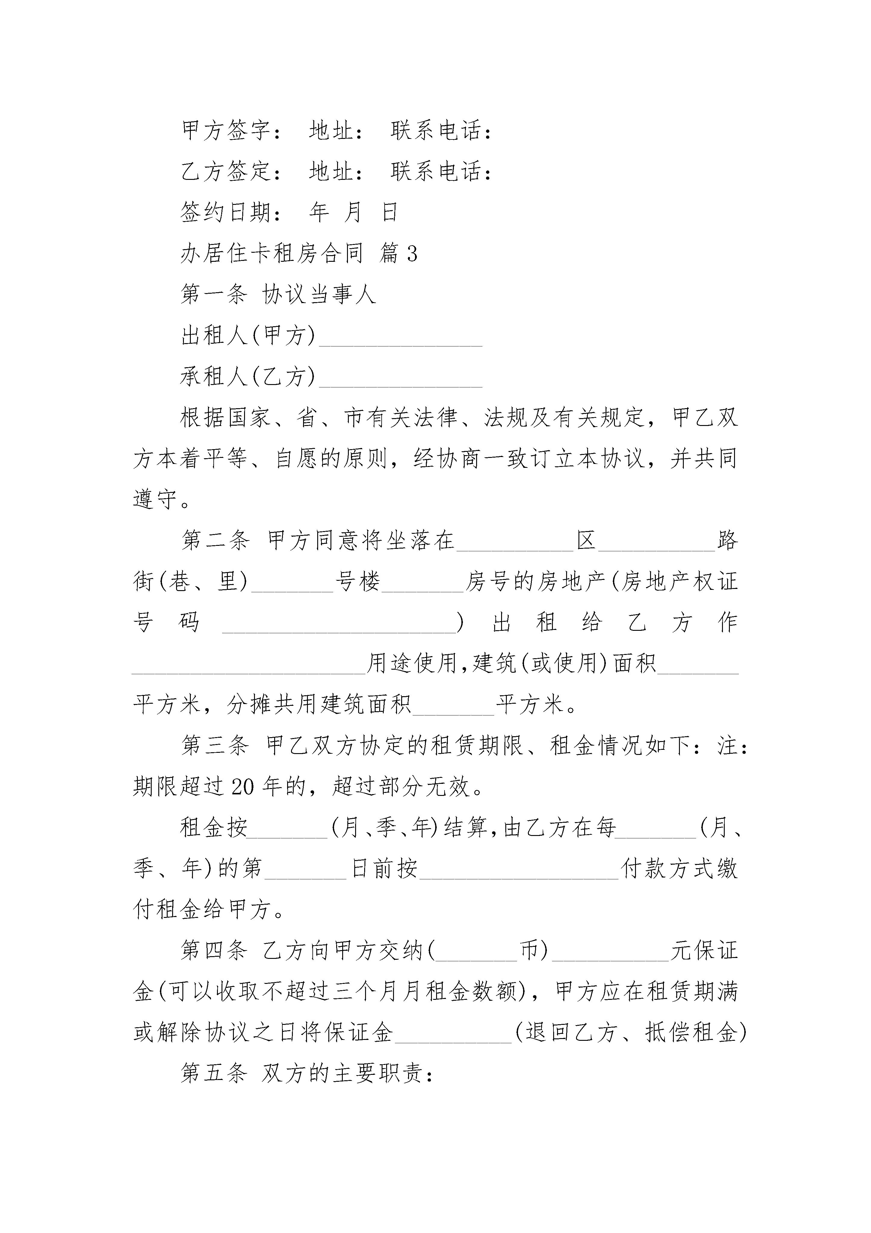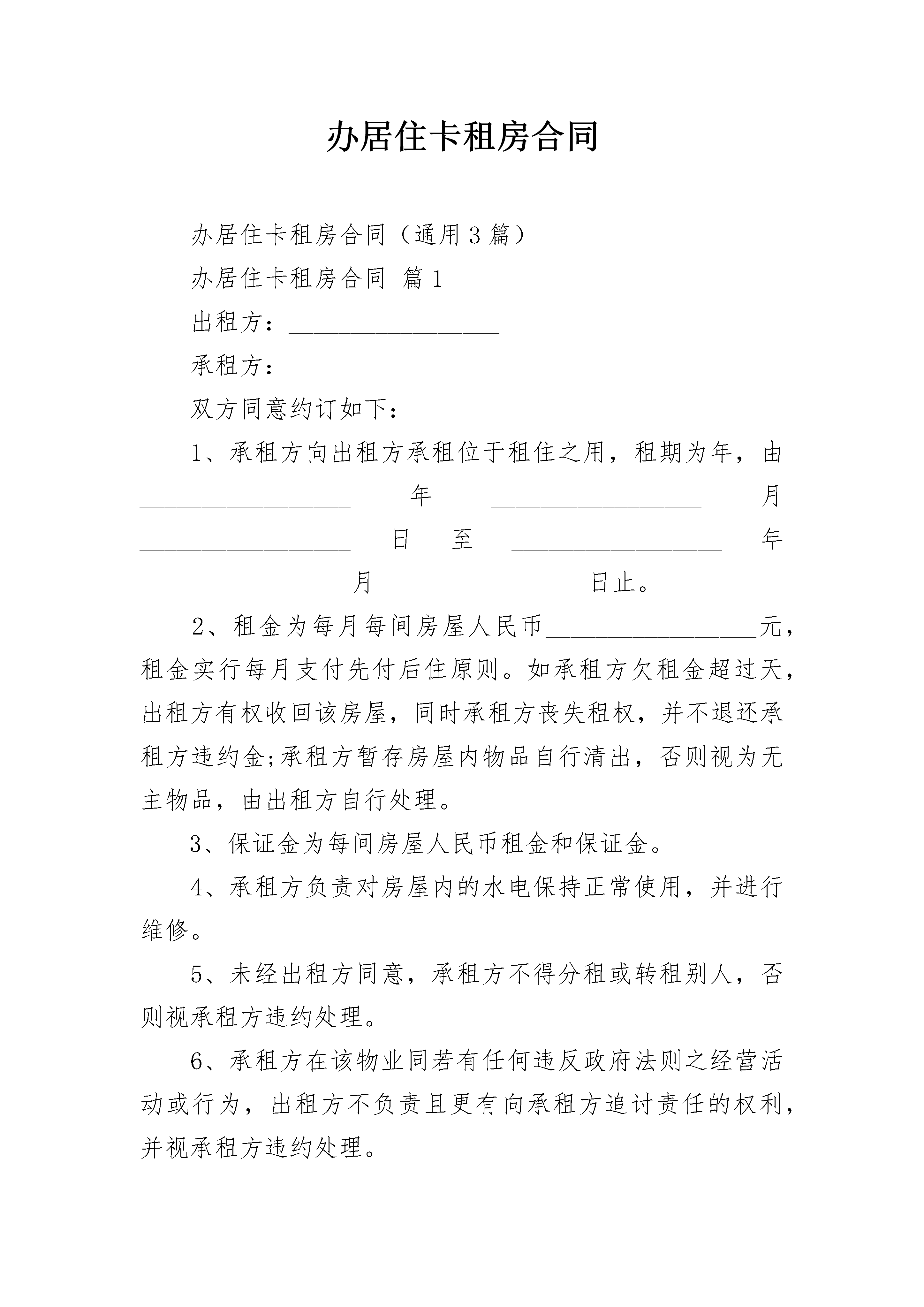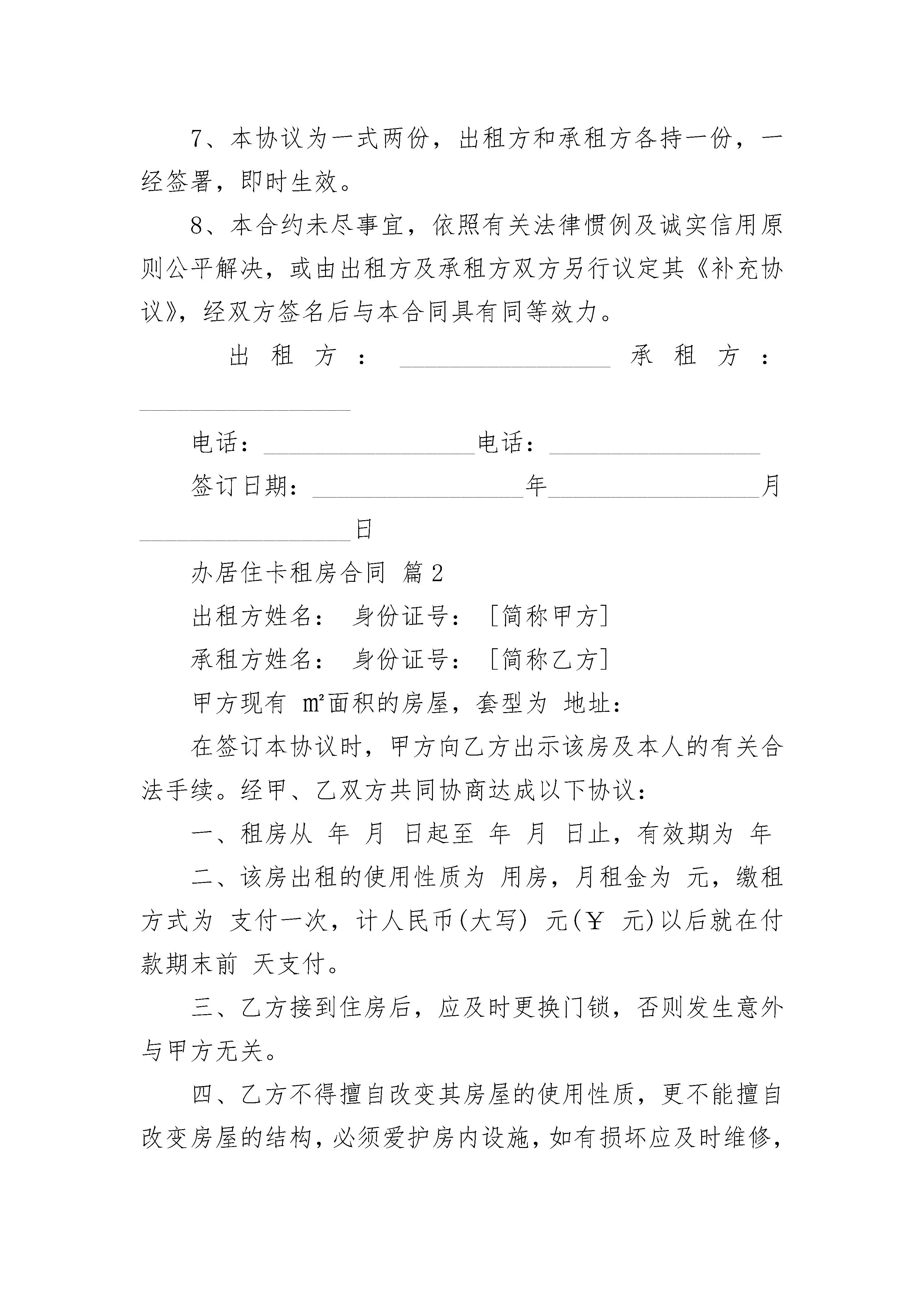 办居住卡租房合同办居住卡租房合同(通用3篇)办居住卡租房合同篇1出租方:_________________承租方:_________________双方同意约订如下:1、承租方向出租方承租位于租住之用,租期为年,由_________________年_________________月_________________日至_________________年_________________月_________________日止。2、租金为每月每间房屋人民币_________________元,租金实行每月支付先付后住原则。如承租方欠租金超过天,出租方有权收回该房屋,同时承租方丧失租权,并不退还承租方违约金;承租方暂存房屋内物品自行清出,否则视为无主物品,由出租方自行处理。3、保证金为每间房屋人民币租金和保证金。4、承租方负责对房屋内的水电保持正常使用,并进行维修。5、未经出租方同意,承租方不得分租或转租别人,否则视承租方违约处理。6、承租方在该物业同若有任何违反政府法则之经营活动或行为,出租方不负责且更有向承租方追讨责任的权利,并视承租方违约处理。7、本协议为一式两份,出租方和承租方各持一份,一经签署,即时生效。8、本合约未尽事宜,依照有关法律惯例及诚实信用原则公平解决,或由出租方及承租方双方另行议定其《补充协议》,经双方签名后与本合同具有同等效力。出租方:_________________承租方:_________________电话:_________________电话:_________________签订日期:_________________年_________________月_________________日办居住卡租房合同篇2出租方姓名:身份证号:[简称甲方]承租方姓名:身份证号:[简称乙方]甲方现有㎡面积的房屋,套型为地址:在签订本协议时,甲方向乙方出示该房及本人的有关合法手续。经甲、乙双方共同协商达成以下协议:一、租房从年月日起至年月日止,有效期为年二、该房出租的使用性质为用房,月租金为元,缴租方式为支付一次,计人民币(大写)元(¥元)以后就在付款期末前天支付。三、乙方接到住房后,应及时更换门锁,否则发生意外与甲方无关。四、乙方不得擅自改变其房屋的使用性质,更不能擅自改变房屋的结构,必须爱护房内设施,如有损坏应及时维修,否则照价赔偿。五、在本协议期内,甲方不得干涉乙方的合法居住(经营)权,不得收回房屋或转租他人,更不得提高房租或终止协议。六、乙方必须按照交纳房租,否则甲方有权采取措施收回房屋,由此造成的损失由乙方承担。七、乙方必须遵守当地暂住区域内的各项规章制度,办理各种相关证件、按时交纳水、电、气、收视电话、物业管理等费用。并做好一切安全全措施,若出现安全事故,均由乙方自行负责。合同签订后,乙方交保证金元给甲方,乙方退房时结清水、电、气、电话、物业管理等费用后及屋内设施家具、家电无损坏,甲方退还乙方所交保证金,另水、电气底度为:水吨;电度;气方。乙方的民事纠纷均自行负责。以交费收据为准。八、若乙方的本协议期满后需继续租用此房,应提前壹月与甲方商议。(在同等的条件下,乙方有优先租赁、购买权)。九、甲、乙双方在协议期内,均不得违约,如甲方违约则按该房月租金及搬家所造成的损失,作违约赔偿金。乙方违约则从押金里扣除一个月房屋租金作赔偿金给甲方。十、如果拆迁此房乙方无条件搬出,所交甲方的房租按未满天数甲方退还乙方。十一、本协议一式两份,甲、乙双方各执一份。从签定之日起生效,到期自行作废,未尽事宜,双方协商解决。甲方签字:地址:联系电话:乙方签定:地址:联系电话:签约日期:年月日办居住卡租房合同篇3第一条协议当事人出租人(甲方)______________承租人(乙方)______________根据国家、省、市有关法律、法规及有关规定,甲乙双方本着平等、自愿的原则,经协商一致订立本协议,并共同遵守。第二条甲方同意将坐落在__________区__________路街(巷、里)_______号楼_______房号的房地产(房地产权证号码____________________)出租给乙方作____________________用途使用,建筑(或使用)面积_______平方米,分摊共用建筑面积_______平方米。第三条甲乙双方协定的租赁期限、租金情况如下:注:期限超过20年的,超过部分无效。租金按_______(月、季、年)结算,由乙方在每_______(月、季、年)的第_______日前按_________________付款方式缴付租金给甲方。第四条乙方向甲方交纳(_______币)__________元保证金(可以收取不超过三个月月租金数额),甲方应在租赁期满或解除协议之日将保证金________