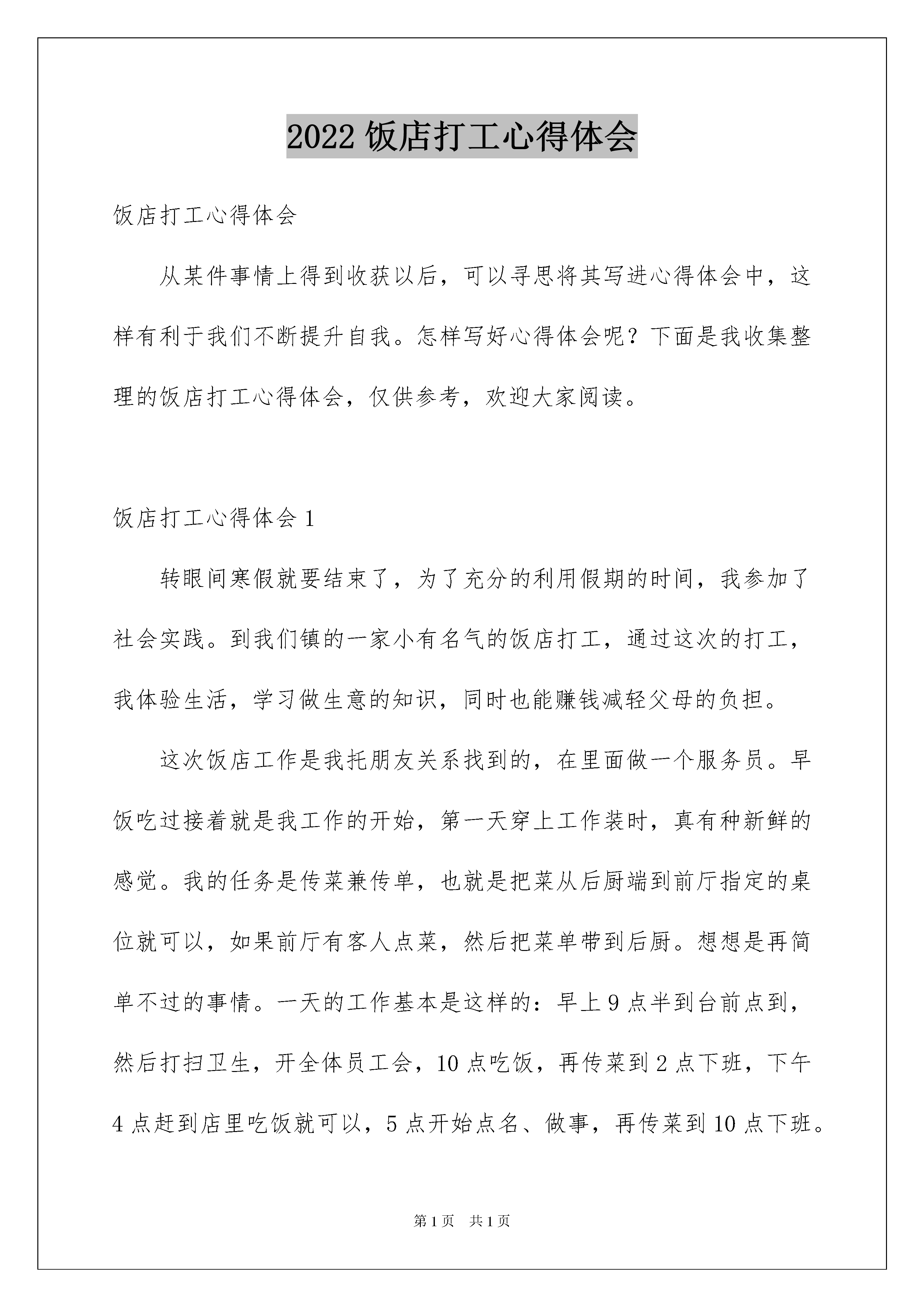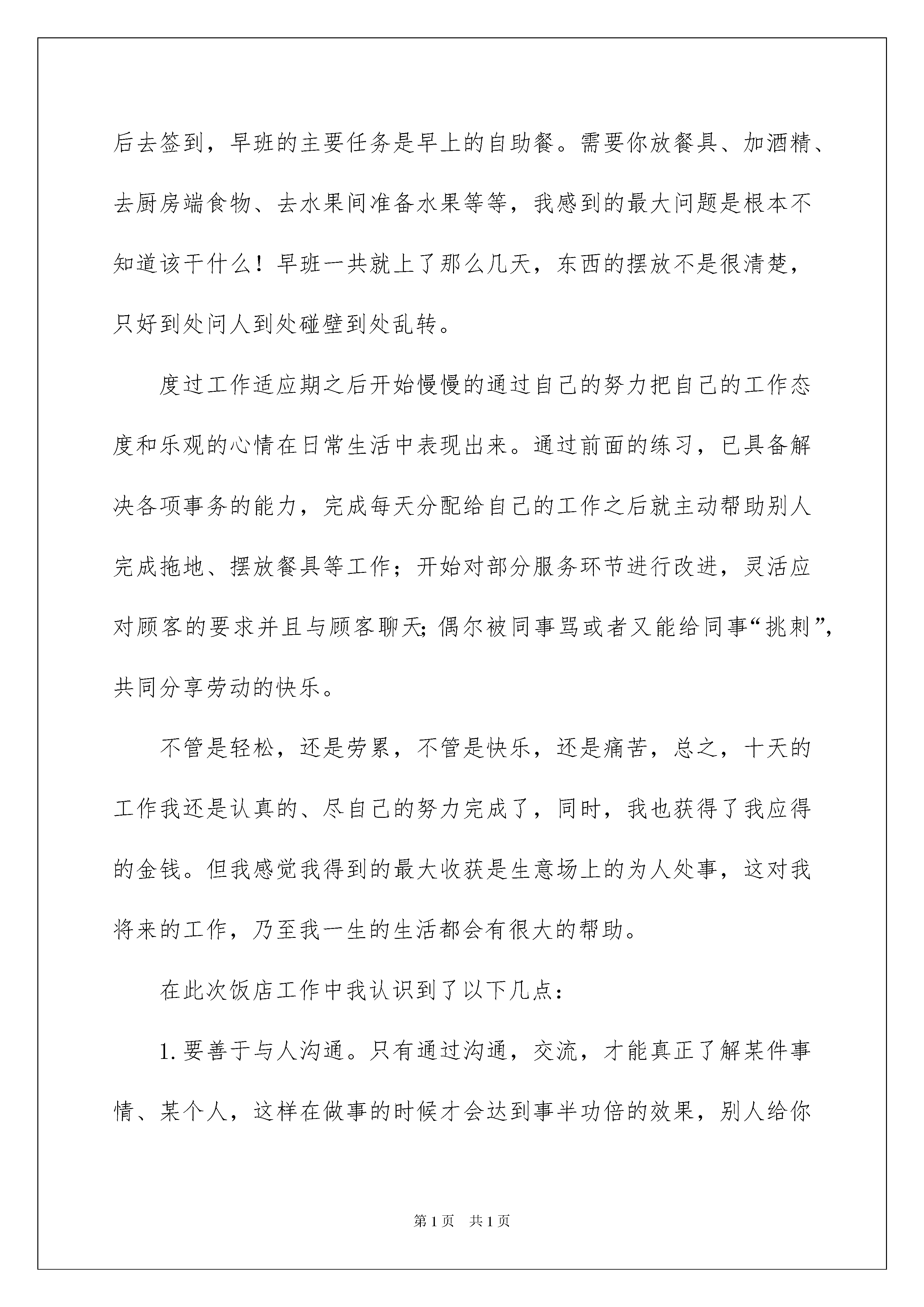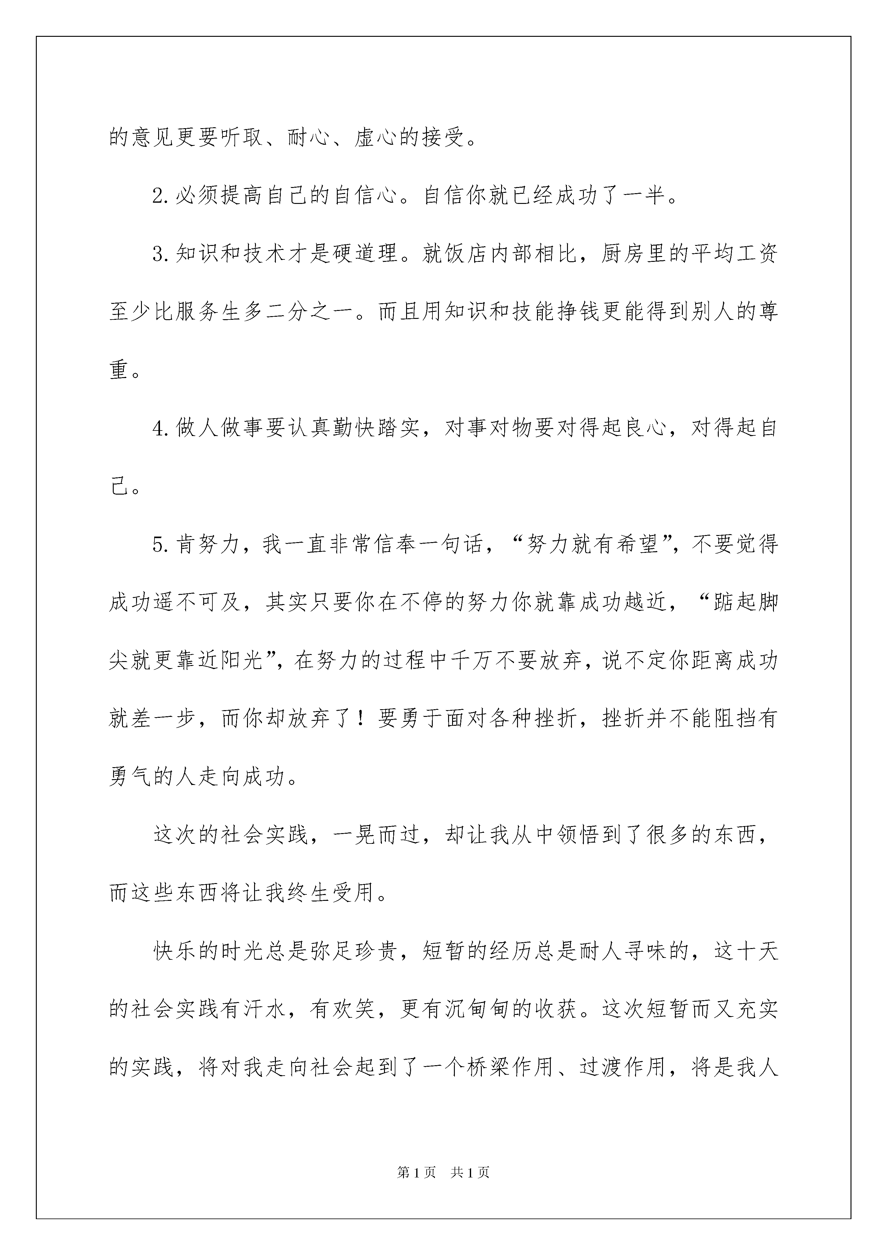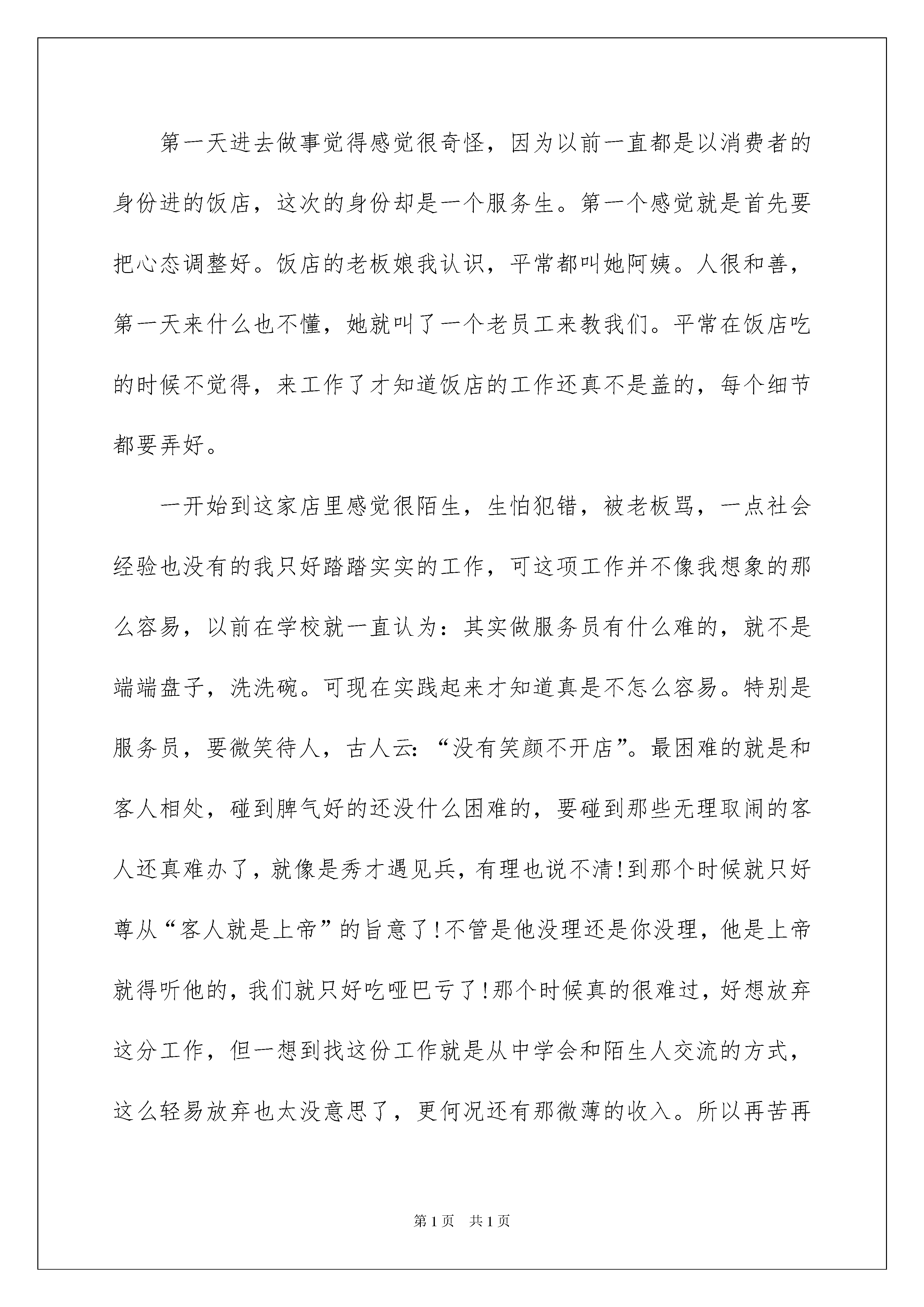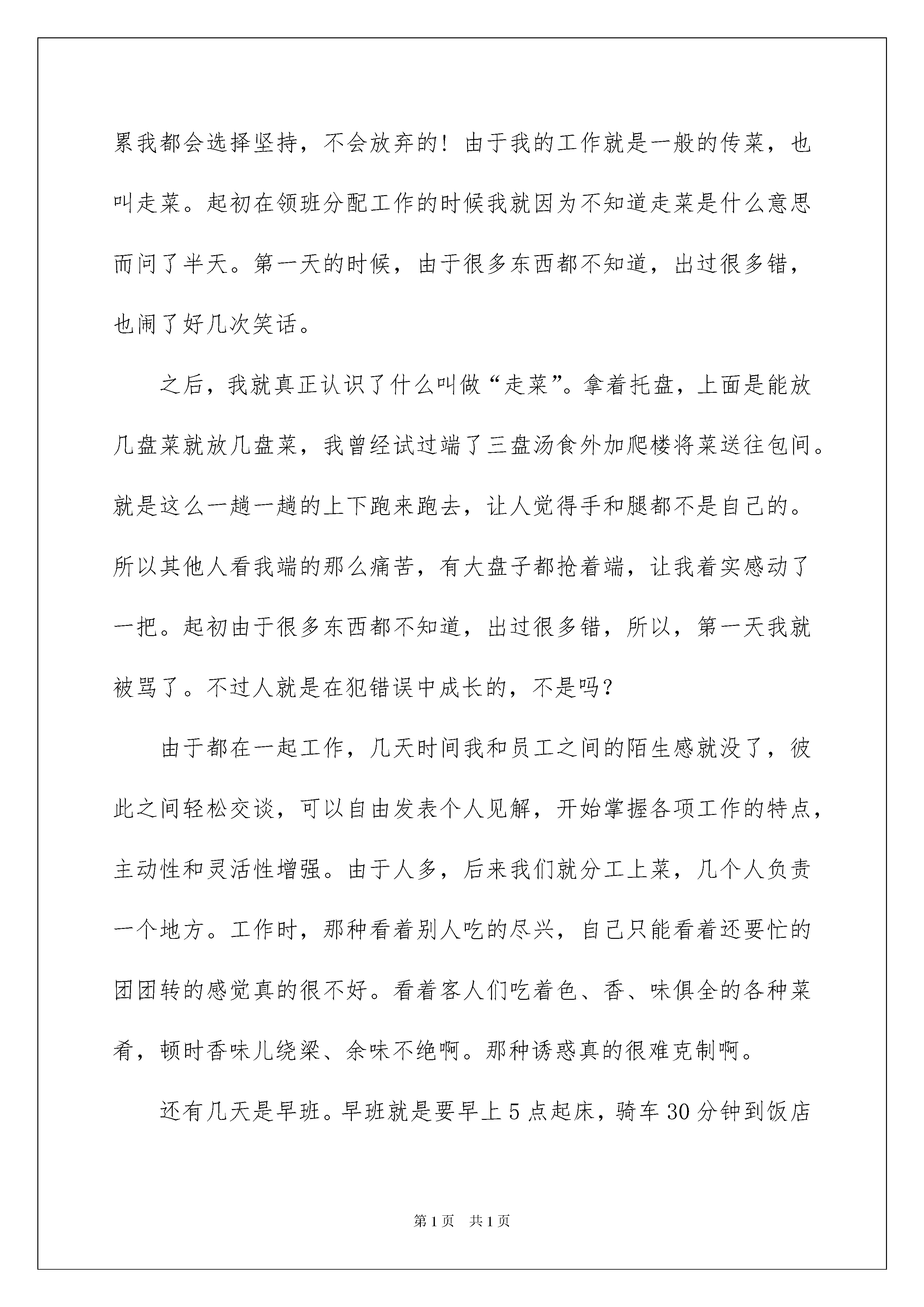 2022饭店打工心得体会饭店打工心得体会从某件事情上得到收获以后,可以寻思将其写进心得体会中,这样有利于我们不断提升自我。怎样写好心得体会呢?下面是我收集整理的饭店打工心得体会,仅供参考,欢迎大家阅读。饭店打工心得体会1转眼间寒假就要结束了,为了充分的利用假期的时间,我参加了社会实践。到我们镇的一家小有名气的饭店打工,通过这次的打工,我体验生活,学习做生意的知识,同时也能赚钱减轻父母的负担。这次饭店工作是我托朋友关系找到的,在里面做一个服务员。早饭吃过接着就是我工作的开始,第一天穿上工作装时,真有种新鲜的感觉。我的任务是传菜兼传单,也就是把菜从后厨端到前厅指定的桌位就可以,如果前厅有客人点菜,然后把菜单带到后厨。想想是再简单不过的事情。一天的工作基本是这样的:早上9点半到台前点到,然后打扫卫生,开全体员工会,10点吃饭,再传菜到2点下班,下午4点赶到店里吃饭就可以,5点开始点名、做事,再传菜到10点下班。第一天进去做事觉得感觉很奇怪,因为以前一直都是以消费者的身份进的饭店,这次的身份却是一个服务生。第一个感觉就是首先要把心态调整好。饭店的老板娘我认识,平常都叫她阿姨。人很和善,第一天来什么也不懂,她就叫了一个老员工来教我们。平常在饭店吃的时候不觉得,来工作了才知道饭店的工作还真不是盖的,每个细节都要弄好。一开始到这家店里感觉很陌生,生怕犯错,被老板骂,一点社会经验也没有的我只好踏踏实实的工作,可这项工作并不像我想象的那么容易,以前在学校就一直认为:其实做服务员有什么难的,就不是端端盘子,洗洗碗。可现在实践起来才知道真是不怎么容易。特别是服务员,要微笑待人,古人云:“没有笑颜不开店”。最困难的就是和客人相处,碰到脾气好的还没什么困难的,要碰到那些无理取闹的客人还真难办了,就像是秀才遇见兵,有理也说不清!到那个时候就只好尊从“客人就是上帝”的旨意了!不管是他没理还是你没理,他是上帝就得听他的,我们就只好吃哑巴亏了!那个时候真的很难过,好想放弃这分工作,但一想到找这份工作就是从中学会和陌生人交流的方式,这么轻易放弃也太没意思了,更何况还有那微薄的收入。所以再苦再累我都会选择坚持,不会放弃的!由于我的工作就是一般的传菜,也叫走菜。起初在领班分配工作的时候我就因为不知道走菜是什么意思而问了半天。第一天的时候,由于很多东西都不知道,出过很多错,也闹了好几次笑话。之后,我就真正认识了什么叫做“走菜”。拿着托盘,上面是能放几盘菜就放几盘菜,我曾经试过端了三盘汤食外加爬楼将菜送往包间。就是这么一趟一趟的上下跑来跑去,让人觉得手和腿都不是自己的。所以其他人看我端的那么痛苦,有大盘子都抢着端,让我着实感动了一把。起初由于很多东西都不知道,出过很多错,所以,第一天我就被骂了。不过人就是在犯错误中成长的,不是吗?由于都在一起工作,几天时间我和员工之间的陌生感就没了,彼此之间轻松交谈,可以自由发表个人见解,开始掌握各项工作的特点,主动性和灵活性增强。由于人多,后来我们就分工上菜,几个人负责一个地方。工作时,那种看着别人吃的尽兴,自己只能看着还要忙的团团转的感觉真的很不好。看着客人们吃着色、香、味俱全的各种菜肴,顿时香味儿绕梁、余味不绝啊。那种诱惑真的很难克制啊。还有几天是早班。早班就是要早上5点起床,骑车30分钟到饭店后去签到,早班的主要任务是早上的自助餐。需要你放餐具、加酒精、去厨房端食物、去水果间准备水果等等,我感到的最大问题是根本不知道该干什么!早班一共就上了那么几天,东西的摆放不是很清楚,只好到处问人到处碰壁到处乱转。度过工作适应期之后开始慢慢的通过自己的努力把自己的工作态度和乐观的心情在日常生活中表现出来。通过前面的练习,已具备解决各项事务的能力,完成每天分配给自己的工作之后就主动帮助别人完成拖地、摆放餐具等工作;开始对部分服务环节进行改进,灵活应对顾客的要求并且与顾客聊天;偶尔被同事骂或者又能给同事“挑刺”,共同分享劳动的快乐。不管是轻松,还是劳累,不管是快乐,还是痛苦,总之,十天的工作我还是认真的、尽自己的努力完成了,同时,我也获得了我应得的金钱。但我感觉我得到的最大收获是生意场上的为人处事,这对我将来的工作,乃至我一生的生活都会有很大的帮助。在此次饭店工作中我认识到了以下几点:1.要善于与人沟通。只有通过沟通,交流,才能真正了解某件事情、某个人,这样在做事的时候才会达到事半功倍的效果,别人给你的意见更要听取、耐心、虚心的接受。2.必须提高自己的自信心。自信你就已经成功了一半。3.知识和技术才是硬道理。就饭店内部相比,厨房里的平均工资至少比服务生多二分之一。而且用知识和技能挣钱更能得到