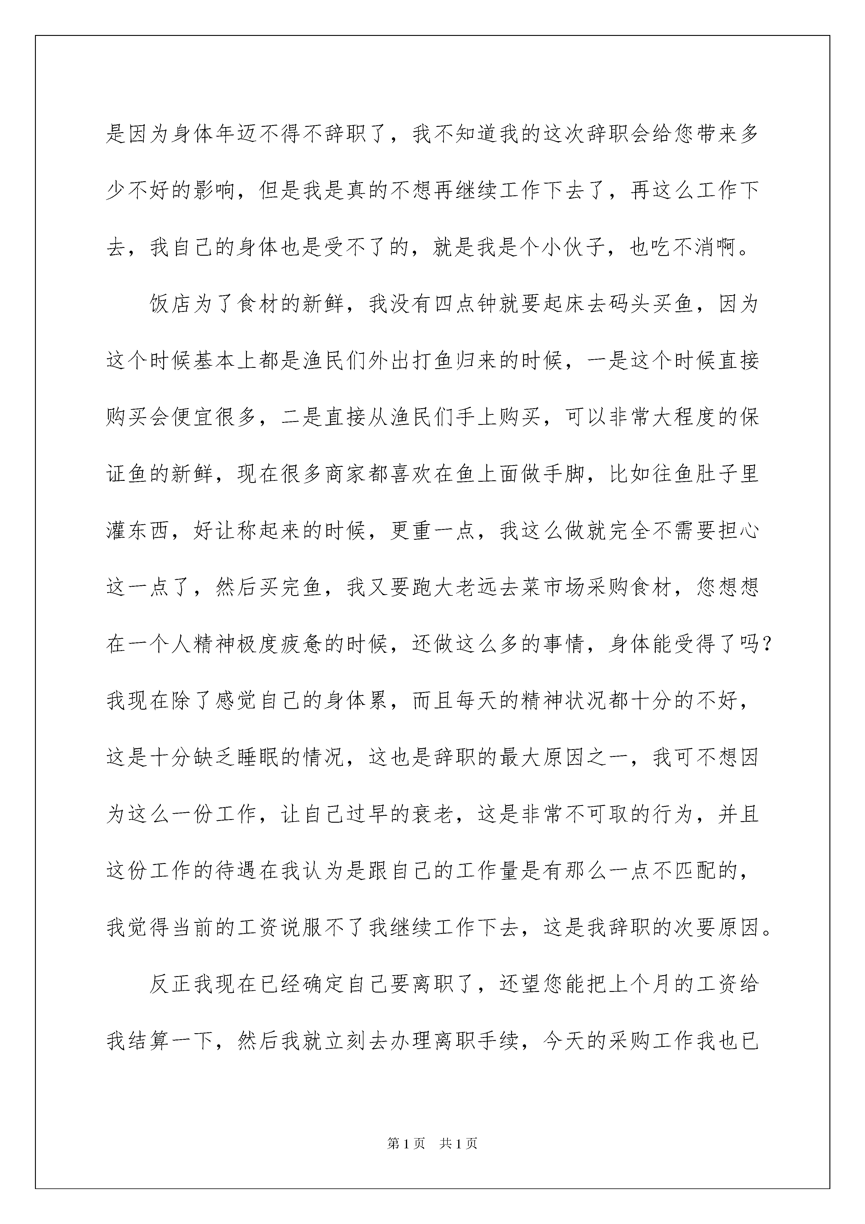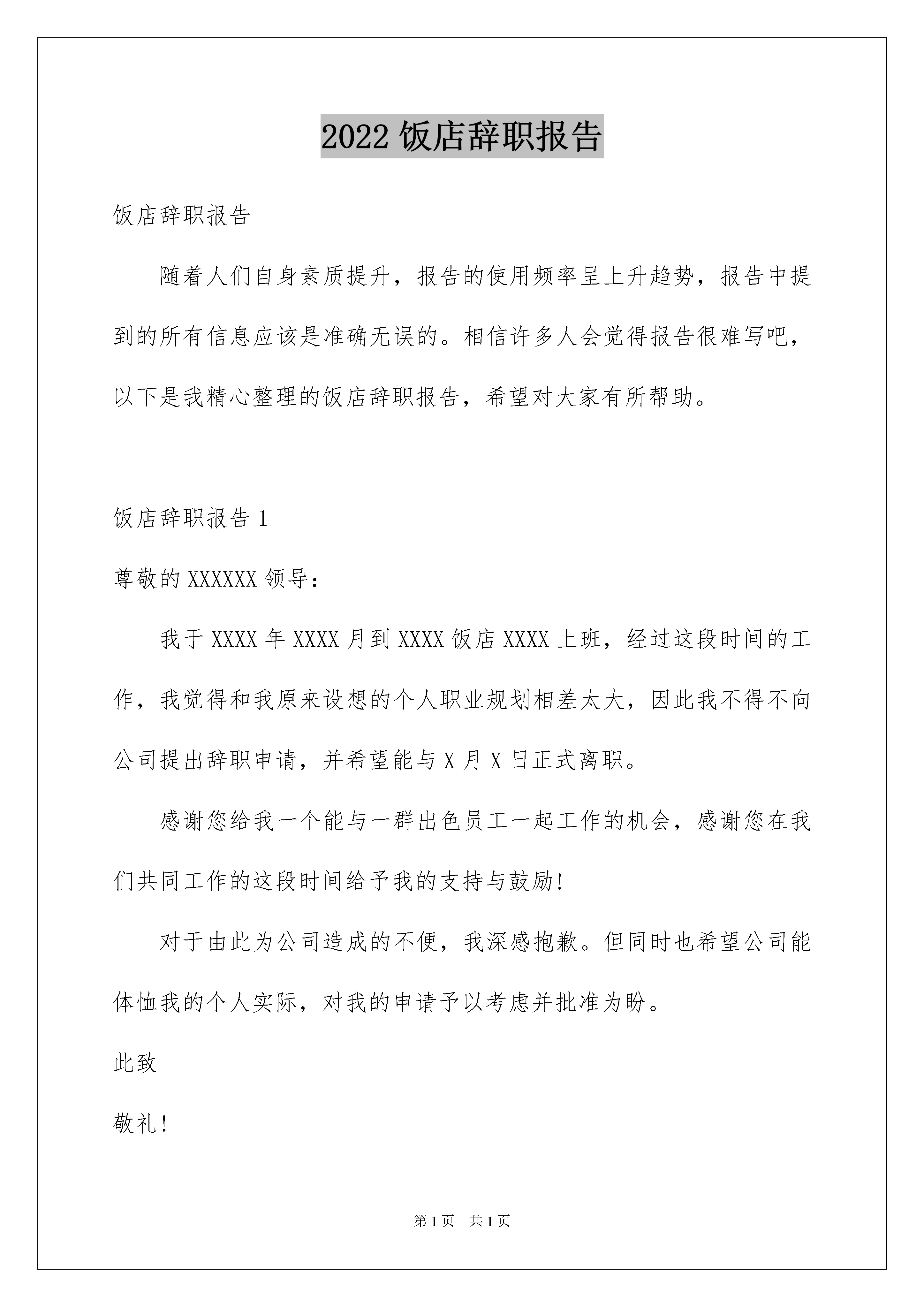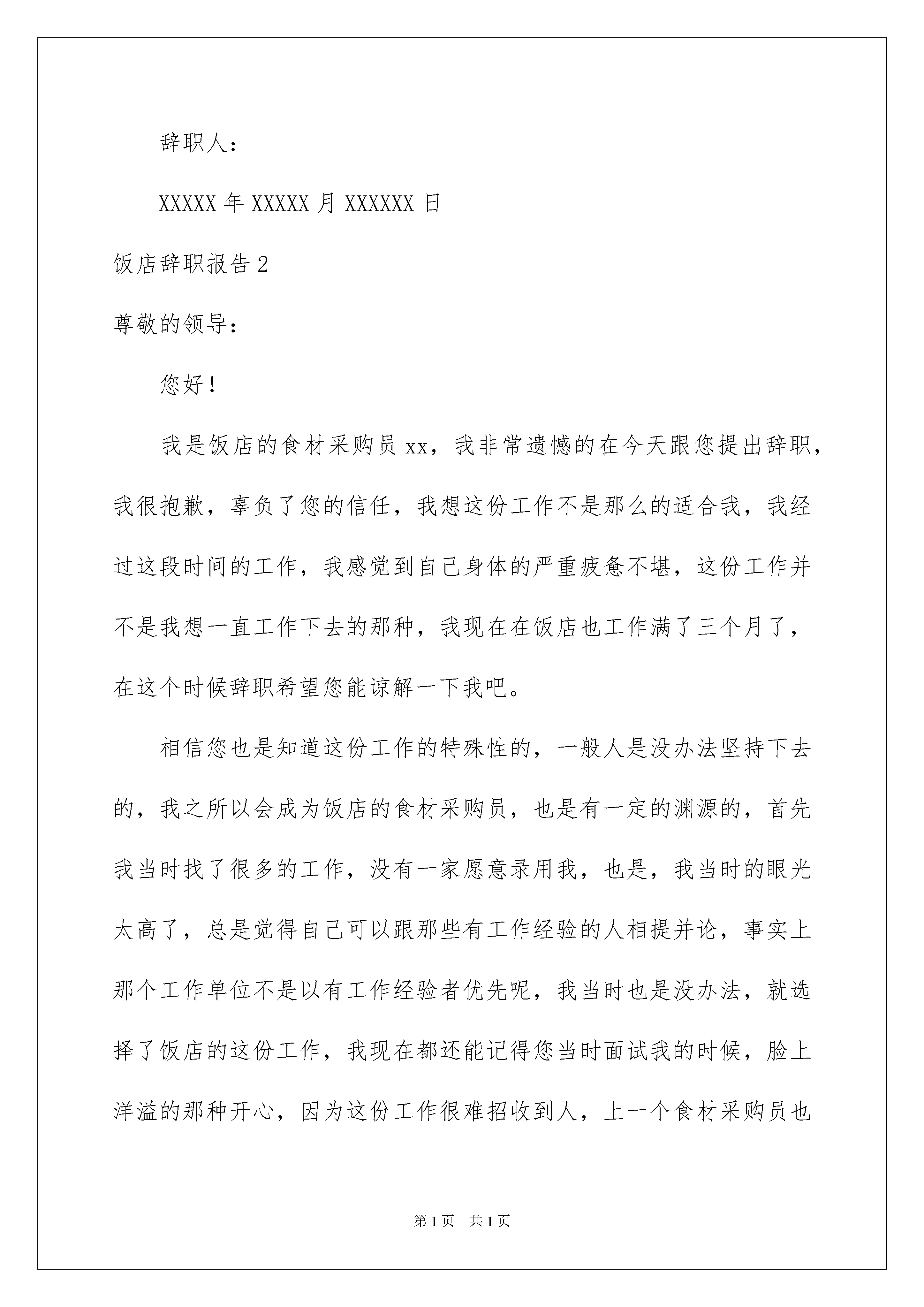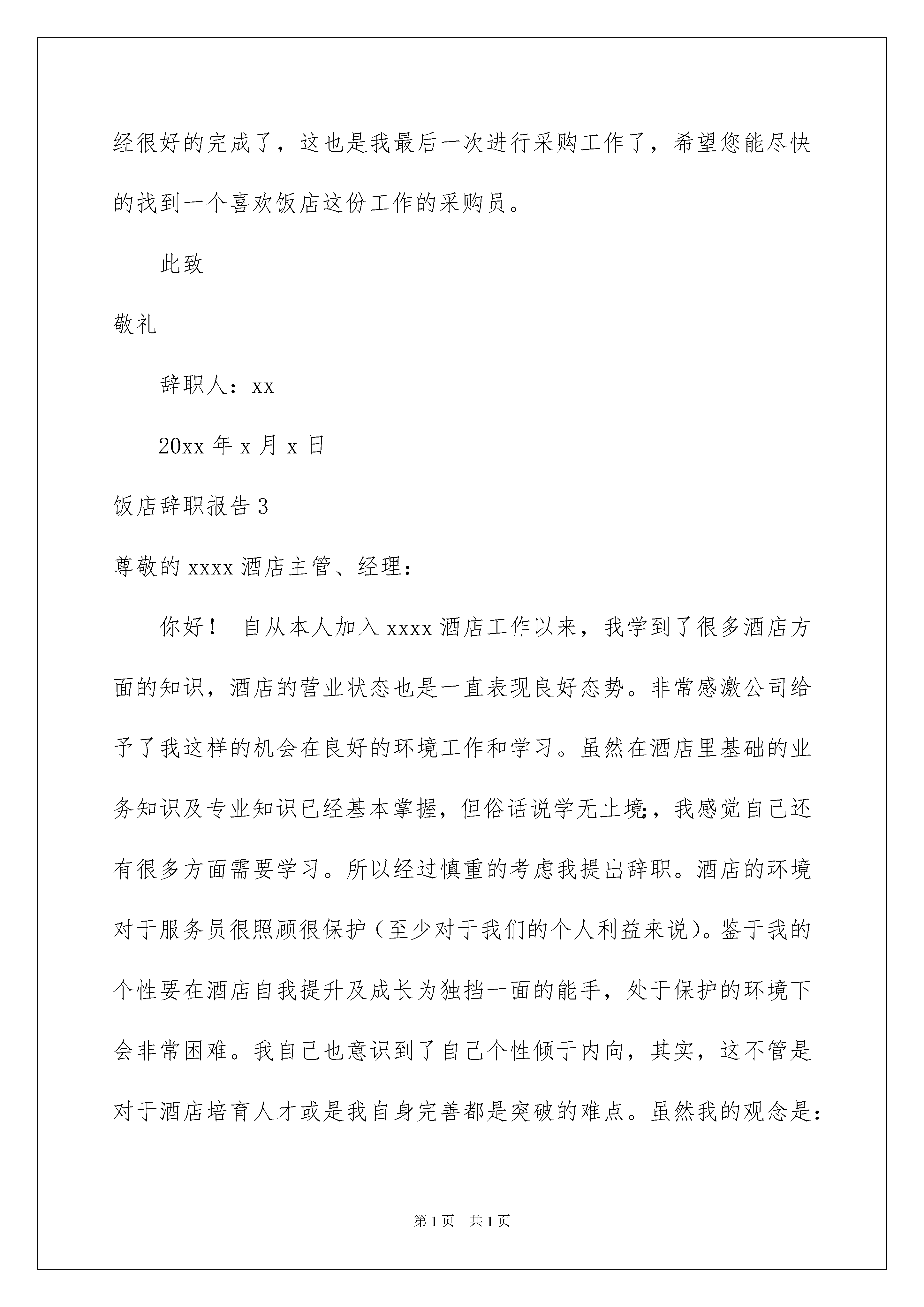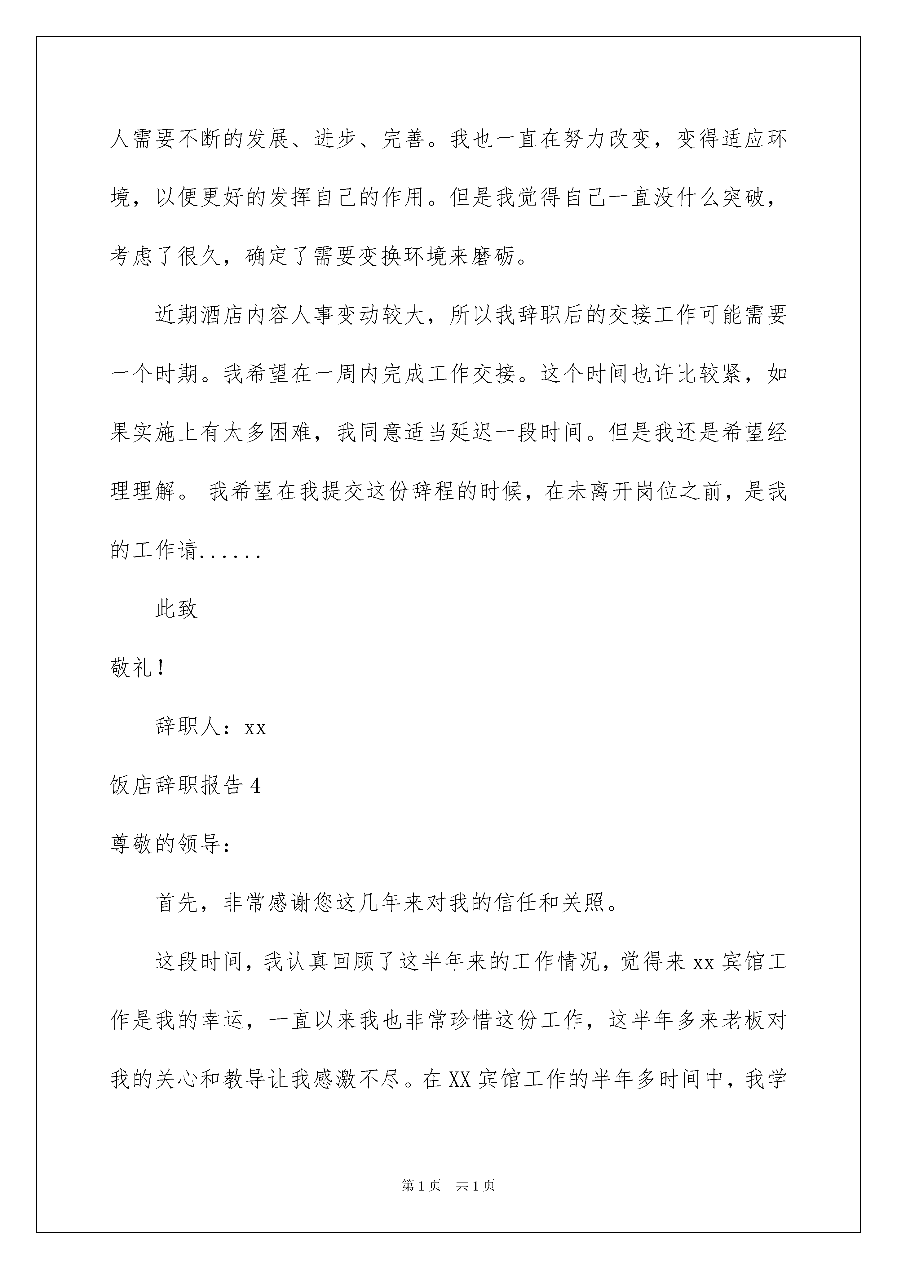 2022饭店辞职报告饭店辞职报告随着人们自身素质提升,报告的使用频率呈上升趋势,报告中提到的所有信息应该是准确无误的。相信许多人会觉得报告很难写吧,以下是我精心整理的饭店辞职报告,希望对大家有所帮助。饭店辞职报告1尊敬的XXXXXX领导:我于XXXX年XXXX月到XXXX饭店XXXX上班,经过这段时间的工作,我觉得和我原来设想的个人职业规划相差太大,因此我不得不向公司提出辞职申请,并希望能与X月X日正式离职。感谢您给我一个能与一群出色员工一起工作的机会,感谢您在我们共同工作的这段时间给予我的支持与鼓励!对于由此为公司造成的不便,我深感抱歉。但同时也希望公司能体恤我的个人实际,对我的申请予以考虑并批准为盼。此致敬礼!辞职人:XXXXX年XXXXX月XXXXXX日饭店辞职报告2尊敬的领导:您好!我是饭店的食材采购员xx,我非常遗憾的在今天跟您提出辞职,我很抱歉,辜负了您的信任,我想这份工作不是那么的适合我,我经过这段时间的工作,我感觉到自己身体的严重疲惫不堪,这份工作并不是我想一直工作下去的那种,我现在在饭店也工作满了三个月了,在这个时候辞职希望您能谅解一下我吧。相信您也是知道这份工作的特殊性的,一般人是没办法坚持下去的,我之所以会成为饭店的食材采购员,也是有一定的渊源的,首先我当时找了很多的工作,没有一家愿意录用我,也是,我当时的眼光太高了,总是觉得自己可以跟那些有工作经验的人相提并论,事实上那个工作单位不是以有工作经验者优先呢,我当时也是没办法,就选择了饭店的这份工作,我现在都还能记得您当时面试我的时候,脸上洋溢的那种开心,因为这份工作很难招收到人,上一个食材采购员也是因为身体年迈不得不辞职了,我不知道我的这次辞职会给您带来多少不好的影响,但是我是真的不想再继续工作下去了,再这么工作下去,我自己的身体也是受不了的,就是我是个小伙子,也吃不消啊。饭店为了食材的新鲜,我没有四点钟就要起床去码头买鱼,因为这个时候基本上都是渔民们外出打鱼归来的时候,一是这个时候直接购买会便宜很多,二是直接从渔民们手上购买,可以非常大程度的保证鱼的新鲜,现在很多商家都喜欢在鱼上面做手脚,比如往鱼肚子里灌东西,好让称起来的时候,更重一点,我这么做就完全不需要担心这一点了,然后买完鱼,我又要跑大老远去菜市场采购食材,您想想在一个人精神极度疲惫的时候,还做这么多的事情,身体能受得了吗?我现在除了感觉自己的身体累,而且每天的精神状况都十分的不好,这是十分缺乏睡眠的情况,这也是辞职的最大原因之一,我可不想因为这么一份工作,让自己过早的衰老,这是非常不可取的行为,并且这份工作的待遇在我认为是跟自己的工作量是有那么一点不匹配的,我觉得当前的工资说服不了我继续工作下去,这是我辞职的次要原因。反正我现在已经确定自己要离职了,还望您能把上个月的工资给我结算一下,然后我就立刻去办理离职手续,今天的采购工作我也已经很好的完成了,这也是我最后一次进行采购工作了,希望您能尽快的找到一个喜欢饭店这份工作的采购员。此致敬礼辞职人:xx20xx年x月x日饭店辞职报告3尊敬的xxxx酒店主管、经理:你好!自从本人加入xxxx酒店工作以来,我学到了很多酒店方面的知识,酒店的营业状态也是一直表现良好态势。非常感激公司给予了我这样的机会在良好的环境工作和学习。虽然在酒店里基础的业务知识及专业知识已经基本掌握,但俗话说学无止境;,我感觉自己还有很多方面需要学习。所以经过慎重的考虑我提出辞职。酒店的环境对于服务员很照顾很保护(至少对于我们的个人利益来说)。鉴于我的个性要在酒店自我提升及成长为独挡一面的能手,处于保护的环境下会非常困难。我自己也意识到了自己个性倾于内向,其实,这不管是对于酒店培育人才或是我自身完善都是突破的难点。虽然我的观念是:人需要不断的发展、进步、完善。我也一直在努力改变,变得适应环境,以便更好的发挥自己的作用。但是我觉得自己一直没什么突破,考虑了很久,确定了需要变换环境来磨砺。近期酒店内容人事变动较大,所以我辞职后的交接工作可能需要一个时期。我希望在一周内完成工作交接。这个时间也许比较紧,如果实施上有太多困难,我同意适当延迟一段时间。但是我还是希望经理理解。我希望在我提交这份辞程的时候,在未离开岗位之前,是我的工作请......此致敬礼!辞职人:xx饭店辞职报告4尊敬的领导:首先,非常感谢您这几年来对我的信任和关照。这段时间,我认真回顾了这半年来的工作情况,觉得来xx宾馆工作是我的幸运,一直以来我也非常珍惜这份工作,这半年多来老板对我的关心和教导让我感激不尽。在XX宾馆工作的半年多时间中,我学到很多东西,无论是交际方面还是