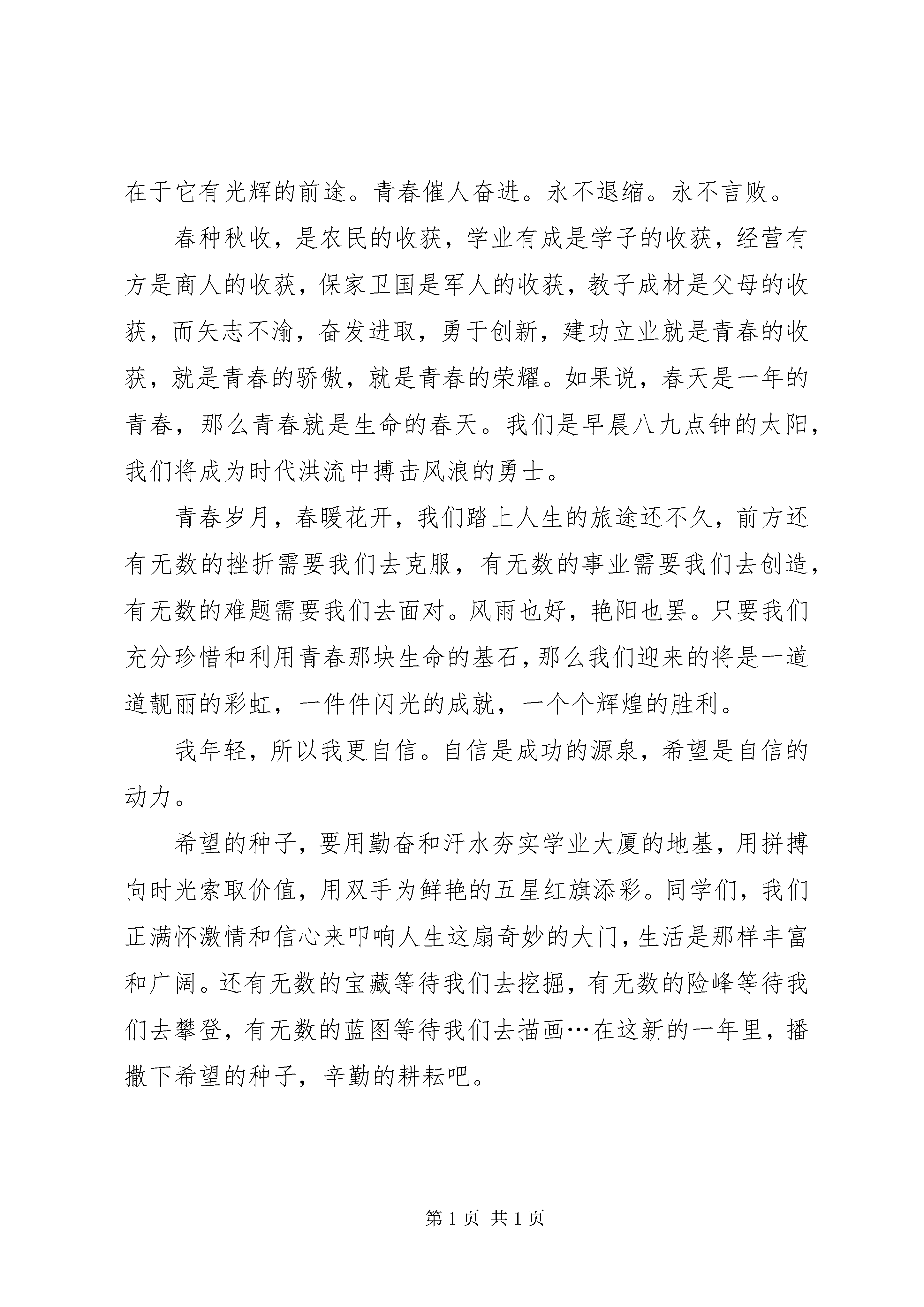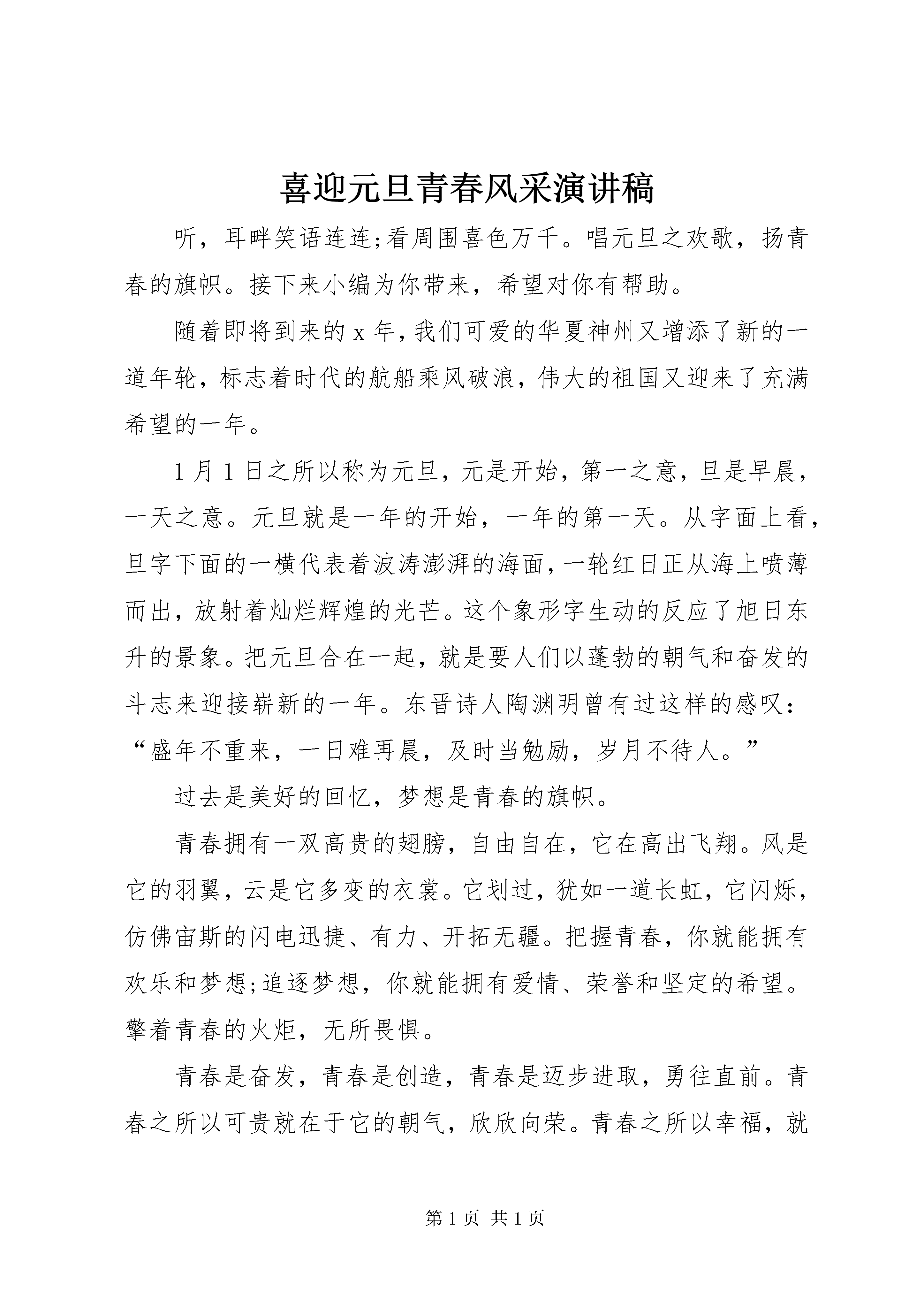 喜迎元旦青春风采演讲稿听,耳畔笑语连连;看周围喜色万千。唱元旦之欢歌,扬青春的旗帜。接下来小编为你带来,希望对你有帮助。随着即将到来的x年,我们可爱的华夏神州又增添了新的一道年轮,标志着时代的航船乘风破浪,伟大的祖国又迎来了充满希望的一年。1月1日之所以称为元旦,元是开始,第一之意,旦是早晨,一天之意。元旦就是一年的开始,一年的第一天。从字面上看,旦字下面的一横代表着波涛澎湃的海面,一轮红日正从海上喷薄而出,放射着灿烂辉煌的光芒。这个象形字生动的反应了旭日东升的景象。把元旦合在一起,就是要人们以蓬勃的朝气和奋发的斗志来迎接崭新的一年。东晋诗人陶渊明曾有过这样的感叹:“盛年不重来,一日难再晨,及时当勉励,岁月不待人。”过去是美好的回忆,梦想是青春的旗帜。青春拥有一双高贵的翅膀,自由自在,它在高出飞翔。风是它的羽翼,云是它多变的衣裳。它划过,犹如一道长虹,它闪烁,仿佛宙斯的闪电迅捷、有力、开拓无疆。把握青春,你就能拥有欢乐和梦想;追逐梦想,你就能拥有爱情、荣誉和坚定的希望。擎着青春的火炬,无所畏惧。青春是奋发,青春是创造,青春是迈步进取,勇往直前。青春之所以可贵就在于它的朝气,欣欣向荣。青春之所以幸福,就在于它有光辉的前途。青春催人奋进。永不退缩。永不言败。春种秋收,是农民的收获,学业有成是学子的收获,经营有方是商人的收获,保家卫国是军人的收获,教子成材是父母的收获,而矢志不渝,奋发进取,勇于创新,建功立业就是青春的收获,就是青春的骄傲,就是青春的荣耀。如果说,春天是一年的青春,那么青春就是生命的春天。我们是早晨八九点钟的太阳,我们将成为时代洪流中搏击风浪的勇士。青春岁月,春暖花开,我们踏上人生的旅途还不久,前方还有无数的挫折需要我们去克服,有无数的事业需要我们去创造,有无数的难题需要我们去面对。风雨也好,艳阳也罢。只要我们充分珍惜和利用青春那块生命的基石,那么我们迎来的将是一道道靓丽的彩虹,一件件闪光的成就,一个个辉煌的胜利。我年轻,所以我更自信。自信是成功的源泉,希望是自信的动力。希望的种子,要用勤奋和汗水夯实学业大厦的地基,用拼搏向时光索取价值,用双手为鲜艳的五星红旗添彩。同学们,我们正满怀激情和信心来叩响人生这扇奇妙的大门,生活是那样丰富和广阔。还有无数的宝藏等待我们去挖掘,有无数的险峰等待我们去攀登,有无数的蓝图等待我们去描画…在这新的一年里,播撒下希望的种子,辛勤的耕耘吧。我的演讲完毕。谢谢大家。