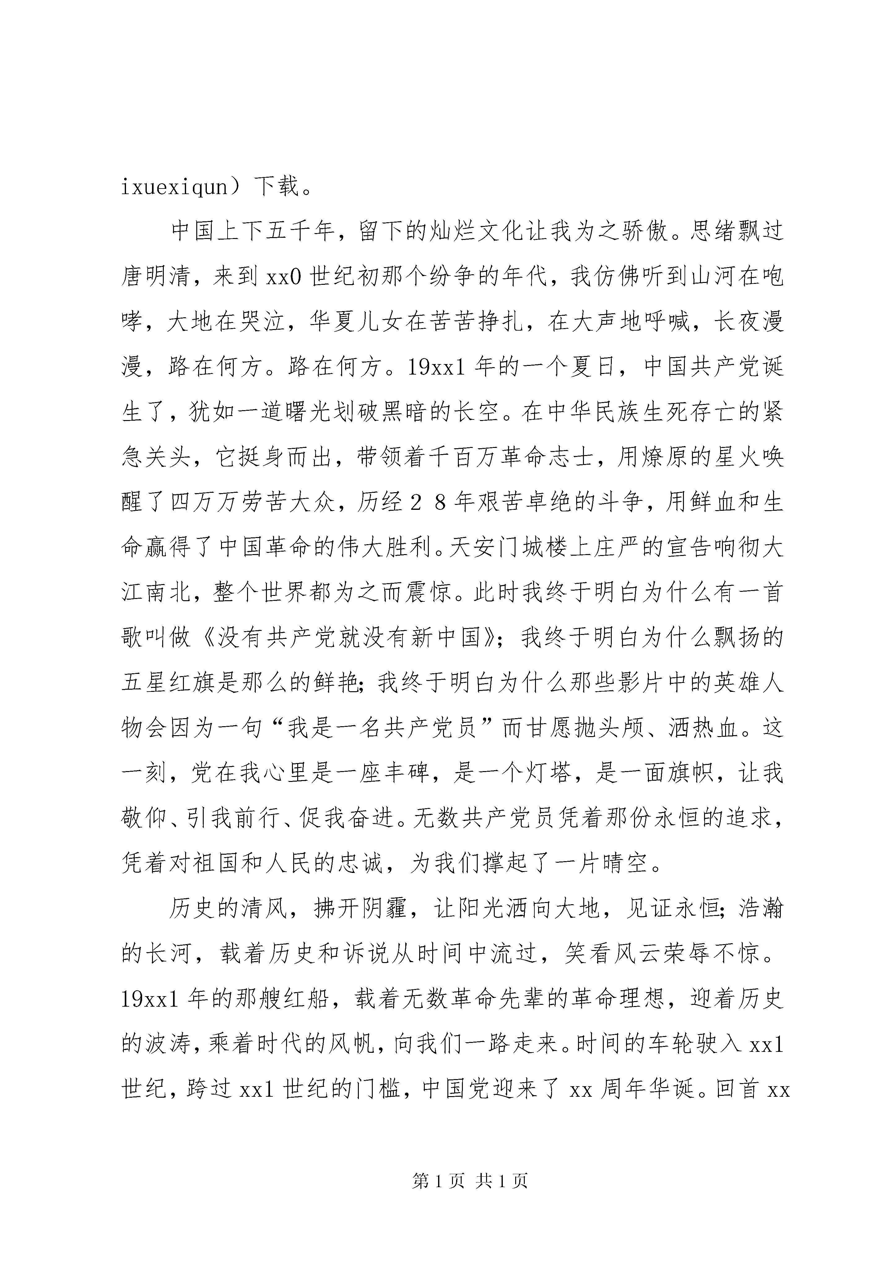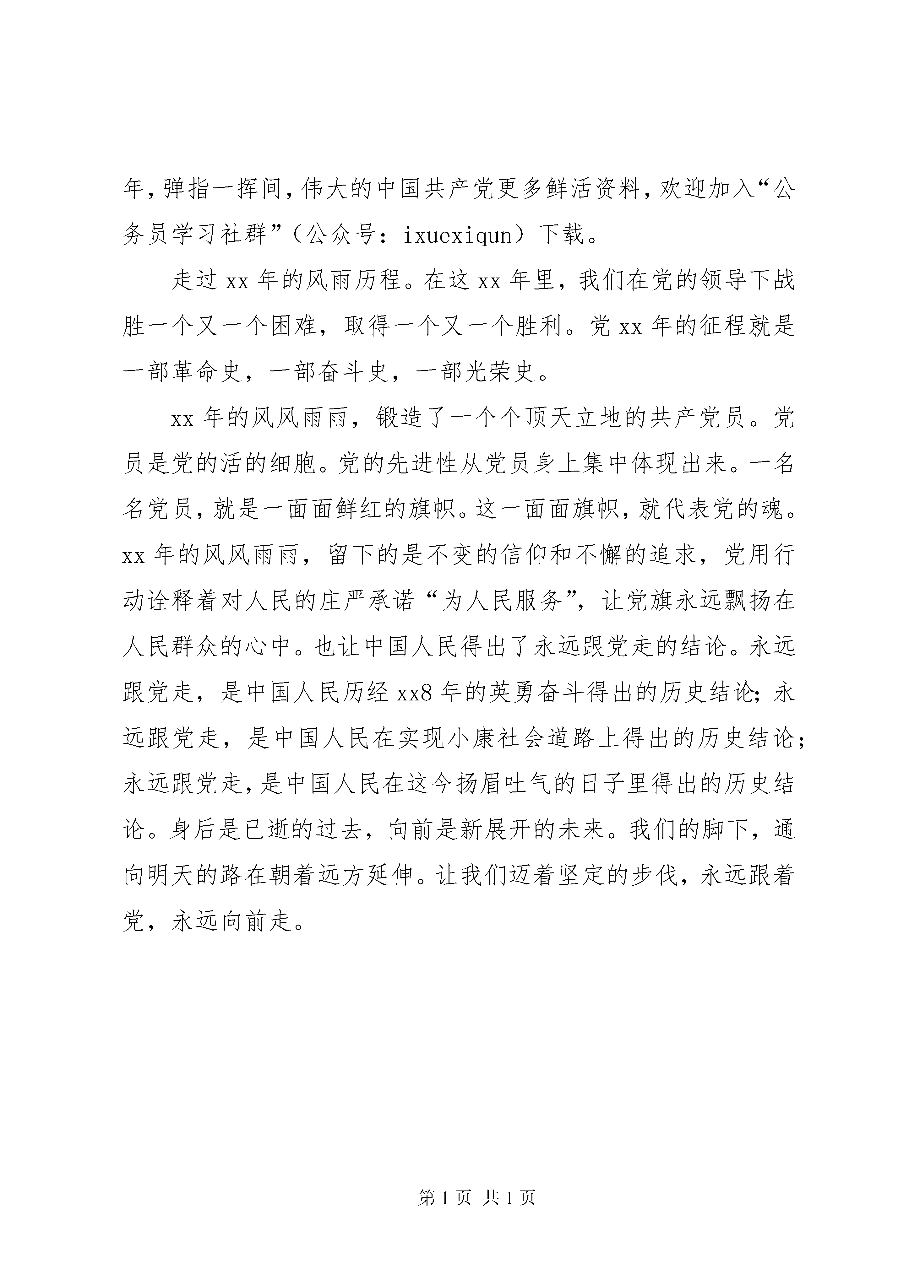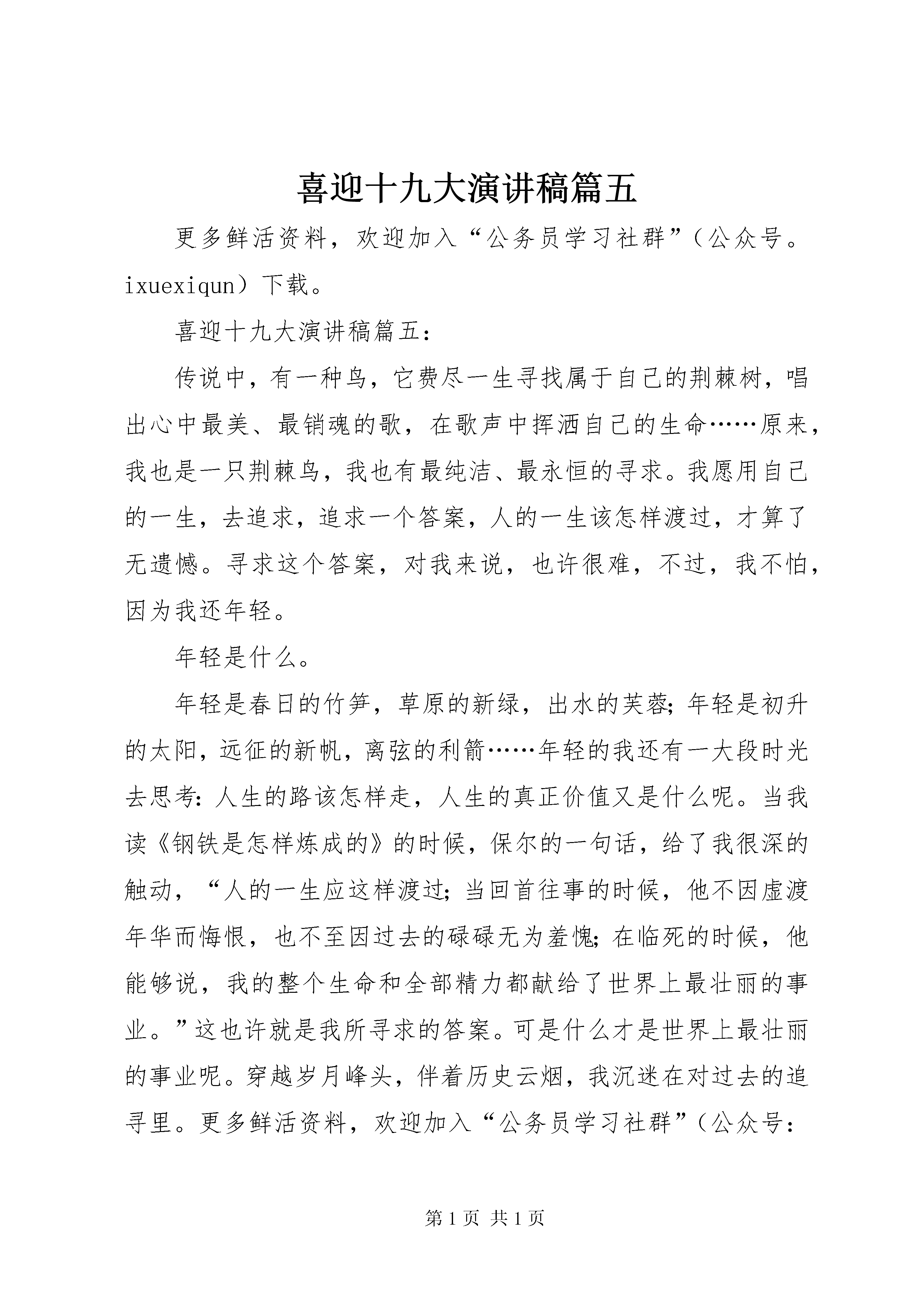 喜迎十九大演讲稿篇五更多鲜活资料,欢迎加入“公务员学习社群”(公众号。ixuexiqun)下载。喜迎十九大演讲稿篇五:传说中,有一种鸟,它费尽一生寻找属于自己的荆棘树,唱出心中最美、最销魂的歌,在歌声中挥洒自己的生命……原来,我也是一只荆棘鸟,我也有最纯洁、最永恒的寻求。我愿用自己的一生,去追求,追求一个答案,人的一生该怎样渡过,才算了无遗憾。寻求这个答案,对我来说,也许很难,不过,我不怕,因为我还年轻。年轻是什么。年轻是春日的竹笋,草原的新绿,出水的芙蓉;年轻是初升的太阳,远征的新帆,离弦的利箭……年轻的我还有一大段时光去思考:人生的路该怎样走,人生的真正价值又是什么呢。当我读《钢铁是怎样炼成的》的时候,保尔的一句话,给了我很深的触动,“人的一生应这样渡过;当回首往事的时候,他不因虚渡年华而悔恨,也不至因过去的碌碌无为羞愧;在临死的时候,他能够说,我的整个生命和全部精力都献给了世界上最壮丽的事业。”这也许就是我所寻求的答案。可是什么才是世界上最壮丽的事业呢。穿越岁月峰头,伴着历史云烟,我沉迷在对过去的追寻里。更多鲜活资料,欢迎加入“公务员学习社群”(公众号:ixuexiqun)下载。中国上下五千年,留下的灿烂文化让我为之骄傲。思绪飘过唐明清,来到xx0世纪初那个纷争的年代,我仿佛听到山河在咆哮,大地在哭泣,华夏儿女在苦苦挣扎,在大声地呼喊,长夜漫漫,路在何方。路在何方。19xx1年的一个夏日,中国共产党诞生了,犹如一道曙光划破黑暗的长空。在中华民族生死存亡的紧急关头,它挺身而出,带领着千百万革命志士,用燎原的星火唤醒了四万万劳苦大众,历经28年艰苦卓绝的斗争,用鲜血和生命赢得了中国革命的伟大胜利。天安门城楼上庄严的宣告响彻大江南北,整个世界都为之而震惊。此时我终于明白为什么有一首歌叫做《没有共产党就没有新中国》;我终于明白为什么飘扬的五星红旗是那么的鲜艳;我终于明白为什么那些影片中的英雄人物会因为一句“我是一名共产党员”而甘愿抛头颅、洒热血。这一刻,党在我心里是一座丰碑,是一个灯塔,是一面旗帜,让我敬仰、引我前行、促我奋进。无数共产党员凭着那份永恒的追求,凭着对祖国和人民的忠诚,为我们撑起了一片晴空。历史的清风,拂开阴霾,让阳光洒向大地,见证永恒;浩瀚的长河,载着历史和诉说从时间中流过,笑看风云荣辱不惊。19xx1年的那艘红船,载着无数革命先辈的革命理想,迎着历史的波涛,乘着时代的风帆,向我们一路走来。时间的车轮驶入xx1世纪,跨过xx1世纪的门槛,中国党迎来了xx周年华诞。回首xx年,弹指一挥间,伟大的中国共产党更多鲜活资料,欢迎加入“公务员学习社群”(公众号:ixuexiqun)下载。走过xx年的风雨历程。在这xx年里,我们在党的领导下战胜一个又一个困难,取得一个又一个胜利。党xx年的征程就是一部革命史,一部奋斗史,一部光荣史。xx年的风风雨雨,锻造了一个个顶天立地的共产党员。党员是党的活的细胞。党的先进性从党员身上集中体现出来。一名名党员,就是一面面鲜红的旗帜。这一面面旗帜,就代表党的魂。xx年的风风雨雨,留下的是不变的信仰和不懈的追求,党用行动诠释着对人民的庄严承诺“为人民服务”,让党旗永远飘扬在人民群众的心中。也让中国人民得出了永远跟党走的结论。永远跟党走,是中国人民历经xx8年的英勇奋斗得出的历史结论;永远跟党走,是中国人民在实现小康社会道路上得出的历史结论;永远跟党走,是中国人民在这今扬眉吐气的日子里得出的历史结论。身后是已逝的过去,向前是新展开的未来。我们的脚下,通向明天的路在朝着远方延伸。让我们迈着坚定的步伐,永远跟着党,永远向前走。