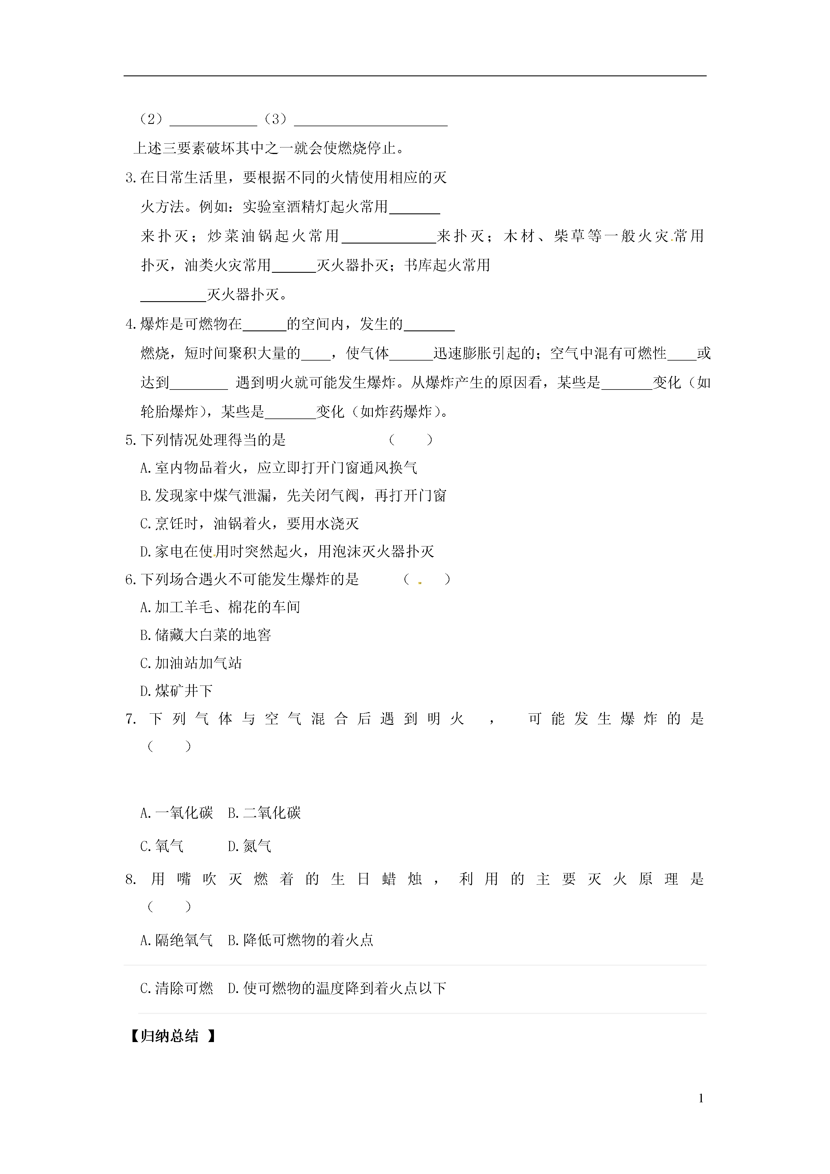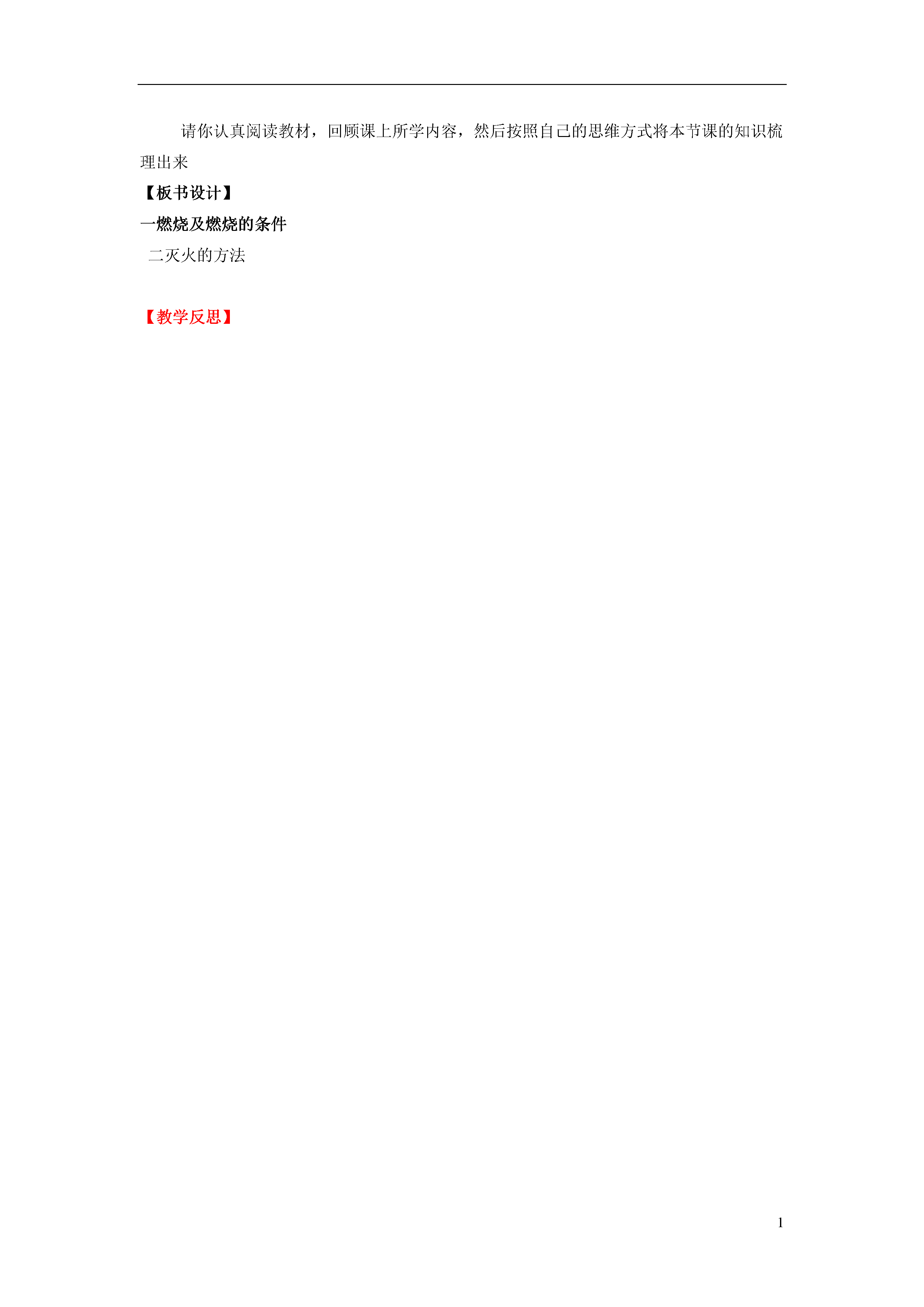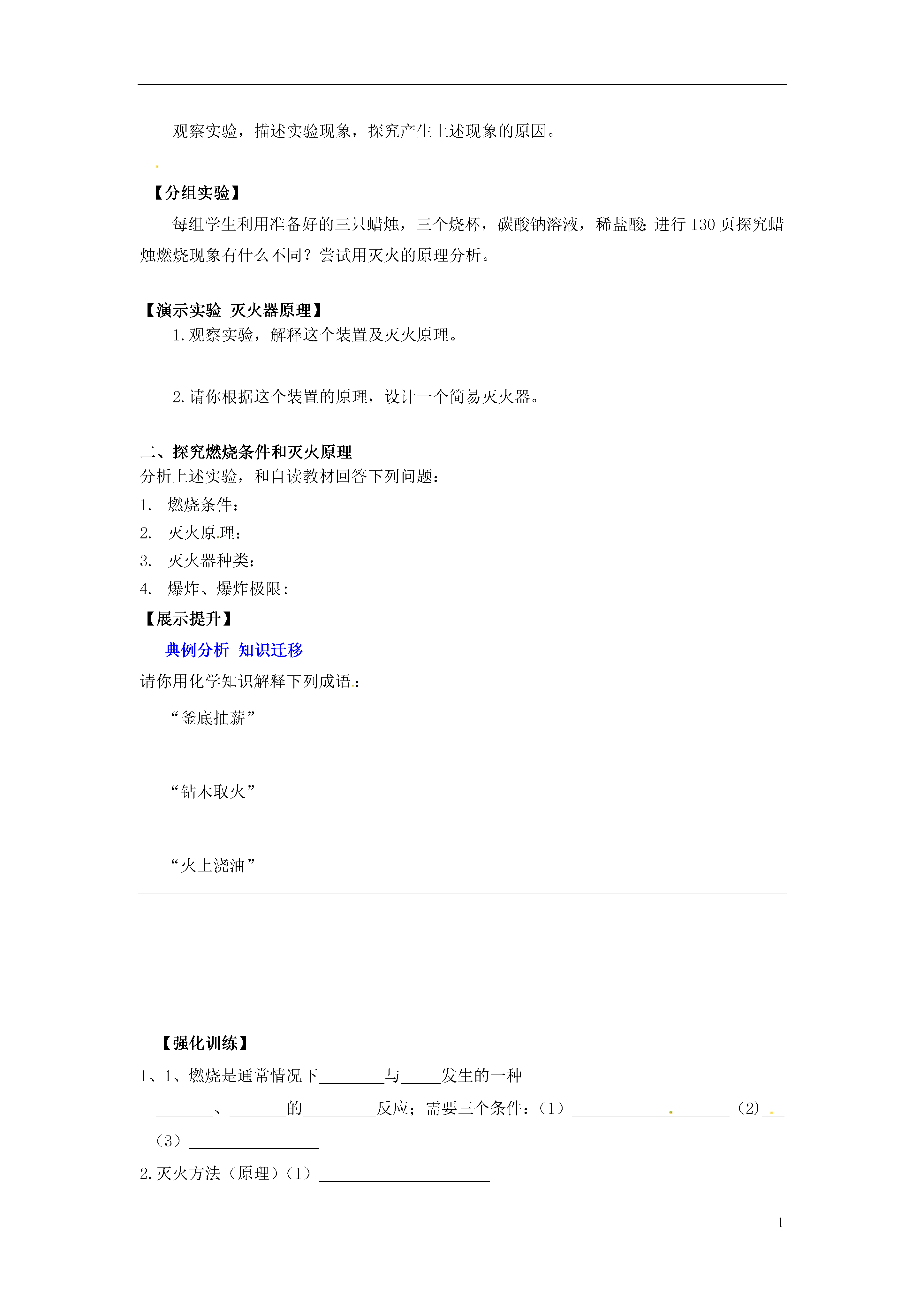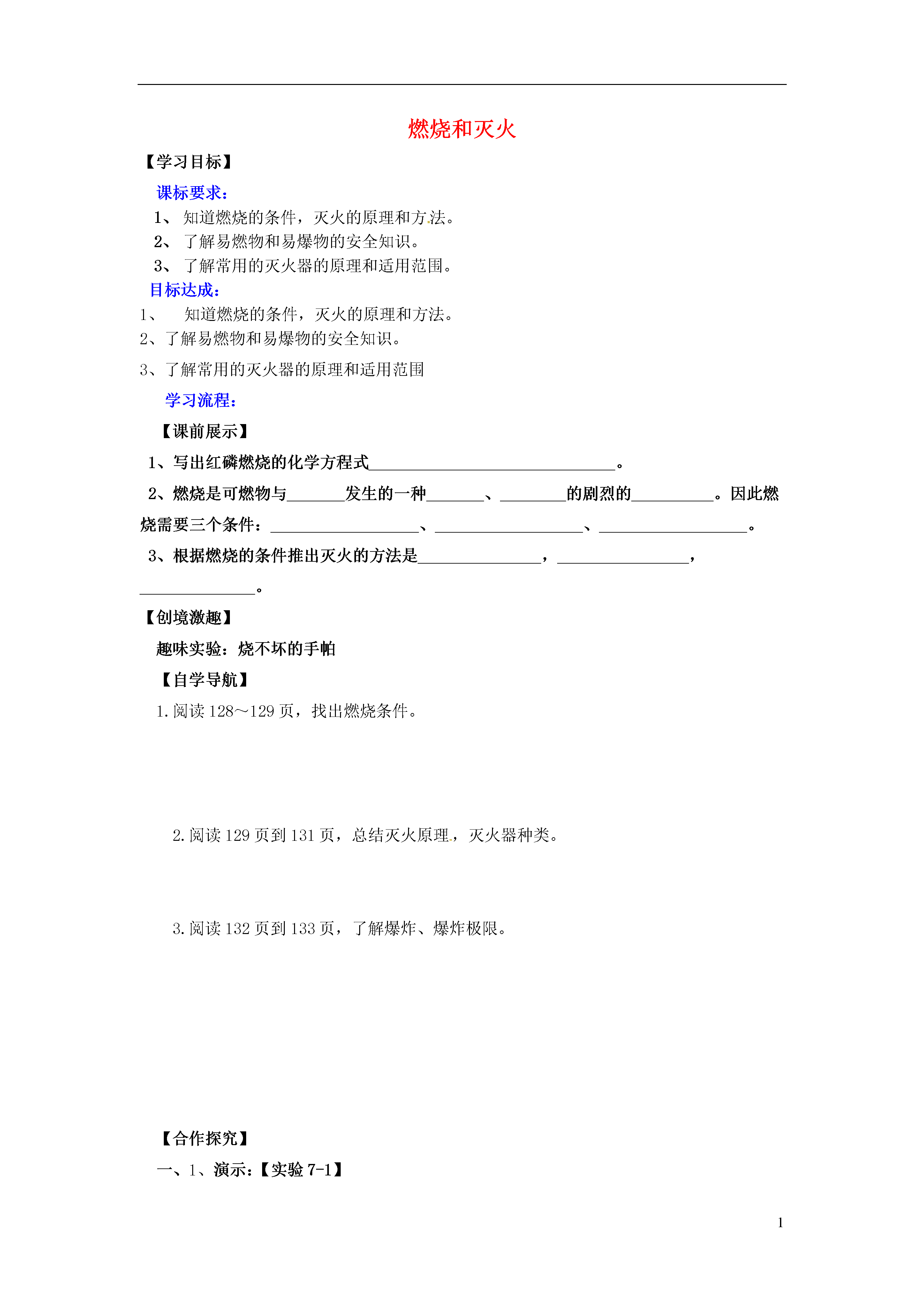 1燃烧和灭火【学习目标】课标要求:知道燃烧的条件,灭火的原理和方法。了解易燃物和易爆物的安全知识。了解常用的灭火器的原理和适用范围。目标达成:知道燃烧的条件,灭火的原理和方法。2、了解易燃物和易爆物的安全知识。3、了解常用的灭火器的原理和适用范围学习流程:【课前展示】1、写出红磷燃烧的化学方程式______________________________。2、燃烧是可燃物与_______发生的一种_______、________的剧烈的__________。因此燃烧需要三个条件:__________________、__________________、__________________。3、根据燃烧的条件推出灭火的方法是_______________,________________,______________。【创境激趣】趣味实验:烧不坏的手帕【自学导航】1.阅读128~129页,找出燃烧条件。2.阅读129页到131页,总结灭火原理,灭火器种类。3.阅读132页到133页,了解爆炸、爆炸极限。【合作探究】1、演示:【实验7-1】观察实验,描述实验现象,探究产生上述现象的原因。【分组实验】每组学生利用准备好的三只蜡烛,三个烧杯,碳酸钠溶液,稀盐酸;进行130页探究蜡烛燃烧现象有什么不同?尝试用灭火的原理分析。【演示实验灭火器原理】1.观察实验,解释这个装置及灭火原理。2.请你根据这个装置的原理,设计一个简易灭火器。二、探究燃烧条件和灭火原理分析上述实验,和自读教材回答下列问题:燃烧条件:灭火原理:灭火器种类:爆炸、爆炸极限:【展示提升】典例分析知识迁移请你用化学知识解释下列成语:“釜底抽薪”“钻木取火”“火上浇油”【强化训练】1、燃烧是通常情况下与发生的一种、的反应;需要三个条件:(1)(2)(3)灭火方法(原理)(1)(2)(3)上述三要素破坏其中之一就会使燃烧停止。在日常生活里,要根据不同的火情使用相应的灭火方法。例如:实验室酒精灯起火常用来扑灭;炒菜油锅起火常用来扑灭;木材、柴草等一般火灾常用扑灭,油类火灾常用灭火器扑灭;书库起火常用灭火器扑灭。爆炸是可燃物在的空间内,发生的燃烧,短时间聚积大量的,使气体迅速膨胀引起的;空气中混有可燃性或达到遇到明火就可能发生爆炸。从爆炸产生的原因看,某些是变化(如轮胎爆炸),某些是变化(如炸药爆炸)。下列情况处理得当的是()A.室内物品着火,应立即打开门窗通风换气B.发现家中煤气泄漏,先关闭气阀,再打开门窗C.烹饪时,油锅着火,要用水浇灭D.家电在使用时突然起火,用泡沫灭火器扑灭下列场合遇火不可能发生爆炸的是()A.加工羊毛、棉花的车间B.储藏大白菜的地窖C.加油站加气站D.煤矿井下7.下列气体与空气混合后遇到明火,可能发生爆炸的是()A.一氧化碳B.二氧化碳C.氧气D.氮气8.用嘴吹灭燃着的生日蜡烛,利用的主要灭火原理是()A.隔绝氧气B.降低可燃物的着火点C.清除可燃D.使可燃物的温度降到着火点以下【归纳总结】请你认真阅读教材,回顾课上所学内容,然后按照自己的思维方式将本节课的知识梳理出来【板书设计】一燃烧及燃烧的条件二灭火的方法【教学反思】