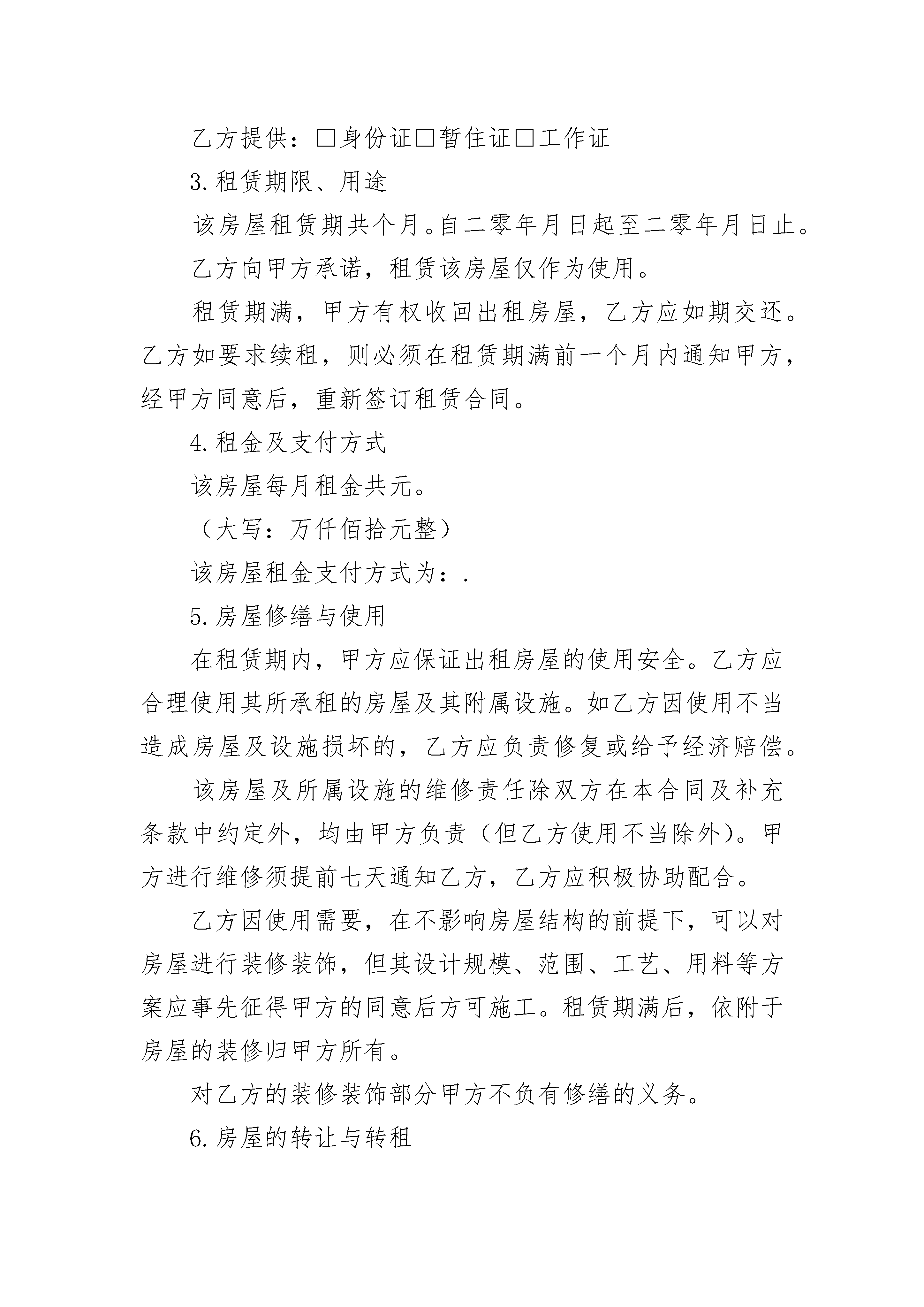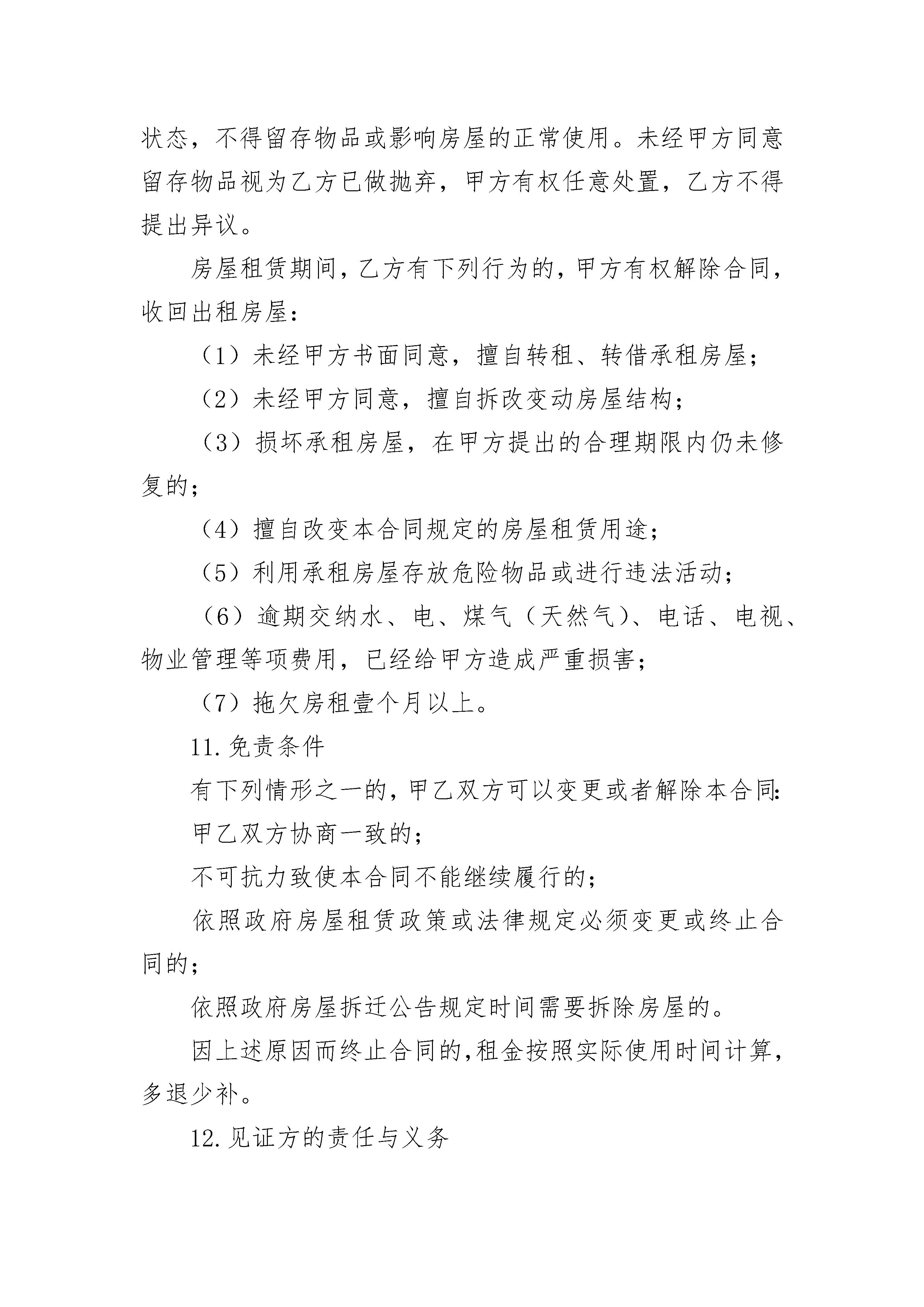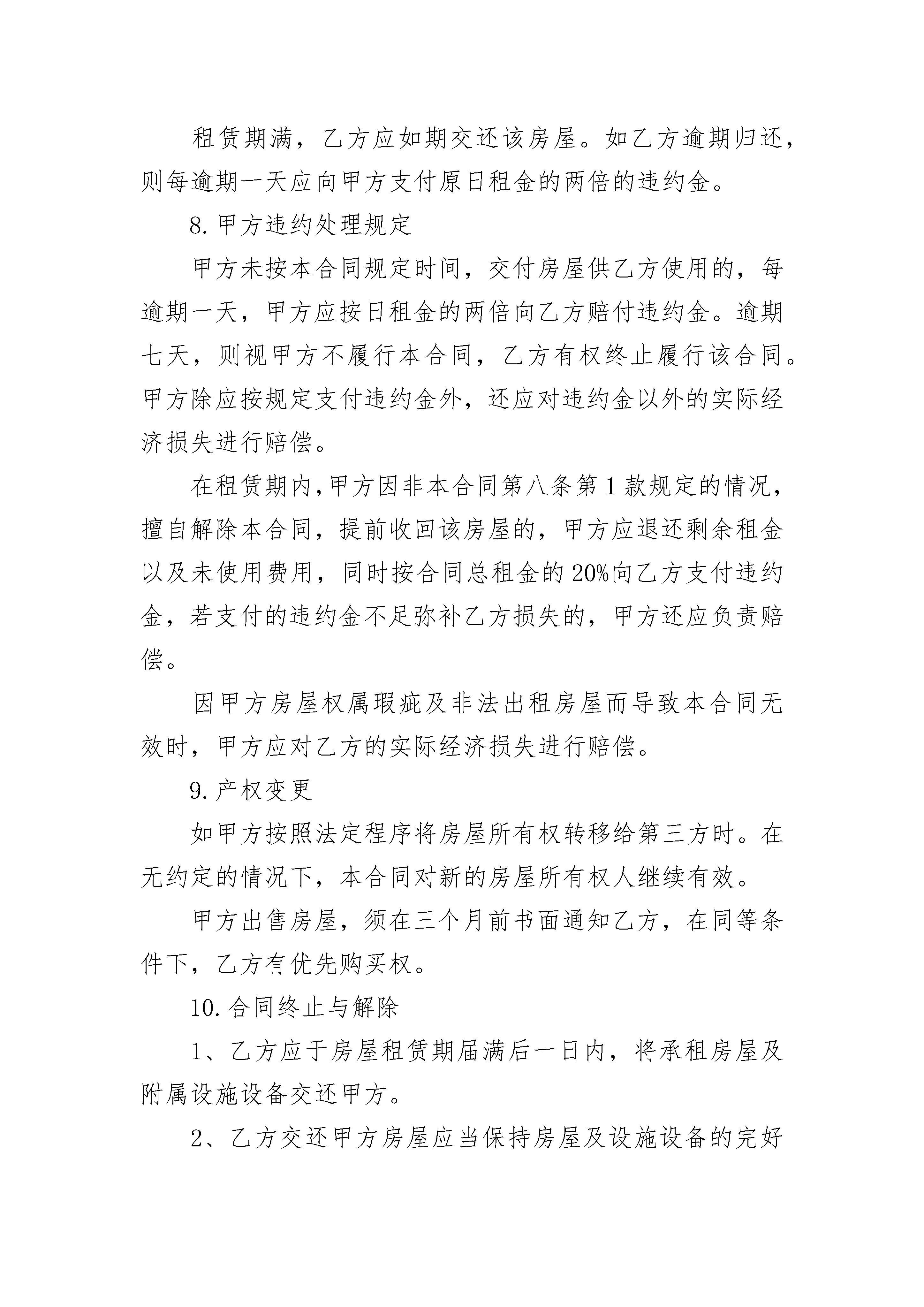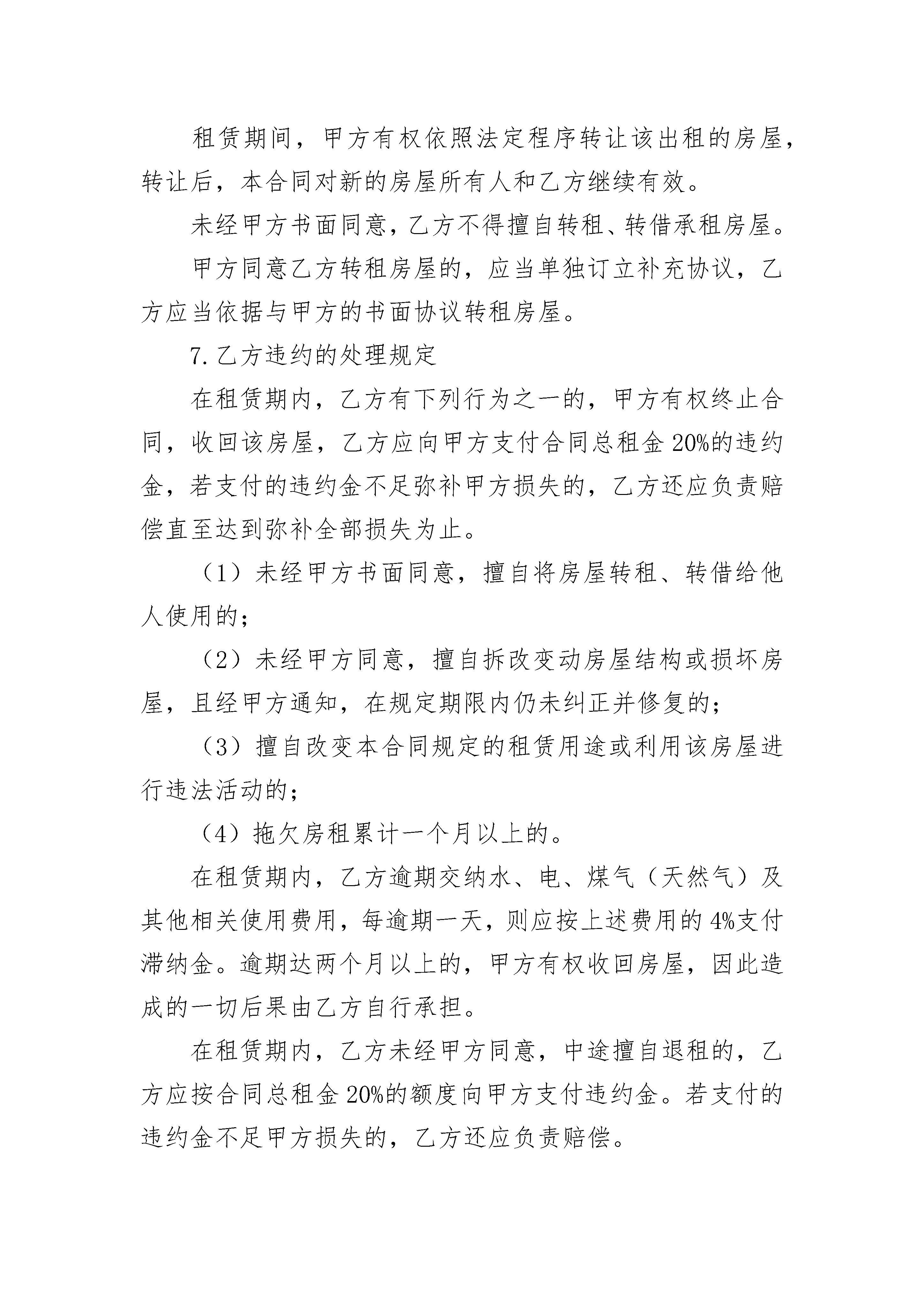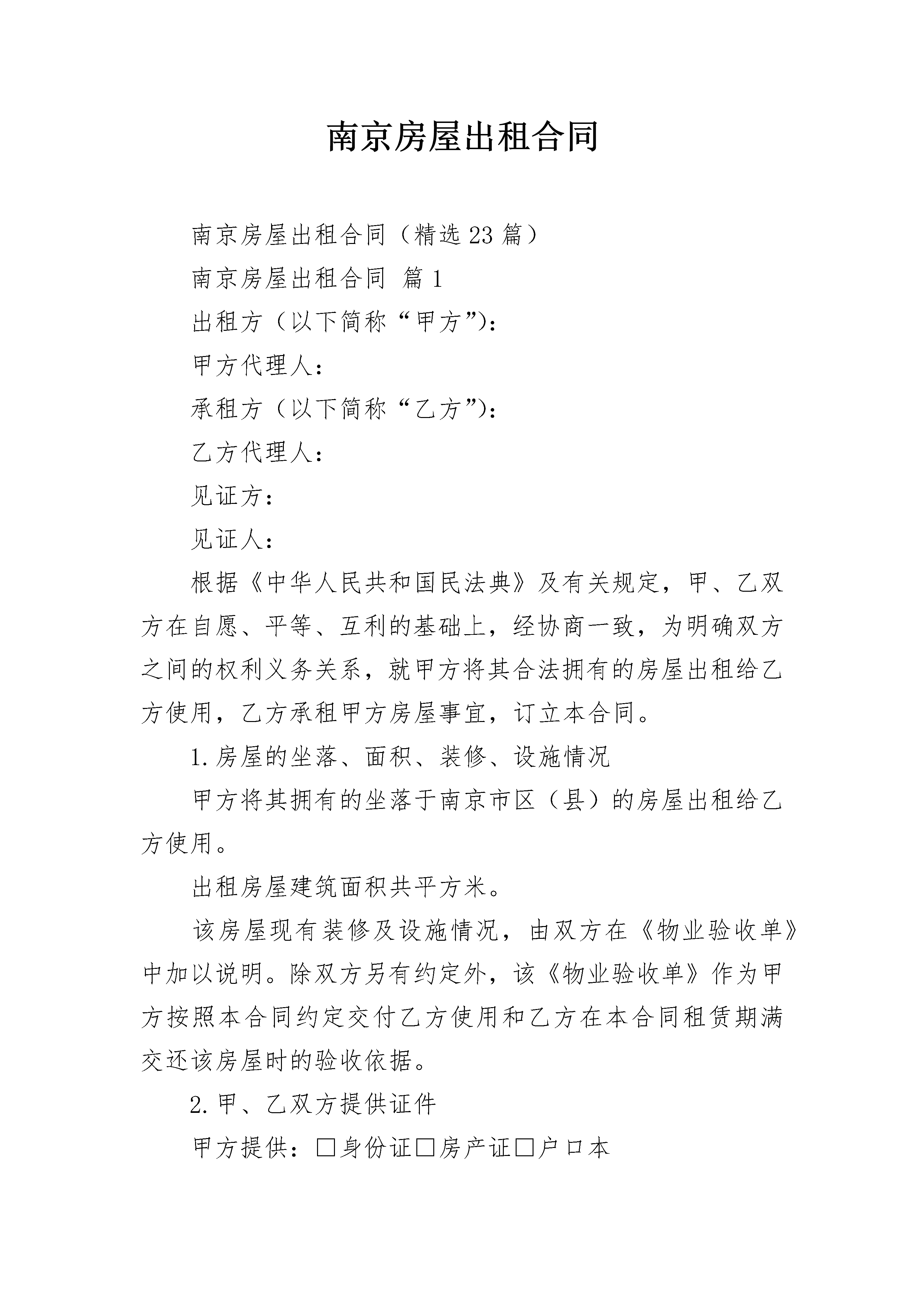南京房屋出租合同南京房屋出租合同(精选23篇)南京房屋出租合同篇1出租方(以下简称“甲方”):甲方代理人:承租方(以下简称“乙方”):乙方代理人:见证方:见证人:根据《中华人民共和国民法典》及有关规定,甲、乙双方在自愿、平等、互利的基础上,经协商一致,为明确双方之间的权利义务关系,就甲方将其合法拥有的房屋出租给乙方使用,乙方承租甲方房屋事宜,订立本合同。1.房屋的坐落、面积、装修、设施情况甲方将其拥有的坐落于南京市区(县)的房屋出租给乙方使用。出租房屋建筑面积共平方米。该房屋现有装修及设施情况,由双方在《物业验收单》中加以说明。除双方另有约定外,该《物业验收单》作为甲方按照本合同约定交付乙方使用和乙方在本合同租赁期满交还该房屋时的验收依据。2.甲、乙双方提供证件甲方提供:□身份证□房产证□户口本乙方提供:□身份证□暂住证□工作证3.租赁期限、用途该房屋租赁期共个月。自二零年月日起至二零年月日止。乙方向甲方承诺,租赁该房屋仅作为使用。租赁期满,甲方有权收回出租房屋,乙方应如期交还。乙方如要求续租,则必须在租赁期满前一个月内通知甲方,经甲方同意后,重新签订租赁合同。4.租金及支付方式该房屋每月租金共元。(大写:万仟佰拾元整)该房屋租金支付方式为:.5.房屋修缮与使用在租赁期内,甲方应保证出租房屋的使用安全。乙方应合理使用其所承租的房屋及其附属设施。如乙方因使用不当造成房屋及设施损坏的,乙方应负责修复或给予经济赔偿。该房屋及所属设施的维修责任除双方在本合同及补充条款中约定外,均由甲方负责(但乙方使用不当除外)。甲方进行维修须提前七天通知乙方,乙方应积极协助配合。乙方因使用需要,在不影响房屋结构的前提下,可以对房屋进行装修装饰,但其设计规模、范围、工艺、用料等方案应事先征得甲方的同意后方可施工。租赁期满后,依附于房屋的装修归甲方所有。对乙方的装修装饰部分甲方不负有修缮的义务。6.房屋的转让与转租租赁期间,甲方有权依照法定程序转让该出租的房屋,转让后,本合同对新的房屋所有人和乙方继续有效。未经甲方书面同意,乙方不得擅自转租、转借承租房屋。甲方同意乙方转租房屋的,应当单独订立补充协议,乙方应当依据与甲方的书面协议转租房屋。7.乙方违约的处理规定在租赁期内,乙方有下列行为之一的,甲方有权终止合同,收回该房屋,乙方应向甲方支付合同总租金20%的违约金,若支付的违约金不足弥补甲方损失的,乙方还应负责赔偿直至达到弥补全部损失为止。(1)未经甲方书面同意,擅自将房屋转租、转借给他人使用的;(2)未经甲方同意,擅自拆改变动房屋结构或损坏房屋,且经甲方通知,在规定期限内仍未纠正并修复的;(3)擅自改变本合同规定的租赁用途或利用该房屋进行违法活动的;(4)拖欠房租累计一个月以上的。在租赁期内,乙方逾期交纳水、电、煤气(天然气)及其他相关使用费用,每逾期一天,则应按上述费用的4%支付滞纳金。逾期达两个月以上的,甲方有权收回房屋,因此造成的一切后果由乙方自行承担。在租赁期内,乙方未经甲方同意,中途擅自退租的,乙方应按合同总租金20%的额度向甲方支付违约金。若支付的违约金不足甲方损失的,乙方还应负责赔偿。租赁期满,乙方应如期交还该房屋。如乙方逾期归还,则每逾期一天应向甲方支付原日租金的两倍的违约金。8.甲方违约处理规定甲方未按本合同规定时间,交付房屋供乙方使用的,每逾期一天,甲方应按日租金的两倍向乙方赔付违约金。逾期七天,则视甲方不履行本合同,乙方有权终止履行该合同。甲方除应按规定支付违约金外,还应对违约金以外的实际经济损失进行赔偿。在租赁期内,甲方因非本合同第八条第1款规定的情况,擅自解除本合同,提前收回该房屋的,甲方应退还剩余租金以及未使用费用,同时按合同总租金的20%向乙方支付违约金,若支付的违约金不足弥补乙方损失的,甲方还应负责赔偿。因甲方房屋权属瑕疵及非法出租房屋而导致本合同无效时,甲方应对乙方的实际经济损失进行赔偿。9.产权变更如甲方按照法定程序将房屋所有权转移给第三方时。在无约定的情况下,本合同对新的房屋所有权人继续有效。甲方出售房屋,须在三个月前书面通知乙方,在同等条件下,乙方有优先购买权。10.合同终止与解除1、乙方应于房屋租赁期届满后一日内,将承租房屋及附属设施设备交还甲方。2、乙方交还甲方房屋应当保持房屋及设施设备的完好状态,不得留存物品或影响房屋的正常使用。未经甲方同意留存物品视为乙方已做抛弃,甲方有权任意处置,乙方不得提出异议。房屋租赁期间,乙方有下列行为的,甲方有权解除合同,收回出租房屋:(1)未经甲方书面同意,擅自转租、转借承租房屋;(2)未经甲方同意,擅自拆改变动房屋结构;(3)损坏承租房屋,在甲方提出的合理期限内仍未修复的;(4)擅自改变本合同规定的房屋租赁用途;(5)利用承租房屋存放危险物品或进行违法活动;(6)逾期交纳