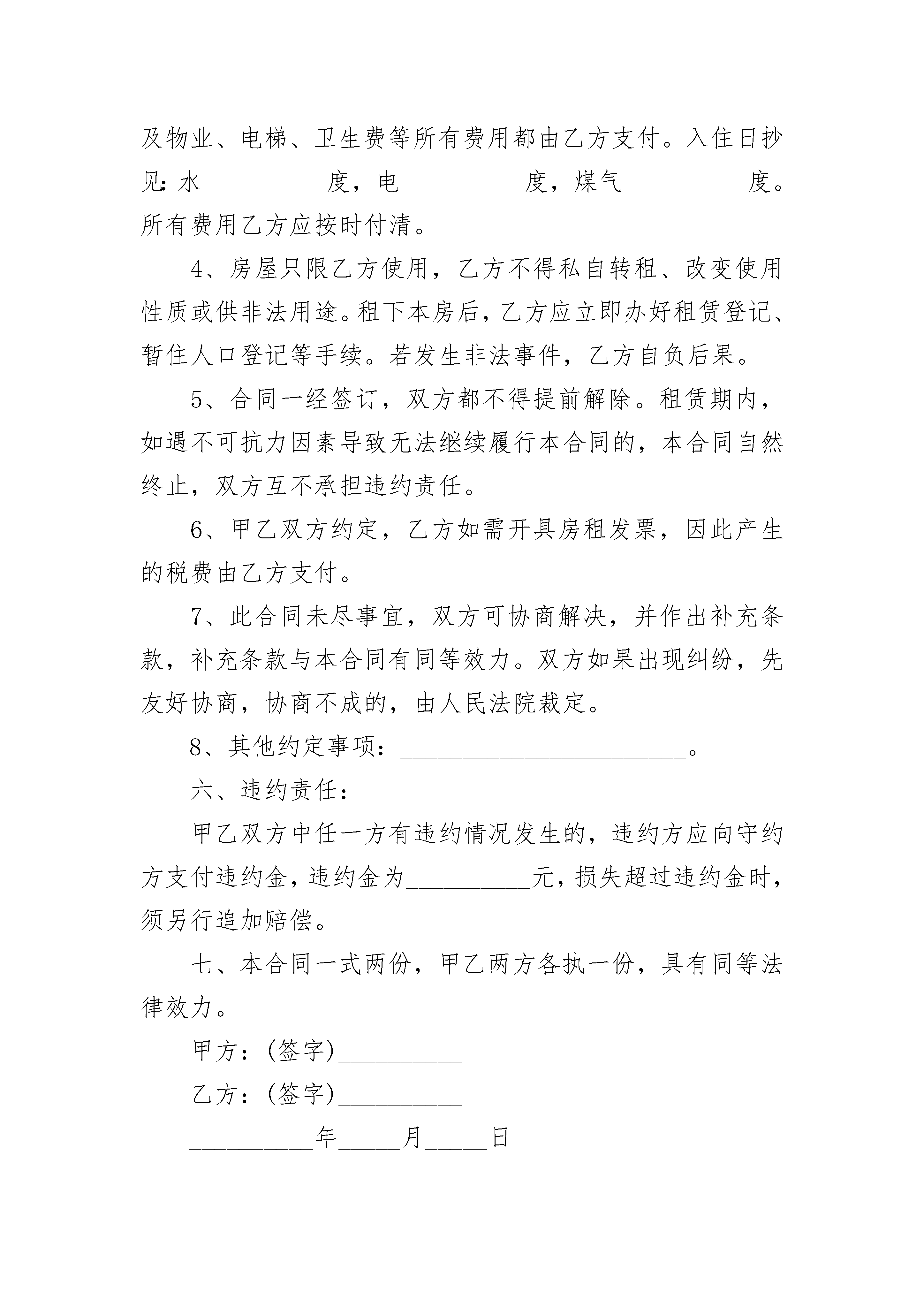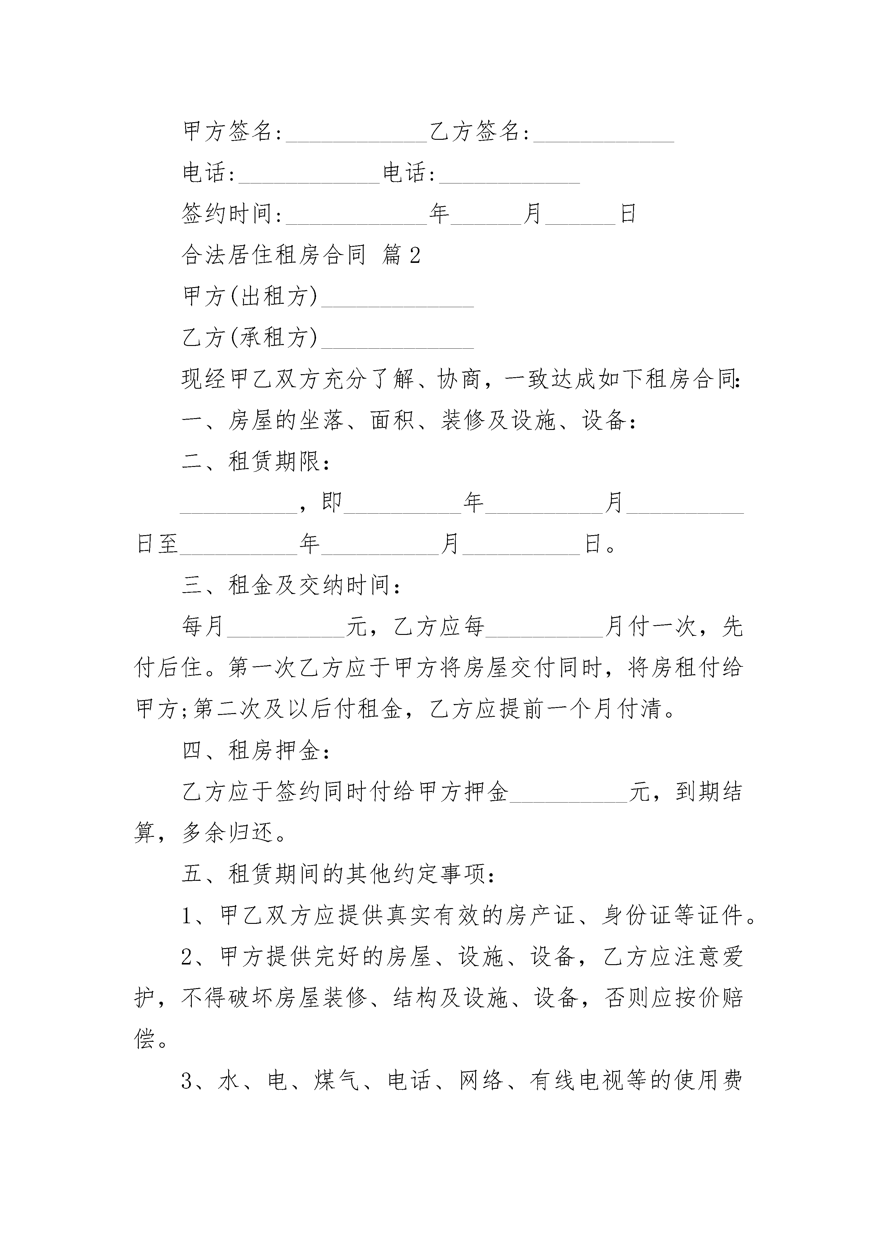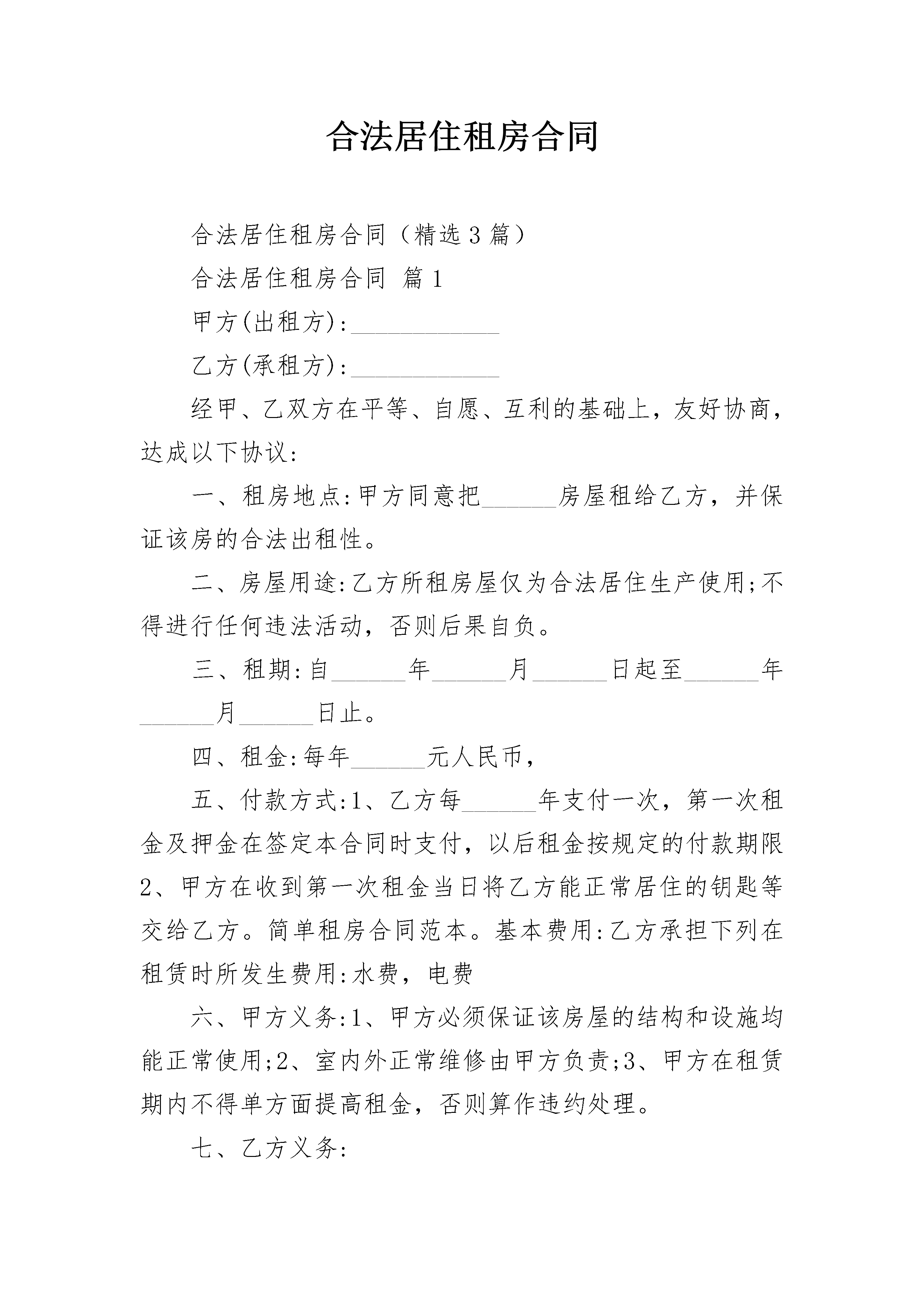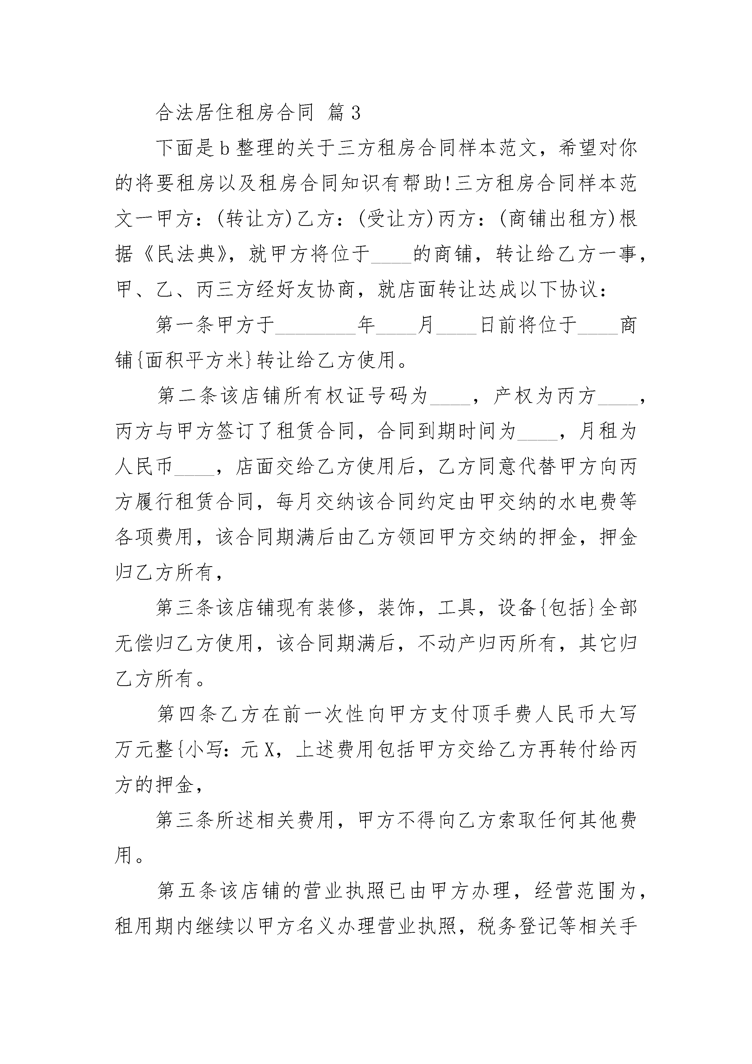 合法居住租房合同合法居住租房合同(精选3篇)合法居住租房合同篇1甲方(出租方):____________乙方(承租方):____________经甲、乙双方在平等、自愿、互利的基础上,友好协商,达成以下协议:一、租房地点:甲方同意把______房屋租给乙方,并保证该房的合法出租性。二、房屋用途:乙方所租房屋仅为合法居住生产使用;不得进行任何违法活动,否则后果自负。三、租期:自______年______月______日起至______年______月______日止。四、租金:每年______元人民币,五、付款方式:1、乙方每______年支付一次,第一次租金及押金在签定本合同时支付,以后租金按规定的付款期限2、甲方在收到第一次租金当日将乙方能正常居住的钥匙等交给乙方。简单租房合同范本。基本费用:乙方承担下列在租赁时所发生费用:水费,电费六、甲方义务:1、甲方必须保证该房屋的结构和设施均能正常使用;2、室内外正常维修由甲方负责;3、甲方在租赁期内不得单方面提高租金,否则算作违约处理。七、乙方义务:1、按照本合同规定的时间和方式支付租金、保证金及其它费用;2、未经甲方同意,乙方不得私自把该房的部分或全部转租他人;3、本合同终止时,需对甲方提供的设施进行清点、检查移交,如有损坏、短缺应照值或酌情赔偿;4、乙方如因使用不当损坏房屋及设施的,应负责修复原状或予以经济赔偿。若水、电、煤气等使用不当或人为造成的人身伤亡和意外事故,与房东无关,后果自负八、违约处理:1、如乙方违反本合同第七条,甲方有权终止合同,收回房屋,没收剩余房款和押金,如不足低过甲方损失,乙方应予以赔偿;2、如甲方违反本合同第六条,应按照一个月租金向乙方支付违约金,并退回剩余房款及保证金;3如租赁未满,如任何一方违反合同,必须向对方交纳六个月租金作为违约金。九、租赁期限内,乙方未经甲方同意不得擅自改变房屋结构设施。十、如因洪水、地震、火灾、拆迁和法律法规政府政策变化等不可抗力原因,导致本协议不能全面履行,甲、乙互不承担违约责任。租金按实际租赁时间计算,多退少补。十一、本合同一式两份,甲、乙双方各执一份,每份均具有同等法律效力。简单租房合同范本。甲方签名:____________乙方签名:____________电话:____________电话:____________签约时间:____________年______月______日合法居住租房合同篇2甲方(出租方)_____________乙方(承租方)_____________现经甲乙双方充分了解、协商,一致达成如下租房合同:一、房屋的坐落、面积、装修及设施、设备:二、租赁期限:__________,即__________年__________月__________日至__________年__________月__________日。三、租金及交纳时间:每月__________元,乙方应每__________月付一次,先付后住。第一次乙方应于甲方将房屋交付同时,将房租付给甲方;第二次及以后付租金,乙方应提前一个月付清。四、租房押金:乙方应于签约同时付给甲方押金__________元,到期结算,多余归还。五、租赁期间的其他约定事项:1、甲乙双方应提供真实有效的房产证、身份证等证件。2、甲方提供完好的房屋、设施、设备,乙方应注意爱护,不得破坏房屋装修、结构及设施、设备,否则应按价赔偿。3、水、电、煤气、电话、网络、有线电视等的使用费及物业、电梯、卫生费等所有费用都由乙方支付。入住日抄见:水__________度,电__________度,煤气__________度。所有费用乙方应按时付清。4、房屋只限乙方使用,乙方不得私自转租、改变使用性质或供非法用途。租下本房后,乙方应立即办好租赁登记、暂住人口登记等手续。若发生非法事件,乙方自负后果。5、合同一经签订,双方都不得提前解除。租赁期内,如遇不可抗力因素导致无法继续履行本合同的,本合同自然终止,双方互不承担违约责任。6、甲乙双方约定,乙方如需开具房租发票,因此产生的税费由乙方支付。7、此合同未尽事宜,双方可协商解决,并作出补充条款,补充条款与本合同有同等效力。双方如果出现纠纷,先友好协商,协商不成的,由人民法院裁定。8、其他约定事项:_______________________。六、违约责任:甲乙双方中任一方有违约情况发生的,违约方应向守约方支付违约金,违约金为__________元,损失超过违约金时,须另行追加赔偿。七、本合同一式两份,甲乙两方各执一份,具有同等法律效力。甲方:(签字)__________乙方:(签字)____________________年_____月_____日合法居住租房合同篇3下面是b整理的关于三方租房合同样本范文,希望对你的将要租房以及租