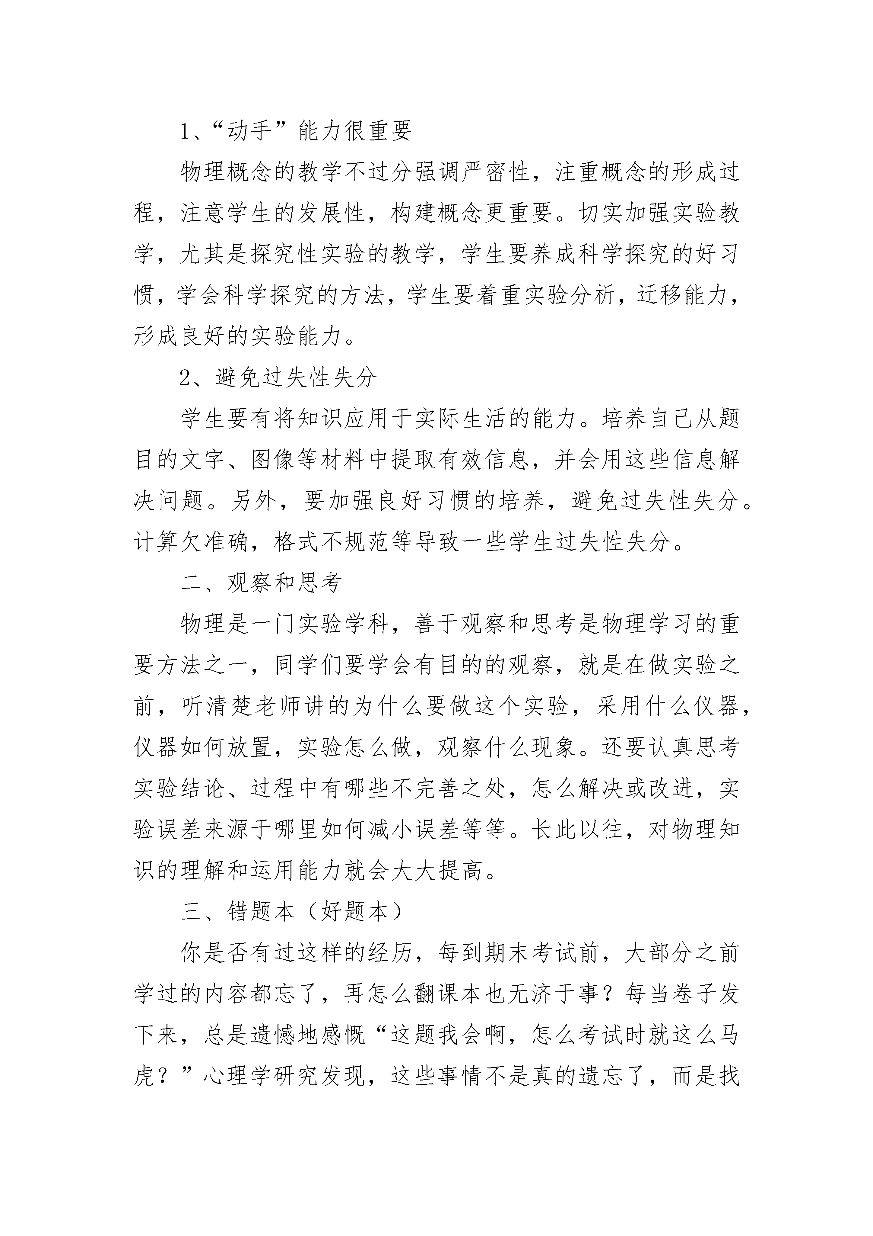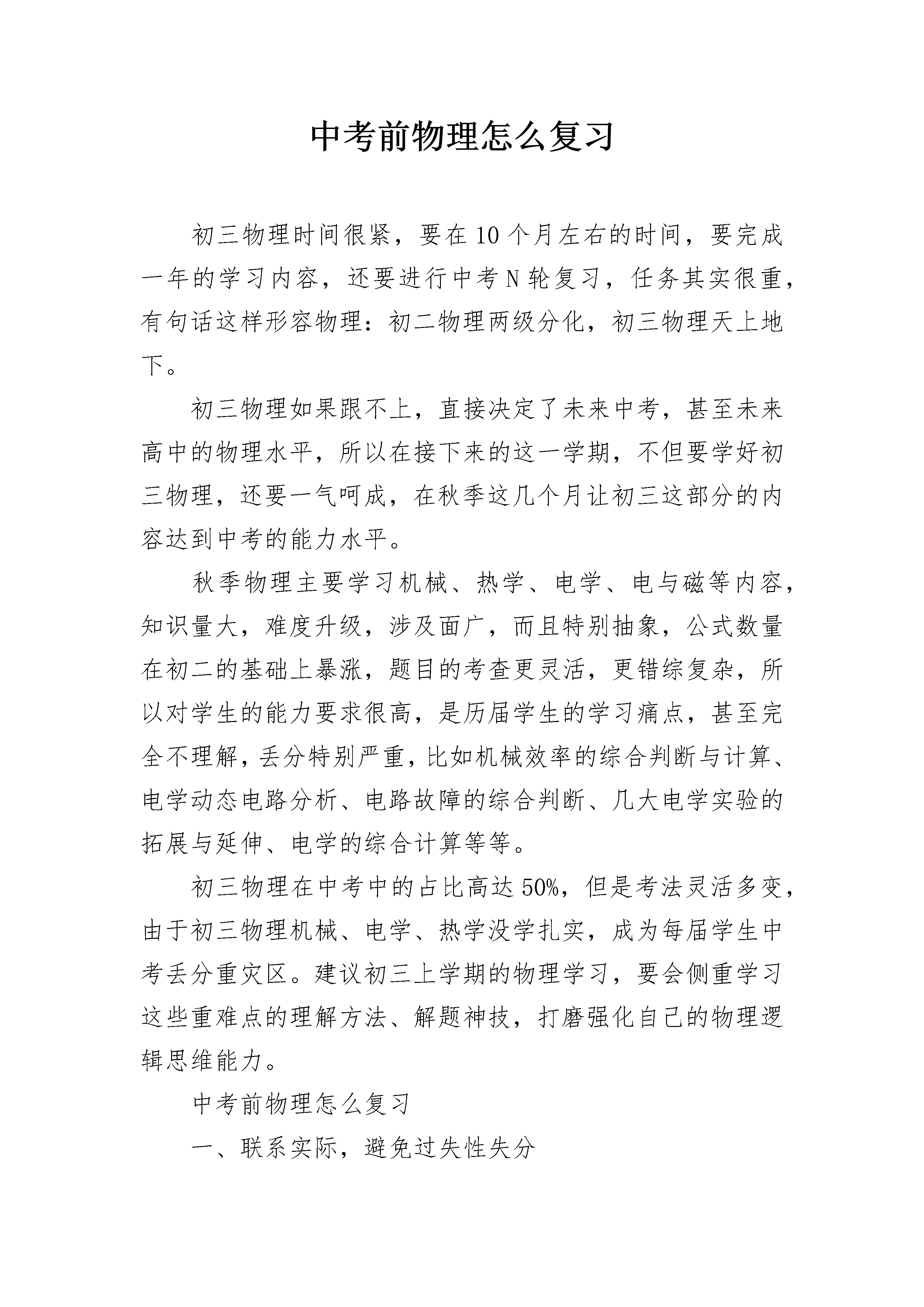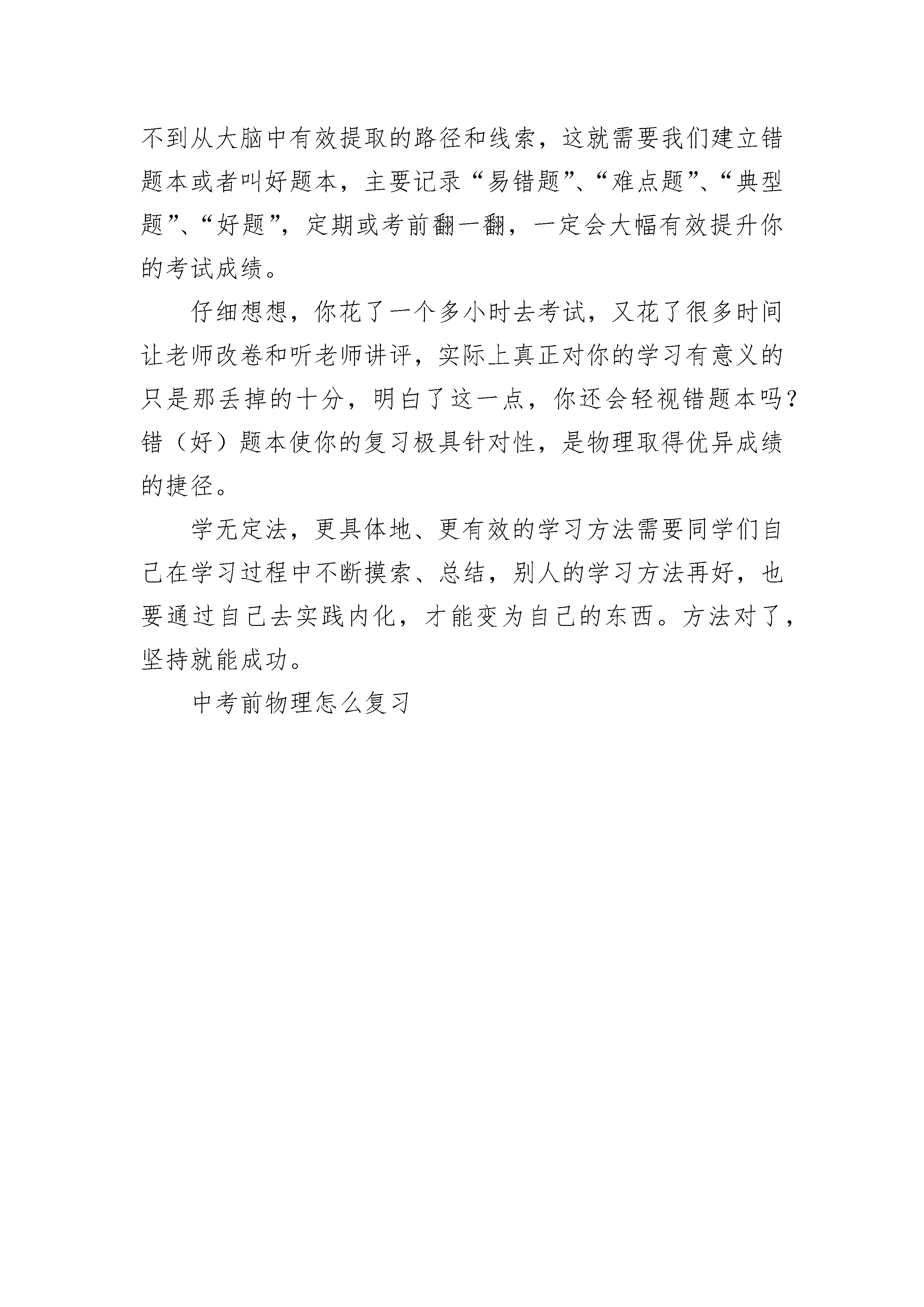 中考前物理怎么复习初三物理时间很紧,要在10个月左右的时间,要完成一年的学习内容,还要进行中考N轮复习,任务其实很重,有句话这样形容物理:初二物理两级分化,初三物理天上地下。初三物理如果跟不上,直接决定了未来中考,甚至未来高中的物理水平,所以在接下来的这一学期,不但要学好初三物理,还要一气呵成,在秋季这几个月让初三这部分的内容达到中考的能力水平。秋季物理主要学习机械、热学、电学、电与磁等内容,知识量大,难度升级,涉及面广,而且特别抽象,公式数量在初二的基础上暴涨,题目的考查更灵活,更错综复杂,所以对学生的能力要求很高,是历届学生的学习痛点,甚至完全不理解,丢分特别严重,比如机械效率的综合判断与计算、电学动态电路分析、电路故障的综合判断、几大电学实验的拓展与延伸、电学的综合计算等等。初三物理在中考中的占比高达50%,但是考法灵活多变,由于初三物理机械、电学、热学没学扎实,成为每届学生中考丢分重灾区。建议初三上学期的物理学习,要会侧重学习这些重难点的理解方法、解题神技,打磨强化自己的物理逻辑思维能力。中考前物理怎么复习一、联系实际,避免过失性失分1、“动手”能力很重要物理概念的教学不过分强调严密性,注重概念的形成过程,注意学生的发展性,构建概念更重要。切实加强实验教学,尤其是探究性实验的教学,学生要养成科学探究的好习惯,学会科学探究的方法,学生要着重实验分析,迁移能力,形成良好的实验能力。2、避免过失性失分学生要有将知识应用于实际生活的能力。培养自己从题目的文字、图像等材料中提取有效信息,并会用这些信息解决问题。另外,要加强良好习惯的培养,避免过失性失分。计算欠准确,格式不规范等导致一些学生过失性失分。二、观察和思考物理是一门实验学科,善于观察和思考是物理学习的重要方法之一,同学们要学会有目的的观察,就是在做实验之前,听清楚老师讲的为什么要做这个实验,采用什么仪器,仪器如何放置,实验怎么做,观察什么现象。还要认真思考实验结论、过程中有哪些不完善之处,怎么解决或改进,实验误差来源于哪里如何减小误差等等。长此以往,对物理知识的理解和运用能力就会大大提高。三、错题本(好题本)你是否有过这样的经历,每到期末考试前,大部分之前学过的内容都忘了,再怎么翻课本也无济于事?每当卷子发下来,总是遗憾地感慨“这题我会啊,怎么考试时就这么马虎?”心理学研究发现,这些事情不是真的遗忘了,而是找不到从大脑中有效提取的路径和线索,这就需要我们建立错题本或者叫好题本,主要记录“易错题”、“难点题”、“典型题”、“好题”,定期或考前翻一翻,一定会大幅有效提升你的考试成绩。仔细想想,你花了一个多小时去考试,又花了很多时间让老师改卷和听老师讲评,实际上真正对你的学习有意义的只是那丢掉的十分,明白了这一点,你还会轻视错题本吗?错(好)题本使你的复习极具针对性,是物理取得优异成绩的捷径。学无定法,更具体地、更有效的学习方法需要同学们自己在学习过程中不断摸索、总结,别人的学习方法再好,也要通过自己去实践内化,才能变为自己的东西。方法对了,坚持就能成功。中考前物理怎么复习
