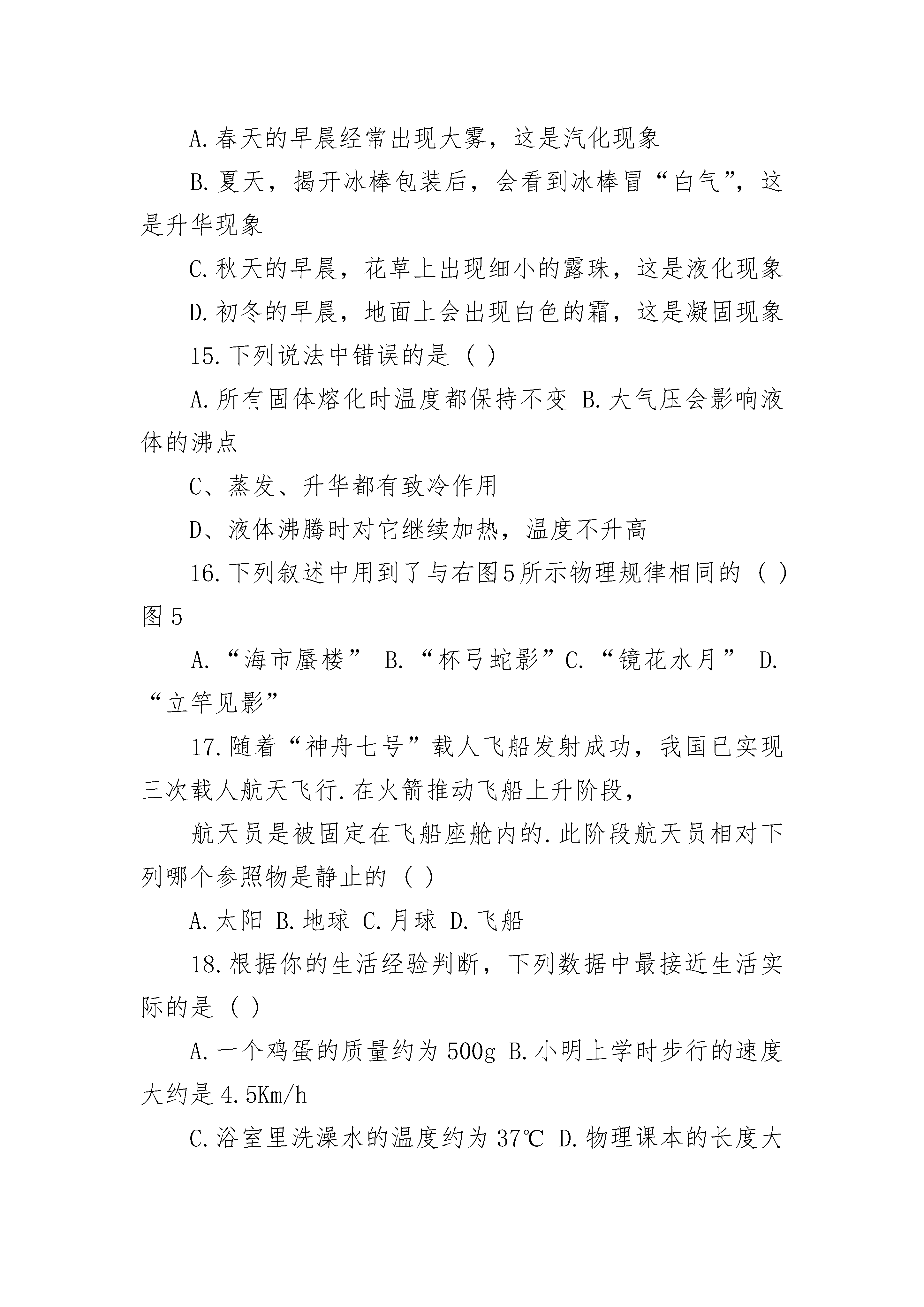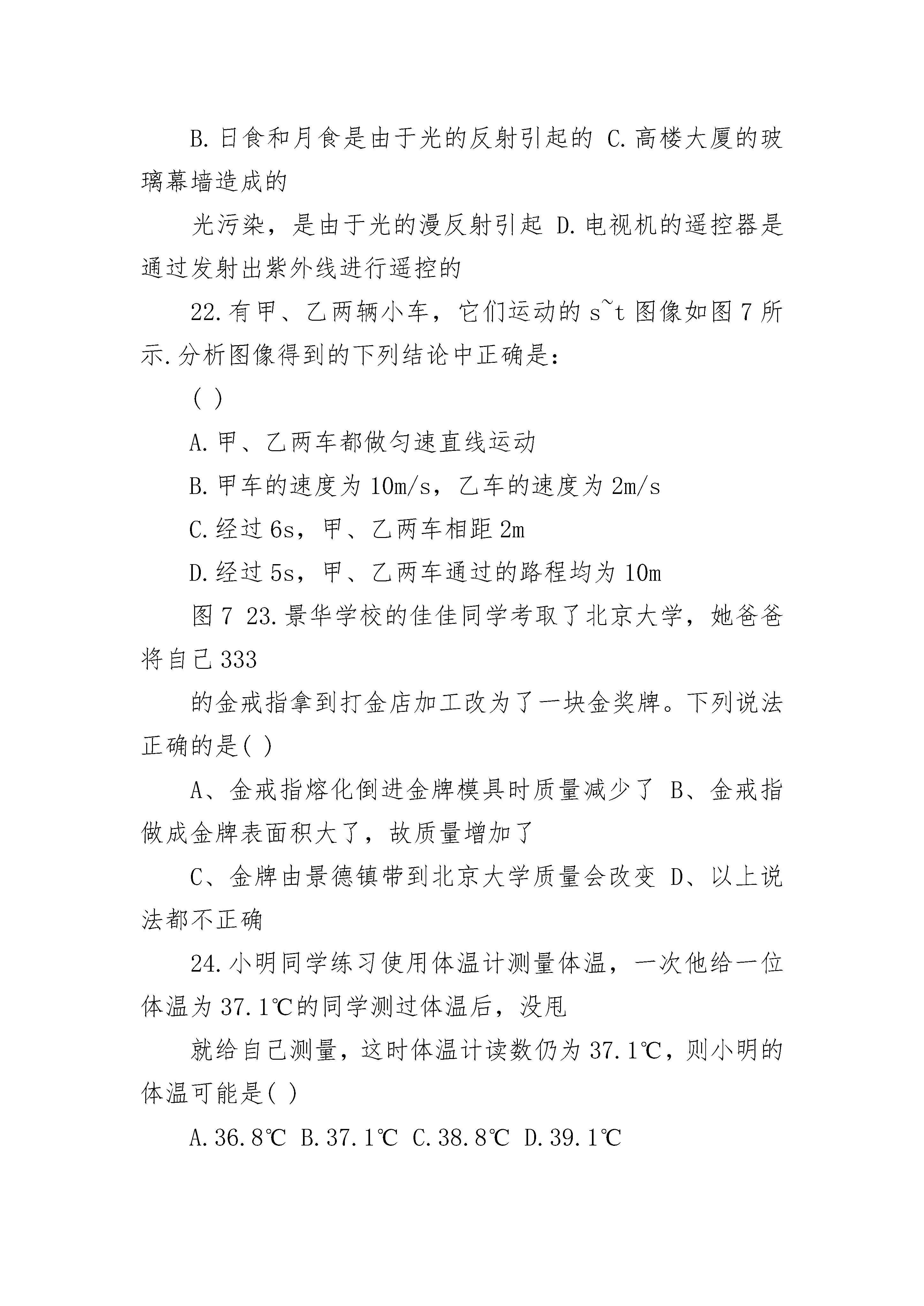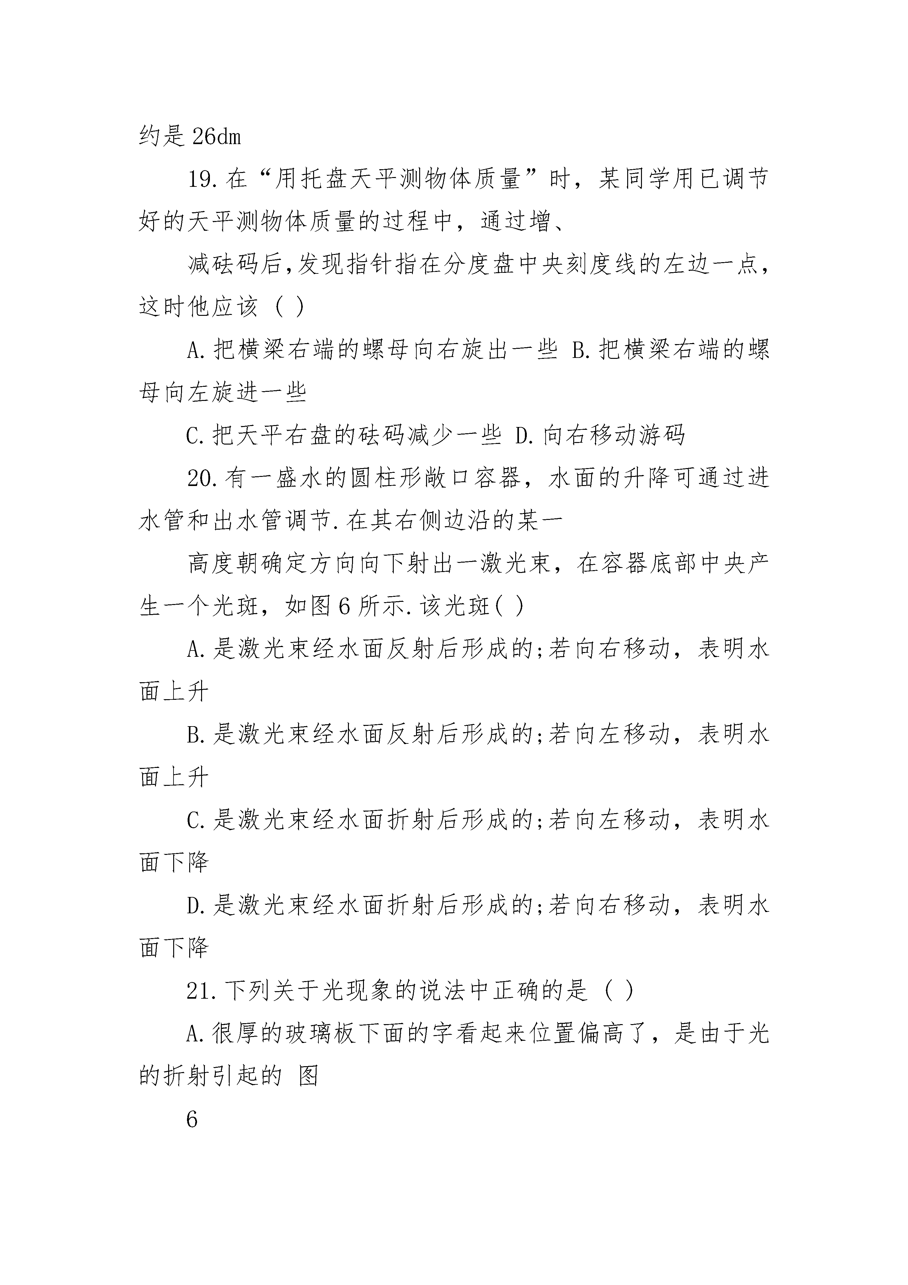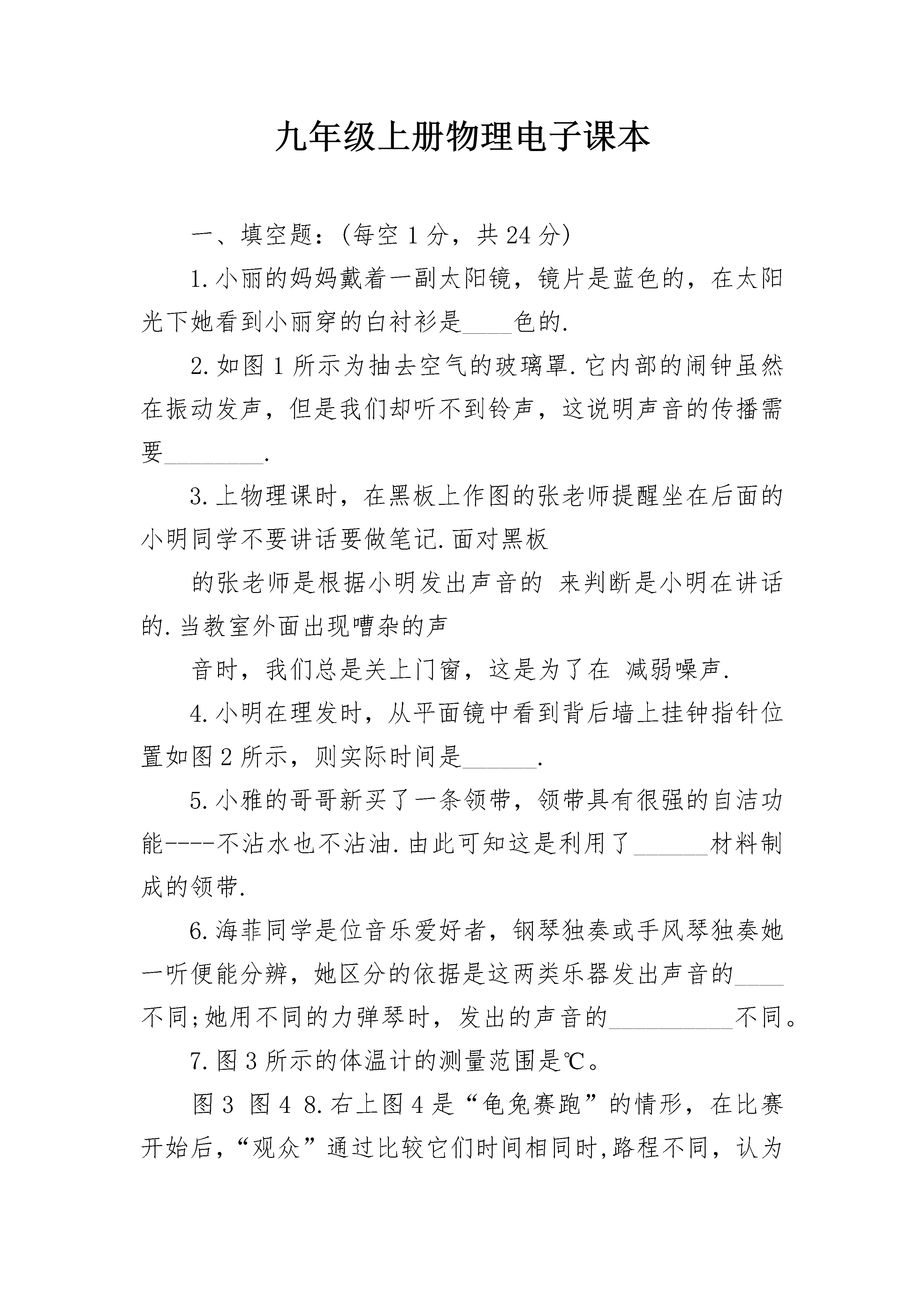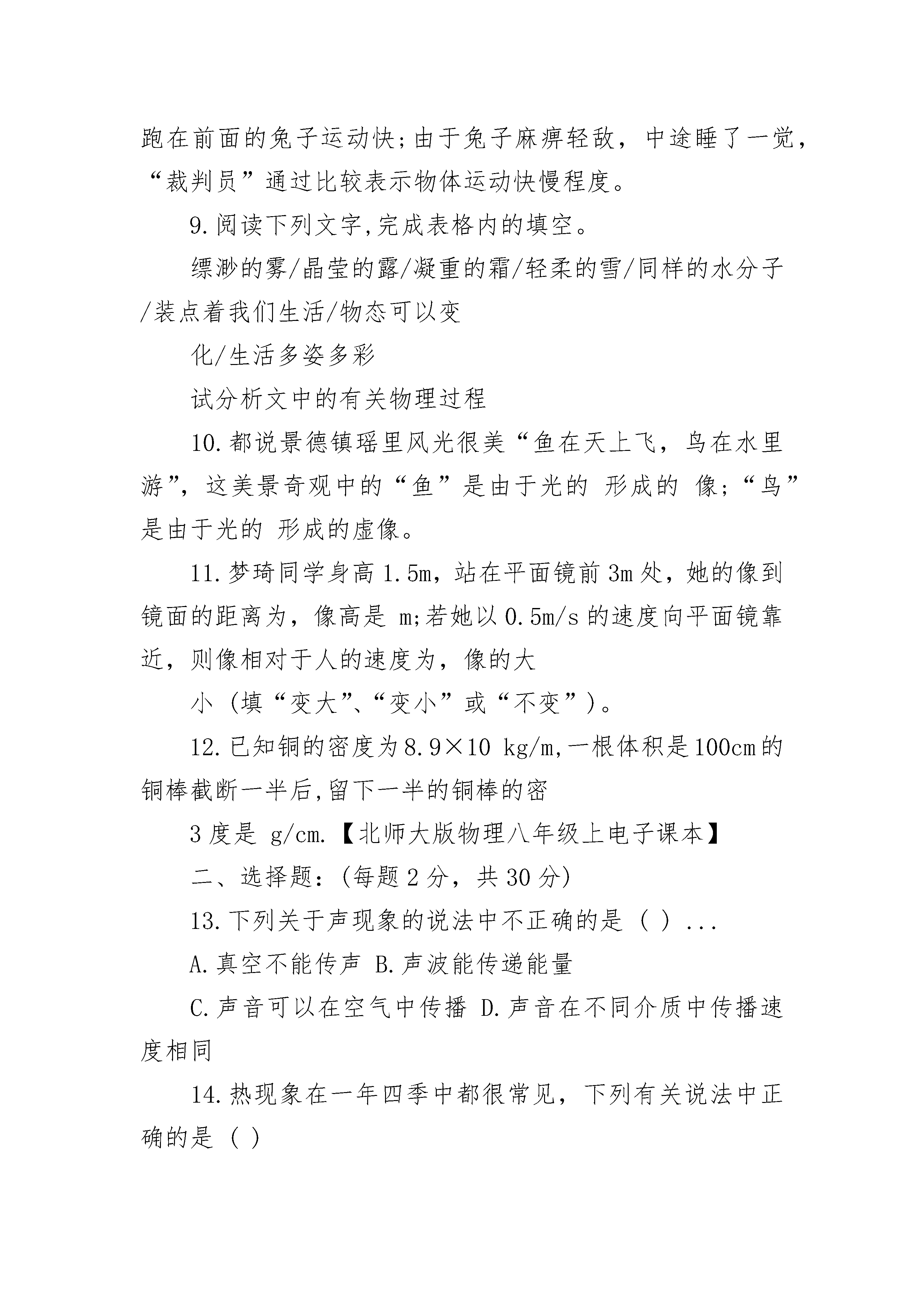 九年级上册物理电子课本一、填空题:(每空1分,共24分)1.小丽的妈妈戴着一副太阳镜,镜片是蓝色的,在太阳光下她看到小丽穿的白衬衫是____色的.2.如图1所示为抽去空气的玻璃罩.它内部的闹钟虽然在振动发声,但是我们却听不到铃声,这说明声音的传播需要________.3.上物理课时,在黑板上作图的张老师提醒坐在后面的小明同学不要讲话要做笔记.面对黑板的张老师是根据小明发出声音的来判断是小明在讲话的.当教室外面出现嘈杂的声音时,我们总是关上门窗,这是为了在减弱噪声.4.小明在理发时,从平面镜中看到背后墙上挂钟指针位置如图2所示,则实际时间是______.5.小雅的哥哥新买了一条领带,领带具有很强的自洁功能----不沾水也不沾油.由此可知这是利用了______材料制成的领带.6.海菲同学是位音乐爱好者,钢琴独奏或手风琴独奏她一听便能分辨,她区分的依据是这两类乐器发出声音的____不同;她用不同的力弹琴时,发出的声音的__________不同。7.图3所示的体温计的测量范围是℃。图3图48.右上图4是“龟兔赛跑”的情形,在比赛开始后,“观众”通过比较它们时间相同时,路程不同,认为跑在前面的兔子运动快;由于兔子麻痹轻敌,中途睡了一觉,“裁判员”通过比较表示物体运动快慢程度。9.阅读下列文字,完成表格内的填空。缥渺的雾/晶莹的露/凝重的霜/轻柔的雪/同样的水分子/装点着我们生活/物态可以变化/生活多姿多彩试分析文中的有关物理过程10.都说景德镇瑶里风光很美“鱼在天上飞,鸟在水里游”,这美景奇观中的“鱼”是由于光的形成的像;“鸟”是由于光的形成的虚像。11.梦琦同学身高1.5m,站在平面镜前3m处,她的像到镜面的距离为,像高是m;若她以0.5m/s的速度向平面镜靠近,则像相对于人的速度为,像的大小(填“变大”、“变小”或“不变”)。12.已知铜的密度为8.9×10kg/m,一根体积是100cm的铜棒截断一半后,留下一半的铜棒的密3度是g/cm.【北师大版物理八年级上电子课本】二、选择题:(每题2分,共30分)13.下列关于声现象的说法中不正确的是()...A.真空不能传声B.声波能传递能量C.声音可以在空气中传播D.声音在不同介质中传播速度相同14.热现象在一年四季中都很常见,下列有关说法中正确的是()A.春天的早晨经常出现大雾,这是汽化现象B.夏天,揭开冰棒包装后,会看到冰棒冒“白气”,这是升华现象C.秋天的早晨,花草上出现细小的露珠,这是液化现象D.初冬的早晨,地面上会出现白色的霜,这是凝固现象15.下列说法中错误的是()A.所有固体熔化时温度都保持不变B.大气压会影响液体的沸点C、蒸发、升华都有致冷作用D、液体沸腾时对它继续加热,温度不升高16.下列叙述中用到了与右图5所示物理规律相同的()图5A.“海市蜃楼”B.“杯弓蛇影”C.“镜花水月”D.“立竿见影”17.随着“神舟七号”载人飞船发射成功,我国已实现三次载人航天飞行.在火箭推动飞船上升阶段,航天员是被固定在飞船座舱内的.此阶段航天员相对下列哪个参照物是静止的()A.太阳B.地球C.月球D.飞船18.根据你的生活经验判断,下列数据中最接近生活实际的是()A.一个鸡蛋的质量约为500gB.小明上学时步行的速度大约是4.5Km/hC.浴室里洗澡水的温度约为37℃D.物理课本的长度大约是26dm19.在“用托盘天平测物体质量”时,某同学用已调节好的天平测物体质量的过程中,通过增、减砝码后,发现指针指在分度盘中央刻度线的左边一点,这时他应该()A.把横梁右端的螺母向右旋出一些B.把横梁右端的螺母向左旋进一些C.把天平右盘的砝码减少一些D.向右移动游码20.有一盛水的圆柱形敞口容器,水面的升降可通过进水管和出水管调节.在其右侧边沿的某一高度朝确定方向向下射出一激光束,在容器底部中央产生一个光斑,如图6所示.该光斑()A.是激光束经水面反射后形成的;若向右移动,表明水面上升B.是激光束经水面反射后形成的;若向左移动,表明水面上升C.是激光束经水面折射后形成的;若向左移动,表明水面下降D.是激光束经水面折射后形成的;若向右移动,表明水面下降21.下列关于光现象的说法中正确的是()A.很厚的玻璃板下面的字看起来位置偏高了,是由于光的折射引起的图6B.日食和月食是由于光的反射引起的C.高楼大厦的玻璃幕墙造成的光污染,是由于光的漫反射引起D.电视机的遥控器是通过发射出紫外线进行遥控的22.有甲、乙两辆小车,它们运动的s~t图像如图7所示.分析图像得到的下列结论中正确是:()A.甲、乙两车都做匀速直线运动B.甲车的速度为10m/s,乙车的速度为2m/sC.经过6s,甲、乙两车相距2mD.经过5s,甲、乙两车通过的路程均为10m图723.景华学校的佳佳同学考取了北京大学,她爸爸将自己333的金戒指