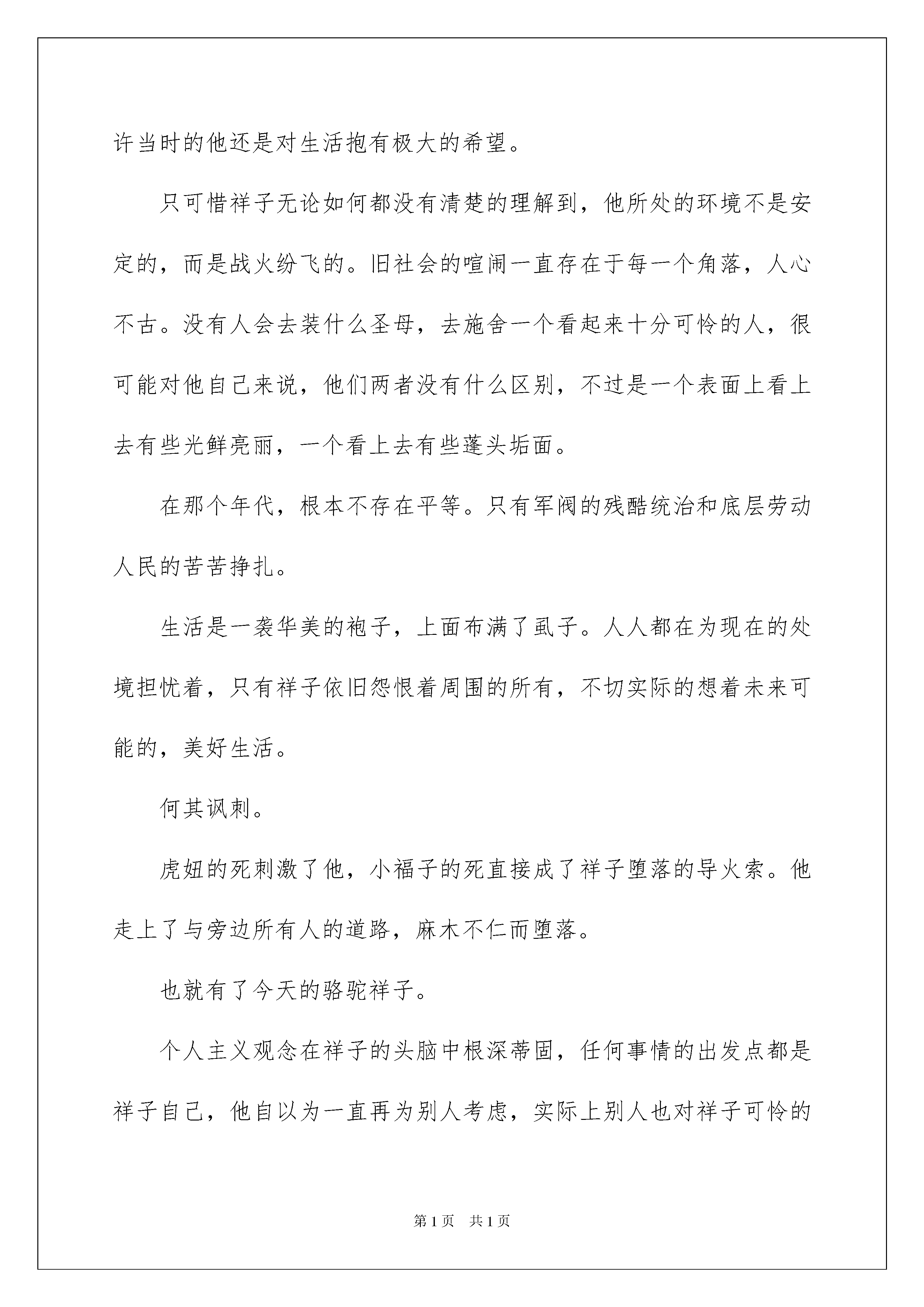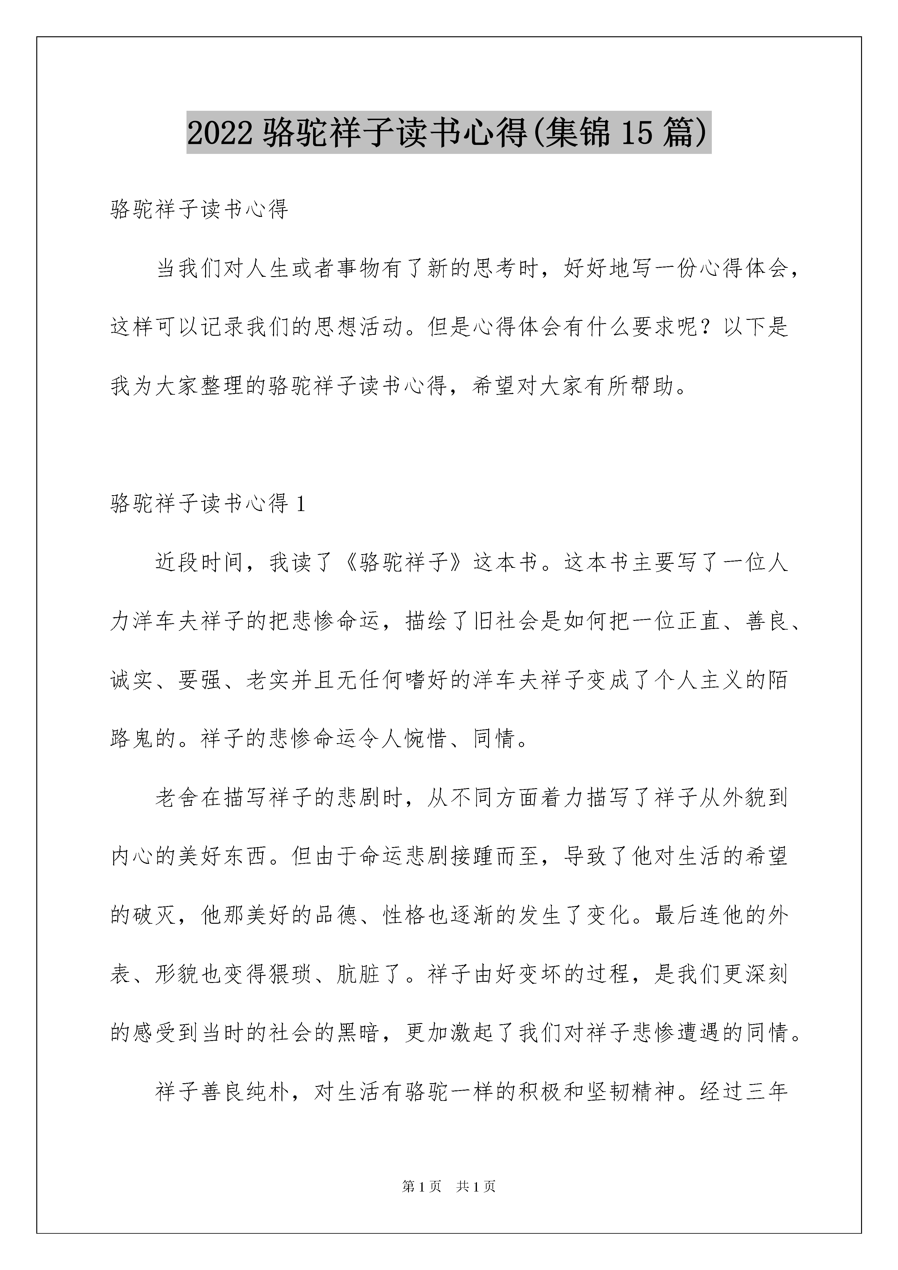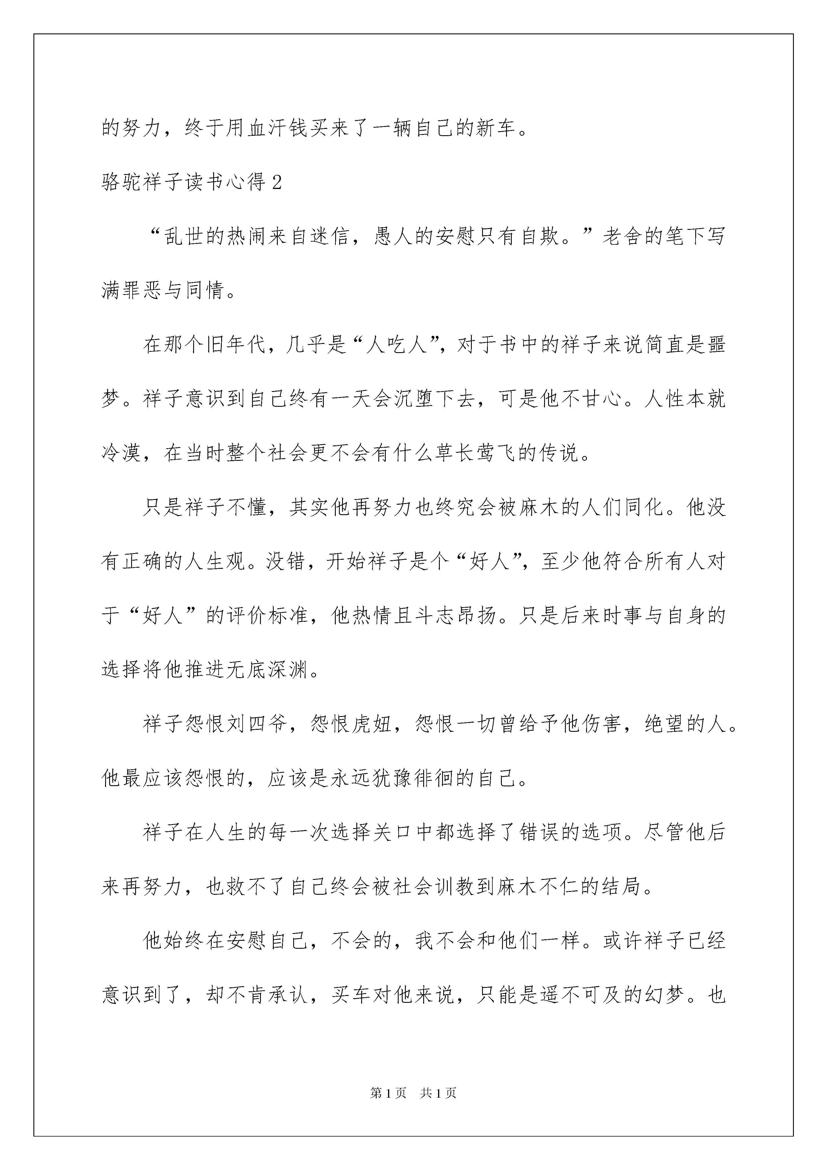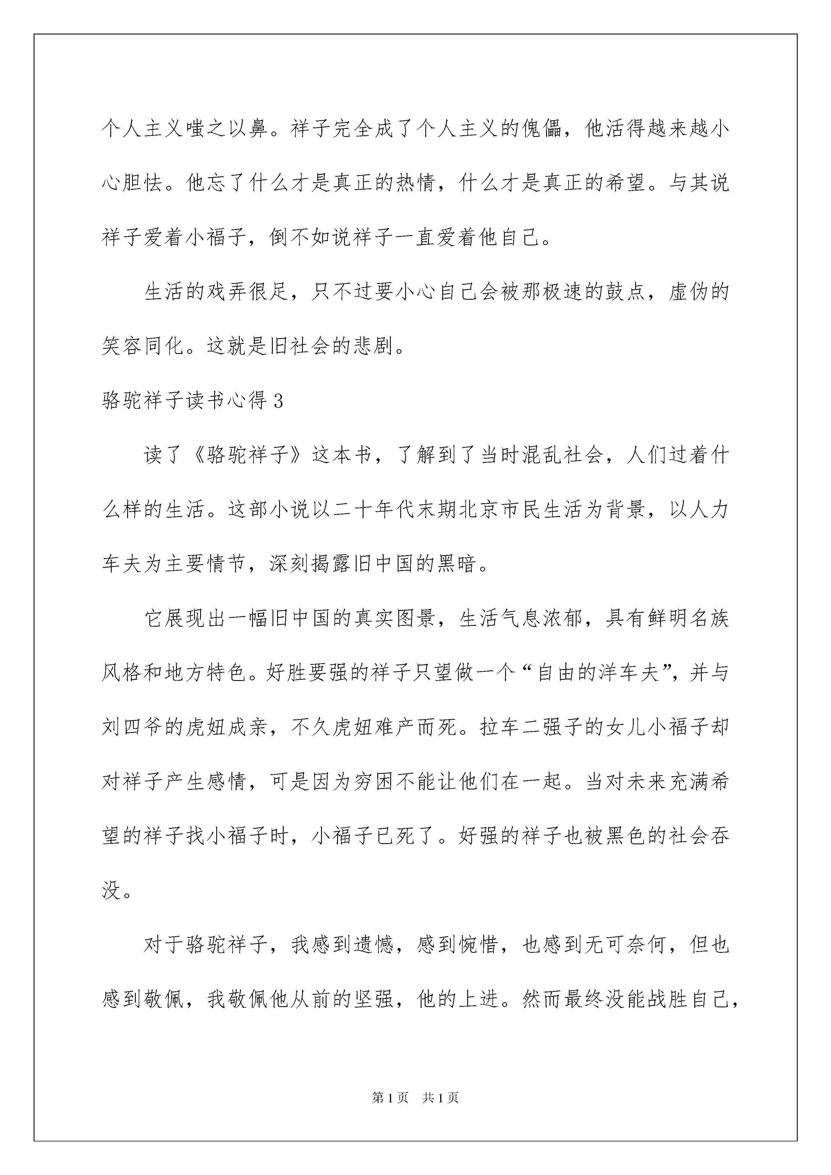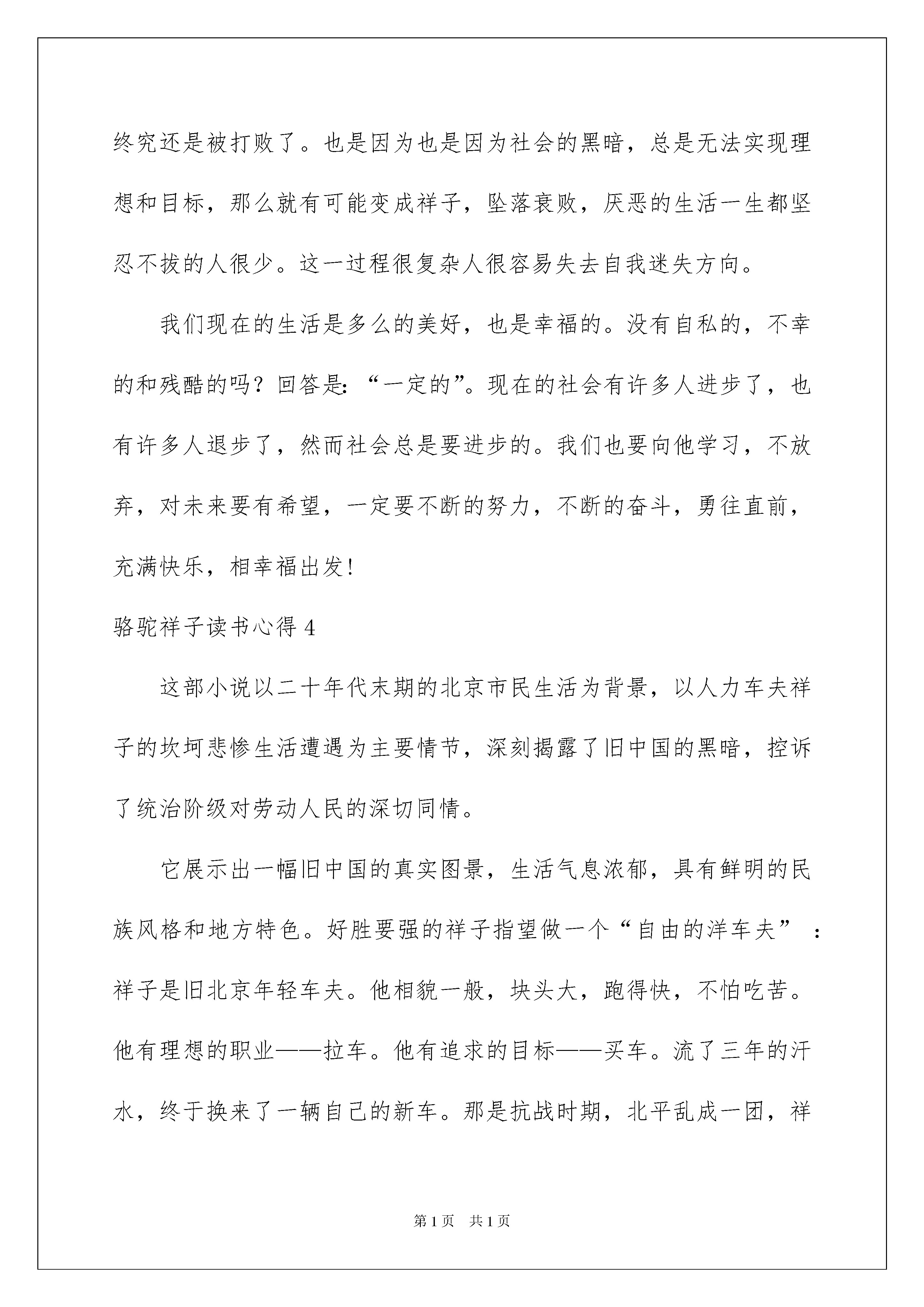 2022骆驼祥子读书心得(集锦15篇)骆驼祥子读书心得当我们对人生或者事物有了新的思考时,好好地写一份心得体会,这样可以记录我们的思想活动。但是心得体会有什么要求呢?以下是我为大家整理的骆驼祥子读书心得,希望对大家有所帮助。骆驼祥子读书心得1近段时间,我读了《骆驼祥子》这本书。这本书主要写了一位人力洋车夫祥子的把悲惨命运,描绘了旧社会是如何把一位正直、善良、诚实、要强、老实并且无任何嗜好的洋车夫祥子变成了个人主义的陌路鬼的。祥子的悲惨命运令人惋惜、同情。老舍在描写祥子的悲剧时,从不同方面着力描写了祥子从外貌到内心的美好东西。但由于命运悲剧接踵而至,导致了他对生活的希望的破灭,他那美好的品德、性格也逐渐的发生了变化。最后连他的外表、形貌也变得猥琐、肮脏了。祥子由好变坏的过程,是我们更深刻的感受到当时的社会的黑暗,更加激起了我们对祥子悲惨遭遇的同情。祥子善良纯朴,对生活有骆驼一样的积极和坚韧精神。经过三年的努力,终于用血汗钱买来了一辆自己的新车。骆驼祥子读书心得2“乱世的热闹来自迷信,愚人的安慰只有自欺。”老舍的笔下写满罪恶与同情。在那个旧年代,几乎是“人吃人”,对于书中的祥子来说简直是噩梦。祥子意识到自己终有一天会沉堕下去,可是他不甘心。人性本就冷漠,在当时整个社会更不会有什么草长莺飞的传说。只是祥子不懂,其实他再努力也终究会被麻木的人们同化。他没有正确的人生观。没错,开始祥子是个“好人”,至少他符合所有人对于“好人”的评价标准,他热情且斗志昂扬。只是后来时事与自身的选择将他推进无底深渊。祥子怨恨刘四爷,怨恨虎妞,怨恨一切曾给予他伤害,绝望的人。他最应该怨恨的,应该是永远犹豫徘徊的自己。祥子在人生的每一次选择关口中都选择了错误的选项。尽管他后来再努力,也救不了自己终会被社会训教到麻木不仁的结局。他始终在安慰自己,不会的,我不会和他们一样。或许祥子已经意识到了,却不肯承认,买车对他来说,只能是遥不可及的幻梦。也许当时的他还是对生活抱有极大的希望。只可惜祥子无论如何都没有清楚的理解到,他所处的环境不是安定的,而是战火纷飞的。旧社会的喧闹一直存在于每一个角落,人心不古。没有人会去装什么圣母,去施舍一个看起来十分可怜的人,很可能对他自己来说,他们两者没有什么区别,不过是一个表面上看上去有些光鲜亮丽,一个看上去有些蓬头垢面。在那个年代,根本不存在平等。只有军阀的残酷统治和底层劳动人民的苦苦挣扎。生活是一袭华美的袍子,上面布满了虱子。人人都在为现在的处境担忧着,只有祥子依旧怨恨着周围的所有,不切实际的想着未来可能的,美好生活。何其讽刺。虎妞的死刺激了他,小福子的死直接成了祥子堕落的导火索。他走上了与旁边所有人的道路,麻木不仁而堕落。也就有了今天的骆驼祥子。个人主义观念在祥子的头脑中根深蒂固,任何事情的出发点都是祥子自己,他自以为一直再为别人考虑,实际上别人也对祥子可怜的个人主义嗤之以鼻。祥子完全成了个人主义的傀儡,他活得越来越小心胆怯。他忘了什么才是真正的热情,什么才是真正的希望。与其说祥子爱着小福子,倒不如说祥子一直爱着他自己。生活的戏弄很足,只不过要小心自己会被那极速的鼓点,虚伪的笑容同化。这就是旧社会的悲剧。骆驼祥子读书心得3读了《骆驼祥子》这本书,了解到了当时混乱社会,人们过着什么样的生活。这部小说以二十年代末期北京市民生活为背景,以人力车夫为主要情节,深刻揭露旧中国的黑暗。它展现出一幅旧中国的真实图景,生活气息浓郁,具有鲜明名族风格和地方特色。好胜要强的祥子只望做一个“自由的洋车夫”,并与刘四爷的虎妞成亲,不久虎妞难产而死。拉车二强子的女儿小福子却对祥子产生感情,可是因为穷困不能让他们在一起。当对未来充满希望的祥子找小福子时,小福子已死了。好强的祥子也被黑色的社会吞没。对于骆驼祥子,我感到遗憾,感到惋惜,也感到无可奈何,但也感到敬佩,我敬佩他从前的坚强,他的上进。然而最终没能战胜自己,终究还是被打败了。也是因为也是因为社会的黑暗,总是无法实现理想和目标,那么就有可能变成祥子,坠落衰败,厌恶的生活一生都坚忍不拔的人很少。这一过程很复杂人很容易失去自我迷失方向。我们现在的生活是多么的美好,也是幸福的。没有自私的,不幸的和残酷的吗?回答是:“一定的”。现在的社会有许多人进步了,也有许多人退步了,然而社会总是要进步的。我们也要向他学习,不放弃,对未来要有希望,一定要不断的努力,不断的奋斗,勇往直前,充满快乐,相幸福出发!骆驼祥子读书心得4这部小说以二十年代末期的北京市民生活为背景,以人力车夫祥子的坎坷悲惨生活遭遇为主要情节,深刻揭露了旧中国的黑暗,控诉了统治阶级对劳动人民的深切同情。