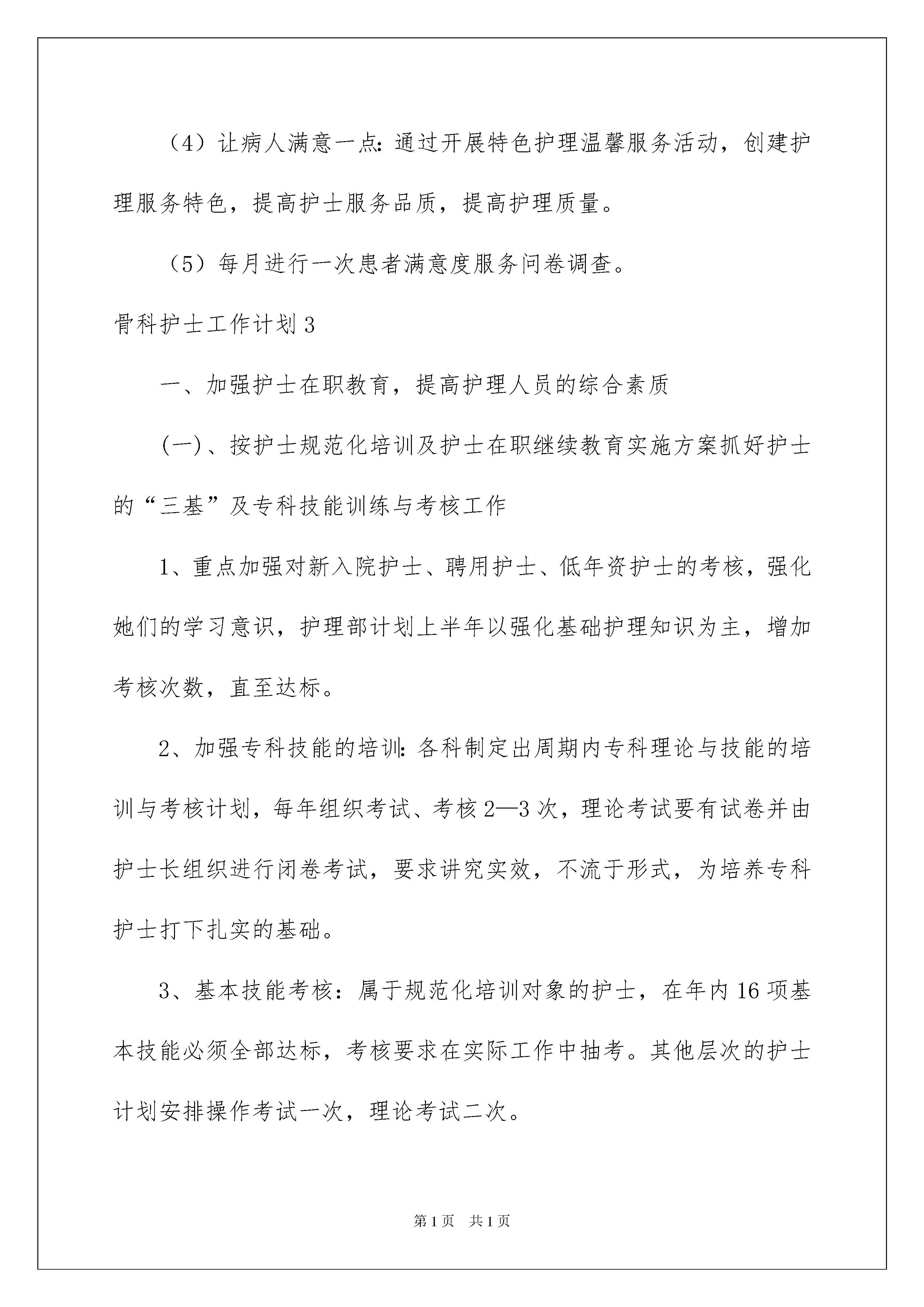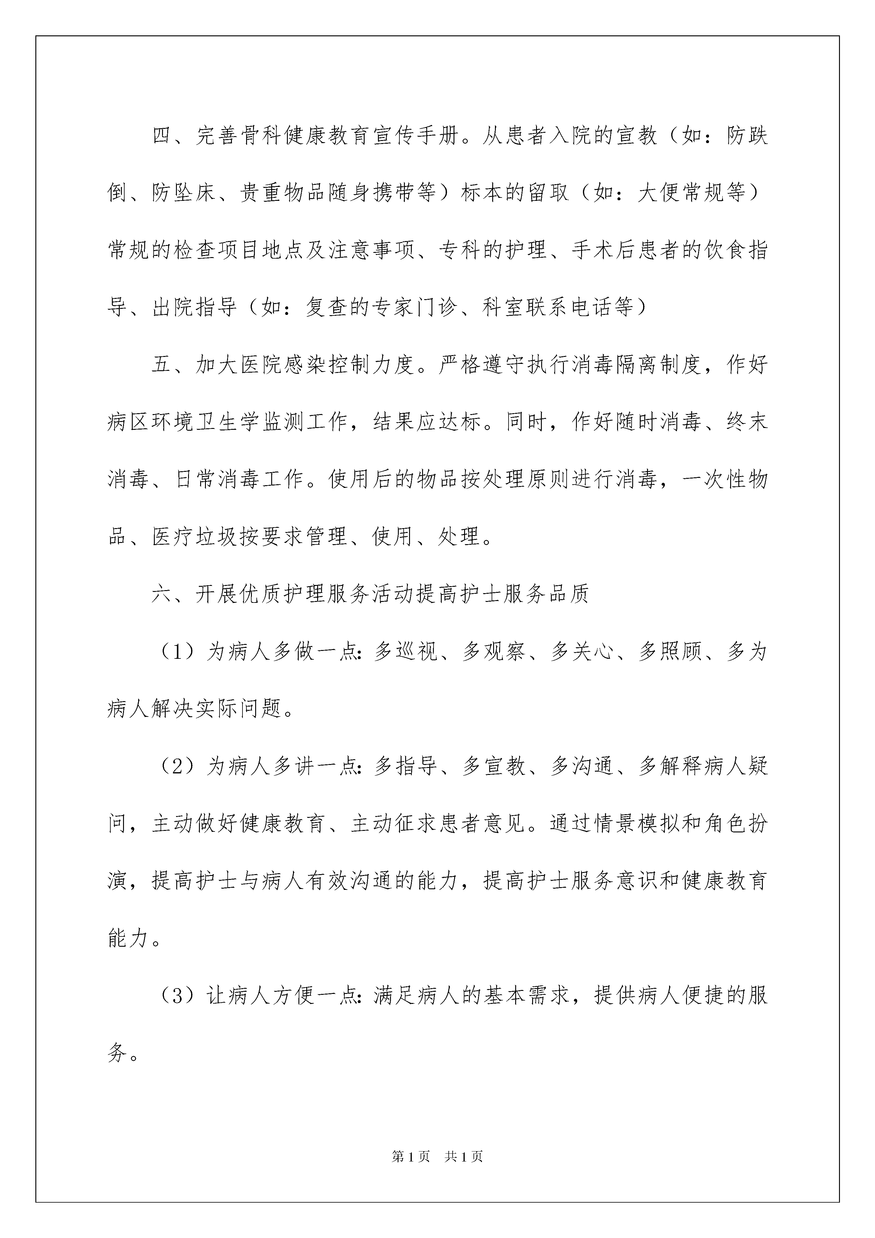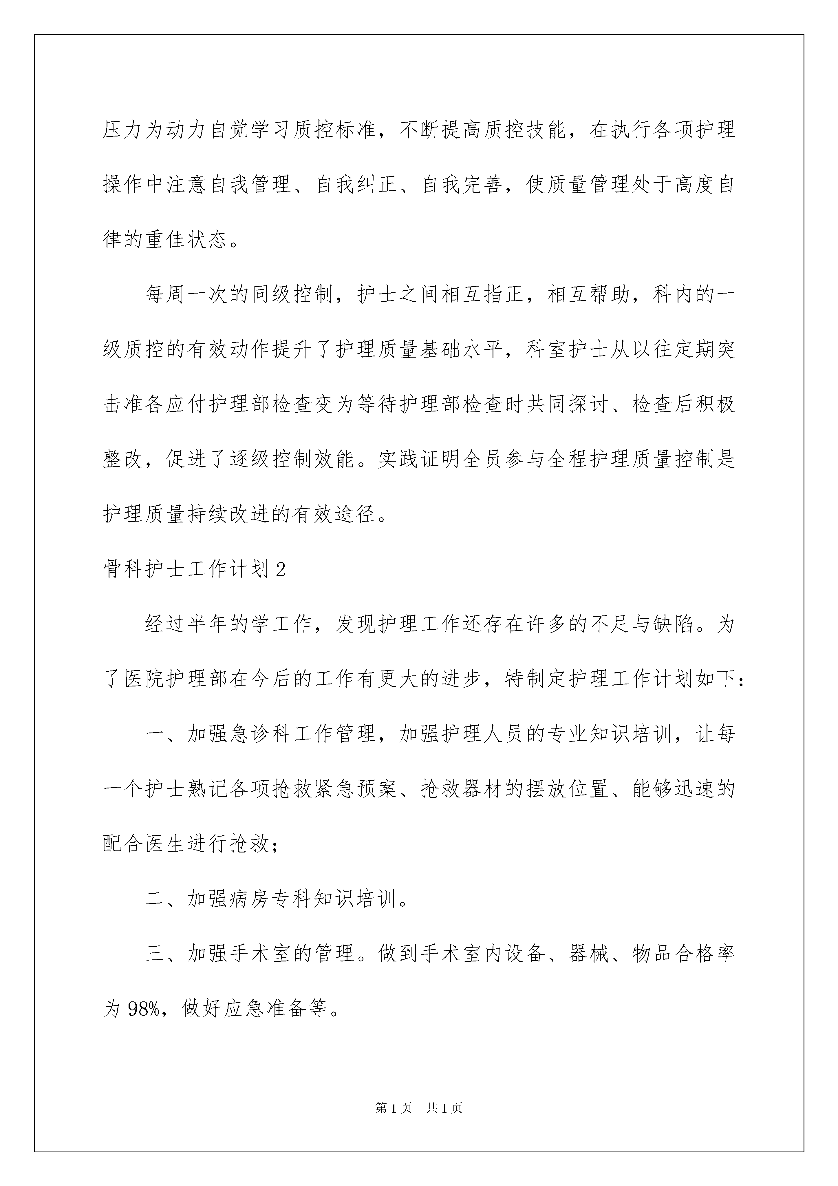 2022骨科护士工作计划骨科护士工作计划光阴迅速,一眨眼就过去了,迎接我们的将是新的生活,新的挑战,是时候开始制定计划了。想学习拟定计划却不知道该请教谁?下面是我帮大家整理的骨科护士工作计划,仅供参考,大家一起来看看吧。骨科护士工作计划11、学习质控标准标准是质量管理的基础,是实施质量控制的科学依据,护士长组织全体护士认真学习护理部质控标准,对5名组长重点辅导。各组再针对性深入研讨,达到人人掌握质控标准,工作中以标准为指南严格自律,检查时以标准为准绳客观评价。2、实施质量控制各小组组长根据本组成员班次及病房工作实际,灵活安排时间,每周对所负责的质控项目进行1次检查,检查时不评分,只详细记录存在的问题,责任人在班时当面交换意见并由本人及时纠正;责任人不在班时一般缺陷由质控护士代为纠正然后向责任人说明,严重缺陷立即报告护士长、通知责任人及时返科现场解决。出现频率较高的问题列入全科护理质控会议进行分析讲评,出错较多的护士列为重点辅导对象,加强培训考核提高业务技能。每月初召开护理质量评析会,各质控组长汇报上月各自查情况,护士长反馈上月科及护理部质量检查情况,针对存在的问题集体讨论,制定整改方案并付诸实施,再进入下一轮自查自纠,如此循环运转。3、质控方法评价每一质控成员建立自查本,首页记有本项检查的标准。每周体现一次检查的内容。护士长对每个质控人员给予评介,好的表扬,未完成的列入护士素质考评分。全员质控实施前、后(20xx年4月分前后)护理质量检查评分情况明显提高,而且问题逐步减少,护理质量也形成持续改进。通过全员参与,增强护士的质量意识,积极主动地寻找问题的对策与方法,变被动管理为参与式管理。实行全员控制、全程控制,使护理质量得到了稳步提高。4、总结护士是护理质量的直接责任者,全员参与护理质量控制,人人以压力为动力自觉学习质控标准,不断提高质控技能,在执行各项护理操作中注意自我管理、自我纠正、自我完善,使质量管理处于高度自律的重佳状态。每周一次的同级控制,护士之间相互指正,相互帮助,科内的一级质控的有效动作提升了护理质量基础水平,科室护士从以往定期突击准备应付护理部检查变为等待护理部检查时共同探讨、检查后积极整改,促进了逐级控制效能。实践证明全员参与全程护理质量控制是护理质量持续改进的有效途径。骨科护士工作计划2经过半年的学工作,发现护理工作还存在许多的不足与缺陷。为了医院护理部在今后的工作有更大的进步,特制定护理工作计划如下:一、加强急诊科工作管理,加强护理人员的专业知识培训,让每一个护士熟记各项抢救紧急预案、抢救器材的摆放位置、能够迅速的配合医生进行抢救;二、加强病房专科知识培训。三、加强手术室的管理。做到手术室内设备、器械、物品合格率为98%,做好应急准备等。四、完善骨科健康教育宣传手册。从患者入院的宣教(如:防跌倒、防坠床、贵重物品随身携带等)标本的留取(如:大便常规等)常规的检查项目地点及注意事项、专科的护理、手术后患者的饮食指导、出院指导(如:复查的专家门诊、科室联系电话等)五、加大医院感染控制力度。严格遵守执行消毒隔离制度,作好病区环境卫生学监测工作,结果应达标。同时,作好随时消毒、终末消毒、日常消毒工作。使用后的物品按处理原则进行消毒,一次性物品、医疗垃圾按要求管理、使用、处理。六、开展优质护理服务活动提高护士服务品质(1)为病人多做一点:多巡视、多观察、多关心、多照顾、多为病人解决实际问题。(2)为病人多讲一点:多指导、多宣教、多沟通、多解释病人疑问,主动做好健康教育、主动征求患者意见。通过情景模拟和角色扮演,提高护士与病人有效沟通的能力,提高护士服务意识和健康教育能力。(3)让病人方便一点:满足病人的基本需求,提供病人便捷的服务。(4)让病人满意一点:通过开展特色护理温馨服务活动,创建护理服务特色,提高护士服务品质,提高护理质量。(5)每月进行一次患者满意度服务问卷调查。骨科护士工作计划3一、加强护士在职教育,提高护理人员的综合素质(一)、按护士规范化培训及护士在职继续教育实施方案抓好护士的“三基”及专科技能训练与考核工作1、重点加强对新入院护士、聘用护士、低年资护士的考核,强化她们的学习意识,护理部计划上半年以强化基础护理知识为主,增加考核次数,直至达标。2、加强专科技能的培训:各科制定出周期内专科理论与技能的培训与考核计划,每年组织考试、考核2—3次,理论考试要有试卷并由护士长组织进行闭卷考试,要求讲究实效,不流于形式,为培养专科护士打下扎实的基础。3、基本技能考核:属于规范化培训对象的护士,在年内16项基本技能必须全部达标,考核要求在实际工作中抽考。其他