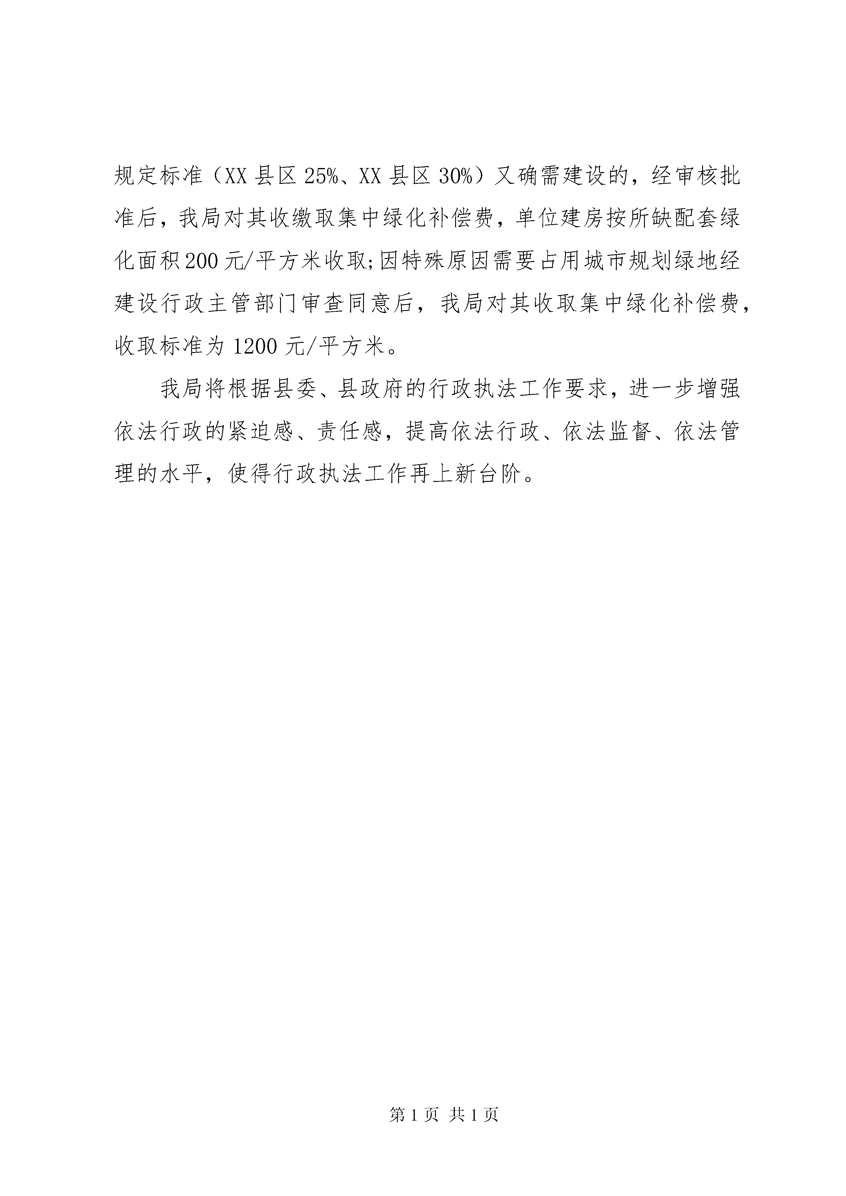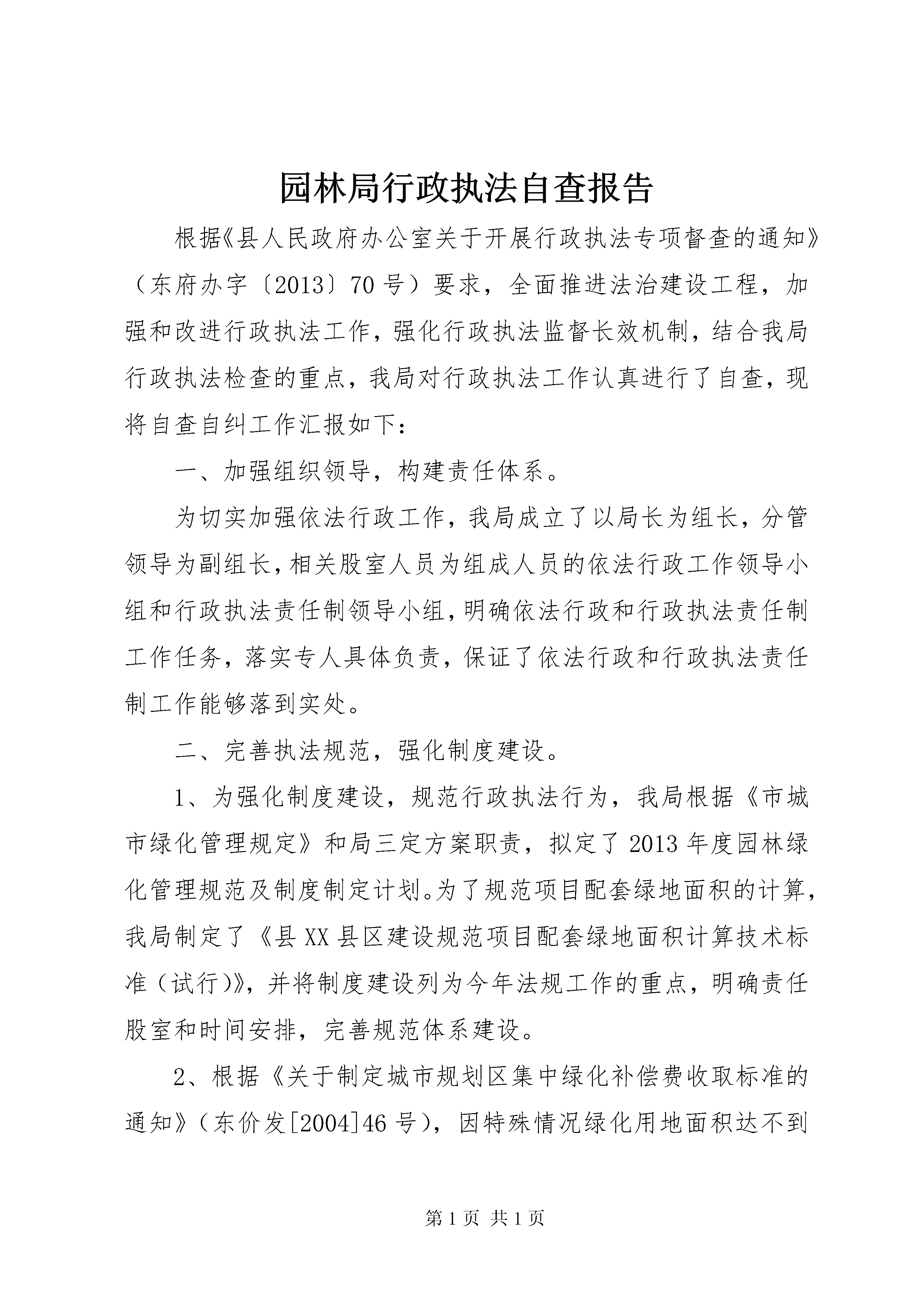 园林局行政执法自查报告根据《县人民政府办公室关于开展行政执法专项督查的通知》(东府办字〔2013〕70号)要求,全面推进法治建设工程,加强和改进行政执法工作,强化行政执法监督长效机制,结合我局行政执法检查的重点,我局对行政执法工作认真进行了自查,现将自查自纠工作汇报如下:一、加强组织领导,构建责任体系。为切实加强依法行政工作,我局成立了以局长为组长,分管领导为副组长,相关股室人员为组成人员的依法行政工作领导小组和行政执法责任制领导小组,明确依法行政和行政执法责任制工作任务,落实专人具体负责,保证了依法行政和行政执法责任制工作能够落到实处。二、完善执法规范,强化制度建设。1、为强化制度建设,规范行政执法行为,我局根据《市城市绿化管理规定》和局三定方案职责,拟定了2013年度园林绿化管理规范及制度制定计划。为了规范项目配套绿地面积的计算,我局制定了《县XX县区建设规范项目配套绿地面积计算技术标准(试行)》,并将制度建设列为今年法规工作的重点,明确责任股室和时间安排,完善规范体系建设。2、根据《关于制定城市规划区集中绿化补偿费收取标准的通知》(东价发[2004]46号),因特殊情况绿化用地面积达不到规定标准(XX县区25%、XX县区30%)又确需建设的,经审核批准后,我局对其收缴取集中绿化补偿费,单位建房按所缺配套绿化面积200元/平方米收取;因特殊原因需要占用城市规划绿地经建设行政主管部门审查同意后,我局对其收取集中绿化补偿费,收取标准为1200元/平方米。我局将根据县委、县政府的行政执法工作要求,进一步增强依法行政的紧迫感、责任感,提高依法行政、依法监督、依法管理的水平,使得行政执法工作再上新台阶。
