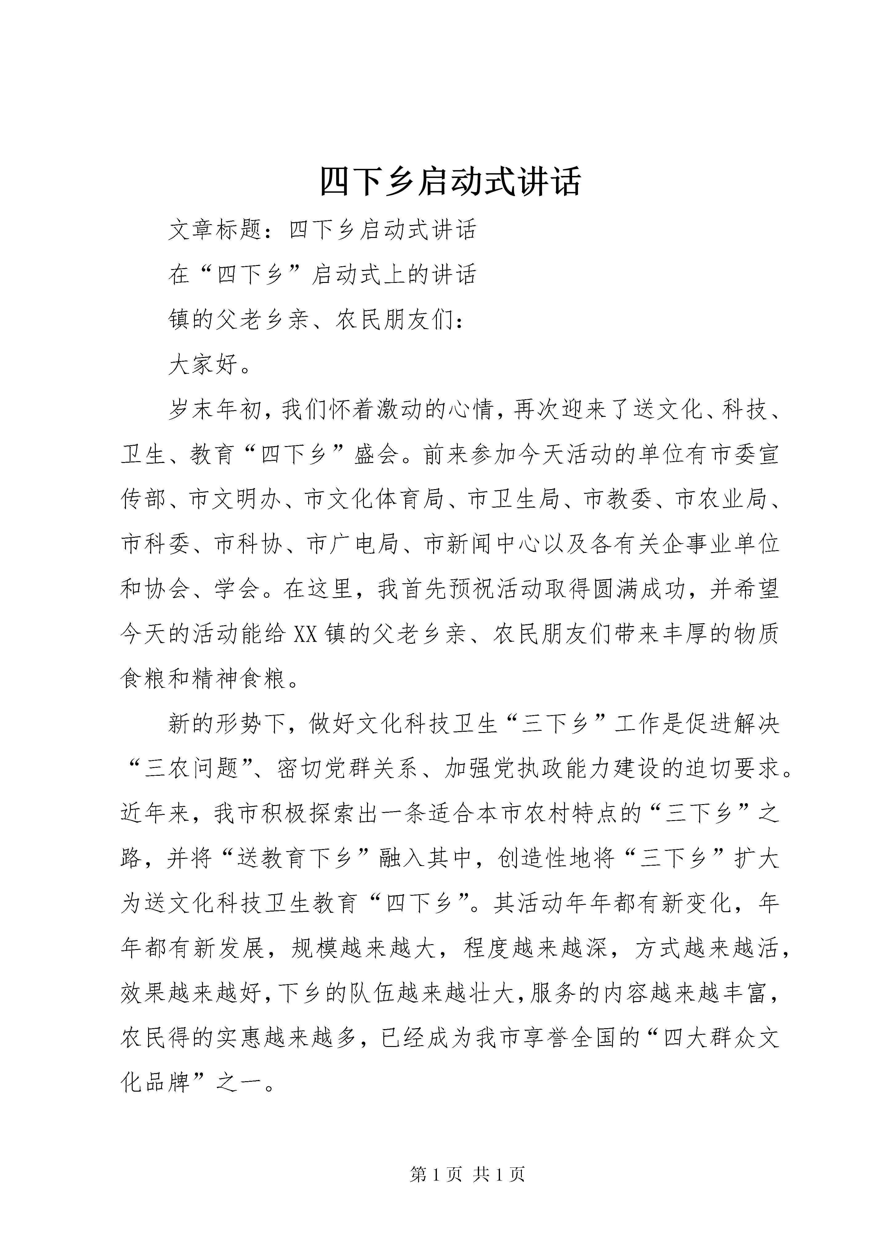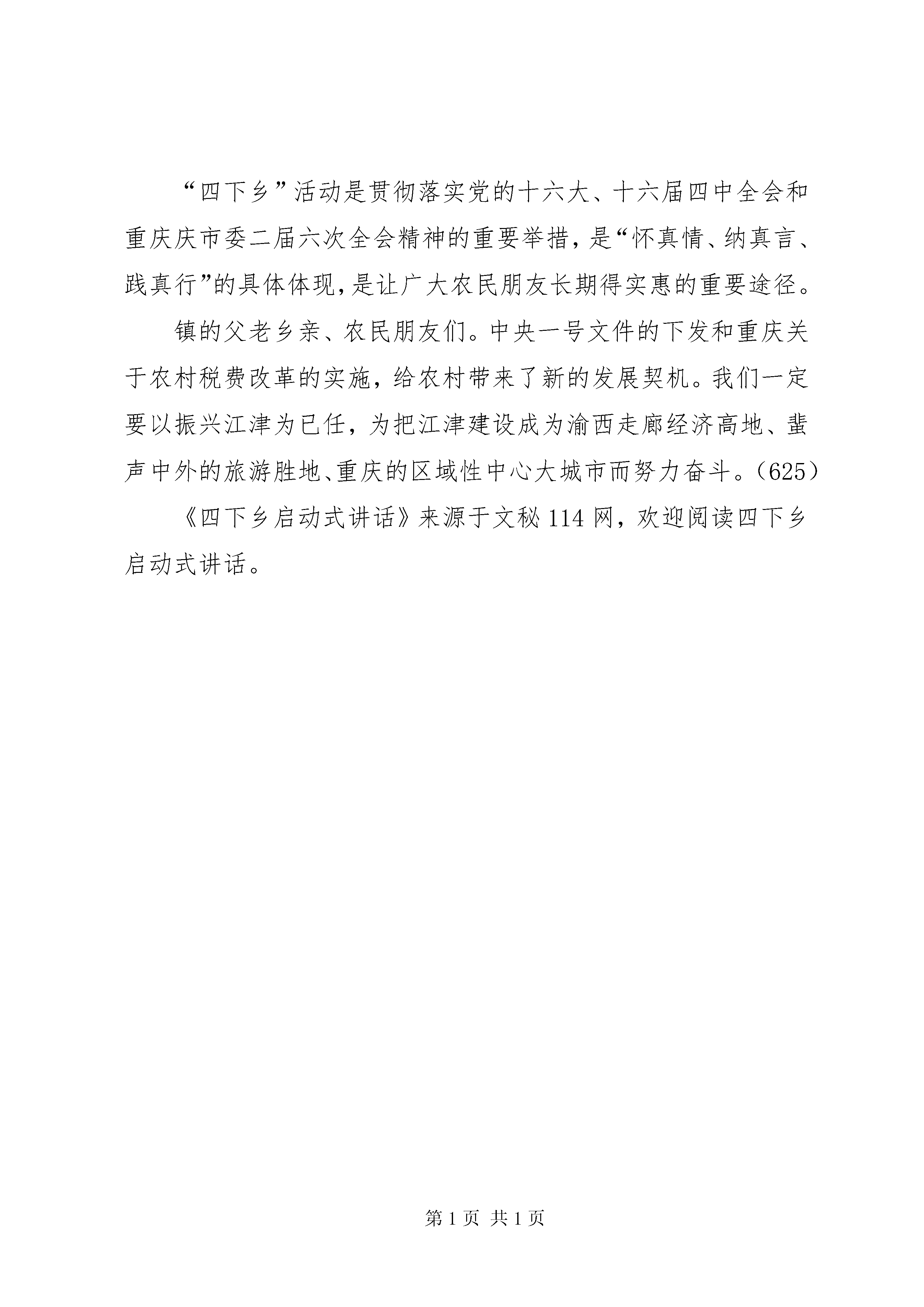 四下乡启动式讲话文章标题:四下乡启动式讲话在“四下乡”启动式上的讲话镇的父老乡亲、农民朋友们:大家好。岁末年初,我们怀着激动的心情,再次迎来了送文化、科技、卫生、教育“四下乡”盛会。前来参加今天活动的单位有市委宣传部、市文明办、市文化体育局、市卫生局、市教委、市农业局、市科委、市科协、市广电局、市新闻中心以及各有关企事业单位和协会、学会。在这里,我首先预祝活动取得圆满成功,并希望今天的活动能给XX镇的父老乡亲、农民朋友们带来丰厚的物质食粮和精神食粮。新的形势下,做好文化科技卫生“三下乡”工作是促进解决“三农问题”、密切党群关系、加强党执政能力建设的迫切要求。近年来,我市积极探索出一条适合本市农村特点的“三下乡”之路,并将“送教育下乡”融入其中,创造性地将“三下乡”扩大为送文化科技卫生教育“四下乡”。其活动年年都有新变化,年年都有新发展,规模越来越大,程度越来越深,方式越来越活,效果越来越好,下乡的队伍越来越壮大,服务的内容越来越丰富,农民得的实惠越来越多,已经成为我市享誉全国的“四大群众文化品牌”之一。“四下乡”活动是贯彻落实党的十六大、十六届四中全会和重庆庆市委二届六次全会精神的重要举措,是“怀真情、纳真言、践真行”的具体体现,是让广大农民朋友长期得实惠的重要途径。镇的父老乡亲、农民朋友们。中央一号文件的下发和重庆关于农村税费改革的实施,给农村带来了新的发展契机。我们一定要以振兴江津为已任,为把江津建设成为渝西走廊经济高地、蜚声中外的旅游胜地、重庆的区域性中心大城市而努力奋斗。(625)《四下乡启动式讲话》来源于文秘114网,欢迎阅读四下乡启动式讲话。