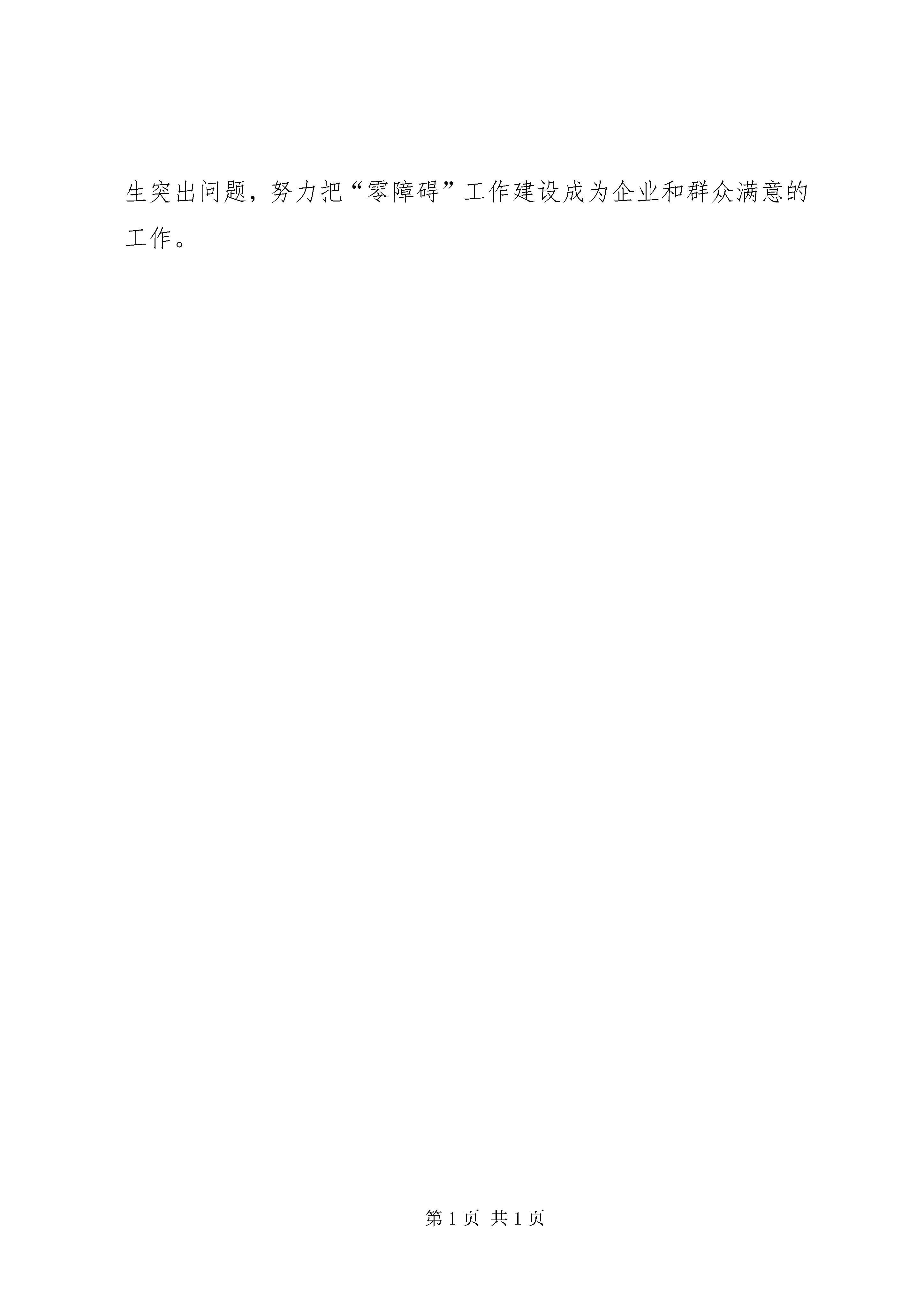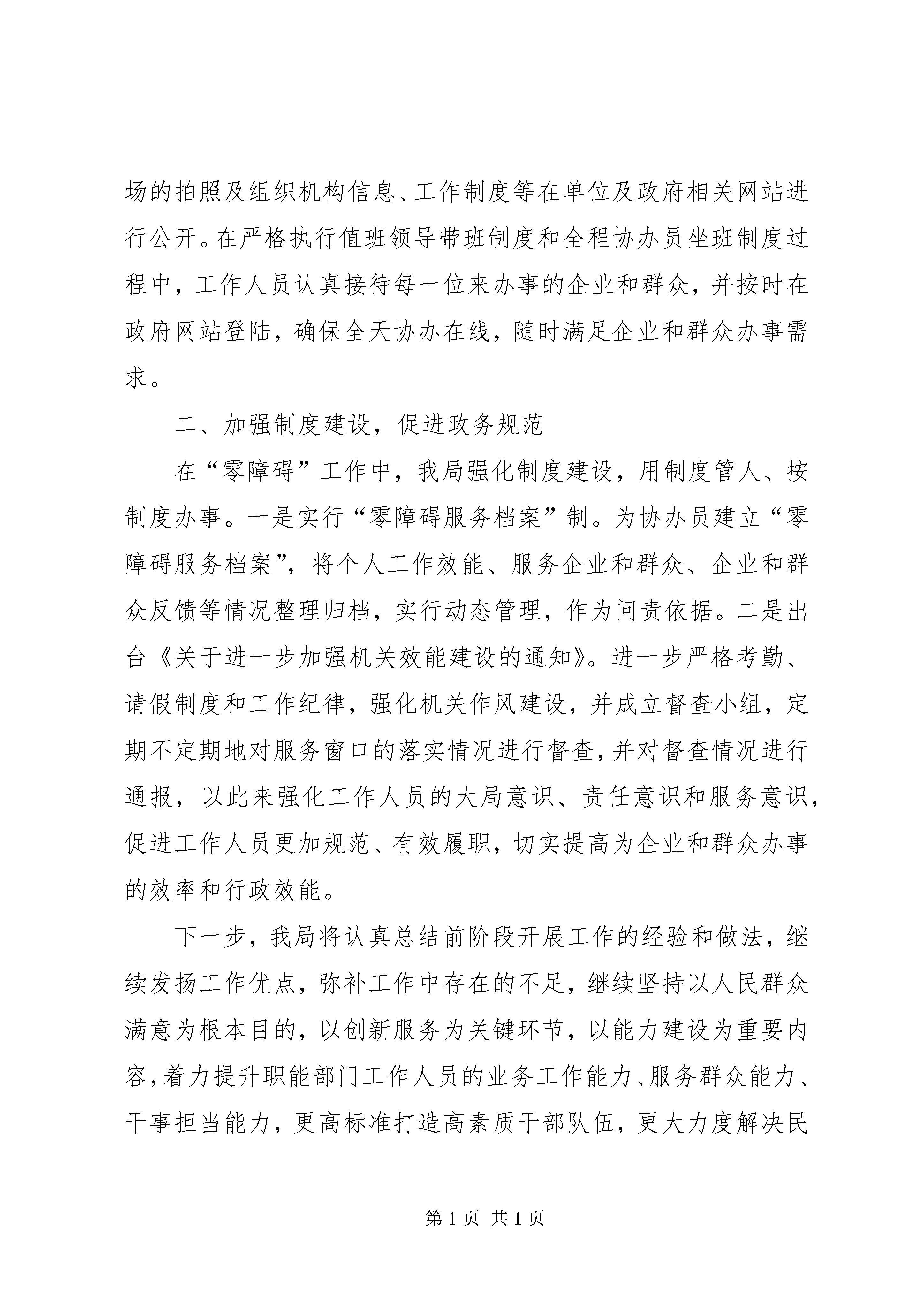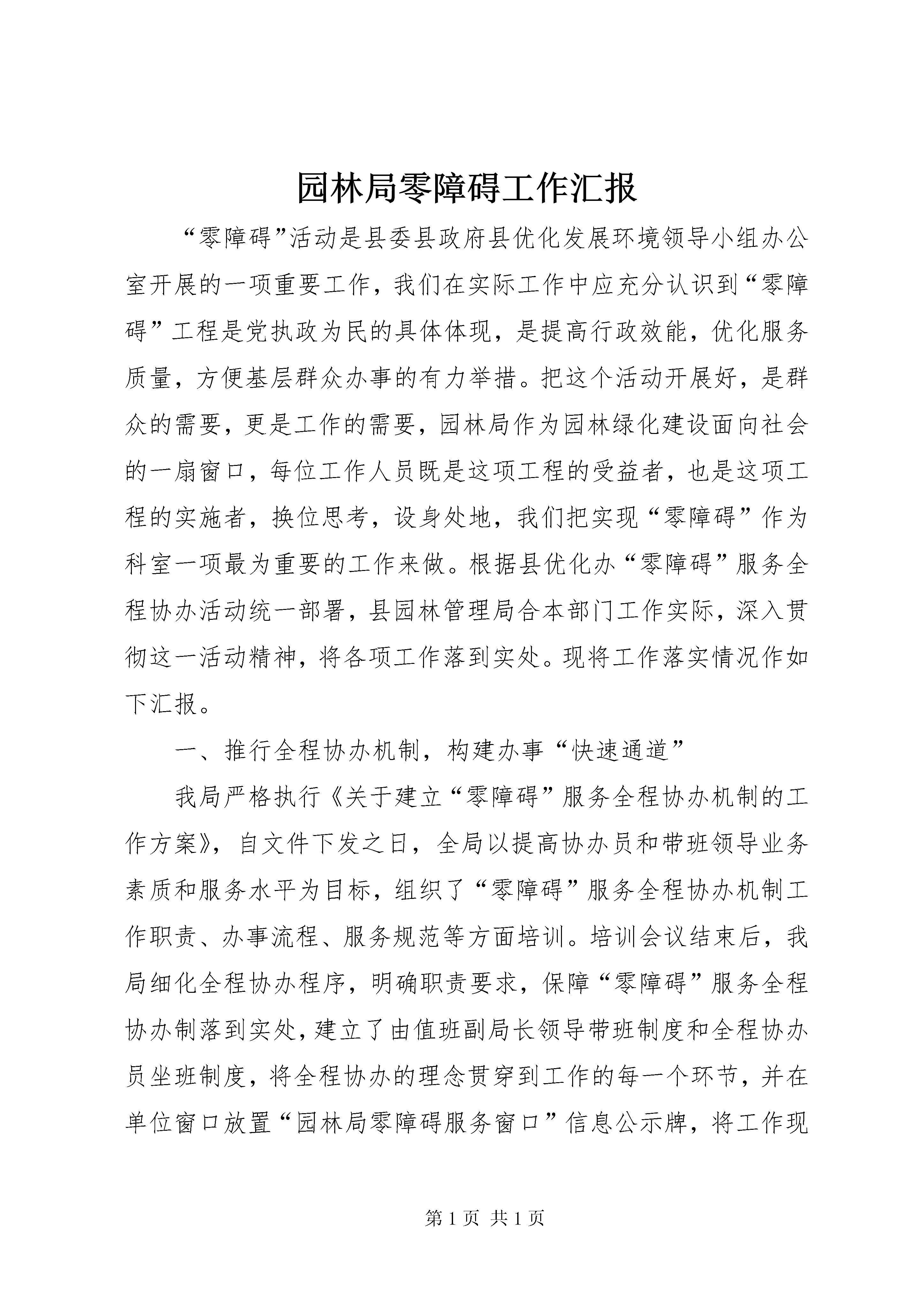 园林局零障碍工作汇报“零障碍”活动是县委县政府县优化发展环境领导小组办公室开展的一项重要工作,我们在实际工作中应充分认识到“零障碍”工程是党执政为民的具体体现,是提高行政效能,优化服务质量,方便基层群众办事的有力举措。把这个活动开展好,是群众的需要,更是工作的需要,园林局作为园林绿化建设面向社会的一扇窗口,每位工作人员既是这项工程的受益者,也是这项工程的实施者,换位思考,设身处地,我们把实现“零障碍”作为科室一项最为重要的工作来做。根据县优化办“零障碍”服务全程协办活动统一部署,县园林管理局合本部门工作实际,深入贯彻这一活动精神,将各项工作落到实处。现将工作落实情况作如下汇报。一、推行全程协办机制,构建办事“快速通道”我局严格执行《关于建立“零障碍”服务全程协办机制的工作方案》,自文件下发之日,全局以提高协办员和带班领导业务素质和服务水平为目标,组织了“零障碍”服务全程协办机制工作职责、办事流程、服务规范等方面培训。培训会议结束后,我局细化全程协办程序,明确职责要求,保障“零障碍”服务全程协办制落到实处,建立了由值班副局长领导带班制度和全程协办员坐班制度,将全程协办的理念贯穿到工作的每一个环节,并在单位窗口放置“园林局零障碍服务窗口”信息公示牌,将工作现场的拍照及组织机构信息、工作制度等在单位及政府相关网站进行公开。在严格执行值班领导带班制度和全程协办员坐班制度过程中,工作人员认真接待每一位来办事的企业和群众,并按时在政府网站登陆,确保全天协办在线,随时满足企业和群众办事需求。二、加强制度建设,促进政务规范在“零障碍”工作中,我局强化制度建设,用制度管人、按制度办事。一是实行“零障碍服务档案”制。为协办员建立“零障碍服务档案”,将个人工作效能、服务企业和群众、企业和群众反馈等情况整理归档,实行动态管理,作为问责依据。二是出台《关于进一步加强机关效能建设的通知》。进一步严格考勤、请假制度和工作纪律,强化机关作风建设,并成立督查小组,定期不定期地对服务窗口的落实情况进行督查,并对督查情况进行通报,以此来强化工作人员的大局意识、责任意识和服务意识,促进工作人员更加规范、有效履职,切实提高为企业和群众办事的效率和行政效能。下一步,我局将认真总结前阶段开展工作的经验和做法,继续发扬工作优点,弥补工作中存在的不足,继续坚持以人民群众满意为根本目的,以创新服务为关键环节,以能力建设为重要内容,着力提升职能部门工作人员的业务工作能力、服务群众能力、干事担当能力,更高标准打造高素质干部队伍,更大力度解决民生突出问题,努力把“零障碍”工作建设成为企业和群众满意的工作。