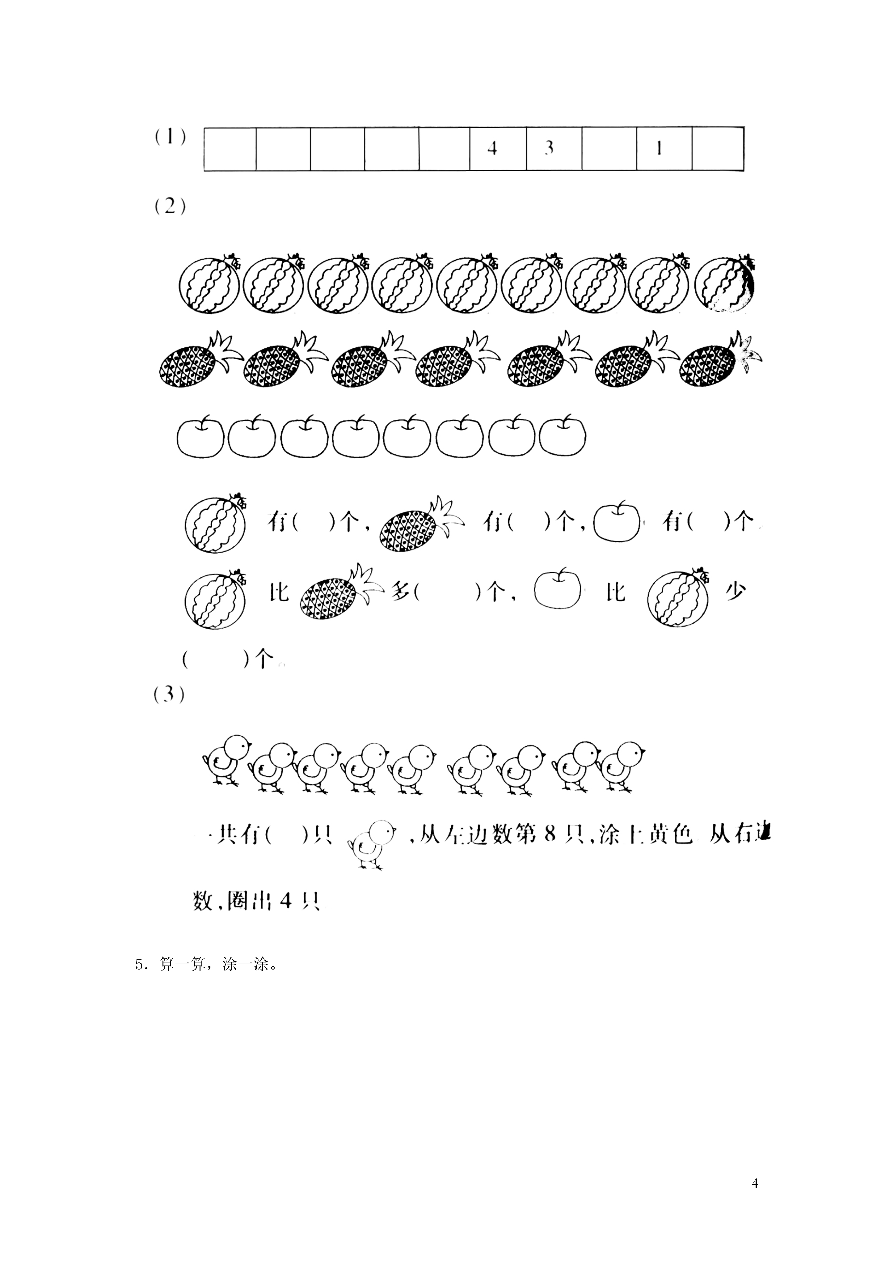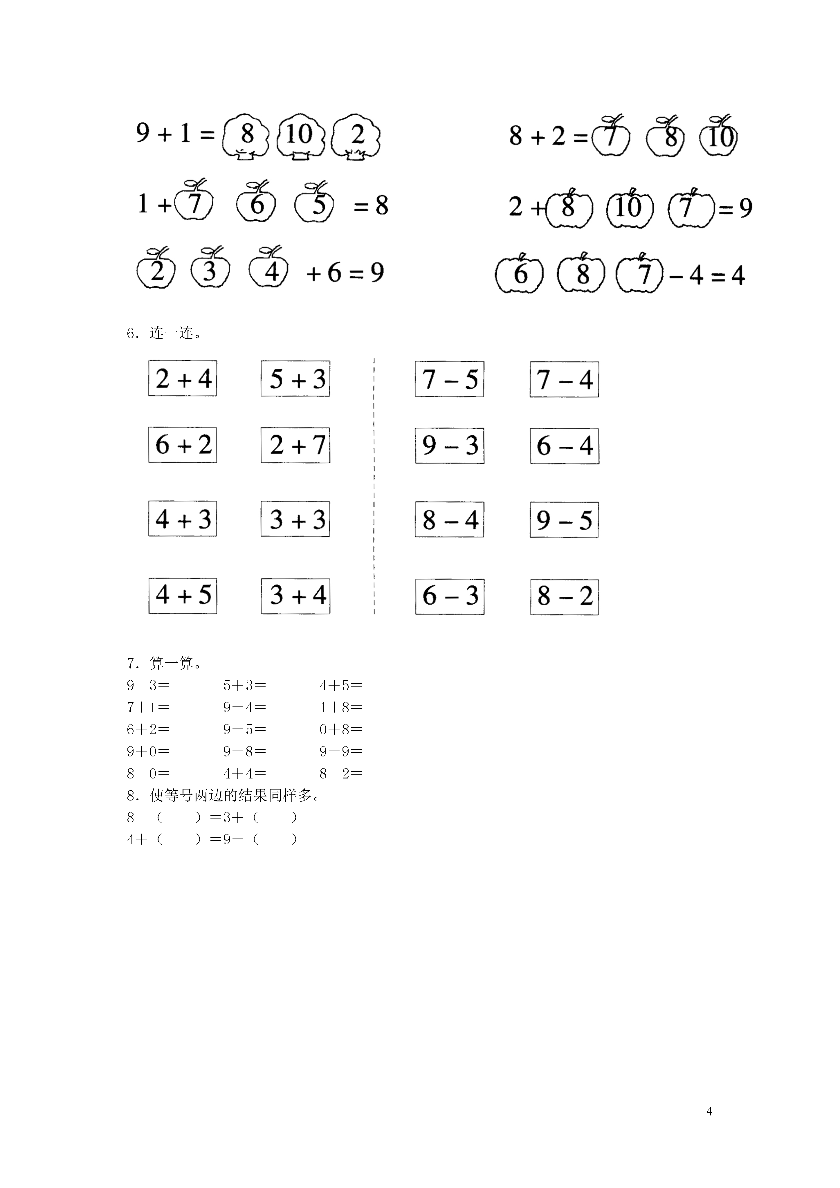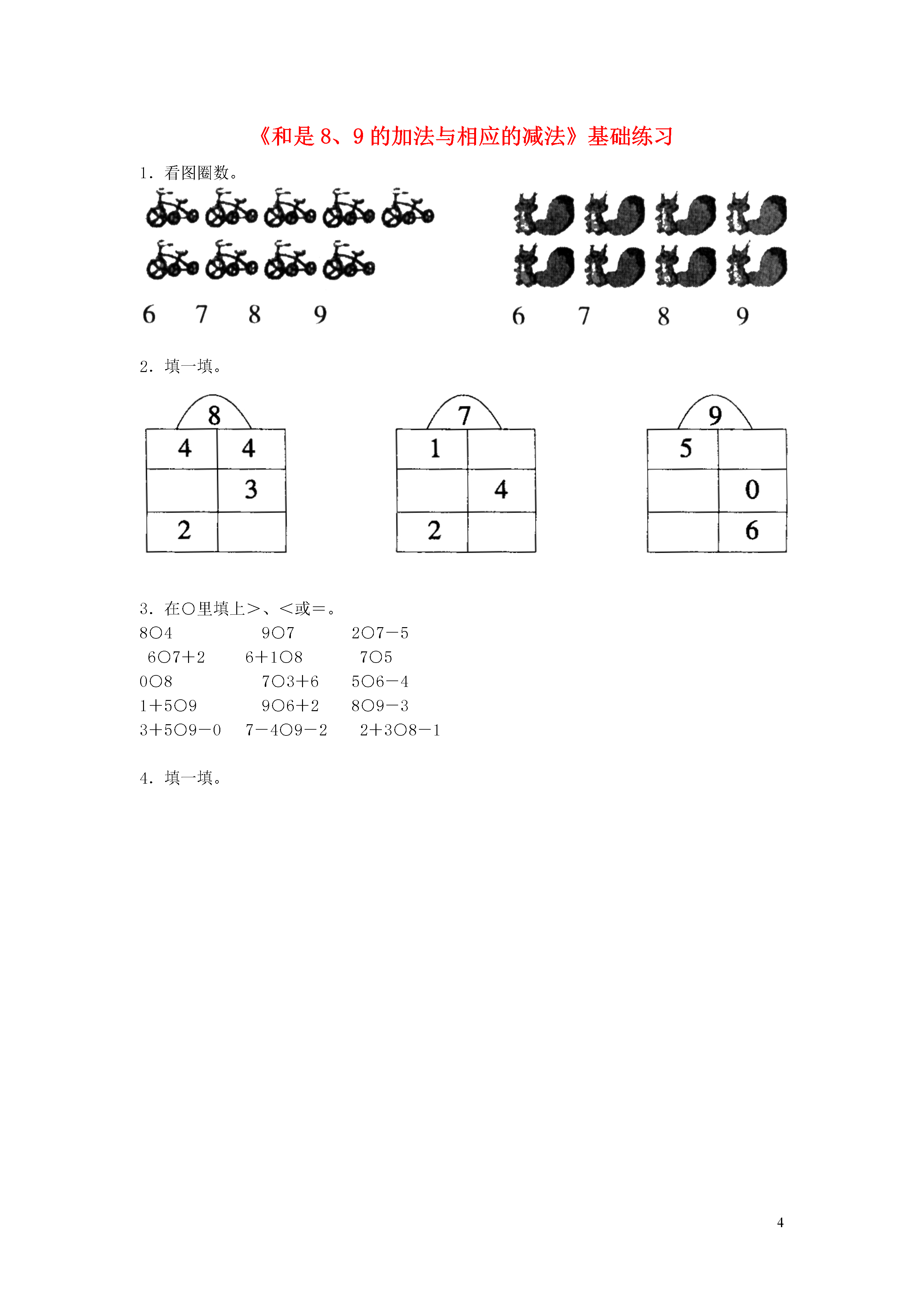 4《和是8、9的加法与相应的减法》基础练习1.看图圈数。2.填一填。3.在○里填上>、<或=。8○49○72○7-56○7+26+1○87○50○87○3+65○6-41+5○99○6+28○9-33+5○9-07-4○9-22+3○8-14.填一填。5.算一算,涂一涂。6.连一连。7.算一算。9-3=5+3=4+5=7+1=9-4=1+8=6+2=9-5=0+8=9+0=9-8=9-9=8-0=4+4=8-2=8.使等号两边的结果同样多。8-()=3+()4+()=9-()