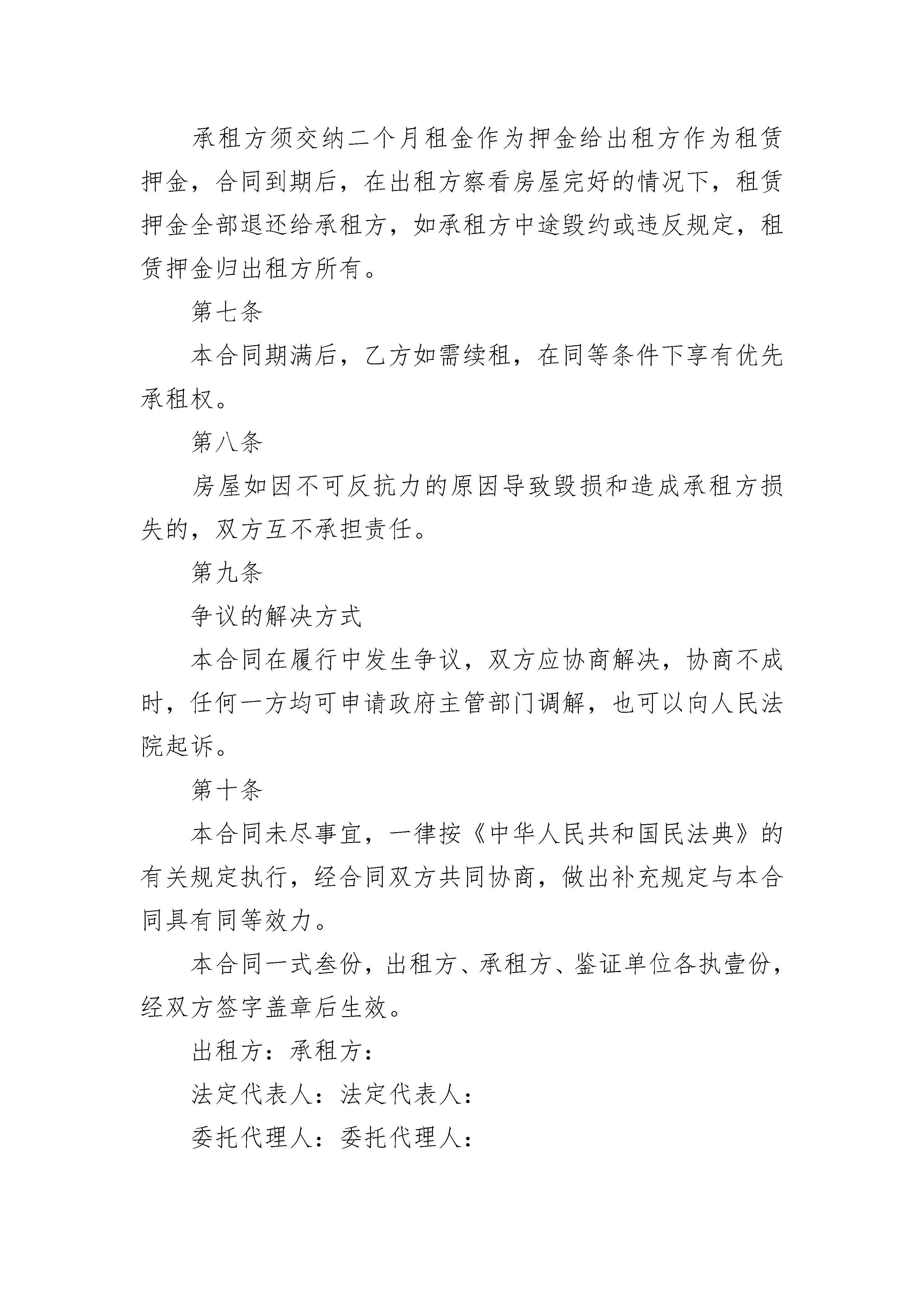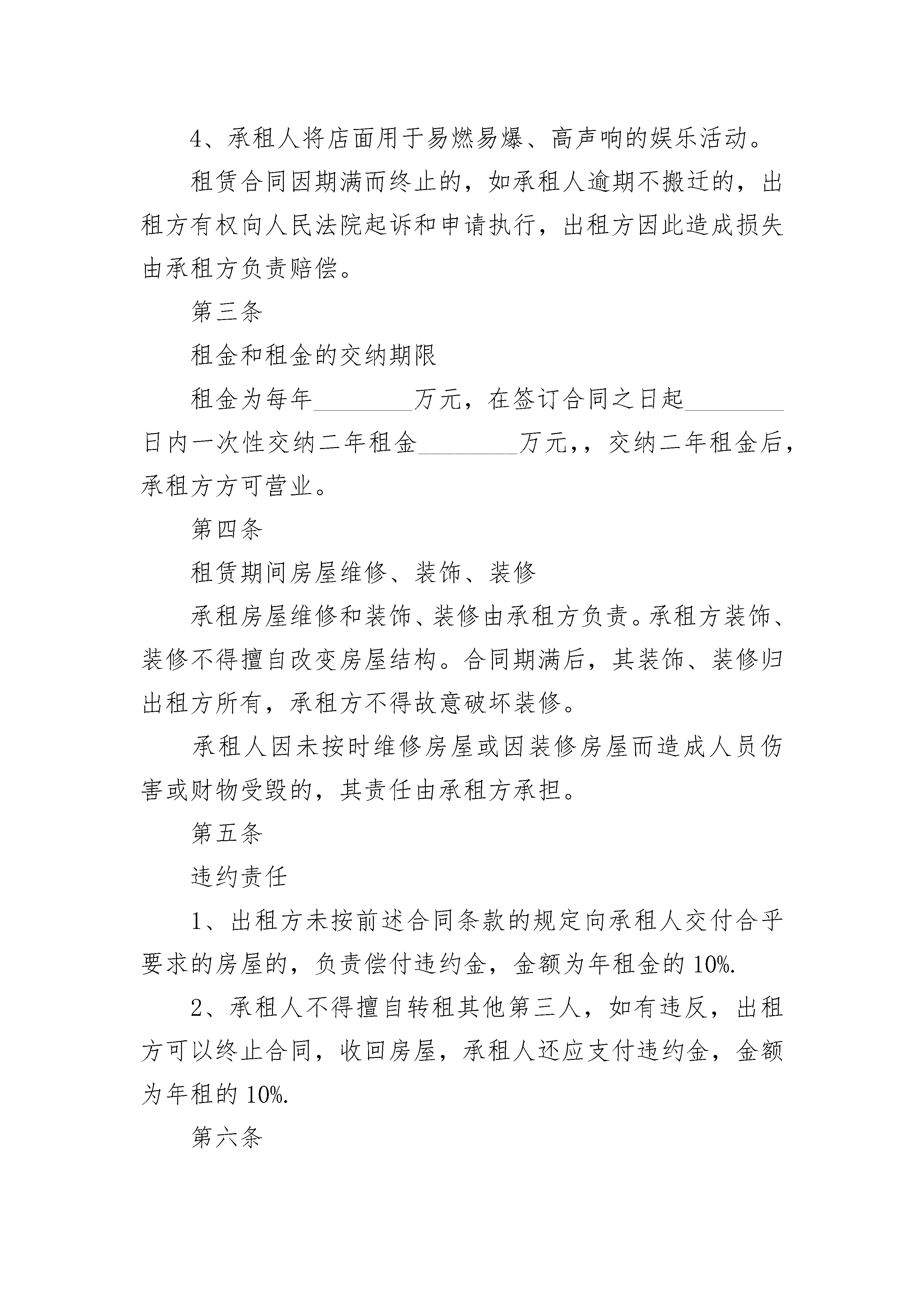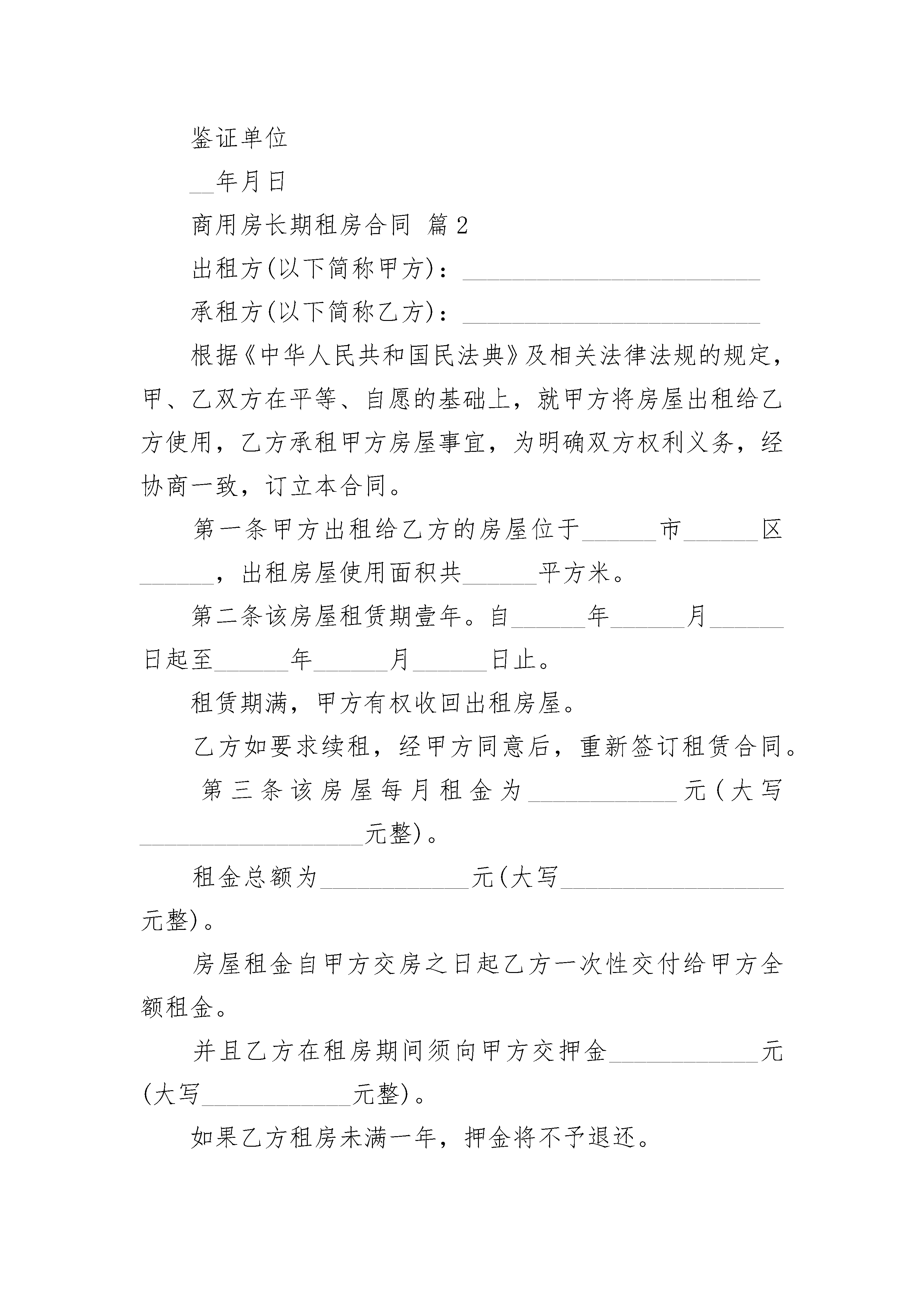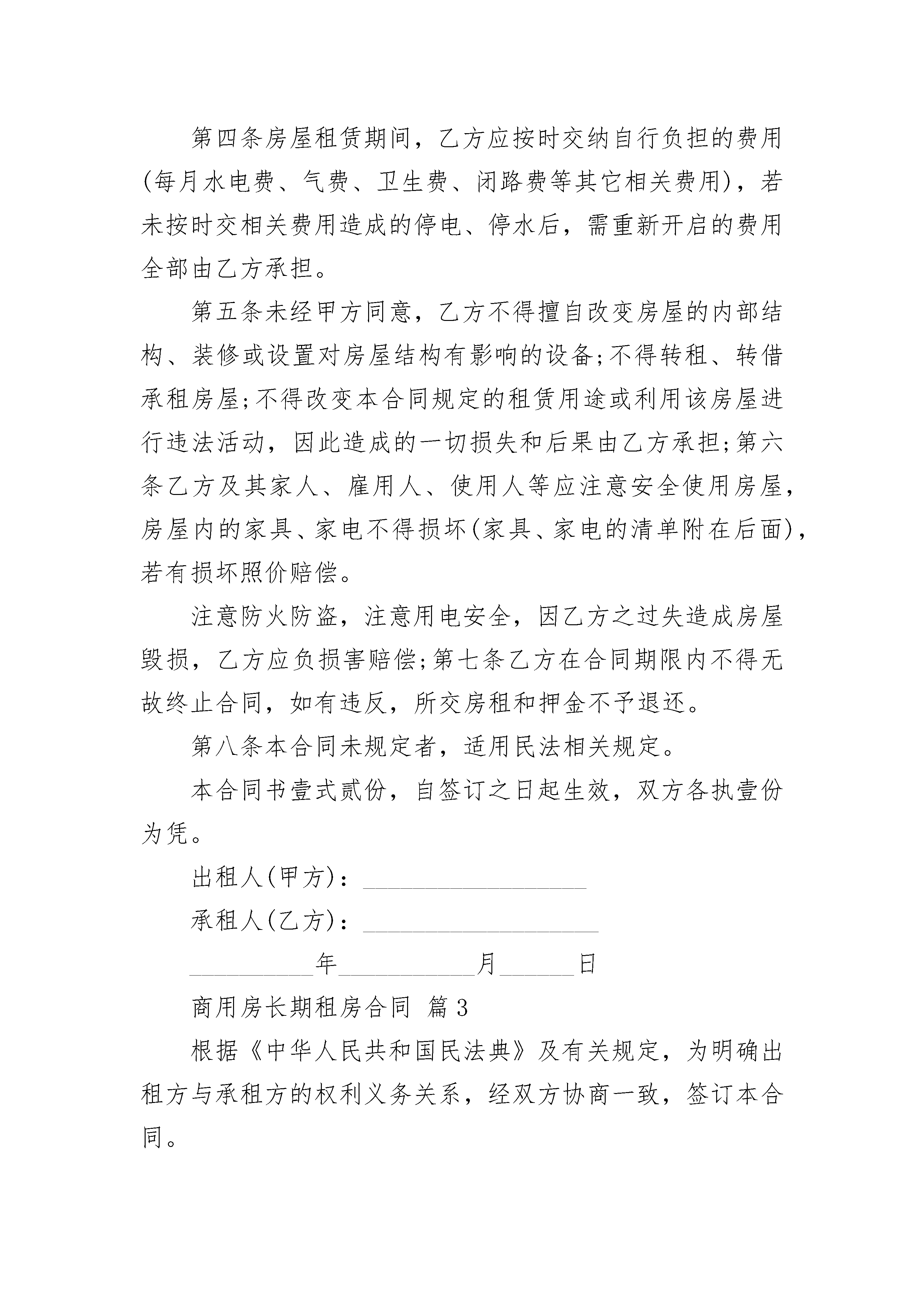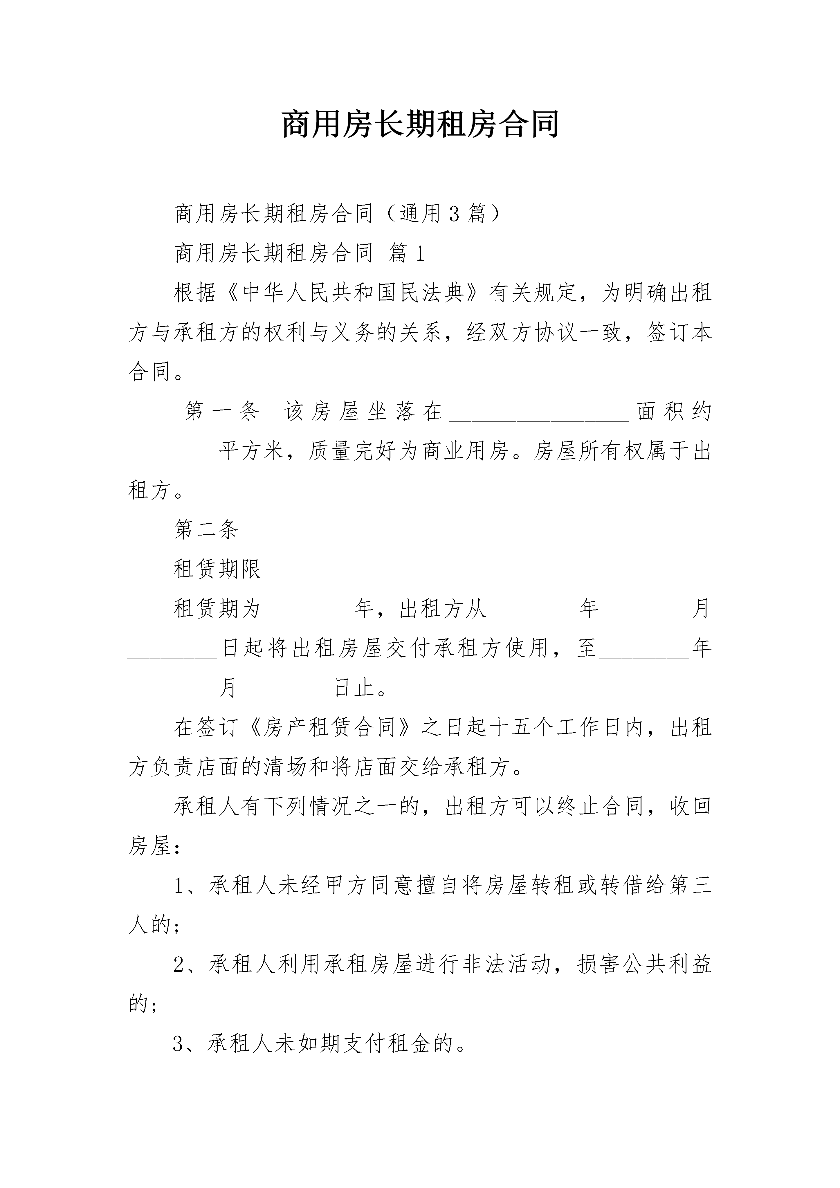 商用房长期租房合同商用房长期租房合同(通用3篇)商用房长期租房合同篇1根据《中华人民共和国民法典》有关规定,为明确出租方与承租方的权利与义务的关系,经双方协议一致,签订本合同。第一条该房屋坐落在________________面积约________平方米,质量完好为商业用房。房屋所有权属于出租方。第二条租赁期限租赁期为________年,出租方从________年________月________日起将出租房屋交付承租方使用,至________年________月________日止。在签订《房产租赁合同》之日起十五个工作日内,出租方负责店面的清场和将店面交给承租方。承租人有下列情况之一的,出租方可以终止合同,收回房屋:1、承租人未经甲方同意擅自将房屋转租或转借给第三人的;2、承租人利用承租房屋进行非法活动,损害公共利益的;3、承租人未如期支付租金的。4、承租人将店面用于易燃易爆、高声响的娱乐活动。租赁合同因期满而终止的,如承租人逾期不搬迁的,出租方有权向人民法院起诉和申请执行,出租方因此造成损失由承租方负责赔偿。第三条租金和租金的交纳期限租金为每年________万元,在签订合同之日起________日内一次性交纳二年租金________万元,,交纳二年租金后,承租方方可营业。第四条租赁期间房屋维修、装饰、装修承租房屋维修和装饰、装修由承租方负责。承租方装饰、装修不得擅自改变房屋结构。合同期满后,其装饰、装修归出租方所有,承租方不得故意破坏装修。承租人因未按时维修房屋或因装修房屋而造成人员伤害或财物受毁的,其责任由承租方承担。第五条违约责任1、出租方未按前述合同条款的规定向承租人交付合乎要求的房屋的,负责偿付违约金,金额为年租金的10%.2、承租人不得擅自转租其他第三人,如有违反,出租方可以终止合同,收回房屋,承租人还应支付违约金,金额为年租的10%.第六条承租方须交纳二个月租金作为押金给出租方作为租赁押金,合同到期后,在出租方察看房屋完好的情况下,租赁押金全部退还给承租方,如承租方中途毁约或违反规定,租赁押金归出租方所有。第七条本合同期满后,乙方如需续租,在同等条件下享有优先承租权。第八条房屋如因不可反抗力的原因导致毁损和造成承租方损失的,双方互不承担责任。第九条争议的解决方式本合同在履行中发生争议,双方应协商解决,协商不成时,任何一方均可申请政府主管部门调解,也可以向人民法院起诉。第十条本合同未尽事宜,一律按《中华人民共和国民法典》的有关规定执行,经合同双方共同协商,做出补充规定与本合同具有同等效力。本合同一式叁份,出租方、承租方、鉴证单位各执壹份,经双方签字盖章后生效。出租方:承租方:法定代表人:法定代表人:委托代理人:委托代理人:鉴证单位__年月日商用房长期租房合同篇2出租方(以下简称甲方):________________________承租方(以下简称乙方):________________________根据《中华人民共和国民法典》及相关法律法规的规定,甲、乙双方在平等、自愿的基础上,就甲方将房屋出租给乙方使用,乙方承租甲方房屋事宜,为明确双方权利义务,经协商一致,订立本合同。第一条甲方出租给乙方的房屋位于______市______区______,出租房屋使用面积共______平方米。第二条该房屋租赁期壹年。自______年______月______日起至______年______月______日止。租赁期满,甲方有权收回出租房屋。乙方如要求续租,经甲方同意后,重新签订租赁合同。第三条该房屋每月租金为____________元(大写__________________元整)。租金总额为____________元(大写__________________元整)。房屋租金自甲方交房之日起乙方一次性交付给甲方全额租金。并且乙方在租房期间须向甲方交押金____________元(大写____________元整)。如果乙方租房未满一年,押金将不予退还。第四条房屋租赁期间,乙方应按时交纳自行负担的费用(每月水电费、气费、卫生费、闭路费等其它相关费用),若未按时交相关费用造成的停电、停水后,需重新开启的费用全部由乙方承担。第五条未经甲方同意,乙方不得擅自改变房屋的内部结构、装修或设置对房屋结构有影响的设备;不得转租、转借承租房屋;不得改变本合同规定的租赁用途或利用该房屋进行违法活动,因此造成的一切损失和后果由乙方承担;第六条乙方及其家人、雇用人、使用人等应注意安全使用房屋,房屋内的家具、家电不得损坏(家具、家电的清单附在后面),若有损坏照价赔偿。注意防火防盗,注意用电安全,因乙方之过失造成房屋毁损,乙方应负损害赔偿;第七条乙方在合同期限内不得无故终止合同,如有违反,所交房租和押金不予退还。第八条本合同未规定者,适用民法