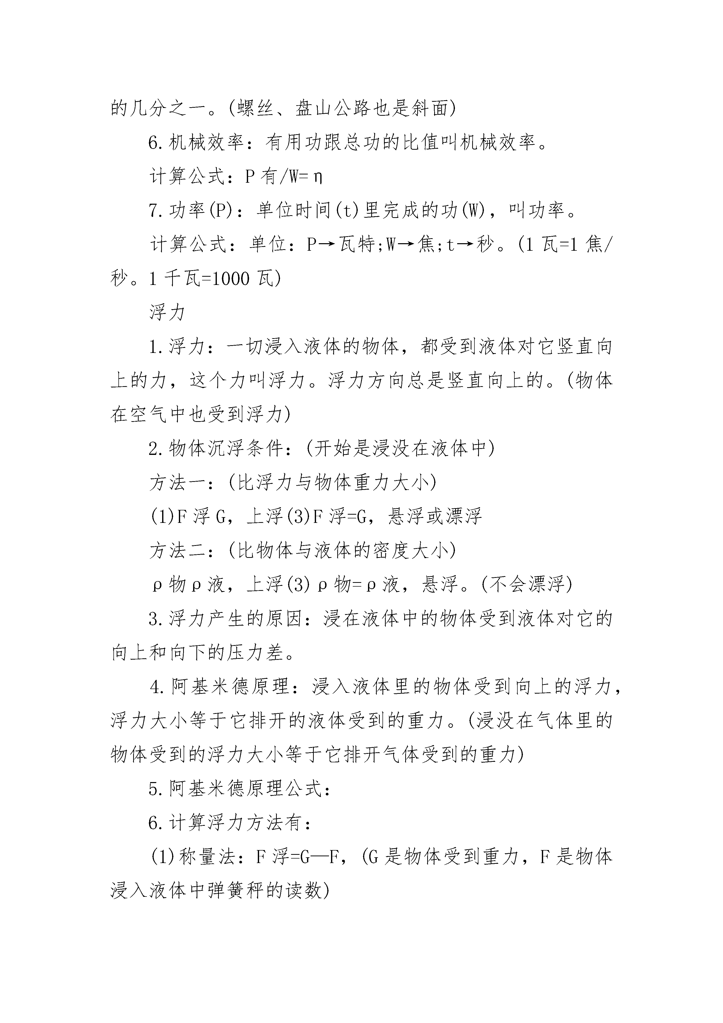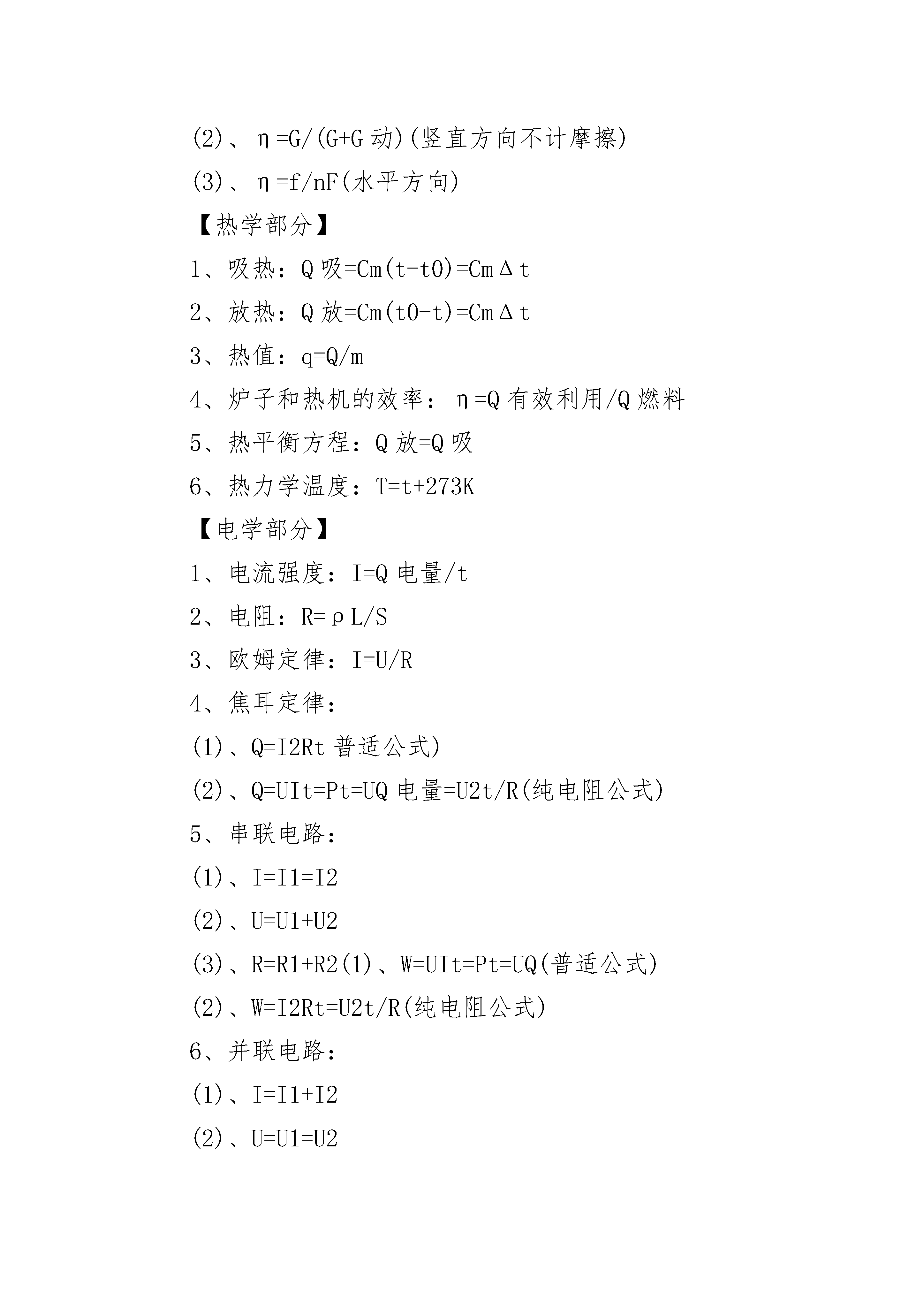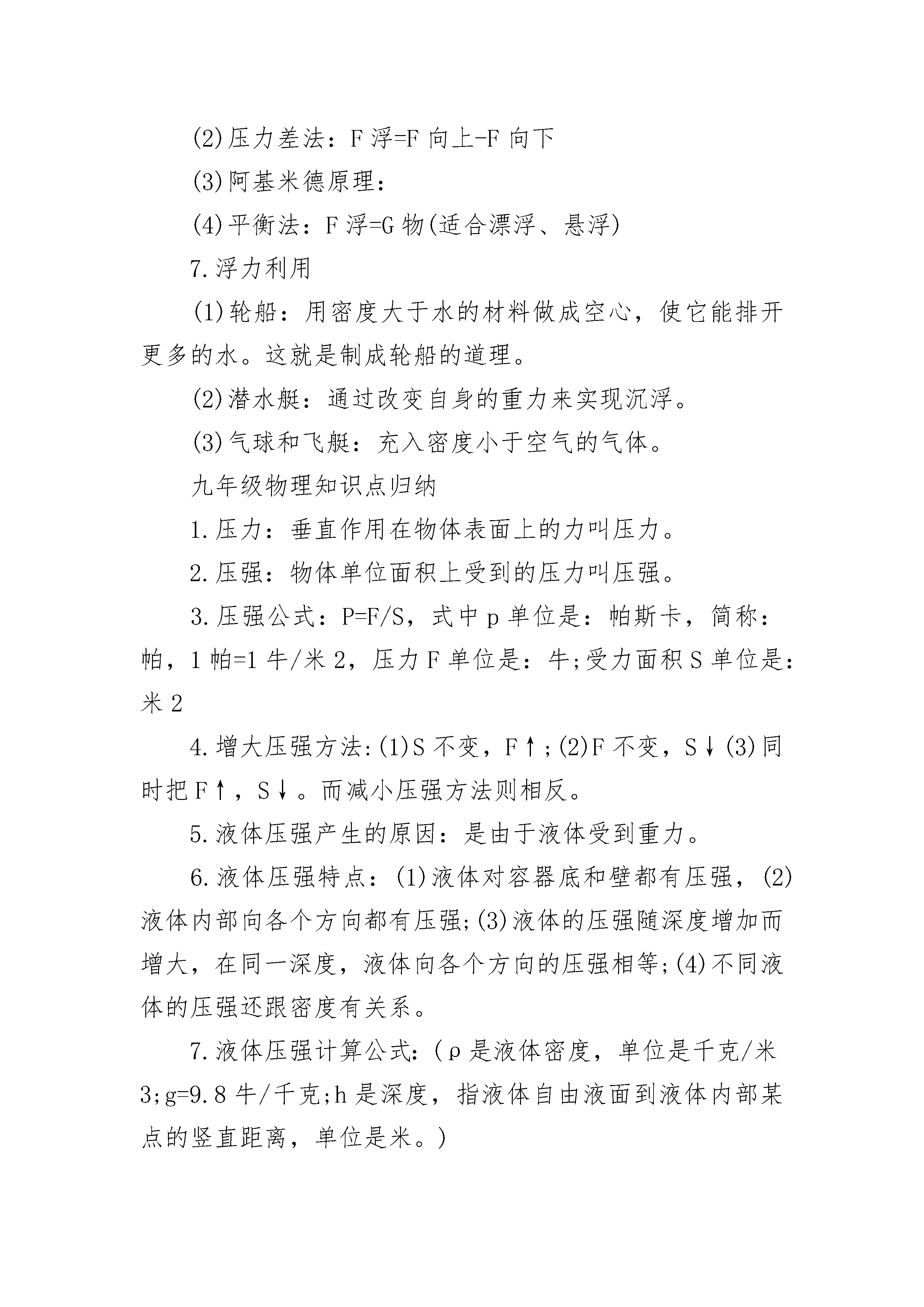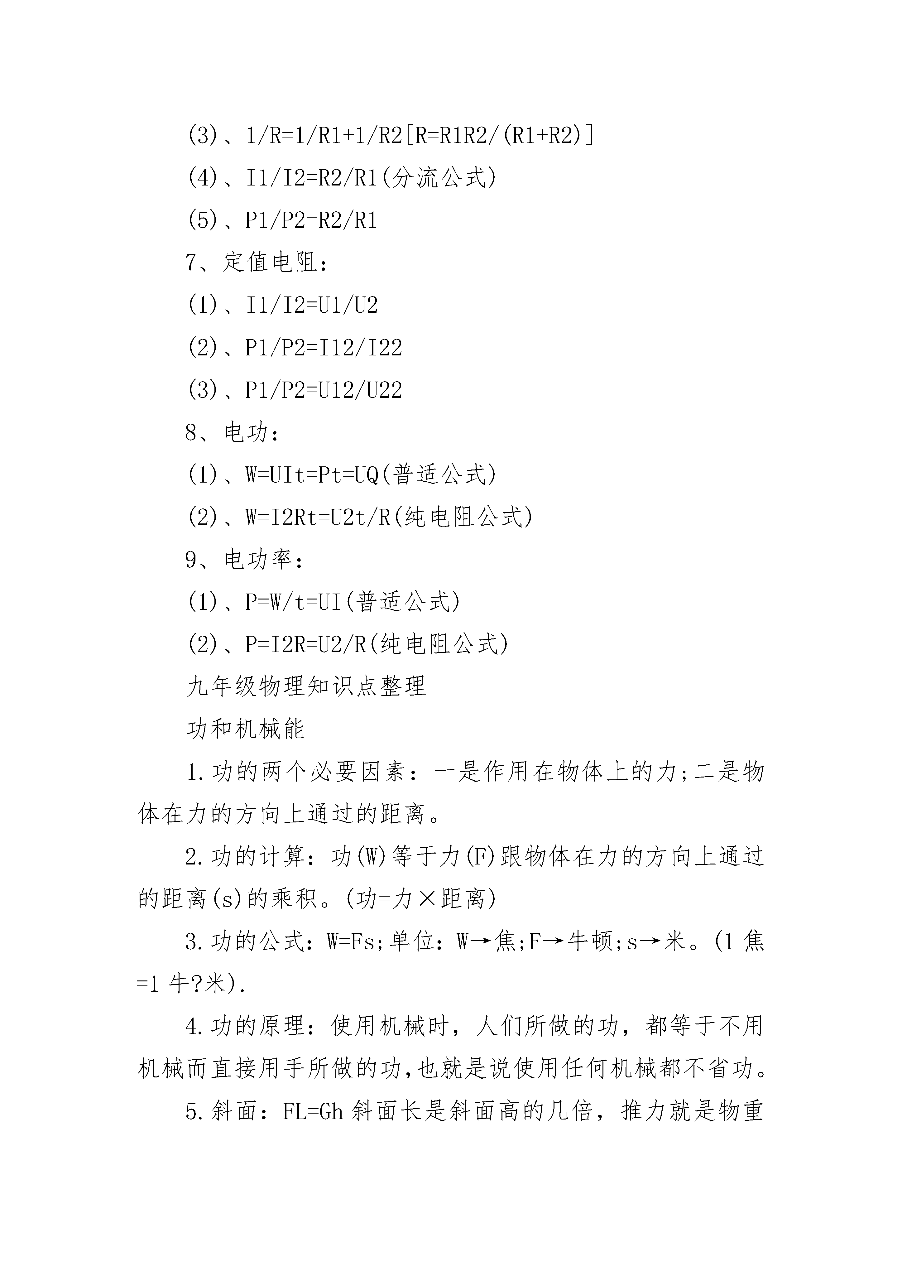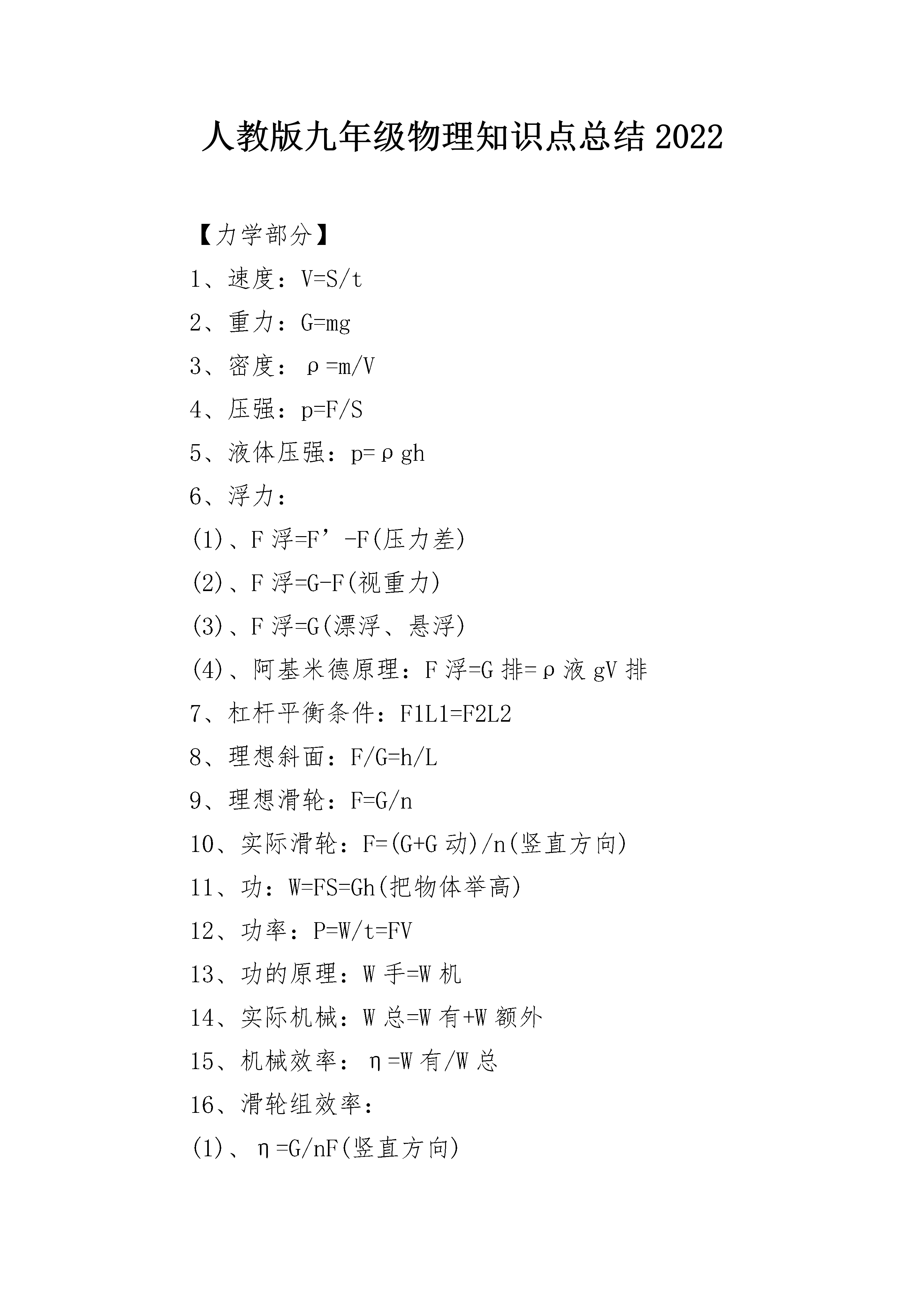 人教版九年级物理知识点总结2022【力学部分】1、速度:V=S/t2、重力:G=mg3、密度:ρ=m/V4、压强:p=F/S5、液体压强:p=ρgh6、浮力:(1)、F浮=F’-F(压力差)(2)、F浮=G-F(视重力)(3)、F浮=G(漂浮、悬浮)(4)、阿基米德原理:F浮=G排=ρ液gV排7、杠杆平衡条件:F1L1=F2L28、理想斜面:F/G=h/L9、理想滑轮:F=G/n10、实际滑轮:F=(G+G动)/n(竖直方向)11、功:W=FS=Gh(把物体举高)12、功率:P=W/t=FV13、功的原理:W手=W机14、实际机械:W总=W有+W额外15、机械效率:η=W有/W总16、滑轮组效率:(1)、η=G/nF(竖直方向)(2)、η=G/(G+G动)(竖直方向不计摩擦)(3)、η=f/nF(水平方向)【热学部分】1、吸热:Q吸=Cm(t-t0)=CmΔt2、放热:Q放=Cm(t0-t)=CmΔt3、热值:q=Q/m4、炉子和热机的效率:η=Q有效利用/Q燃料5、热平衡方程:Q放=Q吸6、热力学温度:T=t+273K【电学部分】1、电流强度:I=Q电量/t2、电阻:R=ρL/S3、欧姆定律:I=U/R4、焦耳定律:(1)、Q=I2Rt普适公式)(2)、Q=UIt=Pt=UQ电量=U2t/R(纯电阻公式)5、串联电路:(1)、I=I1=I2(2)、U=U1+U2(3)、R=R1+R2(1)、W=UIt=Pt=UQ(普适公式)(2)、W=I2Rt=U2t/R(纯电阻公式)6、并联电路:(1)、I=I1+I2(2)、U=U1=U2(3)、1/R=1/R1+1/R2[R=R1R2/(R1+R2)](4)、I1/I2=R2/R1(分流公式)(5)、P1/P2=R2/R17、定值电阻:(1)、I1/I2=U1/U2(2)、P1/P2=I12/I22(3)、P1/P2=U12/U228、电功:(1)、W=UIt=Pt=UQ(普适公式)(2)、W=I2Rt=U2t/R(纯电阻公式)9、电功率:(1)、P=W/t=UI(普适公式)(2)、P=I2R=U2/R(纯电阻公式)九年级物理知识点整理功和机械能1.功的两个必要因素:一是作用在物体上的力;二是物体在力的方向上通过的距离。2.功的计算:功(W)等于力(F)跟物体在力的方向上通过的距离(s)的乘积。(功=力×距离)3.功的公式:W=Fs;单位:W→焦;F→牛顿;s→米。(1焦=1牛?米).4.功的原理:使用机械时,人们所做的功,都等于不用机械而直接用手所做的功,也就是说使用任何机械都不省功。5.斜面:FL=Gh斜面长是斜面高的几倍,推力就是物重的几分之一。(螺丝、盘山公路也是斜面)6.机械效率:有用功跟总功的比值叫机械效率。计算公式:P有/W=η7.功率(P):单位时间(t)里完成的功(W),叫功率。计算公式:单位:P→瓦特;W→焦;t→秒。(1瓦=1焦/秒。1千瓦=1000瓦)浮力1.浮力:一切浸入液体的物体,都受到液体对它竖直向上的力,这个力叫浮力。浮力方向总是竖直向上的。(物体在空气中也受到浮力)2.物体沉浮条件:(开始是浸没在液体中)方法一:(比浮力与物体重力大小)(1)F浮G,上浮(3)F浮=G,悬浮或漂浮方法二:(比物体与液体的密度大小)ρ物ρ液,上浮(3)ρ物=ρ液,悬浮。(不会漂浮)3.浮力产生的原因:浸在液体中的物体受到液体对它的向上和向下的压力差。4.阿基米德原理:浸入液体里的物体受到向上的浮力,浮力大小等于它排开的液体受到的重力。(浸没在气体里的物体受到的浮力大小等于它排开气体受到的重力)5.阿基米德原理公式:6.计算浮力方法有:(1)称量法:F浮=G—F,(G是物体受到重力,F是物体浸入液体中弹簧秤的读数)(2)压力差法:F浮=F向上-F向下(3)阿基米德原理:(4)平衡法:F浮=G物(适合漂浮、悬浮)7.浮力利用(1)轮船:用密度大于水的材料做成空心,使它能排开更多的水。这就是制成轮船的道理。(2)潜水艇:通过改变自身的重力来实现沉浮。(3)气球和飞艇:充入密度小于空气的气体。九年级物理知识点归纳1.压力:垂直作用在物体表面上的力叫压力。2.压强:物体单位面积上受到的压力叫压强。3.压强公式:P=F/S,式中p单位是:帕斯卡,简称:帕,1帕=1牛/米2,压力F单位是:牛;受力面积S单位是:米24.增大压强方法:(1)S不变,F↑;(2)F不变,S↓(3)同时把F↑,S↓。而减小压强方法则相反。5.液体压强产生的原因:是由于液体受到重力。6.液体压强特点:(1)液体对容器底和壁都有压强,(2)液体内部向各个方向都有压强;(3)液体的压强随深度增加而增大,在同一深度,液体向各个方向的压强相等;(4)不同液体的压强还跟密度有关系。7.液体压强计算公式:(ρ是液体密度