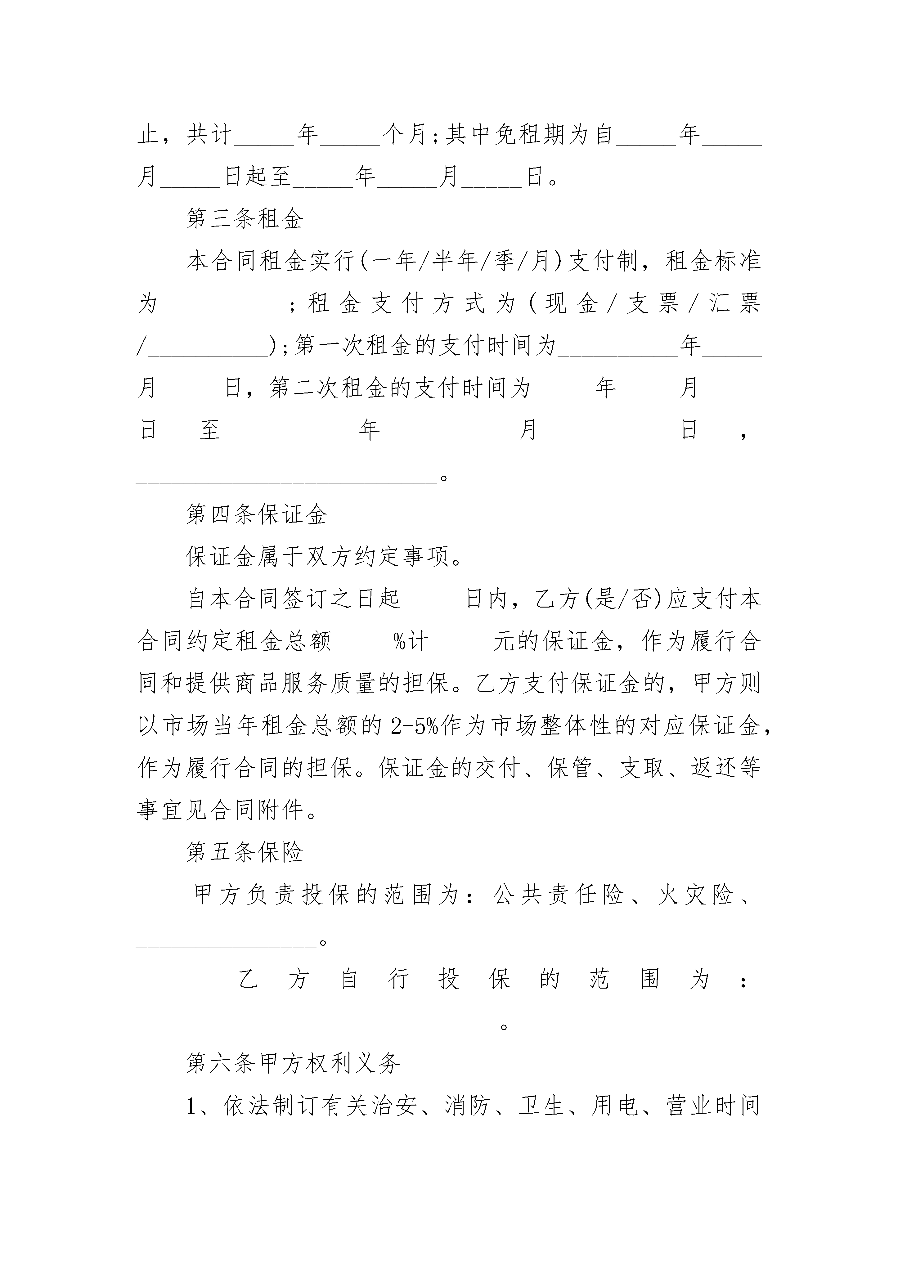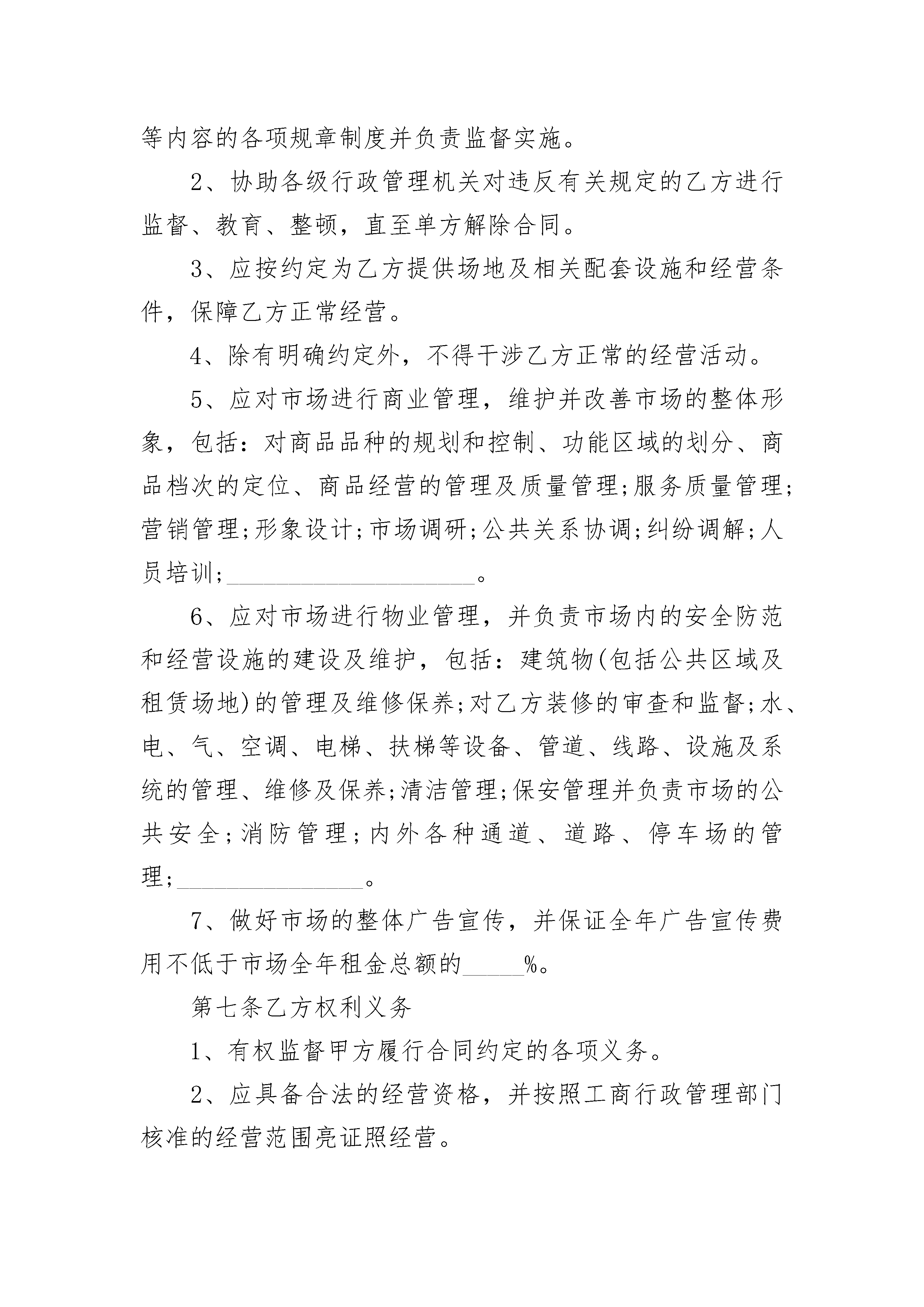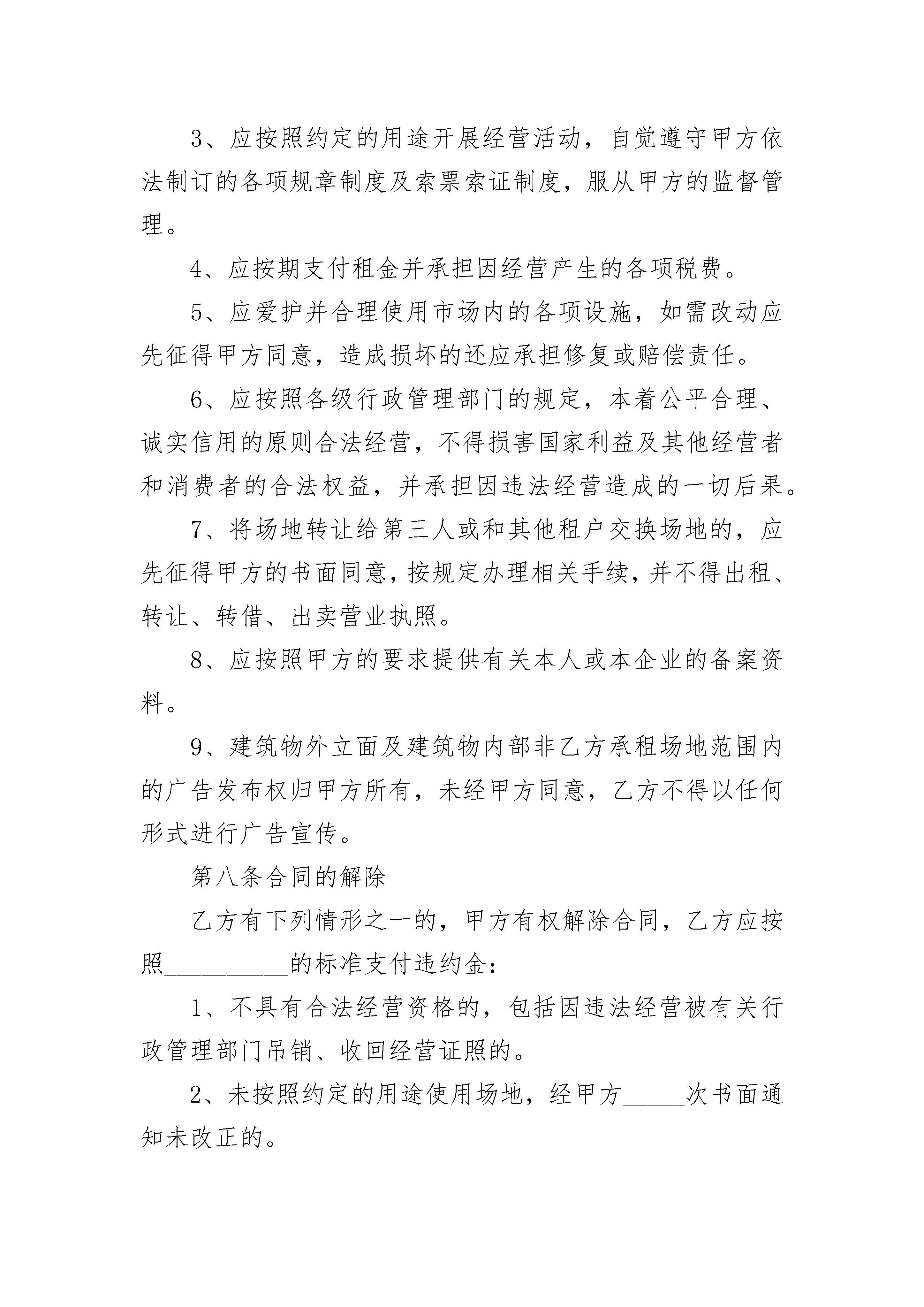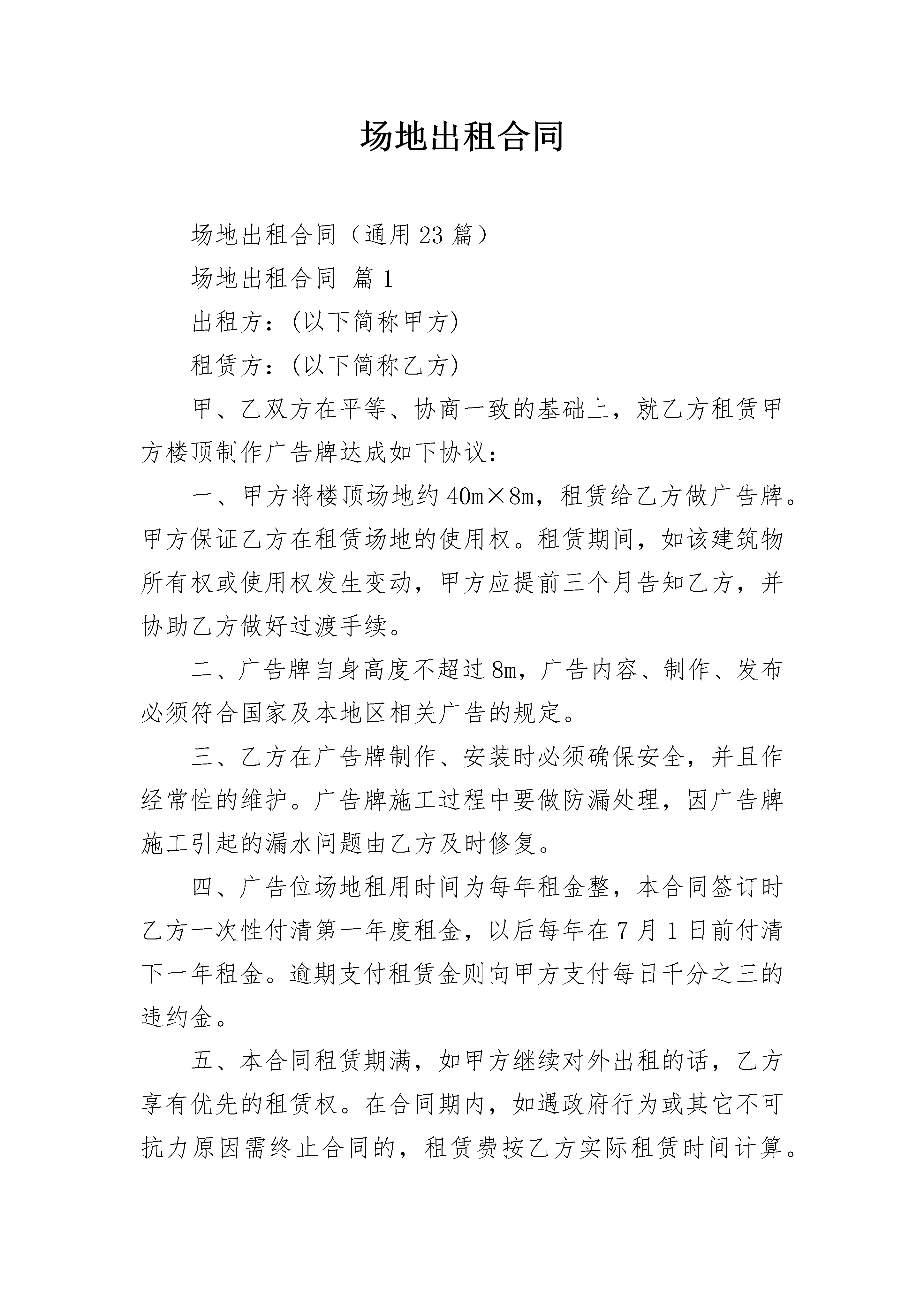 场地出租合同场地出租合同(通用23篇)场地出租合同篇1出租方:(以下简称甲方)租赁方:(以下简称乙方)甲、乙双方在平等、协商一致的基础上,就乙方租赁甲方楼顶制作广告牌达成如下协议:一、甲方将楼顶场地约40m×8m,租赁给乙方做广告牌。甲方保证乙方在租赁场地的使用权。租赁期间,如该建筑物所有权或使用权发生变动,甲方应提前三个月告知乙方,并协助乙方做好过渡手续。二、广告牌自身高度不超过8m,广告内容、制作、发布必须符合国家及本地区相关广告的规定。三、乙方在广告牌制作、安装时必须确保安全,并且作经常性的维护。广告牌施工过程中要做防漏处理,因广告牌施工引起的漏水问题由乙方及时修复。四、广告位场地租用时间为每年租金整,本合同签订时乙方一次性付清第一年度租金,以后每年在7月1日前付清下一年租金。逾期支付租赁金则向甲方支付每日千分之三的违约金。五、本合同租赁期满,如甲方继续对外出租的话,乙方享有优先的租赁权。在合同期内,如遇政府行为或其它不可抗力原因需终止合同的,租赁费按乙方实际租赁时间计算。六、甲方提供乙方发布广告期间的所需电源。电费按电力部门对甲方收费标准计价,乙方每月向甲方支付电费,不得拖欠。逾期支付电费的,则向甲方支付每日千分之三的违约金,甲方并可采取停电方式追讨电费。七、本合同自双方签字生效。在执行过程中如有争议,双方协商,协商不成,双方均可依法向法院提起诉讼。八、本合同一式两份,甲、乙双方各执一份,具同等效力。甲方(公章):_________乙方(公章):_________法定代表人(签字):_________法定代表人(签字):__________________年____月____日_________年____月____日场地出租合同篇2出租人(甲方):________________承租人(乙方):________________根据《中华人民共和国合同法》等有关法律、法规的规定,双方就租赁场地从事经营的事宜经协商达成协议如下:第一条租赁场地乙方承租甲方________(层/厅)________号场地,面积________平方米,用途以营业执照核准的经营范围为准;库房________平方米,库房位置为________________________。第二条租赁期限自_____年_____月_____日起至_____年_____月_____日止,共计_____年_____个月;其中免租期为自_____年_____月_____日起至_____年_____月_____日。第三条租金本合同租金实行(一年/半年/季/月)支付制,租金标准为__________;租金支付方式为(现金/支票/汇票/__________);第一次租金的支付时间为__________年_____月_____日,第二次租金的支付时间为_____年_____月_____日至_____年_____月_____日,_________________________。第四条保证金保证金属于双方约定事项。自本合同签订之日起_____日内,乙方(是/否)应支付本合同约定租金总额_____%计_____元的保证金,作为履行合同和提供商品服务质量的担保。乙方支付保证金的,甲方则以市场当年租金总额的2-5%作为市场整体性的对应保证金,作为履行合同的担保。保证金的交付、保管、支取、返还等事宜见合同附件。第五条保险甲方负责投保的范围为:公共责任险、火灾险、_______________。乙方自行投保的范围为:______________________________。第六条甲方权利义务1、依法制订有关治安、消防、卫生、用电、营业时间等内容的各项规章制度并负责监督实施。2、协助各级行政管理机关对违反有关规定的乙方进行监督、教育、整顿,直至单方解除合同。3、应按约定为乙方提供场地及相关配套设施和经营条件,保障乙方正常经营。4、除有明确约定外,不得干涉乙方正常的经营活动。5、应对市场进行商业管理,维护并改善市场的整体形象,包括:对商品品种的规划和控制、功能区域的划分、商品档次的定位、商品经营的管理及质量管理;服务质量管理;营销管理;形象设计;市场调研;公共关系协调;纠纷调解;人员培训;____________________。6、应对市场进行物业管理,并负责市场内的安全防范和经营设施的建设及维护,包括:建筑物(包括公共区域及租赁场地)的管理及维修保养;对乙方装修的审查和监督;水、电、气、空调、电梯、扶梯等设备、管道、线路、设施及系统的管理、维修及保养;清洁管理;保安管理并负责市场的公共安全;消防管理;内外各种通道、道路、停车场的管理;_______________。7、做好市场的整体广告宣传,并保证全年广告宣传费用不低于市场全年租金总额的_____%。第七条乙方权利义务1、有权监督