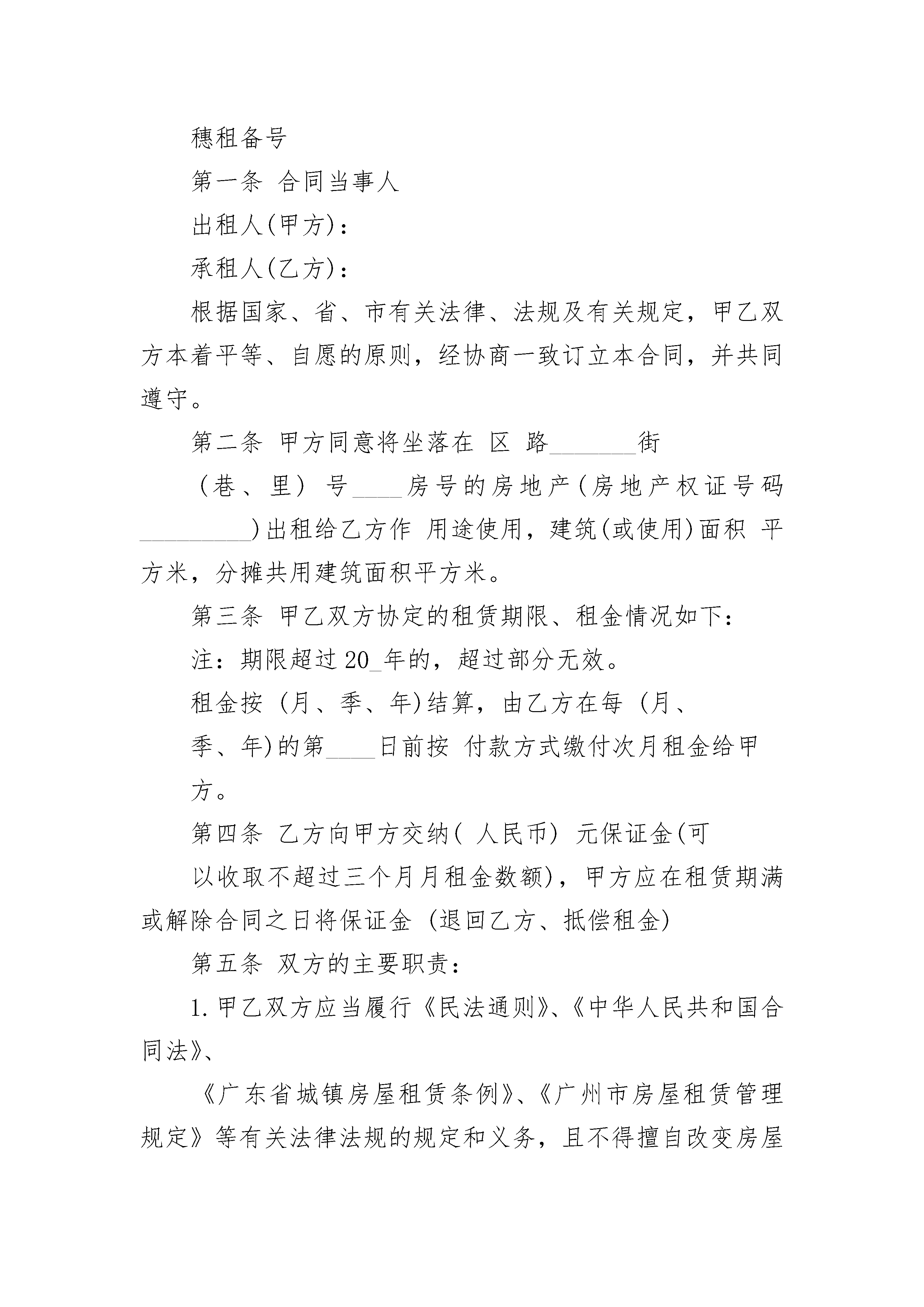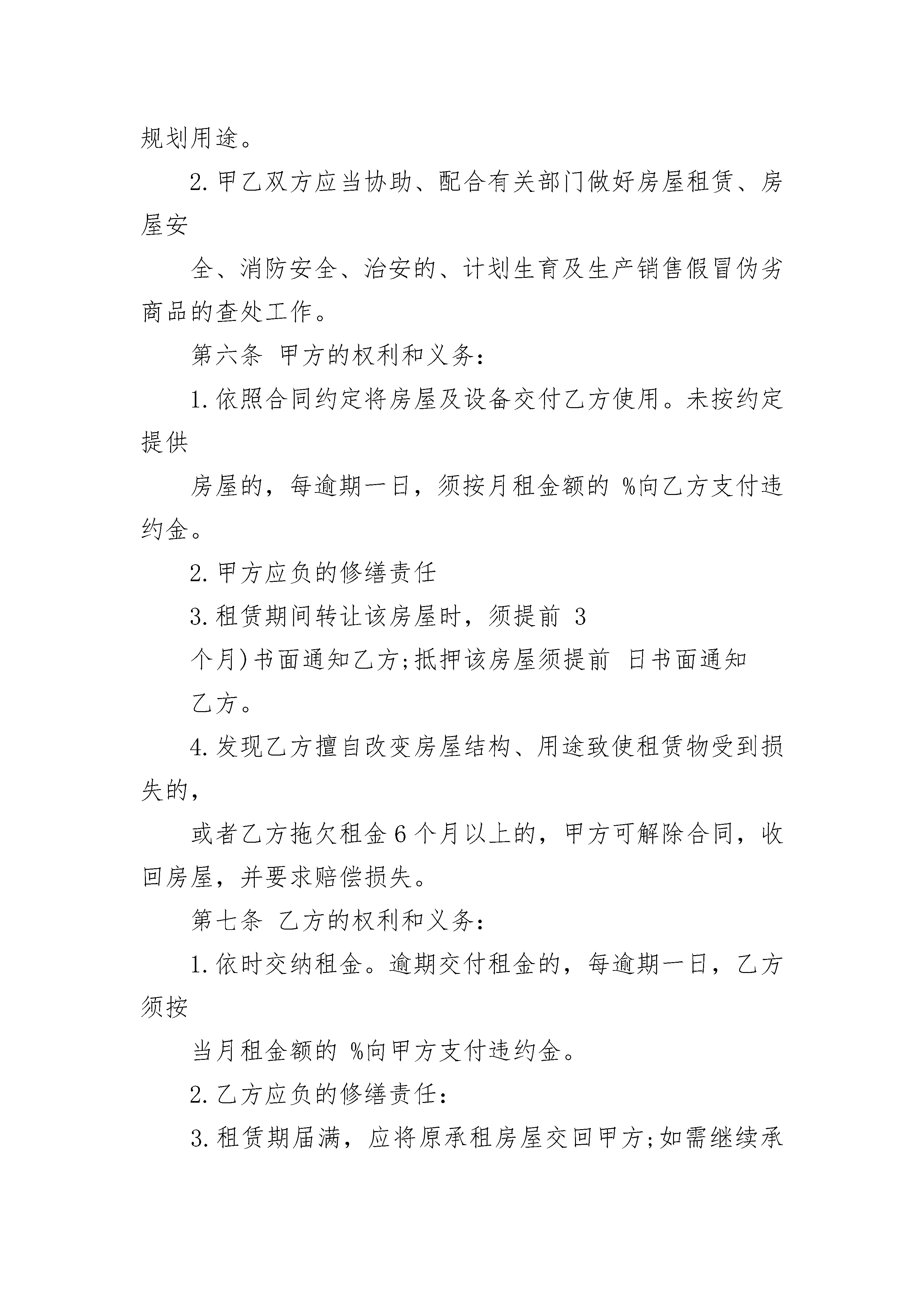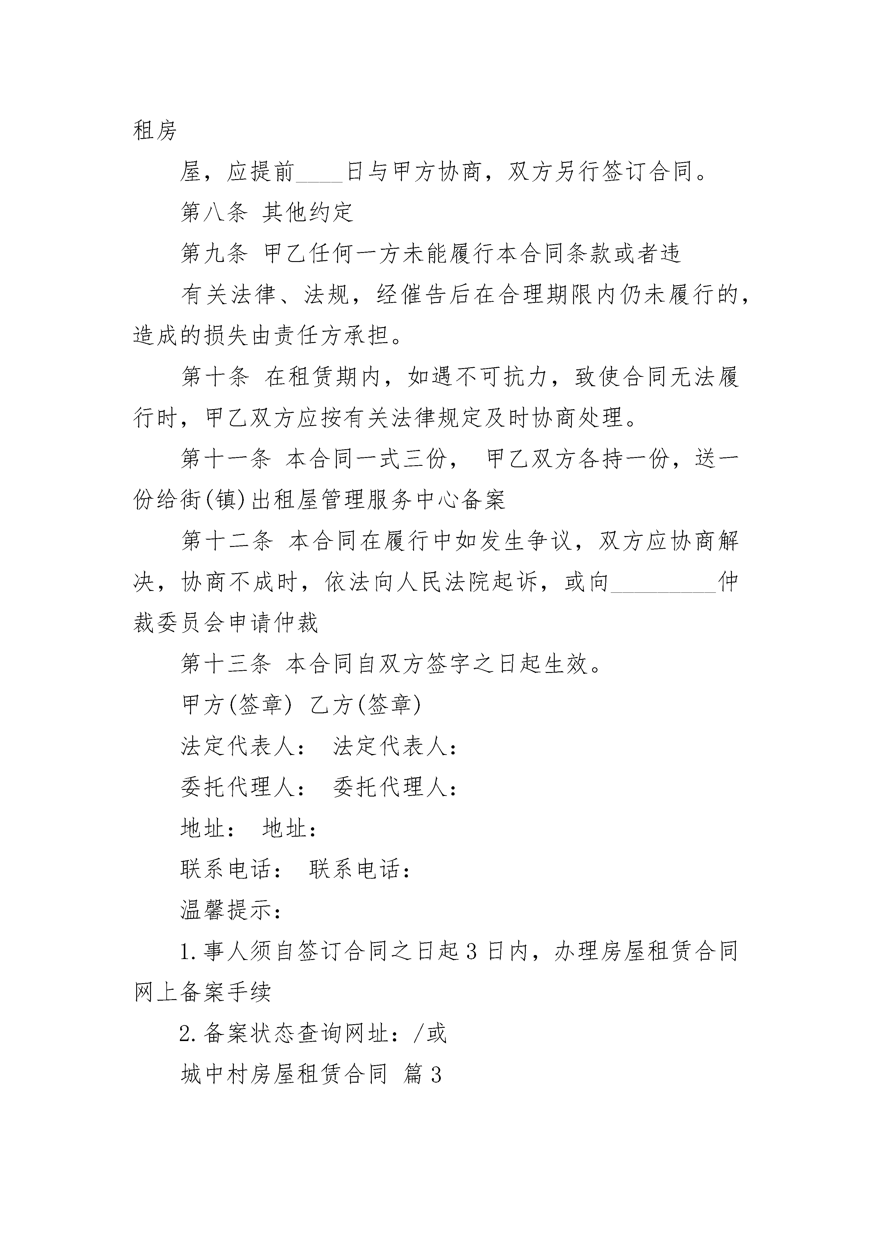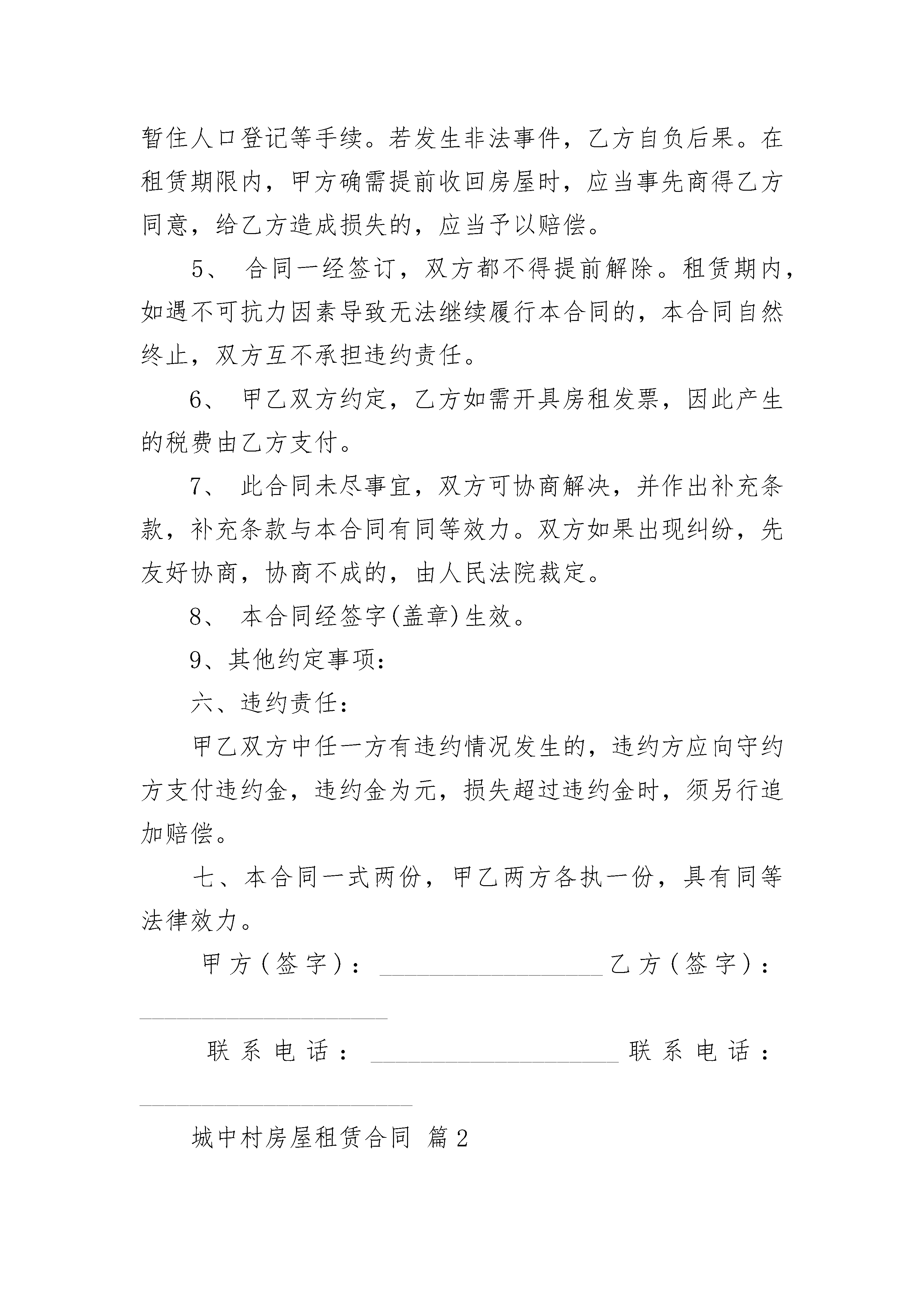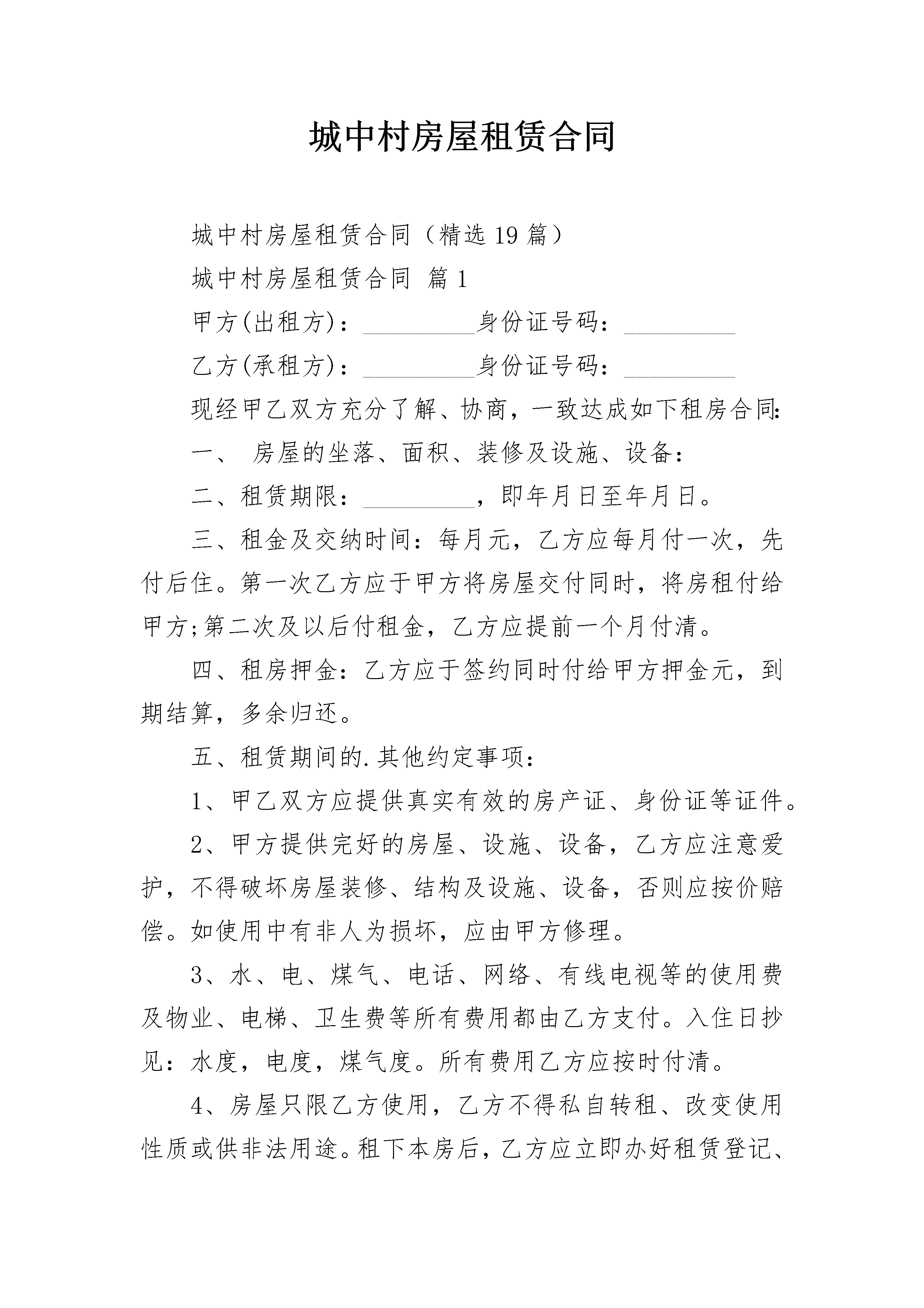 城中村房屋租赁合同城中村房屋租赁合同(精选19篇)城中村房屋租赁合同篇1甲方(出租方):_________身份证号码:_________乙方(承租方):_________身份证号码:_________现经甲乙双方充分了解、协商,一致达成如下租房合同:一、房屋的坐落、面积、装修及设施、设备:二、租赁期限:_________,即年月日至年月日。三、租金及交纳时间:每月元,乙方应每月付一次,先付后住。第一次乙方应于甲方将房屋交付同时,将房租付给甲方;第二次及以后付租金,乙方应提前一个月付清。四、租房押金:乙方应于签约同时付给甲方押金元,到期结算,多余归还。五、租赁期间的.其他约定事项:1、甲乙双方应提供真实有效的房产证、身份证等证件。2、甲方提供完好的房屋、设施、设备,乙方应注意爱护,不得破坏房屋装修、结构及设施、设备,否则应按价赔偿。如使用中有非人为损坏,应由甲方修理。3、水、电、煤气、电话、网络、有线电视等的使用费及物业、电梯、卫生费等所有费用都由乙方支付。入住日抄见:水度,电度,煤气度。所有费用乙方应按时付清。4、房屋只限乙方使用,乙方不得私自转租、改变使用性质或供非法用途。租下本房后,乙方应立即办好租赁登记、暂住人口登记等手续。若发生非法事件,乙方自负后果。在租赁期限内,甲方确需提前收回房屋时,应当事先商得乙方同意,给乙方造成损失的,应当予以赔偿。5、合同一经签订,双方都不得提前解除。租赁期内,如遇不可抗力因素导致无法继续履行本合同的,本合同自然终止,双方互不承担违约责任。6、甲乙双方约定,乙方如需开具房租发票,因此产生的税费由乙方支付。7、此合同未尽事宜,双方可协商解决,并作出补充条款,补充条款与本合同有同等效力。双方如果出现纠纷,先友好协商,协商不成的,由人民法院裁定。8、本合同经签字(盖章)生效。9、其他约定事项:六、违约责任:甲乙双方中任一方有违约情况发生的,违约方应向守约方支付违约金,违约金为元,损失超过违约金时,须另行追加赔偿。七、本合同一式两份,甲乙两方各执一份,具有同等法律效力。甲方(签字):__________________乙方(签字):____________________联系电话:____________________联系电话:______________________城中村房屋租赁合同篇2穗租备号第一条合同当事人出租人(甲方):承租人(乙方):根据国家、省、市有关法律、法规及有关规定,甲乙双方本着平等、自愿的原则,经协商一致订立本合同,并共同遵守。第二条甲方同意将坐落在区路_______街(巷、里)号____房号的房地产(房地产权证号码_________)出租给乙方作用途使用,建筑(或使用)面积平方米,分摊共用建筑面积平方米。第三条甲乙双方协定的租赁期限、租金情况如下:注:期限超过20_年的,超过部分无效。租金按(月、季、年)结算,由乙方在每(月、季、年)的第____日前按付款方式缴付次月租金给甲方。第四条乙方向甲方交纳(人民币)元保证金(可以收取不超过三个月月租金数额),甲方应在租赁期满或解除合同之日将保证金(退回乙方、抵偿租金)第五条双方的主要职责:1.甲乙双方应当履行《民法通则》、《中华人民共和国合同法》、《广东省城镇房屋租赁条例》、《广州市房屋租赁管理规定》等有关法律法规的规定和义务,且不得擅自改变房屋规划用途。2.甲乙双方应当协助、配合有关部门做好房屋租赁、房屋安全、消防安全、治安的、计划生育及生产销售假冒伪劣商品的查处工作。第六条甲方的权利和义务:1.依照合同约定将房屋及设备交付乙方使用。未按约定提供房屋的,每逾期一日,须按月租金额的%向乙方支付违约金。2.甲方应负的修缮责任3.租赁期间转让该房屋时,须提前3个月)书面通知乙方;抵押该房屋须提前日书面通知乙方。4.发现乙方擅自改变房屋结构、用途致使租赁物受到损失的,或者乙方拖欠租金6个月以上的,甲方可解除合同,收回房屋,并要求赔偿损失。第七条乙方的权利和义务:1.依时交纳租金。逾期交付租金的,每逾期一日,乙方须按当月租金额的%向甲方支付违约金。2.乙方应负的修缮责任:3.租赁期届满,应将原承租房屋交回甲方;如需继续承租房屋,应提前____日与甲方协商,双方另行签订合同。第八条其他约定第九条甲乙任何一方未能履行本合同条款或者违有关法律、法规,经催告后在合理期限内仍未履行的,造成的损失由责任方承担。第十条在租赁期内,如遇不可抗力,致使合同无法履行时,甲乙双方应按有关法律规定及时协商处理。第十一条本合同一式三份,甲乙双方各持一份,送一份给街(镇)出租屋管理服务中心备案第十二条本合同在履行中如发生争议,双方应协商解决,协商不成时,依法向人民法院起诉,或向_________仲裁委员会申请仲裁第十三条本合同自双方签字之日起生效。甲方(签章)
