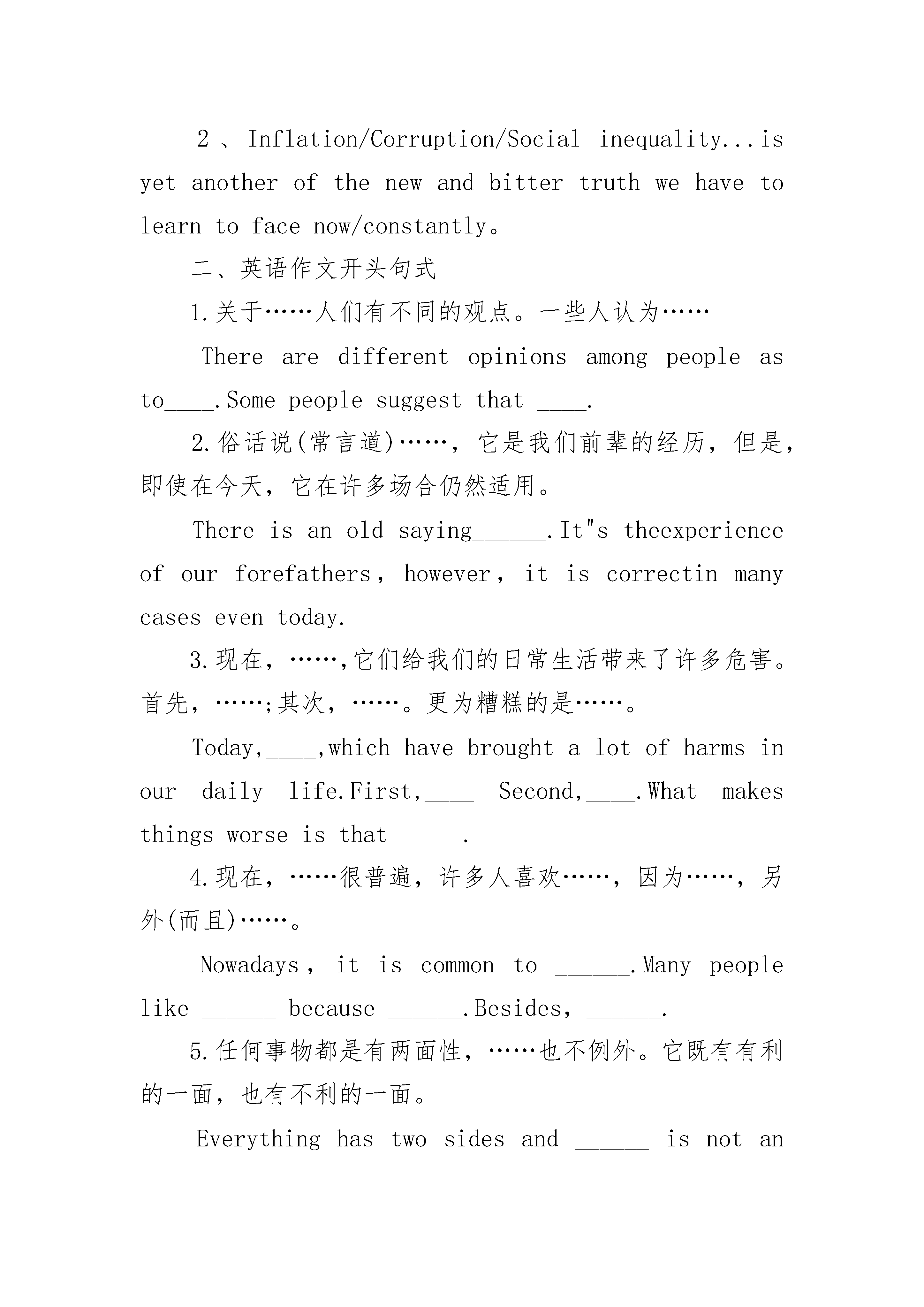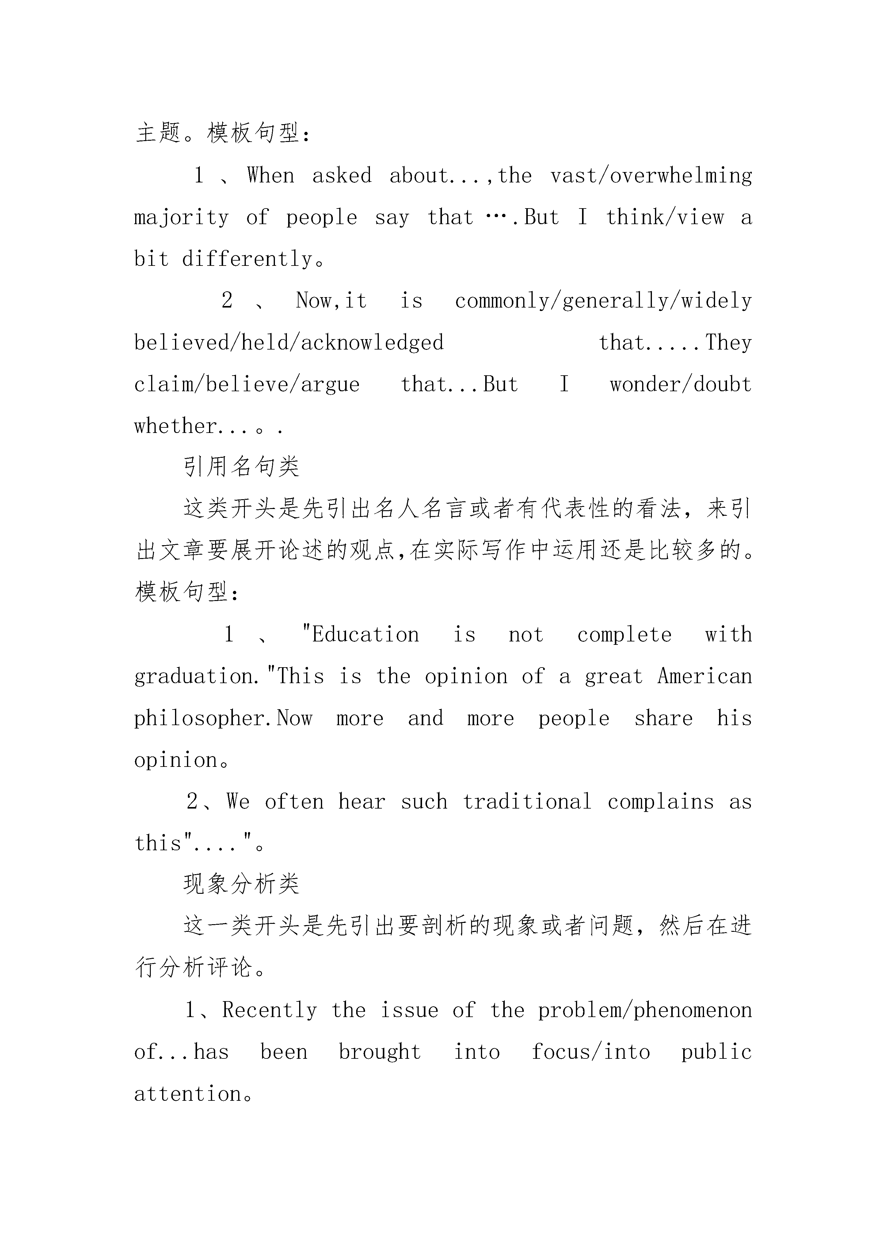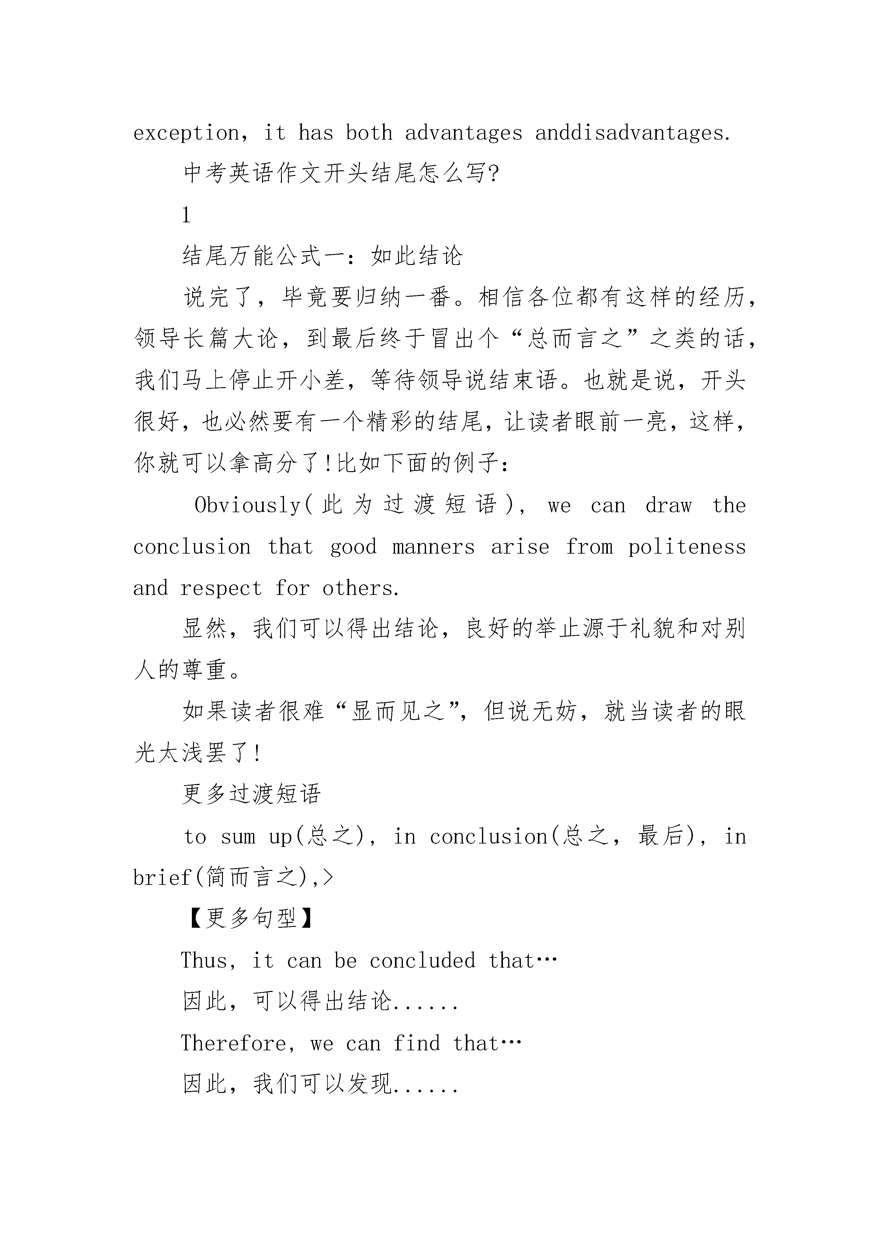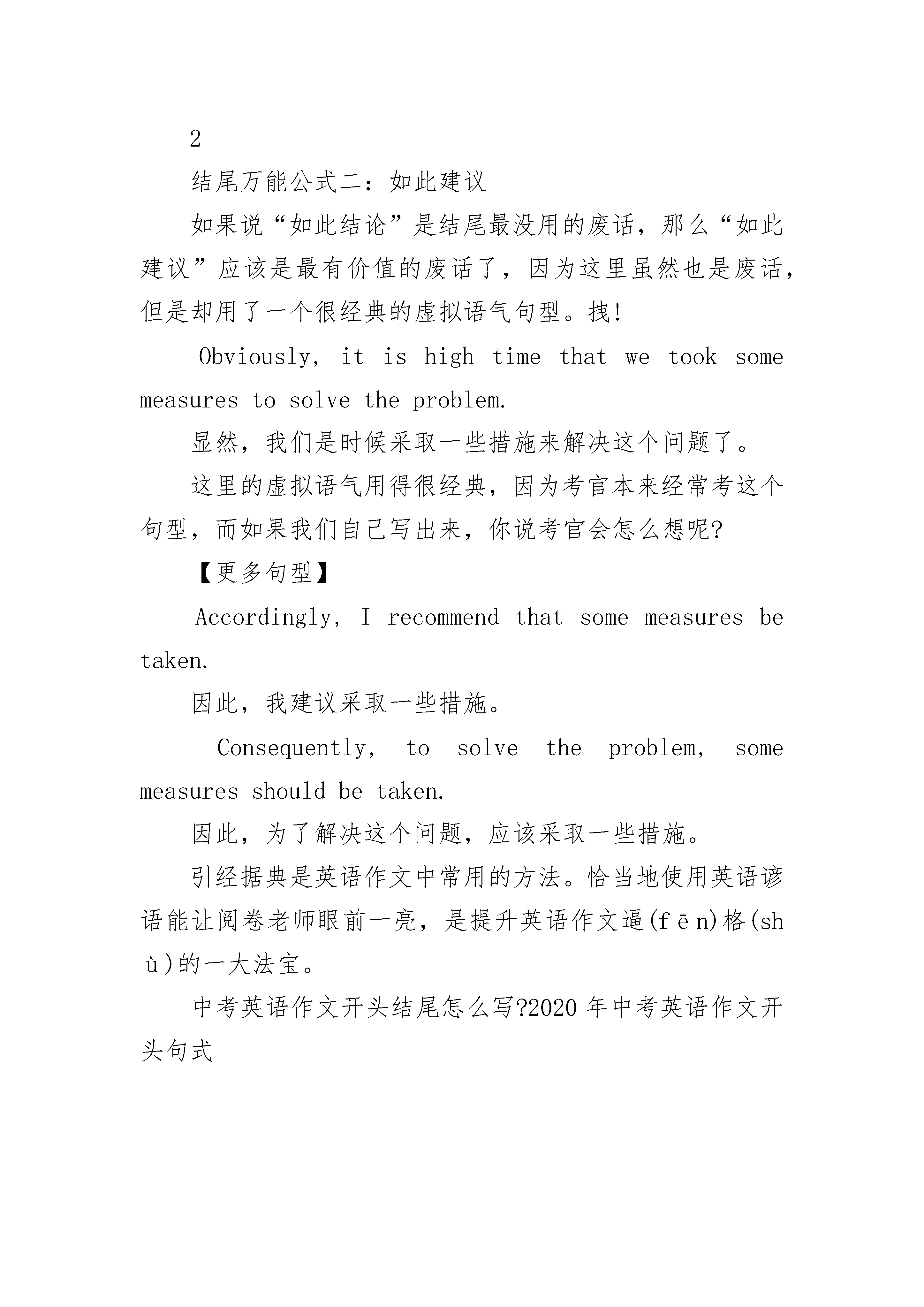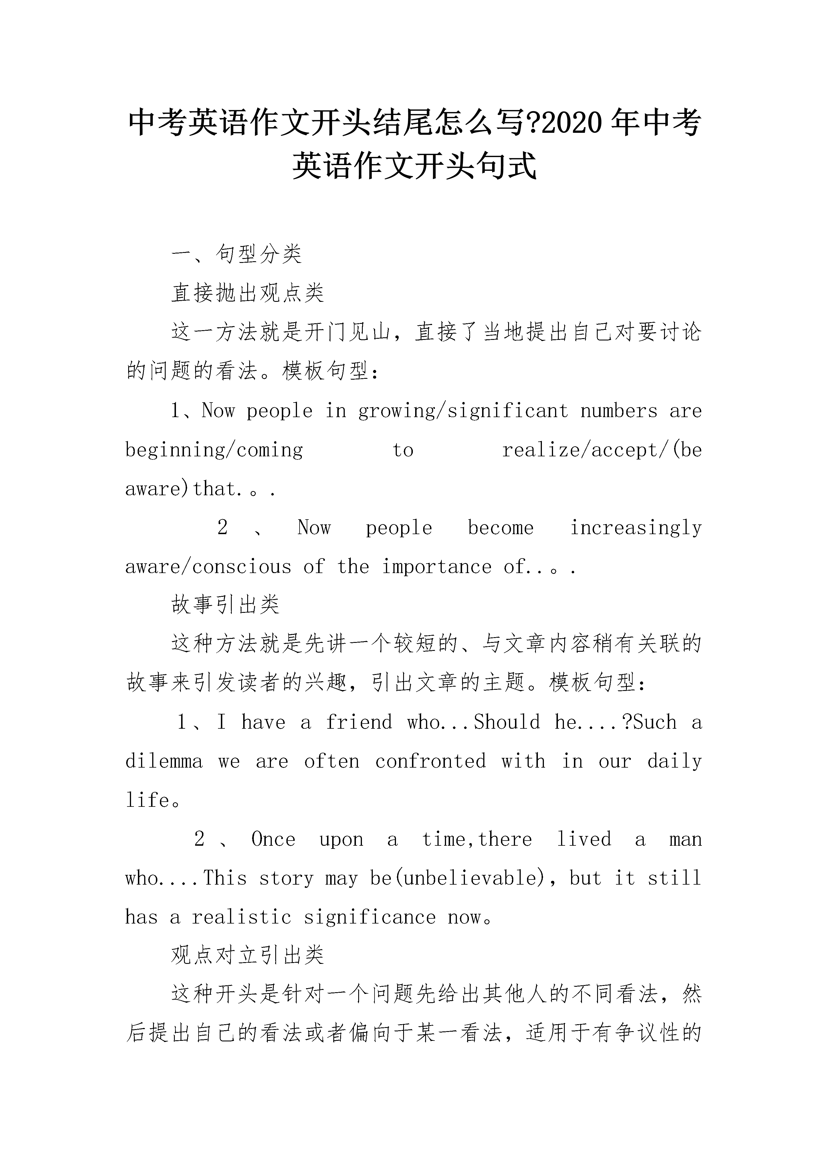 中考英语作文开头结尾怎么写?2020年中考英语作文开头句式一、句型分类直接抛出观点类这一方法就是开门见山,直接了当地提出自己对要讨论的问题的看法。模板句型:1、Nowpeopleingrowing/significantnumbersarebeginning/comingtorealize/accept/(beaware)that.。.2、Nowpeoplebecomeincreasinglyaware/consciousoftheimportanceof..。.故事引出类这种方法就是先讲一个较短的、与文章内容稍有关联的故事来引发读者的兴趣,引出文章的主题。模板句型:1、Ihaveafriendwho...Shouldhe....?Suchadilemmaweareoftenconfrontedwithinourdailylife。2、Onceuponatime,therelivedamanwho....Thisstorymaybe(unbelievable),butitstillhasarealisticsignificancenow。观点对立引出类这种开头是针对一个问题先给出其他人的不同看法,然后提出自己的看法或者偏向于某一看法,适用于有争议性的主题。模板句型:1、Whenaskedabout...,thevast/overwhelmingmajorityofpeoplesaythat….ButIthink/viewabitdifferently。2、Now,itiscommonly/generally/widelybelieved/held/acknowledgedthat.....Theyclaim/believe/arguethat...ButIwonder/doubtwhether...。.引用名句类这类开头是先引出名人名言或者有代表性的看法,来引出文章要展开论述的观点,在实际写作中运用还是比较多的。模板句型:1、"Educationisnotcompletewithgraduation."ThisistheopinionofagreatAmericanphilosopher.Nowmoreandmorepeoplesharehisopinion。2、Weoftenhearsuchtraditionalcomplainsasthis"...."。现象分析类这一类开头是先引出要剖析的现象或者问题,然后在进行分析评论。1、Recentlytheissueoftheproblem/phenomenonof...hasbeenbroughtintofocus/intopublicattention。2、Inflation/Corruption/Socialinequality...isyetanotherofthenewandbittertruthwehavetolearntofacenow/constantly。二、英语作文开头句式1.关于……人们有不同的观点。一些人认为……Therearedifferentopinionsamongpeopleasto____.Somepeoplesuggestthat____.2.俗话说(常言道)……,它是我们前辈的经历,但是,即使在今天,它在许多场合仍然适用。Thereisanoldsaying______.It"stheexperienceofourforefathers,however,itiscorrectinmanycaseseventoday.3.现在,……,它们给我们的日常生活带来了许多危害。首先,……;其次,……。更为糟糕的是……。Today,____,whichhavebroughtalotofharmsinourdailylife.First,____Second,____.Whatmakesthingsworseisthat______.4.现在,……很普遍,许多人喜欢……,因为……,另外(而且)……。Nowadays,itiscommonto______.Manypeoplelike______because______.Besides,______.5.任何事物都是有两面性,……也不例外。它既有有利的一面,也有不利的一面。Everythinghastwosidesand______isnotanexception,ithasbothadvantagesanddisadvantages.中考英语作文开头结尾怎么写?1结尾万能公式一:如此结论说完了,毕竟要归纳一番。相信各位都有这样的经历,领导长篇大论,到最后终于冒出个“总而言之”之类的话,我们马上停止开小差,等待领导说结束语。也就是说,开头很好,也必然要有一个精彩的结尾,让读者眼前一亮,这样,你就可以拿高分