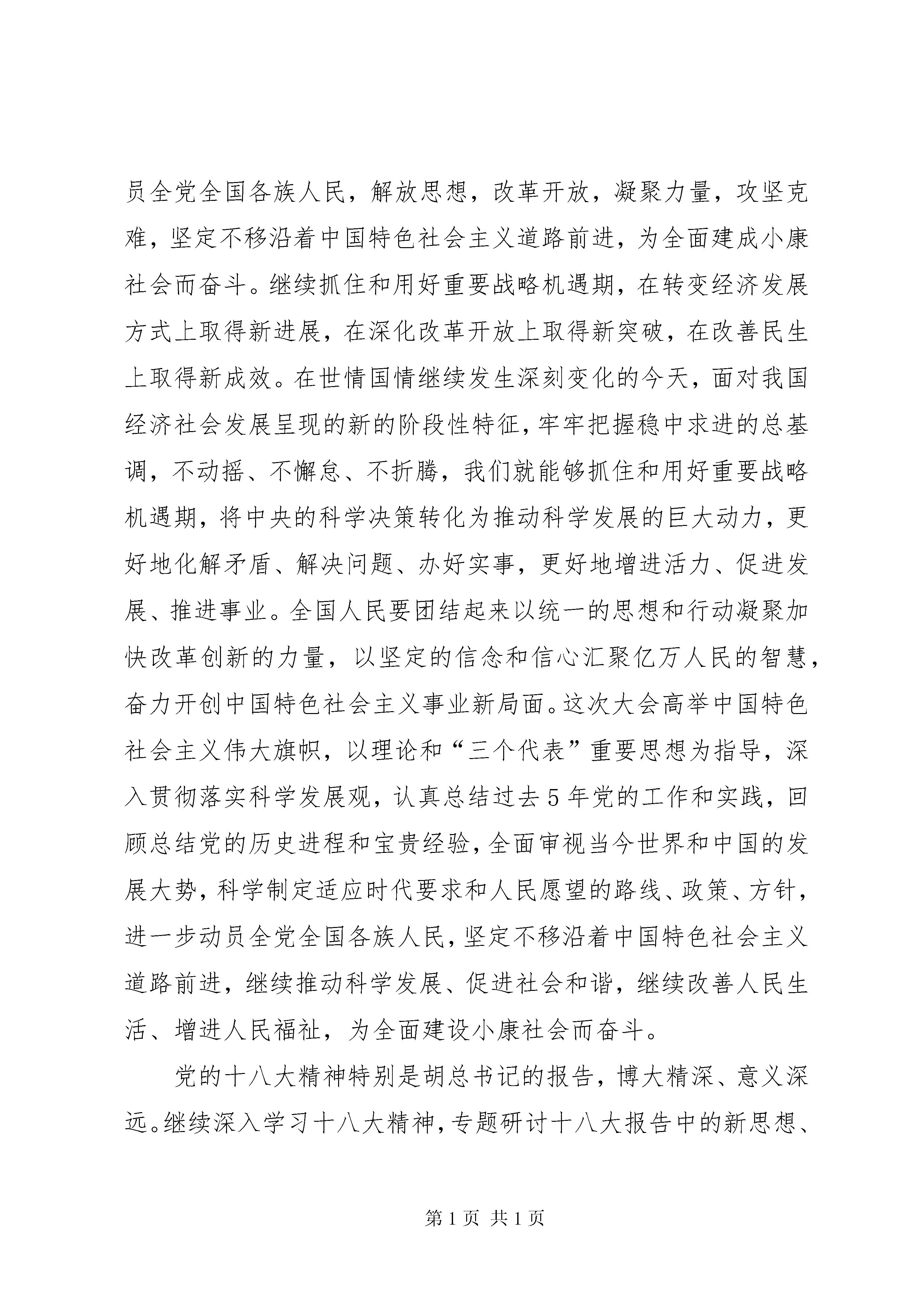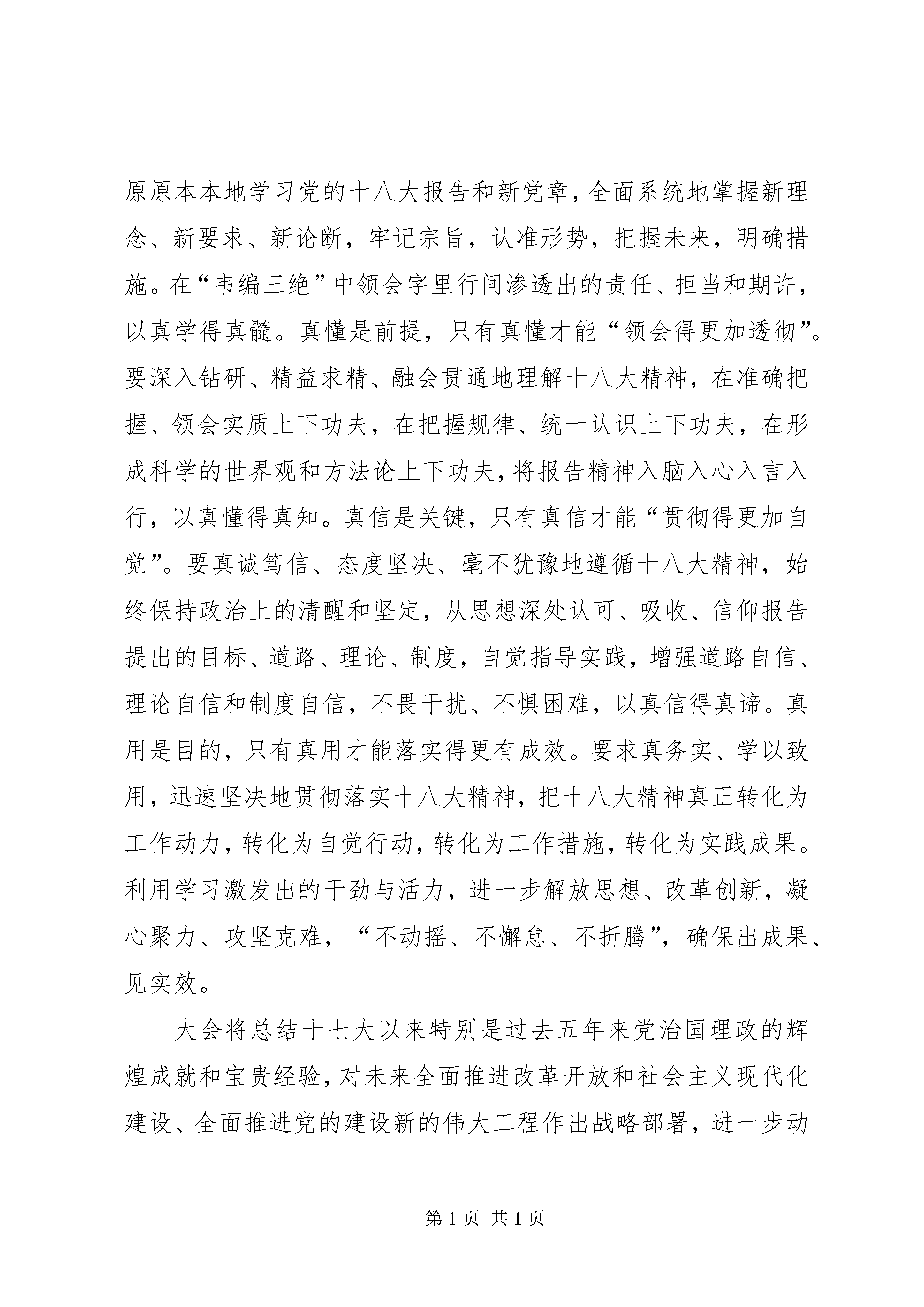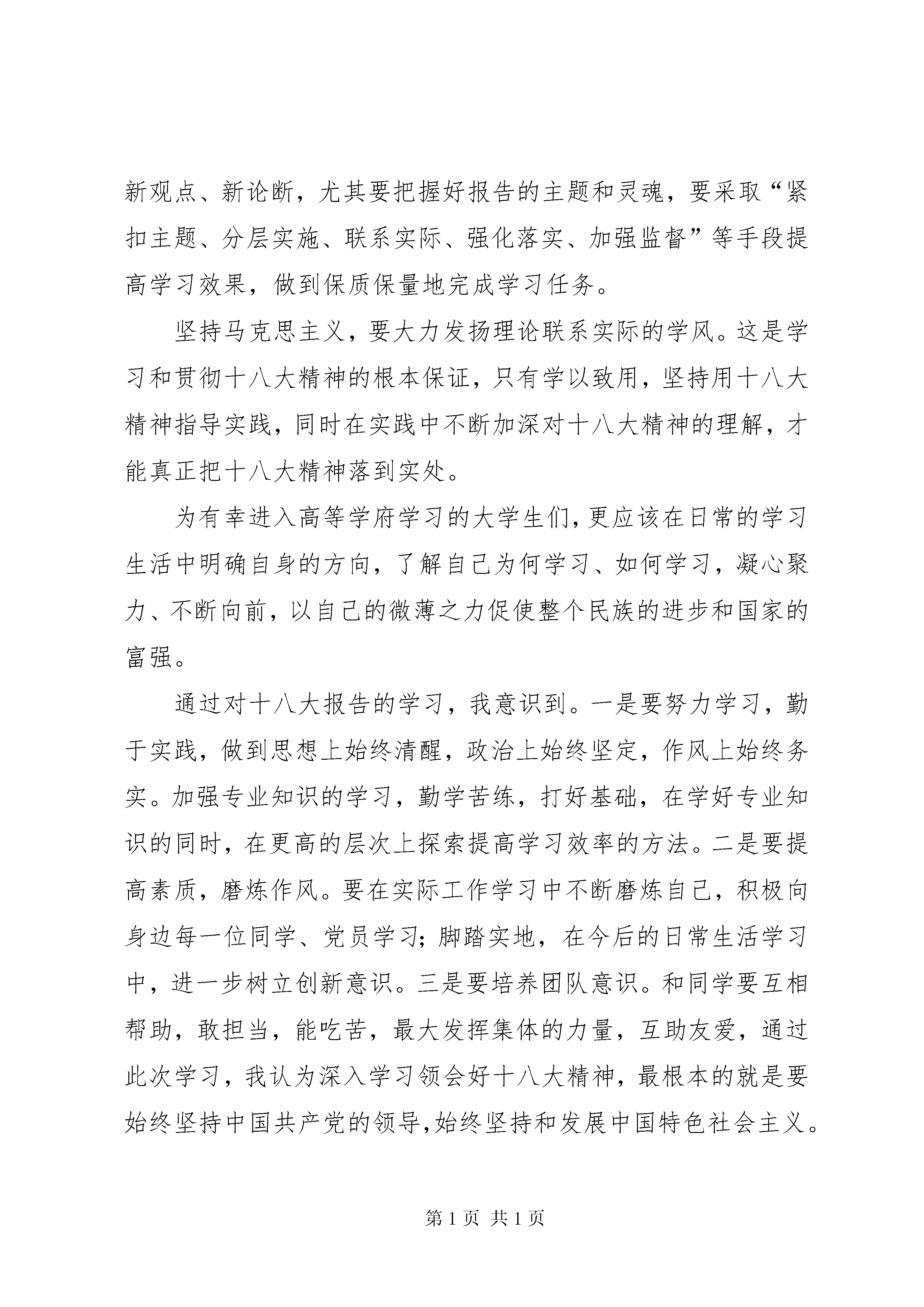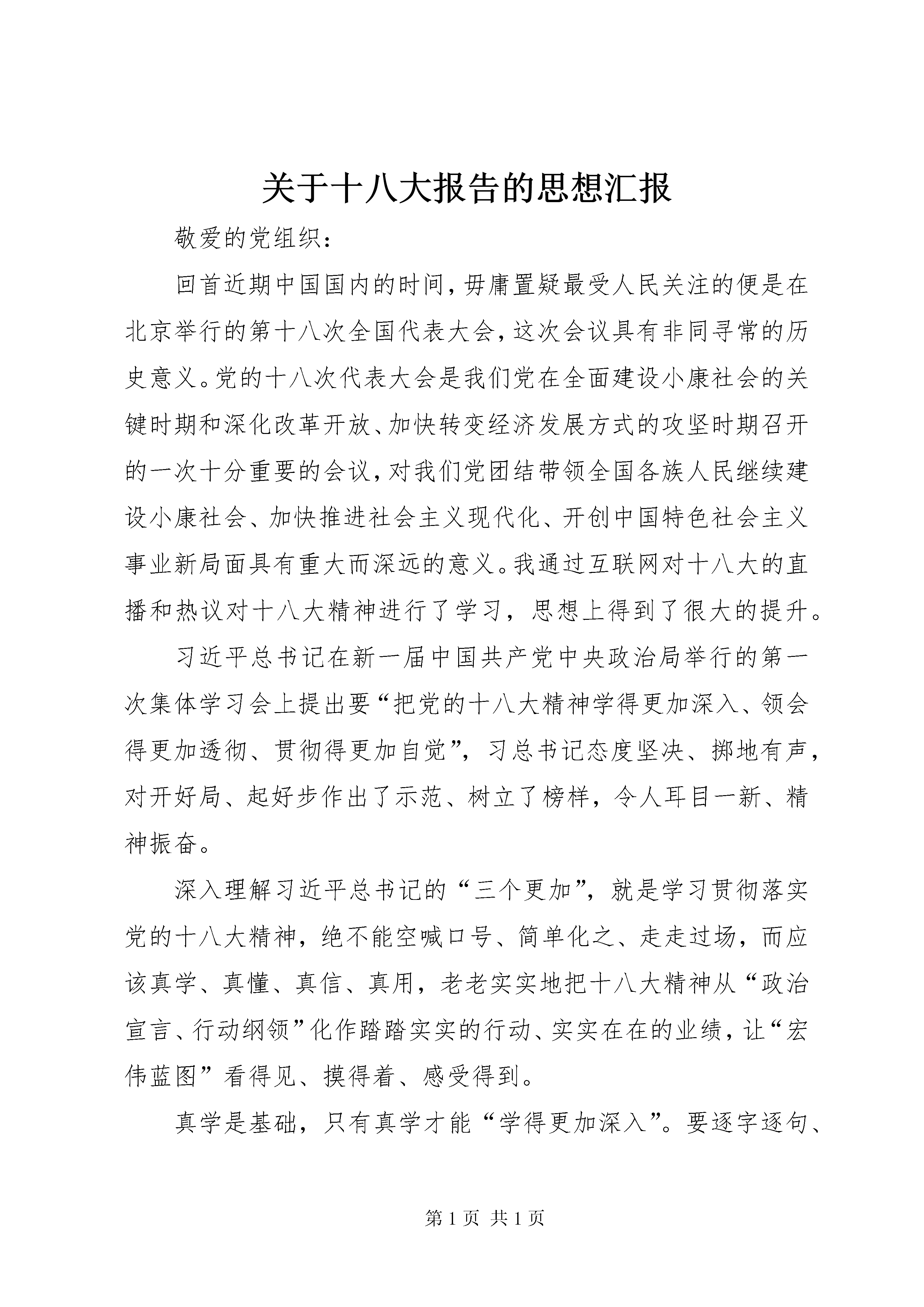 关于十八大报告的思想汇报敬爱的党组织:回首近期中国国内的时间,毋庸置疑最受人民关注的便是在北京举行的第十八次全国代表大会,这次会议具有非同寻常的历史意义。党的十八次代表大会是我们党在全面建设小康社会的关键时期和深化改革开放、加快转变经济发展方式的攻坚时期召开的一次十分重要的会议,对我们党团结带领全国各族人民继续建设小康社会、加快推进社会主义现代化、开创中国特色社会主义事业新局面具有重大而深远的意义。我通过互联网对十八大的直播和热议对十八大精神进行了学习,思想上得到了很大的提升。习近平总书记在新一届中国共产党中央政治局举行的第一次集体学习会上提出要“把党的十八大精神学得更加深入、领会得更加透彻、贯彻得更加自觉”,习总书记态度坚决、掷地有声,对开好局、起好步作出了示范、树立了榜样,令人耳目一新、精神振奋。深入理解习近平总书记的“三个更加”,就是学习贯彻落实党的十八大精神,绝不能空喊口号、简单化之、走走过场,而应该真学、真懂、真信、真用,老老实实地把十八大精神从“政治宣言、行动纲领”化作踏踏实实的行动、实实在在的业绩,让“宏伟蓝图”看得见、摸得着、感受得到。真学是基础,只有真学才能“学得更加深入”。要逐字逐句、原原本本地学习党的十八大报告和新党章,全面系统地掌握新理念、新要求、新论断,牢记宗旨,认准形势,把握未来,明确措施。在“韦编三绝”中领会字里行间渗透出的责任、担当和期许,以真学得真髓。真懂是前提,只有真懂才能“领会得更加透彻”。要深入钻研、精益求精、融会贯通地理解十八大精神,在准确把握、领会实质上下功夫,在把握规律、统一认识上下功夫,在形成科学的世界观和方法论上下功夫,将报告精神入脑入心入言入行,以真懂得真知。真信是关键,只有真信才能“贯彻得更加自觉”。要真诚笃信、态度坚决、毫不犹豫地遵循十八大精神,始终保持政治上的清醒和坚定,从思想深处认可、吸收、信仰报告提出的目标、道路、理论、制度,自觉指导实践,增强道路自信、理论自信和制度自信,不畏干扰、不惧困难,以真信得真谛。真用是目的,只有真用才能落实得更有成效。要求真务实、学以致用,迅速坚决地贯彻落实十八大精神,把十八大精神真正转化为工作动力,转化为自觉行动,转化为工作措施,转化为实践成果。利用学习激发出的干劲与活力,进一步解放思想、改革创新,凝心聚力、攻坚克难,“不动摇、不懈怠、不折腾”,确保出成果、见实效。大会将总结十七大以来特别是过去五年来党治国理政的辉煌成就和宝贵经验,对未来全面推进改革开放和社会主义现代化建设、全面推进党的建设新的伟大工程作出战略部署,进一步动员全党全国各族人民,解放思想,改革开放,凝聚力量,攻坚克难,坚定不移沿着中国特色社会主义道路前进,为全面建成小康社会而奋斗。继续抓住和用好重要战略机遇期,在转变经济发展方式上取得新进展,在深化改革开放上取得新突破,在改善民生上取得新成效。在世情国情继续发生深刻变化的今天,面对我国经济社会发展呈现的新的阶段性特征,牢牢把握稳中求进的总基调,不动摇、不懈怠、不折腾,我们就能够抓住和用好重要战略机遇期,将中央的科学决策转化为推动科学发展的巨大动力,更好地化解矛盾、解决问题、办好实事,更好地增进活力、促进发展、推进事业。全国人民要团结起来以统一的思想和行动凝聚加快改革创新的力量,以坚定的信念和信心汇聚亿万人民的智慧,奋力开创中国特色社会主义事业新局面。这次大会高举中国特色社会主义伟大旗帜,以理论和“三个代表”重要思想为指导,深入贯彻落实科学发展观,认真总结过去5年党的工作和实践,回顾总结党的历史进程和宝贵经验,全面审视当今世界和中国的发展大势,科学制定适应时代要求和人民愿望的路线、政策、方针,进一步动员全党全国各族人民,坚定不移沿着中国特色社会主义道路前进,继续推动科学发展、促进社会和谐,继续改善人民生活、增进人民福祉,为全面建设小康社会而奋斗。党的十八大精神特别是胡总书记的报告,博大精深、意义深远。继续深入学习十八大精神,专题研讨十八大报告中的新思想、新观点、新论断,尤其要把握好报告的主题和灵魂,要采取“紧扣主题、分层实施、联系实际、强化落实、加强监督”等手段提高学习效果,做到保质保量地完成学习任务。坚持马克思主义,要大力发扬理论联系实际的学风。这是学习和贯彻十八大精神的根本保证,只有学以致用,坚持用十八大精神指导实践,同时在实践中不断加深对十八大精神的理解,才能真正把十八大精神落到实处。为有幸进入高等学府学习的大学生们,更应该在日常的学习生活中明确自身的方向,了解自己为何学习、如何学习,凝心聚力、不断向前,以自己的微薄之力促使整个民族的进步和国家的富强。通过对十八大报告的学习,我意识到。一是要努力学习,勤于实践,做到思想上始终清醒,政治上始终坚定,作风上始终务实。加强专业知识的学习,勤学苦练,打