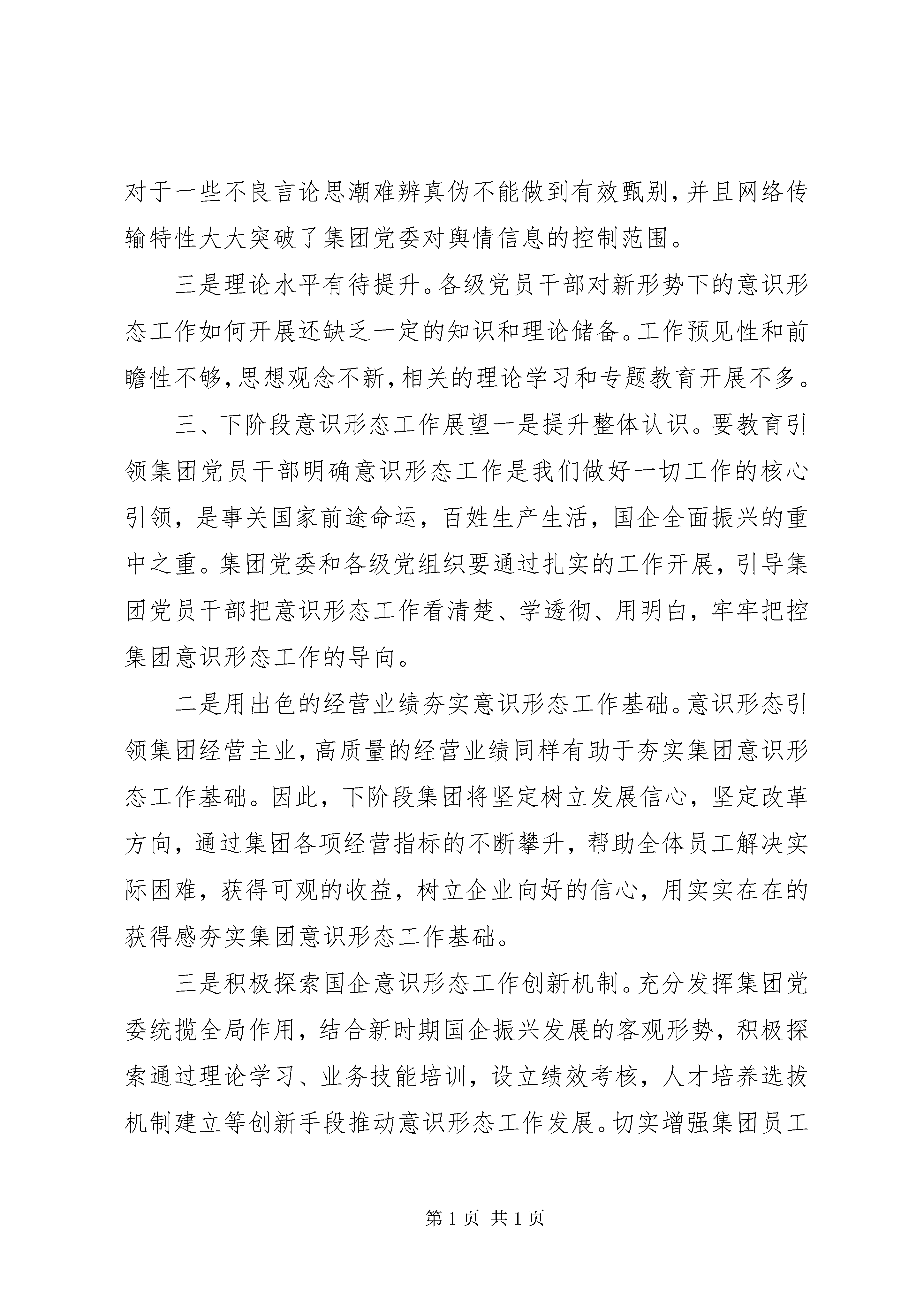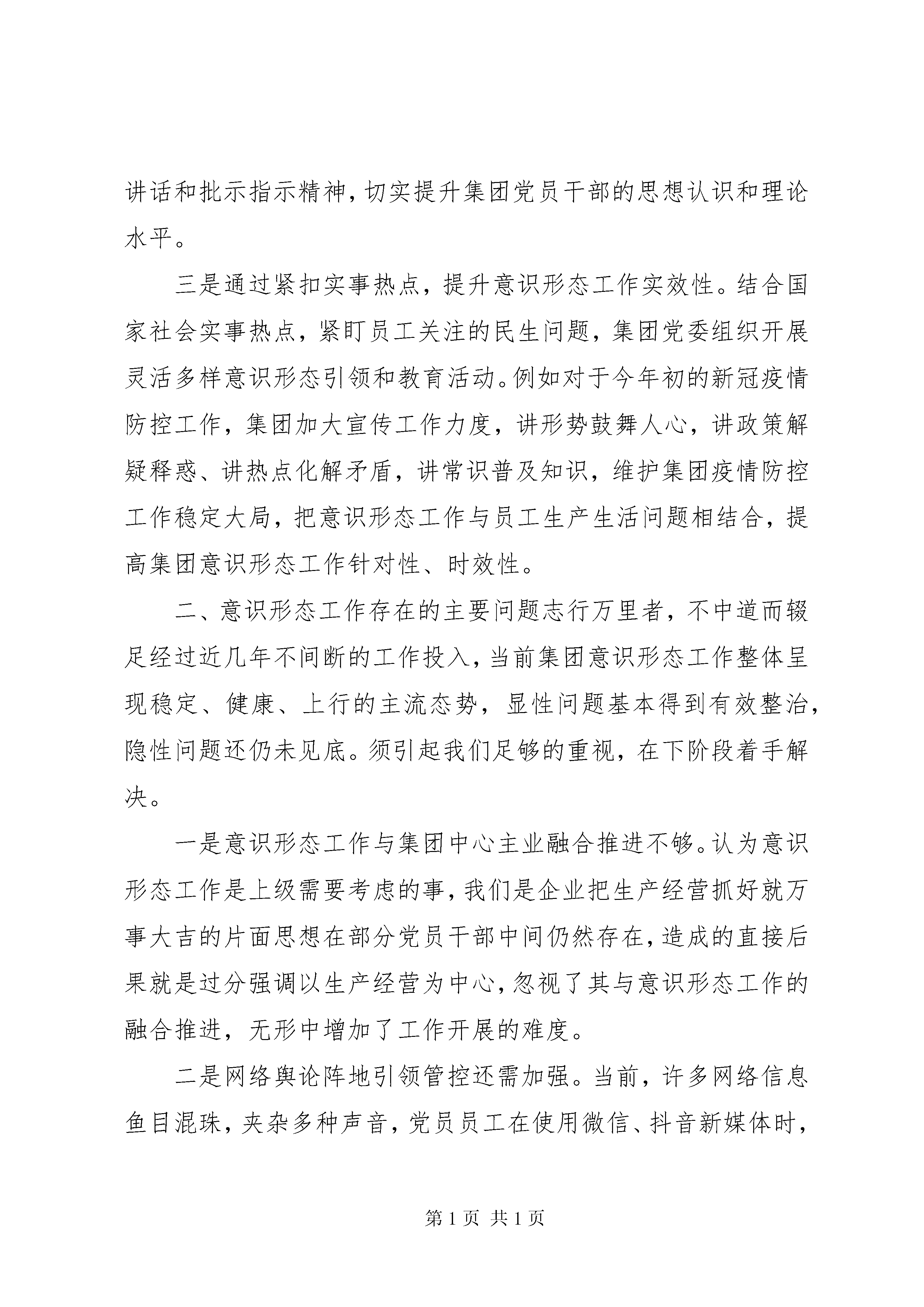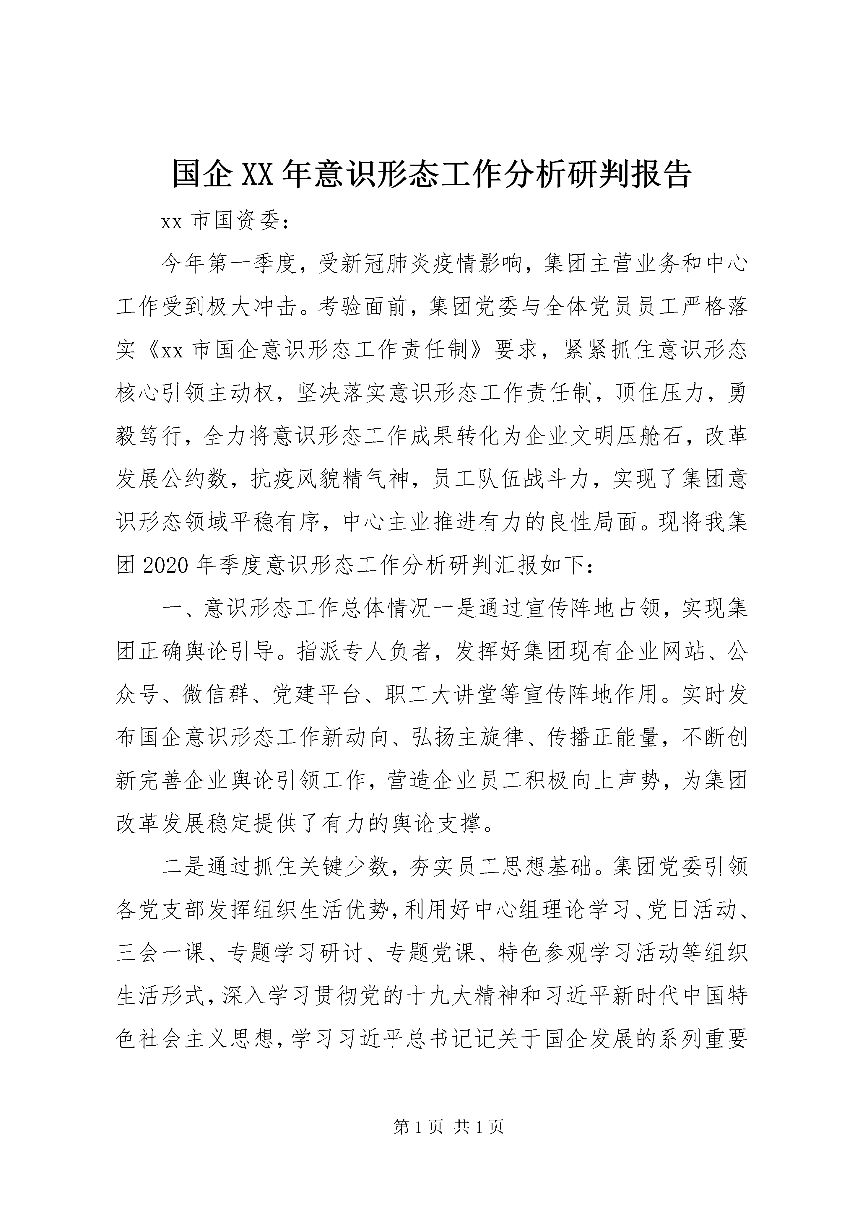 国企XX年意识形态工作分析研判报告xx市国资委:今年第一季度,受新冠肺炎疫情影响,集团主营业务和中心工作受到极大冲击。考验面前,集团党委与全体党员员工严格落实《xx市国企意识形态工作责任制》要求,紧紧抓住意识形态核心引领主动权,坚决落实意识形态工作责任制,顶住压力,勇毅笃行,全力将意识形态工作成果转化为企业文明压舱石,改革发展公约数,抗疫风貌精气神,员工队伍战斗力,实现了集团意识形态领域平稳有序,中心主业推进有力的良性局面。现将我集团2020年季度意识形态工作分析研判汇报如下:一、意识形态工作总体情况一是通过宣传阵地占领,实现集团正确舆论引导。指派专人负者,发挥好集团现有企业网站、公众号、微信群、党建平台、职工大讲堂等宣传阵地作用。实时发布国企意识形态工作新动向、弘扬主旋律、传播正能量,不断创新完善企业舆论引领工作,营造企业员工积极向上声势,为集团改革发展稳定提供了有力的舆论支撑。二是通过抓住关键少数,夯实员工思想基础。集团党委引领各党支部发挥组织生活优势,利用好中心组理论学习、党日活动、三会一课、专题学习研讨、专题党课、特色参观学习活动等组织生活形式,深入学习贯彻党的十九大精神和习近平新时代中国特色社会主义思想,学习习近平总书记记关于国企发展的系列重要讲话和批示指示精神,切实提升集团党员干部的思想认识和理论水平。三是通过紧扣实事热点,提升意识形态工作实效性。结合国家社会实事热点,紧盯员工关注的民生问题,集团党委组织开展灵活多样意识形态引领和教育活动。例如对于今年初的新冠疫情防控工作,集团加大宣传工作力度,讲形势鼓舞人心,讲政策解疑释惑、讲热点化解矛盾,讲常识普及知识,维护集团疫情防控工作稳定大局,把意识形态工作与员工生产生活问题相结合,提高集团意识形态工作针对性、时效性。二、意识形态工作存在的主要问题志行万里者,不中道而辍足经过近几年不间断的工作投入,当前集团意识形态工作整体呈现稳定、健康、上行的主流态势,显性问题基本得到有效整治,隐性问题还仍未见底。须引起我们足够的重视,在下阶段着手解决。一是意识形态工作与集团中心主业融合推进不够。认为意识形态工作是上级需要考虑的事,我们是企业把生产经营抓好就万事大吉的片面思想在部分党员干部中间仍然存在,造成的直接后果就是过分强调以生产经营为中心,忽视了其与意识形态工作的融合推进,无形中增加了工作开展的难度。二是网络舆论阵地引领管控还需加强。当前,许多网络信息鱼目混珠,夹杂多种声音,党员员工在使用微信、抖音新媒体时,对于一些不良言论思潮难辨真伪不能做到有效甄别,并且网络传输特性大大突破了集团党委对舆情信息的控制范围。三是理论水平有待提升。各级党员干部对新形势下的意识形态工作如何开展还缺乏一定的知识和理论储备。工作预见性和前瞻性不够,思想观念不新,相关的理论学习和专题教育开展不多。三、下阶段意识形态工作展望一是提升整体认识。要教育引领集团党员干部明确意识形态工作是我们做好一切工作的核心引领,是事关国家前途命运,百姓生产生活,国企全面振兴的重中之重。集团党委和各级党组织要通过扎实的工作开展,引导集团党员干部把意识形态工作看清楚、学透彻、用明白,牢牢把控集团意识形态工作的导向。二是用出色的经营业绩夯实意识形态工作基础。意识形态引领集团经营主业,高质量的经营业绩同样有助于夯实集团意识形态工作基础。因此,下阶段集团将坚定树立发展信心,坚定改革方向,通过集团各项经营指标的不断攀升,帮助全体员工解决实际困难,获得可观的收益,树立企业向好的信心,用实实在在的获得感夯实集团意识形态工作基础。三是积极探索国企意识形态工作创新机制。充分发挥集团党委统揽全局作用,结合新时期国企振兴发展的客观形势,积极探索通过理论学习、业务技能培训,设立绩效考核,人才培养选拔机制建立等创新手段推动意识形态工作发展。切实增强集团员工的工作进取心和行业归属感,通过持续高涨的员工工作热情,推动集团在意识形态领域取得创新突破。
