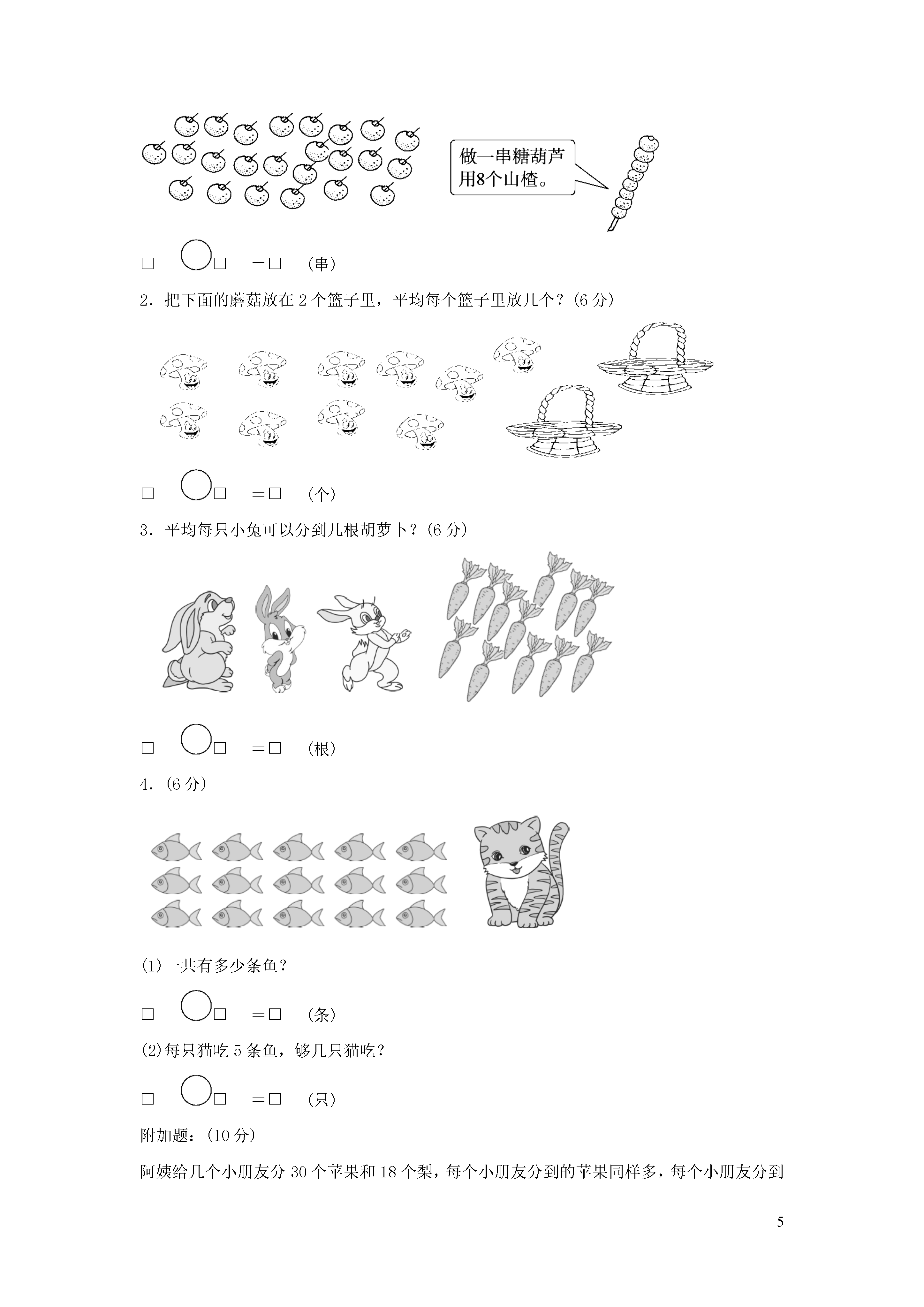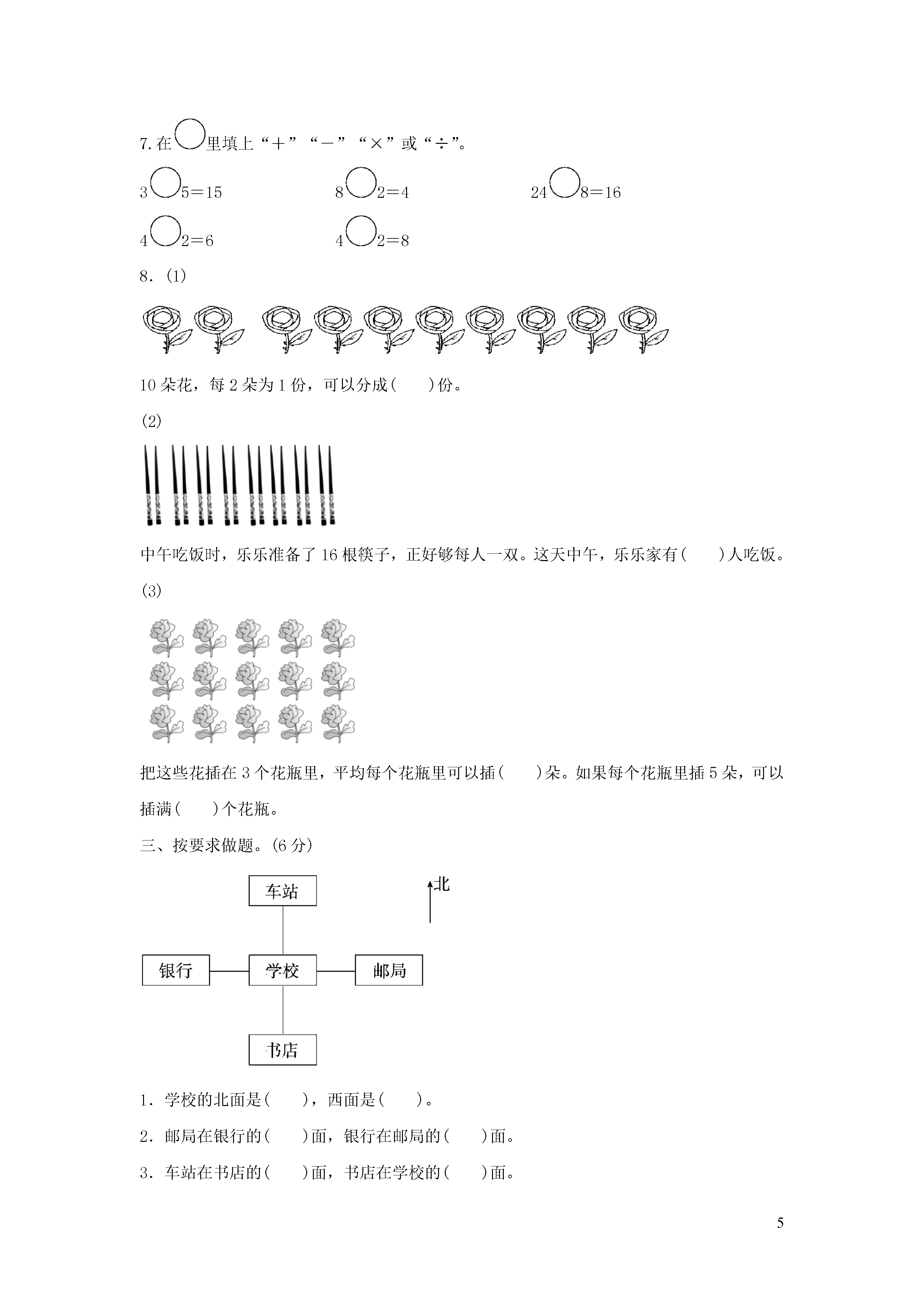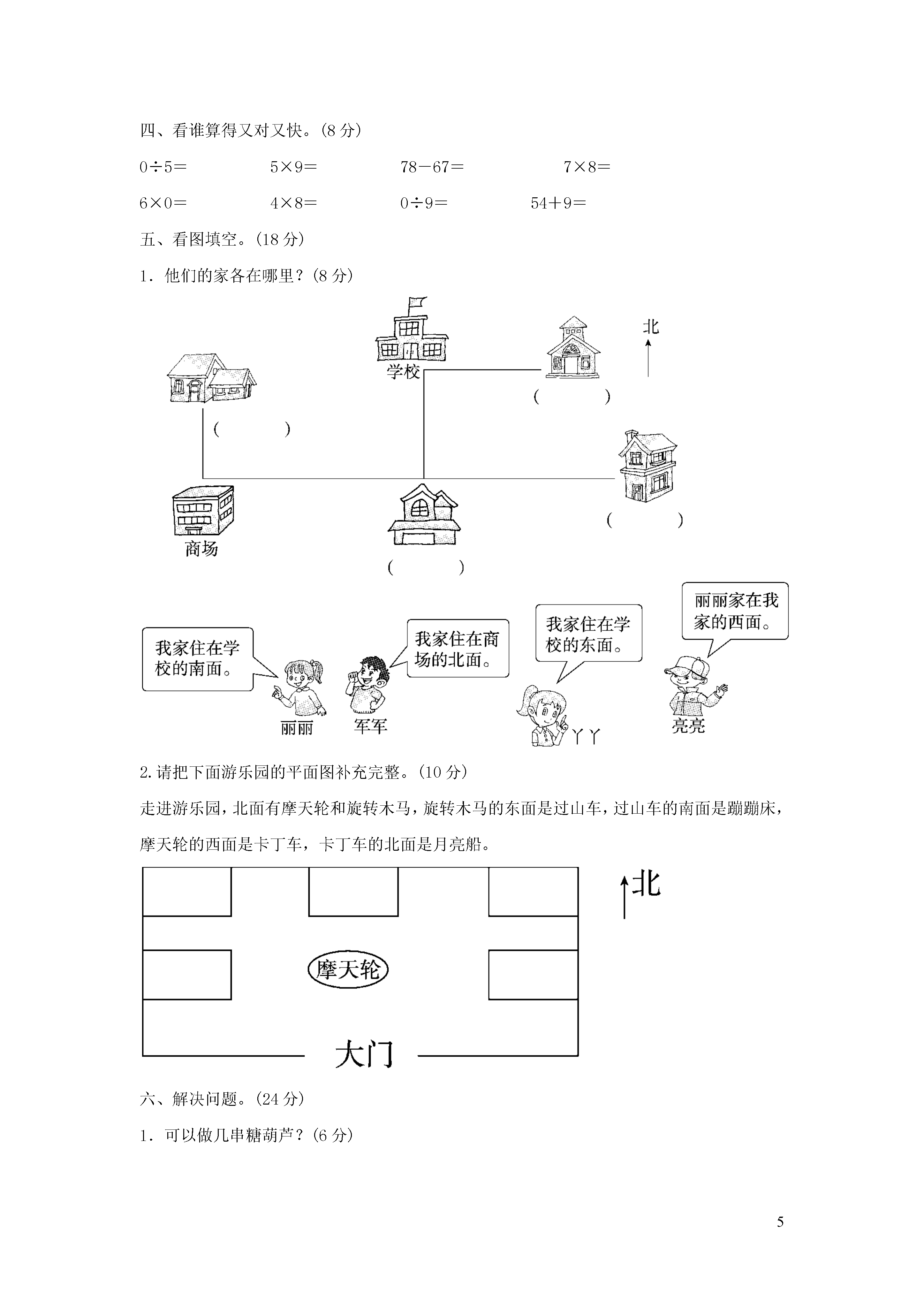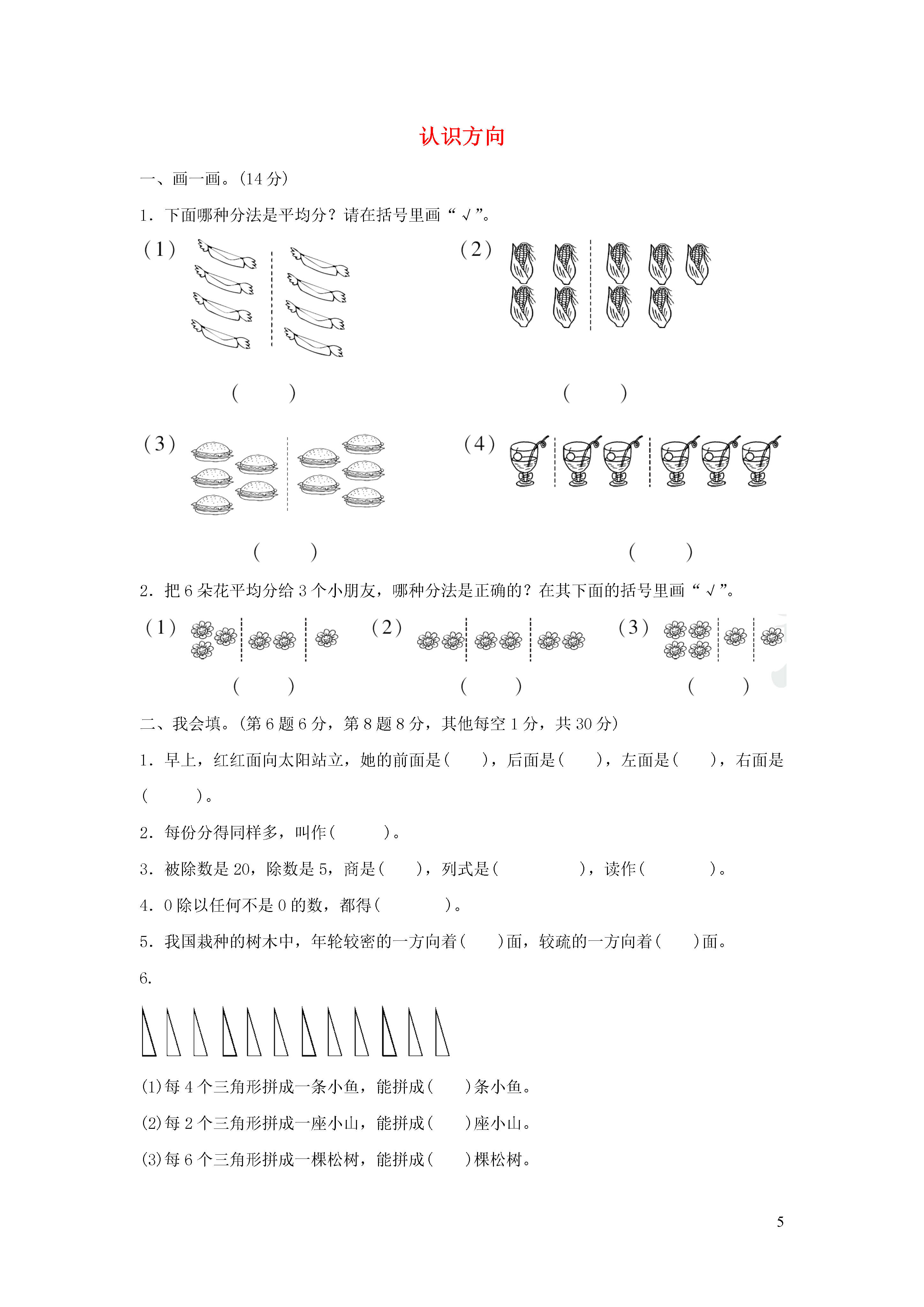 5认识方向一、画一画。(14分)1.下面哪种分法是平均分?请在括号里画“√”。2.把6朵花平均分给3个小朋友,哪种分法是正确的?在其下面的括号里画“√”。二、我会填。(第6题6分,第8题8分,其他每空1分,共30分)1.早上,红红面向太阳站立,她的前面是(),后面是(),左面是(),右面是()。2.每份分得同样多,叫作()。3.被除数是20,除数是5,商是(),列式是(),读作()。4.0除以任何不是0的数,都得()。5.我国栽种的树木中,年轮较密的一方向着()面,较疏的一方向着()面。6.(1)每4个三角形拼成一条小鱼,能拼成()条小鱼。(2)每2个三角形拼成一座小山,能拼成()座小山。(3)每6个三角形拼成一棵松树,能拼成()棵松树。7.在里填上“+”“-”“×”或“÷”。35=1582=4248=1642=642=88.(1)10朵花,每2朵为1份,可以分成()份。(2)中午吃饭时,乐乐准备了16根筷子,正好够每人一双。这天中午,乐乐家有()人吃饭。(3)把这些花插在3个花瓶里,平均每个花瓶里可以插()朵。如果每个花瓶里插5朵,可以插满()个花瓶。三、按要求做题。(6分)1.学校的北面是(),西面是()。2.邮局在银行的()面,银行在邮局的()面。3.车站在书店的()面,书店在学校的()面。四、看谁算得又对又快。(8分)0÷5=5×9=78-67=7×8=6×0=4×8=0÷9=54+9=五、看图填空。(18分)1.他们的家各在哪里?(8分)2.请把下面游乐园的平面图补充完整。(10分)走进游乐园,北面有摩天轮和旋转木马,旋转木马的东面是过山车,过山车的南面是蹦蹦床,摩天轮的西面是卡丁车,卡丁车的北面是月亮船。六、解决问题。(24分)1.可以做几串糖葫芦?(6分)eq\a\vs4\al\co1(□)eq\a\vs4\al\co1(□)=eq\a\vs4\al\co1(□)(串)2.把下面的蘑菇放在2个篮子里,平均每个篮子里放几个?(6分)eq\a\vs4\al\co1(□)eq\a\vs4\al\co1(□)=eq\a\vs4\al\co1(□)(个)3.平均每只小兔可以分到几根胡萝卜?(6分)eq\a\vs4\al\co1(□)eq\a\vs4\al\co1(□)=eq\a\vs4\al\co1(□)(根)4.(6分)(1)一共有多少条鱼?eq\a\vs4\al\co1(□)eq\a\vs4\al\co1(□)=eq\a\vs4\al\co1(□)(条)(2)每只猫吃5条鱼,够几只猫吃?eq\a\vs4\al\co1(□)eq\a\vs4\al\co1(□)=eq\a\vs4\al\co1(□)(只)附加题:(10分)阿姨给几个小朋友分30个苹果和18个梨,每个小朋友分到的苹果同样多,每个小朋友分到的梨也同样多。想一想,最多有几个小朋友?参考答案一、1.(1)√(3)√2.(2)√二、1.东西北南2.平均分3.420÷5=420除以5等于44.05.北南6.(1)3(2)6(3)27.×÷-+×8.(1)5(2)8(3)53三、1.车站银行2.东西3.北南四、0451156032063五、略。六、1.24÷8=32.10÷2=53.12÷3=44.(1)3×5=15(2)15÷5=3附加题:最多有6个小朋友。