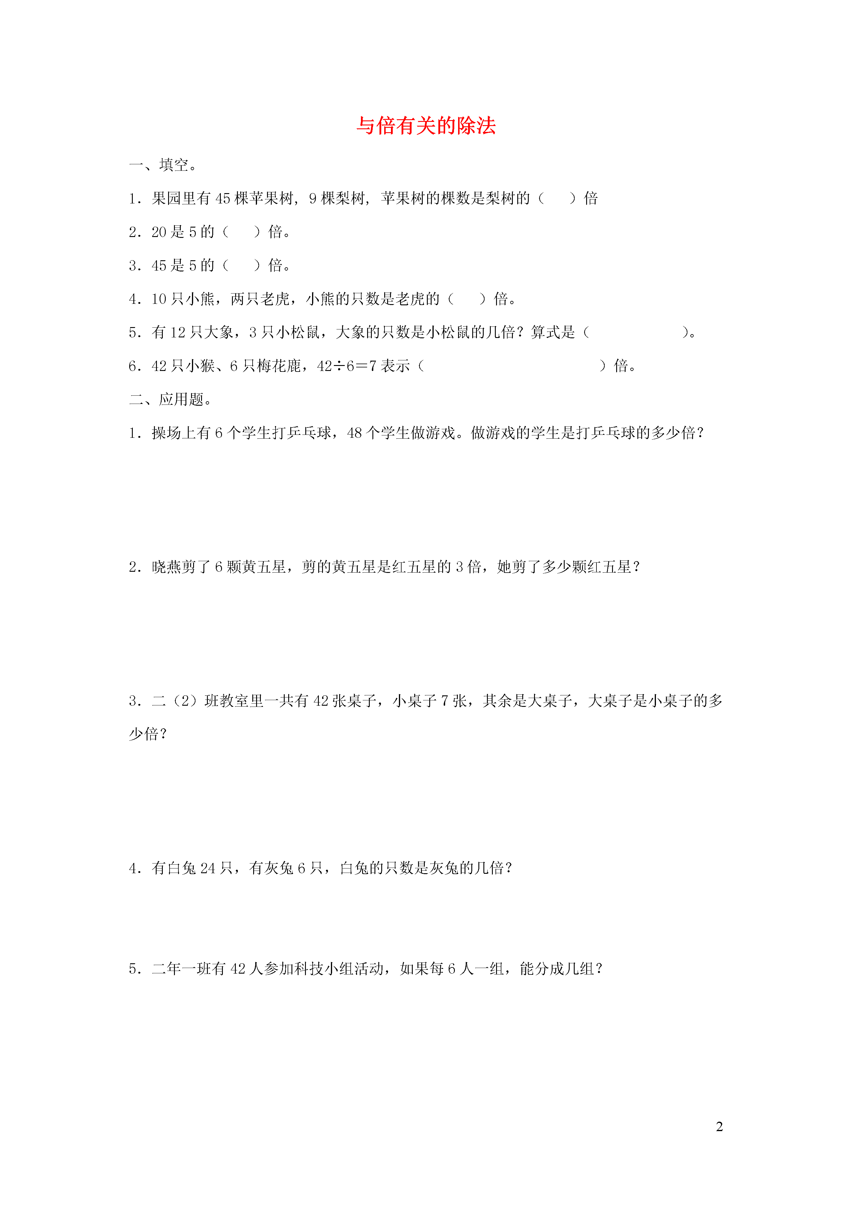 2与倍有关的除法一、填空。1.果园里有45棵苹果树,9棵梨树,苹果树的棵数是梨树的()倍2.20是5的()倍。3.45是5的()倍。4.10只小熊,两只老虎,小熊的只数是老虎的()倍。5.有12只大象,3只小松鼠,大象的只数是小松鼠的几倍?算式是()。6.42只小猴、6只梅花鹿,42÷6=7表示()倍。二、应用题。1.操场上有6个学生打乒乓球,48个学生做游戏。做游戏的学生是打乒乓球的多少倍?2.晓燕剪了6颗黄五星,剪的黄五星是红五星的3倍,她剪了多少颗红五星?3.二(2)班教室里一共有42张桌子,小桌子7张,其余是大桌子,大桌子是小桌子的多少倍?4.有白兔24只,有灰兔6只,白兔的只数是灰兔的几倍?5.二年一班有42人参加科技小组活动,如果每6人一组,能分成几组?附答案:一、5;4;9;5;12÷3=;小猴的只数是梅花鹿的7。二、1、48÷6=8(倍)。2、6÷3=2(棵)。3、42-7=35(张)35÷7=5(倍)。4、24÷6=4(倍)。5、42÷6=7(组)。
