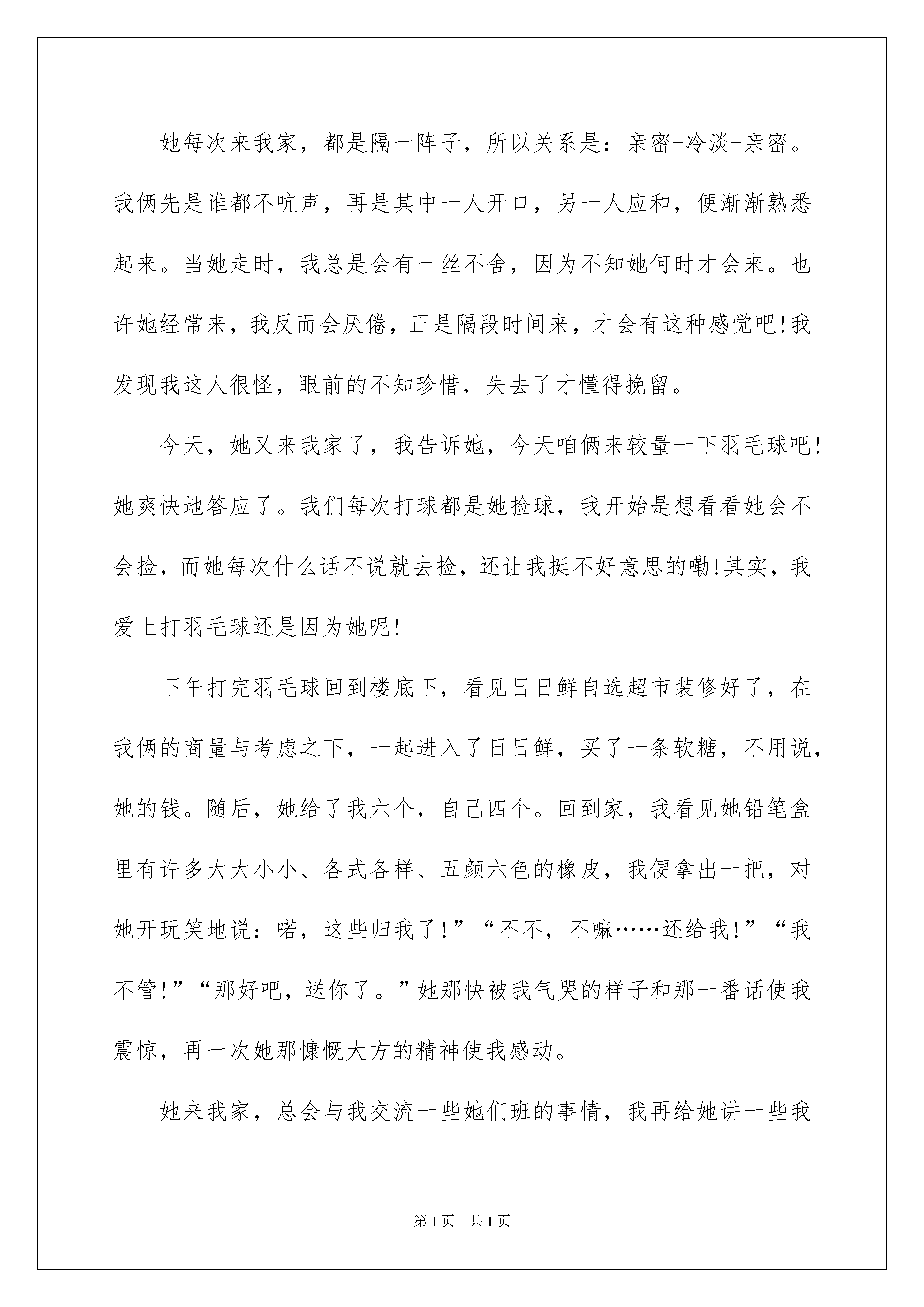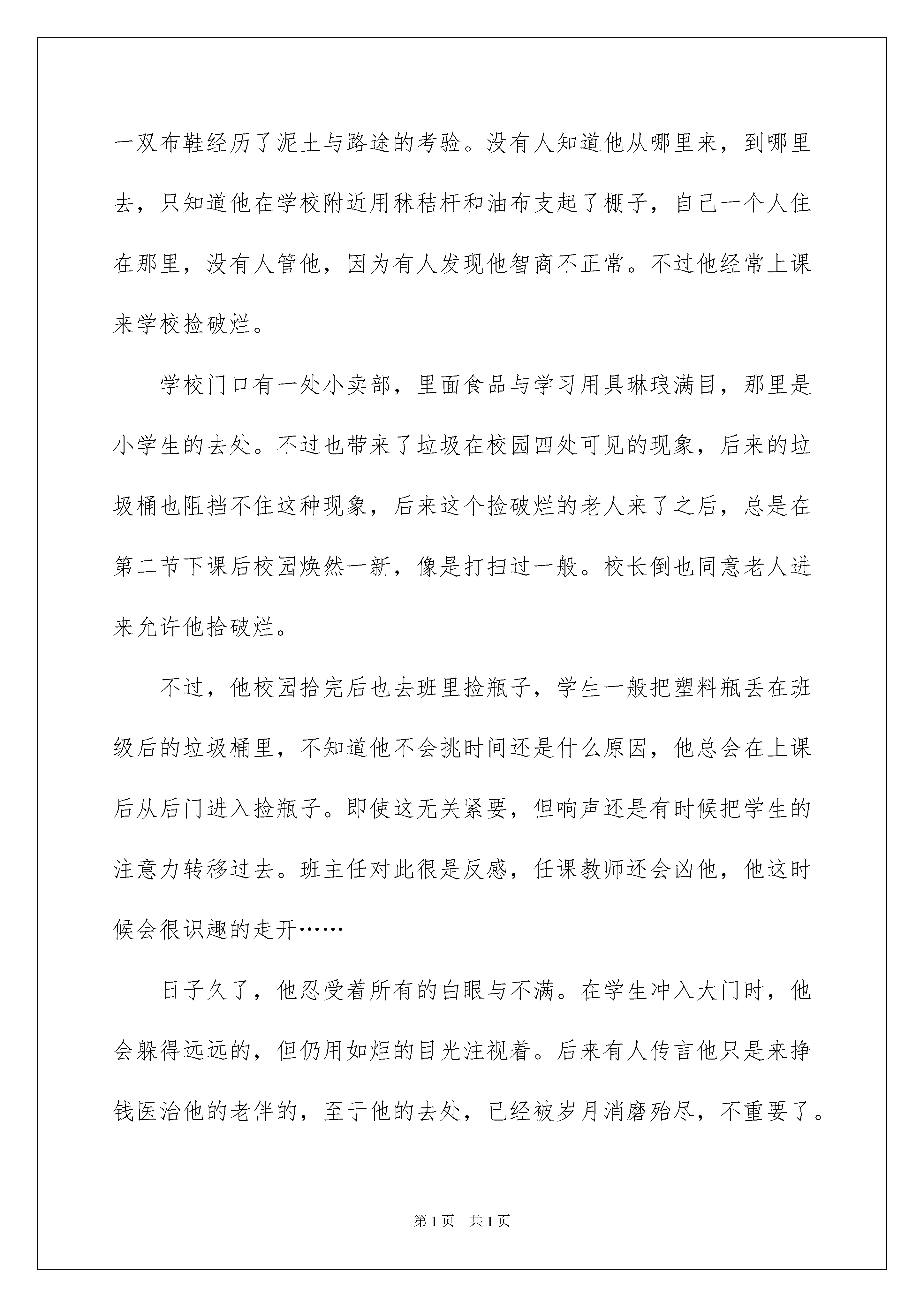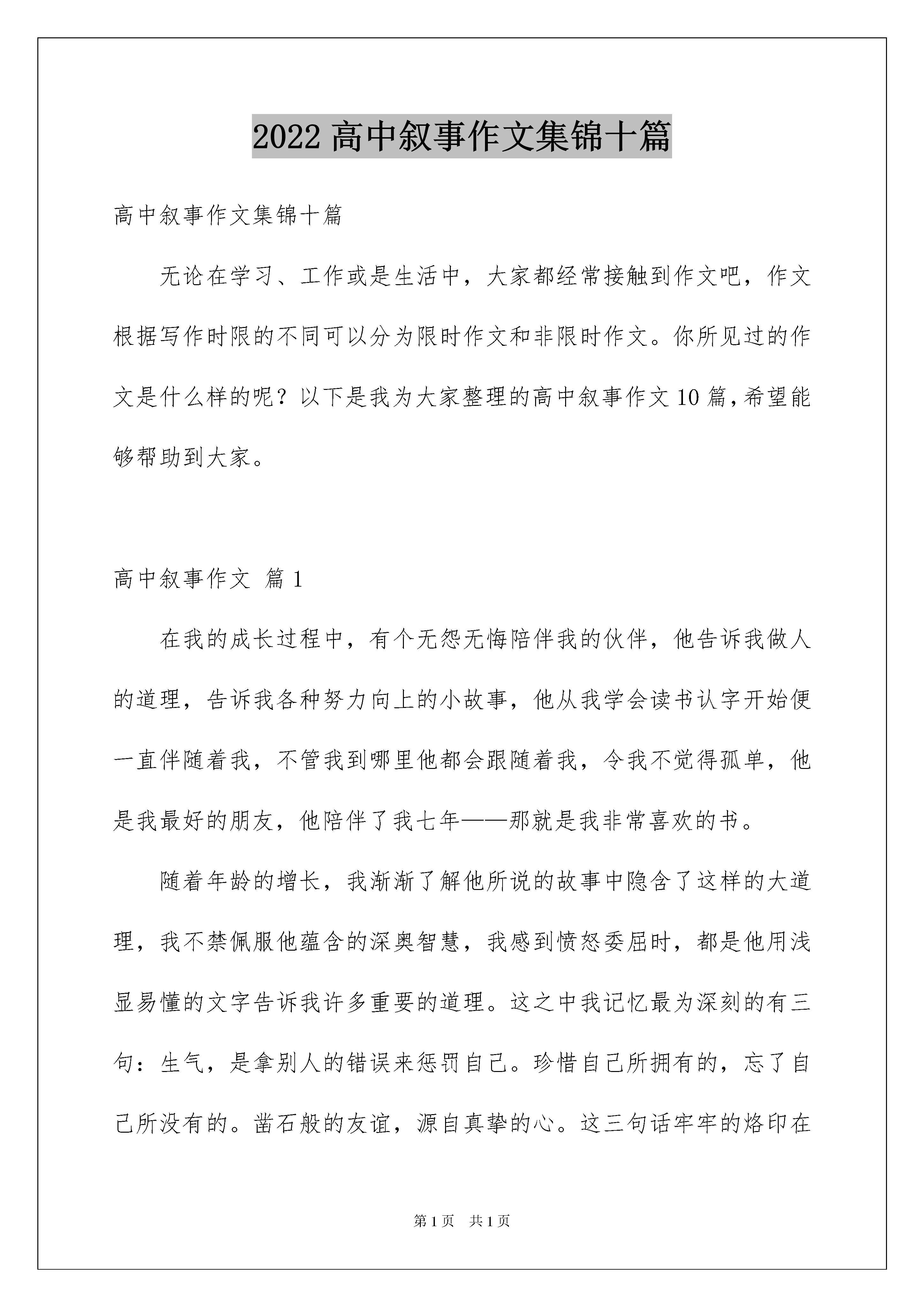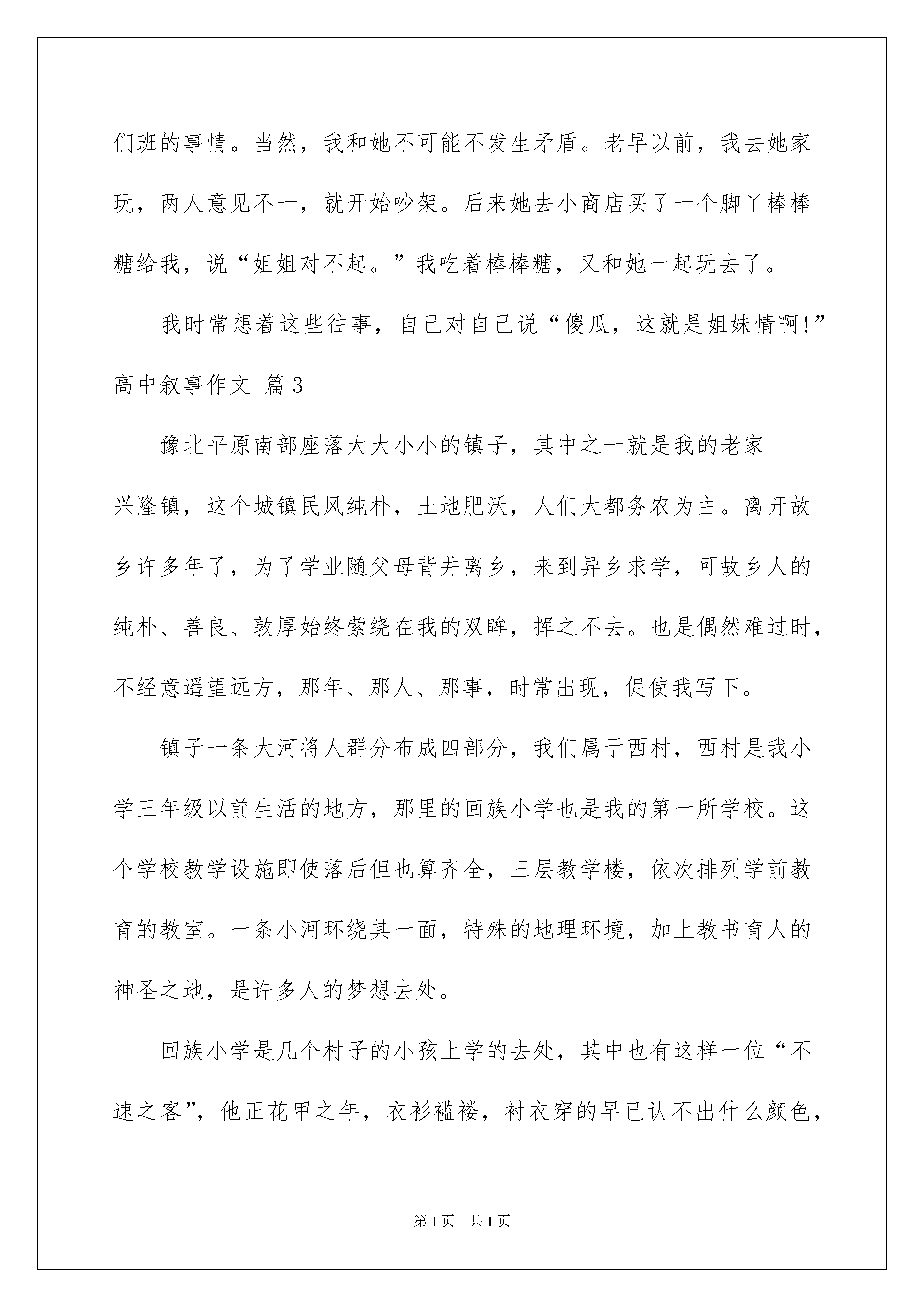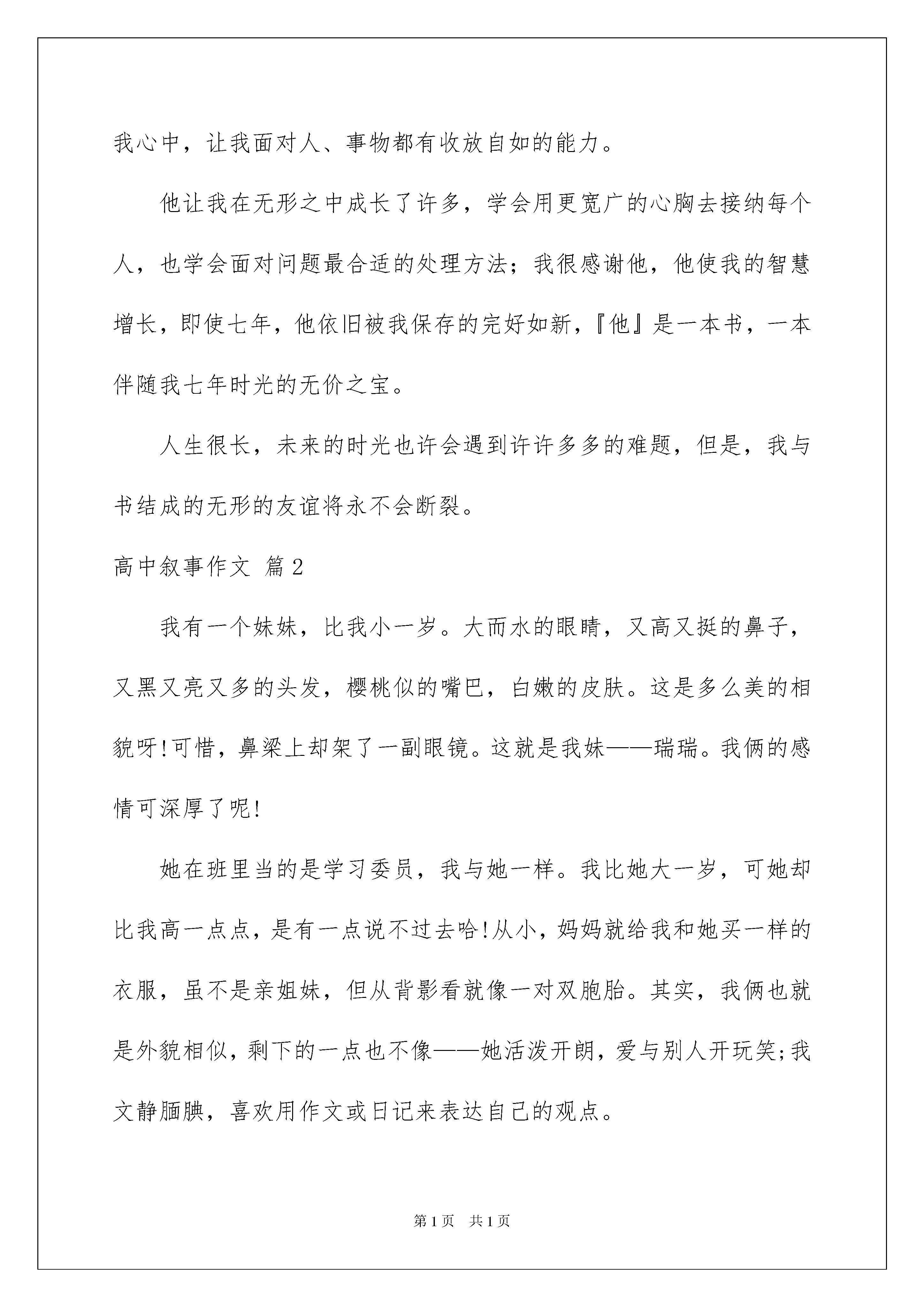 2022高中叙事作文集锦十篇高中叙事作文集锦十篇无论在学习、工作或是生活中,大家都经常接触到作文吧,作文根据写作时限的不同可以分为限时作文和非限时作文。你所见过的作文是什么样的呢?以下是我为大家整理的高中叙事作文10篇,希望能够帮助到大家。高中叙事作文篇1在我的成长过程中,有个无怨无悔陪伴我的伙伴,他告诉我做人的道理,告诉我各种努力向上的小故事,他从我学会读书认字开始便一直伴随着我,不管我到哪里他都会跟随着我,令我不觉得孤单,他是我最好的朋友,他陪伴了我七年——那就是我非常喜欢的书。随着年龄的增长,我渐渐了解他所说的故事中隐含了这样的大道理,我不禁佩服他蕴含的深奥智慧,我感到愤怒委屈时,都是他用浅显易懂的文字告诉我许多重要的道理。这之中我记忆最为深刻的有三句:生气,是拿别人的错误来惩罚自己。珍惜自己所拥有的,忘了自己所没有的。凿石般的友谊,源自真挚的心。这三句话牢牢的烙印在我心中,让我面对人、事物都有收放自如的能力。他让我在无形之中成长了许多,学会用更宽广的心胸去接纳每个人,也学会面对问题最合适的处理方法;我很感谢他,他使我的智慧增长,即使七年,他依旧被我保存的完好如新,『他』是一本书,一本伴随我七年时光的无价之宝。人生很长,未来的时光也许会遇到许许多多的难题,但是,我与书结成的无形的友谊将永不会断裂。高中叙事作文篇2我有一个妹妹,比我小一岁。大而水的眼睛,又高又挺的鼻子,又黑又亮又多的头发,樱桃似的嘴巴,白嫩的皮肤。这是多么美的相貌呀!可惜,鼻梁上却架了一副眼镜。这就是我妹——瑞瑞。我俩的感情可深厚了呢!她在班里当的是学习委员,我与她一样。我比她大一岁,可她却比我高一点点,是有一点说不过去哈!从小,妈妈就给我和她买一样的衣服,虽不是亲姐妹,但从背影看就像一对双胞胎。其实,我俩也就是外貌相似,剩下的一点也不像——她活泼开朗,爱与别人开玩笑;我文静腼腆,喜欢用作文或日记来表达自己的观点。她每次来我家,都是隔一阵子,所以关系是:亲密-冷淡-亲密。我俩先是谁都不吭声,再是其中一人开口,另一人应和,便渐渐熟悉起来。当她走时,我总是会有一丝不舍,因为不知她何时才会来。也许她经常来,我反而会厌倦,正是隔段时间来,才会有这种感觉吧!我发现我这人很怪,眼前的不知珍惜,失去了才懂得挽留。今天,她又来我家了,我告诉她,今天咱俩来较量一下羽毛球吧!她爽快地答应了。我们每次打球都是她捡球,我开始是想看看她会不会捡,而她每次什么话不说就去捡,还让我挺不好意思的嘞!其实,我爱上打羽毛球还是因为她呢!下午打完羽毛球回到楼底下,看见日日鲜自选超市装修好了,在我俩的商量与考虑之下,一起进入了日日鲜,买了一条软糖,不用说,她的钱。随后,她给了我六个,自己四个。回到家,我看见她铅笔盒里有许多大大小小、各式各样、五颜六色的橡皮,我便拿出一把,对她开玩笑地说:喏,这些归我了!”“不不,不嘛……还给我!”“我不管!”“那好吧,送你了。”她那快被我气哭的样子和那一番话使我震惊,再一次她那慷慨大方的精神使我感动。她来我家,总会与我交流一些她们班的事情,我再给她讲一些我们班的事情。当然,我和她不可能不发生矛盾。老早以前,我去她家玩,两人意见不一,就开始吵架。后来她去小商店买了一个脚丫棒棒糖给我,说“姐姐对不起。”我吃着棒棒糖,又和她一起玩去了。我时常想着这些往事,自己对自己说“傻瓜,这就是姐妹情啊!”高中叙事作文篇3豫北平原南部座落大大小小的镇子,其中之一就是我的老家——兴隆镇,这个城镇民风纯朴,土地肥沃,人们大都务农为主。离开故乡许多年了,为了学业随父母背井离乡,来到异乡求学,可故乡人的纯朴、善良、敦厚始终萦绕在我的双眸,挥之不去。也是偶然难过时,不经意遥望远方,那年、那人、那事,时常出现,促使我写下。镇子一条大河将人群分布成四部分,我们属于西村,西村是我小学三年级以前生活的地方,那里的回族小学也是我的第一所学校。这个学校教学设施即使落后但也算齐全,三层教学楼,依次排列学前教育的教室。一条小河环绕其一面,特殊的地理环境,加上教书育人的神圣之地,是许多人的梦想去处。回族小学是几个村子的小孩上学的去处,其中也有这样一位“不速之客”,他正花甲之年,衣衫褴褛,衬衣穿的早已认不出什么颜色,一双布鞋经历了泥土与路途的考验。没有人知道他从哪里来,到哪里去,只知道他在学校附近用秫秸杆和油布支起了棚子,自己一个人住在那里,没有人管他,因为有人发现他智商不正常。不过他经常上课来学校捡破烂。学校门口有一处小卖部,里面食品与学习用具琳琅满目,那里是小学生的去处。不过也带来了垃圾在校园四处可见的现象,后来的垃圾桶也阻挡不住这种现象,后来这个捡破