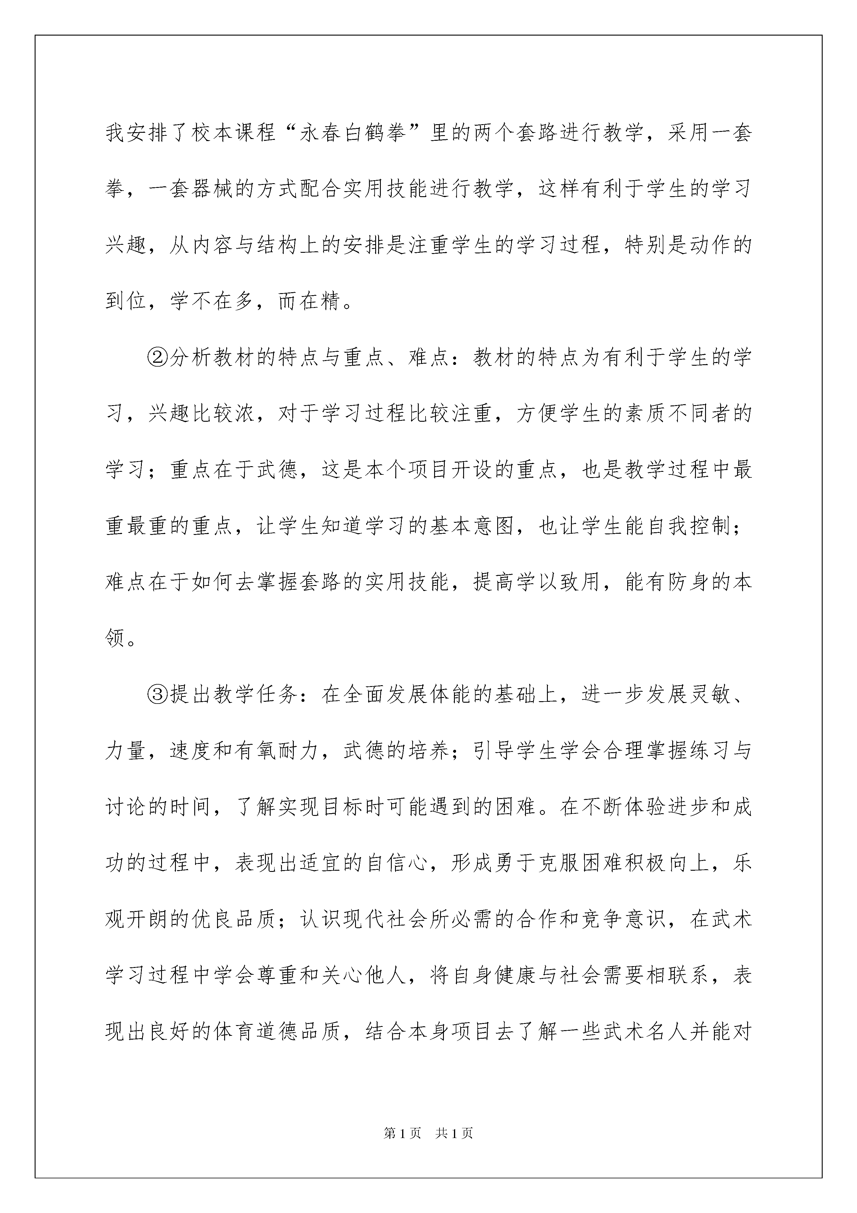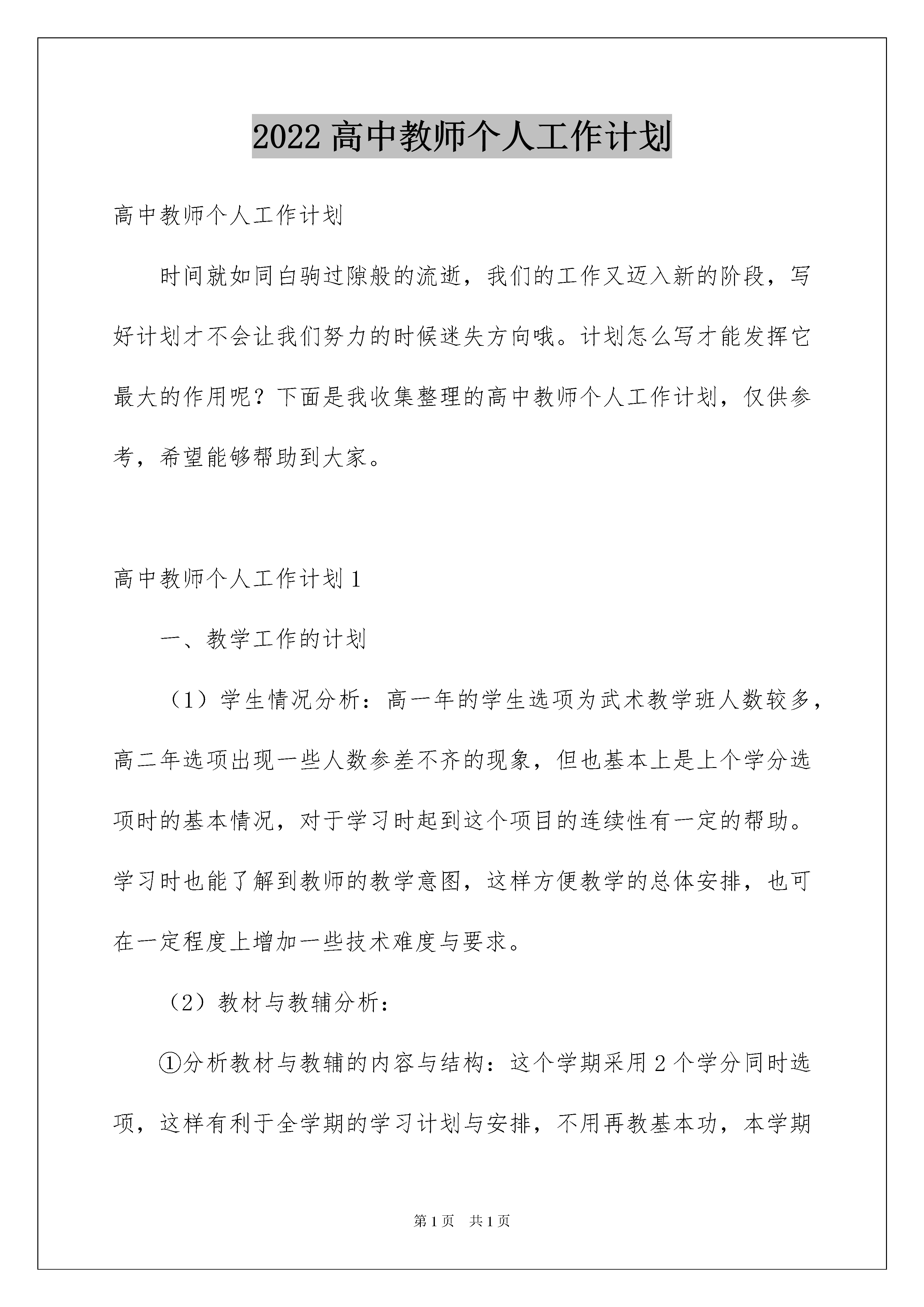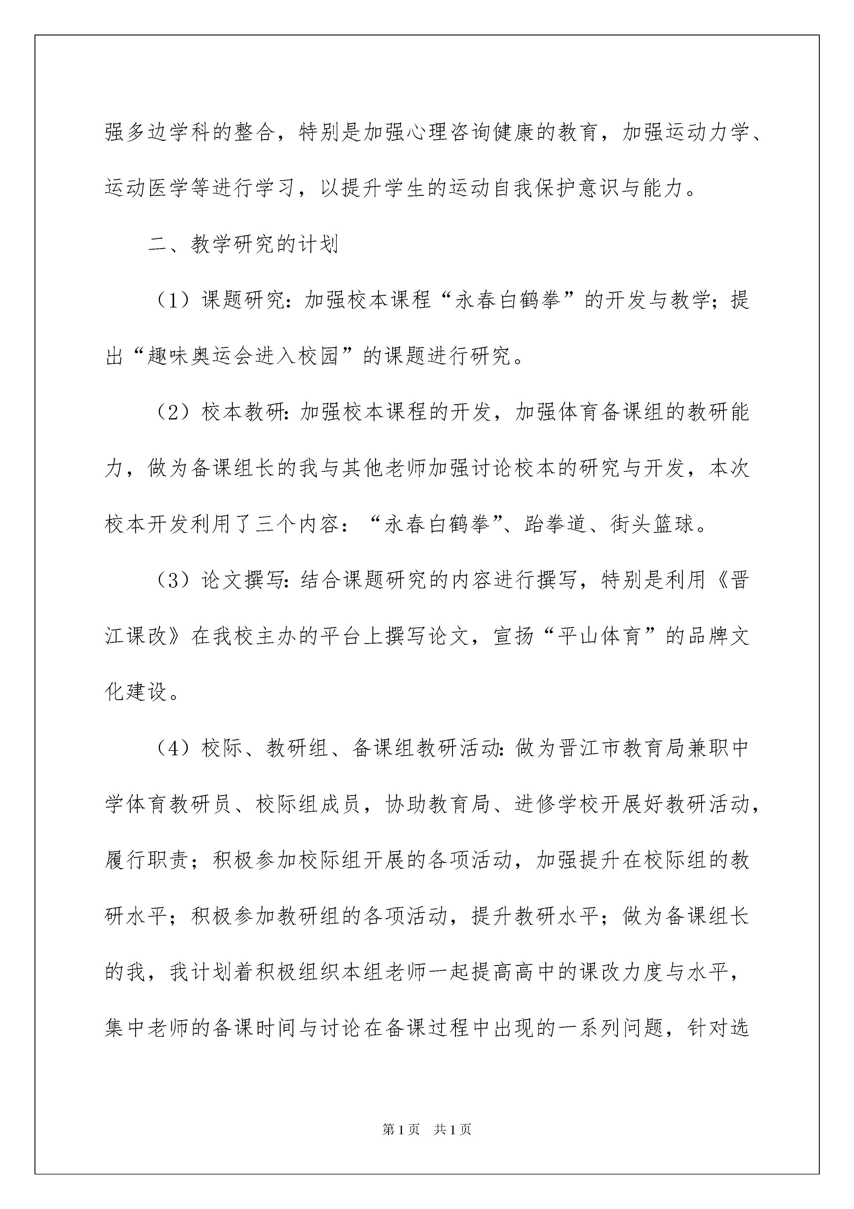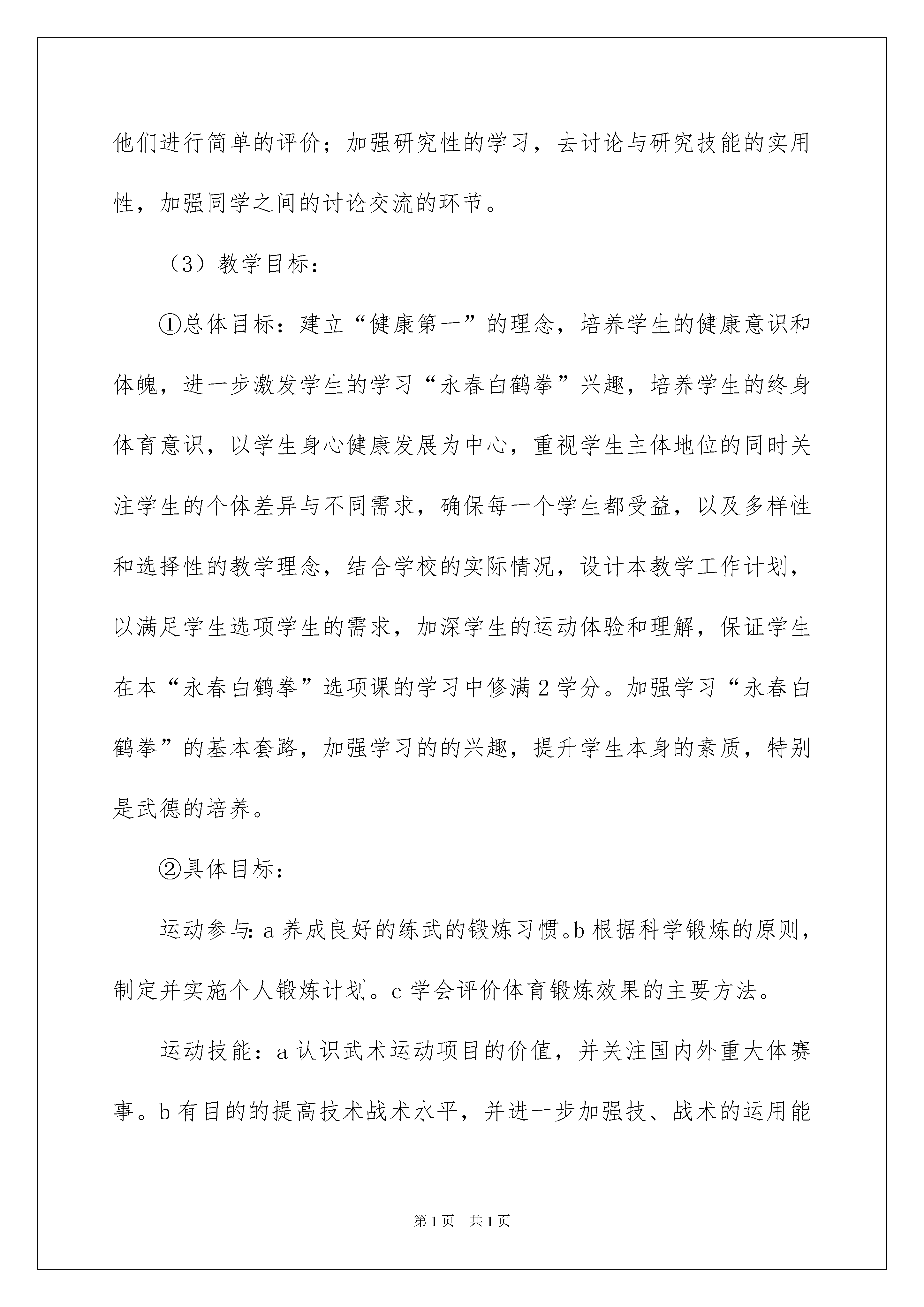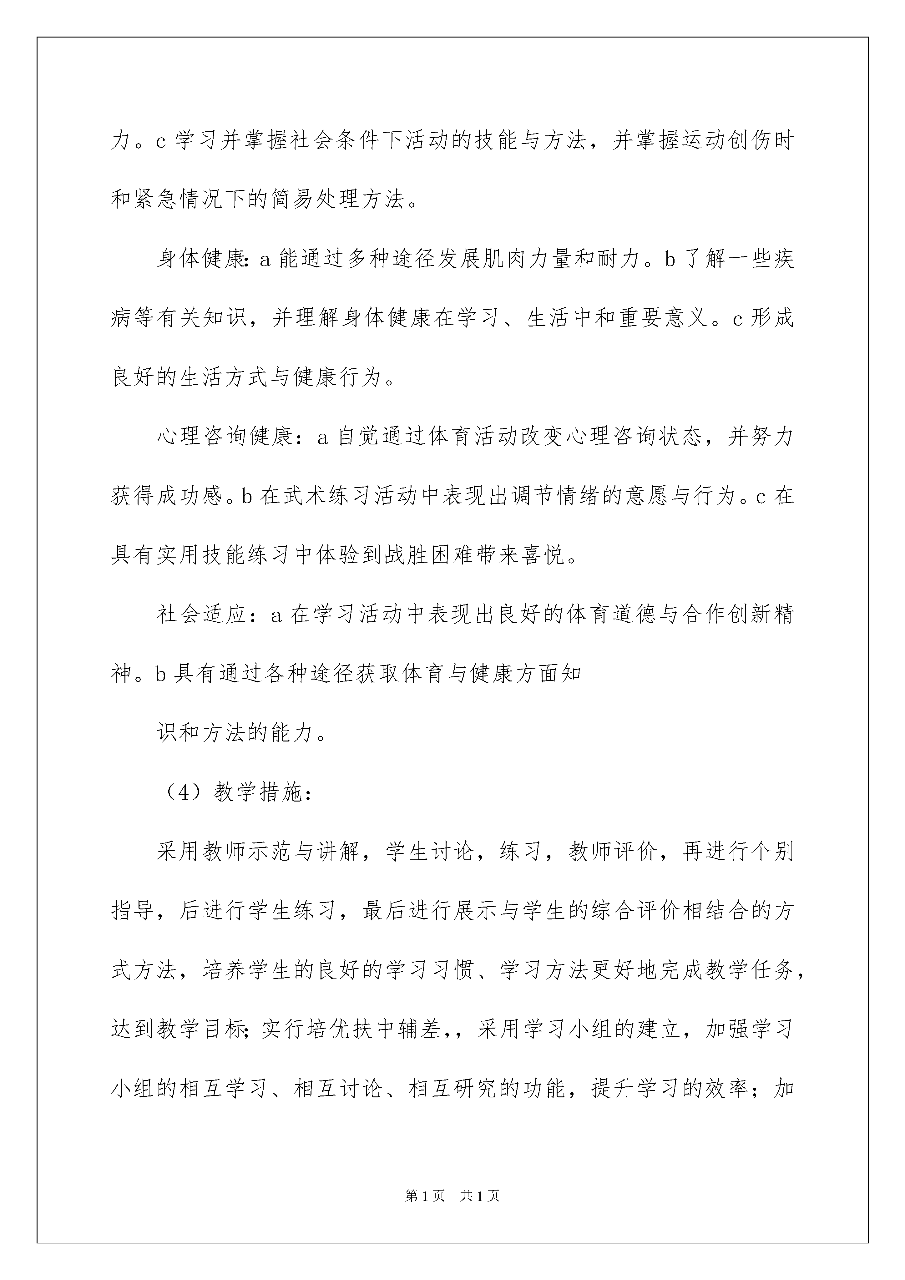 2022高中教师个人工作计划高中教师个人工作计划时间就如同白驹过隙般的流逝,我们的工作又迈入新的阶段,写好计划才不会让我们努力的时候迷失方向哦。计划怎么写才能发挥它最大的作用呢?下面是我收集整理的高中教师个人工作计划,仅供参考,希望能够帮助到大家。高中教师个人工作计划1一、教学工作的计划(1)学生情况分析:高一年的学生选项为武术教学班人数较多,高二年选项出现一些人数参差不齐的现象,但也基本上是上个学分选项时的基本情况,对于学习时起到这个项目的连续性有一定的帮助。学习时也能了解到教师的教学意图,这样方便教学的总体安排,也可在一定程度上增加一些技术难度与要求。(2)教材与教辅分析:①分析教材与教辅的内容与结构:这个学期采用2个学分同时选项,这样有利于全学期的学习计划与安排,不用再教基本功,本学期我安排了校本课程“永春白鹤拳”里的两个套路进行教学,采用一套拳,一套器械的方式配合实用技能进行教学,这样有利于学生的学习兴趣,从内容与结构上的安排是注重学生的学习过程,特别是动作的到位,学不在多,而在精。②分析教材的特点与重点、难点:教材的特点为有利于学生的学习,兴趣比较浓,对于学习过程比较注重,方便学生的素质不同者的学习;重点在于武德,这是本个项目开设的重点,也是教学过程中最重最重的重点,让学生知道学习的基本意图,也让学生能自我控制;难点在于如何去掌握套路的实用技能,提高学以致用,能有防身的本领。③提出教学任务:在全面发展体能的基础上,进一步发展灵敏、力量,速度和有氧耐力,武德的培养;引导学生学会合理掌握练习与讨论的时间,了解实现目标时可能遇到的困难。在不断体验进步和成功的过程中,表现出适宜的自信心,形成勇于克服困难积极向上,乐观开朗的优良品质;认识现代社会所必需的合作和竞争意识,在武术学习过程中学会尊重和关心他人,将自身健康与社会需要相联系,表现出良好的体育道德品质,结合本身项目去了解一些武术名人并能对他们进行简单的评价;加强研究性的学习,去讨论与研究技能的实用性,加强同学之间的讨论交流的环节。(3)教学目标:①总体目标:建立“健康第一”的理念,培养学生的健康意识和体魄,进一步激发学生的学习“永春白鹤拳”兴趣,培养学生的终身体育意识,以学生身心健康发展为中心,重视学生主体地位的同时关注学生的个体差异与不同需求,确保每一个学生都受益,以及多样性和选择性的教学理念,结合学校的实际情况,设计本教学工作计划,以满足学生选项学生的需求,加深学生的运动体验和理解,保证学生在本“永春白鹤拳”选项课的学习中修满2学分。加强学习“永春白鹤拳”的基本套路,加强学习的的兴趣,提升学生本身的素质,特别是武德的培养。②具体目标:运动参与:a养成良好的练武的锻炼习惯。b根据科学锻炼的原则,制定并实施个人锻炼计划。c学会评价体育锻炼效果的主要方法。运动技能:a认识武术运动项目的价值,并关注国内外重大体赛事。b有目的的提高技术战术水平,并进一步加强技、战术的运用能力。c学习并掌握社会条件下活动的技能与方法,并掌握运动创伤时和紧急情况下的简易处理方法。身体健康:a能通过多种途径发展肌肉力量和耐力。b了解一些疾病等有关知识,并理解身体健康在学习、生活中和重要意义。c形成良好的生活方式与健康行为。心理咨询健康:a自觉通过体育活动改变心理咨询状态,并努力获得成功感。b在武术练习活动中表现出调节情绪的意愿与行为。c在具有实用技能练习中体验到战胜困难带来喜悦。社会适应:a在学习活动中表现出良好的体育道德与合作创新精神。b具有通过各种途径获取体育与健康方面知识和方法的能力。(4)教学措施:采用教师示范与讲解,学生讨论,练习,教师评价,再进行个别指导,后进行学生练习,最后进行展示与学生的综合评价相结合的方式方法,培养学生的良好的学习习惯、学习方法更好地完成教学任务,达到教学目标;实行培优扶中辅差,,采用学习小组的建立,加强学习小组的相互学习、相互讨论、相互研究的功能,提升学习的效率;加强多边学科的整合,特别是加强心理咨询健康的教育,加强运动力学、运动医学等进行学习,以提升学生的运动自我保护意识与能力。二、教学研究的计划(1)课题研究:加强校本课程“永春白鹤拳”的开发与教学;提出“趣味奥运会进入校园”的课题进行研究。(2)校本教研:加强校本课程的开发,加强体育备课组的教研能力,做为备课组长的我与其他老师加强讨论校本的研究与开发,本次校本开发利用了三个内容:“永春白鹤拳”、跆拳道、街头篮球。(3)论文撰写:结合课题研究的内容进行撰写,特别是利用《晋江课改》在我校主办的平台上撰写论文,宣扬“平山体育”的品牌文化建设。(4)校际、教研组