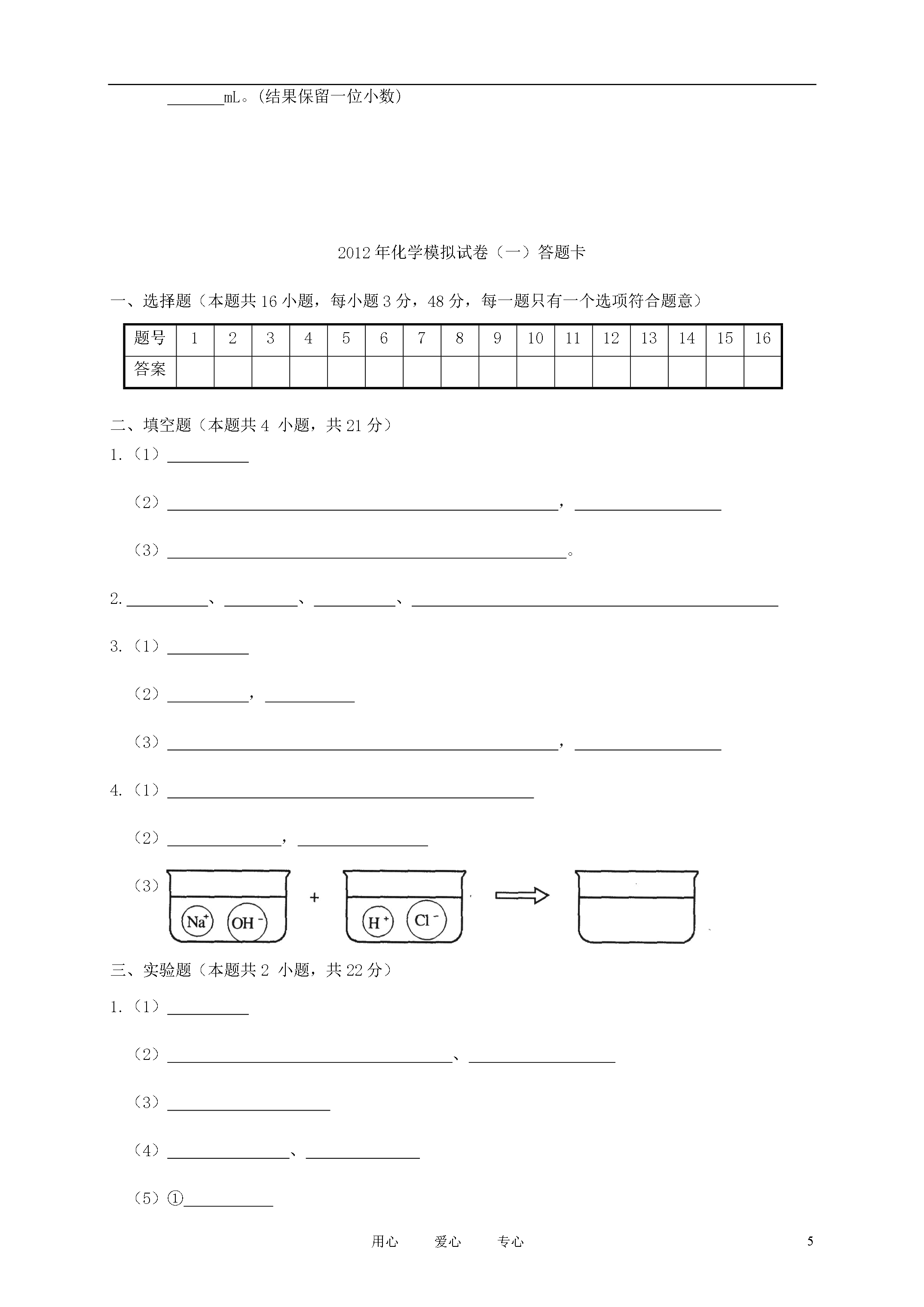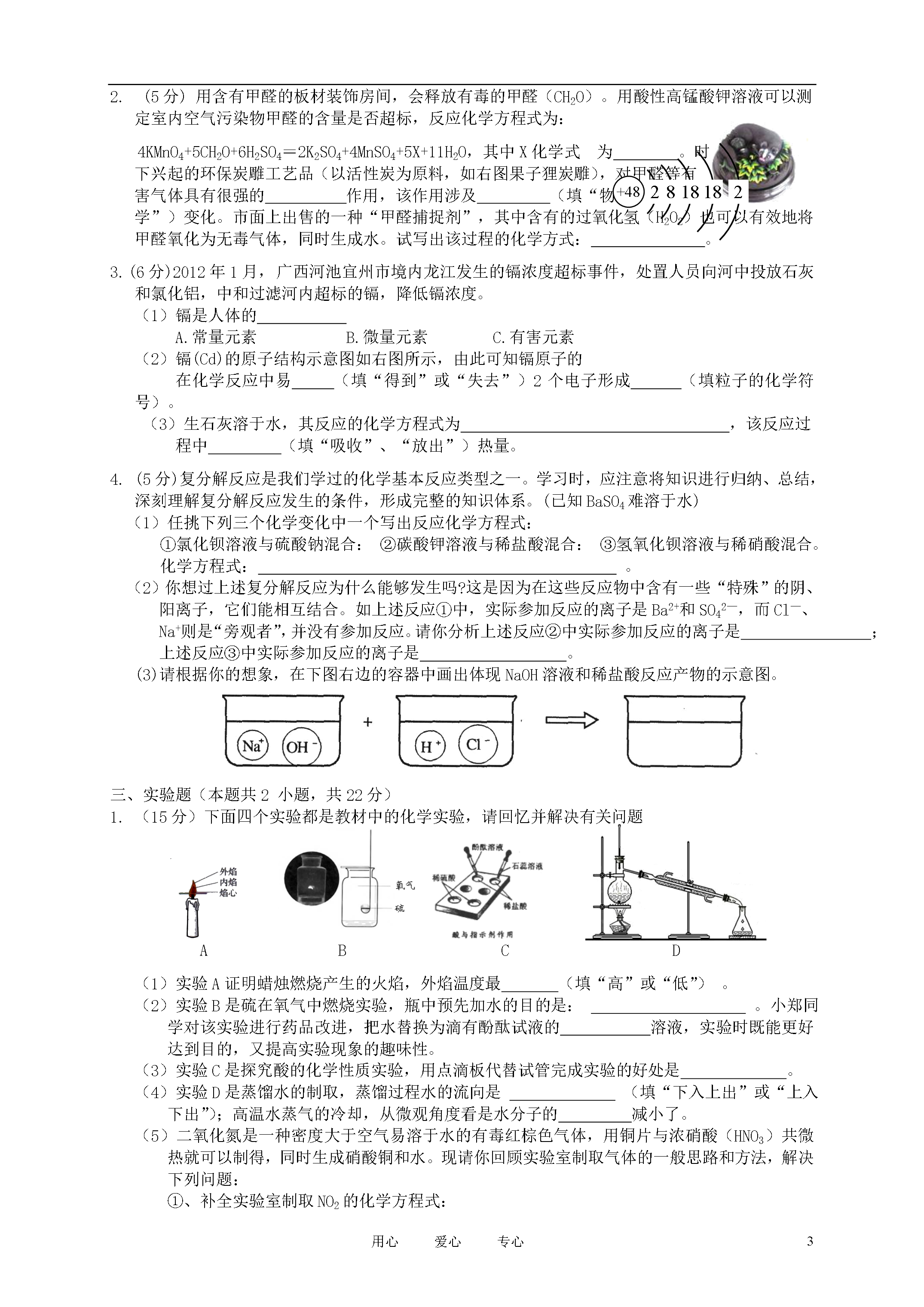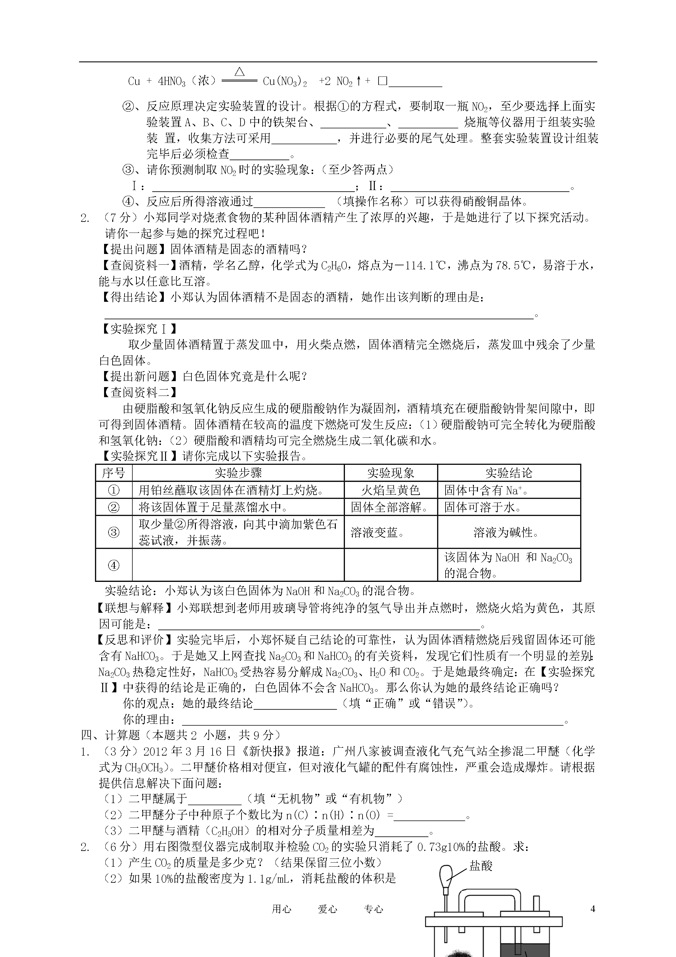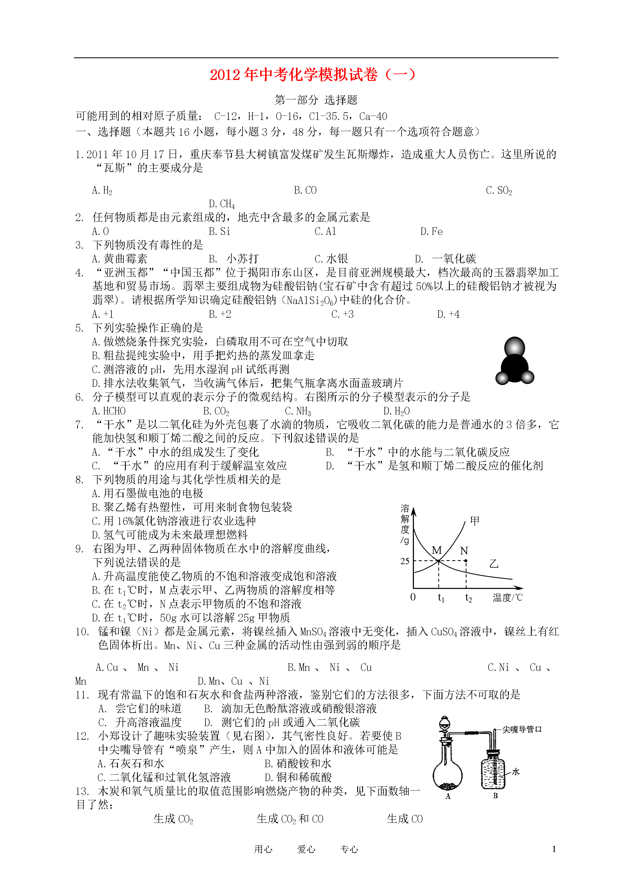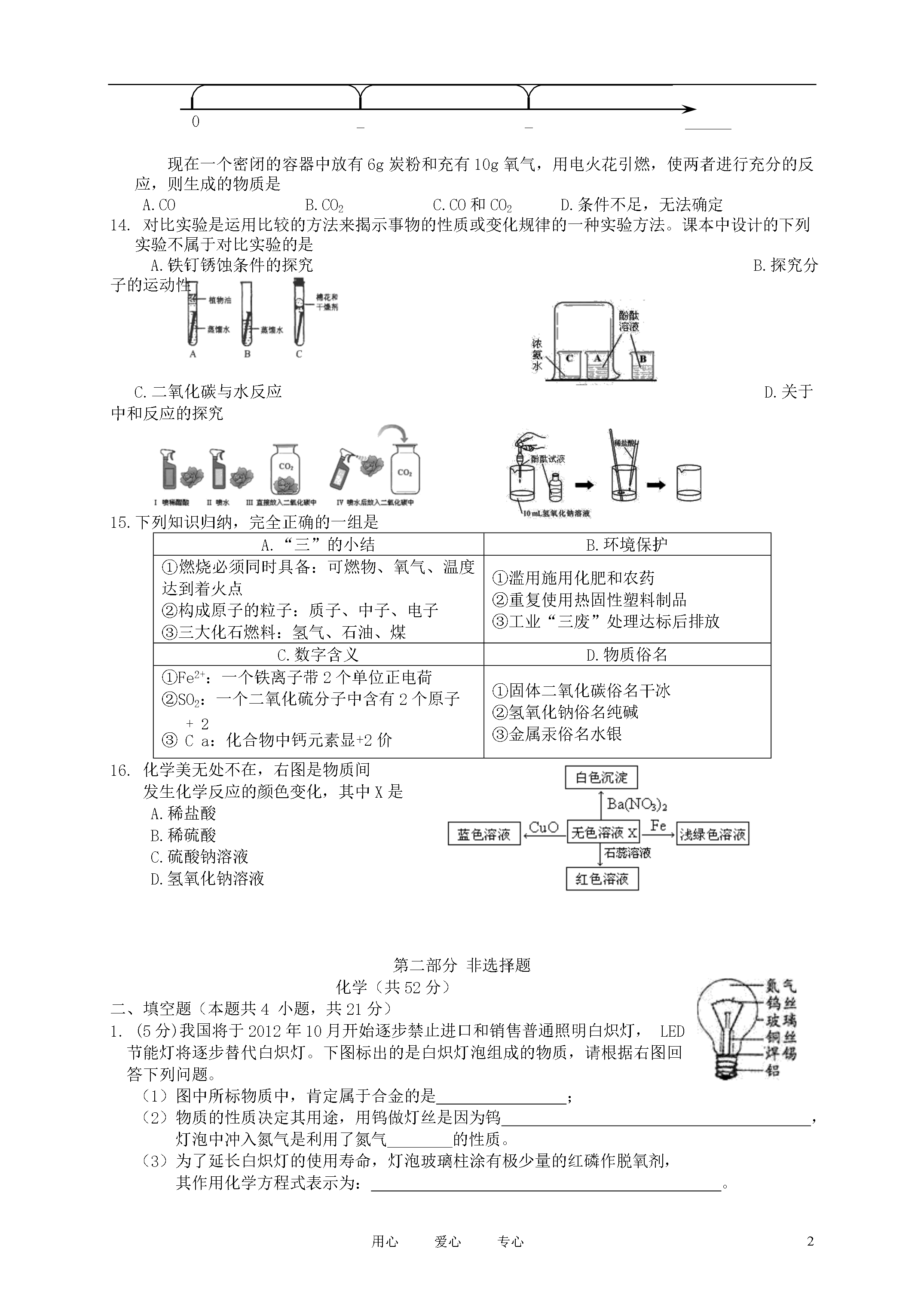 28用心爱心专心2012年中考化学模拟试卷(一)第一部分选择题可能用到的相对原子质量:C-12,H-1,O-16,Cl-35.5,Ca-40一、选择题(本题共16小题,每小题3分,48分,每一题只有一个选项符合题意)1.2011年10月17日,重庆奉节县大树镇富发煤矿发生瓦斯爆炸,造成重大人员伤亡。这里所说的“瓦斯”的主要成分是A.H2B.COC.SO2D.CH42.任何物质都是由元素组成的,地壳中含最多的金属元素是A.OB.SiC.AlD.Fe3.下列物质没有毒性的是A.黄曲霉素B.小苏打C.水银D.一氧化碳4.“亚洲玉都”“中国玉都”位于揭阳市东山区,是目前亚洲规模最大,档次最高的玉器翡翠加工基地和贸易市场。翡翠主要组成物为硅酸铝钠(宝石矿中含有超过50%以上的硅酸铝钠才被视为翡翠)。请根据所学知识确定硅酸铝钠(NaAlSi2O6)中硅的化合价。A.+1B.+2C.+3D.+45.下列实验操作正确的是A.做燃烧条件探究实验,白磷取用不可在空气中切取B.粗盐提纯实验中,用手把灼热的蒸发皿拿走C.测溶液的pH,先用水湿润pH试纸再测D.排水法收集氧气,当收满气体后,把集气瓶拿离水面盖玻璃片6.分子模型可以直观的表示分子的微观结构。右图所示的分子模型表示的分子是A.HCHOB.CO2C.NH3D.H2O7.“干水”是以二氧化硅为外壳包裹了水滴的物质,它吸收二氧化碳的能力是普通水的3倍多,它能加快氢和顺丁烯二酸之间的反应。下刊叙述错误的是A.“干水”中水的组成发生了变化B.“干水”中的水能与二氧化碳反应C.“干水”的应用有利于缓解温室效应D.“干水”是氢和顺丁烯二酸反应的催化剂8.下列物质的用途与其化学性质相关的是A.用石墨做电池的电极NM溶解度/g250t1t2温度/℃甲乙B.聚乙烯有热塑性,可用来制食物包装袋C.用16%氯化钠溶液进行农业选种D.氢气可能成为未来最理想燃料9.右图为甲、乙两种固体物质在水中的溶解度曲线,下列说法错误的是A.升高温度能使乙物质的不饱和溶液变成饱和溶液B.在t1℃时,M点表示甲、乙两物质的溶解度相等C.在t2℃时,N点表示甲物质的不饱和溶液D.在t1℃时,50g水可以溶解25g甲物质10.锰和镍(Ni)都是金属元素,将镍丝插入MnSO4溶液中无变化,插入CuSO4溶液中,镍丝上有红色固体析出。Mn、Ni、Cu三种金属的活动性由强到弱的顺序是A.Cu、Mn、NiB.Mn、Ni、CuC.Ni、Cu、MnD.Mn、Cu、Ni11.现有常温下的饱和石灰水和食盐两种溶液,鉴别它们的方法很多,下面方法不可取的是A.尝它们的味道B.滴加无色酚酞溶液或硝酸银溶液C.升高溶液温度D.测它们的pH或通入二氧化碳12.小郑设计了趣味实验装置(见右图),其气密性良好。若要使B中尖嘴导管有“喷泉”产生,则A中加入的固体和液体可能是A.石灰石和水B.硝酸铵和水C.二氧化锰和过氧化氢溶液D.铜和稀硫酸13.木炭和氧气质量比的取值范围影响燃烧产物的种类,见下面数轴一目了然:生成CO2生成CO2和CO生成CO0现在一个密闭的容器中放有6g炭粉和充有10g氧气,用电火花引燃,使两者进行充分的反应,则生成的物质是A.COB.CO2C.CO和CO2D.条件不足,无法确定14.对比实验是运用比较的方法来揭示事物的性质或变化规律的一种实验方法。课本中设计的下列实验不属于对比实验的是A.铁钉锈蚀条件的探究B.探究分子的运动性C.二氧化碳与水反应D.关于中和反应的探究15.下列知识归纳,完全正确的一组是A.“三”的小结B.环境保护①燃烧必须同时具备:可燃物、氧气、温度达到着火点②构成原子的粒子:质子、中子、电子③三大化石燃料:氢气、石油、煤①滥用施用化肥和农药②重复使用热固性塑料制品③工业“三废”处理达标后排放C.数字含义D.物质俗名①Fe2+:一个铁离子带2个单位正电荷②SO2:一个二氧化硫分子中含有2个原子③:化合物中钙元素显+2价①固体二氧化碳俗名干冰②氢氧化钠俗名纯碱③金属汞俗名水银16.化学美无处不在,右图是物质间发生化学反应的颜色变化,其中X是A.稀盐酸B.稀硫酸C.硫酸钠溶液D.氢氧化钠溶液第二部分非选择题化学(共52分)二、填空题(本题共4小题,共21分)1.(5分)我国将于2012年10月开始逐步禁止进口和销售普通照明白炽灯,LED节能灯将逐步替代白炽灯。下图标出的是白炽灯泡组成的物质,请根据右图回答下列问题。(1)图中所标物质中,肯定属于合金的是;(2)物质的性质决定其用途,用钨做灯丝是因为钨,灯泡中冲入氮气是利用了氮气________的性质。(3)为了延长白炽灯的使用寿命,灯泡玻璃柱涂有极少量的红磷作脱氧剂,其作用化学方程式表示为:。2.(5分)用含有甲醛的板材装饰房间,会释放有毒的甲醛(CH2O)。用酸性高锰酸钾溶液可以测