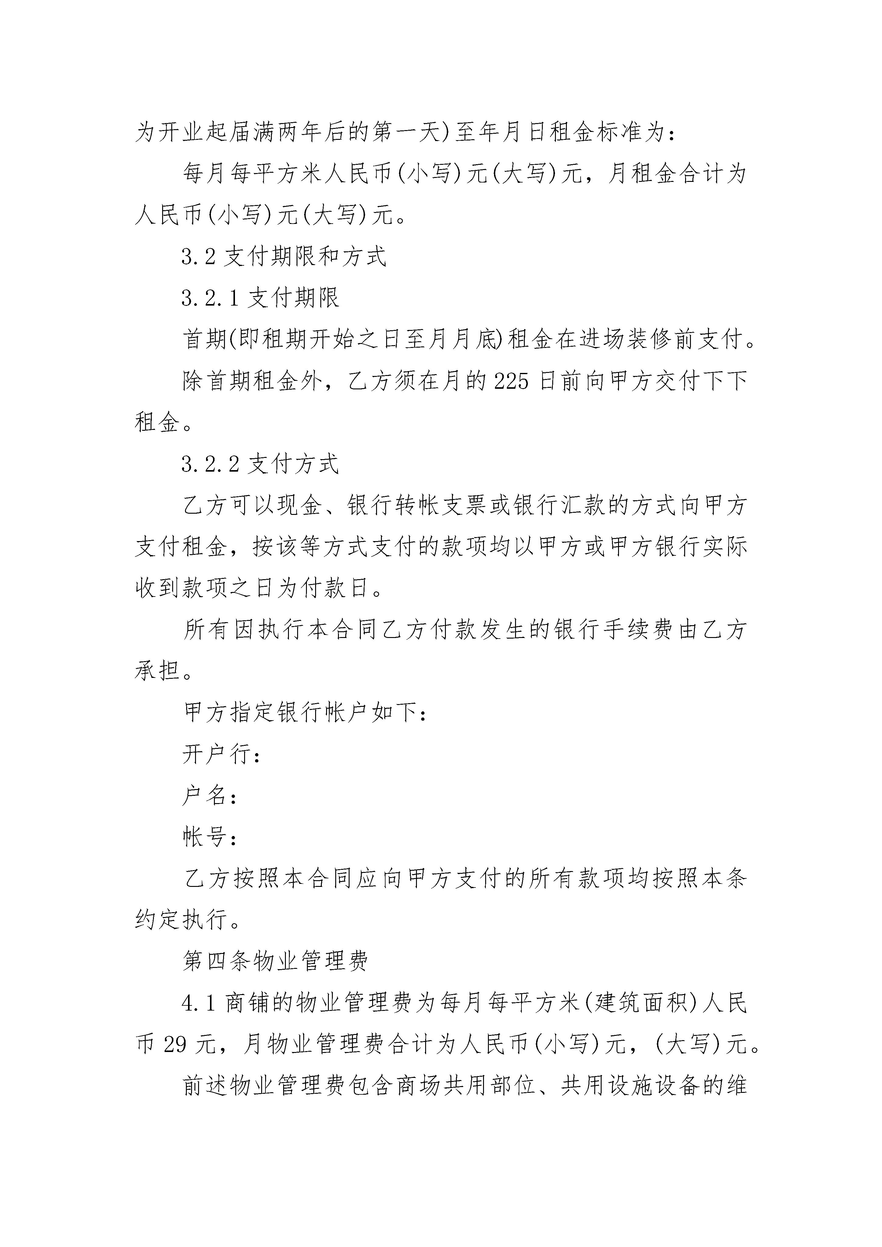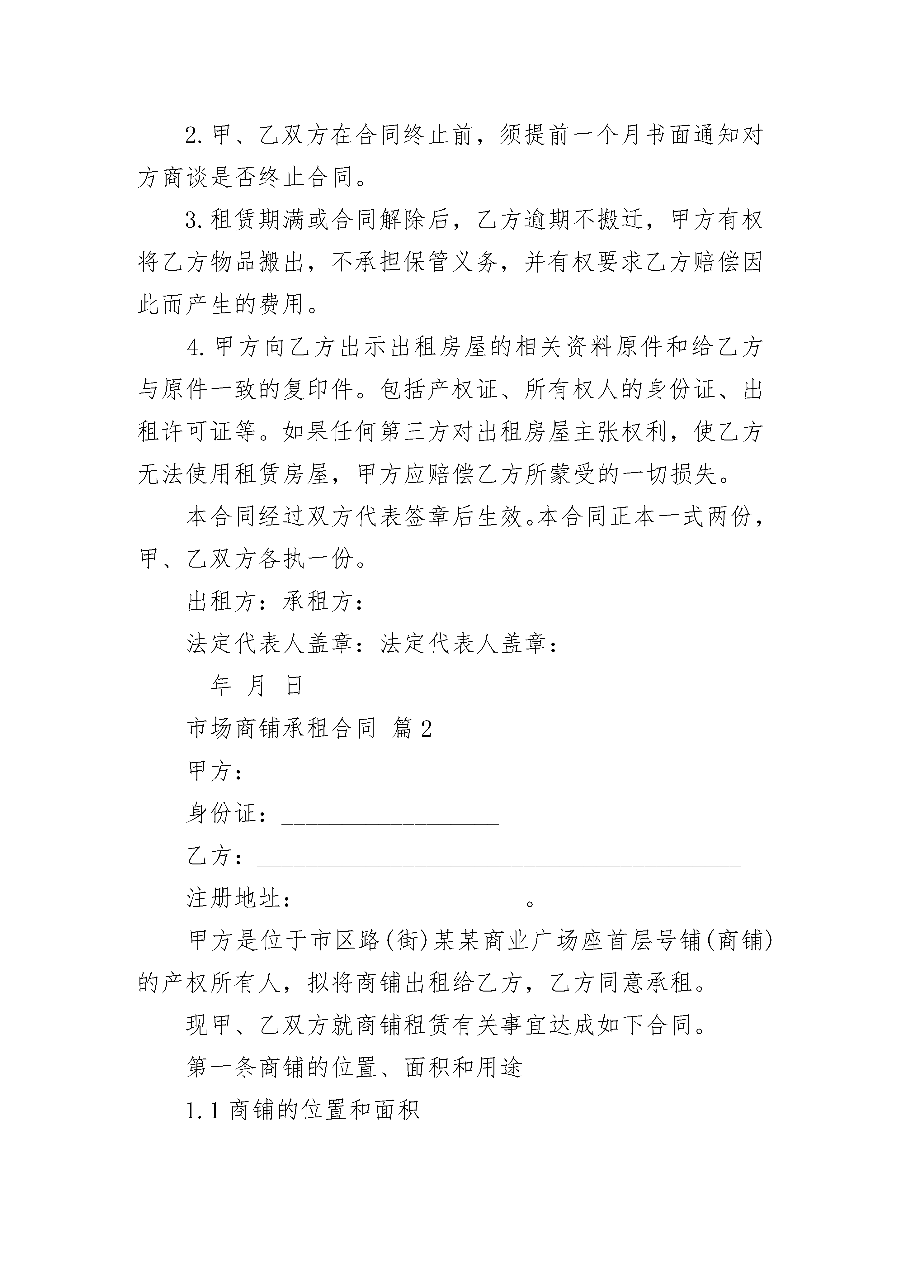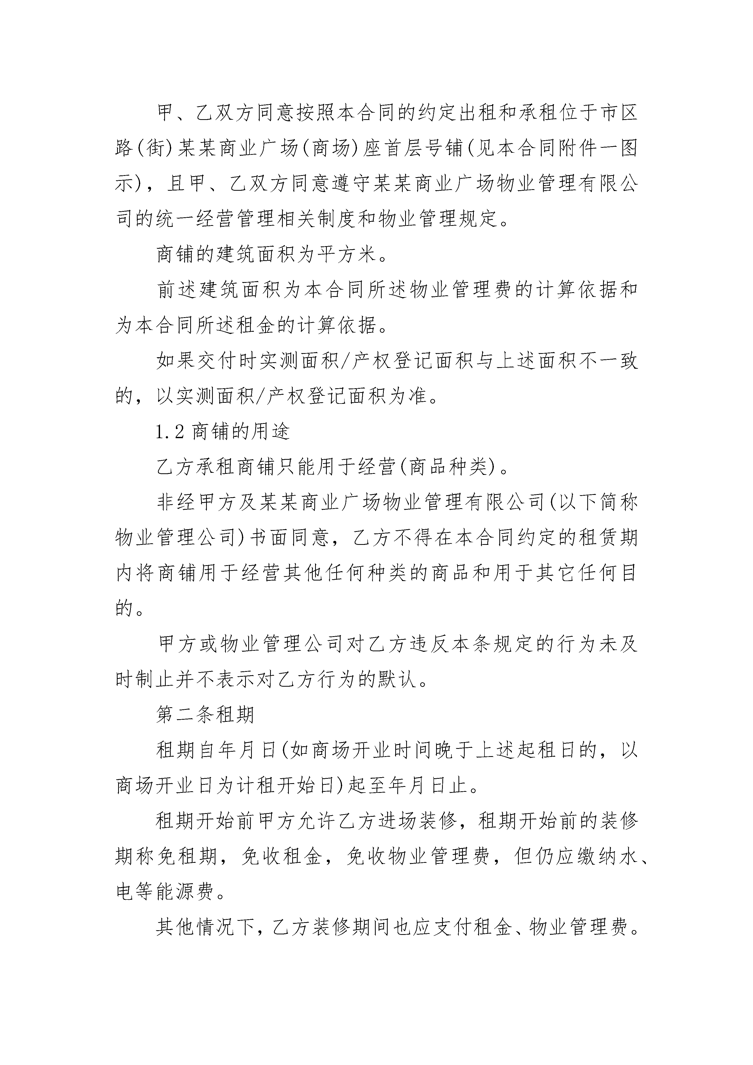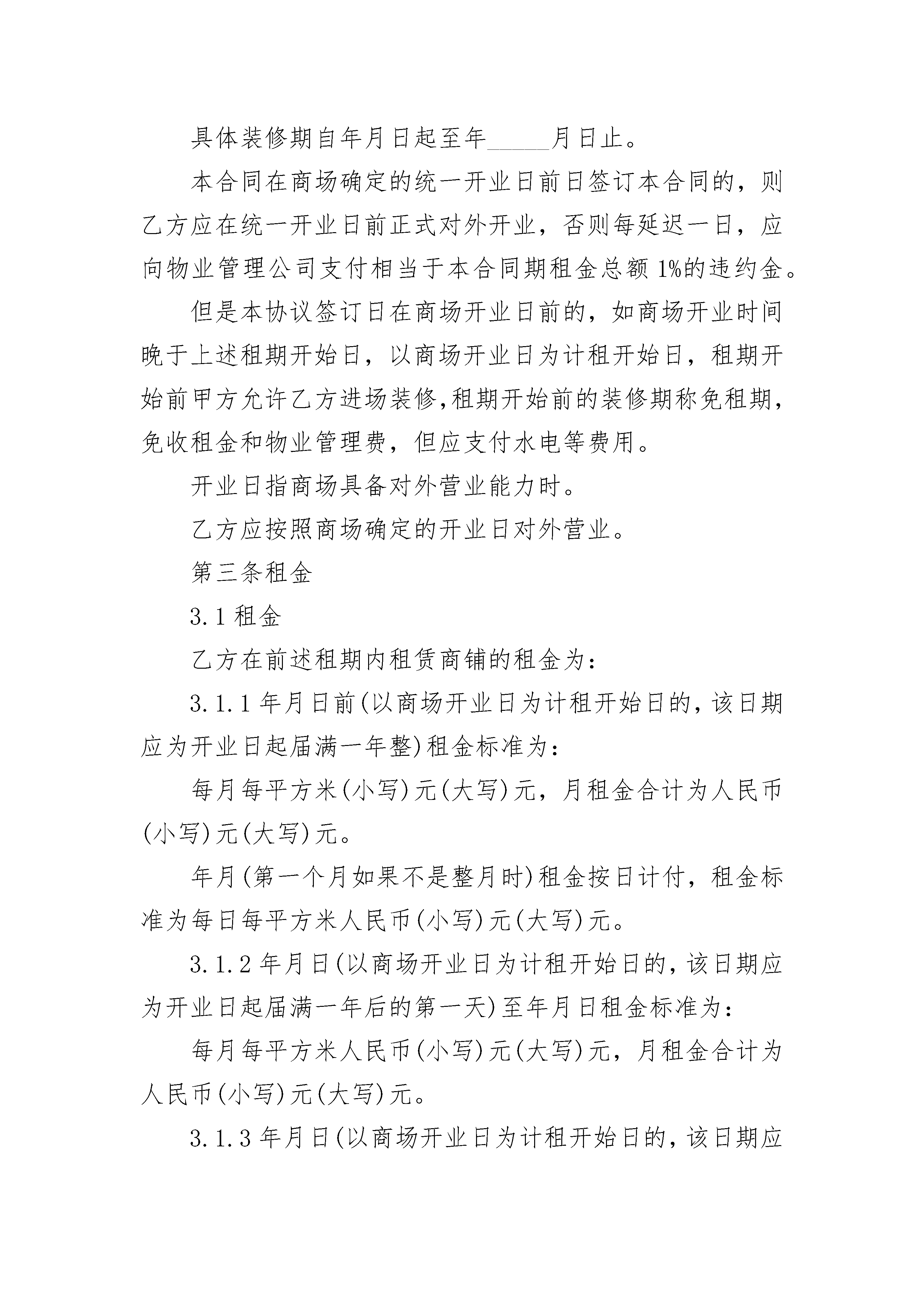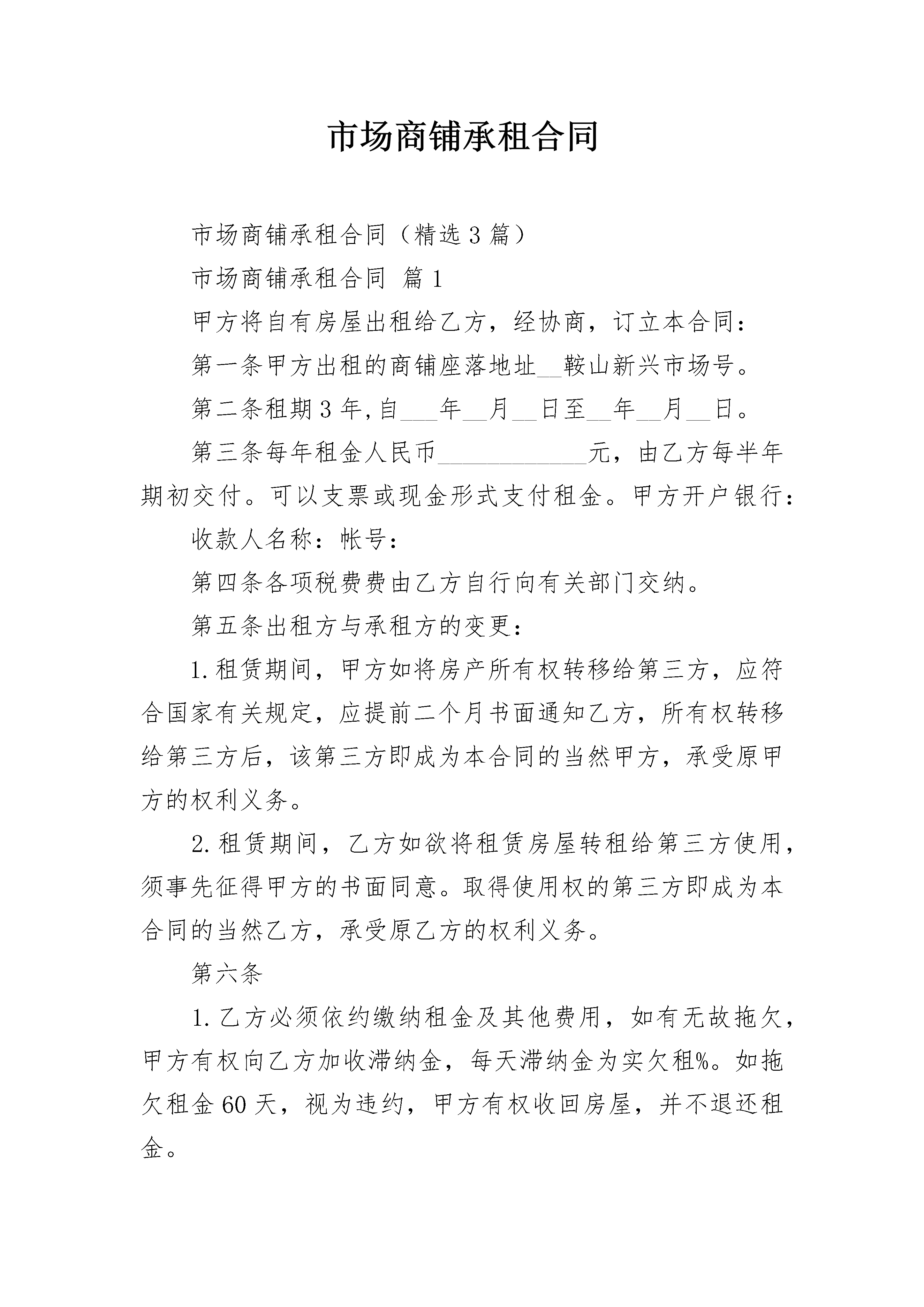 市场商铺承租合同市场商铺承租合同(精选3篇)市场商铺承租合同篇1甲方将自有房屋出租给乙方,经协商,订立本合同:第一条甲方出租的商铺座落地址__鞍山新兴市场号。第二条租期3年,自___年__月__日至__年__月__日。第三条每年租金人民币____________元,由乙方每半年期初交付。可以支票或现金形式支付租金。甲方开户银行:收款人名称:帐号:第四条各项税费费由乙方自行向有关部门交纳。第五条出租方与承租方的变更:1.租赁期间,甲方如将房产所有权转移给第三方,应符合国家有关规定,应提前二个月书面通知乙方,所有权转移给第三方后,该第三方即成为本合同的当然甲方,承受原甲方的权利义务。2.租赁期间,乙方如欲将租赁房屋转租给第三方使用,须事先征得甲方的书面同意。取得使用权的第三方即成为本合同的当然乙方,承受原乙方的权利义务。第六条1.乙方必须依约缴纳租金及其他费用,如有无故拖欠,甲方有权向乙方加收滞纳金,每天滞纳金为实欠租%。如拖欠租金60天,视为违约,甲方有权收回房屋,并不退还租金。2.甲、乙双方在合同终止前,须提前一个月书面通知对方商谈是否终止合同。3.租赁期满或合同解除后,乙方逾期不搬迁,甲方有权将乙方物品搬出,不承担保管义务,并有权要求乙方赔偿因此而产生的费用。4.甲方向乙方出示出租房屋的相关资料原件和给乙方与原件一致的复印件。包括产权证、所有权人的身份证、出租许可证等。如果任何第三方对出租房屋主张权利,使乙方无法使用租赁房屋,甲方应赔偿乙方所蒙受的一切损失。本合同经过双方代表签章后生效。本合同正本一式两份,甲、乙双方各执一份。出租方:承租方:法定代表人盖章:法定代表人盖章:__年_月_日市场商铺承租合同篇2甲方:________________________________________身份证:__________________乙方:________________________________________注册地址:__________________。甲方是位于市区路(街)某某商业广场座首层号铺(商铺)的产权所有人,拟将商铺出租给乙方,乙方同意承租。现甲、乙双方就商铺租赁有关事宜达成如下合同。第一条商铺的位置、面积和用途1.1商铺的位置和面积甲、乙双方同意按照本合同的约定出租和承租位于市区路(街)某某商业广场(商场)座首层号铺(见本合同附件一图示),且甲、乙双方同意遵守某某商业广场物业管理有限公司的统一经营管理相关制度和物业管理规定。商铺的建筑面积为平方米。前述建筑面积为本合同所述物业管理费的计算依据和为本合同所述租金的计算依据。如果交付时实测面积/产权登记面积与上述面积不一致的,以实测面积/产权登记面积为准。1.2商铺的用途乙方承租商铺只能用于经营(商品种类)。非经甲方及某某商业广场物业管理有限公司(以下简称物业管理公司)书面同意,乙方不得在本合同约定的租赁期内将商铺用于经营其他任何种类的商品和用于其它任何目的。甲方或物业管理公司对乙方违反本条规定的行为未及时制止并不表示对乙方行为的默认。第二条租期租期自年月日(如商场开业时间晚于上述起租日的,以商场开业日为计租开始日)起至年月日止。租期开始前甲方允许乙方进场装修,租期开始前的装修期称免租期,免收租金,免收物业管理费,但仍应缴纳水、电等能源费。其他情况下,乙方装修期间也应支付租金、物业管理费。具体装修期自年月日起至年_____月日止。本合同在商场确定的统一开业日前日签订本合同的,则乙方应在统一开业日前正式对外开业,否则每延迟一日,应向物业管理公司支付相当于本合同期租金总额1%的违约金。但是本协议签订日在商场开业日前的,如商场开业时间晚于上述租期开始日,以商场开业日为计租开始日,租期开始前甲方允许乙方进场装修,租期开始前的装修期称免租期,免收租金和物业管理费,但应支付水电等费用。开业日指商场具备对外营业能力时。乙方应按照商场确定的开业日对外营业。第三条租金3.1租金乙方在前述租期内租赁商铺的租金为:3.1.1年月日前(以商场开业日为计租开始日的,该日期应为开业日起届满一年整)租金标准为:每月每平方米(小写)元(大写)元,月租金合计为人民币(小写)元(大写)元。年月(第一个月如果不是整月时)租金按日计付,租金标准为每日每平方米人民币(小写)元(大写)元。3.1.2年月日(以商场开业日为计租开始日的,该日期应为开业日起届满一年后的第一天)至年月日租金标准为:每月每平方米人民币(小写)元(大写)元,月租金合计为人民币(小写)元(大写)元。3.1.3年月日(以商场开业日为计租开始日的,该日期应为开业起届满两年后的第一天)至年月日租金标准为:每月每平方米人民币(小写)元(大写)元,月租金合计为人民币(小写)元(大写)元。3.2支付期限和方式3.2.1支付期限首期(即租