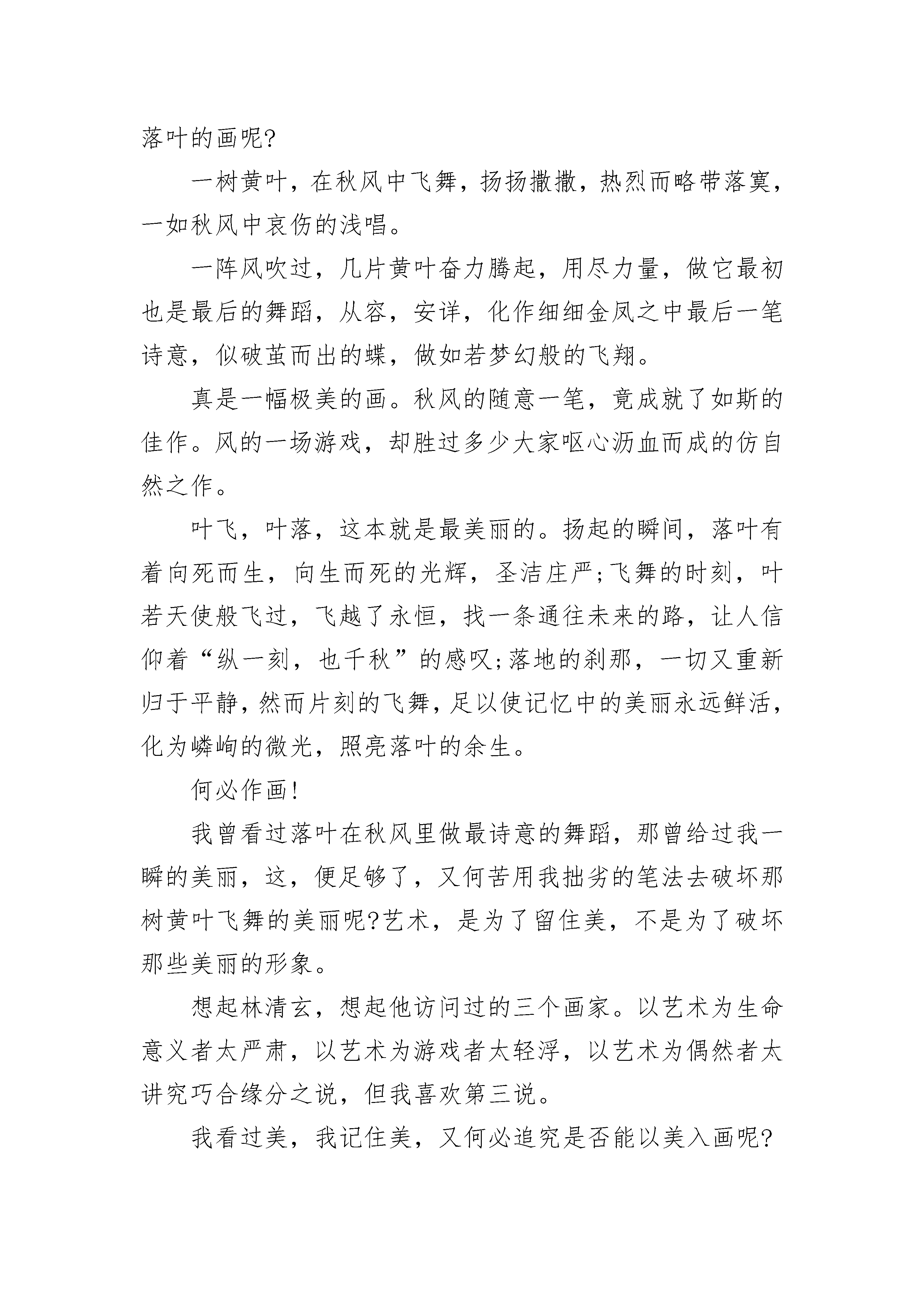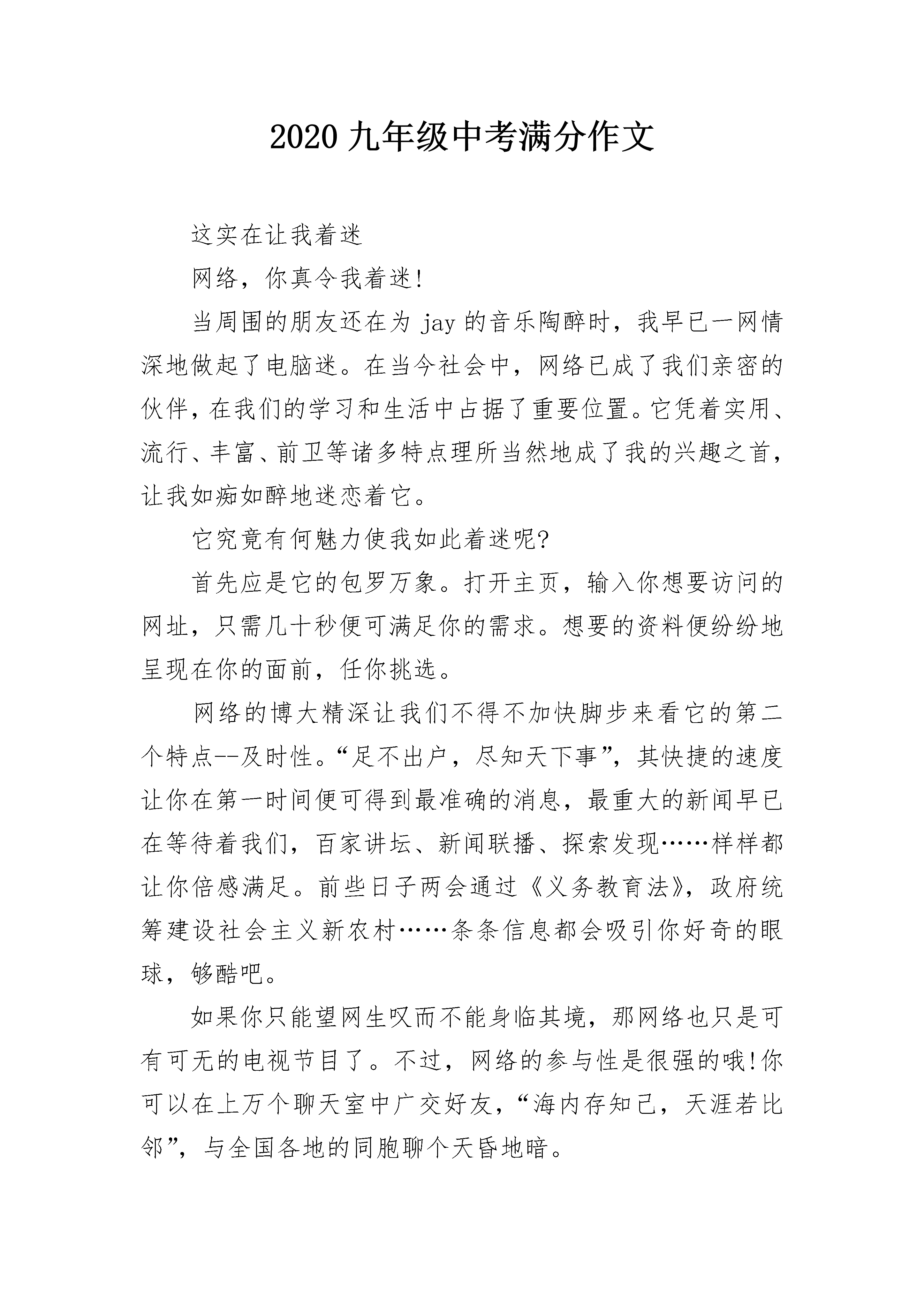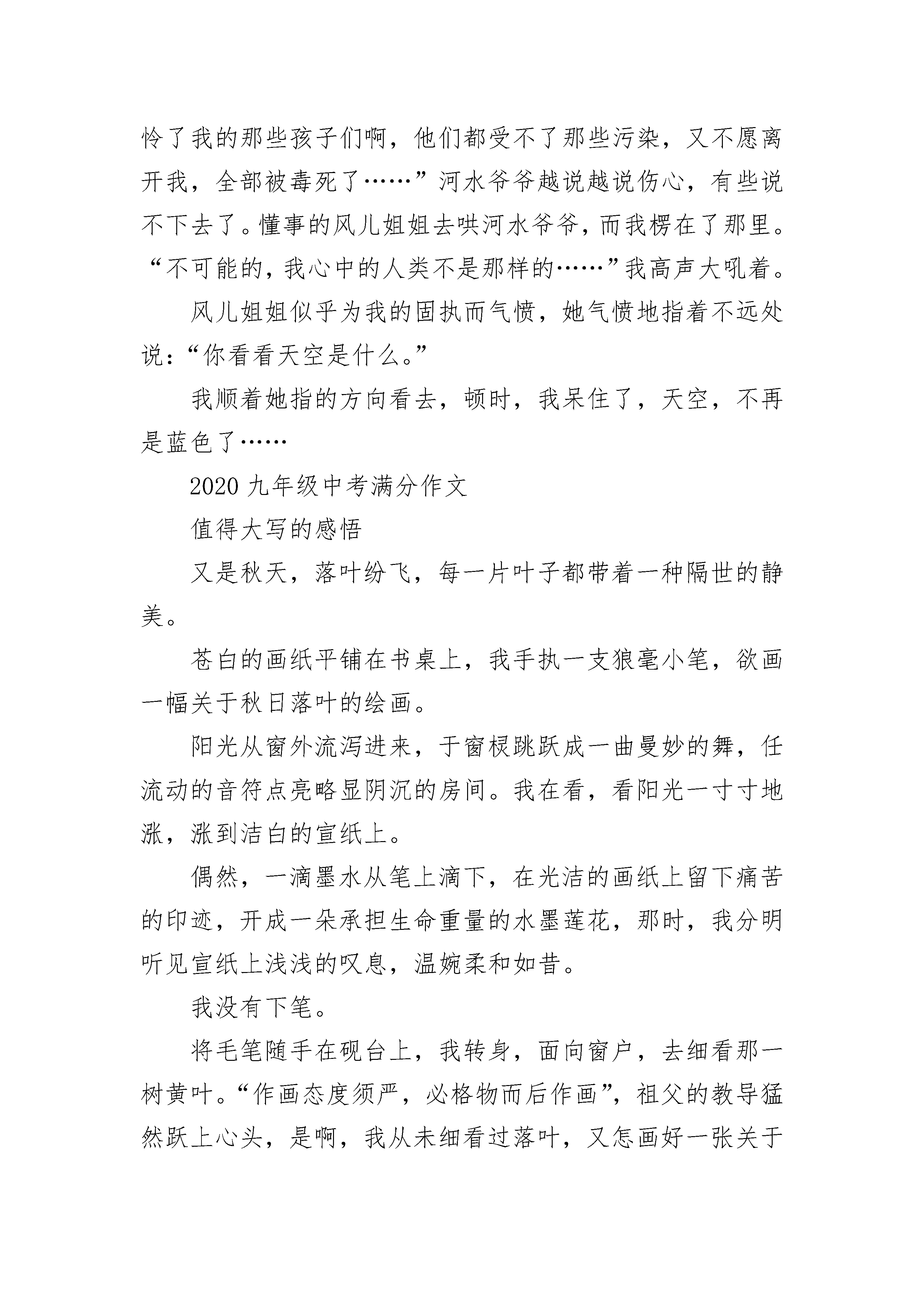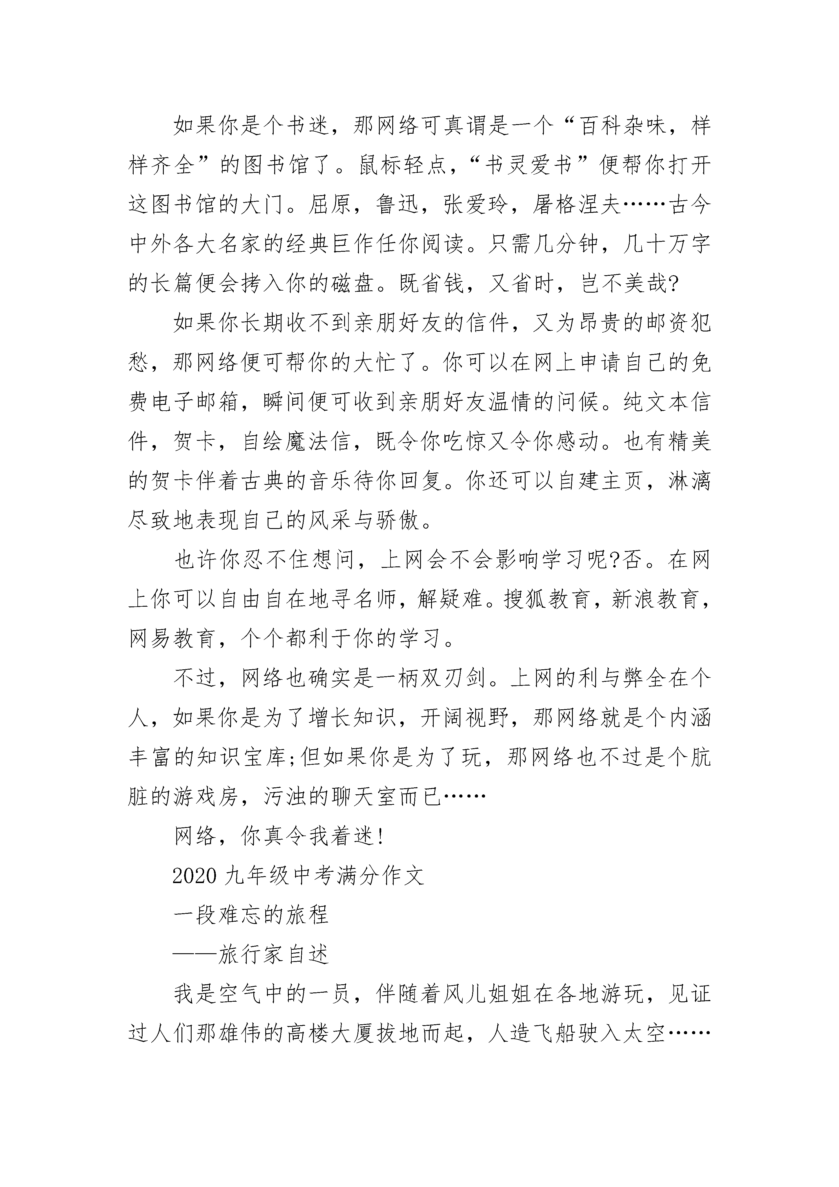 2020九年级中考满分作文这实在让我着迷网络,你真令我着迷!当周围的朋友还在为jay的音乐陶醉时,我早已一网情深地做起了电脑迷。在当今社会中,网络已成了我们亲密的伙伴,在我们的学习和生活中占据了重要位置。它凭着实用、流行、丰富、前卫等诸多特点理所当然地成了我的兴趣之首,让我如痴如醉地迷恋着它。它究竟有何魅力使我如此着迷呢?首先应是它的包罗万象。打开主页,输入你想要访问的网址,只需几十秒便可满足你的需求。想要的资料便纷纷地呈现在你的面前,任你挑选。网络的博大精深让我们不得不加快脚步来看它的第二个特点--及时性。“足不出户,尽知天下事”,其快捷的速度让你在第一时间便可得到最准确的消息,最重大的新闻早已在等待着我们,百家讲坛、新闻联播、探索发现……样样都让你倍感满足。前些日子两会通过《义务教育法》,政府统筹建设社会主义新农村……条条信息都会吸引你好奇的眼球,够酷吧。如果你只能望网生叹而不能身临其境,那网络也只是可有可无的电视节目了。不过,网络的参与性是很强的哦!你可以在上万个聊天室中广交好友,“海内存知己,天涯若比邻”,与全国各地的同胞聊个天昏地暗。如果你是个书迷,那网络可真谓是一个“百科杂味,样样齐全”的图书馆了。鼠标轻点,“书灵爱书”便帮你打开这图书馆的大门。屈原,鲁迅,张爱玲,屠格涅夫……古今中外各大名家的经典巨作任你阅读。只需几分钟,几十万字的长篇便会拷入你的磁盘。既省钱,又省时,岂不美哉?如果你长期收不到亲朋好友的信件,又为昂贵的邮资犯愁,那网络便可帮你的大忙了。你可以在网上申请自己的免费电子邮箱,瞬间便可收到亲朋好友温情的问候。纯文本信件,贺卡,自绘魔法信,既令你吃惊又令你感动。也有精美的贺卡伴着古典的音乐待你回复。你还可以自建主页,淋漓尽致地表现自己的风采与骄傲。也许你忍不住想问,上网会不会影响学习呢?否。在网上你可以自由自在地寻名师,解疑难。搜狐教育,新浪教育,网易教育,个个都利于你的学习。不过,网络也确实是一柄双刃剑。上网的利与弊全在个人,如果你是为了增长知识,开阔视野,那网络就是个内涵丰富的知识宝库;但如果你是为了玩,那网络也不过是个肮脏的游戏房,污浊的聊天室而已……网络,你真令我着迷!2020九年级中考满分作文一段难忘的旅程——旅行家自述我是空气中的一员,伴随着风儿姐姐在各地游玩,见证过人们那雄伟的高楼大厦拔地而起,人造飞船驶入太空……今天,我仍然和风儿姐姐在旅游,看——宽阔的马路上车水马龙,天空的飞机声不绝于耳。我再次陶醉于其中,心中好生敬佩,人类真的很伟大,把地球装扮的如此的美丽与发达。“看,人来人往的马路上,繁乱中带有秩序,看来人们还不错吗。”我依旧在一如既往的赞叹着人类的生活,然而,风儿姐姐这次并不赞同我的话,他她摇了摇头,轻轻的叹了口气,把我送到了离地面更近的地方。顿时,一股难闻的尾气扑面而来,呛地我直流眼泪,最厉害的是他们似乎要把我也同化了,要不是风儿姐姐赶紧带我跑到了城市外面,也许我也会成为它们污染行列的一员了。出了城市,空气似乎好了很多,我感觉好多了,也不在流眼泪了。风耳姐姐笑了笑说:“怎么样,这下你就不那么认为了吧?”“可能是这个城市的污染太严重了吧,别的地方就不会这样了”我仍然不愿放弃自己对人类多年来良好的评价,反驳的说。不是这样的,别的城市或许比着更严重。”一个沉重的声音在我们背后响起。原来是河水爷爷。我和风儿姐姐一起走过去,“咦,爷爷,您什么时候喜欢穿黑色的衣服了?您的那些孩子们呢,怎么看不见他们了啊?”我奇怪的问。“唉,一言难尽啊!”河水爷爷叹了口气说道“本来我是青色的,这你知道,谁知这几年人类发展这么快,科技发达了,可是他们把垃圾、污水什么的都丢到我这来了。让我帮他们收拾这些没用的废物,结果,我成了这个样子了。可怜了我的那些孩子们啊,他们都受不了那些污染,又不愿离开我,全部被毒死了……”河水爷爷越说越说伤心,有些说不下去了。懂事的风儿姐姐去哄河水爷爷,而我楞在了那里。“不可能的,我心中的人类不是那样的……”我高声大吼着。风儿姐姐似乎为我的固执而气愤,她气愤地指着不远处说:“你看看天空是什么。”我顺着她指的方向看去,顿时,我呆住了,天空,不再是蓝色了……2020九年级中考满分作文值得大写的感悟又是秋天,落叶纷飞,每一片叶子都带着一种隔世的静美。苍白的画纸平铺在书桌上,我手执一支狼毫小笔,欲画一幅关于秋日落叶的绘画。阳光从窗外流泻进来,于窗棂跳跃成一曲曼妙的舞,任流动的音符点亮略显阴沉的房间。我在看,看阳光一寸寸地涨,涨到洁白的宣纸上。偶然,一滴墨水从笔上滴下,在光洁的画纸上留下痛苦的印迹,开成一朵承担生命重量的水墨莲花,那时,我分明听见宣纸上浅浅的叹息,温婉柔和如昔。我没有下笔。将毛笔随手在砚台上,我转身,面向窗户,去细看那一树黄叶。“作画态度须严,必格物而后作画”,祖父的教导猛然