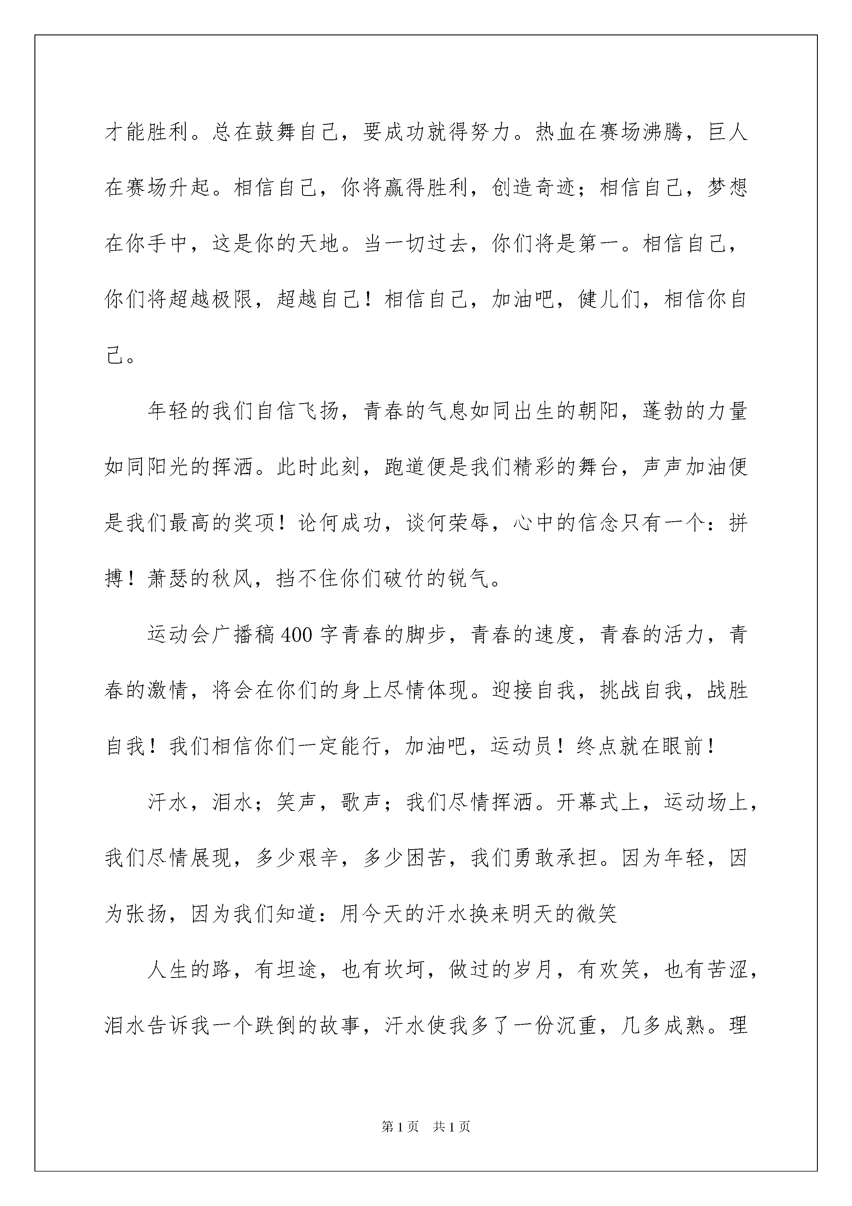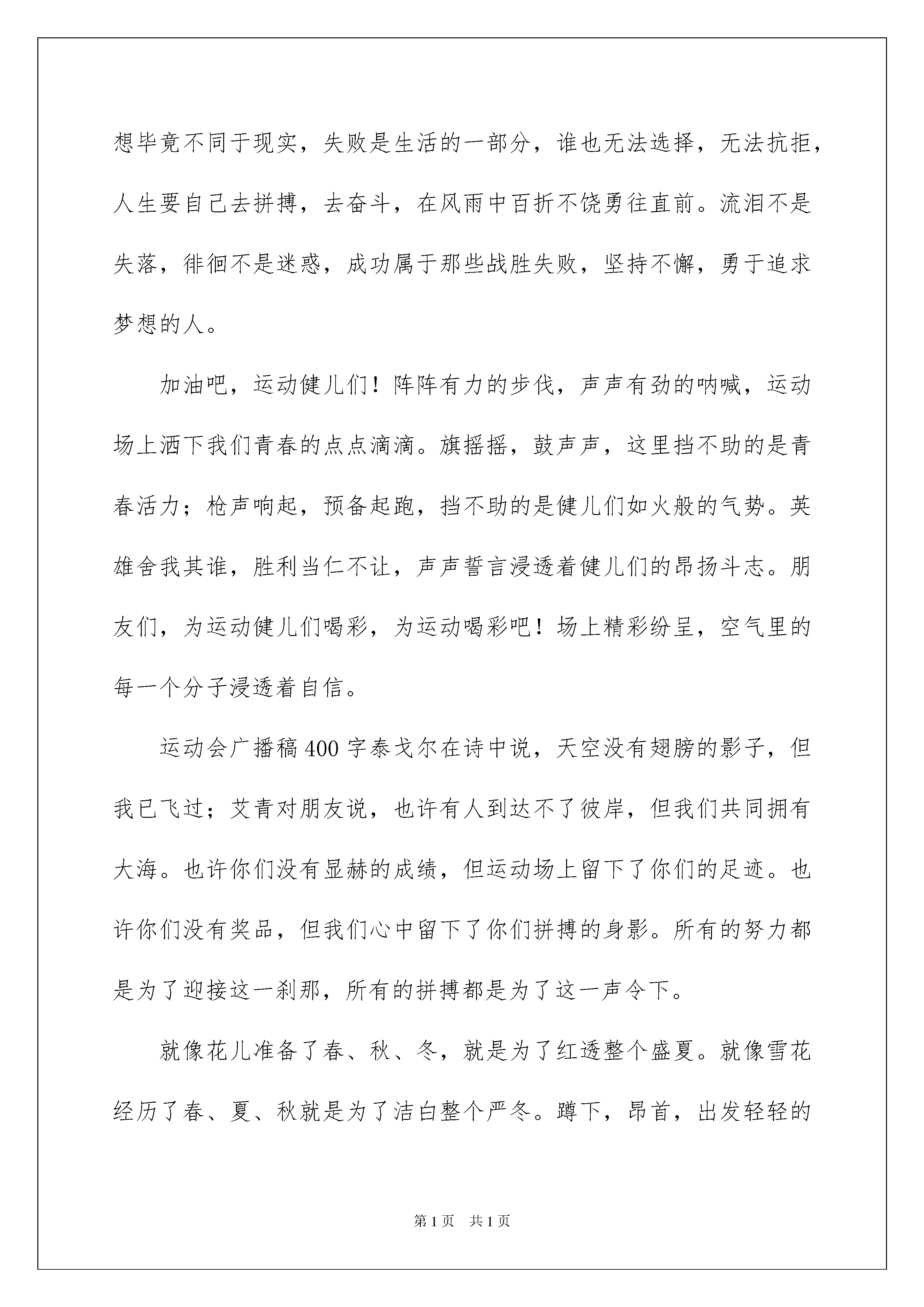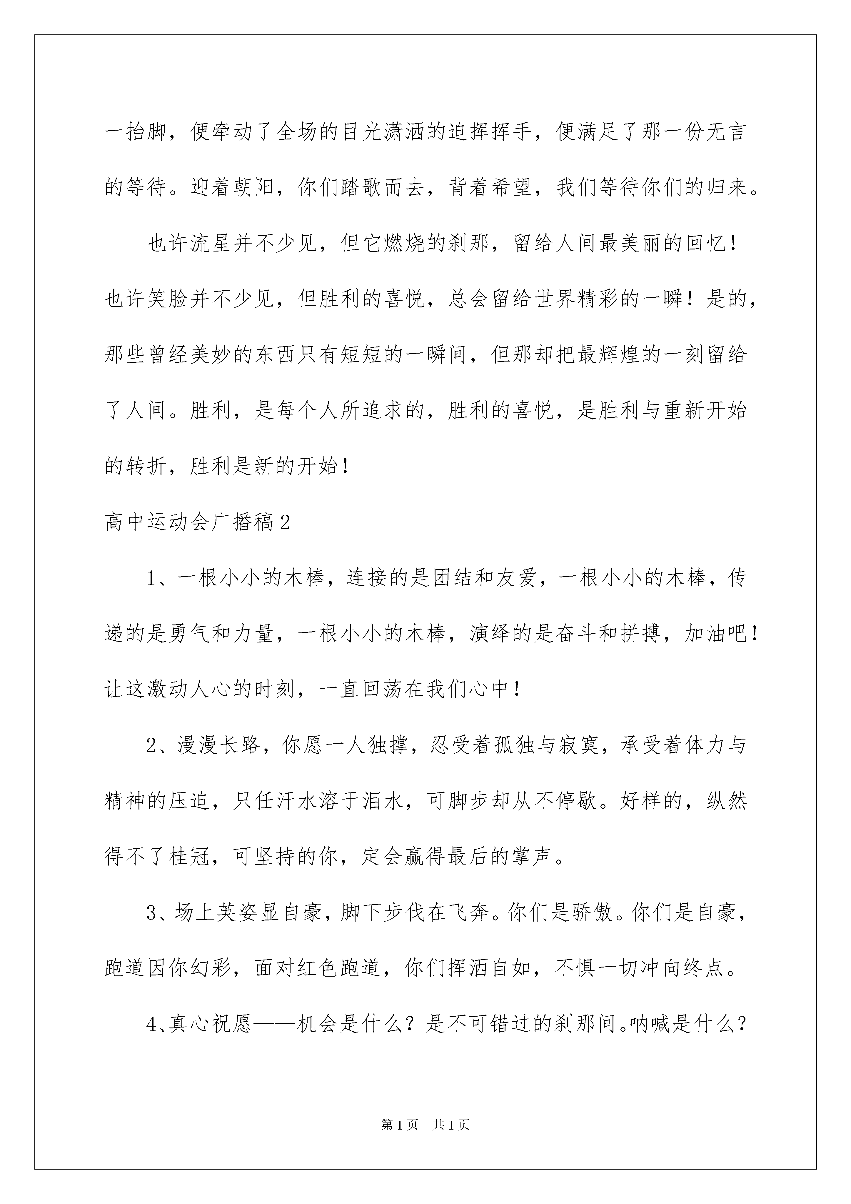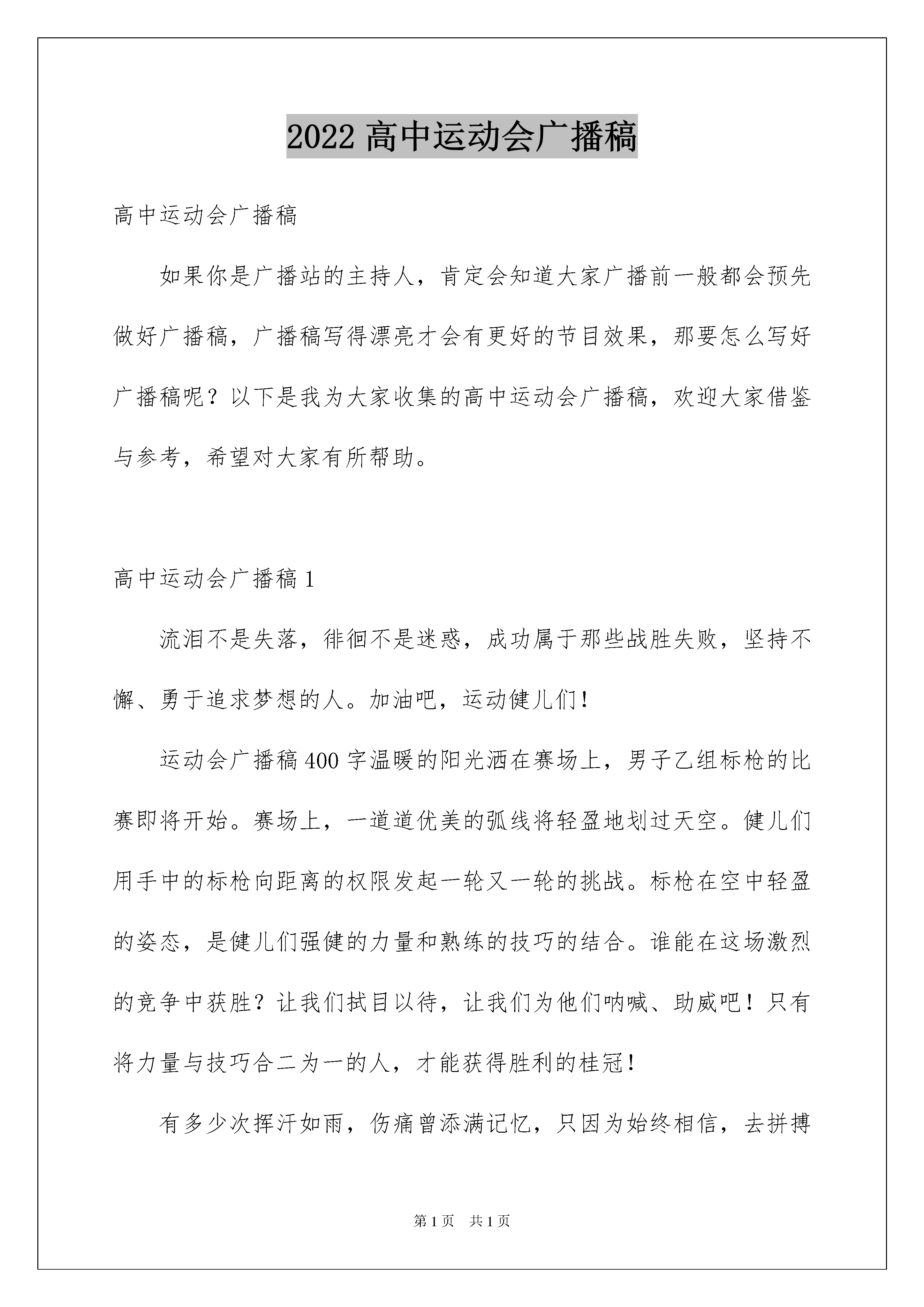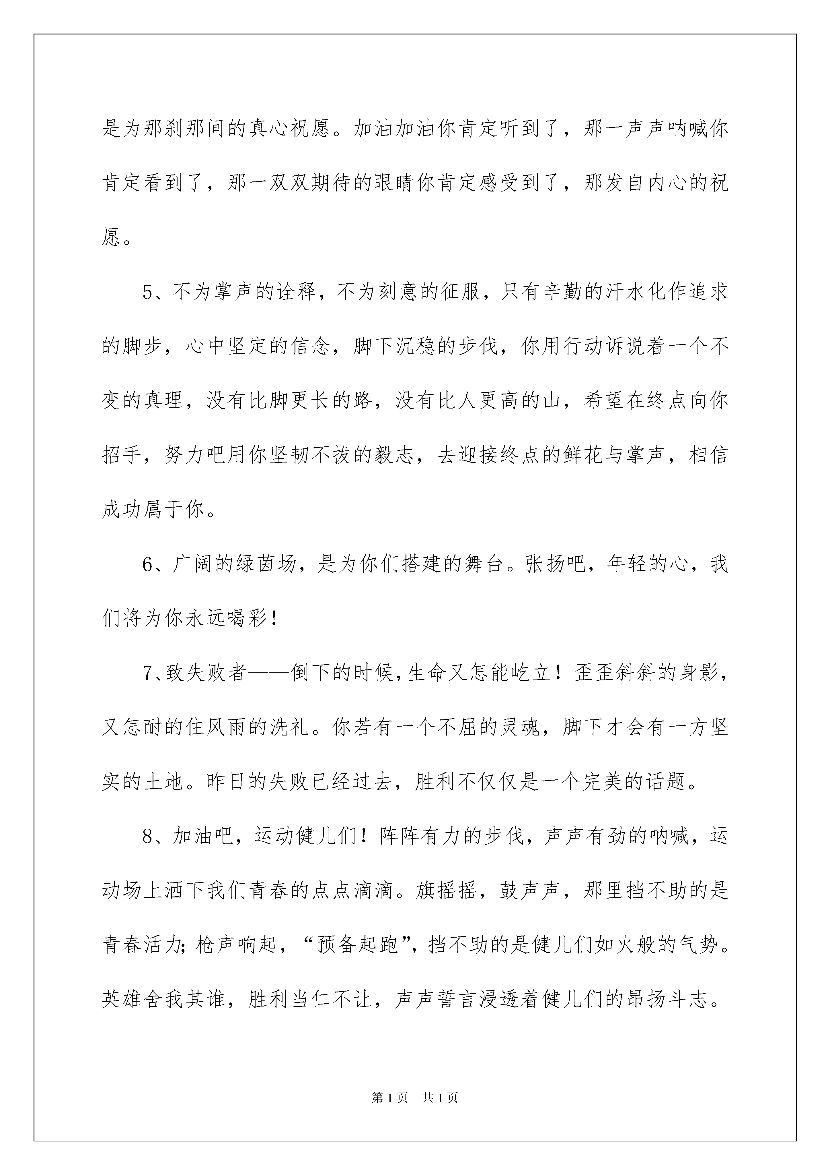 2022高中运动会广播稿高中运动会广播稿如果你是广播站的主持人,肯定会知道大家广播前一般都会预先做好广播稿,广播稿写得漂亮才会有更好的节目效果,那要怎么写好广播稿呢?以下是我为大家收集的高中运动会广播稿,欢迎大家借鉴与参考,希望对大家有所帮助。高中运动会广播稿1流泪不是失落,徘徊不是迷惑,成功属于那些战胜失败,坚持不懈、勇于追求梦想的人。加油吧,运动健儿们!运动会广播稿400字温暖的阳光洒在赛场上,男子乙组标枪的比赛即将开始。赛场上,一道道优美的弧线将轻盈地划过天空。健儿们用手中的标枪向距离的权限发起一轮又一轮的挑战。标枪在空中轻盈的姿态,是健儿们强健的力量和熟练的技巧的结合。谁能在这场激烈的竞争中获胜?让我们拭目以待,让我们为他们呐喊、助威吧!只有将力量与技巧合二为一的人,才能获得胜利的桂冠!有多少次挥汗如雨,伤痛曾添满记忆,只因为始终相信,去拼搏才能胜利。总在鼓舞自己,要成功就得努力。热血在赛场沸腾,巨人在赛场升起。相信自己,你将赢得胜利,创造奇迹;相信自己,梦想在你手中,这是你的天地。当一切过去,你们将是第一。相信自己,你们将超越极限,超越自己!相信自己,加油吧,健儿们,相信你自己。年轻的我们自信飞扬,青春的气息如同出生的朝阳,蓬勃的力量如同阳光的挥洒。此时此刻,跑道便是我们精彩的舞台,声声加油便是我们最高的奖项!论何成功,谈何荣辱,心中的信念只有一个:拼搏!萧瑟的秋风,挡不住你们破竹的锐气。运动会广播稿400字青春的脚步,青春的速度,青春的活力,青春的激情,将会在你们的身上尽情体现。迎接自我,挑战自我,战胜自我!我们相信你们一定能行,加油吧,运动员!终点就在眼前!汗水,泪水;笑声,歌声;我们尽情挥洒。开幕式上,运动场上,我们尽情展现,多少艰辛,多少困苦,我们勇敢承担。因为年轻,因为张扬,因为我们知道:用今天的汗水换来明天的微笑人生的路,有坦途,也有坎坷,做过的岁月,有欢笑,也有苦涩,泪水告诉我一个跌倒的故事,汗水使我多了一份沉重,几多成熟。理想毕竟不同于现实,失败是生活的一部分,谁也无法选择,无法抗拒,人生要自己去拼搏,去奋斗,在风雨中百折不饶勇往直前。流泪不是失落,徘徊不是迷惑,成功属于那些战胜失败,坚持不懈,勇于追求梦想的人。加油吧,运动健儿们!阵阵有力的步伐,声声有劲的呐喊,运动场上洒下我们青春的点点滴滴。旗摇摇,鼓声声,这里挡不助的是青春活力;枪声响起,预备起跑,挡不助的是健儿们如火般的气势。英雄舍我其谁,胜利当仁不让,声声誓言浸透着健儿们的昂扬斗志。朋友们,为运动健儿们喝彩,为运动喝彩吧!场上精彩纷呈,空气里的每一个分子浸透着自信。运动会广播稿400字泰戈尔在诗中说,天空没有翅膀的影子,但我已飞过;艾青对朋友说,也许有人到达不了彼岸,但我们共同拥有大海。也许你们没有显赫的成绩,但运动场上留下了你们的足迹。也许你们没有奖品,但我们心中留下了你们拼搏的身影。所有的努力都是为了迎接这一刹那,所有的拼搏都是为了这一声令下。就像花儿准备了春、秋、冬,就是为了红透整个盛夏。就像雪花经历了春、夏、秋就是为了洁白整个严冬。蹲下,昂首,出发轻轻的一抬脚,便牵动了全场的目光潇洒的迫挥挥手,便满足了那一份无言的等待。迎着朝阳,你们踏歌而去,背着希望,我们等待你们的归来。也许流星并不少见,但它燃烧的刹那,留给人间最美丽的回忆!也许笑脸并不少见,但胜利的喜悦,总会留给世界精彩的一瞬!是的,那些曾经美妙的东西只有短短的一瞬间,但那却把最辉煌的一刻留给了人间。胜利,是每个人所追求的,胜利的喜悦,是胜利与重新开始的转折,胜利是新的开始!高中运动会广播稿21、一根小小的木棒,连接的是团结和友爱,一根小小的木棒,传递的是勇气和力量,一根小小的木棒,演绎的是奋斗和拼搏,加油吧!让这激动人心的时刻,一直回荡在我们心中!2、漫漫长路,你愿一人独撑,忍受着孤独与寂寞,承受着体力与精神的压迫,只任汗水溶于泪水,可脚步却从不停歇。好样的,纵然得不了桂冠,可坚持的你,定会赢得最后的掌声。3、场上英姿显自豪,脚下步伐在飞奔。你们是骄傲。你们是自豪,跑道因你幻彩,面对红色跑道,你们挥洒自如,不惧一切冲向终点。4、真心祝愿——机会是什么?是不可错过的刹那间。呐喊是什么?是为那刹那间的真心祝愿。加油加油你肯定听到了,那一声声呐喊你肯定看到了,那一双双期待的眼睛你肯定感受到了,那发自内心的祝愿。5、不为掌声的诠释,不为刻意的征服,只有辛勤的汗水化作追求的脚步,心中坚定的信念,脚下沉稳的步伐,你用行动诉说着一个不变的真理,没有比脚更长的路,没有比人更高的山,希望在终点向你招手,努力吧用你坚韧不拔的毅志,去迎接终点的