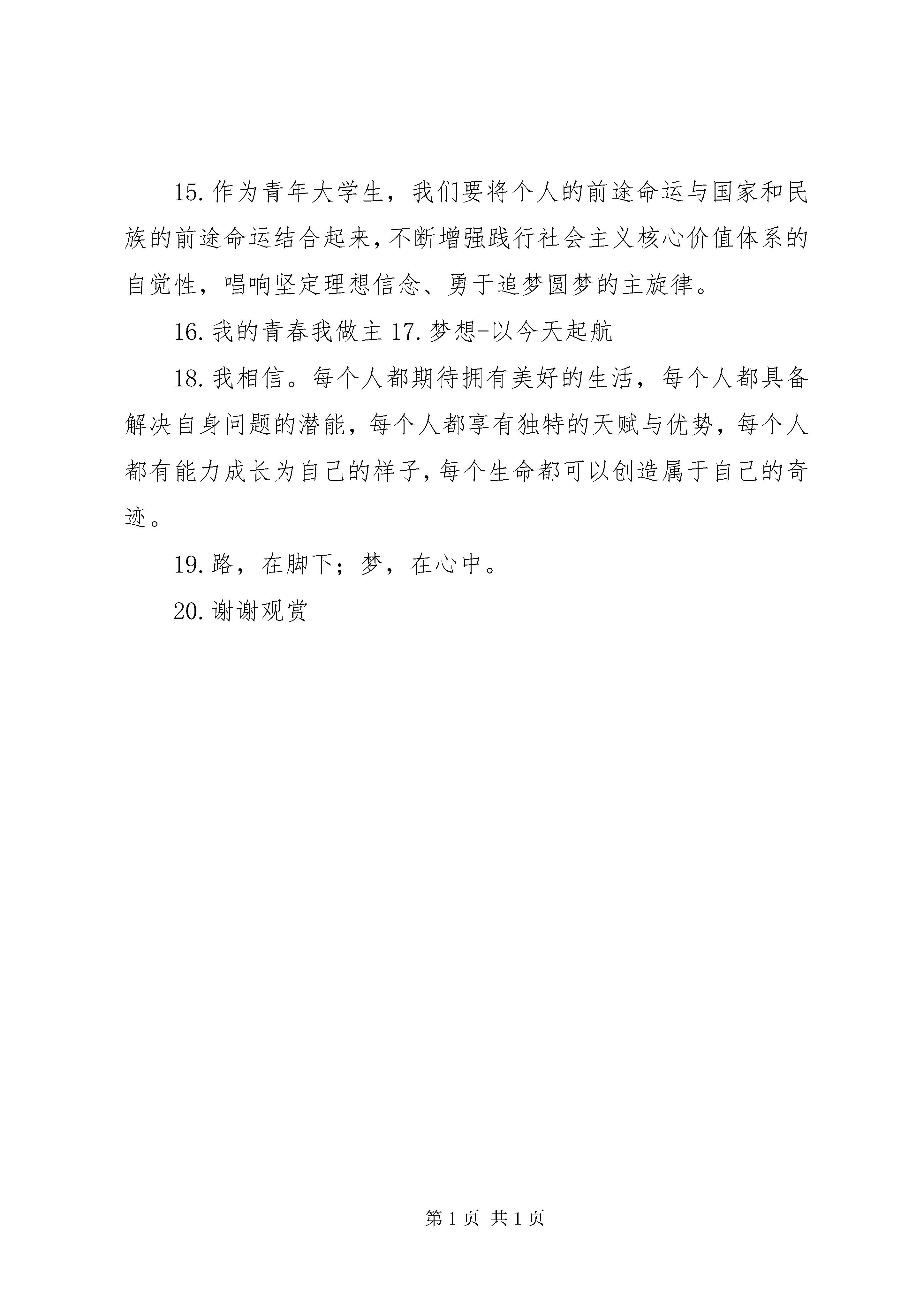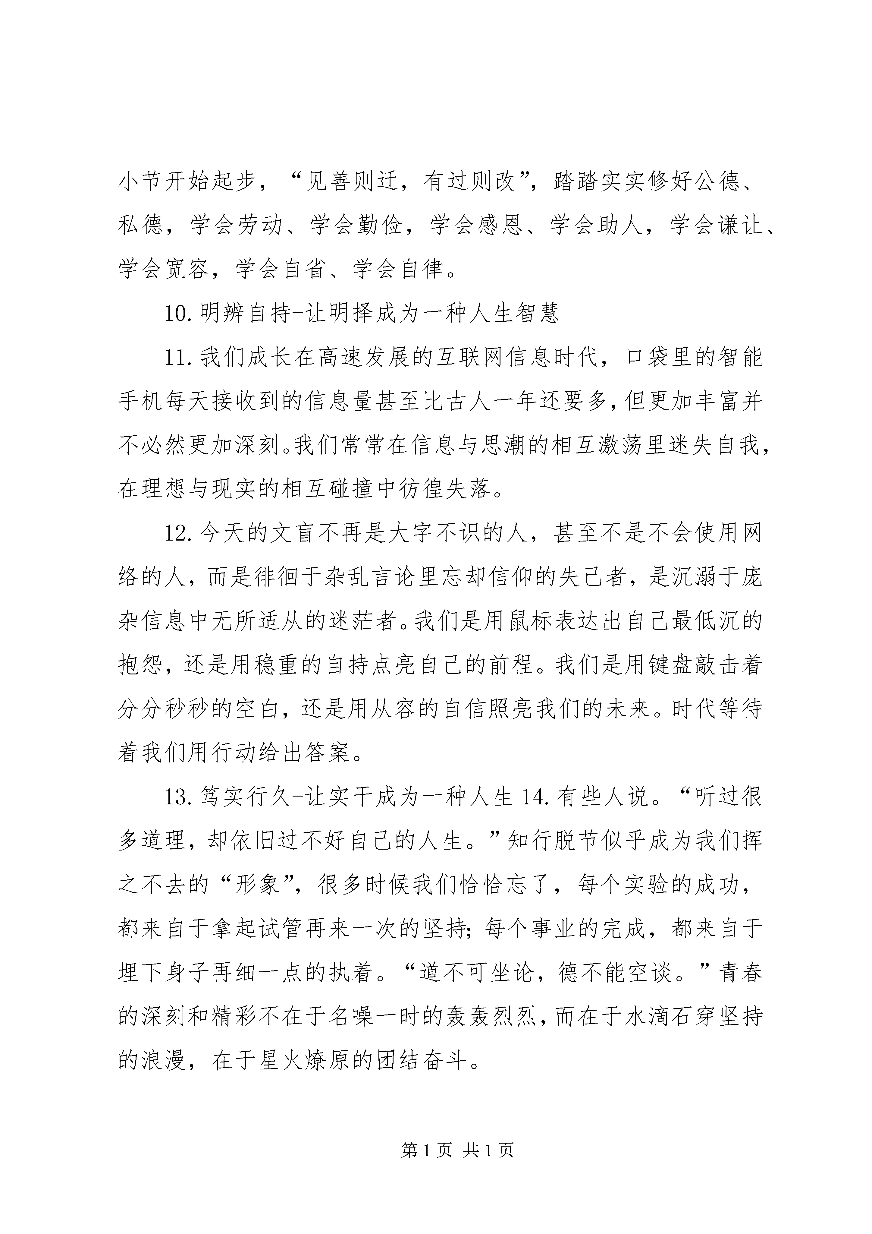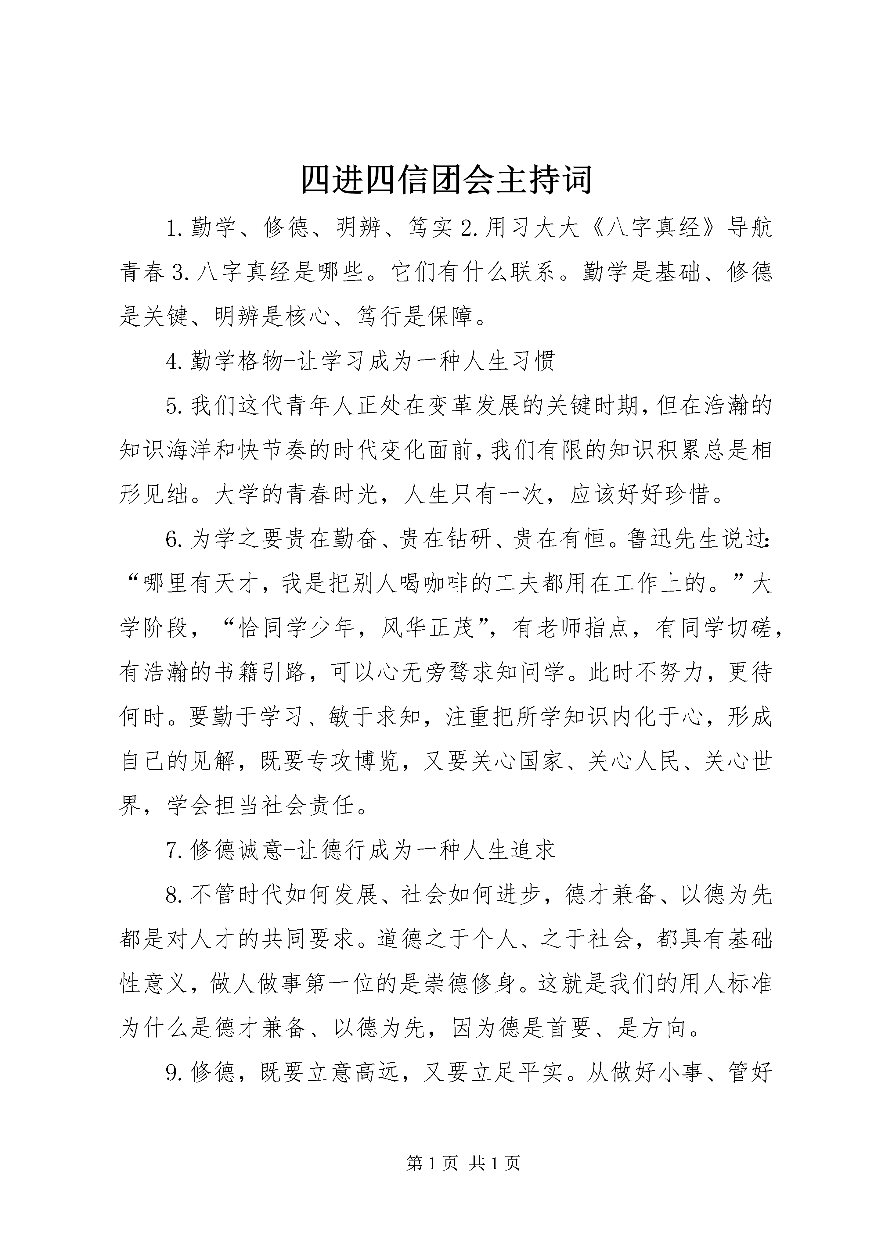 四进四信团会主持词1.勤学、修德、明辨、笃实2.用习大大《八字真经》导航青春3.八字真经是哪些。它们有什么联系。勤学是基础、修德是关键、明辨是核心、笃行是保障。4.勤学格物-让学习成为一种人生习惯5.我们这代青年人正处在变革发展的关键时期,但在浩瀚的知识海洋和快节奏的时代变化面前,我们有限的知识积累总是相形见绌。大学的青春时光,人生只有一次,应该好好珍惜。6.为学之要贵在勤奋、贵在钻研、贵在有恒。鲁迅先生说过:“哪里有天才,我是把别人喝咖啡的工夫都用在工作上的。”大学阶段,“恰同学少年,风华正茂”,有老师指点,有同学切磋,有浩瀚的书籍引路,可以心无旁骛求知问学。此时不努力,更待何时。要勤于学习、敏于求知,注重把所学知识内化于心,形成自己的见解,既要专攻博览,又要关心国家、关心人民、关心世界,学会担当社会责任。7.修德诚意-让德行成为一种人生追求8.不管时代如何发展、社会如何进步,德才兼备、以德为先都是对人才的共同要求。道德之于个人、之于社会,都具有基础性意义,做人做事第一位的是崇德修身。这就是我们的用人标准为什么是德才兼备、以德为先,因为德是首要、是方向。9.修德,既要立意高远,又要立足平实。从做好小事、管好小节开始起步,“见善则迁,有过则改”,踏踏实实修好公德、私德,学会劳动、学会勤俭,学会感恩、学会助人,学会谦让、学会宽容,学会自省、学会自律。10.明辨自持-让明择成为一种人生智慧11.我们成长在高速发展的互联网信息时代,口袋里的智能手机每天接收到的信息量甚至比古人一年还要多,但更加丰富并不必然更加深刻。我们常常在信息与思潮的相互激荡里迷失自我,在理想与现实的相互碰撞中彷徨失落。12.今天的文盲不再是大字不识的人,甚至不是不会使用网络的人,而是徘徊于杂乱言论里忘却信仰的失己者,是沉溺于庞杂信息中无所适从的迷茫者。我们是用鼠标表达出自己最低沉的抱怨,还是用稳重的自持点亮自己的前程。我们是用键盘敲击着分分秒秒的空白,还是用从容的自信照亮我们的未来。时代等待着我们用行动给出答案。13.笃实行久-让实干成为一种人生14.有些人说。“听过很多道理,却依旧过不好自己的人生。”知行脱节似乎成为我们挥之不去的“形象”,很多时候我们恰恰忘了,每个实验的成功,都来自于拿起试管再来一次的坚持;每个事业的完成,都来自于埋下身子再细一点的执着。“道不可坐论,德不能空谈。”青春的深刻和精彩不在于名噪一时的轰轰烈烈,而在于水滴石穿坚持的浪漫,在于星火燎原的团结奋斗。15.作为青年大学生,我们要将个人的前途命运与国家和民族的前途命运结合起来,不断增强践行社会主义核心价值体系的自觉性,唱响坚定理想信念、勇于追梦圆梦的主旋律。16.我的青春我做主17.梦想-以今天起航18.我相信。每个人都期待拥有美好的生活,每个人都具备解决自身问题的潜能,每个人都享有独特的天赋与优势,每个人都有能力成长为自己的样子,每个生命都可以创造属于自己的奇迹。19.路,在脚下;梦,在心中。20.谢谢观赏