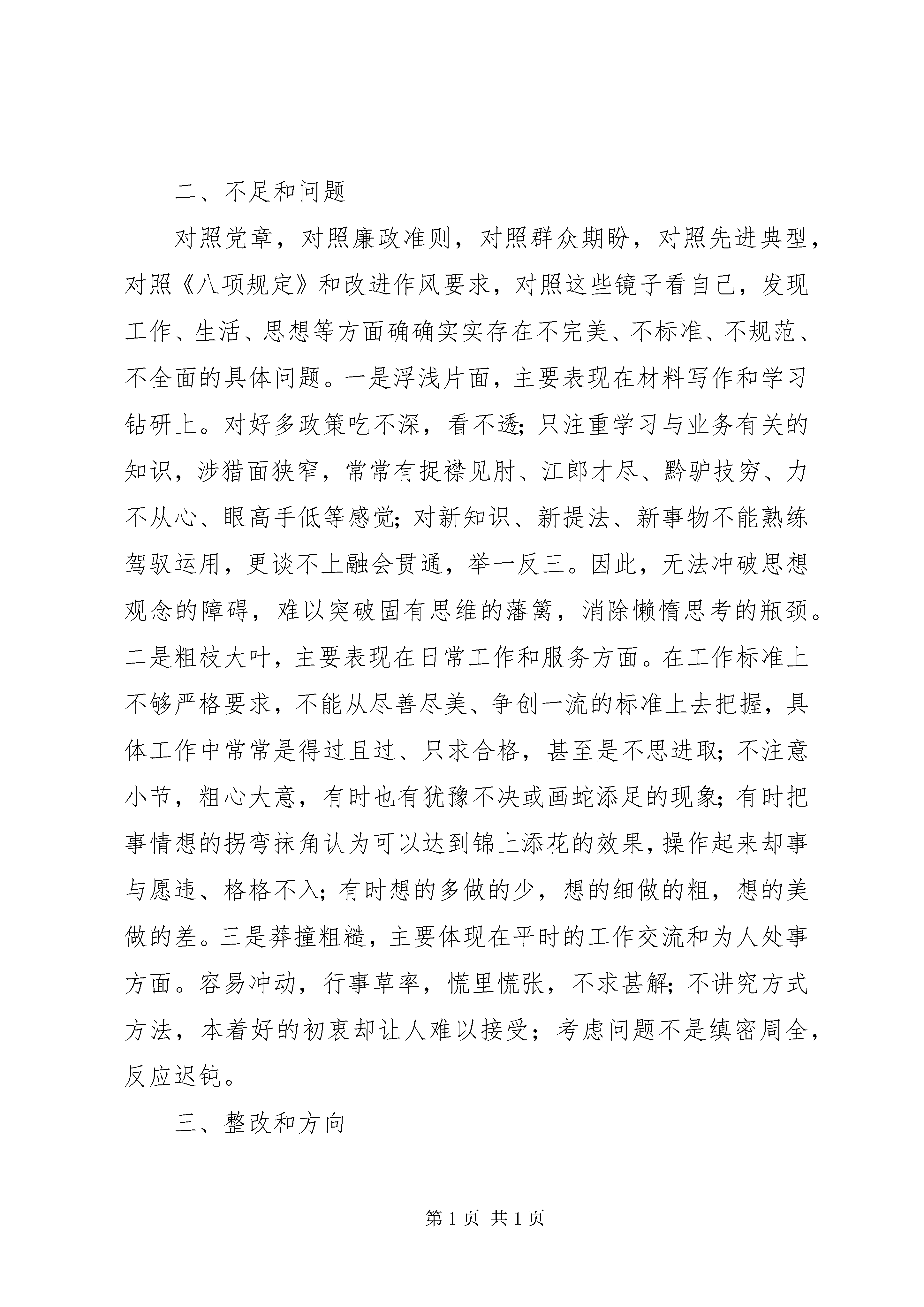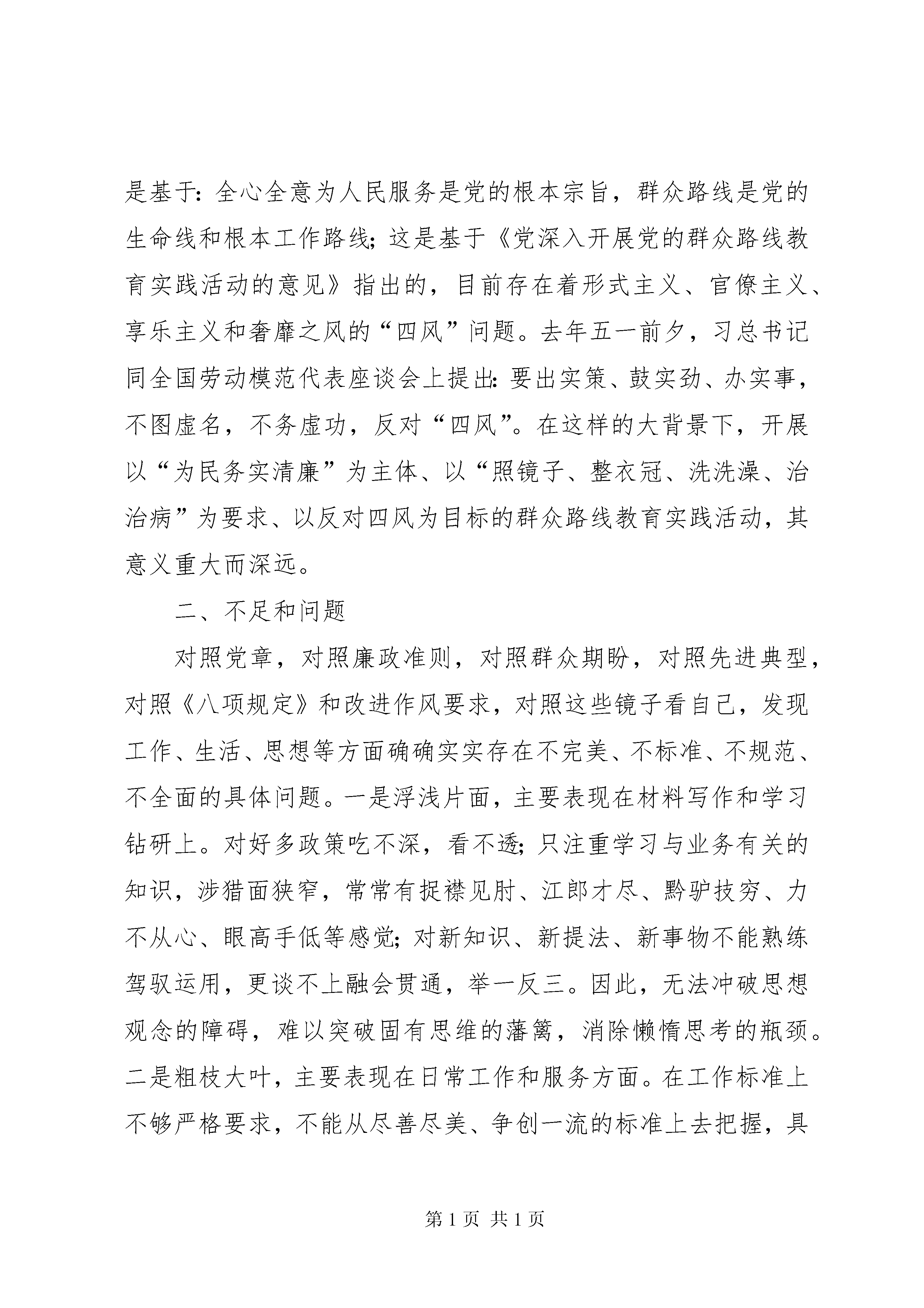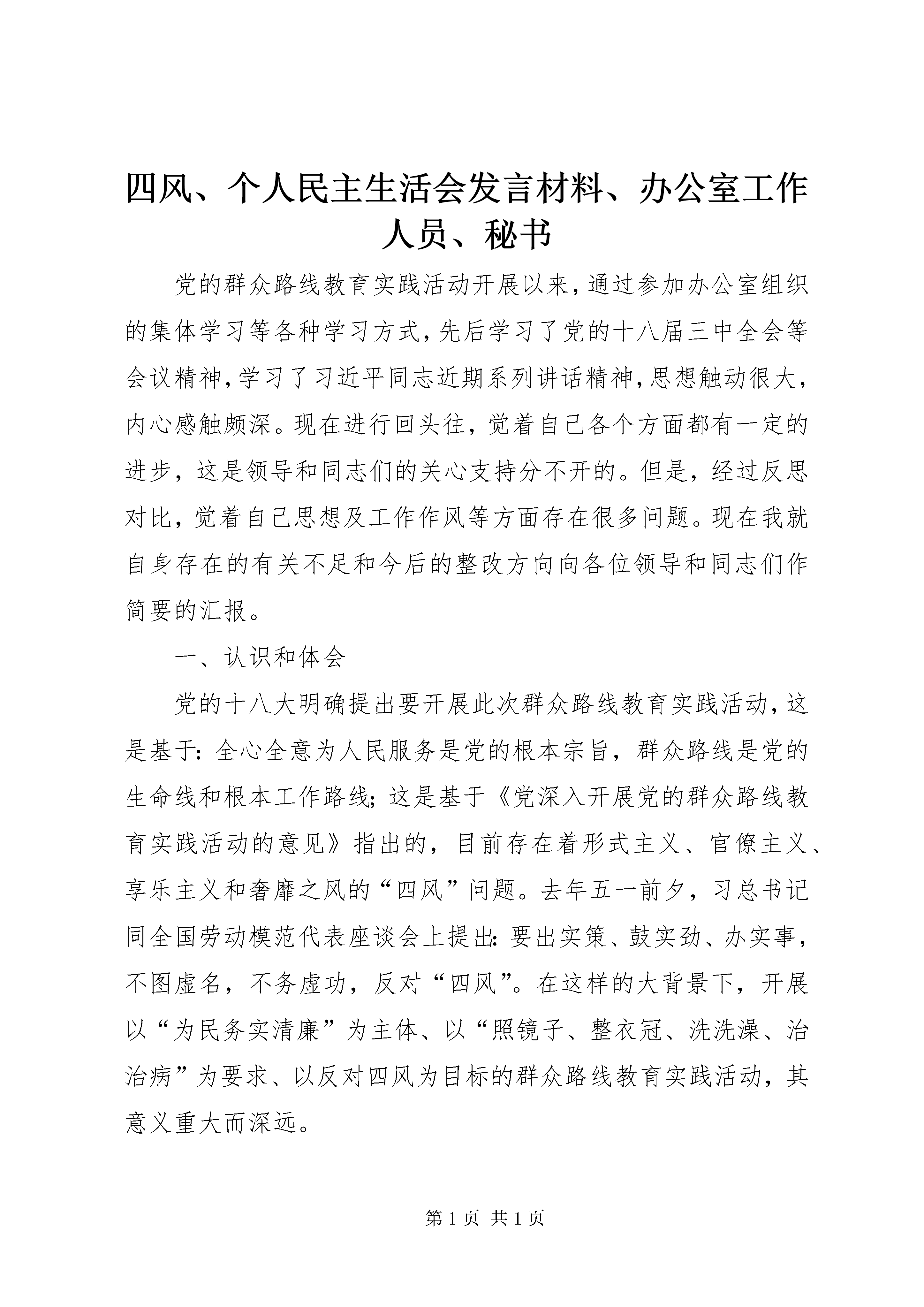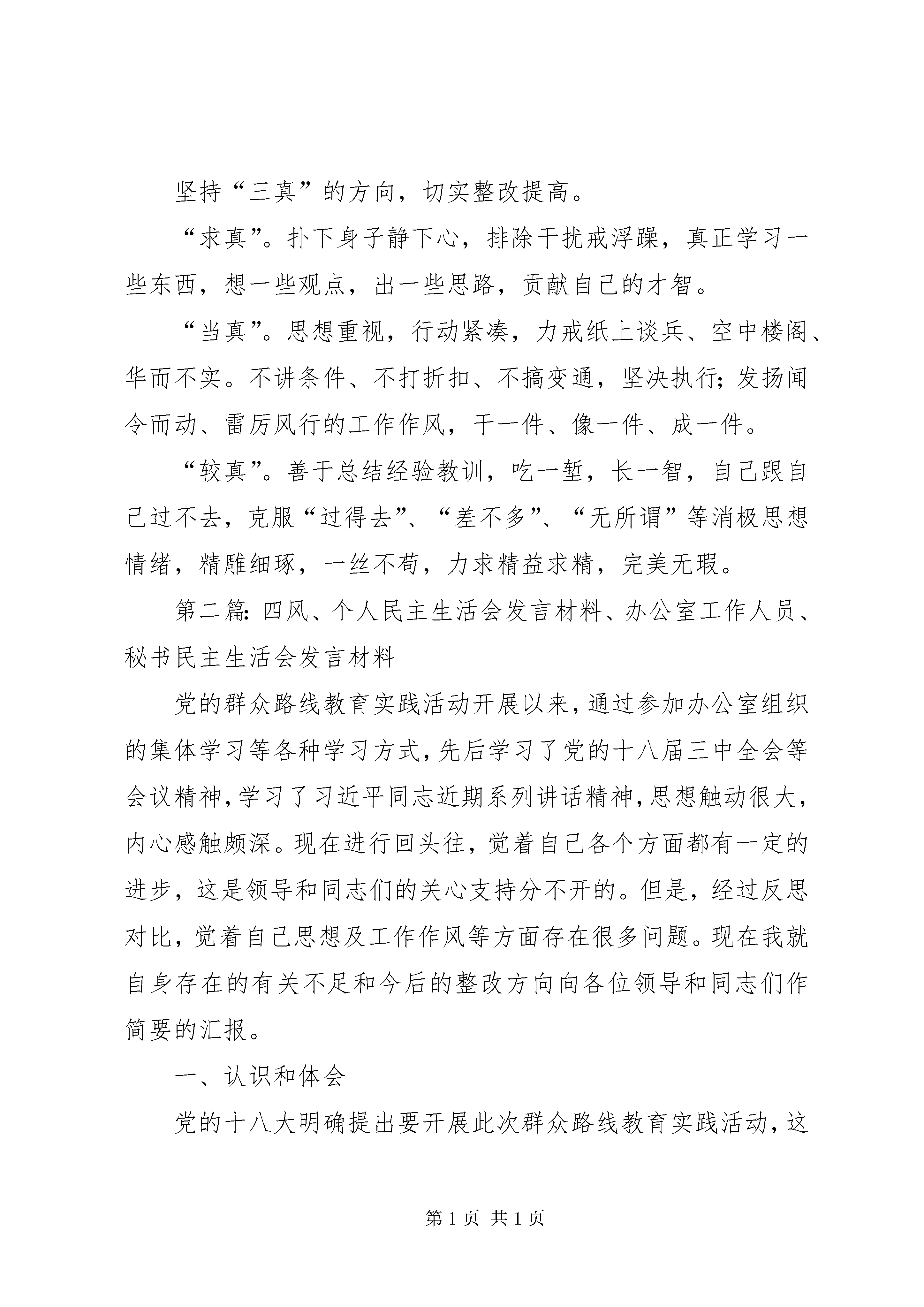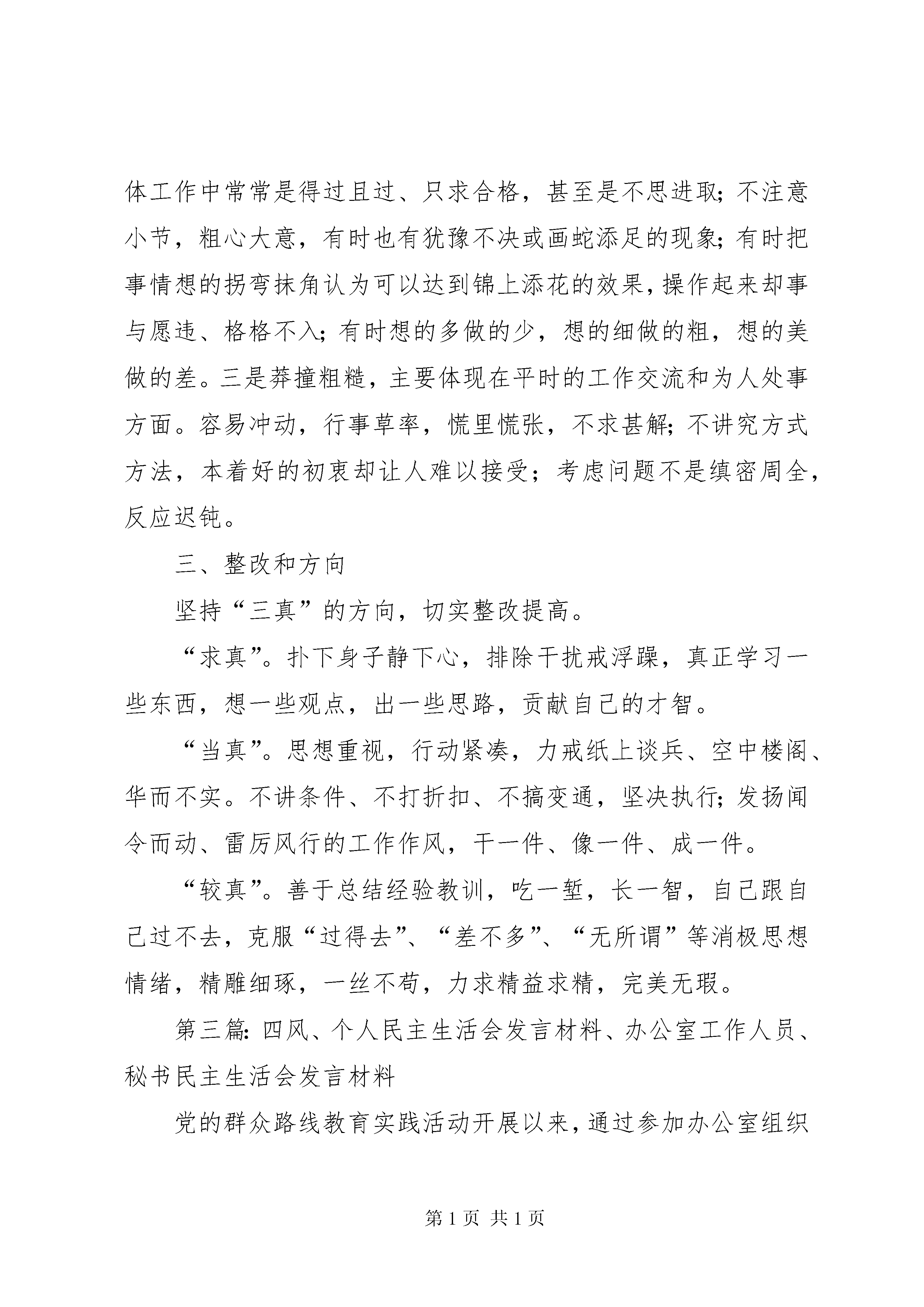 四风、个人民主生活会发言材料、办公室工作人员、秘书党的群众路线教育实践活动开展以来,通过参加办公室组织的集体学习等各种学习方式,先后学习了党的十八届三中全会等会议精神,学习了习近平同志近期系列讲话精神,思想触动很大,内心感触颇深。现在进行回头往,觉着自己各个方面都有一定的进步,这是领导和同志们的关心支持分不开的。但是,经过反思对比,觉着自己思想及工作作风等方面存在很多问题。现在我就自身存在的有关不足和今后的整改方向向各位领导和同志们作简要的汇报。一、认识和体会党的十八大明确提出要开展此次群众路线教育实践活动,这是基于:全心全意为人民服务是党的根本宗旨,群众路线是党的生命线和根本工作路线;这是基于《党深入开展党的群众路线教育实践活动的意见》指出的,目前存在着形式主义、官僚主义、享乐主义和奢靡之风的“四风”问题。去年五一前夕,习总书记同全国劳动模范代表座谈会上提出:要出实策、鼓实劲、办实事,不图虚名,不务虚功,反对“四风”。在这样的大背景下,开展以“为民务实清廉”为主体、以“照镜子、整衣冠、洗洗澡、治治病”为要求、以反对四风为目标的群众路线教育实践活动,其意义重大而深远。二、不足和问题对照党章,对照廉政准则,对照群众期盼,对照先进典型,对照《八项规定》和改进作风要求,对照这些镜子看自己,发现工作、生活、思想等方面确确实实存在不完美、不标准、不规范、不全面的具体问题。一是浮浅片面,主要表现在材料写作和学习钻研上。对好多政策吃不深,看不透;只注重学习与业务有关的知识,涉猎面狭窄,常常有捉襟见肘、江郎才尽、黔驴技穷、力不从心、眼高手低等感觉;对新知识、新提法、新事物不能熟练驾驭运用,更谈不上融会贯通,举一反三。因此,无法冲破思想观念的障碍,难以突破固有思维的藩篱,消除懒惰思考的瓶颈。二是粗枝大叶,主要表现在日常工作和服务方面。在工作标准上不够严格要求,不能从尽善尽美、争创一流的标准上去把握,具体工作中常常是得过且过、只求合格,甚至是不思进取;不注意小节,粗心大意,有时也有犹豫不决或画蛇添足的现象;有时把事情想的拐弯抹角认为可以达到锦上添花的效果,操作起来却事与愿违、格格不入;有时想的多做的少,想的细做的粗,想的美做的差。三是莽撞粗糙,主要体现在平时的工作交流和为人处事方面。容易冲动,行事草率,慌里慌张,不求甚解;不讲究方式方法,本着好的初衷却让人难以接受;考虑问题不是缜密周全,反应迟钝。三、整改和方向坚持“三真”的方向,切实整改提高。“求真”。扑下身子静下心,排除干扰戒浮躁,真正学习一些东西,想一些观点,出一些思路,贡献自己的才智。“当真”。思想重视,行动紧凑,力戒纸上谈兵、空中楼阁、华而不实。不讲条件、不打折扣、不搞变通,坚决执行;发扬闻令而动、雷厉风行的工作作风,干一件、像一件、成一件。“较真”。善于总结经验教训,吃一堑,长一智,自己跟自己过不去,克服“过得去”、“差不多”、“无所谓”等消极思想情绪,精雕细琢,一丝不苟,力求精益求精,完美无瑕。第二篇:四风、个人民主生活会发言材料、办公室工作人员、秘书民主生活会发言材料党的群众路线教育实践活动开展以来,通过参加办公室组织的集体学习等各种学习方式,先后学习了党的十八届三中全会等会议精神,学习了习近平同志近期系列讲话精神,思想触动很大,内心感触颇深。现在进行回头往,觉着自己各个方面都有一定的进步,这是领导和同志们的关心支持分不开的。但是,经过反思对比,觉着自己思想及工作作风等方面存在很多问题。现在我就自身存在的有关不足和今后的整改方向向各位领导和同志们作简要的汇报。一、认识和体会党的十八大明确提出要开展此次群众路线教育实践活动,这是基于:全心全意为人民服务是党的根本宗旨,群众路线是党的生命线和根本工作路线;这是基于《党深入开展党的群众路线教育实践活动的意见》指出的,目前存在着形式主义、官僚主义、享乐主义和奢靡之风的“四风”问题。去年五一前夕,习总书记同全国劳动模范代表座谈会上提出:要出实策、鼓实劲、办实事,不图虚名,不务虚功,反对“四风”。在这样的大背景下,开展以“为民务实清廉”为主体、以“照镜子、整衣冠、洗洗澡、治治病”为要求、以反对四风为目标的群众路线教育实践活动,其意义重大而深远。二、不足和问题对照党章,对照廉政准则,对照群众期盼,对照先进典型,对照《八项规定》和改进作风要求,对照这些镜子看自己,发现工作、生活、思想等方面确确实实存在不完美、不标准、不规范、不全面的具体问题。一是浮浅片面,主要表现在材料写作和学习钻研上。对好多政策吃不深,看不透;只注重学习与业务有关的知识,涉猎面狭窄,常常有捉襟见肘、江郎才尽、黔驴技穷、力不从心、眼高手低等感觉;对新知识、新提法、新事物不能熟练驾驭运用,更谈不上融会贯通,举一反三。因此,无法冲破思想观念的障碍,难以突破固有