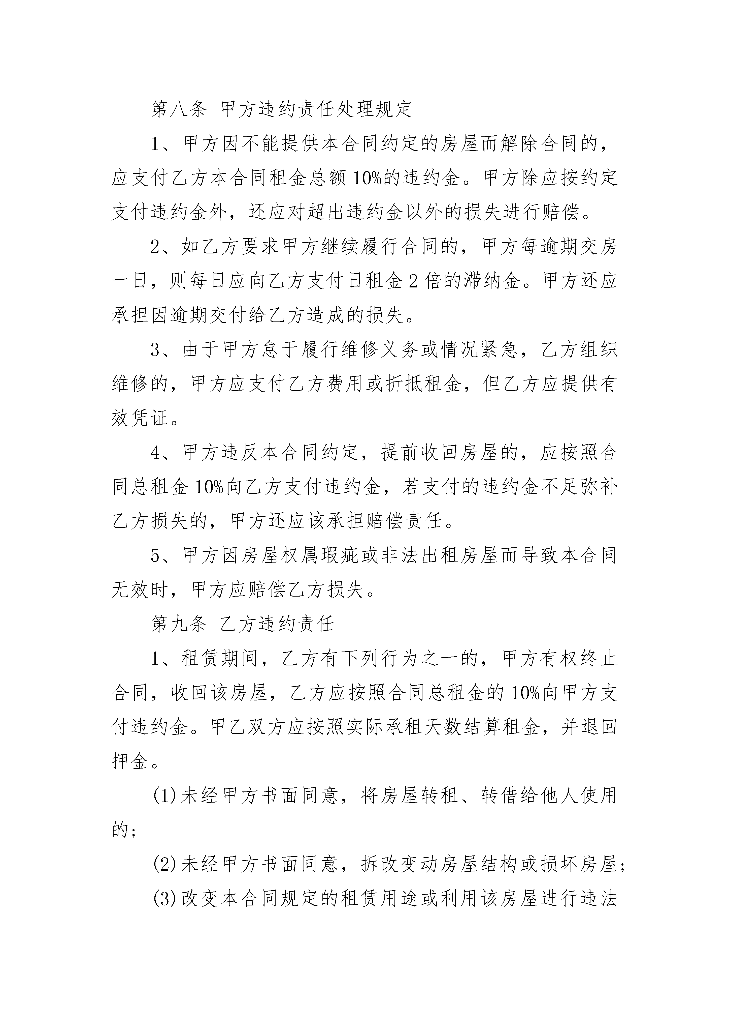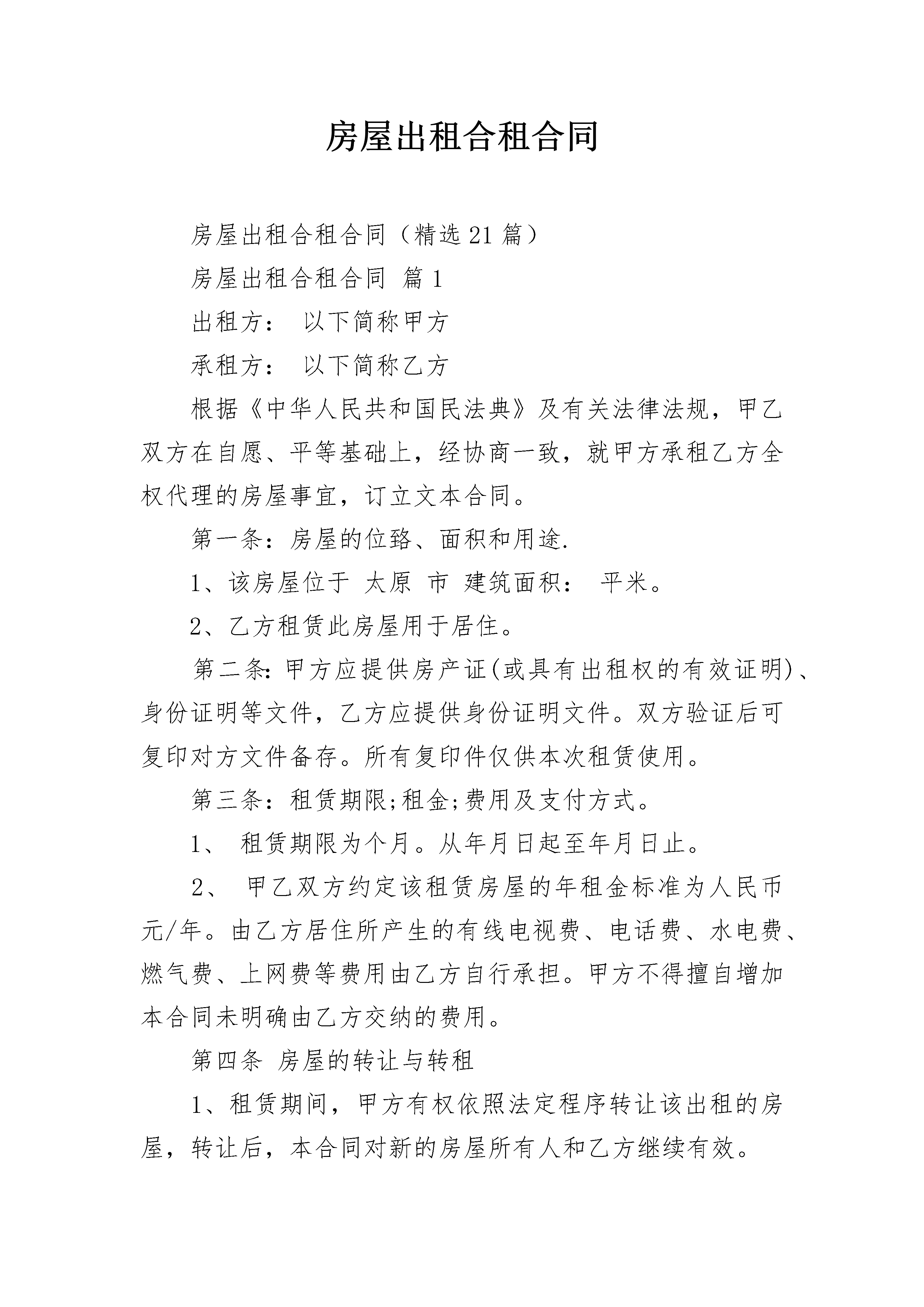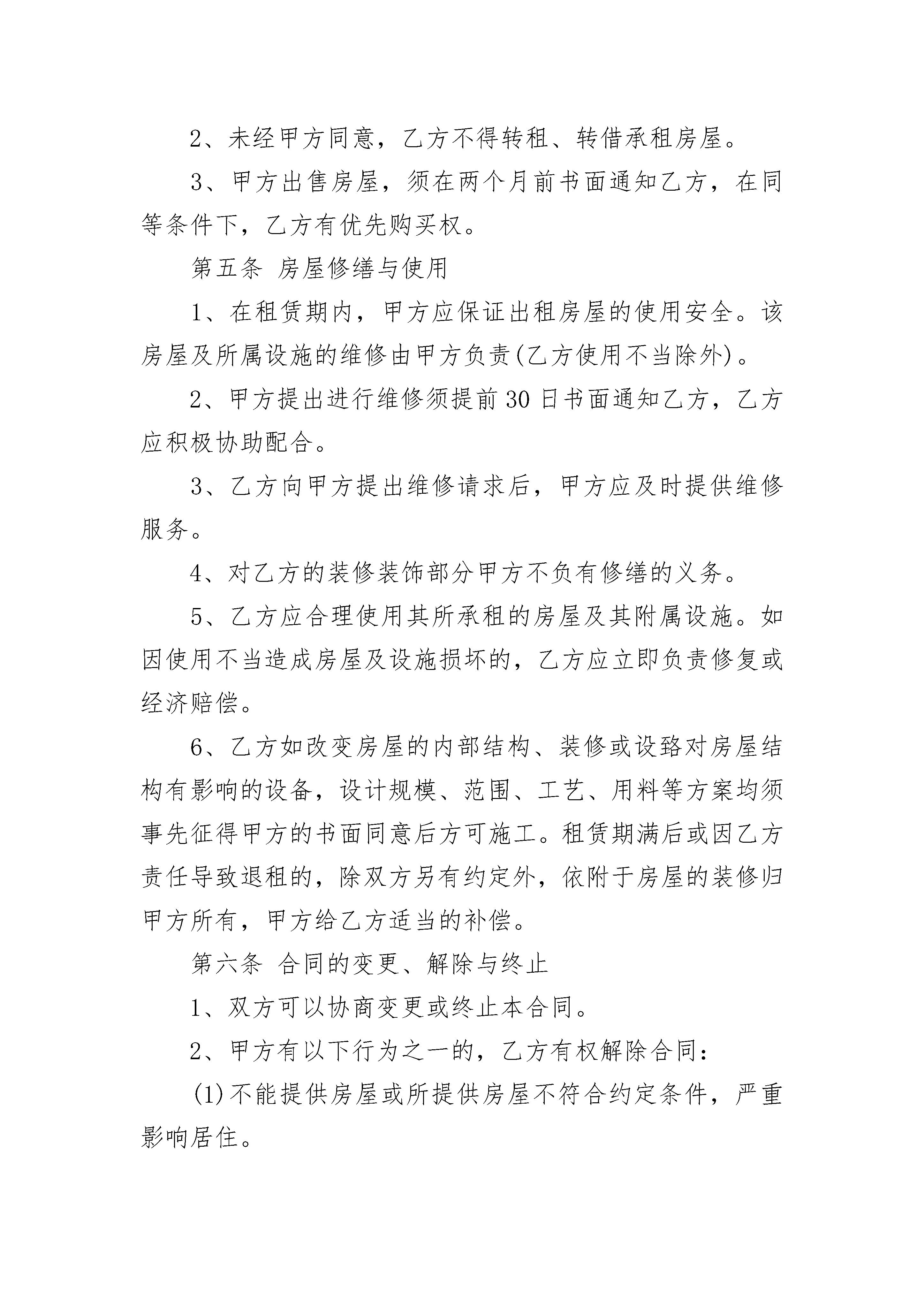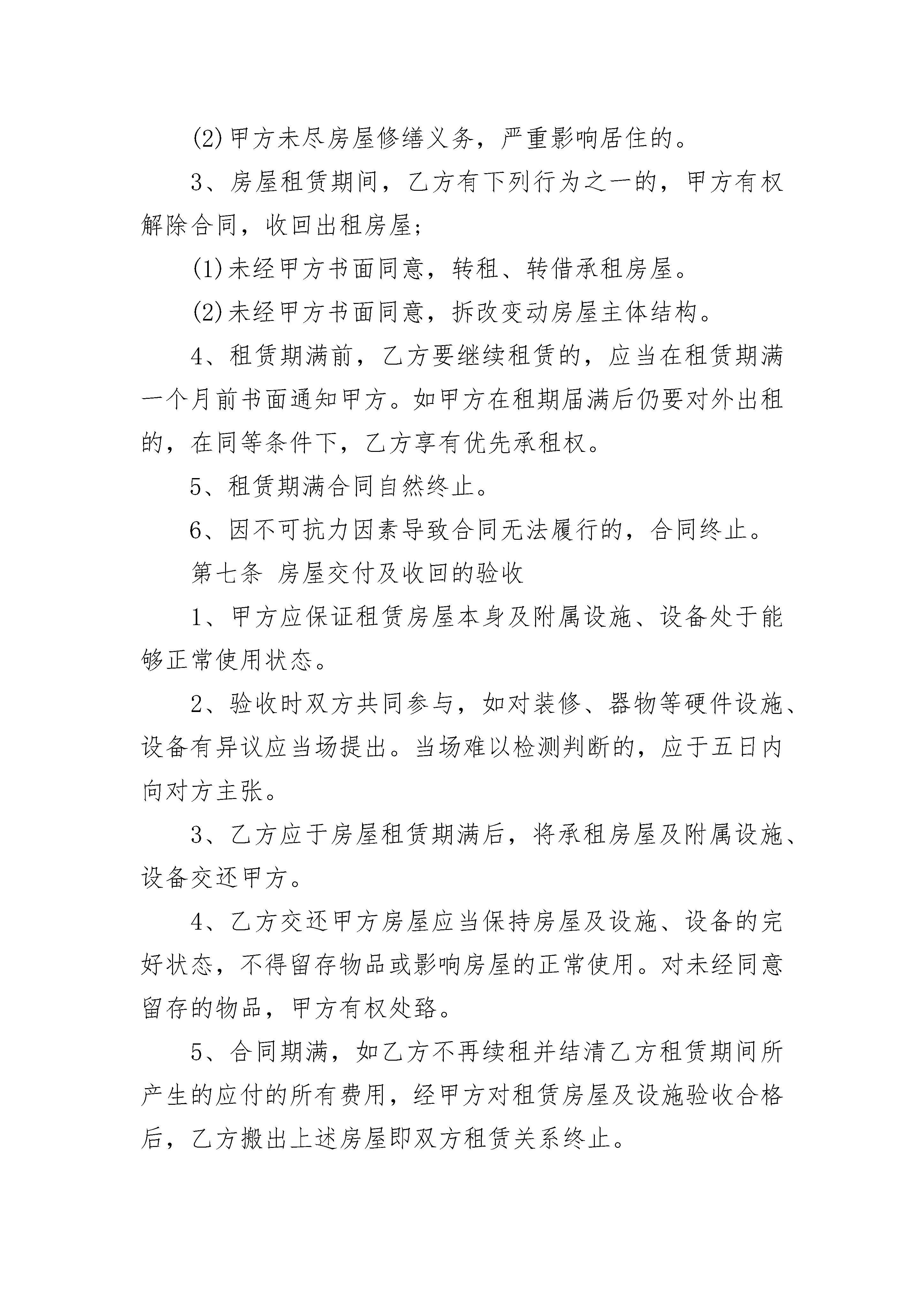 房屋出租合租合同房屋出租合租合同(精选21篇)房屋出租合租合同篇1出租方:以下简称甲方承租方:以下简称乙方根据《中华人民共和国民法典》及有关法律法规,甲乙双方在自愿、平等基础上,经协商一致,就甲方承租乙方全权代理的房屋事宜,订立文本合同。第一条:房屋的位臵、面积和用途.1、该房屋位于太原市建筑面积:平米。2、乙方租赁此房屋用于居住。第二条:甲方应提供房产证(或具有出租权的有效证明)、身份证明等文件,乙方应提供身份证明文件。双方验证后可复印对方文件备存。所有复印件仅供本次租赁使用。第三条:租赁期限;租金;费用及支付方式。1、租赁期限为个月。从年月日起至年月日止。2、甲乙双方约定该租赁房屋的年租金标准为人民币元/年。由乙方居住所产生的有线电视费、电话费、水电费、燃气费、上网费等费用由乙方自行承担。甲方不得擅自增加本合同未明确由乙方交纳的费用。第四条房屋的转让与转租1、租赁期间,甲方有权依照法定程序转让该出租的房屋,转让后,本合同对新的房屋所有人和乙方继续有效。2、未经甲方同意,乙方不得转租、转借承租房屋。3、甲方出售房屋,须在两个月前书面通知乙方,在同等条件下,乙方有优先购买权。第五条房屋修缮与使用1、在租赁期内,甲方应保证出租房屋的使用安全。该房屋及所属设施的维修由甲方负责(乙方使用不当除外)。2、甲方提出进行维修须提前30日书面通知乙方,乙方应积极协助配合。3、乙方向甲方提出维修请求后,甲方应及时提供维修服务。4、对乙方的装修装饰部分甲方不负有修缮的义务。5、乙方应合理使用其所承租的房屋及其附属设施。如因使用不当造成房屋及设施损坏的,乙方应立即负责修复或经济赔偿。6、乙方如改变房屋的内部结构、装修或设臵对房屋结构有影响的设备,设计规模、范围、工艺、用料等方案均须事先征得甲方的书面同意后方可施工。租赁期满后或因乙方责任导致退租的,除双方另有约定外,依附于房屋的装修归甲方所有,甲方给乙方适当的补偿。第六条合同的变更、解除与终止1、双方可以协商变更或终止本合同。2、甲方有以下行为之一的,乙方有权解除合同:(1)不能提供房屋或所提供房屋不符合约定条件,严重影响居住。(2)甲方未尽房屋修缮义务,严重影响居住的。3、房屋租赁期间,乙方有下列行为之一的,甲方有权解除合同,收回出租房屋;(1)未经甲方书面同意,转租、转借承租房屋。(2)未经甲方书面同意,拆改变动房屋主体结构。4、租赁期满前,乙方要继续租赁的,应当在租赁期满一个月前书面通知甲方。如甲方在租期届满后仍要对外出租的,在同等条件下,乙方享有优先承租权。5、租赁期满合同自然终止。6、因不可抗力因素导致合同无法履行的,合同终止。第七条房屋交付及收回的验收1、甲方应保证租赁房屋本身及附属设施、设备处于能够正常使用状态。2、验收时双方共同参与,如对装修、器物等硬件设施、设备有异议应当场提出。当场难以检测判断的,应于五日内向对方主张。3、乙方应于房屋租赁期满后,将承租房屋及附属设施、设备交还甲方。4、乙方交还甲方房屋应当保持房屋及设施、设备的完好状态,不得留存物品或影响房屋的正常使用。对未经同意留存的物品,甲方有权处臵。5、合同期满,如乙方不再续租并结清乙方租赁期间所产生的应付的所有费用,经甲方对租赁房屋及设施验收合格后,乙方搬出上述房屋即双方租赁关系终止。第八条甲方违约责任处理规定1、甲方因不能提供本合同约定的房屋而解除合同的,应支付乙方本合同租金总额10%的违约金。甲方除应按约定支付违约金外,还应对超出违约金以外的损失进行赔偿。2、如乙方要求甲方继续履行合同的,甲方每逾期交房一日,则每日应向乙方支付日租金2倍的滞纳金。甲方还应承担因逾期交付给乙方造成的损失。3、由于甲方怠于履行维修义务或情况紧急,乙方组织维修的,甲方应支付乙方费用或折抵租金,但乙方应提供有效凭证。4、甲方违反本合同约定,提前收回房屋的,应按照合同总租金10%向乙方支付违约金,若支付的违约金不足弥补乙方损失的,甲方还应该承担赔偿责任。5、甲方因房屋权属瑕疵或非法出租房屋而导致本合同无效时,甲方应赔偿乙方损失。第九条乙方违约责任1、租赁期间,乙方有下列行为之一的,甲方有权终止合同,收回该房屋,乙方应按照合同总租金的10%向甲方支付违约金。甲乙双方应按照实际承租天数结算租金,并退回押金。(1)未经甲方书面同意,将房屋转租、转借给他人使用的;(2)未经甲方书面同意,拆改变动房屋结构或损坏房屋;(3)改变本合同规定的租赁用途或利用该房屋进行违法活动的;2、在租赁期内,乙方逾期交纳本合同约定应由乙方负担的费用的,每逾期一天,则应按上述费用总额的万分之五支付甲方滞纳金,但此违约金的总额不超过本合同约定的一个月的租金。3、在租赁期内,乙方未经甲方同意,中途擅自退租的,乙方应该按合同总租金5%的额度向甲方支付违约金。甲乙双方应按照实际承