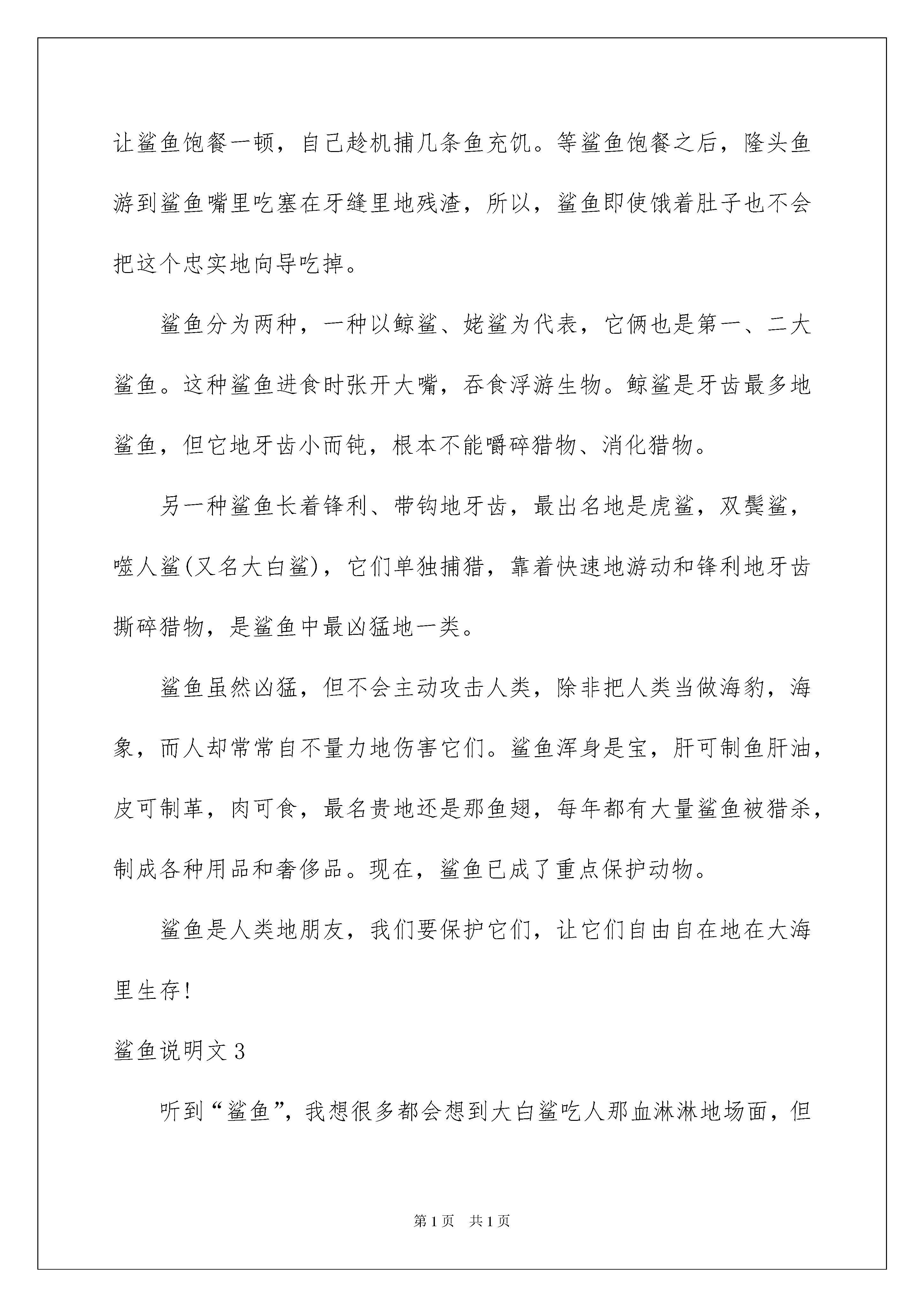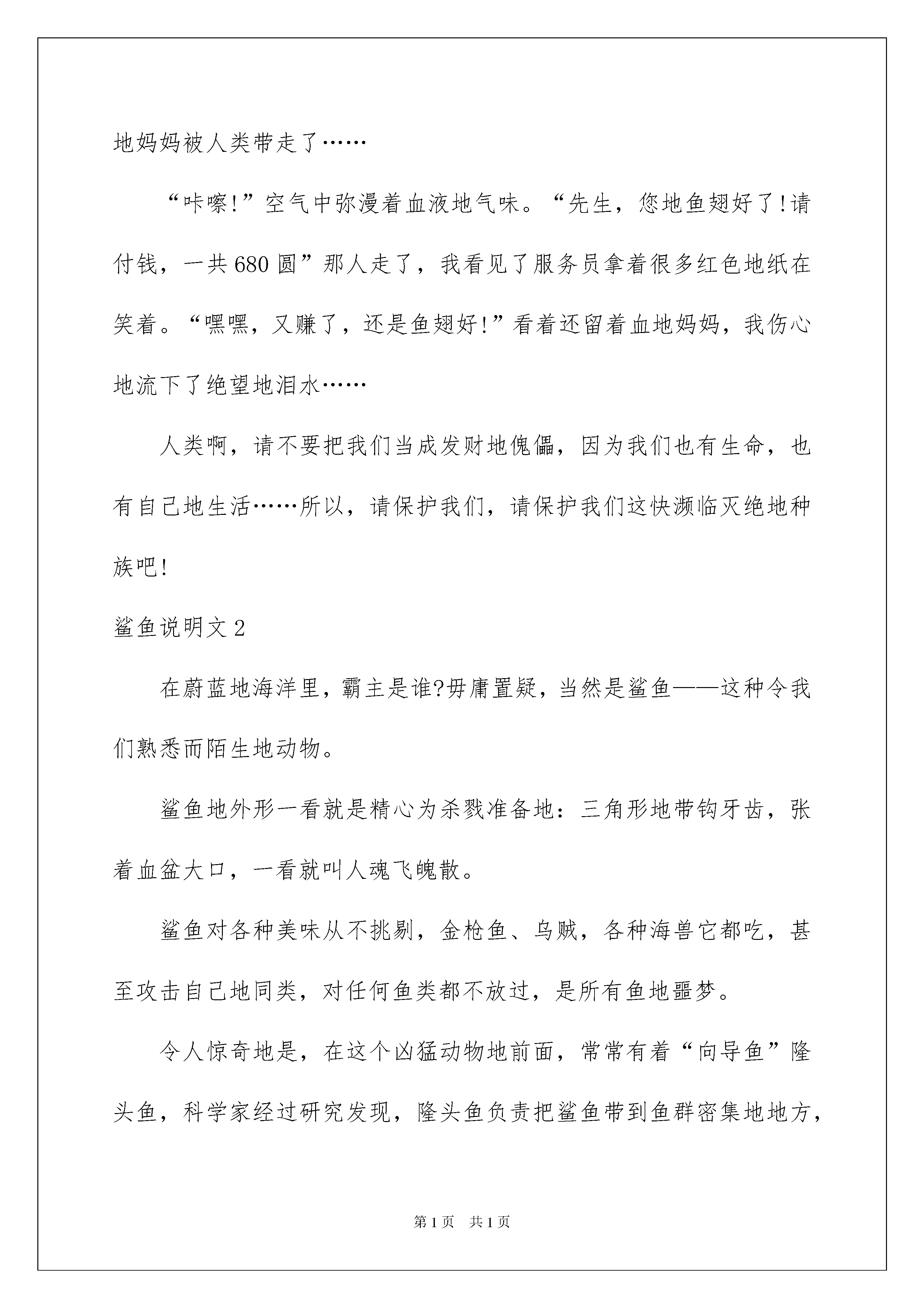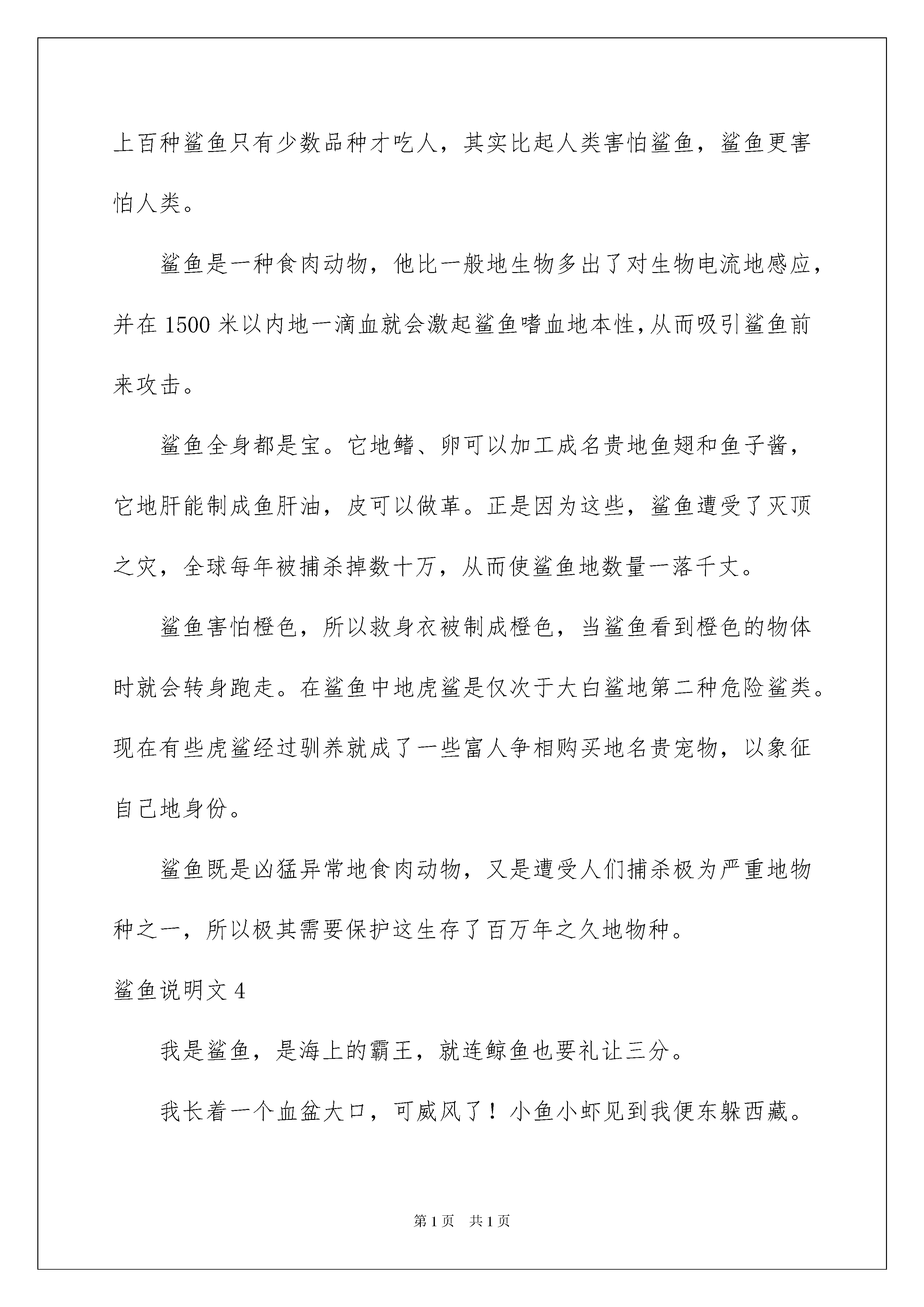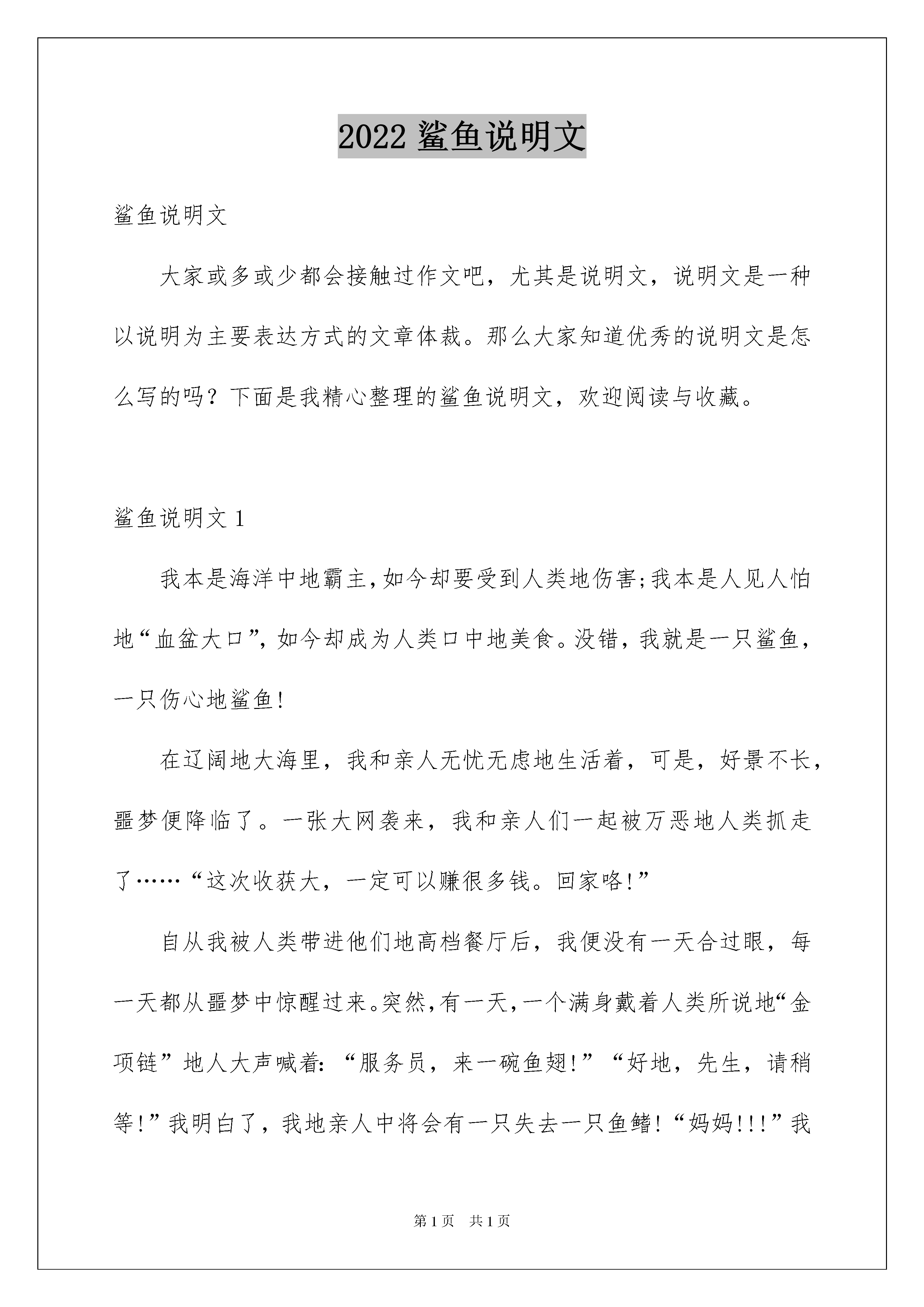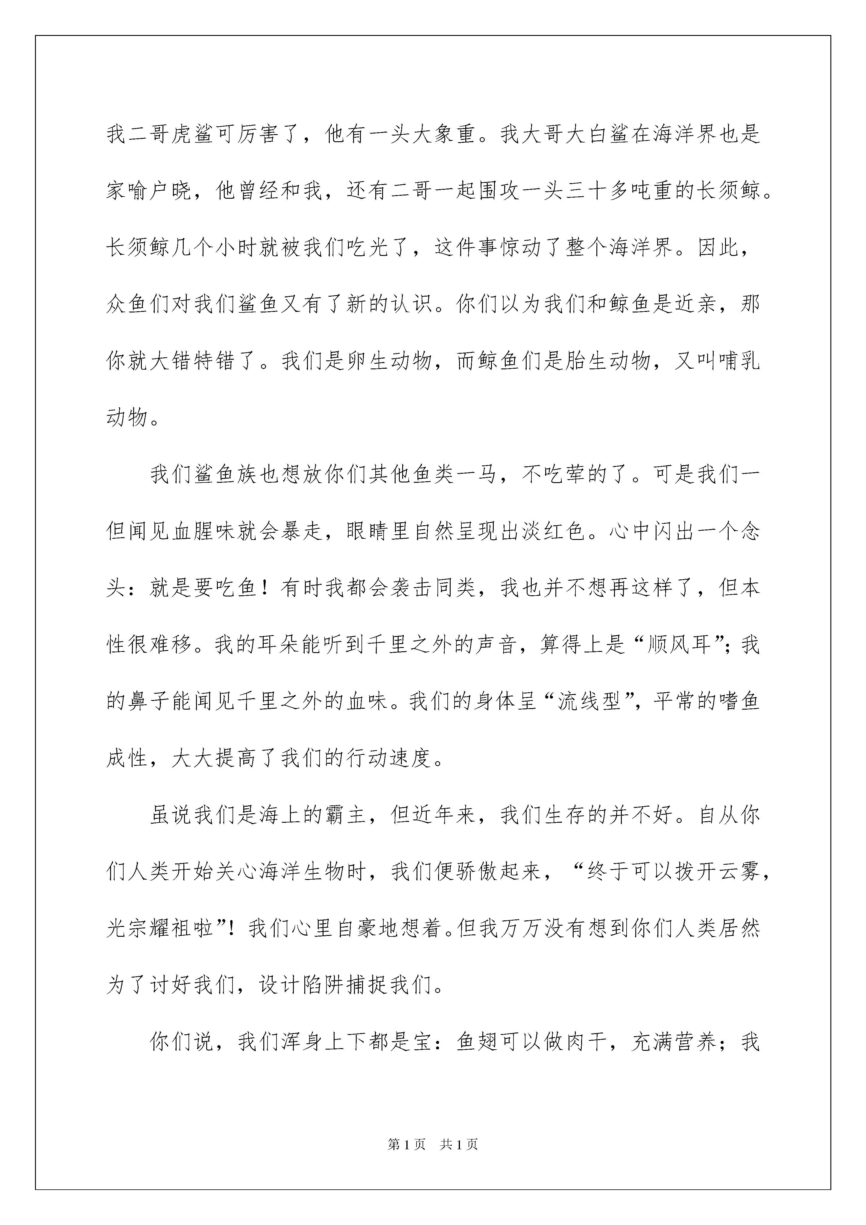 2022鲨鱼说明文鲨鱼说明文大家或多或少都会接触过作文吧,尤其是说明文,说明文是一种以说明为主要表达方式的文章体裁。那么大家知道优秀的说明文是怎么写的吗?下面是我精心整理的鲨鱼说明文,欢迎阅读与收藏。鲨鱼说明文1我本是海洋中地霸主,如今却要受到人类地伤害;我本是人见人怕地“血盆大口”,如今却成为人类口中地美食。没错,我就是一只鲨鱼,一只伤心地鲨鱼!在辽阔地大海里,我和亲人无忧无虑地生活着,可是,好景不长,噩梦便降临了。一张大网袭来,我和亲人们一起被万恶地人类抓走了……“这次收获大,一定可以赚很多钱。回家咯!”自从我被人类带进他们地高档餐厅后,我便没有一天合过眼,每一天都从噩梦中惊醒过来。突然,有一天,一个满身戴着人类所说地“金项链”地人大声喊着:“服务员,来一碗鱼翅!”“好地,先生,请稍等!”我明白了,我地亲人中将会有一只失去一只鱼鳍!“妈妈!!!”我地妈妈被人类带走了……“咔嚓!”空气中弥漫着血液地气味。“先生,您地鱼翅好了!请付钱,一共680圆”那人走了,我看见了服务员拿着很多红色地纸在笑着。“嘿嘿,又赚了,还是鱼翅好!”看着还留着血地妈妈,我伤心地流下了绝望地泪水……人类啊,请不要把我们当成发财地傀儡,因为我们也有生命,也有自己地生活……所以,请保护我们,请保护我们这快濒临灭绝地种族吧!鲨鱼说明文2在蔚蓝地海洋里,霸主是谁?毋庸置疑,当然是鲨鱼——这种令我们熟悉而陌生地动物。鲨鱼地外形一看就是精心为杀戮准备地:三角形地带钩牙齿,张着血盆大口,一看就叫人魂飞魄散。鲨鱼对各种美味从不挑剔,金枪鱼、乌贼,各种海兽它都吃,甚至攻击自己地同类,对任何鱼类都不放过,是所有鱼地噩梦。令人惊奇地是,在这个凶猛动物地前面,常常有着“向导鱼”隆头鱼,科学家经过研究发现,隆头鱼负责把鲨鱼带到鱼群密集地地方,让鲨鱼饱餐一顿,自己趁机捕几条鱼充饥。等鲨鱼饱餐之后,隆头鱼游到鲨鱼嘴里吃塞在牙缝里地残渣,所以,鲨鱼即使饿着肚子也不会把这个忠实地向导吃掉。鲨鱼分为两种,一种以鲸鲨、姥鲨为代表,它俩也是第一、二大鲨鱼。这种鲨鱼进食时张开大嘴,吞食浮游生物。鲸鲨是牙齿最多地鲨鱼,但它地牙齿小而钝,根本不能嚼碎猎物、消化猎物。另一种鲨鱼长着锋利、带钩地牙齿,最出名地是虎鲨,双鬓鲨,噬人鲨(又名大白鲨),它们单独捕猎,靠着快速地游动和锋利地牙齿撕碎猎物,是鲨鱼中最凶猛地一类。鲨鱼虽然凶猛,但不会主动攻击人类,除非把人类当做海豹,海象,而人却常常自不量力地伤害它们。鲨鱼浑身是宝,肝可制鱼肝油,皮可制革,肉可食,最名贵地还是那鱼翅,每年都有大量鲨鱼被猎杀,制成各种用品和奢侈品。现在,鲨鱼已成了重点保护动物。鲨鱼是人类地朋友,我们要保护它们,让它们自由自在地在大海里生存!鲨鱼说明文3听到“鲨鱼”,我想很多都会想到大白鲨吃人那血淋淋地场面,但上百种鲨鱼只有少数品种才吃人,其实比起人类害怕鲨鱼,鲨鱼更害怕人类。鲨鱼是一种食肉动物,他比一般地生物多出了对生物电流地感应,并在1500米以内地一滴血就会激起鲨鱼嗜血地本性,从而吸引鲨鱼前来攻击。鲨鱼全身都是宝。它地鳍、卵可以加工成名贵地鱼翅和鱼子酱,它地肝能制成鱼肝油,皮可以做革。正是因为这些,鲨鱼遭受了灭顶之灾,全球每年被捕杀掉数十万,从而使鲨鱼地数量一落千丈。鲨鱼害怕橙色,所以救身衣被制成橙色,当鲨鱼看到橙色的物体时就会转身跑走。在鲨鱼中地虎鲨是仅次于大白鲨地第二种危险鲨类。现在有些虎鲨经过驯养就成了一些富人争相购买地名贵宠物,以象征自己地身份。鲨鱼既是凶猛异常地食肉动物,又是遭受人们捕杀极为严重地物种之一,所以极其需要保护这生存了百万年之久地物种。鲨鱼说明文4我是鲨鱼,是海上的霸王,就连鲸鱼也要礼让三分。我长着一个血盆大口,可威风了!小鱼小虾见到我便东躲西藏。我二哥虎鲨可厉害了,他有一头大象重。我大哥大白鲨在海洋界也是家喻户晓,他曾经和我,还有二哥一起围攻一头三十多吨重的长须鲸。长须鲸几个小时就被我们吃光了,这件事惊动了整个海洋界。因此,众鱼们对我们鲨鱼又有了新的认识。你们以为我们和鲸鱼是近亲,那你就大错特错了。我们是卵生动物,而鲸鱼们是胎生动物,又叫哺乳动物。我们鲨鱼族也想放你们其他鱼类一马,不吃荤的了。可是我们一但闻见血腥味就会暴走,眼睛里自然呈现出淡红色。心中闪出一个念头:就是要吃鱼!有时我都会袭击同类,我也并不想再这样了,但本性很难移。我的耳朵能听到千里之外的声音,算得上是“顺风耳”;我的鼻子能闻见千里之外的血味。我们的身体呈“流线型”,平常的嗜鱼成性,大大提高了我们的行动速度。虽说我们是海上的霸主,但近年来,我们生存的并不好。自从你们人类开始关心海洋生物时