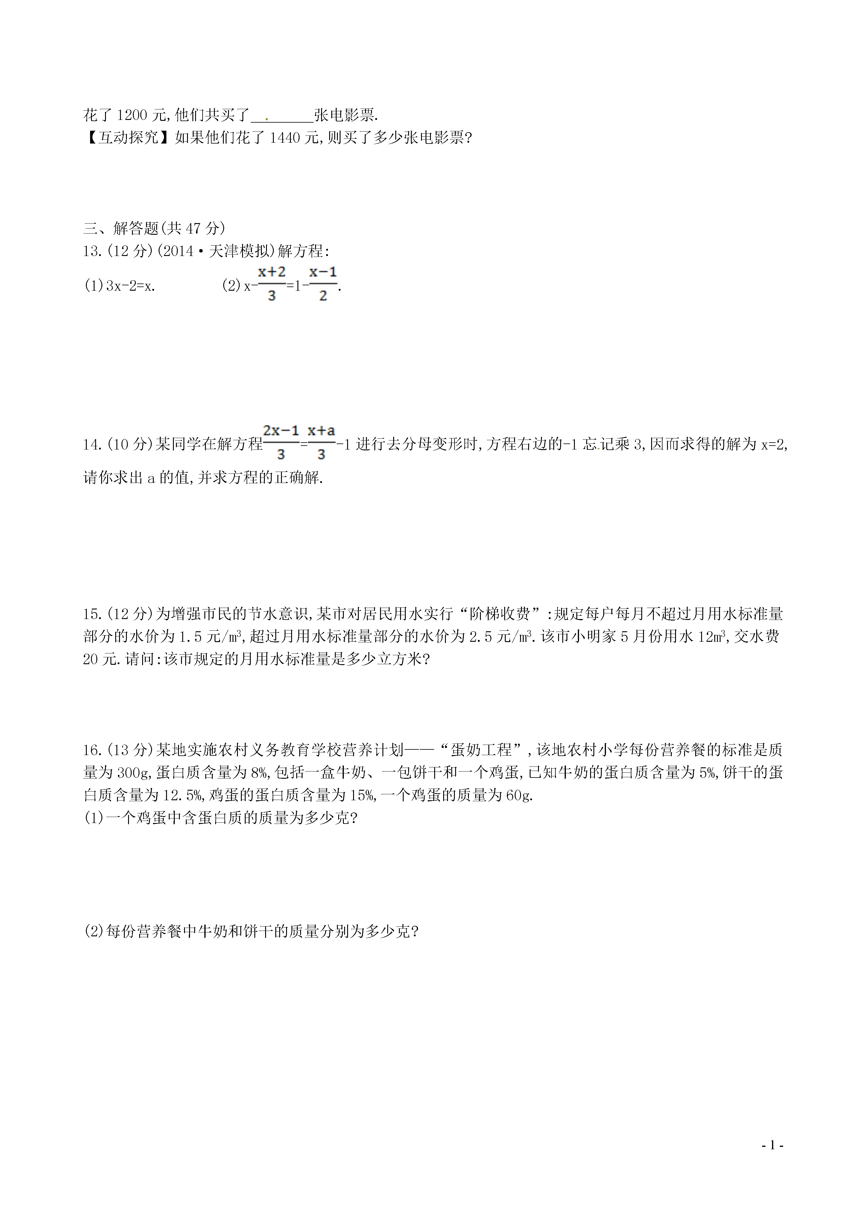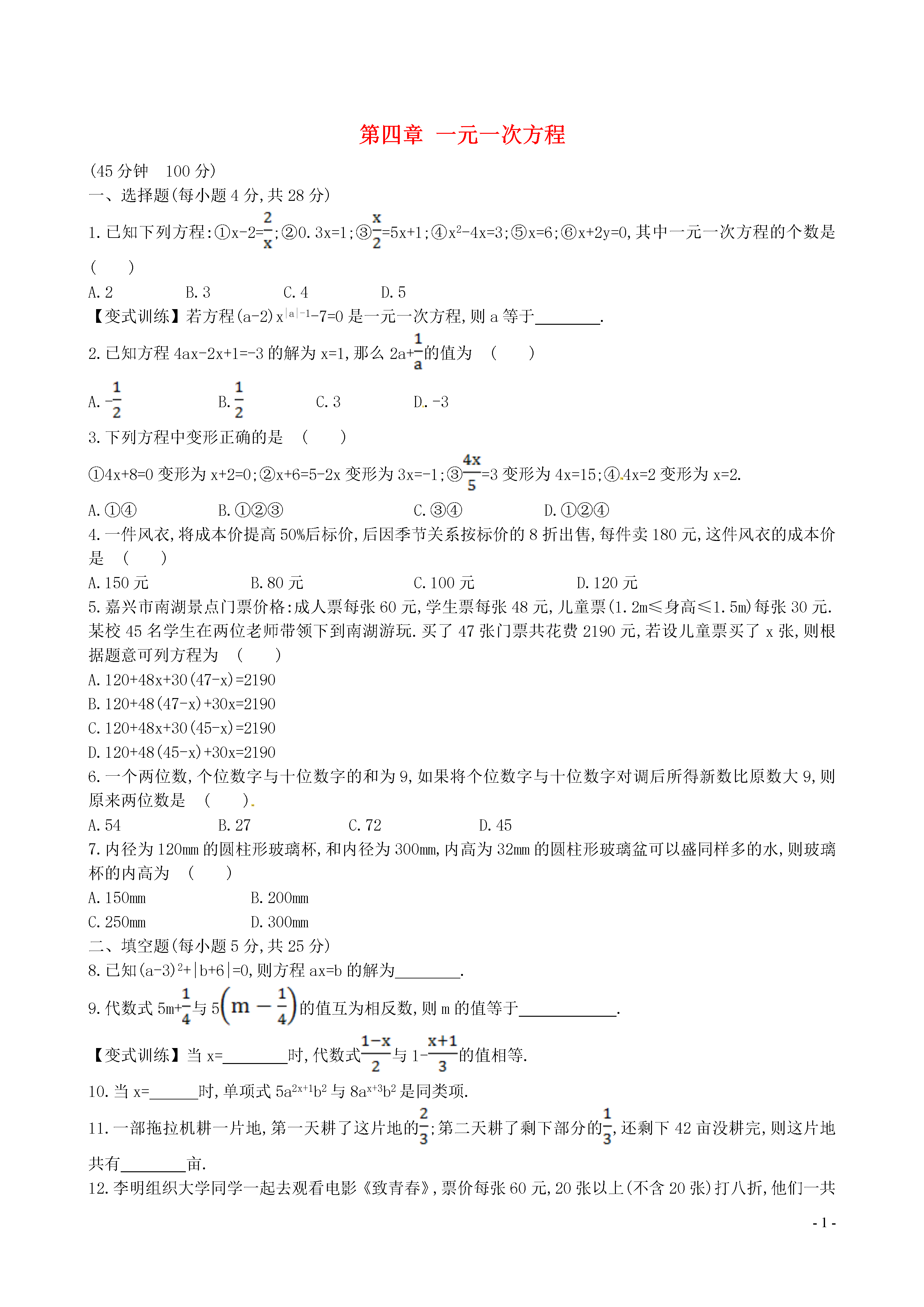 -1-第四章一元一次方程(45分钟100分)一、选择题(每小题4分,共28分)1.已知下列方程:①x-2=;②0.3x=1;③=5x+1;④x2-4x=3;⑤x=6;⑥x+2y=0,其中一元一次方程的个数是()A.2B.3C.4D.5【变式训练】若方程(a-2)x|a|-1-7=0是一元一次方程,则a等于.2.已知方程4ax-2x+1=-3的解为x=1,那么2a+的值为()A.-B.C.3D.-33.下列方程中变形正确的是()①4x+8=0变形为x+2=0;②x+6=5-2x变形为3x=-1;③=3变形为4x=15;④4x=2变形为x=2.A.①④B.①②③C.③④D.①②④4.一件风衣,将成本价提高50%后标价,后因季节关系按标价的8折出售,每件卖180元,这件风衣的成本价是()A.150元B.80元C.100元D.120元5.嘉兴市南湖景点门票价格:成人票每张60元,学生票每张48元,儿童票(1.2m≤身高≤1.5m)每张30元.某校45名学生在两位老师带领下到南湖游玩.买了47张门票共花费2190元,若设儿童票买了x张,则根据题意可列方程为()A.120+48x+30(47-x)=2190B.120+48(47-x)+30x=2190C.120+48x+30(45-x)=2190D.120+48(45-x)+30x=21906.一个两位数,个位数字与十位数字的和为9,如果将个位数字与十位数字对调后所得新数比原数大9,则原来两位数是()A.54B.27C.72D.457.内径为120mm的圆柱形玻璃杯,和内径为300mm,内高为32mm的圆柱形玻璃盆可以盛同样多的水,则玻璃杯的内高为()A.150mmB.200mmC.250mmD.300mm二、填空题(每小题5分,共25分)8.已知(a-3)2+|b+6|=0,则方程ax=b的解为.9.代数式5m+与5的值互为相反数,则m的值等于.【变式训练】当x=时,代数式与1-的值相等.10.当x=时,单项式5a2x+1b2与8ax+3b2是同类项.11.一部拖拉机耕一片地,第一天耕了这片地的;第二天耕了剩下部分的,还剩下42亩没耕完,则这片地共有亩.12.李明组织大学同学一起去观看电影《致青春》,票价每张60元,20张以上(不含20张)打八折,他们一共花了1200元,他们共买了张电影票.【互动探究】如果他们花了1440元,则买了多少张电影票?三、解答题(共47分)13.(12分)(2014·天津模拟)解方程:(1)3x-2=x.(2)x-=1-.14.(10分)某同学在解方程=-1进行去分母变形时,方程右边的-1忘记乘3,因而求得的解为x=2,请你求出a的值,并求方程的正确解.15.(12分)为增强市民的节水意识,某市对居民用水实行“阶梯收费”:规定每户每月不超过月用水标准量部分的水价为1.5元/m3,超过月用水标准量部分的水价为2.5元/m3.该市小明家5月份用水12m3,交水费20元.请问:该市规定的月用水标准量是多少立方米?16.(13分)某地实施农村义务教育学校营养计划——“蛋奶工程”,该地农村小学每份营养餐的标准是质量为300g,蛋白质含量为8%,包括一盒牛奶、一包饼干和一个鸡蛋,已知牛奶的蛋白质含量为5%,饼干的蛋白质含量为12.5%,鸡蛋的蛋白质含量为15%,一个鸡蛋的质量为60g.(1)一个鸡蛋中含蛋白质的质量为多少克?(2)每份营养餐中牛奶和饼干的质量分别为多少克?单元评价检测(四)第四章(45分钟100分)一、选择题(每小题4分,共28分)1.已知下列方程:①x-2=;②0.3x=1;③=5x+1;④x2-4x=3;⑤x=6;⑥x+2y=0,其中一元一次方程的个数是()A.2B.3C.4D.5【解析】选B.②③⑤是一元一次方程,共3个.【变式训练】若方程(a-2)x|a|-1-7=0是一元一次方程,则a等于.【解析】根据一元一次方程的概念可得|a|-1=1,即|a|=2,则a=±2,又因为a-2≠0,即a≠2,所以a=-2.答案:-22.已知方程4ax-2x+1=-3的解为x=1,那么2a+的值为()A.-B.C.3D.-3【解析】选D.把x=1代入方程,得4a-2+1=-3,解得a=-,所以2a+=2×+=-3.3.下列方程中变形正确的是()①4x+8=0变形为x+2=0;②x+6=5-2x变形为3x=-1;③=3变形为4x=15;④4x=2变形为x=2.A.①④B.①②③C.③④D.①②④【解析】选B.①4x+8=0两边同除以4可得:x+2=0,故①正确;②x+6=5-2