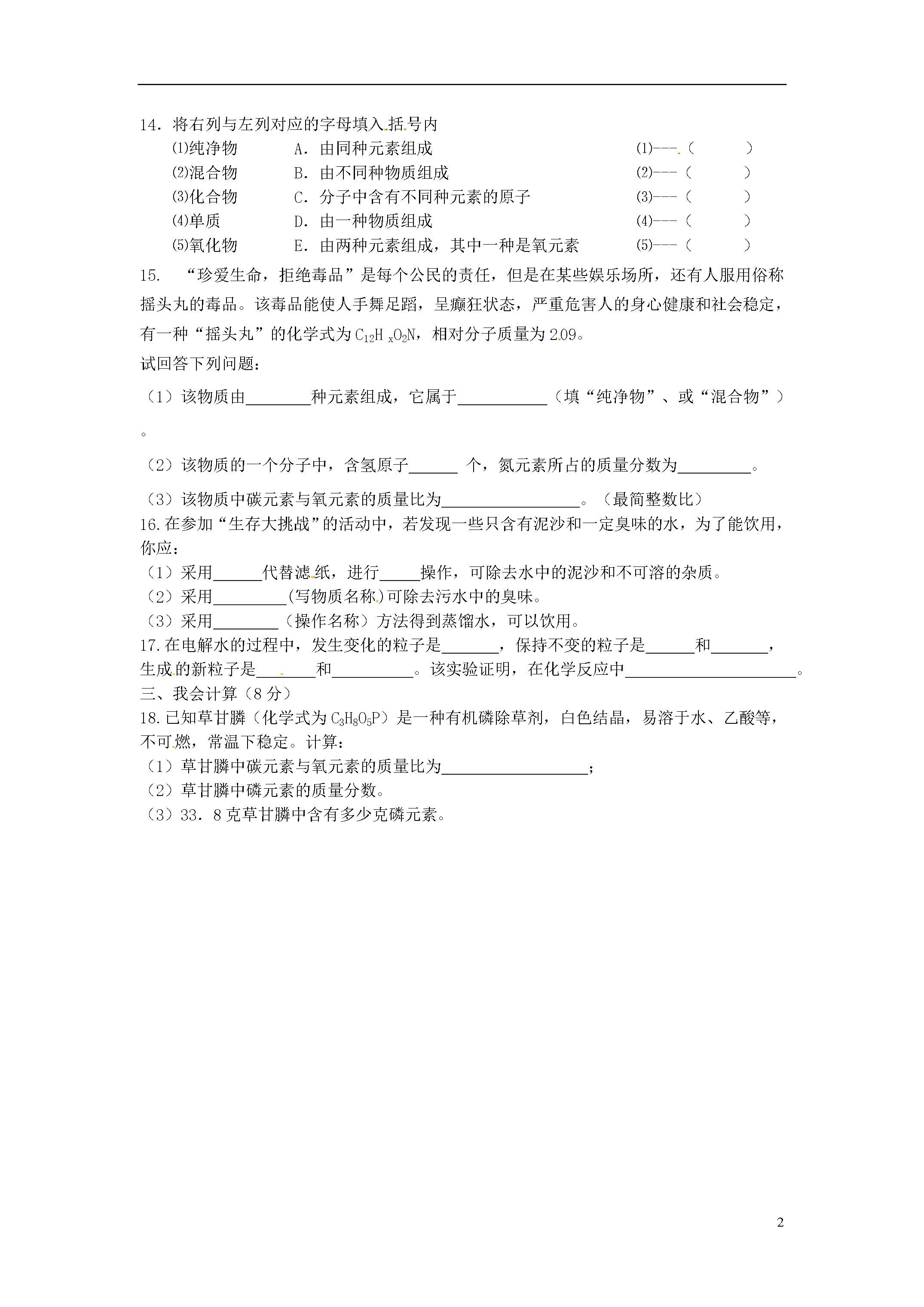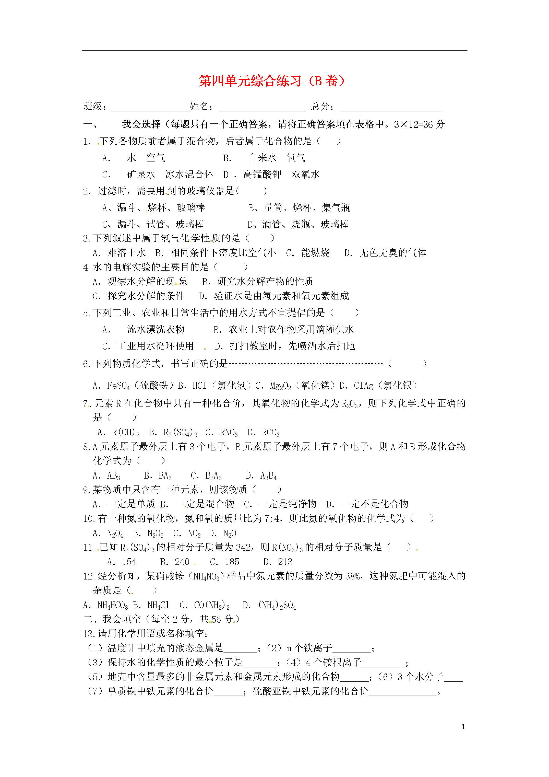 3第四单元综合练习(B卷)班级:姓名:总分:我会选择(每题只有一个正确答案,请将正确答案填在表格中。3×12=36分1.下列各物质前者属于混合物,后者属于化合物的是()A.水空气B.自来水氧气C.矿泉水冰水混合体D.高锰酸钾双氧水2.过滤时,需要用到的玻璃仪器是()A、漏斗、烧杯、玻璃棒B、量筒、烧杯、集气瓶C、漏斗、试管、玻璃棒D、滴管、烧瓶、玻璃棒3.下列叙述中属于氢气化学性质的是()A.难溶于水B.相同条件下密度比空气小C.能燃烧D.无色无臭的气体4.水的电解实验的主要目的是()A.观察水分解的现象B.研究水分解产物的性质C.探究水分解的条件D.验证水是由氢元素和氧元素组成5.下列工业、农业和日常生活中的用水方式不宜提倡的是()A.流水漂洗衣物B.农业上对农作物采用滴灌供水C.工业用水循环使用D.打扫教室时,先喷洒水后扫地6.下列物质化学式,书写正确的是…………………………………………()A.FeSO4(硫酸铁)B.HCl(氯化氢)C.Mg2O2(氧化镁)D.ClAg(氯化银)7.元素R在化合物中只有一种化合价,其氧化物的化学式为R2O3,则下列化学式中正确的是()A.R(OH)2B.R2(SO4)3C.RNO3D.RCO38.A元素原子最外层上有3个电子,B元素原子最外层上有7个电子,则A和B形成化合物化学式为()A.AB3B.BA3C.B2A3D.A3B49.某物质中只含有一种元素,则该物质()A.一定是单质B.一定是混合物C.一定是纯净物D.一定不是化合物10.有一种氮的氧化物,氮和氧的质量比为7:4,则此氮的氧化物的化学式为()A.N2O4B.N2O5C.NO2D.N2O11.已知R2(SO4)3的相对分子质量为342,则R(NO3)3的相对分子质量是()A.154B.240C.185D.21312.经分析知,某硝酸铵(NH4NO3)样品中氮元素的质量分数为38%,这种氮肥中可能混入的杂质是()A.NH4HCO3B.NH4ClC.CO(NH2)2D.(NH4)2SO4二、我会填空(每空2分,共56分)13.请用化学用语或名称填空:(1)温度计中填充的液态金属是;(2)m个铁离子;(3)保持水的化学性质的最小粒子是;(4)4个铵根离子;(5)地壳中含量最多的非金属元素和金属元素形成的化合物;(6)3个水分子(7)单质铁中铁元素的化合价;硫酸亚铁中铁元素的化合价。14.将右列与左列对应的字母填入括号内⑴纯净物A.由同种元素组成⑴---()⑵混合物B.由不同种物质组成⑵---()⑶化合物C.分子中含有不同种元素的原子⑶---()⑷单质D.由一种物质组成⑷---()⑸氧化物E.由两种元素组成,其中一种是氧元素⑸---()15.“珍爱生命,拒绝毒品”是每个公民的责任,但是在某些娱乐场所,还有人服用俗称摇头丸的毒品。该毒品能使人手舞足蹈,呈癫狂状态,严重危害人的身心健康和社会稳定,有一种“摇头丸”的化学式为C12HxO2N,相对分子质量为209。试回答下列问题:(1)该物质由种元素组成,它属于(填“纯净物”、或“混合物”)。(2)该物质的一个分子中,含氢原子个,氮元素所占的质量分数为。(3)该物质中碳元素与氧元素的质量比为。(最简整数比)16.在参加“生存大挑战”的活动中,若发现一些只含有泥沙和一定臭味的水,为了能饮用,你应:(1)采用代替滤纸,进行操作,可除去水中的泥沙和不可溶的杂质。(2)采用(写物质名称)可除去污水中的臭味。(3)采用(操作名称)方法得到蒸馏水,可以饮用。17.在电解水的过程中,发生变化的粒子是,保持不变的粒子是和,生成的新粒子是和。该实验证明,在化学反应中。三、我会计算(8分)18.已知草甘膦(化学式为C3H8O5P)是一种有机磷除草剂,白色结晶,易溶于水、乙酸等,不可燃,常温下稳定。计算:(1)草甘膦中碳元素与氧元素的质量比为;(2)草甘膦中磷元素的质量分数。(3)33.8克草甘膦中含有多少克磷元素。2013年秋季期九年级化学第四单元练习B卷我会选择(每题只有一个正确答案,请将正确答案填在表格中。3×12=36分1.C2.A3.C4.D5.A6.B7.B8.A9.D10.D11.D12.C+20二、我会填空(每空2分,共56分)13.(1)Hg(2)mFe3+(3)H2O(4)4NH4(5)Al2O3(6)3H2O(7)Fe(8)FeSO414.(1)D(2)B(3)C(4)A(5)E15.(1)四纯净物(2)196.7%(3)9:216.(1)布过滤(2)活性炭(3)蒸馏17.水分子氢原子氧原子氧分子氢分子分子可分三、我会计算(8分)18.(1)9:20(2)20%(3)6.76