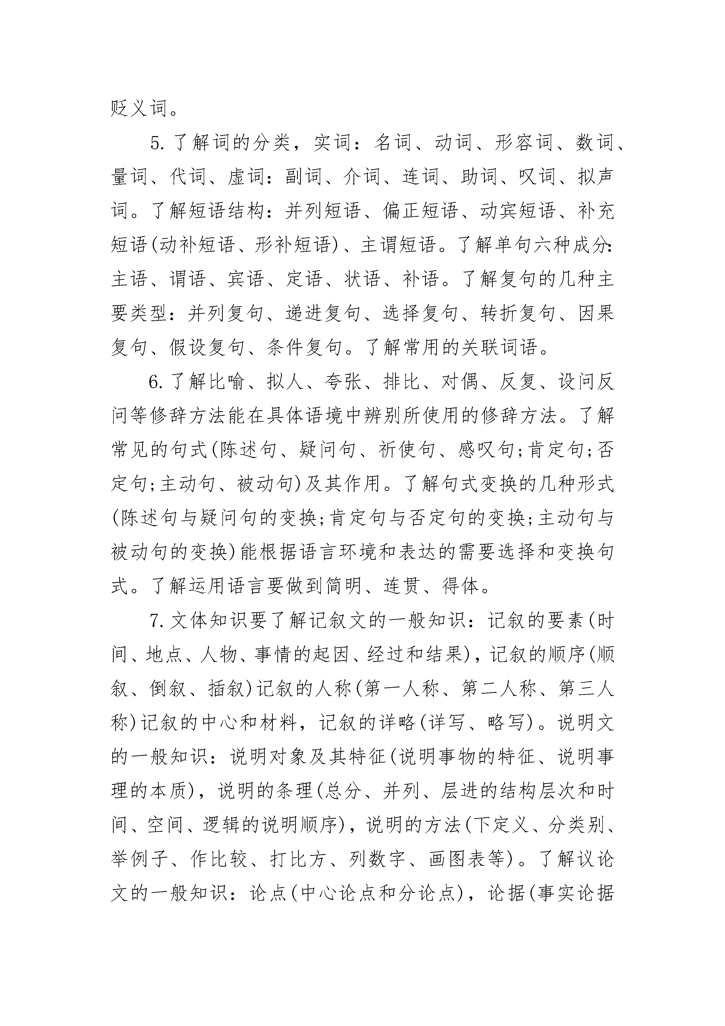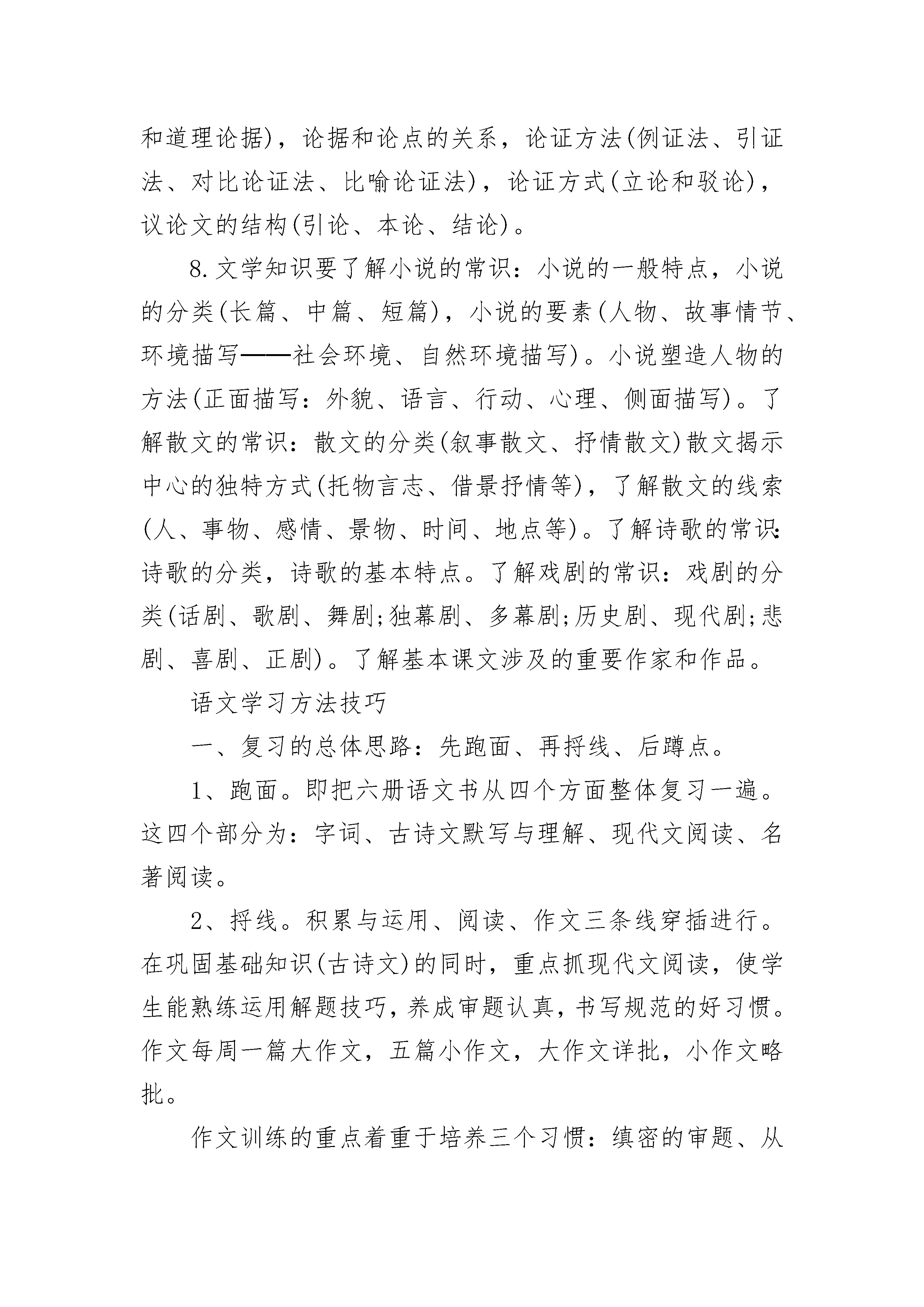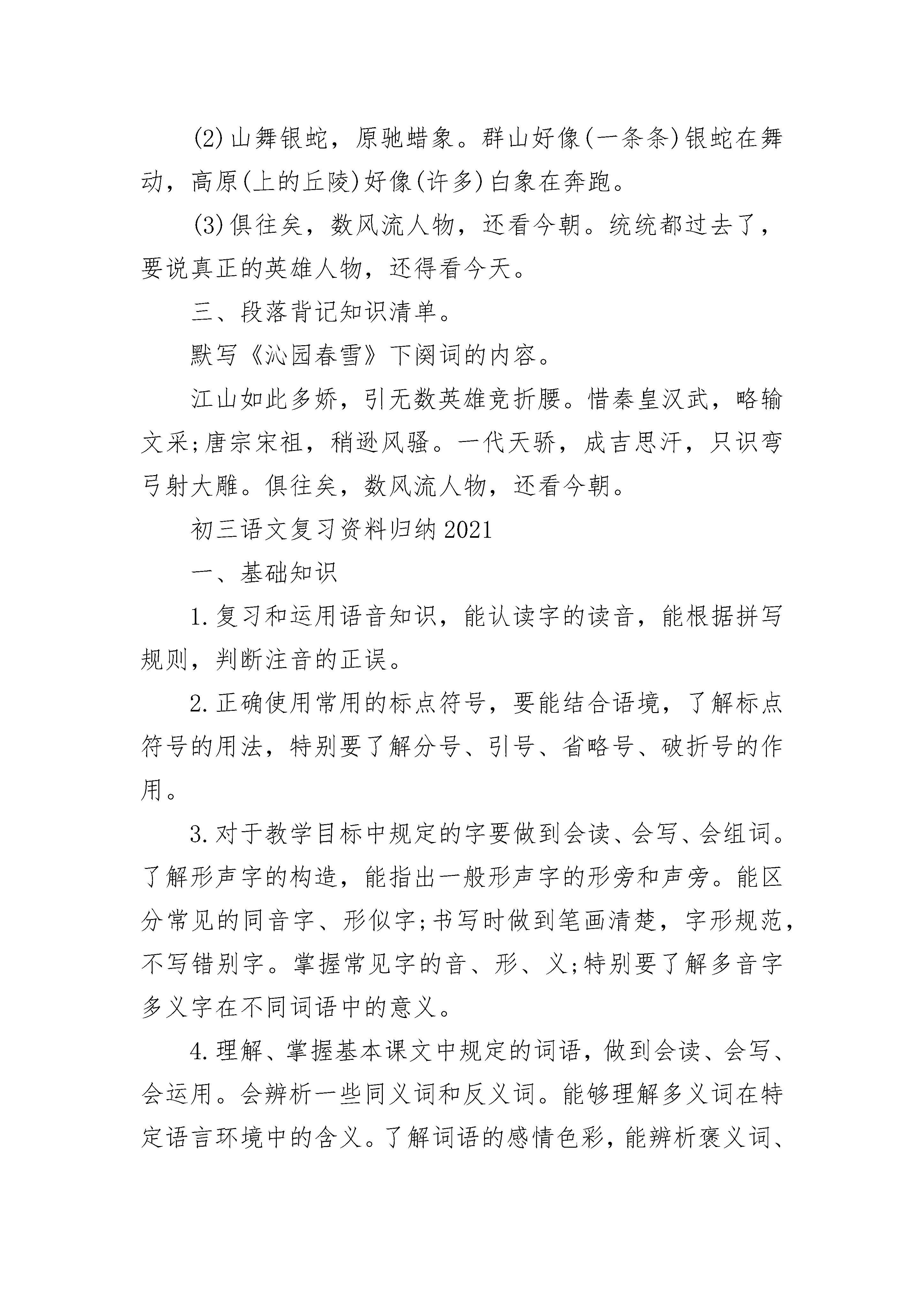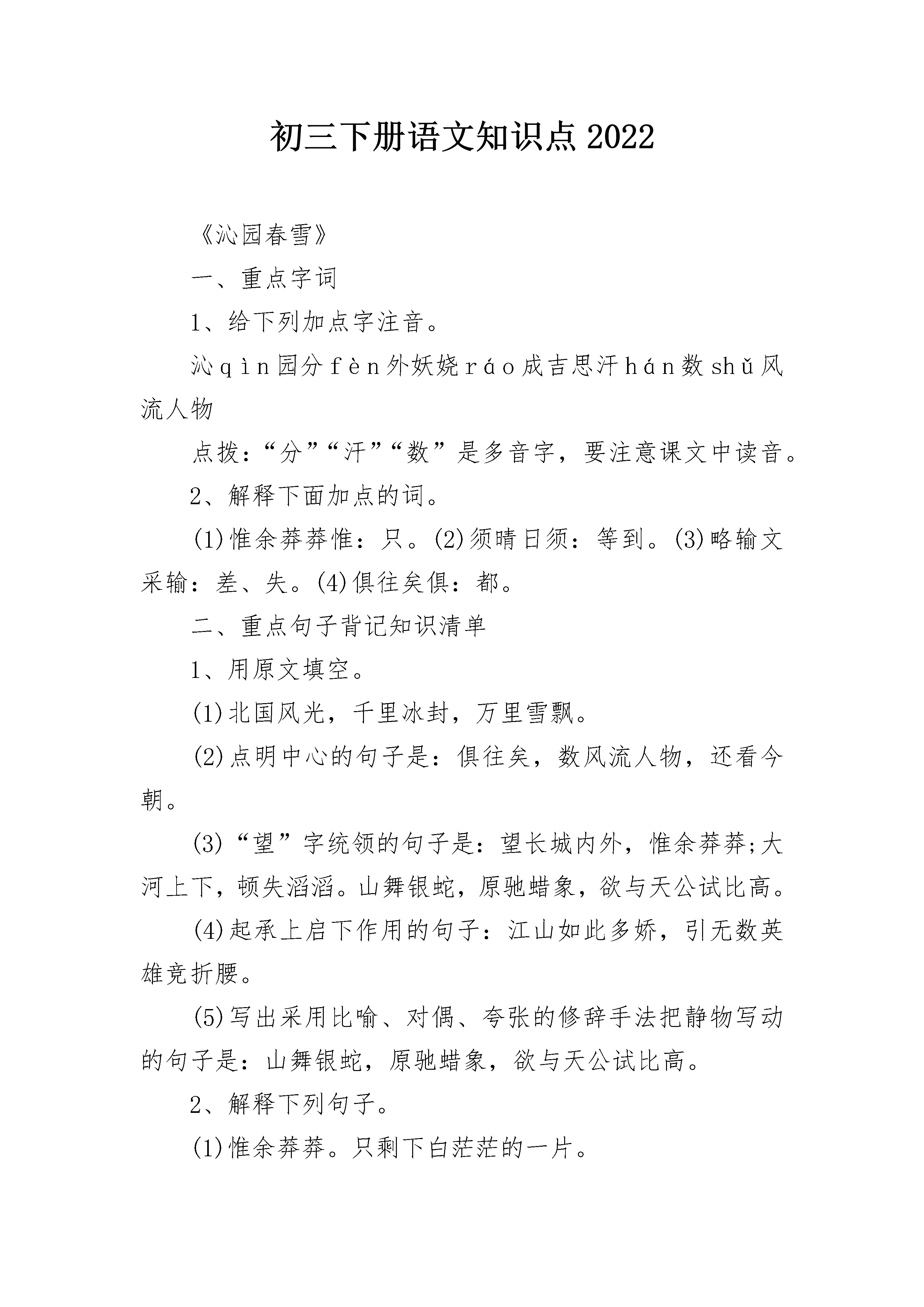 初三下册语文知识点2022《沁园春雪》一、重点字词1、给下列加点字注音。沁qìn园分fèn外妖娆ráo成吉思汗hán数shǔ风流人物点拨:“分”“汗”“数”是多音字,要注意课文中读音。2、解释下面加点的词。(1)惟余莽莽惟:只。(2)须晴日须:等到。(3)略输文采输:差、失。(4)俱往矣俱:都。二、重点句子背记知识清单1、用原文填空。(1)北国风光,千里冰封,万里雪飘。(2)点明中心的句子是:俱往矣,数风流人物,还看今朝。(3)“望”字统领的句子是:望长城内外,惟余莽莽;大河上下,顿失滔滔。山舞银蛇,原驰蜡象,欲与天公试比高。(4)起承上启下作用的句子:江山如此多娇,引无数英雄竞折腰。(5)写出采用比喻、对偶、夸张的修辞手法把静物写动的句子是:山舞银蛇,原驰蜡象,欲与天公试比高。2、解释下列句子。(1)惟余莽莽。只剩下白茫茫的一片。(2)山舞银蛇,原驰蜡象。群山好像(一条条)银蛇在舞动,高原(上的丘陵)好像(许多)白象在奔跑。(3)俱往矣,数风流人物,还看今朝。统统都过去了,要说真正的英雄人物,还得看今天。三、段落背记知识清单。默写《沁园春雪》下阕词的内容。江山如此多娇,引无数英雄竞折腰。惜秦皇汉武,略输文采;唐宗宋祖,稍逊风骚。一代天骄,成吉思汗,只识弯弓射大雕。俱往矣,数风流人物,还看今朝。初三语文复习资料归纳2021一、基础知识1.复习和运用语音知识,能认读字的读音,能根据拼写规则,判断注音的正误。2.正确使用常用的标点符号,要能结合语境,了解标点符号的用法,特别要了解分号、引号、省略号、破折号的作用。3.对于教学目标中规定的字要做到会读、会写、会组词。了解形声字的构造,能指出一般形声字的形旁和声旁。能区分常见的同音字、形似字;书写时做到笔画清楚,字形规范,不写错别字。掌握常见字的音、形、义;特别要了解多音字多义字在不同词语中的意义。4.理解、掌握基本课文中规定的词语,做到会读、会写、会运用。会辨析一些同义词和反义词。能够理解多义词在特定语言环境中的含义。了解词语的感情色彩,能辨析褒义词、贬义词。5.了解词的分类,实词:名词、动词、形容词、数词、量词、代词、虚词:副词、介词、连词、助词、叹词、拟声词。了解短语结构:并列短语、偏正短语、动宾短语、补充短语(动补短语、形补短语)、主谓短语。了解单句六种成分:主语、谓语、宾语、定语、状语、补语。了解复句的几种主要类型:并列复句、递进复句、选择复句、转折复句、因果复句、假设复句、条件复句。了解常用的关联词语。6.了解比喻、拟人、夸张、排比、对偶、反复、设问反问等修辞方法能在具体语境中辨别所使用的修辞方法。了解常见的句式(陈述句、疑问句、祈使句、感叹句;肯定句;否定句;主动句、被动句)及其作用。了解句式变换的几种形式(陈述句与疑问句的变换;肯定句与否定句的变换;主动句与被动句的变换)能根据语言环境和表达的需要选择和变换句式。了解运用语言要做到简明、连贯、得体。7.文体知识要了解记叙文的一般知识:记叙的要素(时间、地点、人物、事情的起因、经过和结果),记叙的顺序(顺叙、倒叙、插叙)记叙的人称(第一人称、第二人称、第三人称)记叙的中心和材料,记叙的详略(详写、略写)。说明文的一般知识:说明对象及其特征(说明事物的特征、说明事理的本质),说明的条理(总分、并列、层进的结构层次和时间、空间、逻辑的说明顺序),说明的方法(下定义、分类别、举例子、作比较、打比方、列数字、画图表等)。了解议论文的一般知识:论点(中心论点和分论点),论据(事实论据和道理论据),论据和论点的关系,论证方法(例证法、引证法、对比论证法、比喻论证法),论证方式(立论和驳论),议论文的结构(引论、本论、结论)。8.文学知识要了解小说的常识:小说的一般特点,小说的分类(长篇、中篇、短篇),小说的要素(人物、故事情节、环境描写──社会环境、自然环境描写)。小说塑造人物的方法(正面描写:外貌、语言、行动、心理、侧面描写)。了解散文的常识:散文的分类(叙事散文、抒情散文)散文揭示中心的独特方式(托物言志、借景抒情等),了解散文的线索(人、事物、感情、景物、时间、地点等)。了解诗歌的常识:诗歌的分类,诗歌的基本特点。了解戏剧的常识:戏剧的分类(话剧、歌剧、舞剧;独幕剧、多幕剧;历史剧、现代剧;悲剧、喜剧、正剧)。了解基本课文涉及的重要作家和作品。语文学习方法技巧一、复习的总体思路:先跑面、再捋线、后蹲点。1、跑面。即把六册语文书从四个方面整体复习一遍。这四个部分为:字词、古诗文默写与理解、现代文阅读、名著阅读。2、捋线。积累与运用、阅读、作文三条线穿插进行。在巩固基础知识(古诗文)的同时,重点抓现代文阅读,使学生能熟练运用解题技巧,养成审题认真,书写规范的好习惯。作文每周一篇大作文,五篇小作文,大作文详批,小作文略批。作文训练