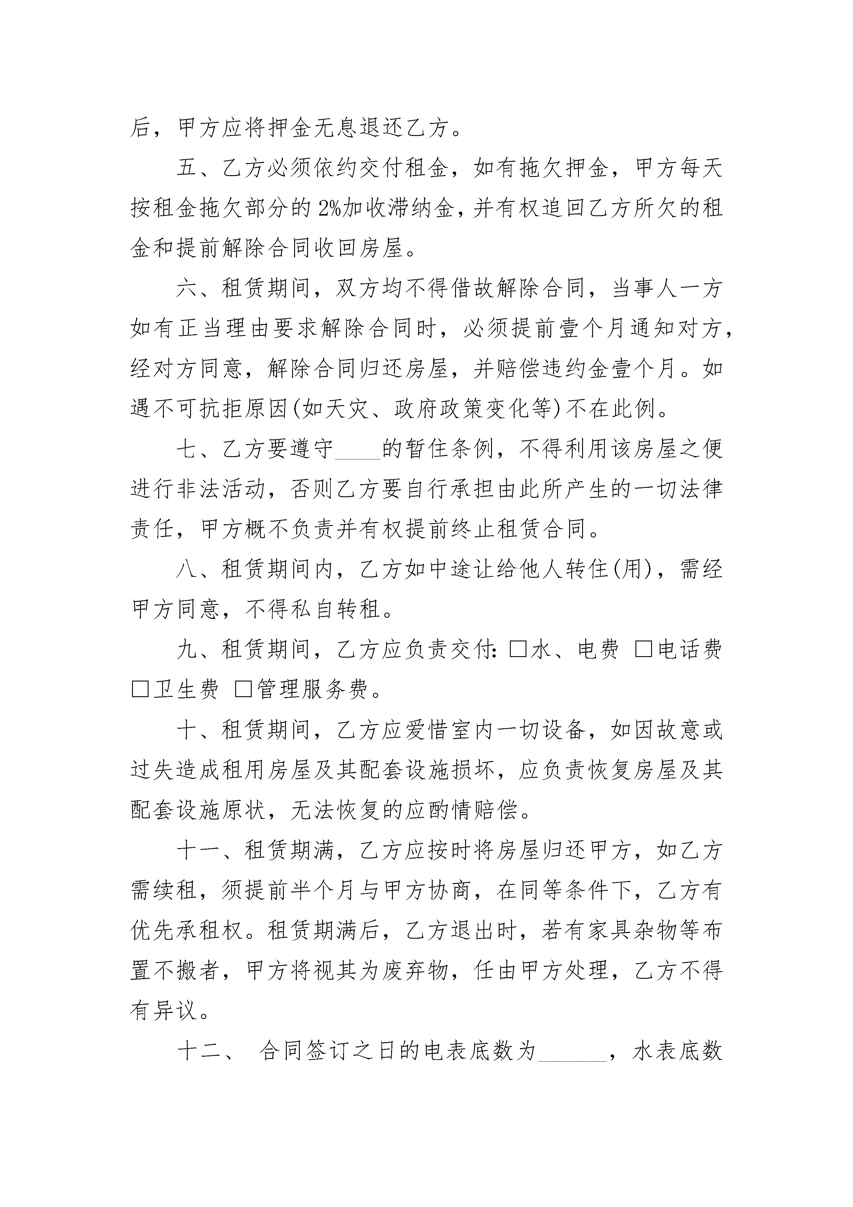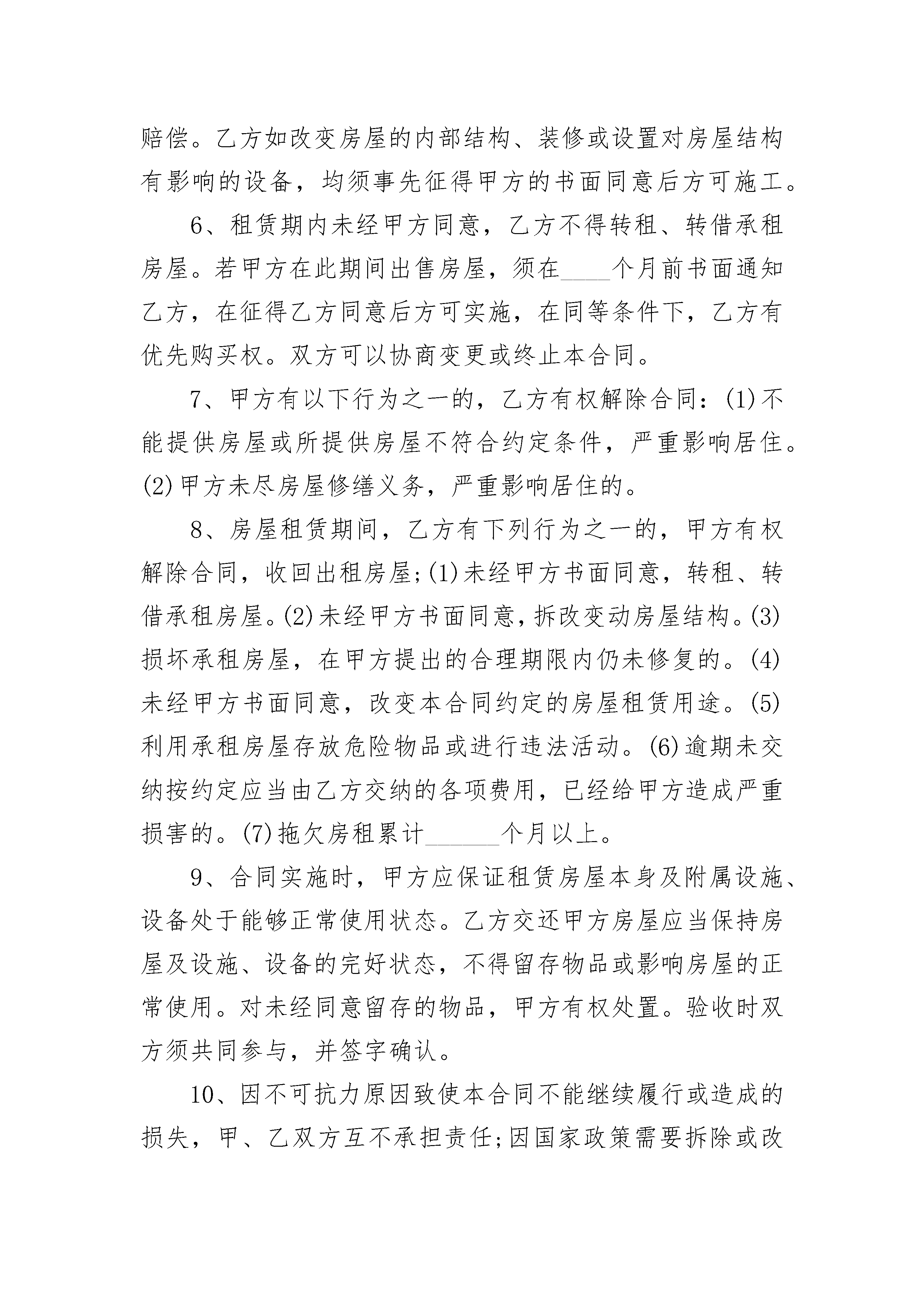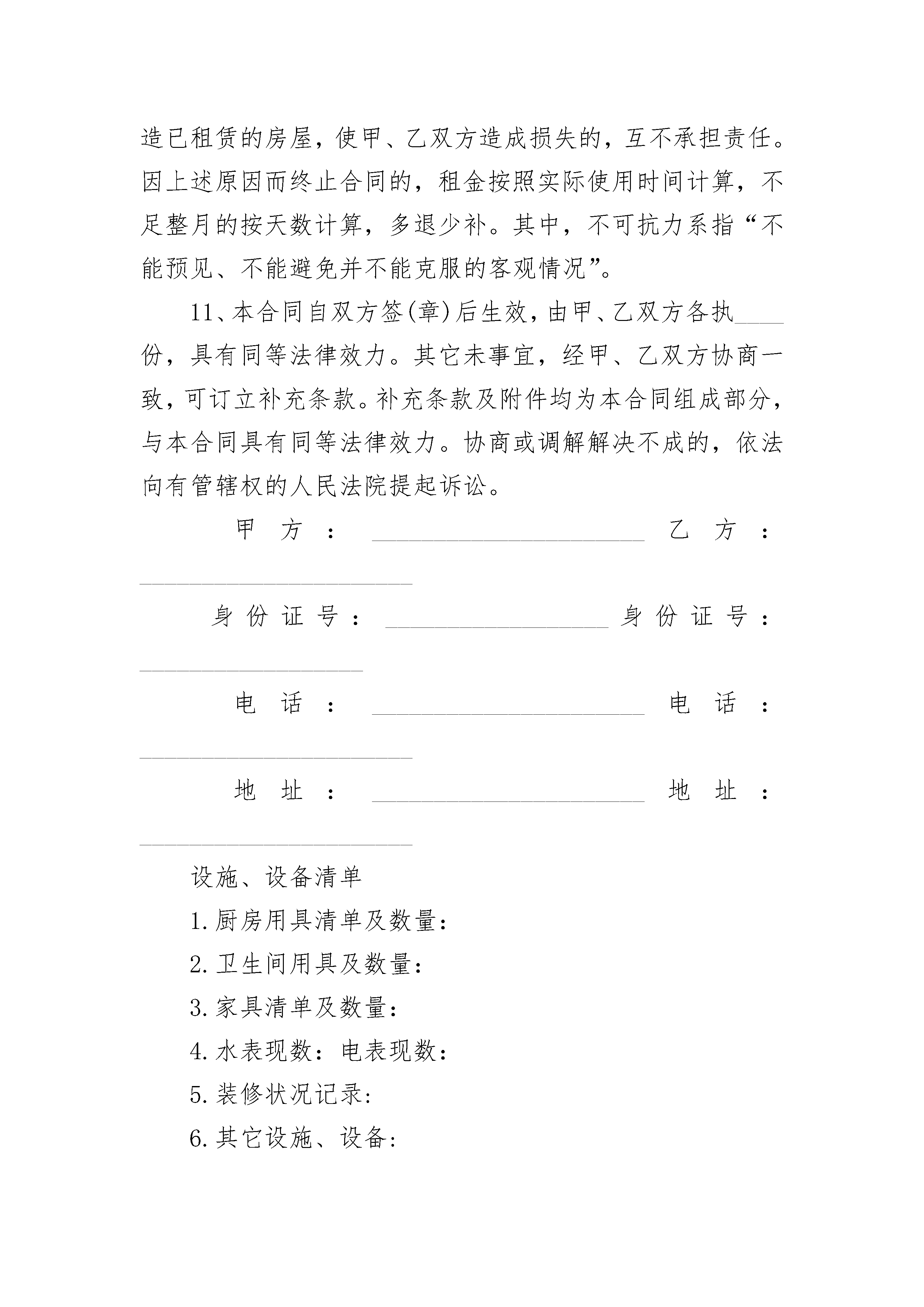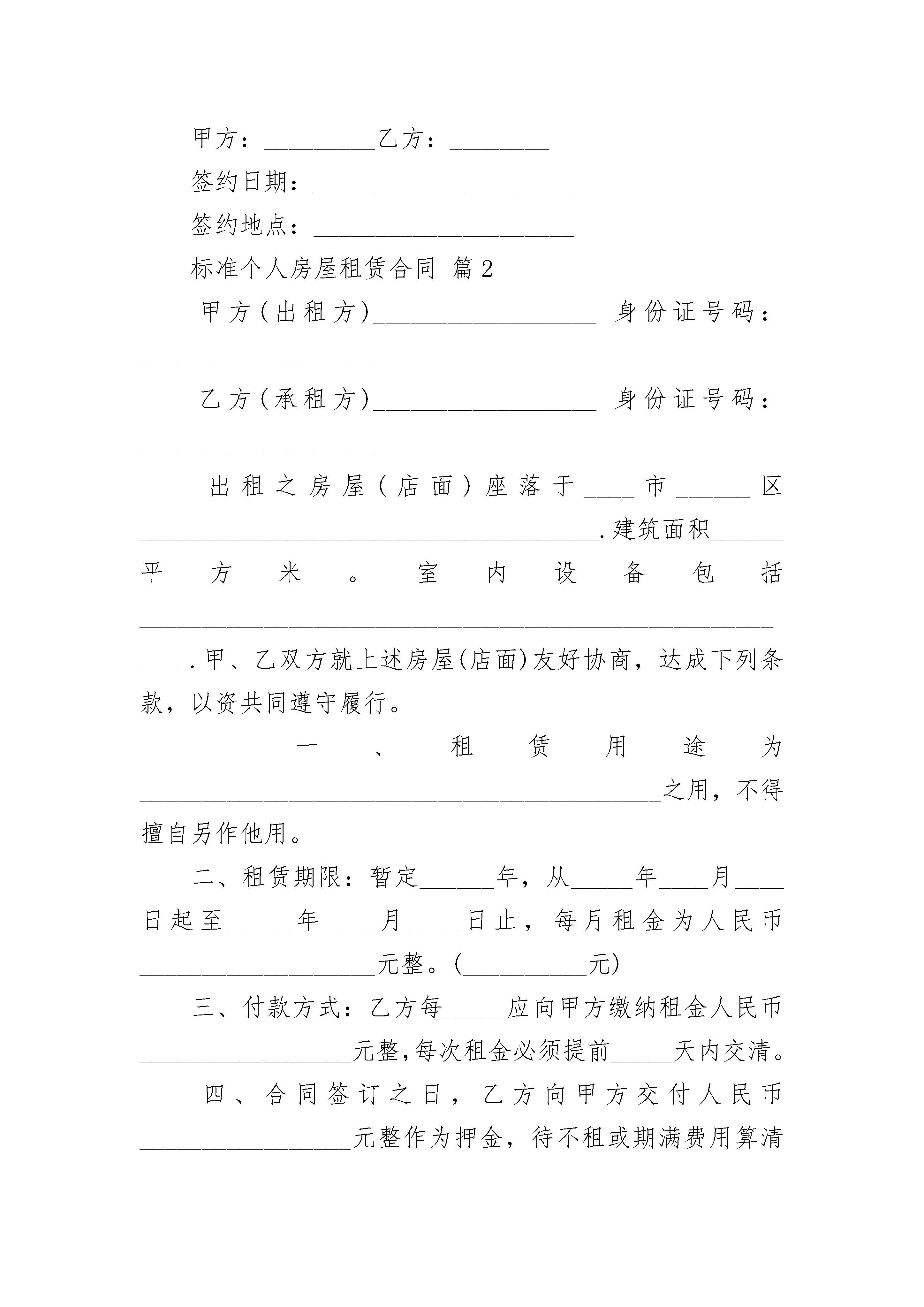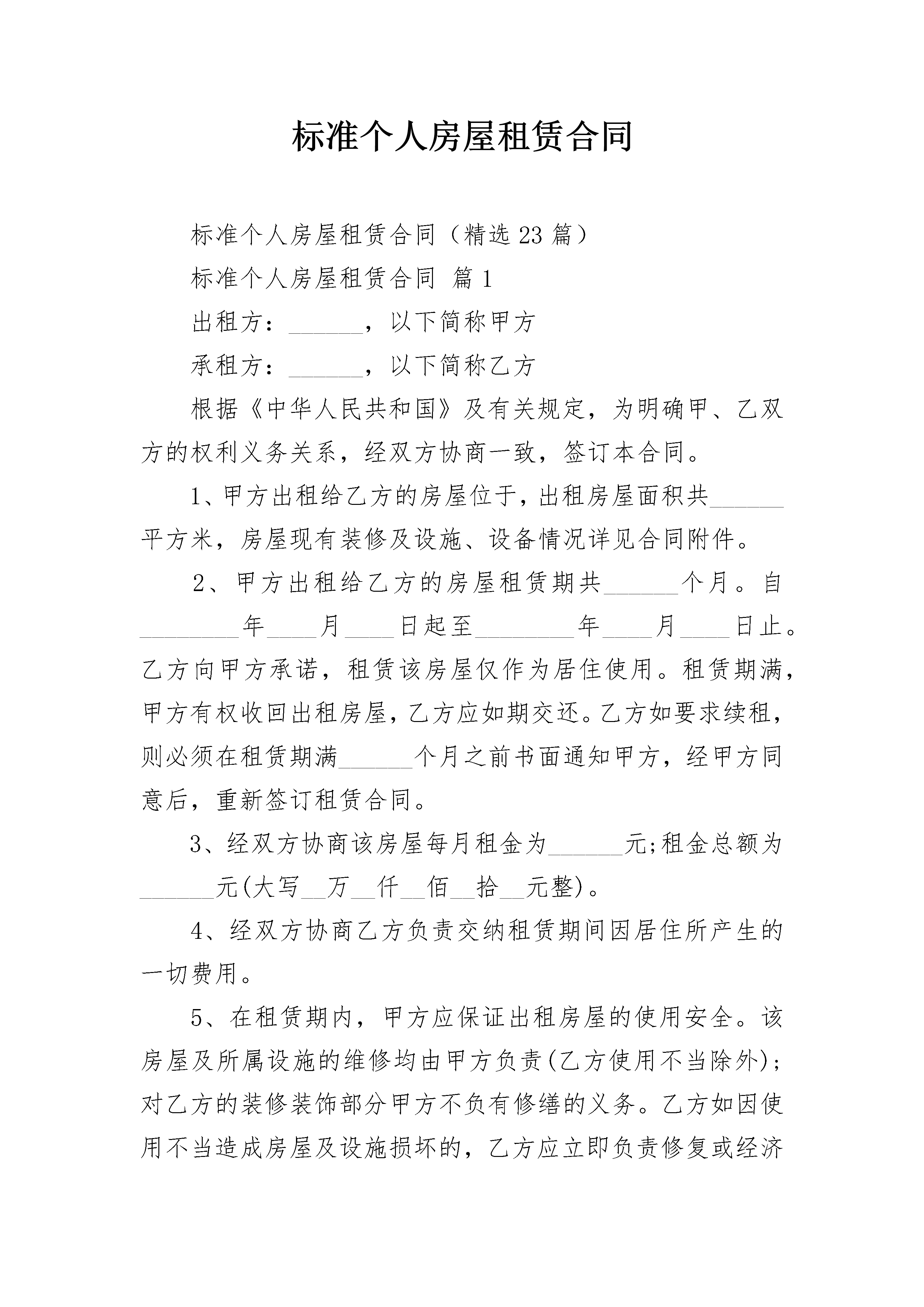 标准个人房屋租赁合同标准个人房屋租赁合同(精选23篇)标准个人房屋租赁合同篇1出租方:______,以下简称甲方承租方:______,以下简称乙方根据《中华人民共和国》及有关规定,为明确甲、乙双方的权利义务关系,经双方协商一致,签订本合同。1、甲方出租给乙方的房屋位于,出租房屋面积共______平方米,房屋现有装修及设施、设备情况详见合同附件。2、甲方出租给乙方的房屋租赁期共______个月。自________年____月____日起至________年____月____日止。乙方向甲方承诺,租赁该房屋仅作为居住使用。租赁期满,甲方有权收回出租房屋,乙方应如期交还。乙方如要求续租,则必须在租赁期满______个月之前书面通知甲方,经甲方同意后,重新签订租赁合同。3、经双方协商该房屋每月租金为______元;租金总额为______元(大写__万__仟__佰__拾__元整)。4、经双方协商乙方负责交纳租赁期间因居住所产生的一切费用。5、在租赁期内,甲方应保证出租房屋的使用安全。该房屋及所属设施的维修均由甲方负责(乙方使用不当除外);对乙方的装修装饰部分甲方不负有修缮的义务。乙方如因使用不当造成房屋及设施损坏的,乙方应立即负责修复或经济赔偿。乙方如改变房屋的内部结构、装修或设置对房屋结构有影响的设备,均须事先征得甲方的书面同意后方可施工。6、租赁期内未经甲方同意,乙方不得转租、转借承租房屋。若甲方在此期间出售房屋,须在____个月前书面通知乙方,在征得乙方同意后方可实施,在同等条件下,乙方有优先购买权。双方可以协商变更或终止本合同。7、甲方有以下行为之一的,乙方有权解除合同:(1)不能提供房屋或所提供房屋不符合约定条件,严重影响居住。(2)甲方未尽房屋修缮义务,严重影响居住的。8、房屋租赁期间,乙方有下列行为之一的,甲方有权解除合同,收回出租房屋;(1)未经甲方书面同意,转租、转借承租房屋。(2)未经甲方书面同意,拆改变动房屋结构。(3)损坏承租房屋,在甲方提出的合理期限内仍未修复的。(4)未经甲方书面同意,改变本合同约定的房屋租赁用途。(5)利用承租房屋存放危险物品或进行违法活动。(6)逾期未交纳按约定应当由乙方交纳的各项费用,已经给甲方造成严重损害的。(7)拖欠房租累计______个月以上。9、合同实施时,甲方应保证租赁房屋本身及附属设施、设备处于能够正常使用状态。乙方交还甲方房屋应当保持房屋及设施、设备的完好状态,不得留存物品或影响房屋的正常使用。对未经同意留存的物品,甲方有权处置。验收时双方须共同参与,并签字确认。10、因不可抗力原因致使本合同不能继续履行或造成的损失,甲、乙双方互不承担责任;因国家政策需要拆除或改造已租赁的房屋,使甲、乙双方造成损失的,互不承担责任。因上述原因而终止合同的,租金按照实际使用时间计算,不足整月的按天数计算,多退少补。其中,不可抗力系指“不能预见、不能避免并不能克服的客观情况”。11、本合同自双方签(章)后生效,由甲、乙双方各执____份,具有同等法律效力。其它未事宜,经甲、乙双方协商一致,可订立补充条款。补充条款及附件均为本合同组成部分,与本合同具有同等法律效力。协商或调解解决不成的,依法向有管辖权的人民法院提起诉讼。甲方:______________________乙方:______________________身份证号:__________________身份证号:__________________电话:______________________电话:______________________地址:______________________地址:______________________设施、设备清单1.厨房用具清单及数量:2.卫生间用具及数量:3.家具清单及数量:4.水表现数:电表现数:5.装修状况记录:6.其它设施、设备:甲方:_________乙方:________签约日期:_____________________签约地点:_____________________标准个人房屋租赁合同篇2甲方(出租方)__________________身份证号码:___________________乙方(承租方)__________________身份证号码:___________________出租之房屋(店面)座落于____市______区_____________________________________.建筑面积______平方米。室内设备包括_______________________________________________________.甲、乙双方就上述房屋(店面)友好协商,达成下列条款,以资共同遵守履行。一、租赁用途为______________