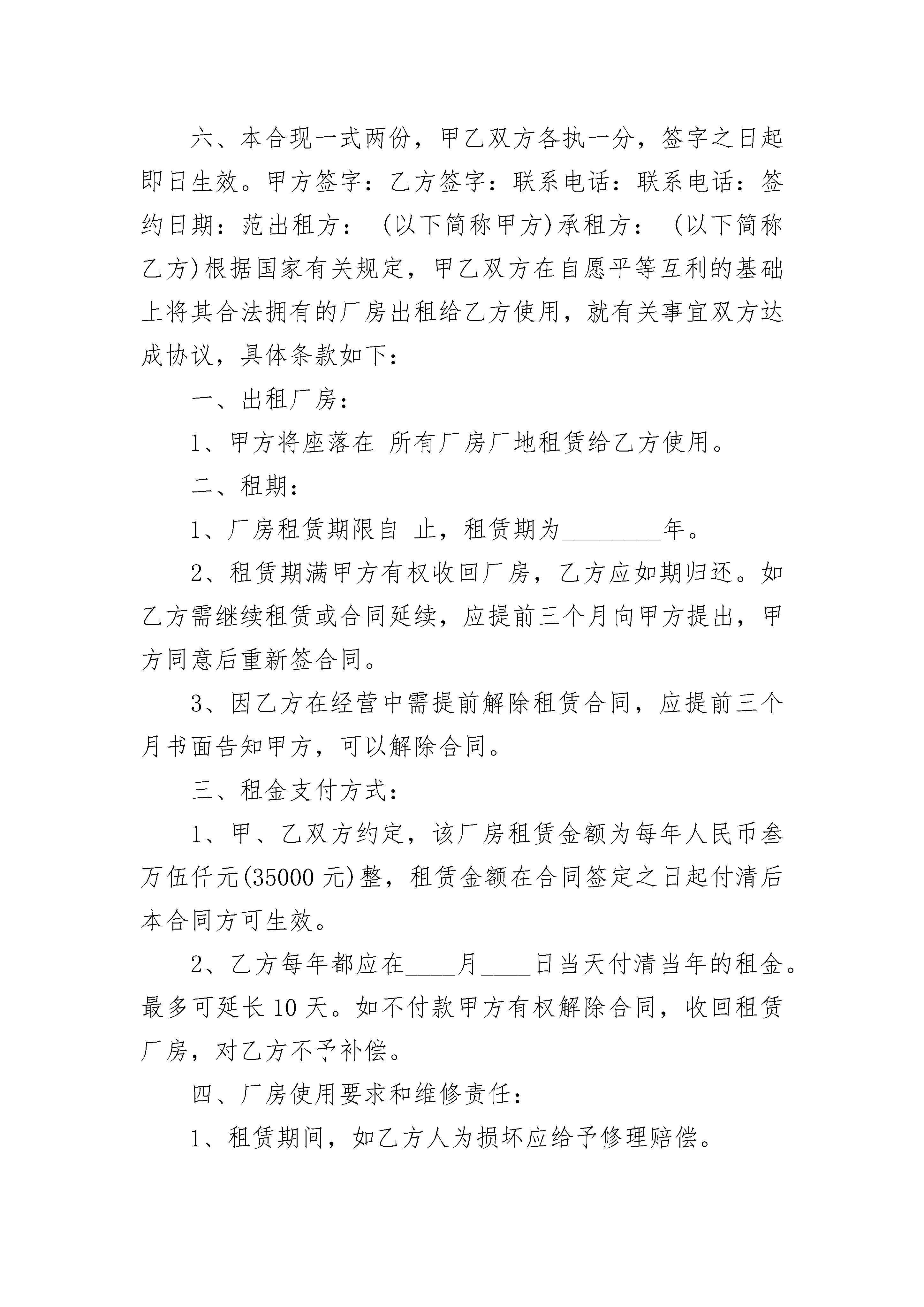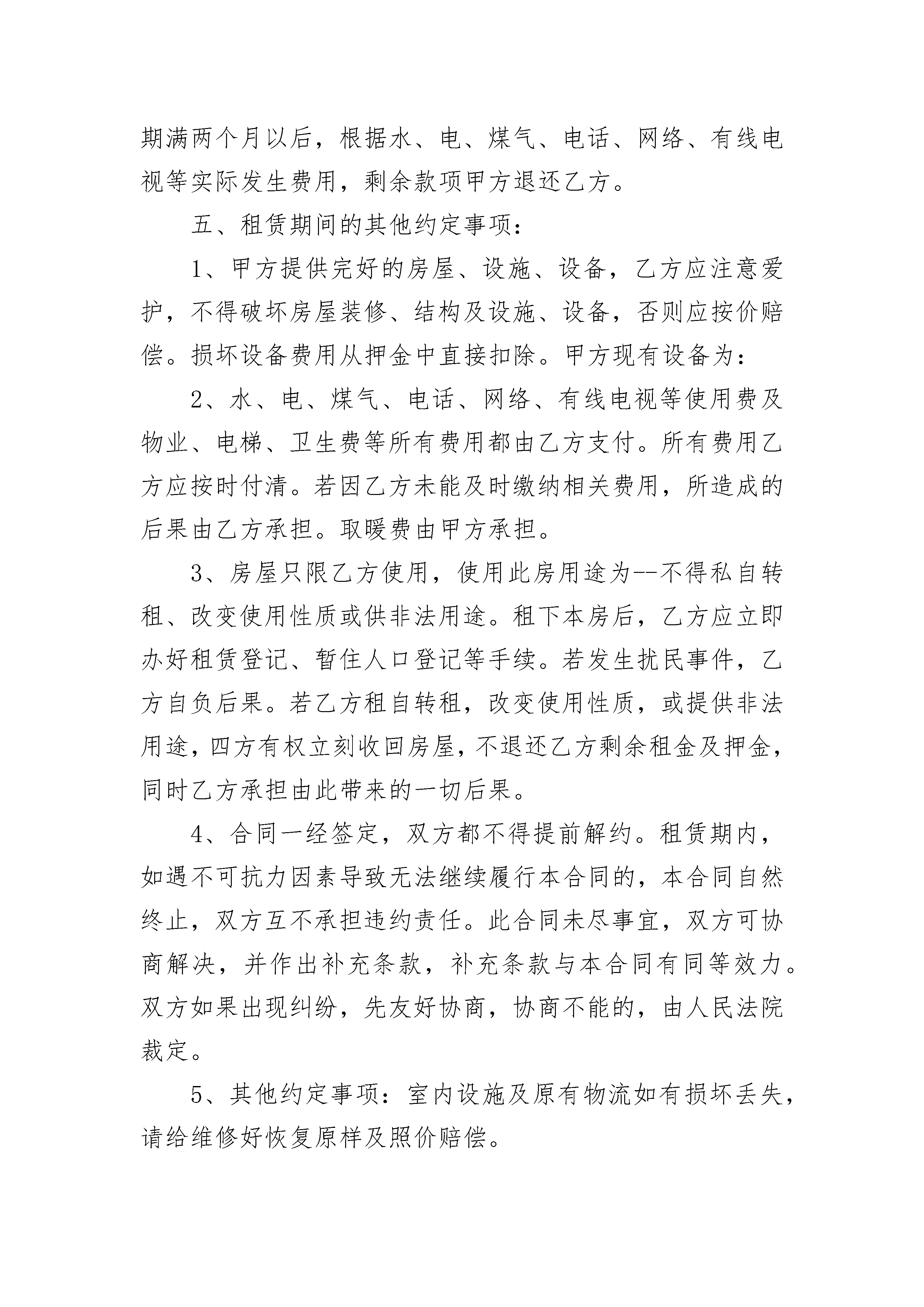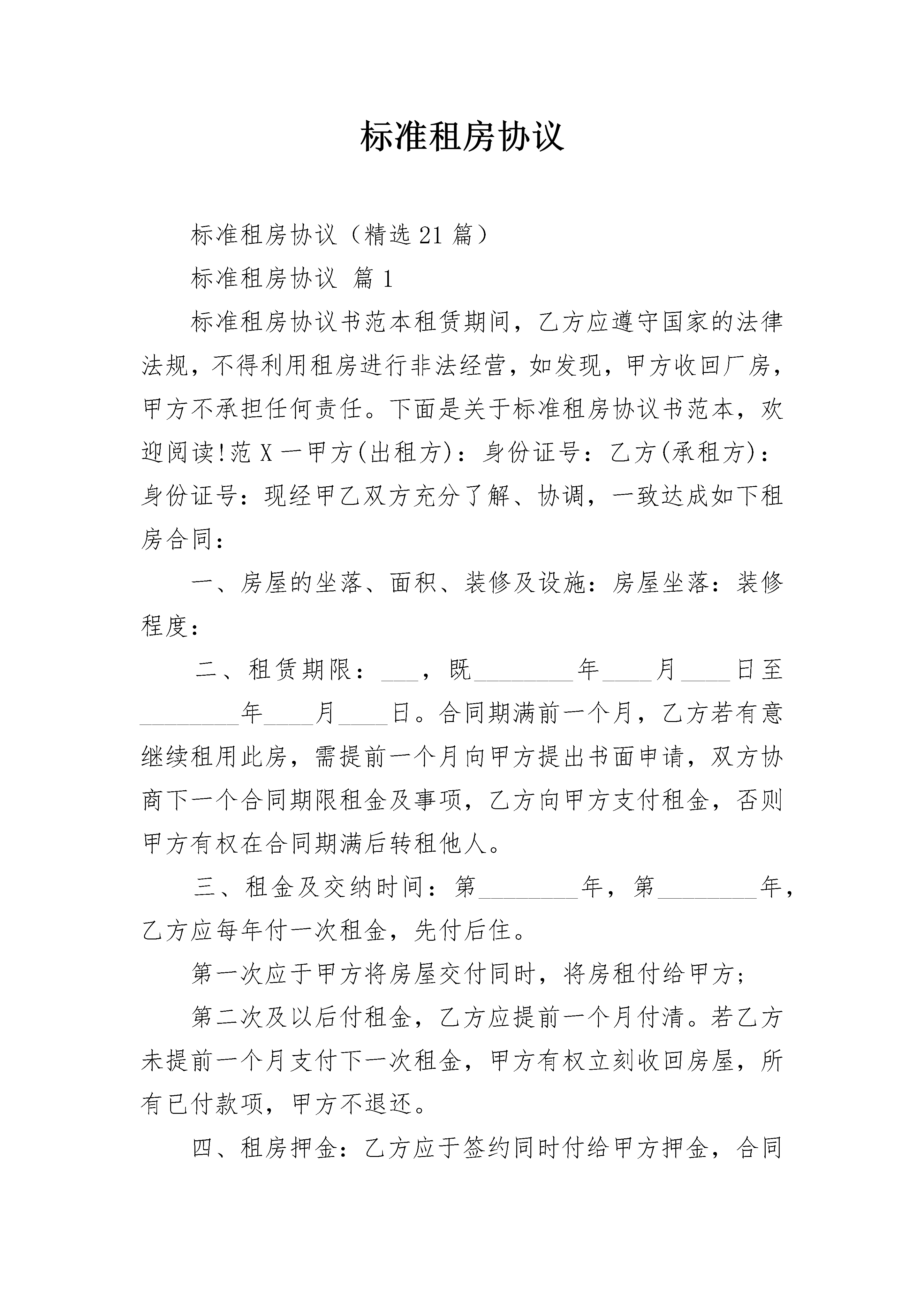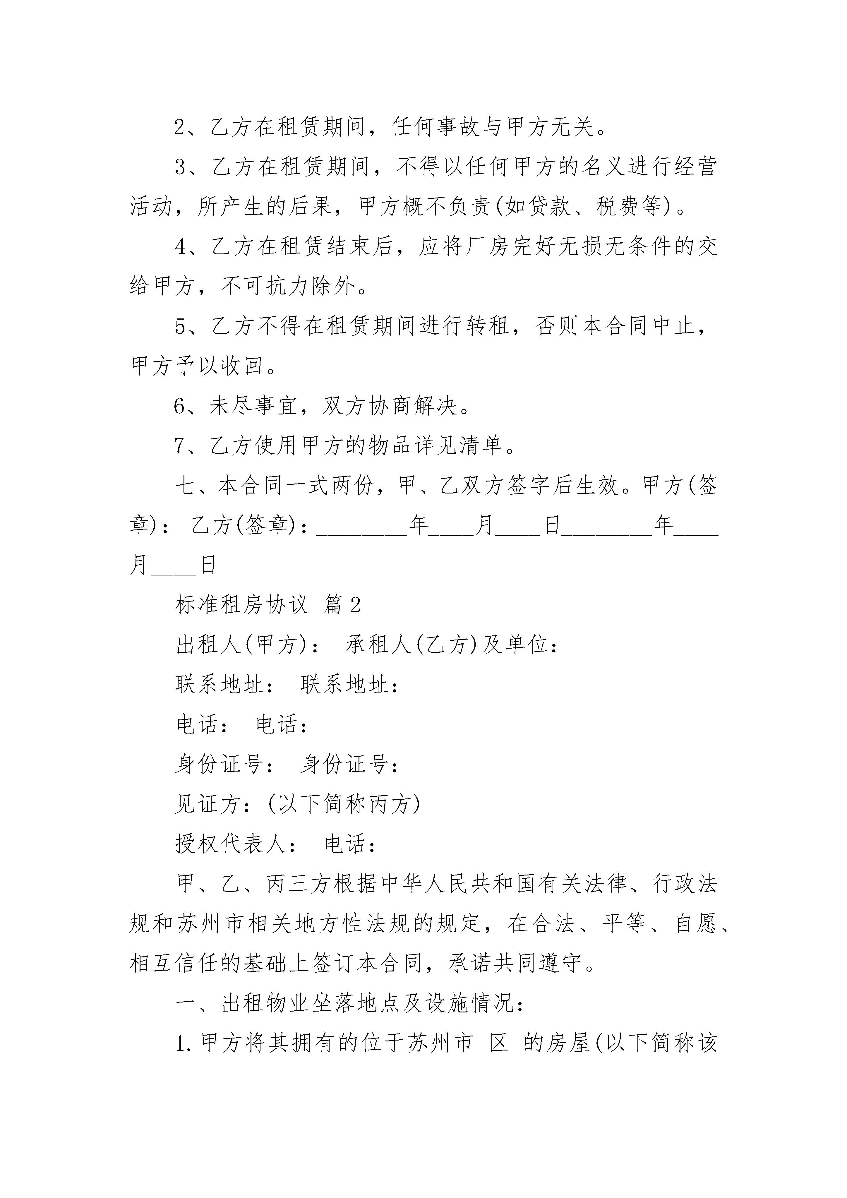 标准租房协议标准租房协议(精选21篇)标准租房协议篇1标准租房协议书范本租赁期间,乙方应遵守国家的法律法规,不得利用租房进行非法经营,如发现,甲方收回厂房,甲方不承担任何责任。下面是关于标准租房协议书范本,欢迎阅读!范X一甲方(出租方):身份证号:乙方(承租方):身份证号:现经甲乙双方充分了解、协调,一致达成如下租房合同:一、房屋的坐落、面积、装修及设施:房屋坐落:装修程度:二、租赁期限:___,既________年____月____日至________年____月____日。合同期满前一个月,乙方若有意继续租用此房,需提前一个月向甲方提出书面申请,双方协商下一个合同期限租金及事项,乙方向甲方支付租金,否则甲方有权在合同期满后转租他人。三、租金及交纳时间:第________年,第________年,乙方应每年付一次租金,先付后住。第一次应于甲方将房屋交付同时,将房租付给甲方;第二次及以后付租金,乙方应提前一个月付清。若乙方未提前一个月支付下一次租金,甲方有权立刻收回房屋,所有已付款项,甲方不退还。四、租房押金:乙方应于签约同时付给甲方押金,合同期满两个月以后,根据水、电、煤气、电话、网络、有线电视等实际发生费用,剩余款项甲方退还乙方。五、租赁期间的其他约定事项:1、甲方提供完好的房屋、设施、设备,乙方应注意爱护,不得破坏房屋装修、结构及设施、设备,否则应按价赔偿。损坏设备费用从押金中直接扣除。甲方现有设备为:2、水、电、煤气、电话、网络、有线电视等使用费及物业、电梯、卫生费等所有费用都由乙方支付。所有费用乙方应按时付清。若因乙方未能及时缴纳相关费用,所造成的后果由乙方承担。取暖费由甲方承担。3、房屋只限乙方使用,使用此房用途为--不得私自转租、改变使用性质或供非法用途。租下本房后,乙方应立即办好租赁登记、暂住人口登记等手续。若发生扰民事件,乙方自负后果。若乙方租自转租,改变使用性质,或提供非法用途,四方有权立刻收回房屋,不退还乙方剩余租金及押金,同时乙方承担由此带来的一切后果。4、合同一经签定,双方都不得提前解约。租赁期内,如遇不可抗力因素导致无法继续履行本合同的,本合同自然终止,双方互不承担违约责任。此合同未尽事宜,双方可协商解决,并作出补充条款,补充条款与本合同有同等效力。双方如果出现纠纷,先友好协商,协商不能的,由人民法院裁定。5、其他约定事项:室内设施及原有物流如有损坏丢失,请给维修好恢复原样及照价赔偿。六、本合现一式两份,甲乙双方各执一分,签字之日起即日生效。甲方签字:乙方签字:联系电话:联系电话:签约日期:范出租方:(以下简称甲方)承租方:(以下简称乙方)根据国家有关规定,甲乙双方在自愿平等互利的基础上将其合法拥有的厂房出租给乙方使用,就有关事宜双方达成协议,具体条款如下:一、出租厂房:1、甲方将座落在所有厂房厂地租赁给乙方使用。二、租期:1、厂房租赁期限自止,租赁期为________年。2、租赁期满甲方有权收回厂房,乙方应如期归还。如乙方需继续租赁或合同延续,应提前三个月向甲方提出,甲方同意后重新签合同。3、因乙方在经营中需提前解除租赁合同,应提前三个月书面告知甲方,可以解除合同。三、租金支付方式:1、甲、乙双方约定,该厂房租赁金额为每年人民币叁万伍仟元(35000元)整,租赁金额在合同签定之日起付清后本合同方可生效。2、乙方每年都应在____月____日当天付清当年的租金。最多可延长10天。如不付款甲方有权解除合同,收回租赁厂房,对乙方不予补偿。四、厂房使用要求和维修责任:1、租赁期间,如乙方人为损坏应给予修理赔偿。2、乙方自建厂房自行维修管理。3、乙方在租赁期间,甲方的厂内财物代为保管,乙方不承担任何责任。4、乙方在租赁结束后,清理完自建的建筑物,恢复原貌。5、乙方在租赁期满后,属乙方投资的厂房、机械及其它附属设施属乙方所有。如不租所有财产应清除出厂,否则甲方有权处理。6、租赁期间,乙方发现该厂房及附属设施非乙方损坏或故障时,应及时通知甲方修复,甲方应在接到乙方通知后____日内进行维修,逾期不维修,乙方可代为维修,费用甲方承担。五、厂房的出租及归还:1、租赁期间,乙方应遵守国家的法律法规,不得利用厂房进行非法经营,如发现,甲方收回厂房,甲方不承担任何责任。2、租赁期间厂房因政策动迁、修路及其它行为,赔偿款属甲方投资的.厂房厂地属甲方所有。属乙方投资的厂房机械及生产损失由乙方所有。3、租赁期间,乙方可根据自己的经营特点进行装修。但不能破坏原貌及主体结构,所产生的费用由乙方自行承担。4、乙方应给甲方留出间房屋放置机械设备。六、其它条款:1、乙方在租赁期间的所有债权债务与甲方无关。2、乙方在租赁期间,任何事故与甲方无关。3、乙方在租赁期间,不得以任何甲方的名义进行经营活动,所产生的后果,甲方概不负责(如贷款、