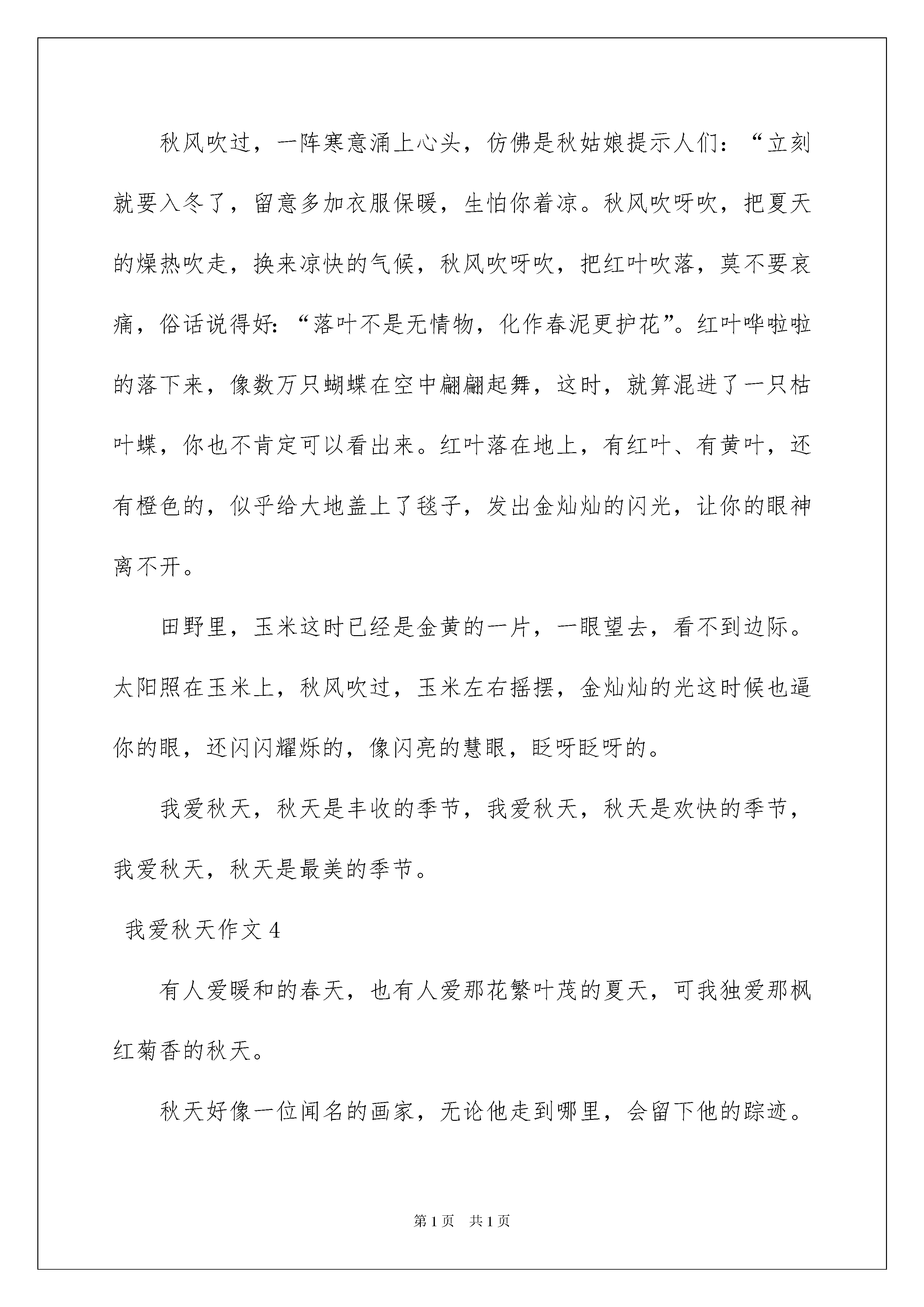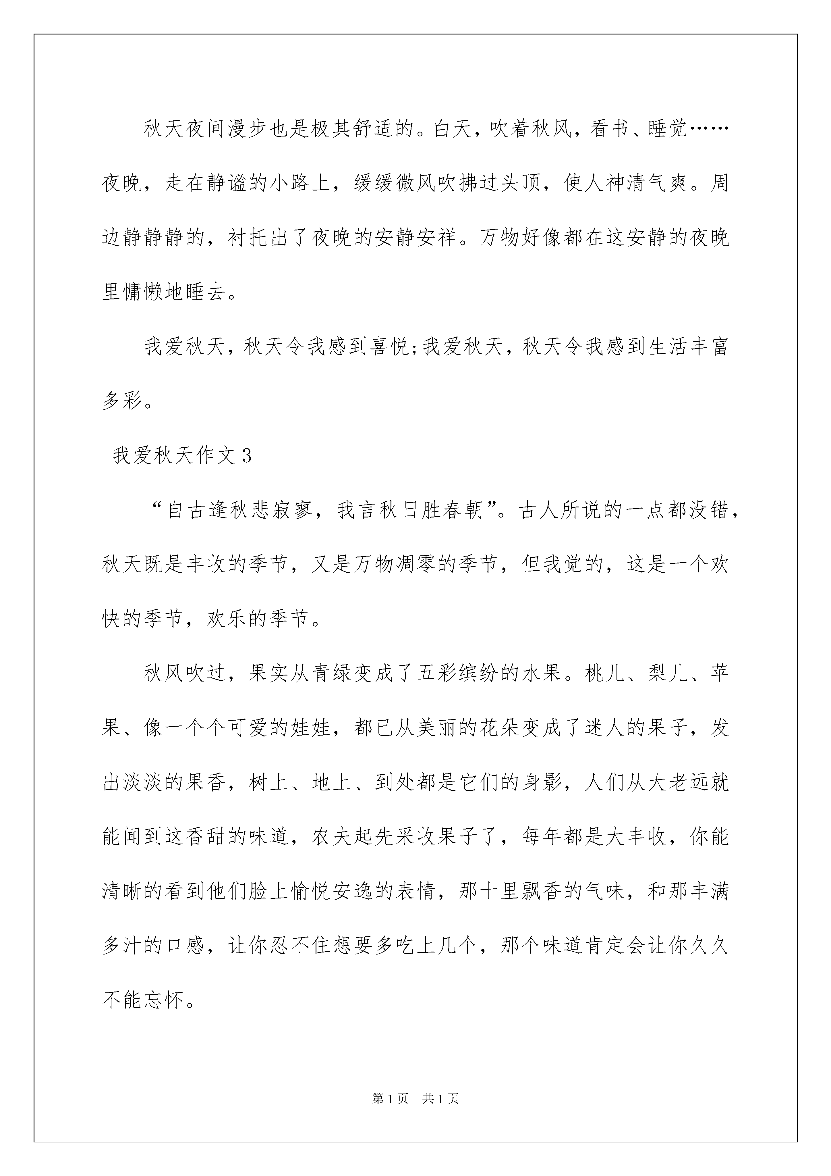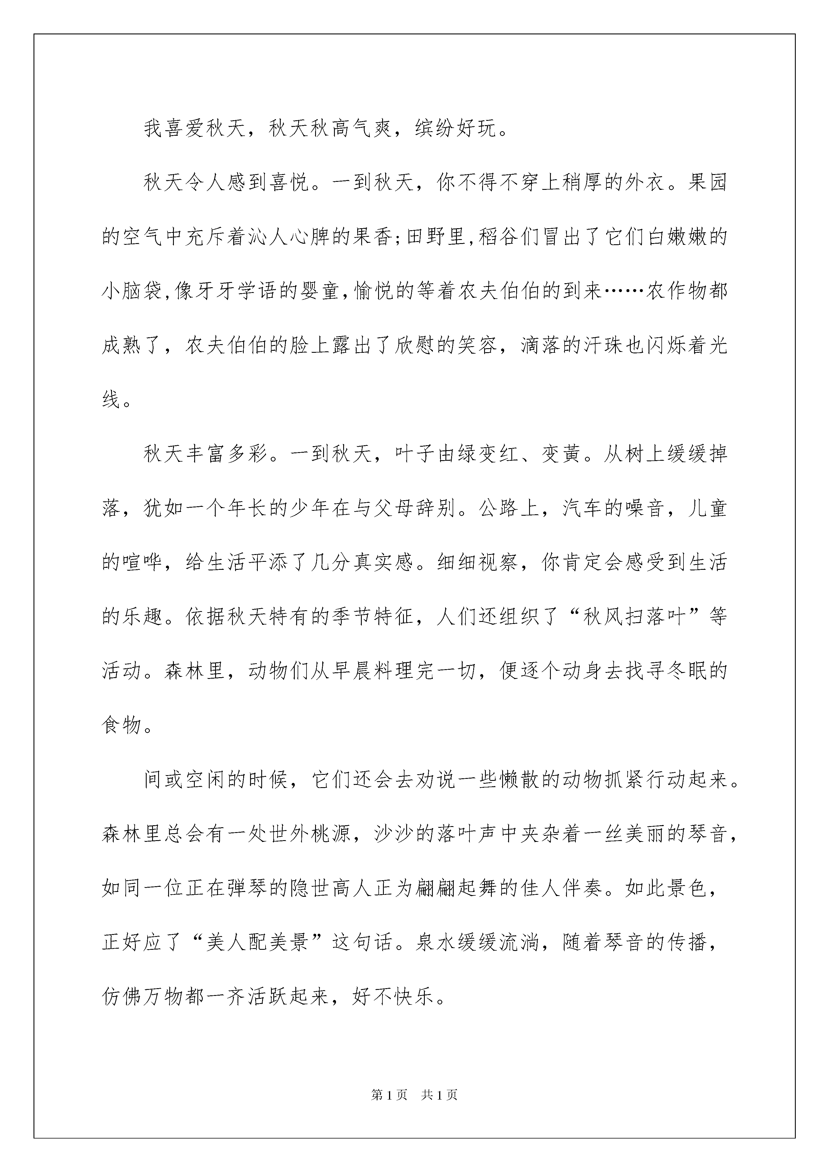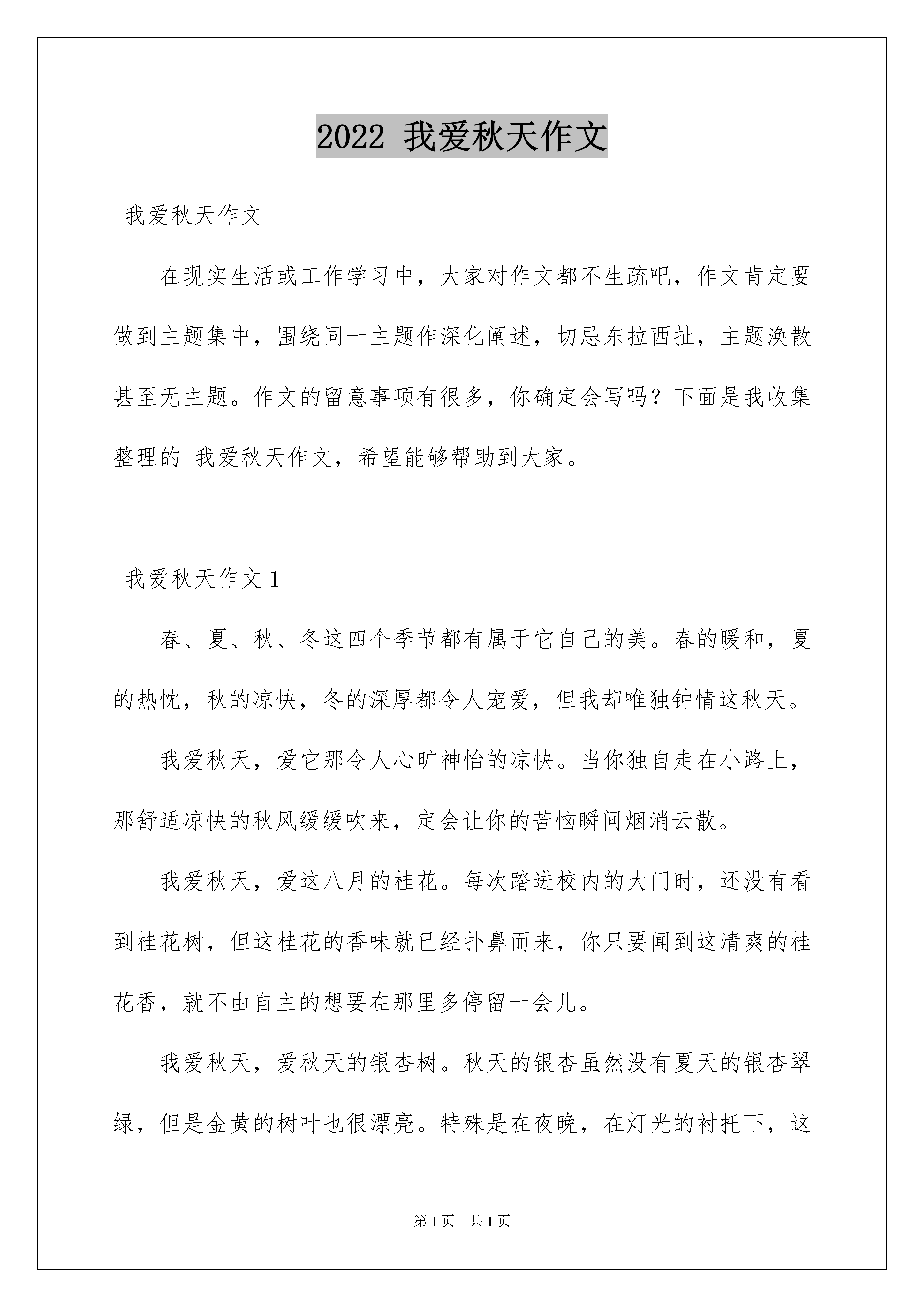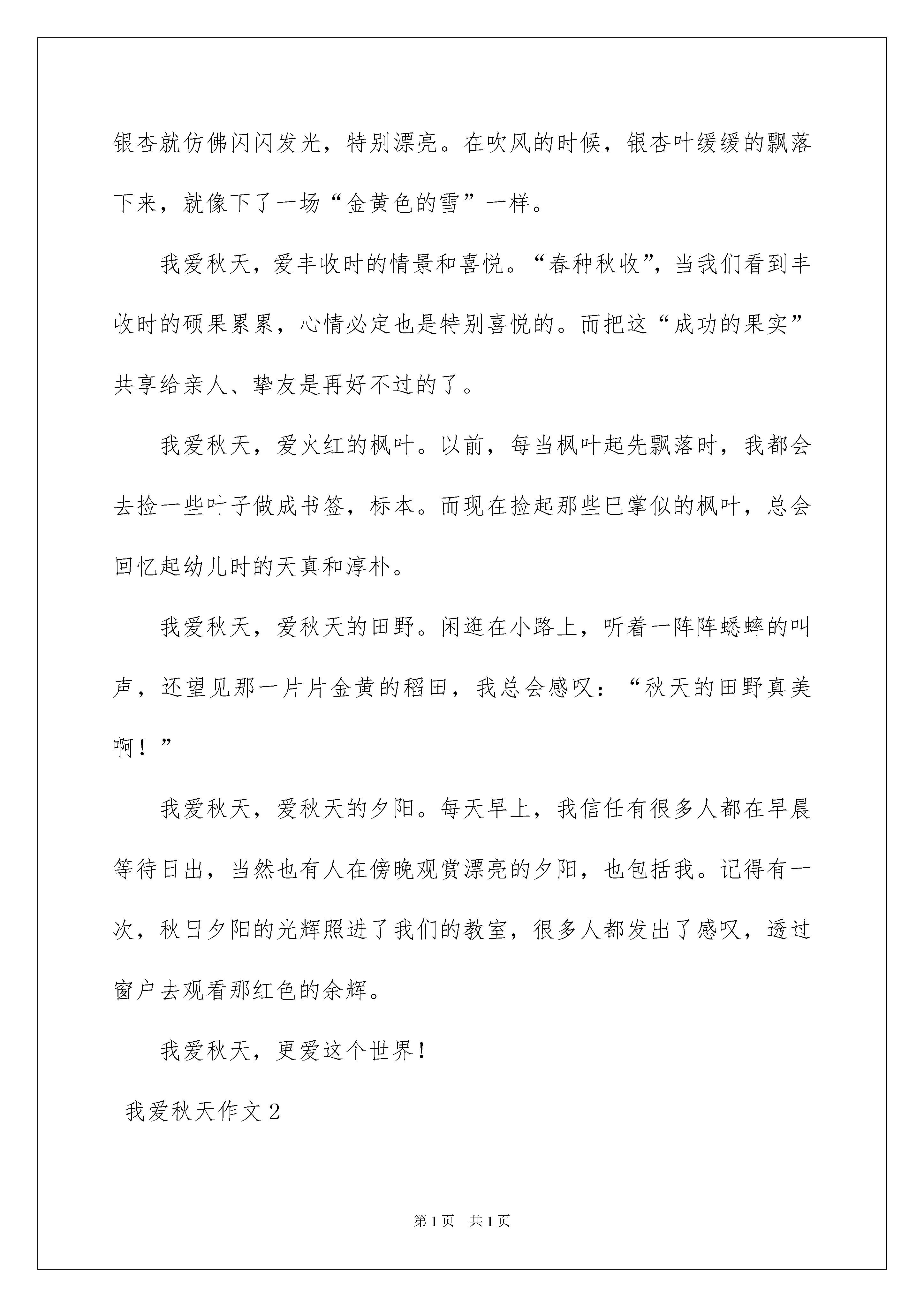 2022我爱秋天作文我爱秋天作文在现实生活或工作学习中,大家对作文都不生疏吧,作文肯定要做到主题集中,围绕同一主题作深化阐述,切忌东拉西扯,主题涣散甚至无主题。作文的留意事项有很多,你确定会写吗?下面是我收集整理的我爱秋天作文,希望能够帮助到大家。我爱秋天作文1春、夏、秋、冬这四个季节都有属于它自己的美。春的暖和,夏的热忱,秋的凉快,冬的深厚都令人宠爱,但我却唯独钟情这秋天。我爱秋天,爱它那令人心旷神怡的凉快。当你独自走在小路上,那舒适凉快的秋风缓缓吹来,定会让你的苦恼瞬间烟消云散。我爱秋天,爱这八月的桂花。每次踏进校内的大门时,还没有看到桂花树,但这桂花的香味就已经扑鼻而来,你只要闻到这清爽的桂花香,就不由自主的想要在那里多停留一会儿。我爱秋天,爱秋天的银杏树。秋天的银杏虽然没有夏天的银杏翠绿,但是金黄的树叶也很漂亮。特殊是在夜晚,在灯光的衬托下,这银杏就仿佛闪闪发光,特别漂亮。在吹风的时候,银杏叶缓缓的飘落下来,就像下了一场“金黄色的雪”一样。我爱秋天,爱丰收时的情景和喜悦。“春种秋收”,当我们看到丰收时的硕果累累,心情必定也是特别喜悦的。而把这“成功的果实”共享给亲人、挚友是再好不过的了。我爱秋天,爱火红的枫叶。以前,每当枫叶起先飘落时,我都会去捡一些叶子做成书签,标本。而现在捡起那些巴掌似的枫叶,总会回忆起幼儿时的天真和淳朴。我爱秋天,爱秋天的田野。闲逛在小路上,听着一阵阵蟋蟀的叫声,还望见那一片片金黄的稻田,我总会感叹:“秋天的田野真美啊!”我爱秋天,爱秋天的夕阳。每天早上,我信任有很多人都在早晨等待日出,当然也有人在傍晚观赏漂亮的夕阳,也包括我。记得有一次,秋日夕阳的光辉照进了我们的教室,很多人都发出了感叹,透过窗户去观看那红色的余辉。我爱秋天,更爱这个世界!我爱秋天作文2我喜爱秋天,秋天秋高气爽,缤纷好玩。秋天令人感到喜悦。一到秋天,你不得不穿上稍厚的外衣。果园的空气中充斥着沁人心脾的果香;田野里,稻谷们冒出了它们白嫩嫩的小脑袋,像牙牙学语的婴童,愉悦的等着农夫伯伯的到来……农作物都成熟了,农夫伯伯的脸上露出了欣慰的笑容,滴落的汗珠也闪烁着光线。秋天丰富多彩。一到秋天,叶子由绿变红、变黃。从树上缓缓掉落,犹如一个年长的少年在与父母辞别。公路上,汽车的噪音,儿童的喧哗,给生活平添了几分真实感。细细视察,你肯定会感受到生活的乐趣。依据秋天特有的季节特征,人们还组织了“秋风扫落叶”等活动。森林里,动物们从早晨料理完一切,便逐个动身去找寻冬眠的食物。间或空闲的时候,它们还会去劝说一些懒散的动物抓紧行动起来。森林里总会有一处世外桃源,沙沙的落叶声中夹杂着一丝美丽的琴音,如同一位正在弾琴的隐世高人正为翩翩起舞的佳人伴奏。如此景色,正好应了“美人配美景”这句话。泉水缓缓流淌,随着琴音的传播,仿佛万物都一齐活跃起来,好不快乐。秋天夜间漫步也是极其舒适的。白天,吹着秋风,看书、睡觉……夜晚,走在静谧的小路上,缓缓微风吹拂过头顶,使人神清气爽。周边静静静的,衬托出了夜晚的安静安祥。万物好像都在这安静的夜晚里慵懒地睡去。我爱秋天,秋天令我感到喜悦;我爱秋天,秋天令我感到生活丰富多彩。我爱秋天作文3“自古逢秋悲寂寥,我言秋日胜春朝”。古人所说的一点都没错,秋天既是丰收的季节,又是万物凋零的季节,但我觉的,这是一个欢快的季节,欢乐的季节。秋风吹过,果实从青绿变成了五彩缤纷的水果。桃儿、梨儿、苹果、像一个个可爱的娃娃,都已从美丽的花朵变成了迷人的果子,发出淡淡的果香,树上、地上、到处都是它们的身影,人们从大老远就能闻到这香甜的味道,农夫起先采收果子了,每年都是大丰收,你能清晰的看到他们脸上愉悦安逸的表情,那十里飘香的气味,和那丰满多汁的口感,让你忍不住想要多吃上几个,那个味道肯定会让你久久不能忘怀。秋风吹过,一阵寒意涌上心头,仿佛是秋姑娘提示人们:“立刻就要入冬了,留意多加衣服保暖,生怕你着凉。秋风吹呀吹,把夏天的燥热吹走,换来凉快的气候,秋风吹呀吹,把红叶吹落,莫不要哀痛,俗话说得好:“落叶不是无情物,化作春泥更护花”。红叶哗啦啦的落下来,像数万只蝴蝶在空中翩翩起舞,这时,就算混进了一只枯叶蝶,你也不肯定可以看出来。红叶落在地上,有红叶、有黄叶,还有橙色的,似乎给大地盖上了毯子,发出金灿灿的闪光,让你的眼神离不开。田野里,玉米这时已经是金黄的一片,一眼望去,看不到边际。太阳照在玉米上,秋风吹过,玉米左右摇摆,金灿灿的光这时候也逼你的眼,还闪闪耀烁的,像闪亮的慧眼,眨呀眨呀的。我爱秋天,秋天是丰收的季节,我爱秋天,秋天是欢快的季节,我爱秋天,秋天是最美的季节。我爱秋天作文4有人爱暖和的