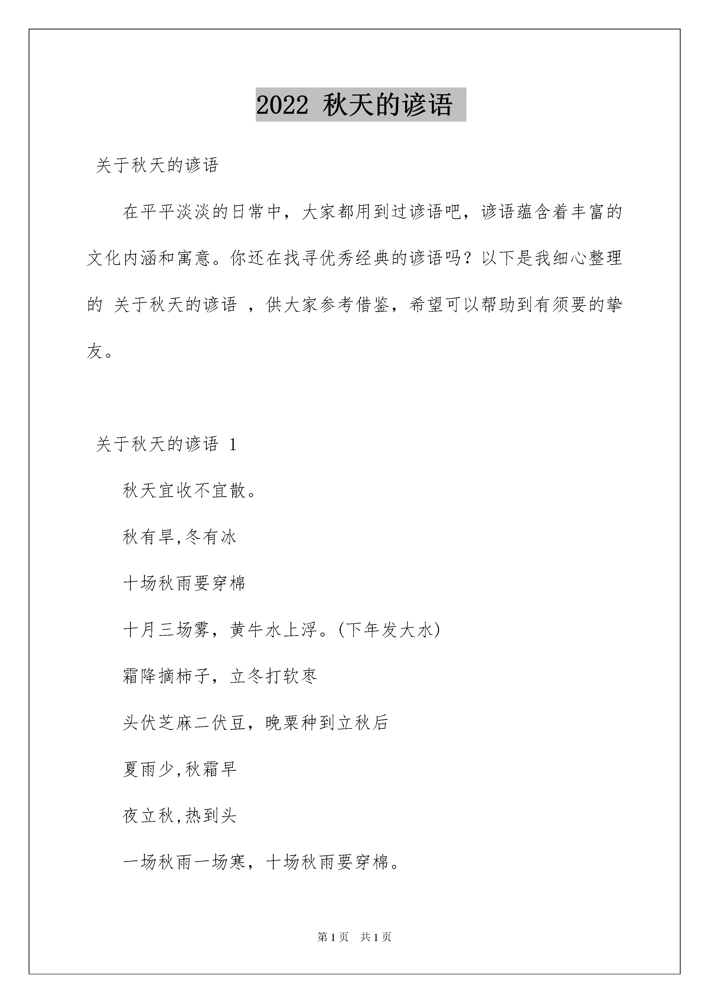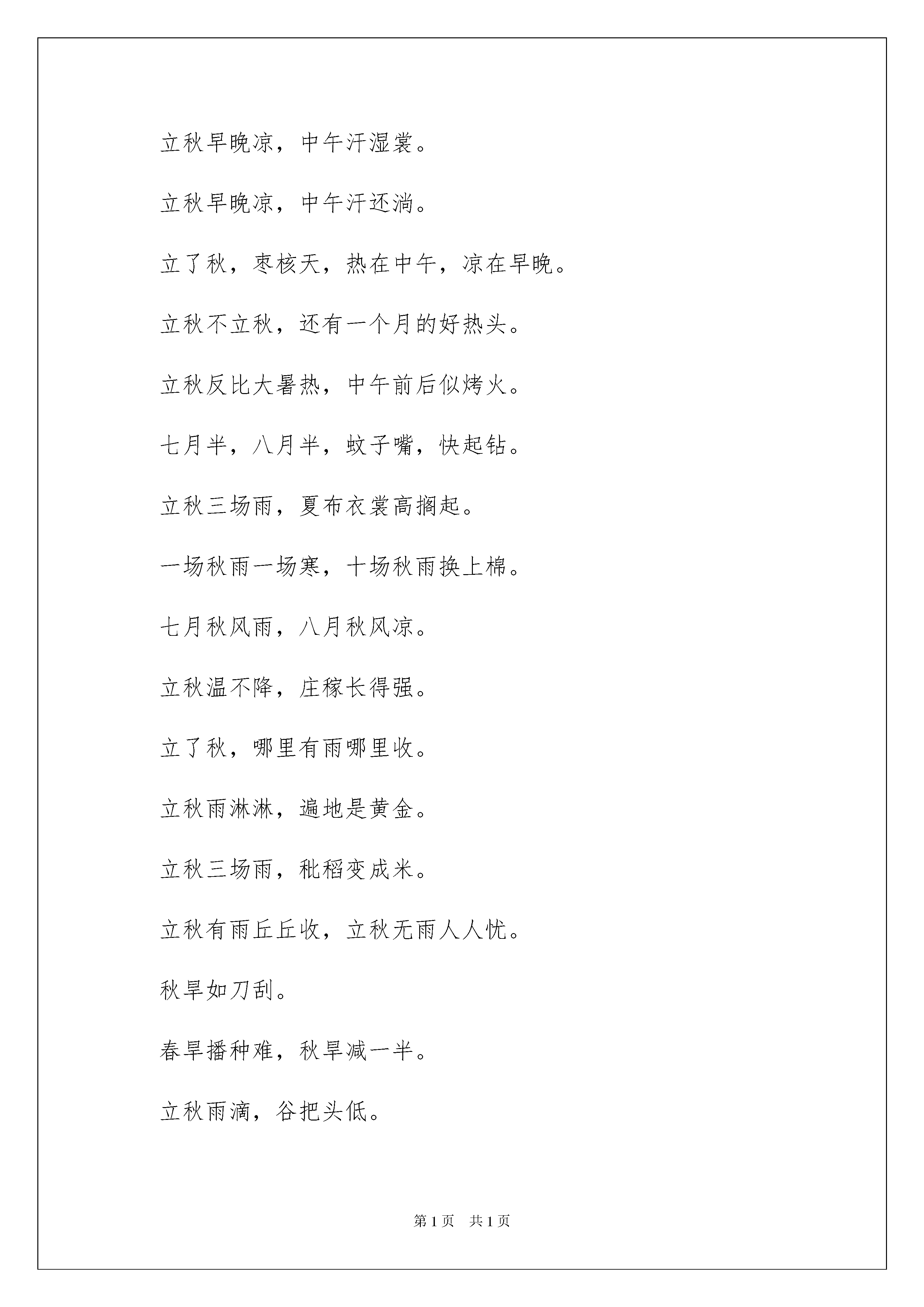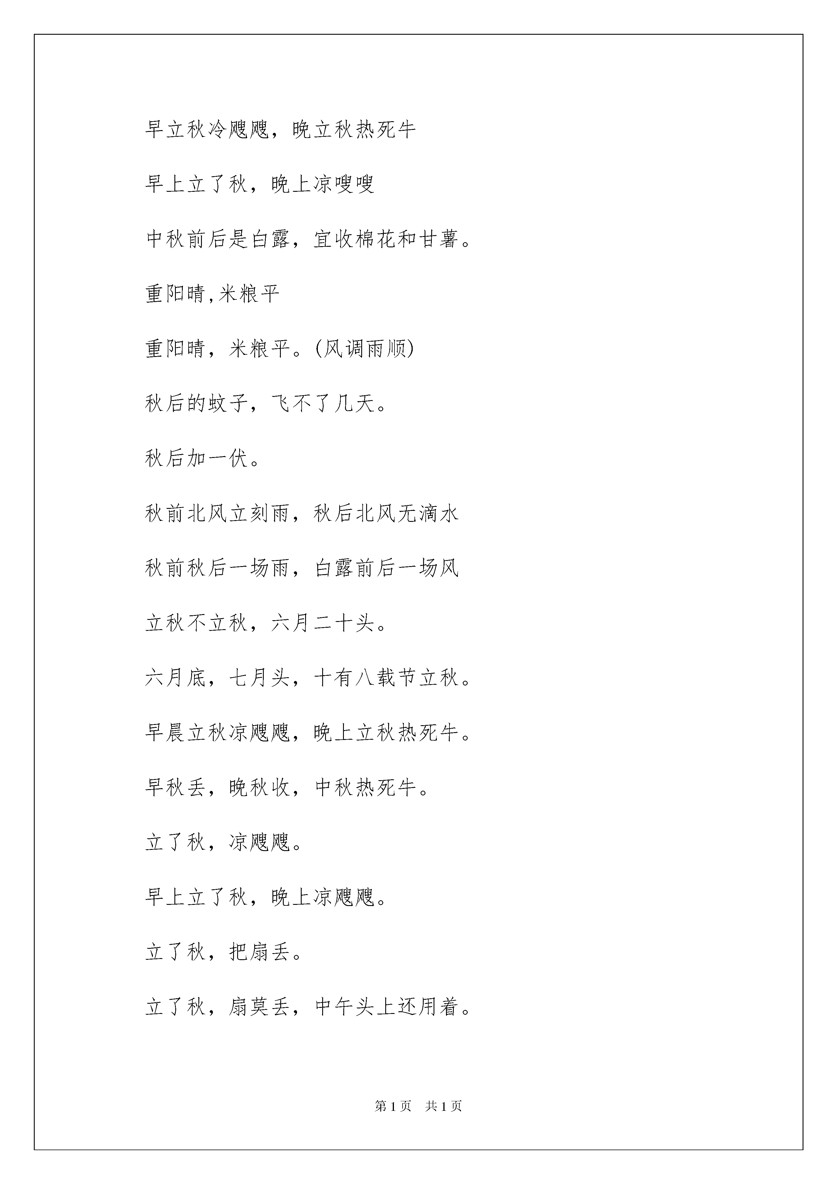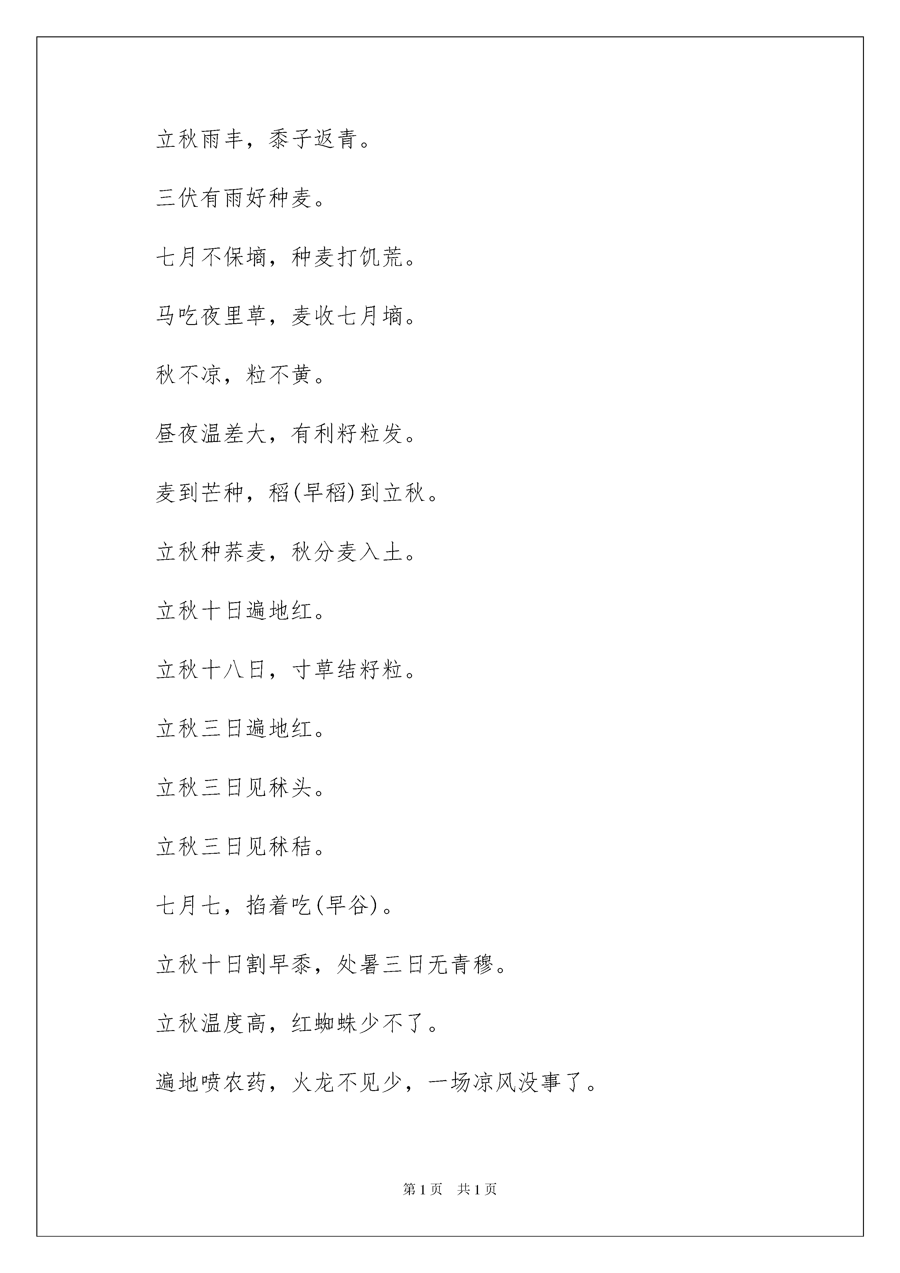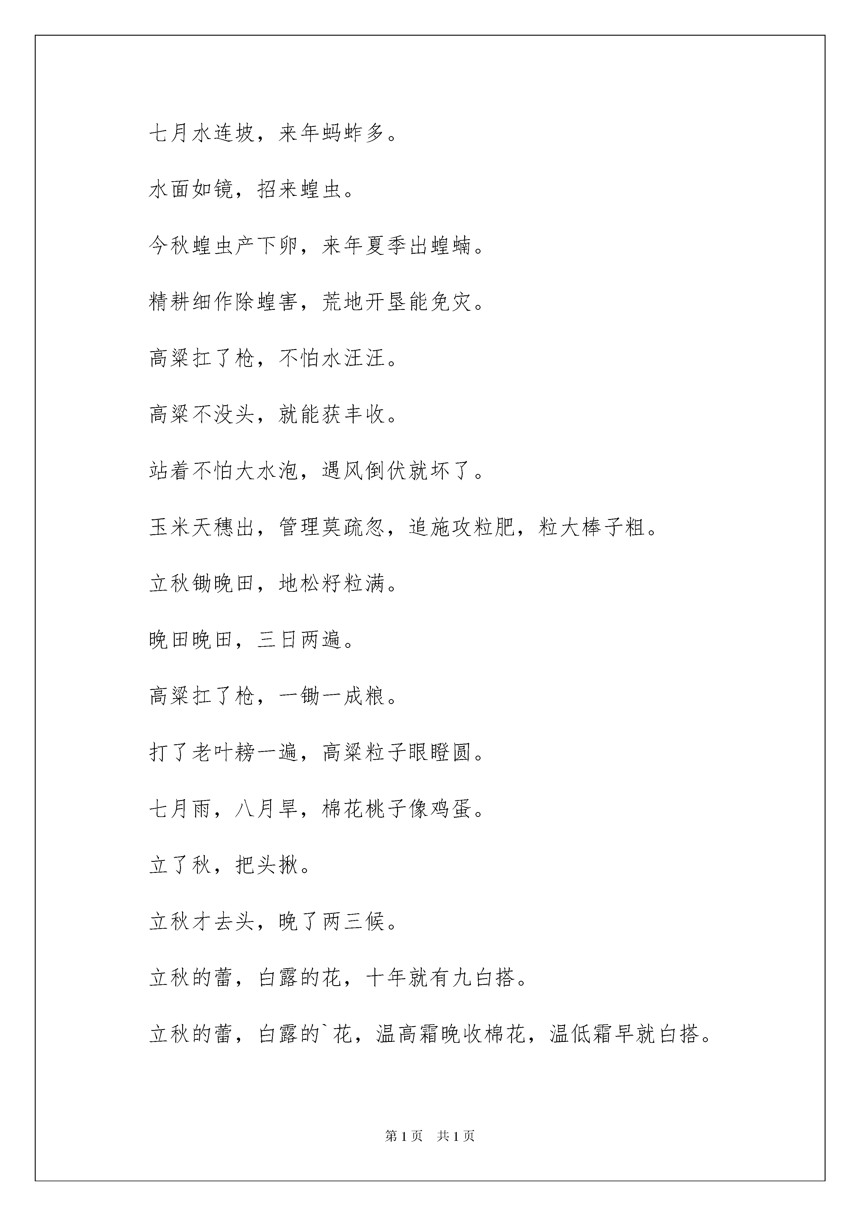 2022秋天的谚语关于秋天的谚语在平平淡淡的日常中,大家都用到过谚语吧,谚语蕴含着丰富的文化内涵和寓意。你还在找寻优秀经典的谚语吗?以下是我细心整理的关于秋天的谚语,供大家参考借鉴,希望可以帮助到有须要的挚友。关于秋天的谚语1秋天宜收不宜散。秋有旱,冬有冰十场秋雨要穿棉十月三场雾,黄牛水上浮。(下年发大水)霜降摘柿子,立冬打软枣头伏芝麻二伏豆,晚粟种到立秋后夏雨少,秋霜早夜立秋,热到头一场秋雨一场寒,十场秋雨要穿棉。早立秋冷飕飕,晚立秋热死牛早上立了秋,晚上凉嗖嗖中秋前后是白露,宜收棉花和甘薯。重阳晴,米粮平重阳晴,米粮平。(风调雨顺)秋后的蚊子,飞不了几天。秋后加一伏。秋前北风立刻雨,秋后北风无滴水秋前秋后一场雨,白露前后一场风立秋不立秋,六月二十头。六月底,七月头,十有八载节立秋。早晨立秋凉飕飕,晚上立秋热死牛。早秋丢,晚秋收,中秋热死牛。立了秋,凉飕飕。早上立了秋,晚上凉飕飕。立了秋,把扇丢。立了秋,扇莫丢,中午头上还用着。立秋早晚凉,中午汗湿裳。立秋早晚凉,中午汗还淌。立了秋,枣核天,热在中午,凉在早晚。立秋不立秋,还有一个月的好热头。立秋反比大暑热,中午前后似烤火。七月半,八月半,蚊子嘴,快起钻。立秋三场雨,夏布衣裳高搁起。一场秋雨一场寒,十场秋雨换上棉。七月秋风雨,八月秋风凉。立秋温不降,庄稼长得强。立了秋,哪里有雨哪里收。立秋雨淋淋,遍地是黄金。立秋三场雨,秕稻变成米。立秋有雨丘丘收,立秋无雨人人忧。秋旱如刀刮。春旱播种难,秋旱减一半。立秋雨滴,谷把头低。立秋雨丰,黍子返青。三伏有雨好种麦。七月不保墒,种麦打饥荒。马吃夜里草,麦收七月墒。秋不凉,粒不黄。昼夜温差大,有利籽粒发。麦到芒种,稻(早稻)到立秋。立秋种荞麦,秋分麦入土。立秋十日遍地红。立秋十八日,寸草结籽粒。立秋三日遍地红。立秋三日见秫头。立秋三日见秫秸。七月七,掐着吃(早谷)。立秋十日割早黍,处暑三日无青穆。立秋温度高,红蜘蛛少不了。遍地喷农药,火龙不见少,一场凉风没事了。七月水连坡,来年蚂蚱多。水面如镜,招来蝗虫。今秋蝗虫产下卵,来年夏季出蝗蝻。精耕细作除蝗害,荒地开垦能免灾。高粱扛了枪,不怕水汪汪。高粱不没头,就能获丰收。站着不怕大水泡,遇风倒伏就坏了。玉米天穗出,管理莫疏忽,追施攻粒肥,粒大棒子粗。立秋锄晚田,地松籽粒满。晚田晚田,三日两遍。高粱扛了枪,一锄一成粮。打了老叶耪一遍,高粱粒子眼瞪圆。七月雨,八月旱,棉花桃子像鸡蛋。立了秋,把头揪。立秋才去头,晚了两三候。立秋的蕾,白露的花,十年就有九白搭。立秋的蕾,白露的`花,温高霜晚收棉花,温低霜早就白搭。秋旱接伏旱,棉田还得灌。棉田再旱,不能漫灌。大背开沟,细水慢流。追肥日期到下限,再向后拖不沾贤(指棉)。氮肥追得多,贪青晚熟光发棵。杈耳接着抹,边心统统掐。边心全部捋,四门落上锁。立秋管葱,快把土壅。要吃葱,高里封。吃辣葱,炕洞壅。要想吃辣葱,得使炕洞壅。六有壅,七月上,八月再看葱发旺。草里的冬瓜,屋脊上的葫芦。姜在地里长,土里要干爽。立秋前,三四天,白菜下种莫拖延。中伏萝卜末伏菜,立秋前后大白菜。立秋种,处暑移,十年就有九不离。立秋播种,处暑移栽,白露晒盘,秋分拢帮,寒露平口,霜降灌心,立冬砍菜。立秋摘花椒,立冬打软枣。七月七,生瓜梨枣都中吃。立了秋,苹果梨子接连揪。立秋温度高,果梨灌浆饱。立秋温度高,果子着色好。果树保好叶,明年多结果。立秋温还高,肥料大积造。牲畜细心管,预防牛流感。牲口棚里勤打扫,一年四季疾病少。喂牲口,没有巧,牛栏马棚勤打扫。立秋处暑温度高,喂鱼留意多投草(料)。发觉鱼病药早用,增产增收有保证。七月菱角八月藕,九月才吃老鸡头(米)。关于秋天的谚语21、八月雷声发,大旱一百八。2、立了秋,便把扇子丢3、立秋晴一日,农夫不用力4、白露身不露,秋后少游水5、立秋荞麦白露花,寒露荞麦收到家。6、立秋胡桃白露梨,寒露柿子红了皮。7、九月九,无事不在河边走。(风大)8、九月九,大夫抄着手,9、立了秋,挂锄钩。10、立秋无雨是空秋,万物历来一半收11、吃了重阳糕,夏衣打成包。12、立了秋,把扇丢。13、九月阴一冬温,九月晴一冬冰。14、不劳医生开处方,秋天萝卜寒人参15、立秋不立秋,六月二十头。16、风风凉凉,晴到重阳。17、秋前北风立刻雨,秋后北风无滴水18、立秋十天遍地黄19、立秋拿住手,还收三五斗20、立秋下雨人快乐,处暑下雨万人愁21、立秋过后,还有‘(秋)老虎’在一头22、萝卜青菜保平安、上床萝卜下床姜23、家家吃萝卜,疾病哪会有!24、白露白茫茫,无被不上床。25、白露节气勿露身,早晚要吩咐26、中秋前后是白露,宜收棉