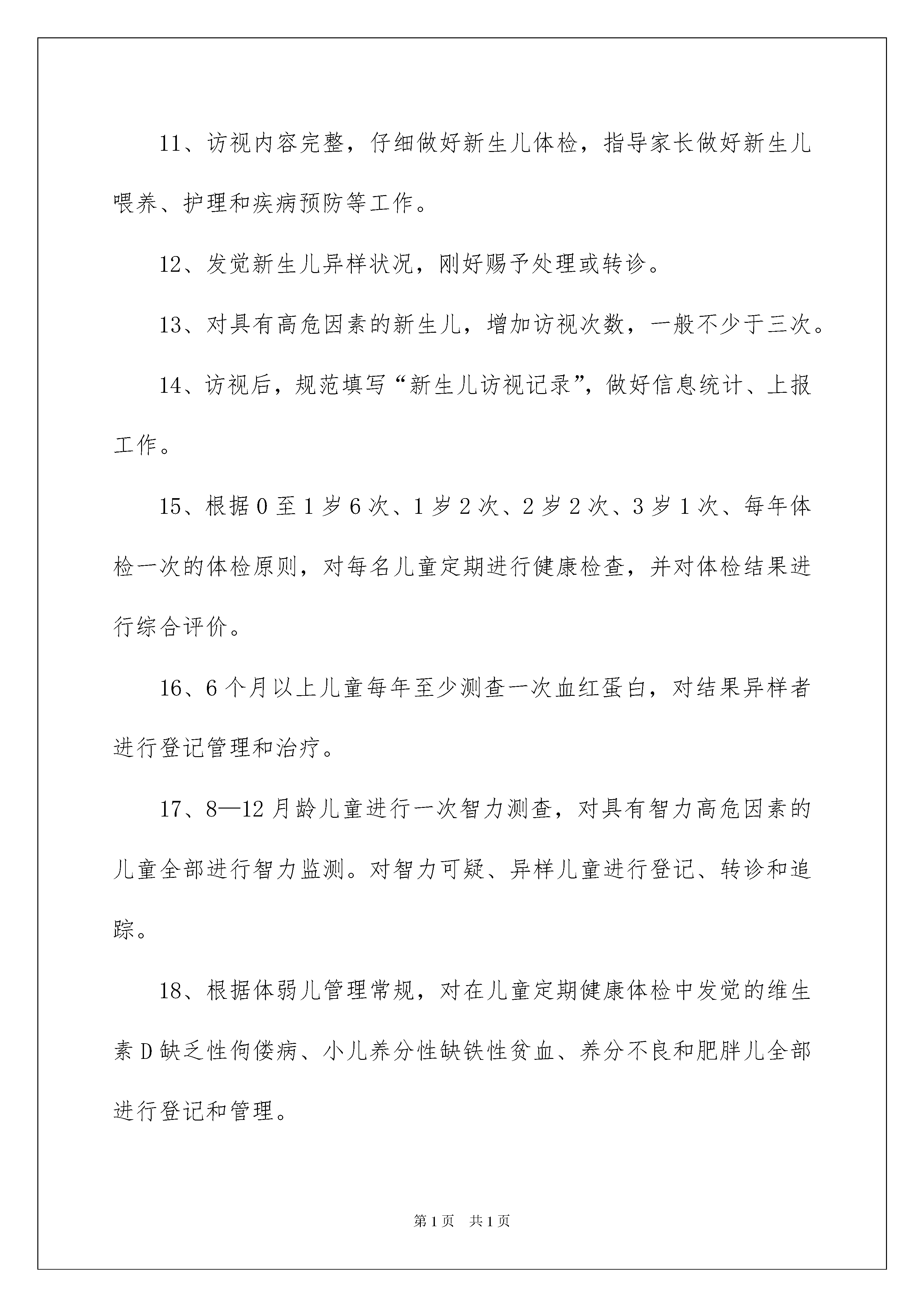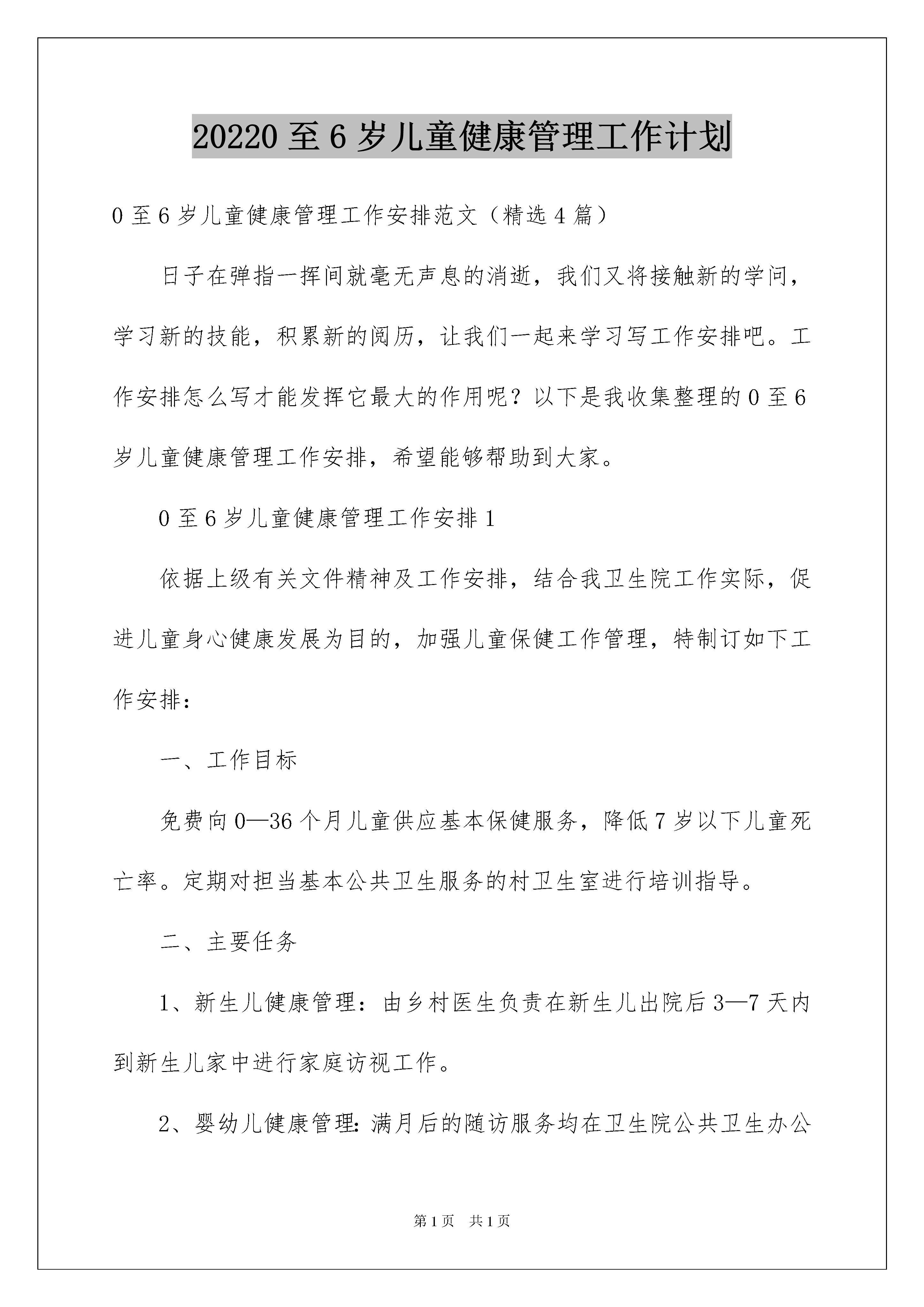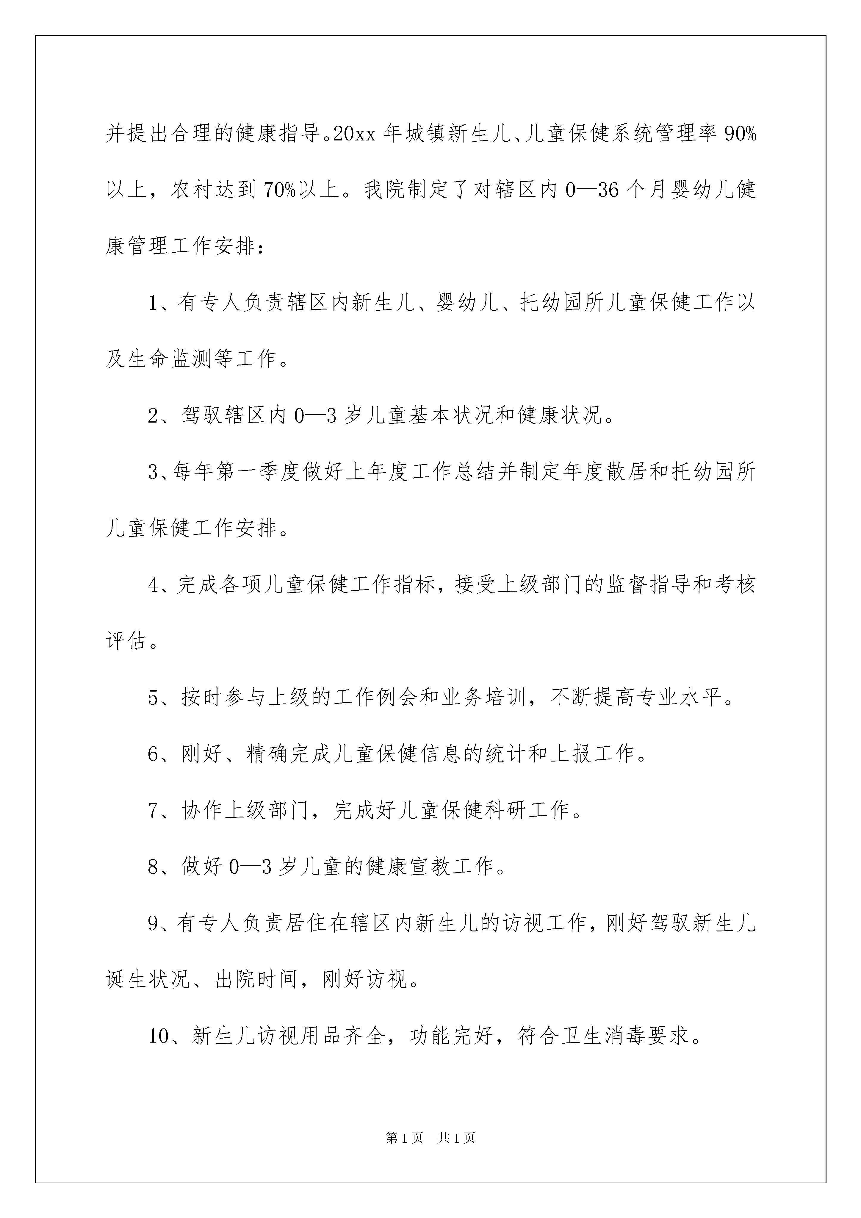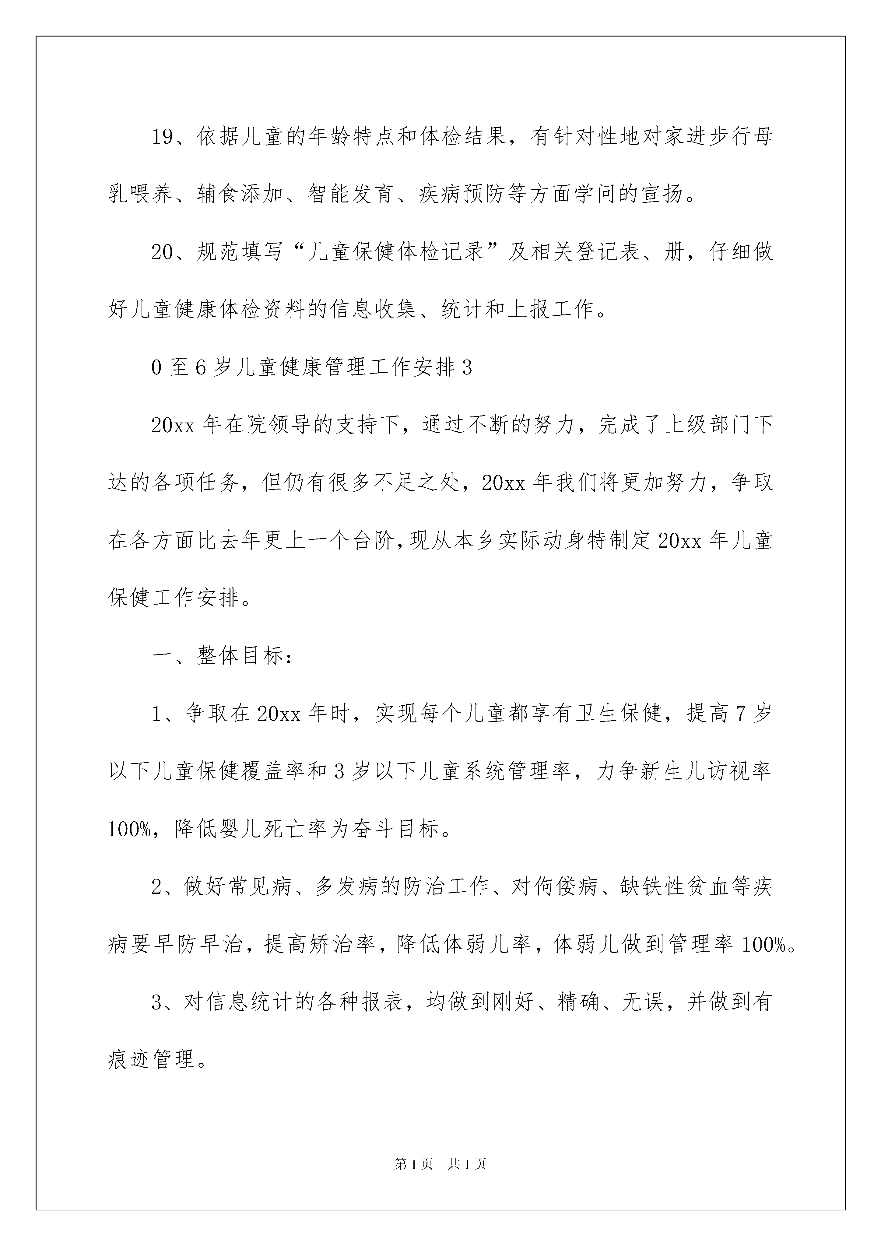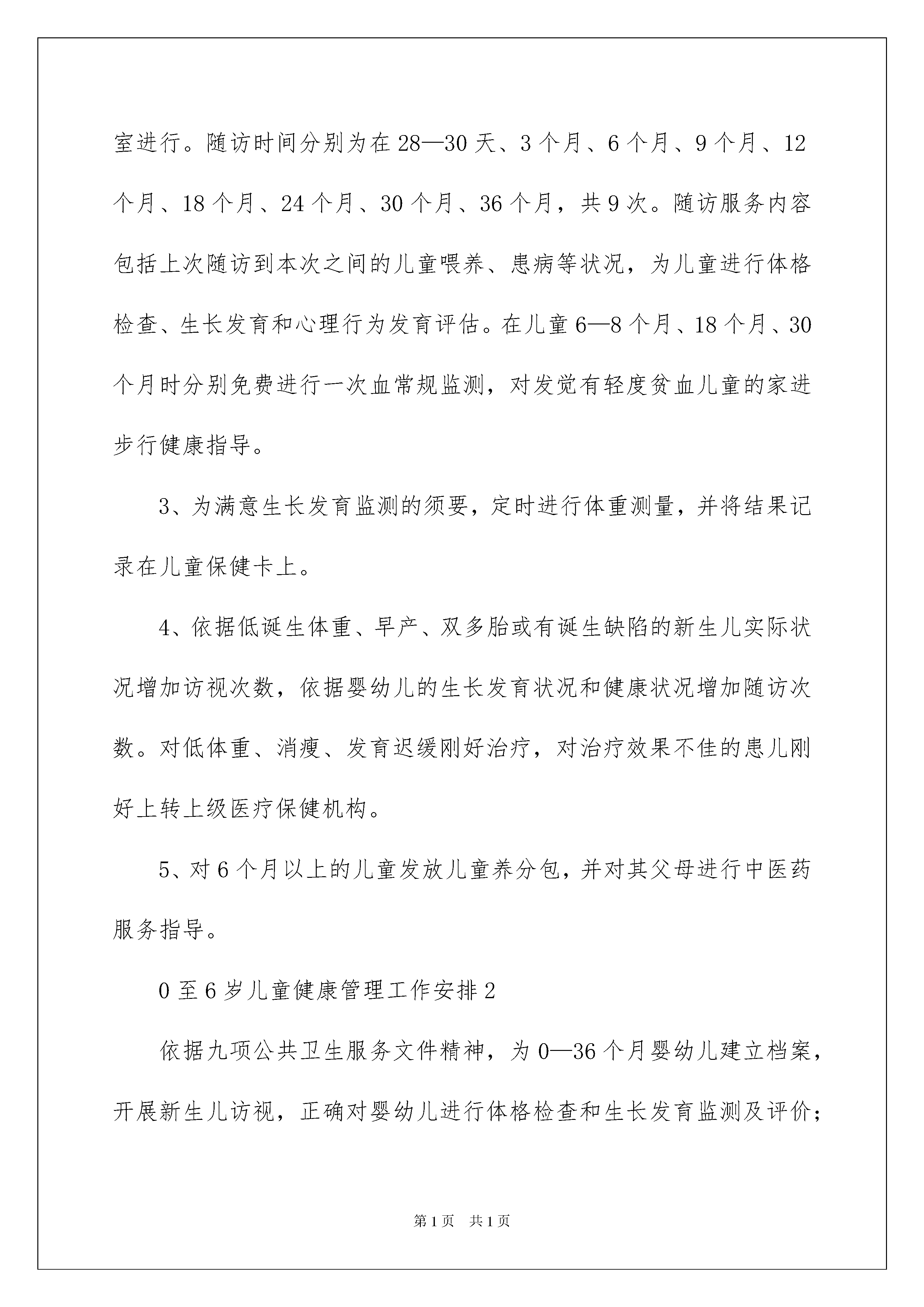 20220至6岁儿童健康管理工作计划0至6岁儿童健康管理工作安排范文(精选4篇)日子在弹指一挥间就毫无声息的消逝,我们又将接触新的学问,学习新的技能,积累新的阅历,让我们一起来学习写工作安排吧。工作安排怎么写才能发挥它最大的作用呢?以下是我收集整理的0至6岁儿童健康管理工作安排,希望能够帮助到大家。0至6岁儿童健康管理工作安排1依据上级有关文件精神及工作安排,结合我卫生院工作实际,促进儿童身心健康发展为目的,加强儿童保健工作管理,特制订如下工作安排:一、工作目标免费向0—36个月儿童供应基本保健服务,降低7岁以下儿童死亡率。定期对担当基本公共卫生服务的村卫生室进行培训指导。二、主要任务1、新生儿健康管理:由乡村医生负责在新生儿出院后3—7天内到新生儿家中进行家庭访视工作。2、婴幼儿健康管理:满月后的随访服务均在卫生院公共卫生办公室进行。随访时间分别为在28—30天、3个月、6个月、9个月、12个月、18个月、24个月、30个月、36个月,共9次。随访服务内容包括上次随访到本次之间的儿童喂养、患病等状况,为儿童进行体格检查、生长发育和心理行为发育评估。在儿童6—8个月、18个月、30个月时分别免费进行一次血常规监测,对发觉有轻度贫血儿童的家进步行健康指导。3、为满意生长发育监测的须要,定时进行体重测量,并将结果记录在儿童保健卡上。4、依据低诞生体重、早产、双多胎或有诞生缺陷的新生儿实际状况增加访视次数,依据婴幼儿的生长发育状况和健康状况增加随访次数。对低体重、消瘦、发育迟缓刚好治疗,对治疗效果不佳的患儿刚好上转上级医疗保健机构。5、对6个月以上的儿童发放儿童养分包,并对其父母进行中医药服务指导。0至6岁儿童健康管理工作安排2依据九项公共卫生服务文件精神,为0—36个月婴幼儿建立档案,开展新生儿访视,正确对婴幼儿进行体格检查和生长发育监测及评价;并提出合理的健康指导。20xx年城镇新生儿、儿童保健系统管理率90%以上,农村达到70%以上。我院制定了对辖区内0—36个月婴幼儿健康管理工作安排:1、有专人负责辖区内新生儿、婴幼儿、托幼园所儿童保健工作以及生命监测等工作。2、驾驭辖区内0—3岁儿童基本状况和健康状况。3、每年第一季度做好上年度工作总结并制定年度散居和托幼园所儿童保健工作安排。4、完成各项儿童保健工作指标,接受上级部门的监督指导和考核评估。5、按时参与上级的工作例会和业务培训,不断提高专业水平。6、刚好、精确完成儿童保健信息的统计和上报工作。7、协作上级部门,完成好儿童保健科研工作。8、做好0—3岁儿童的健康宣教工作。9、有专人负责居住在辖区内新生儿的访视工作,刚好驾驭新生儿诞生状况、出院时间,刚好访视。10、新生儿访视用品齐全,功能完好,符合卫生消毒要求。11、访视内容完整,仔细做好新生儿体检,指导家长做好新生儿喂养、护理和疾病预防等工作。12、发觉新生儿异样状况,刚好赐予处理或转诊。13、对具有高危因素的新生儿,增加访视次数,一般不少于三次。14、访视后,规范填写“新生儿访视记录”,做好信息统计、上报工作。15、根据0至1岁6次、1岁2次、2岁2次、3岁1次、每年体检一次的体检原则,对每名儿童定期进行健康检查,并对体检结果进行综合评价。16、6个月以上儿童每年至少测查一次血红蛋白,对结果异样者进行登记管理和治疗。17、8—12月龄儿童进行一次智力测查,对具有智力高危因素的儿童全部进行智力监测。对智力可疑、异样儿童进行登记、转诊和追踪。18、根据体弱儿管理常规,对在儿童定期健康体检中发觉的维生素D缺乏性佝偻病、小儿养分性缺铁性贫血、养分不良和肥胖儿全部进行登记和管理。19、依据儿童的年龄特点和体检结果,有针对性地对家进步行母乳喂养、辅食添加、智能发育、疾病预防等方面学问的宣扬。20、规范填写“儿童保健体检记录”及相关登记表、册,仔细做好儿童健康体检资料的信息收集、统计和上报工作。0至6岁儿童健康管理工作安排320xx年在院领导的支持下,通过不断的努力,完成了上级部门下达的各项任务,但仍有很多不足之处,20xx年我们将更加努力,争取在各方面比去年更上一个台阶,现从本乡实际动身特制定20xx年儿童保健工作安排。一、整体目标:1、争取在20xx年时,实现每个儿童都享有卫生保健,提高7岁以下儿童保健覆盖率和3岁以下儿童系统管理率,力争新生儿访视率100%,降低婴儿死亡率为奋斗目标。2、做好常见病、多发病的防治工作、对佝偻病、缺铁性贫血等疾病要早防早治,提高矫治率,降低体弱儿率,体弱儿做到管理率100%。3、对信息统计的各种报表,均做到刚好、精确、无误,并做到有痕迹管理。二、