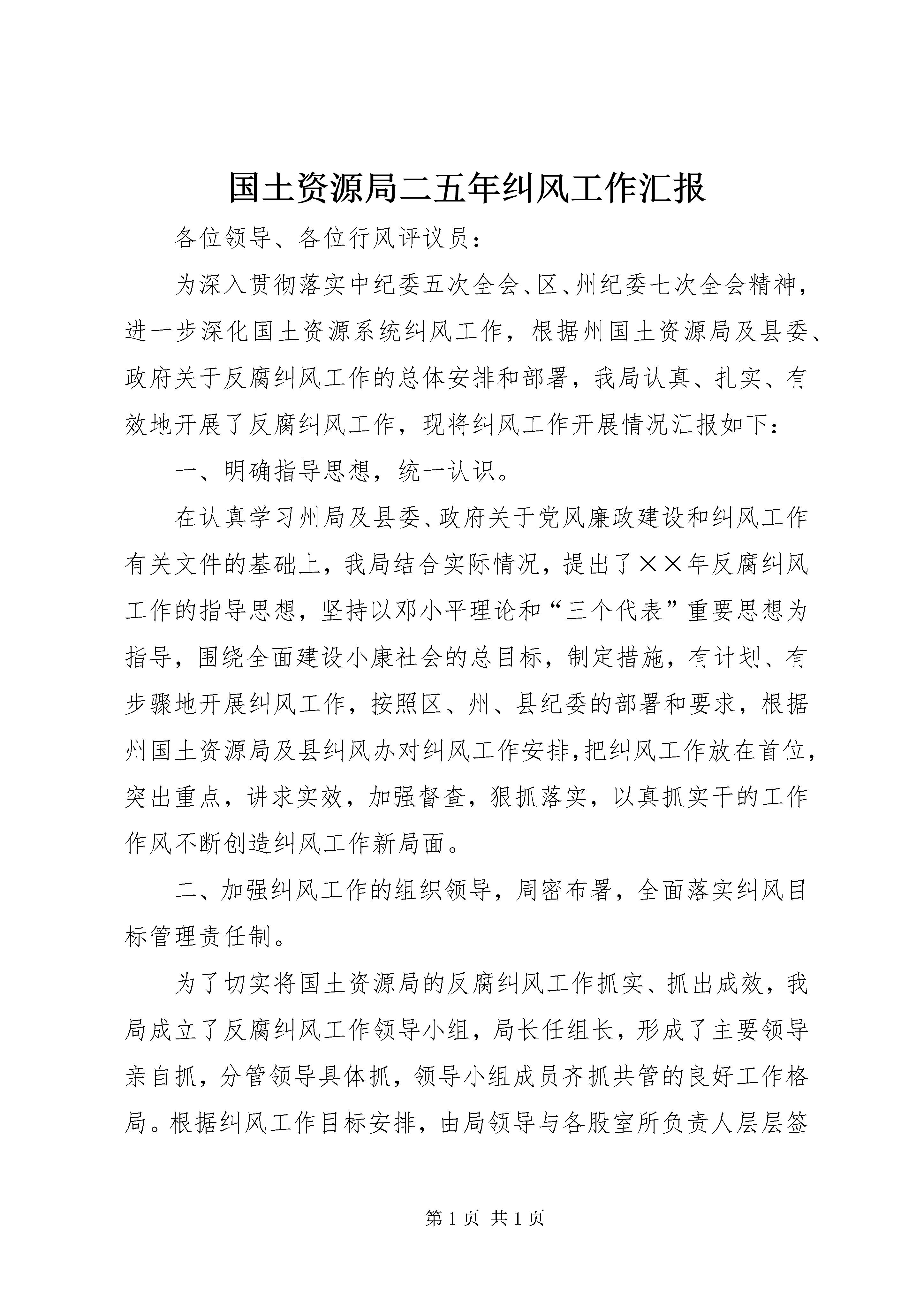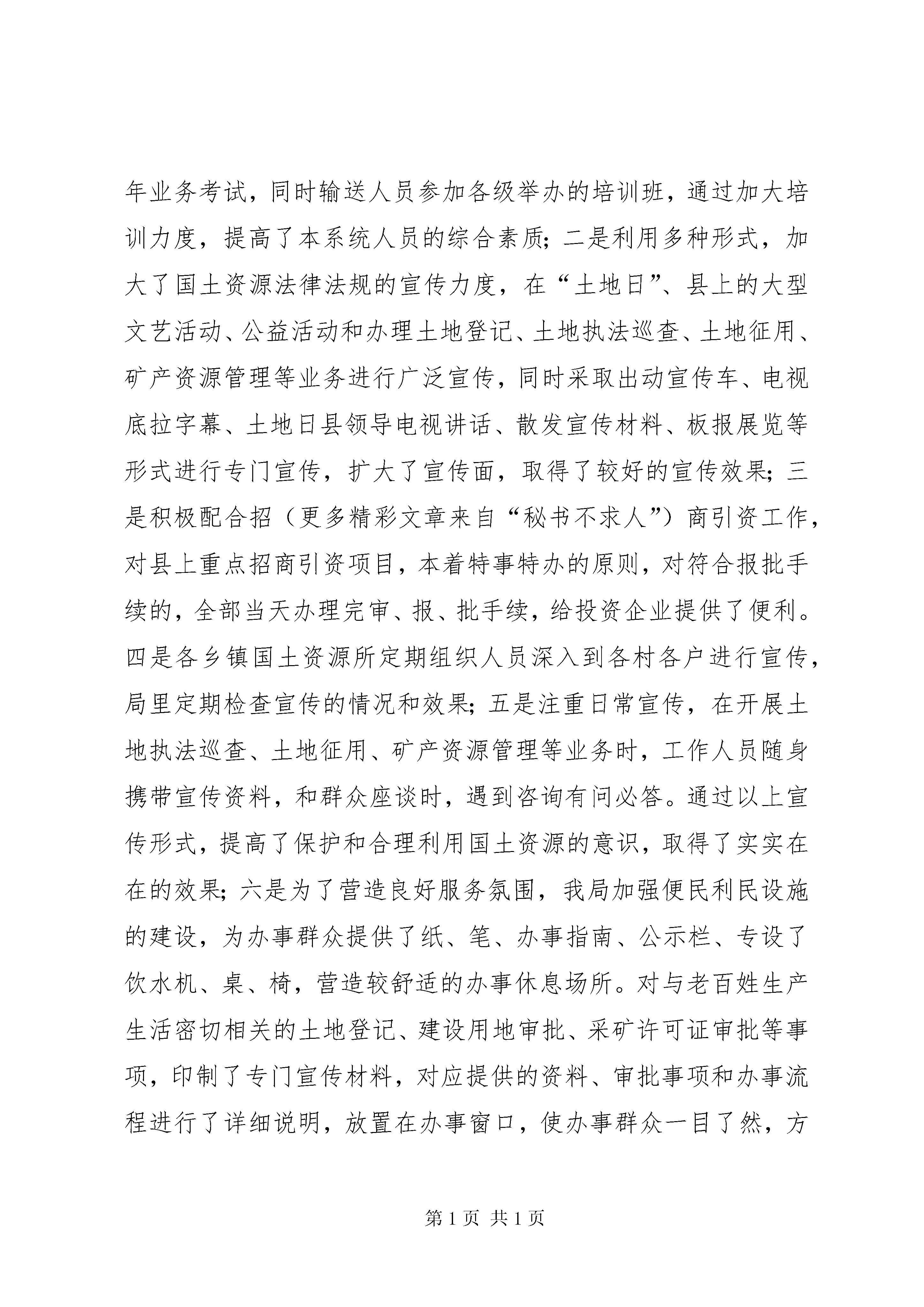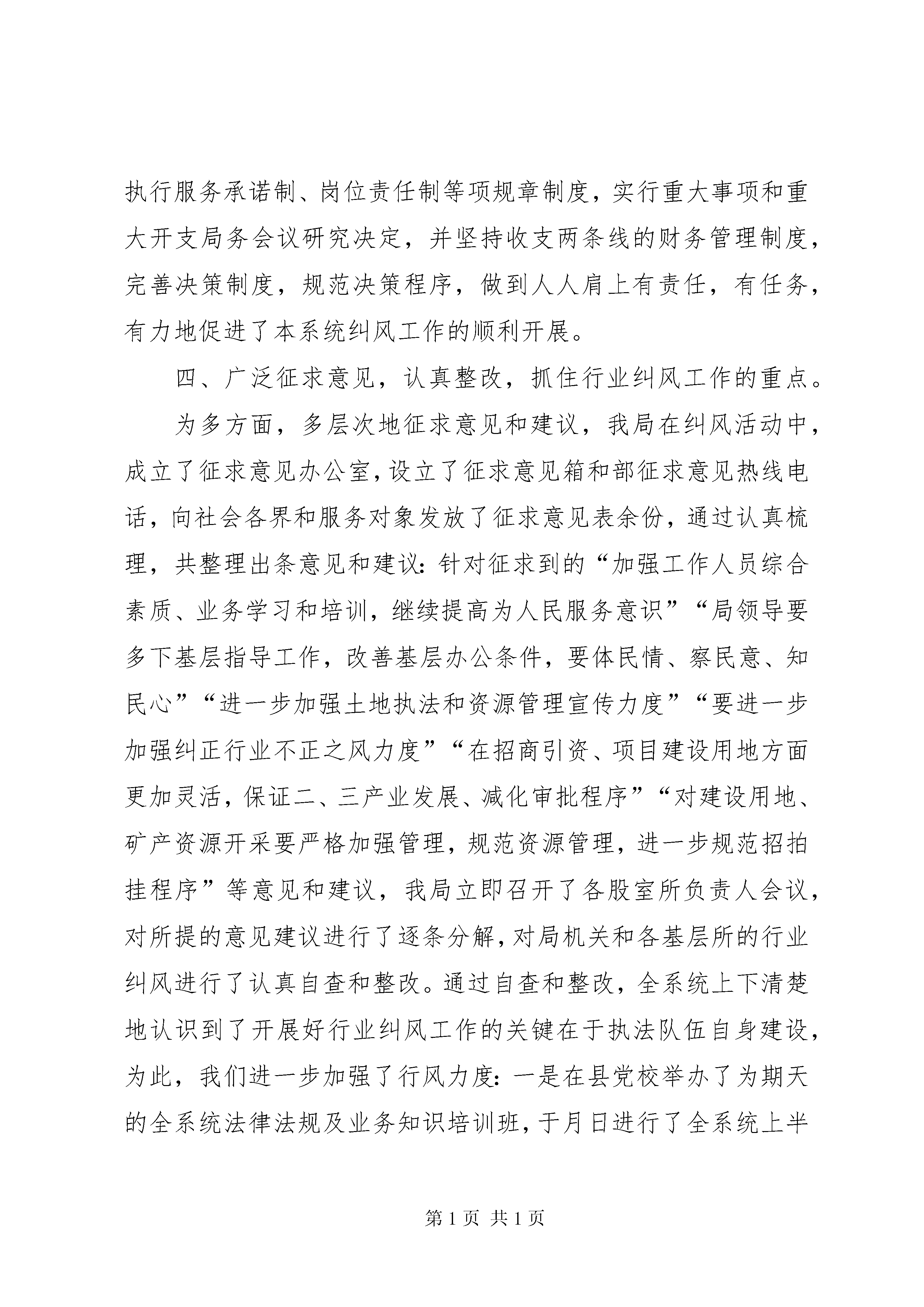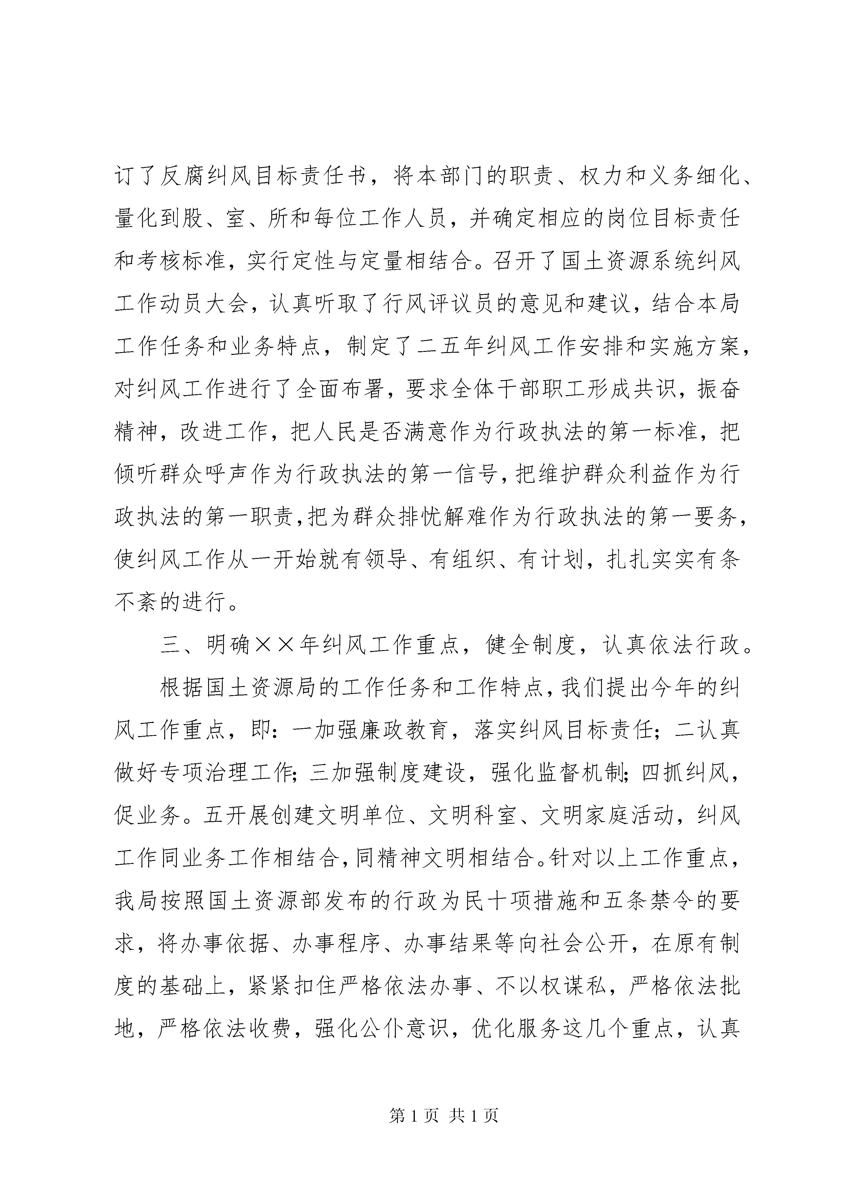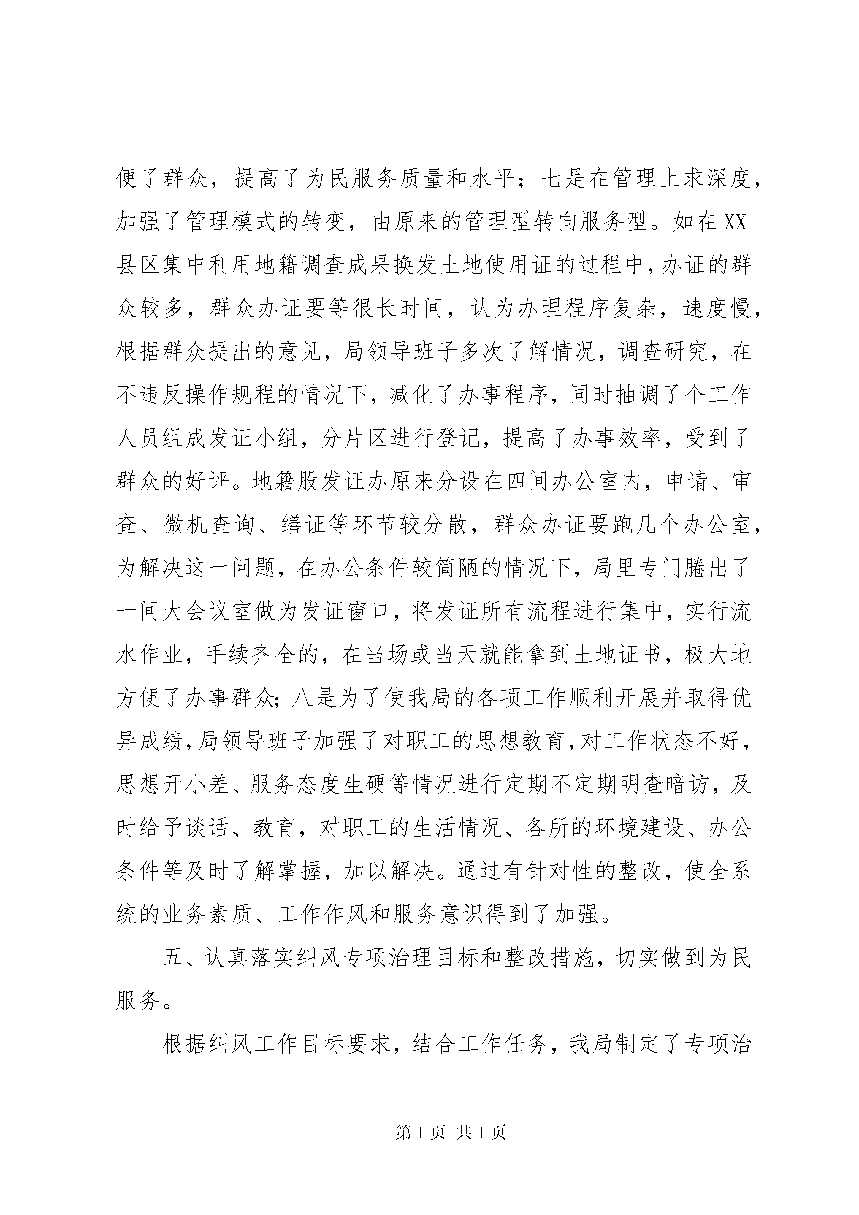 国土资源局二五年纠风工作汇报各位领导、各位行风评议员:为深入贯彻落实中纪委五次全会、区、州纪委七次全会精神,进一步深化国土资源系统纠风工作,根据州国土资源局及县委、政府关于反腐纠风工作的总体安排和部署,我局认真、扎实、有效地开展了反腐纠风工作,现将纠风工作开展情况汇报如下:一、明确指导思想,统一认识。在认真学习州局及县委、政府关于党风廉政建设和纠风工作有关文件的基础上,我局结合实际情况,提出了××年反腐纠风工作的指导思想,坚持以邓小平理论和“三个代表”重要思想为指导,围绕全面建设小康社会的总目标,制定措施,有计划、有步骤地开展纠风工作,按照区、州、县纪委的部署和要求,根据州国土资源局及县纠风办对纠风工作安排,把纠风工作放在首位,突出重点,讲求实效,加强督查,狠抓落实,以真抓实干的工作作风不断创造纠风工作新局面。二、加强纠风工作的组织领导,周密布署,全面落实纠风目标管理责任制。为了切实将国土资源局的反腐纠风工作抓实、抓出成效,我局成立了反腐纠风工作领导小组,局长任组长,形成了主要领导亲自抓,分管领导具体抓,领导小组成员齐抓共管的良好工作格局。根据纠风工作目标安排,由局领导与各股室所负责人层层签订了反腐纠风目标责任书,将本部门的职责、权力和义务细化、量化到股、室、所和每位工作人员,并确定相应的岗位目标责任和考核标准,实行定性与定量相结合。召开了国土资源系统纠风工作动员大会,认真听取了行风评议员的意见和建议,结合本局工作任务和业务特点,制定了二五年纠风工作安排和实施方案,对纠风工作进行了全面布署,要求全体干部职工形成共识,振奋精神,改进工作,把人民是否满意作为行政执法的第一标准,把倾听群众呼声作为行政执法的第一信号,把维护群众利益作为行政执法的第一职责,把为群众排忧解难作为行政执法的第一要务,使纠风工作从一开始就有领导、有组织、有计划,扎扎实实有条不紊的进行。三、明确××年纠风工作重点,健全制度,认真依法行政。根据国土资源局的工作任务和工作特点,我们提出今年的纠风工作重点,即:一加强廉政教育,落实纠风目标责任;二认真做好专项治理工作;三加强制度建设,强化监督机制;四抓纠风,促业务。五开展创建文明单位、文明科室、文明家庭活动,纠风工作同业务工作相结合,同精神文明相结合。针对以上工作重点,我局按照国土资源部发布的行政为民十项措施和五条禁令的要求,将办事依据、办事程序、办事结果等向社会公开,在原有制度的基础上,紧紧扣住严格依法办事、不以权谋私,严格依法批地,严格依法收费,强化公仆意识,优化服务这几个重点,认真执行服务承诺制、岗位责任制等项规章制度,实行重大事项和重大开支局务会议研究决定,并坚持收支两条线的财务管理制度,完善决策制度,规范决策程序,做到人人肩上有责任,有任务,有力地促进了本系统纠风工作的顺利开展。四、广泛征求意见,认真整改,抓住行业纠风工作的重点。为多方面,多层次地征求意见和建议,我局在纠风活动中,成立了征求意见办公室,设立了征求意见箱和部征求意见热线电话,向社会各界和服务对象发放了征求意见表余份,通过认真梳理,共整理出条意见和建议:针对征求到的“加强工作人员综合素质、业务学习和培训,继续提高为人民服务意识”“局领导要多下基层指导工作,改善基层办公条件,要体民情、察民意、知民心”“进一步加强土地执法和资源管理宣传力度”“要进一步加强纠正行业不正之风力度”“在招商引资、项目建设用地方面更加灵活,保证二、三产业发展、减化审批程序”“对建设用地、矿产资源开采要严格加强管理,规范资源管理,进一步规范招拍挂程序”等意见和建议,我局立即召开了各股室所负责人会议,对所提的意见建议进行了逐条分解,对局机关和各基层所的行业纠风进行了认真自查和整改。通过自查和整改,全系统上下清楚地认识到了开展好行业纠风工作的关键在于执法队伍自身建设,为此,我们进一步加强了行风力度:一是在县党校举办了为期天的全系统法律法规及业务知识培训班,于月日进行了全系统上半年业务考试,同时输送人员参加各级举办的培训班,通过加大培训力度,提高了本系统人员的综合素质;二是利用多种形式,加大了国土资源法律法规的宣传力度,在“土地日”、县上的大型文艺活动、公益活动和办理土地登记、土地执法巡查、土地征用、矿产资源管理等业务进行广泛宣传,同时采取出动宣传车、电视底拉字幕、土地日县领导电视讲话、散发宣传材料、板报展览等形式进行专门宣传,扩大了宣传面,取得了较好的宣传效果;三是积极配合招(更多精彩文章来自“秘书不求人”)商引资工作,对县上重点招商引资项目,本着特事特办的原则,对符合报批手续的,全部当天办理完审、报、批手续,给投资企业提供了便利。四是各乡镇国土资源所定期组织人员深入到各村各户进行宣传,局里定期检查宣传的情况和效果;五是注重日常宣传,在开展土地执法巡查