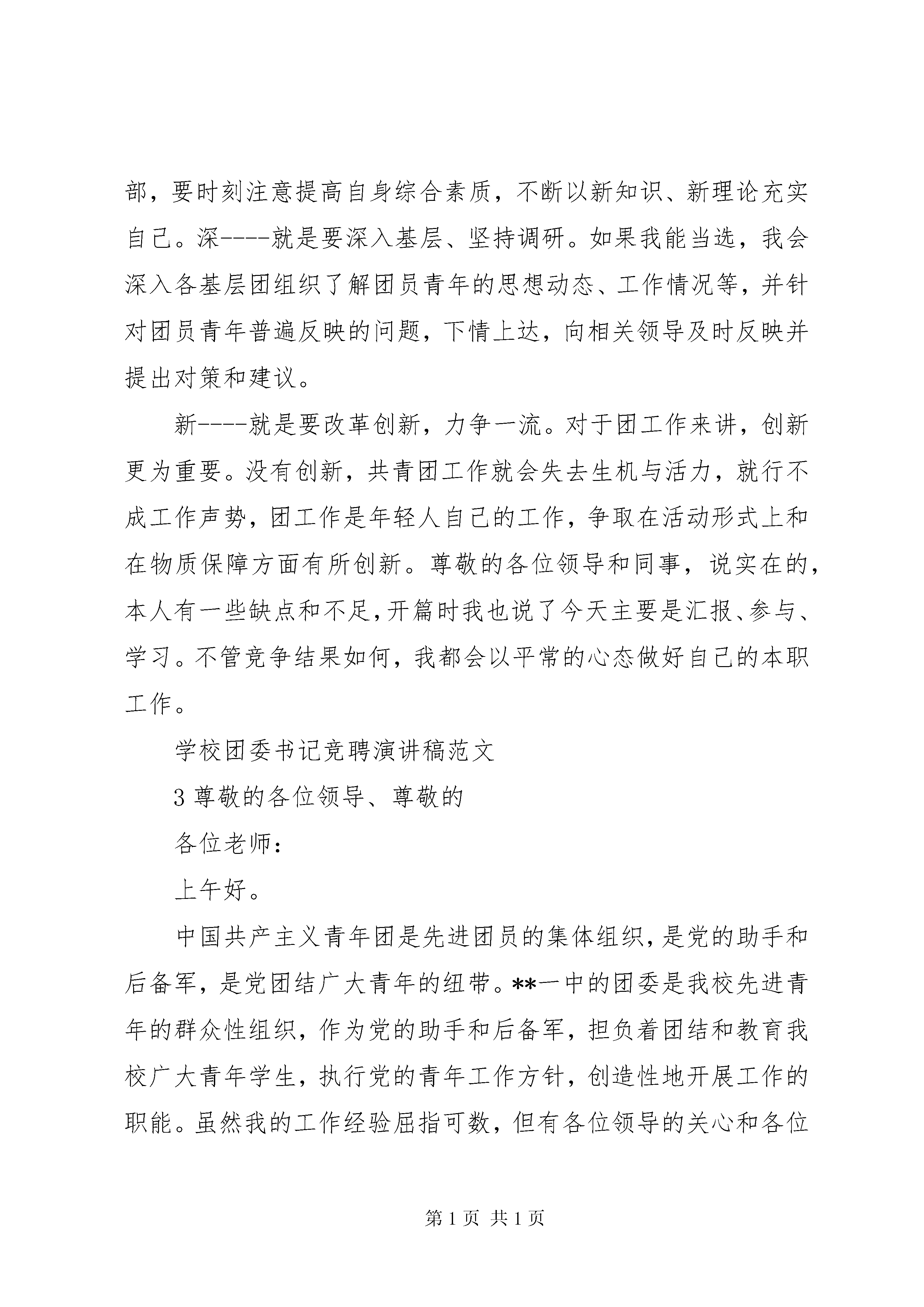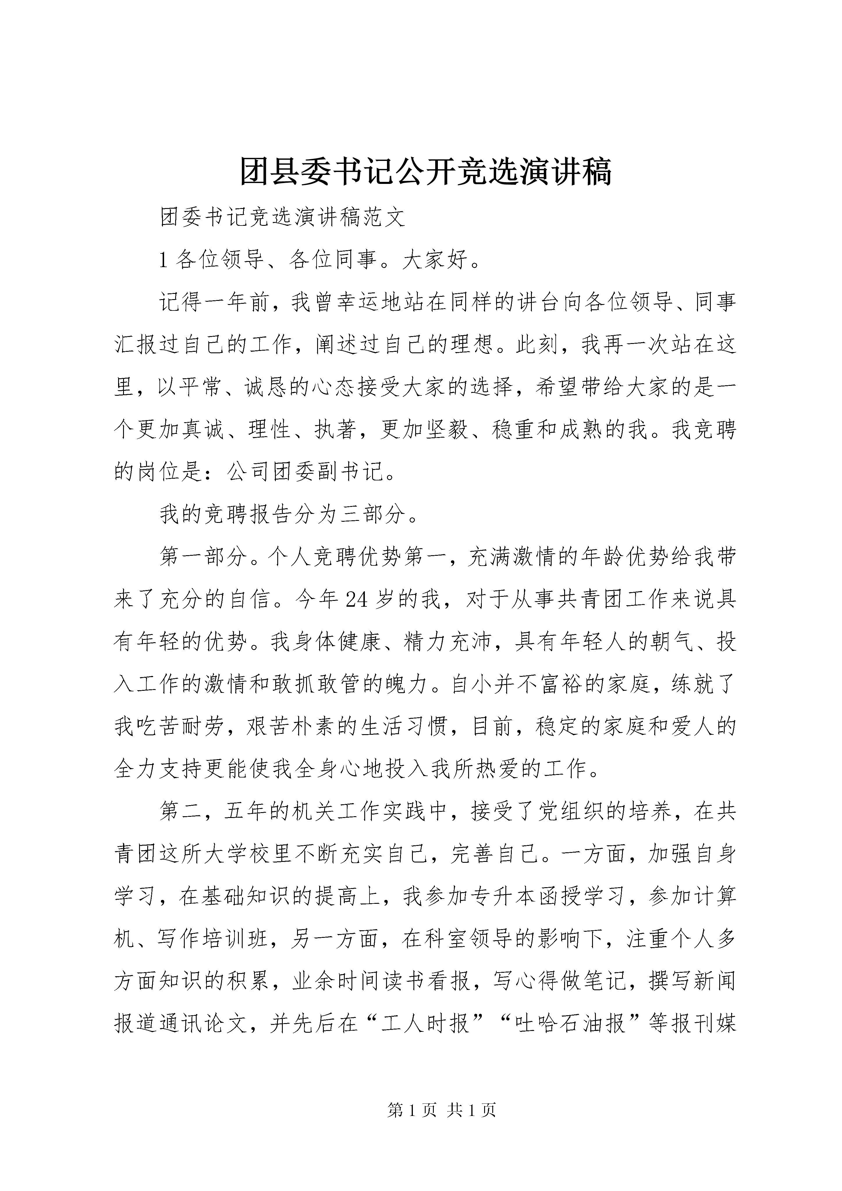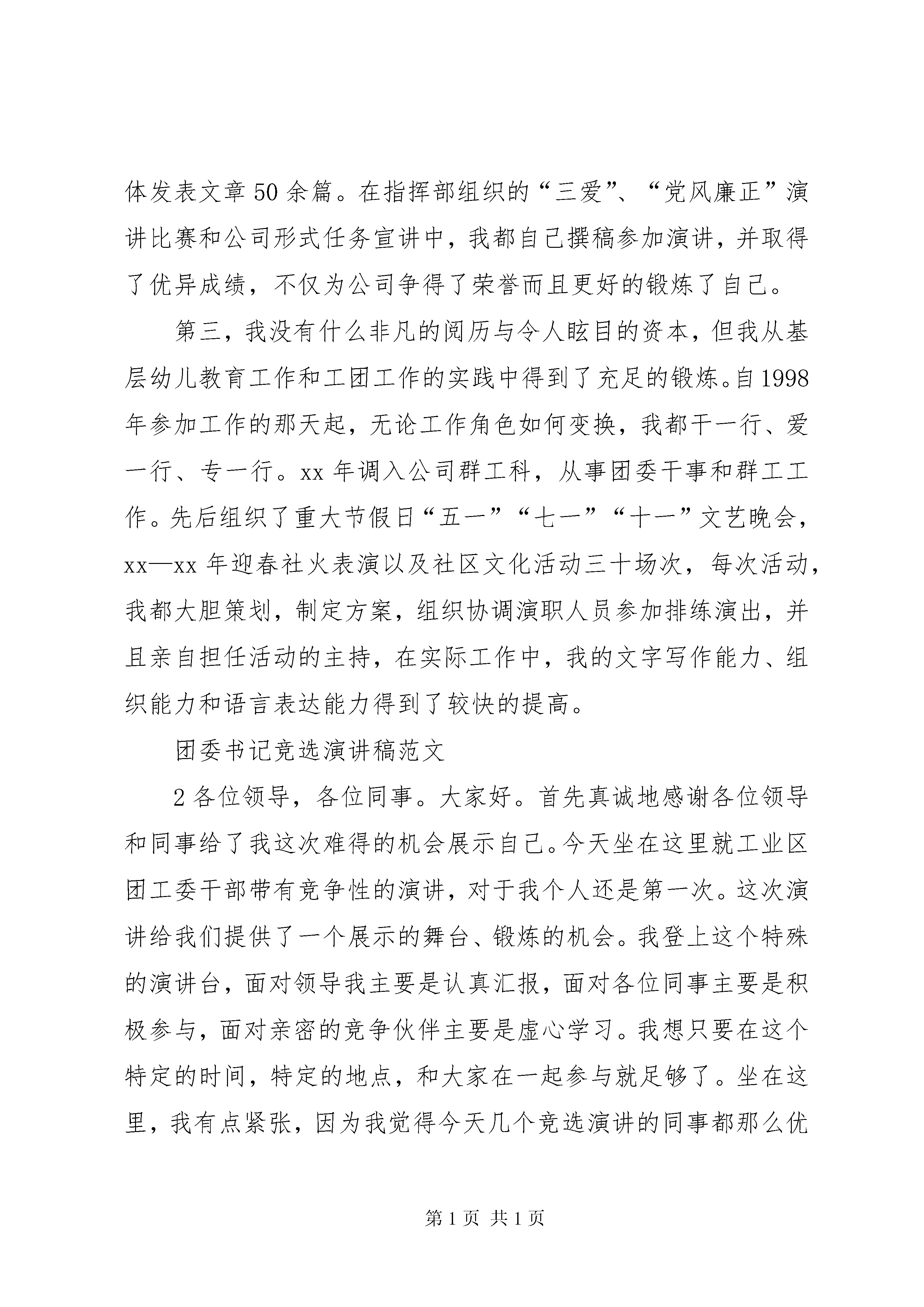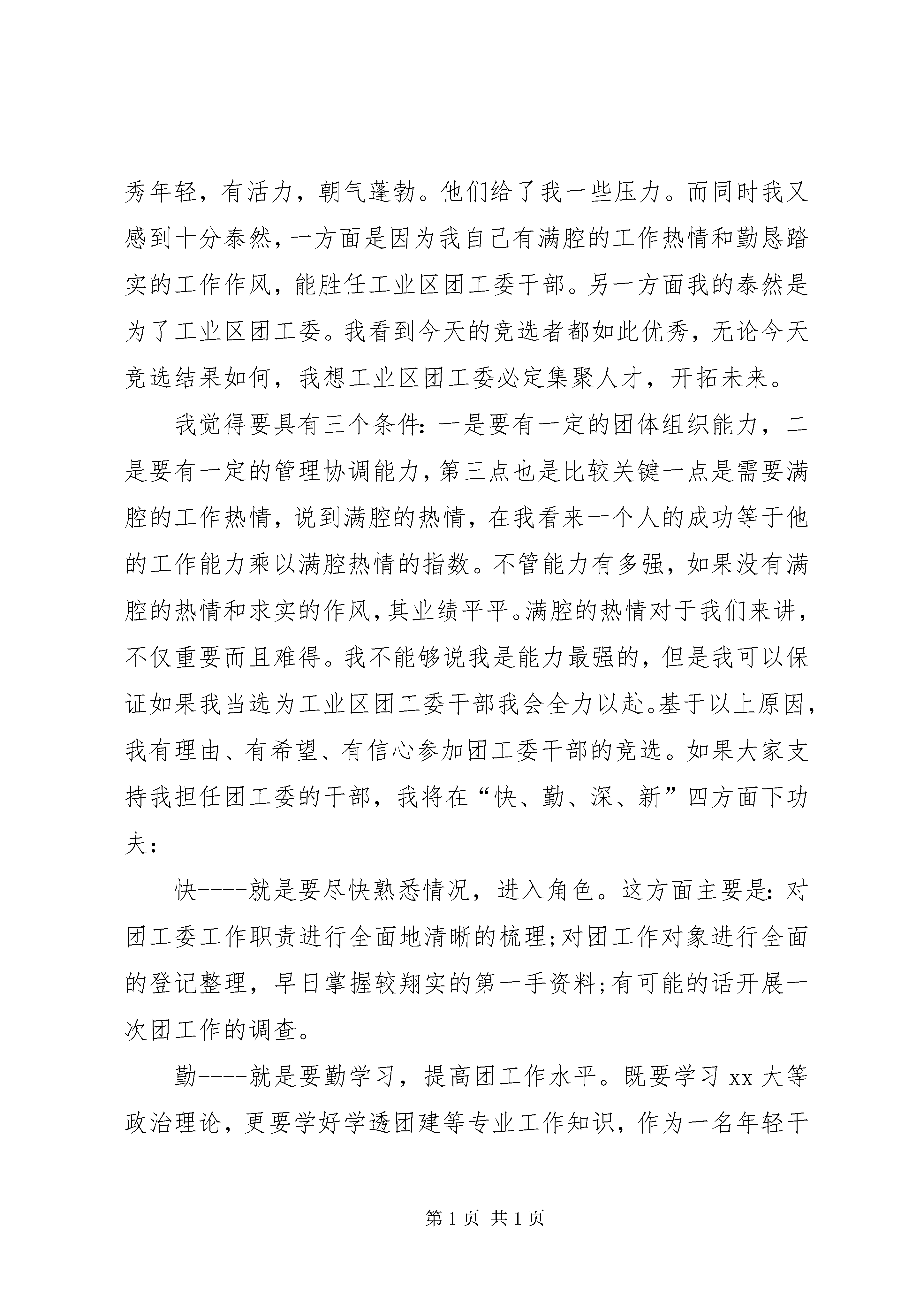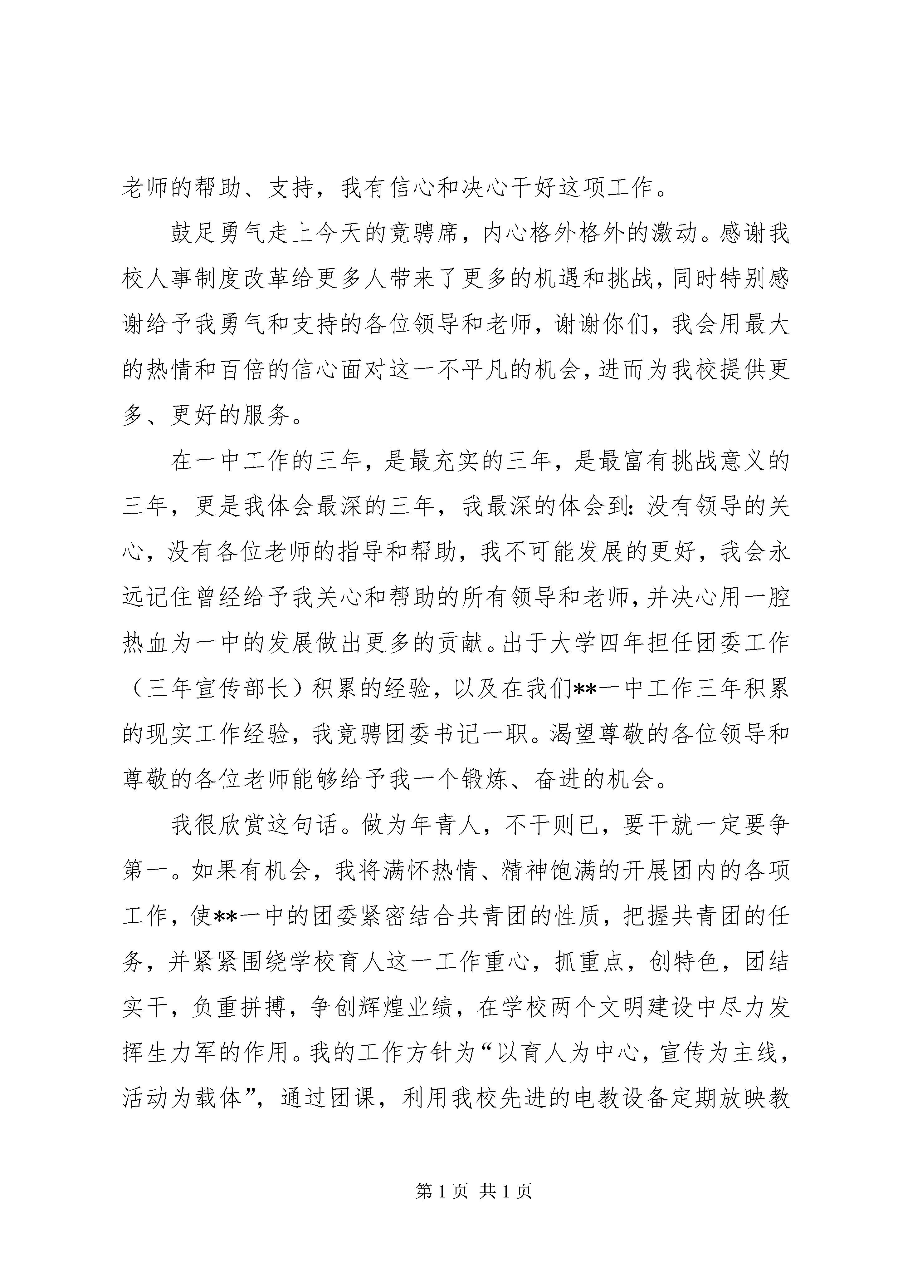 团县委书记公开竞选演讲稿团委书记竞选演讲稿范文1各位领导、各位同事。大家好。记得一年前,我曾幸运地站在同样的讲台向各位领导、同事汇报过自己的工作,阐述过自己的理想。此刻,我再一次站在这里,以平常、诚恳的心态接受大家的选择,希望带给大家的是一个更加真诚、理性、执著,更加坚毅、稳重和成熟的我。我竞聘的岗位是:公司团委副书记。我的竞聘报告分为三部分。第一部分。个人竞聘优势第一,充满激情的年龄优势给我带来了充分的自信。今年24岁的我,对于从事共青团工作来说具有年轻的优势。我身体健康、精力充沛,具有年轻人的朝气、投入工作的激情和敢抓敢管的魄力。自小并不富裕的家庭,练就了我吃苦耐劳,艰苦朴素的生活习惯,目前,稳定的家庭和爱人的全力支持更能使我全身心地投入我所热爱的工作。第二,五年的机关工作实践中,接受了党组织的培养,在共青团这所大学校里不断充实自己,完善自己。一方面,加强自身学习,在基础知识的提高上,我参加专升本函授学习,参加计算机、写作培训班,另一方面,在科室领导的影响下,注重个人多方面知识的积累,业余时间读书看报,写心得做笔记,撰写新闻报道通讯论文,并先后在“工人时报”“吐哈石油报”等报刊媒体发表文章50余篇。在指挥部组织的“三爱”、“党风廉正”演讲比赛和公司形式任务宣讲中,我都自己撰稿参加演讲,并取得了优异成绩,不仅为公司争得了荣誉而且更好的锻炼了自己。第三,我没有什么非凡的阅历与令人眩目的资本,但我从基层幼儿教育工作和工团工作的实践中得到了充足的锻炼。自1998年参加工作的那天起,无论工作角色如何变换,我都干一行、爱一行、专一行。xx年调入公司群工科,从事团委干事和群工工作。先后组织了重大节假日“五一”“七一”“十一”文艺晚会,xx—xx年迎春社火表演以及社区文化活动三十场次,每次活动,我都大胆策划,制定方案,组织协调演职人员参加排练演出,并且亲自担任活动的主持,在实际工作中,我的文字写作能力、组织能力和语言表达能力得到了较快的提高。团委书记竞选演讲稿范文2各位领导,各位同事。大家好。首先真诚地感谢各位领导和同事给了我这次难得的机会展示自己。今天坐在这里就工业区团工委干部带有竞争性的演讲,对于我个人还是第一次。这次演讲给我们提供了一个展示的舞台、锻炼的机会。我登上这个特殊的演讲台,面对领导我主要是认真汇报,面对各位同事主要是积极参与,面对亲密的竞争伙伴主要是虚心学习。我想只要在这个特定的时间,特定的地点,和大家在一起参与就足够了。坐在这里,我有点紧张,因为我觉得今天几个竞选演讲的同事都那么优秀年轻,有活力,朝气蓬勃。他们给了我一些压力。而同时我又感到十分泰然,一方面是因为我自己有满腔的工作热情和勤恳踏实的工作作风,能胜任工业区团工委干部。另一方面我的泰然是为了工业区团工委。我看到今天的竞选者都如此优秀,无论今天竞选结果如何,我想工业区团工委必定集聚人才,开拓未来。我觉得要具有三个条件:一是要有一定的团体组织能力,二是要有一定的管理协调能力,第三点也是比较关键一点是需要满腔的工作热情,说到满腔的热情,在我看来一个人的成功等于他的工作能力乘以满腔热情的指数。不管能力有多强,如果没有满腔的热情和求实的作风,其业绩平平。满腔的热情对于我们来讲,不仅重要而且难得。我不能够说我是能力最强的,但是我可以保证如果我当选为工业区团工委干部我会全力以赴。基于以上原因,我有理由、有希望、有信心参加团工委干部的竞选。如果大家支持我担任团工委的干部,我将在“快、勤、深、新”四方面下功夫:快----就是要尽快熟悉情况,进入角色。这方面主要是:对团工委工作职责进行全面地清晰的梳理;对团工作对象进行全面的登记整理,早日掌握较翔实的第一手资料;有可能的话开展一次团工作的调查。勤----就是要勤学习,提高团工作水平。既要学习xx大等政治理论,更要学好学透团建等专业工作知识,作为一名年轻干部,要时刻注意提高自身综合素质,不断以新知识、新理论充实自己。深----就是要深入基层、坚持调研。如果我能当选,我会深入各基层团组织了解团员青年的思想动态、工作情况等,并针对团员青年普遍反映的问题,下情上达,向相关领导及时反映并提出对策和建议。新----就是要改革创新,力争一流。对于团工作来讲,创新更为重要。没有创新,共青团工作就会失去生机与活力,就行不成工作声势,团工作是年轻人自己的工作,争取在活动形式上和在物质保障方面有所创新。尊敬的各位领导和同事,说实在的,本人有一些缺点和不足,开篇时我也说了今天主要是汇报、参与、学习。不管竞争结果如何,我都会以平常的心态做好自己的本职工作。学校团委书记竞聘演讲稿范文3尊敬的各位领导、尊敬的各位老师:上午好。中国共产主义青年团是先进团员的集体组织,是党的助手和后备军,是党团结广大青年的纽带。**一中的团委是我校先进青年
