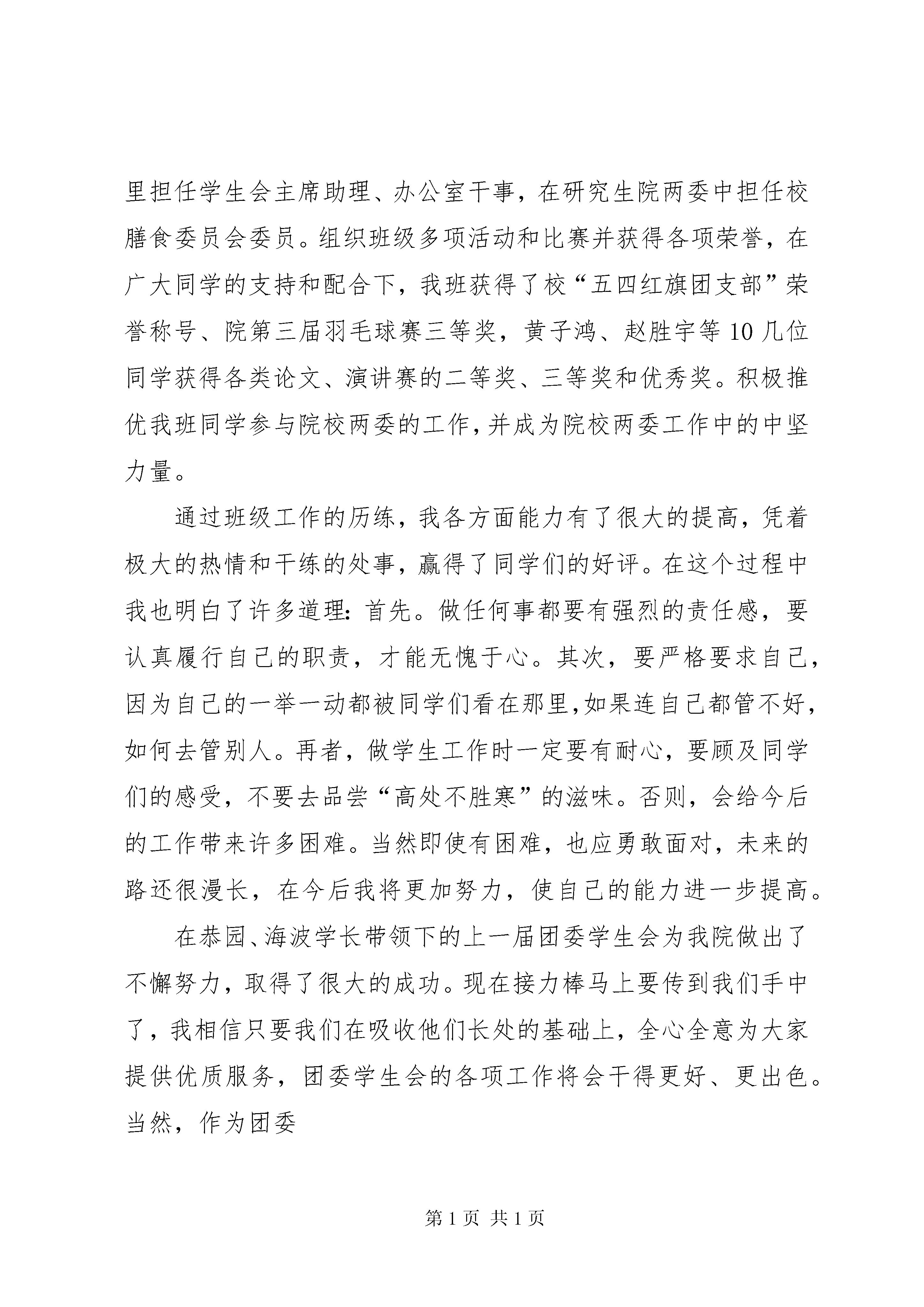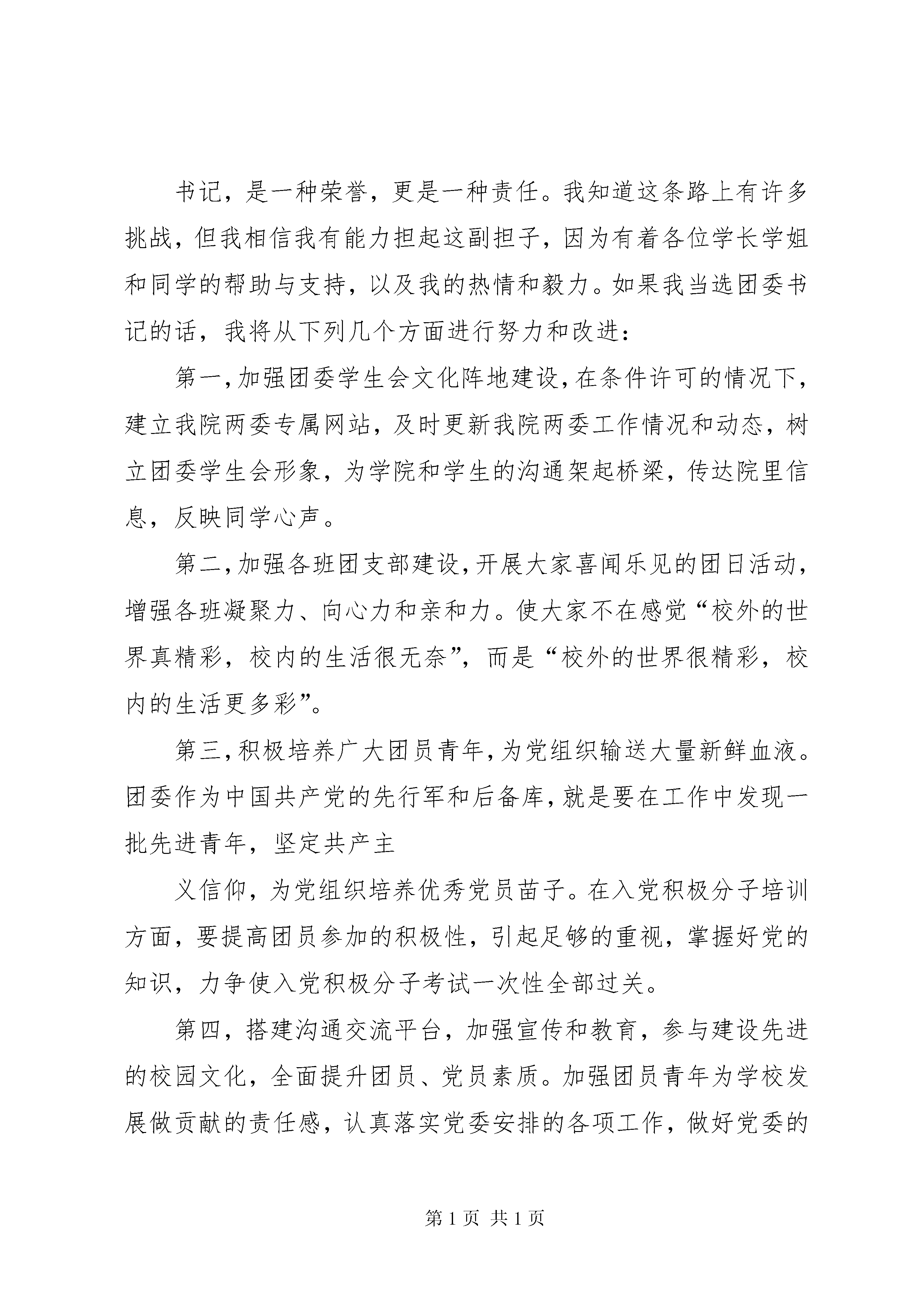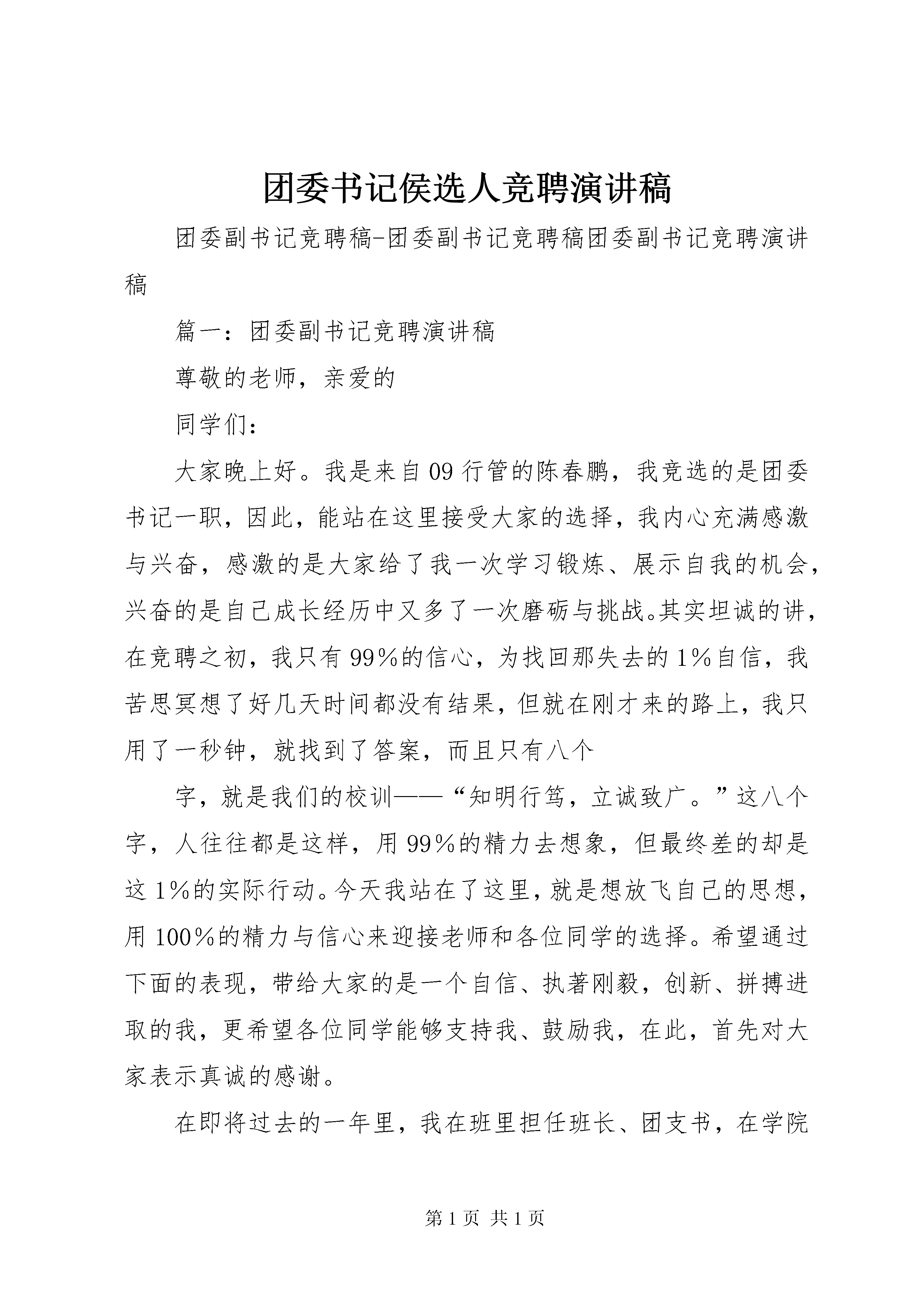 团委书记侯选人竞聘演讲稿团委副书记竞聘稿-团委副书记竞聘稿团委副书记竞聘演讲稿篇一:团委副书记竞聘演讲稿尊敬的老师,亲爱的同学们:大家晚上好。我是来自09行管的陈春鹏,我竞选的是团委书记一职,因此,能站在这里接受大家的选择,我内心充满感激与兴奋,感激的是大家给了我一次学习锻炼、展示自我的机会,兴奋的是自己成长经历中又多了一次磨砺与挑战。其实坦诚的讲,在竞聘之初,我只有99%的信心,为找回那失去的1%自信,我苦思冥想了好几天时间都没有结果,但就在刚才来的路上,我只用了一秒钟,就找到了答案,而且只有八个字,就是我们的校训——“知明行笃,立诚致广。”这八个字,人往往都是这样,用99%的精力去想象,但最终差的却是这1%的实际行动。今天我站在了这里,就是想放飞自己的思想,用100%的精力与信心来迎接老师和各位同学的选择。希望通过下面的表现,带给大家的是一个自信、执著刚毅,创新、拼搏进取的我,更希望各位同学能够支持我、鼓励我,在此,首先对大家表示真诚的感谢。在即将过去的一年里,我在班里担任班长、团支书,在学院里担任学生会主席助理、办公室干事,在研究生院两委中担任校膳食委员会委员。组织班级多项活动和比赛并获得各项荣誉,在广大同学的支持和配合下,我班获得了校“五四红旗团支部”荣誉称号、院第三届羽毛球赛三等奖,黄子鸿、赵胜宇等10几位同学获得各类论文、演讲赛的二等奖、三等奖和优秀奖。积极推优我班同学参与院校两委的工作,并成为院校两委工作中的中坚力量。通过班级工作的历练,我各方面能力有了很大的提高,凭着极大的热情和干练的处事,赢得了同学们的好评。在这个过程中我也明白了许多道理:首先。做任何事都要有强烈的责任感,要认真履行自己的职责,才能无愧于心。其次,要严格要求自己,因为自己的一举一动都被同学们看在那里,如果连自己都管不好,如何去管别人。再者,做学生工作时一定要有耐心,要顾及同学们的感受,不要去品尝“高处不胜寒”的滋味。否则,会给今后的工作带来许多困难。当然即使有困难,也应勇敢面对,未来的路还很漫长,在今后我将更加努力,使自己的能力进一步提高。在恭园、海波学长带领下的上一届团委学生会为我院做出了不懈努力,取得了很大的成功。现在接力棒马上要传到我们手中了,我相信只要我们在吸收他们长处的基础上,全心全意为大家提供优质服务,团委学生会的各项工作将会干得更好、更出色。当然,作为团委书记,是一种荣誉,更是一种责任。我知道这条路上有许多挑战,但我相信我有能力担起这副担子,因为有着各位学长学姐和同学的帮助与支持,以及我的热情和毅力。如果我当选团委书记的话,我将从下列几个方面进行努力和改进:第一,加强团委学生会文化阵地建设,在条件许可的情况下,建立我院两委专属网站,及时更新我院两委工作情况和动态,树立团委学生会形象,为学院和学生的沟通架起桥梁,传达院里信息,反映同学心声。第二,加强各班团支部建设,开展大家喜闻乐见的团日活动,增强各班凝聚力、向心力和亲和力。使大家不在感觉“校外的世界真精彩,校内的生活很无奈”,而是“校外的世界很精彩,校内的生活更多彩”。第三,积极培养广大团员青年,为党组织输送大量新鲜血液。团委作为中国共产党的先行军和后备库,就是要在工作中发现一批先进青年,坚定共产主义信仰,为党组织培养优秀党员苗子。在入党积极分子培训方面,要提高团员参加的积极性,引起足够的重视,掌握好党的知识,力争使入党积极分子考试一次性全部过关。第四,搭建沟通交流平台,加强宣传和教育,参与建设先进的校园文化,全面提升团员、党员素质。加强团员青年为学校发展做贡献的责任感,认真落实党委安排的各项工作,做好党委的助手。以上是我竞选的工作设想,希望大家指正。当然,在各位同学面前,我还是一个才疏学浅的新兵,可是拿破仑的那句“不想当将军的士兵不是好士兵”在激励着我斗胆一试。