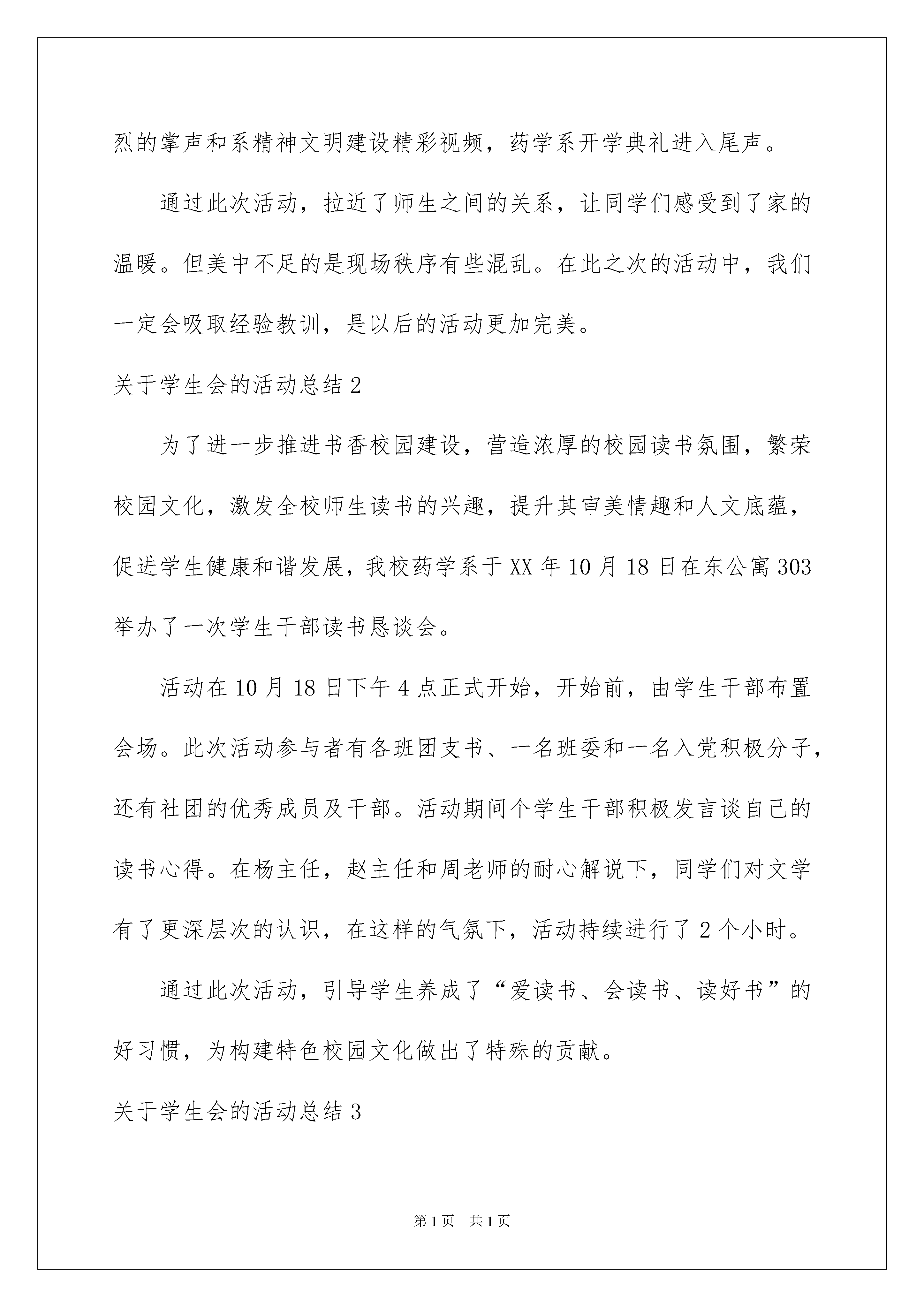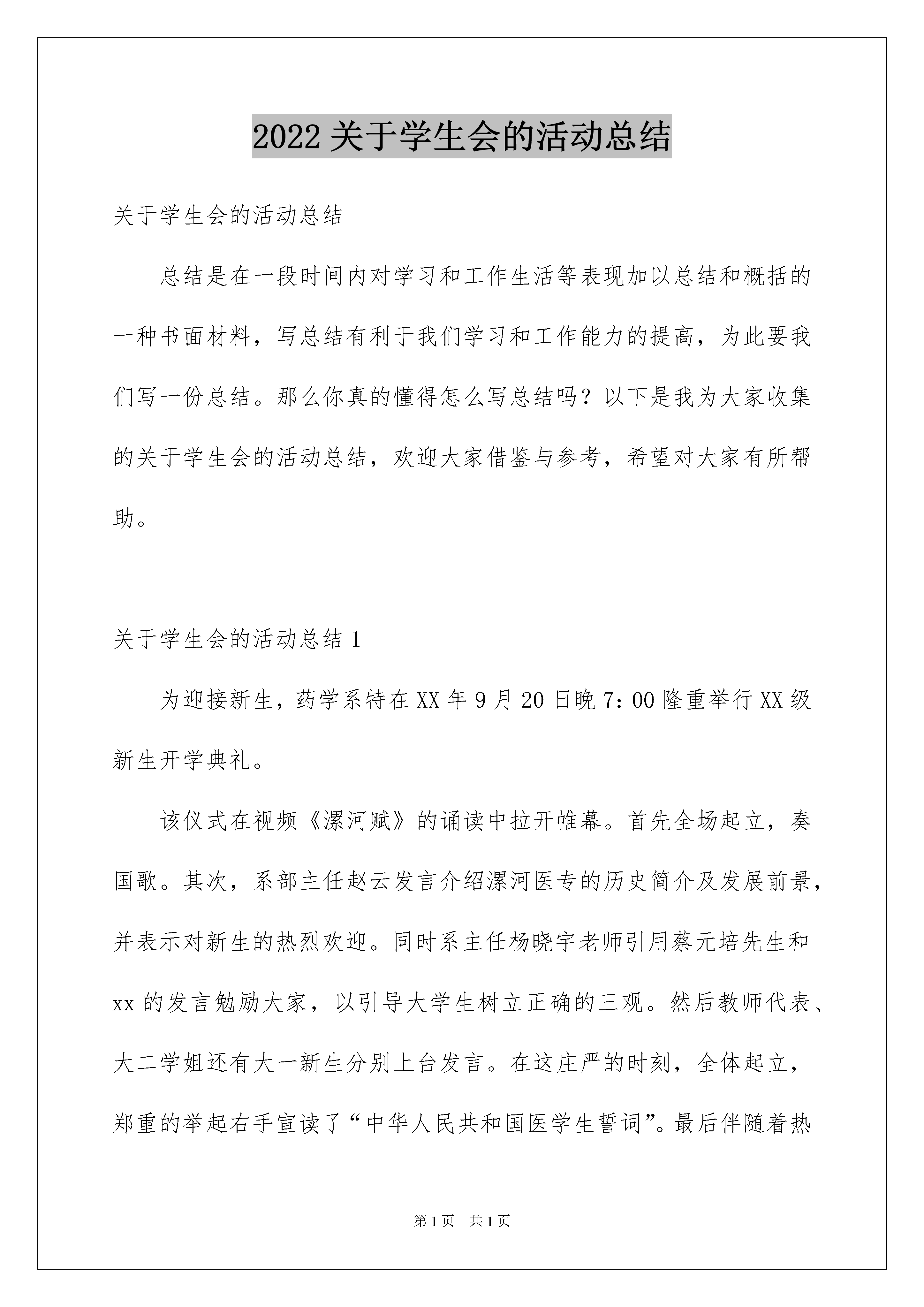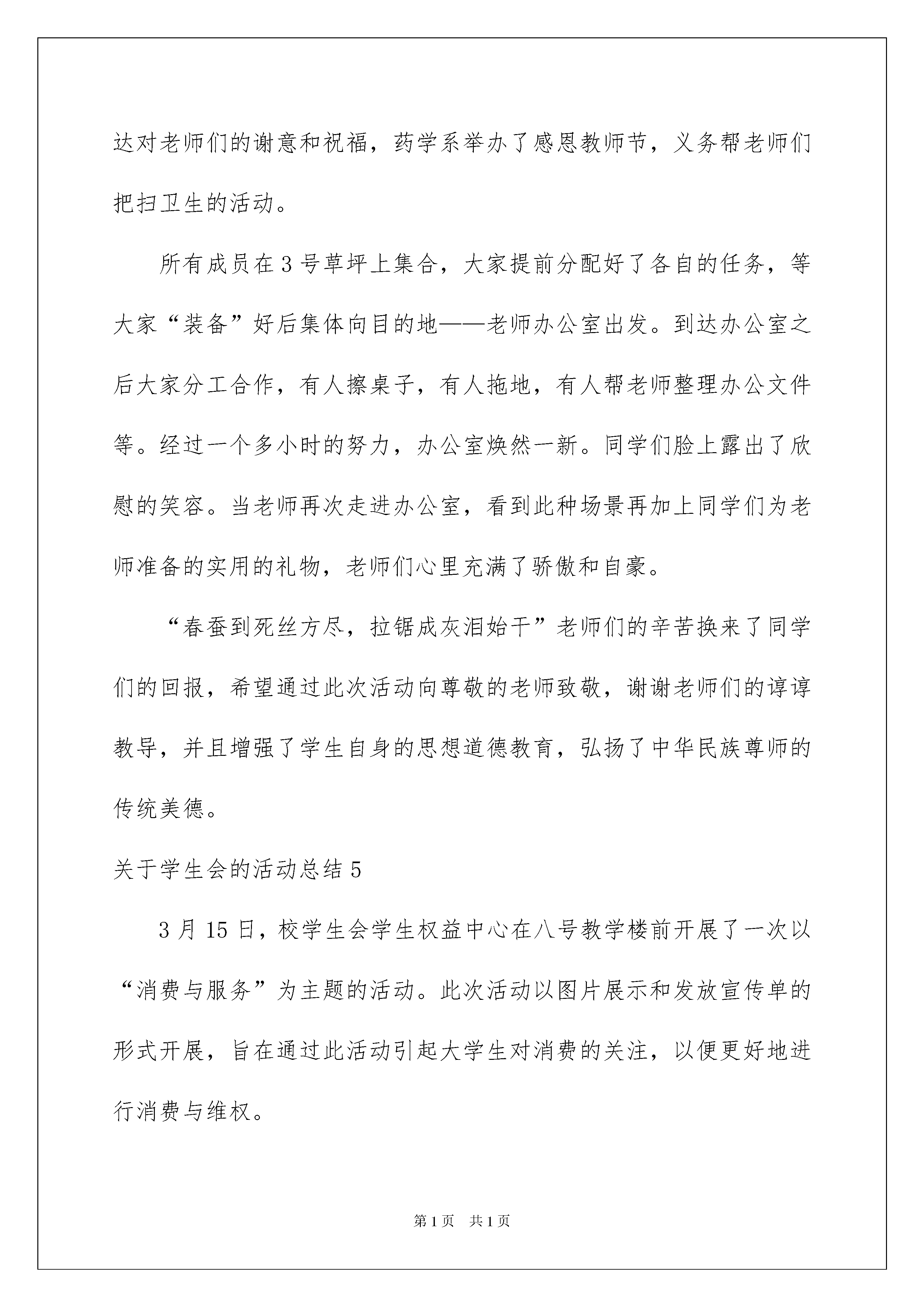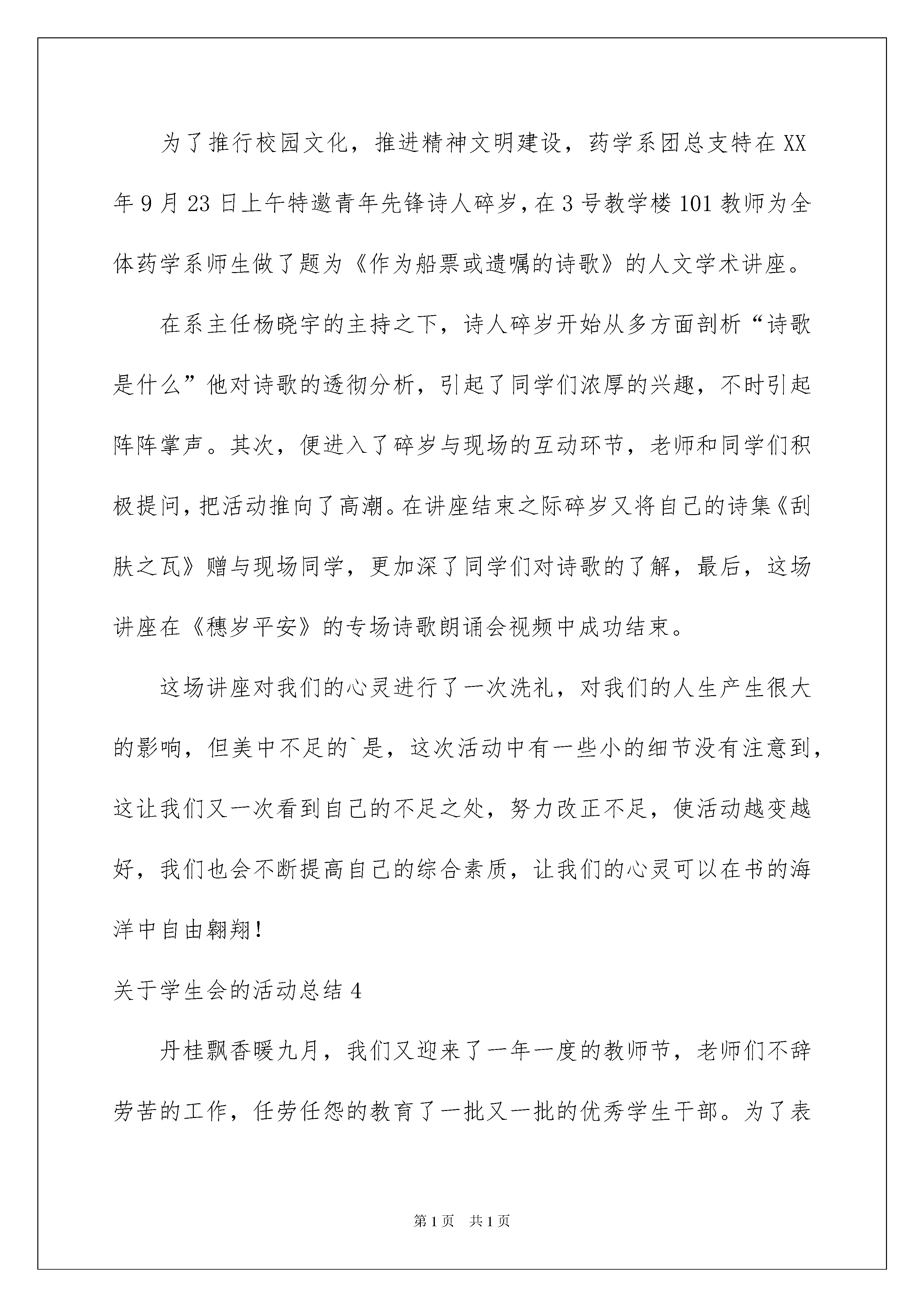 2022关于学生会的活动总结关于学生会的活动总结总结是在一段时间内对学习和工作生活等表现加以总结和概括的一种书面材料,写总结有利于我们学习和工作能力的提高,为此要我们写一份总结。那么你真的懂得怎么写总结吗?以下是我为大家收集的关于学生会的活动总结,欢迎大家借鉴与参考,希望对大家有所帮助。关于学生会的活动总结1为迎接新生,药学系特在XX年9月20日晚7:00隆重举行XX级新生开学典礼。该仪式在视频《漯河赋》的诵读中拉开帷幕。首先全场起立,奏国歌。其次,系部主任赵云发言介绍漯河医专的历史简介及发展前景,并表示对新生的热烈欢迎。同时系主任杨晓宇老师引用蔡元培先生和xx的发言勉励大家,以引导大学生树立正确的三观。然后教师代表、大二学姐还有大一新生分别上台发言。在这庄严的时刻,全体起立,郑重的举起右手宣读了“中华人民共和国医学生誓词”。最后伴随着热烈的掌声和系精神文明建设精彩视频,药学系开学典礼进入尾声。通过此次活动,拉近了师生之间的关系,让同学们感受到了家的温暖。但美中不足的是现场秩序有些混乱。在此之次的活动中,我们一定会吸取经验教训,是以后的活动更加完美。关于学生会的活动总结2为了进一步推进书香校园建设,营造浓厚的校园读书氛围,繁荣校园文化,激发全校师生读书的兴趣,提升其审美情趣和人文底蕴,促进学生健康和谐发展,我校药学系于XX年10月18日在东公寓303举办了一次学生干部读书恳谈会。活动在10月18日下午4点正式开始,开始前,由学生干部布置会场。此次活动参与者有各班团支书、一名班委和一名入党积极分子,还有社团的优秀成员及干部。活动期间个学生干部积极发言谈自己的读书心得。在杨主任,赵主任和周老师的耐心解说下,同学们对文学有了更深层次的认识,在这样的气氛下,活动持续进行了2个小时。通过此次活动,引导学生养成了“爱读书、会读书、读好书”的好习惯,为构建特色校园文化做出了特殊的贡献。关于学生会的活动总结3为了推行校园文化,推进精神文明建设,药学系团总支特在XX年9月23日上午特邀青年先锋诗人碎岁,在3号教学楼101教师为全体药学系师生做了题为《作为船票或遗嘱的诗歌》的人文学术讲座。在系主任杨晓宇的主持之下,诗人碎岁开始从多方面剖析“诗歌是什么”他对诗歌的透彻分析,引起了同学们浓厚的兴趣,不时引起阵阵掌声。其次,便进入了碎岁与现场的互动环节,老师和同学们积极提问,把活动推向了高潮。在讲座结束之际碎岁又将自己的诗集《刮肤之瓦》赠与现场同学,更加深了同学们对诗歌的了解,最后,这场讲座在《穗岁平安》的专场诗歌朗诵会视频中成功结束。这场讲座对我们的心灵进行了一次洗礼,对我们的人生产生很大的影响,但美中不足的`是,这次活动中有一些小的细节没有注意到,这让我们又一次看到自己的不足之处,努力改正不足,使活动越变越好,我们也会不断提高自己的综合素质,让我们的心灵可以在书的海洋中自由翱翔!关于学生会的活动总结4丹桂飘香暖九月,我们又迎来了一年一度的教师节,老师们不辞劳苦的工作,任劳任怨的教育了一批又一批的优秀学生干部。为了表达对老师们的谢意和祝福,药学系举办了感恩教师节,义务帮老师们把扫卫生的活动。所有成员在3号草坪上集合,大家提前分配好了各自的任务,等大家“装备”好后集体向目的地——老师办公室出发。到达办公室之后大家分工合作,有人擦桌子,有人拖地,有人帮老师整理办公文件等。经过一个多小时的努力,办公室焕然一新。同学们脸上露出了欣慰的笑容。当老师再次走进办公室,看到此种场景再加上同学们为老师准备的实用的礼物,老师们心里充满了骄傲和自豪。“春蚕到死丝方尽,拉锯成灰泪始干”老师们的辛苦换来了同学们的回报,希望通过此次活动向尊敬的老师致敬,谢谢老师们的谆谆教导,并且增强了学生自身的思想道德教育,弘扬了中华民族尊师的传统美德。关于学生会的活动总结53月15日,校学生会学生权益中心在八号教学楼前开展了一次以“消费与服务”为主题的活动。此次活动以图片展示和发放宣传单的形式开展,旨在通过此活动引起大学生对消费的关注,以便更好地进行消费与维权。消费无时无刻不影响着我们的生活,与此同时,也随之产生了维权现象。由于目前我国的相关法律体系还不太健全,大学生的法律意识相对薄弱,难以真正运用法律手段来维护自身的权益。此次开展以“消费与服务”为主题的活动,能让大学生更好地了解消费与服务,同时对于提高大学生安全消费、乐于服务的意识有指导作用。在此次活动中,展示了近百张与消费有关的图片,这些图片涉及到人们生活的方方面面,关系到各个阶层的利益,同学们通过观看这些图片可以联想到自己的经历,从而在以后的消费中更好地维护自己的利益,同时通过发
