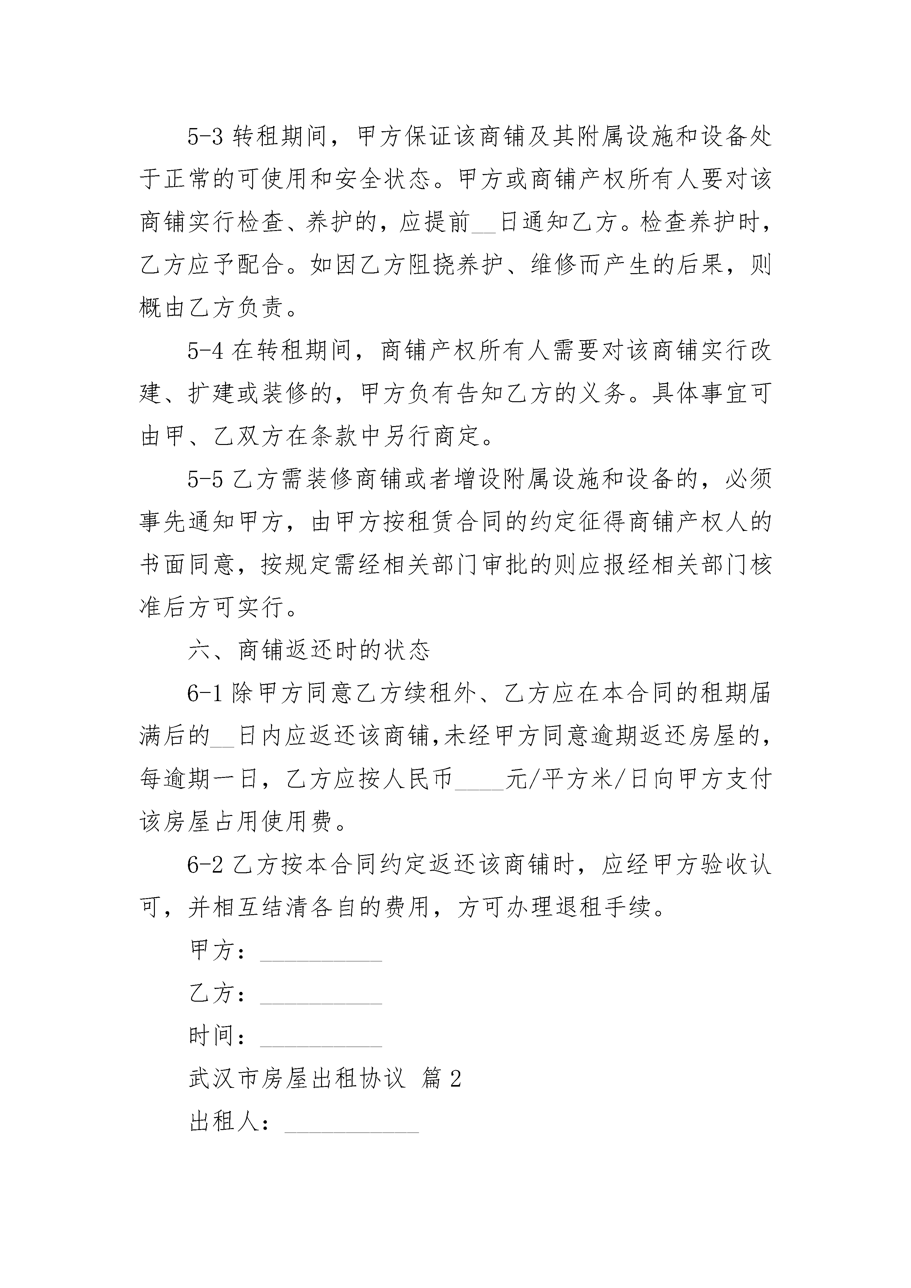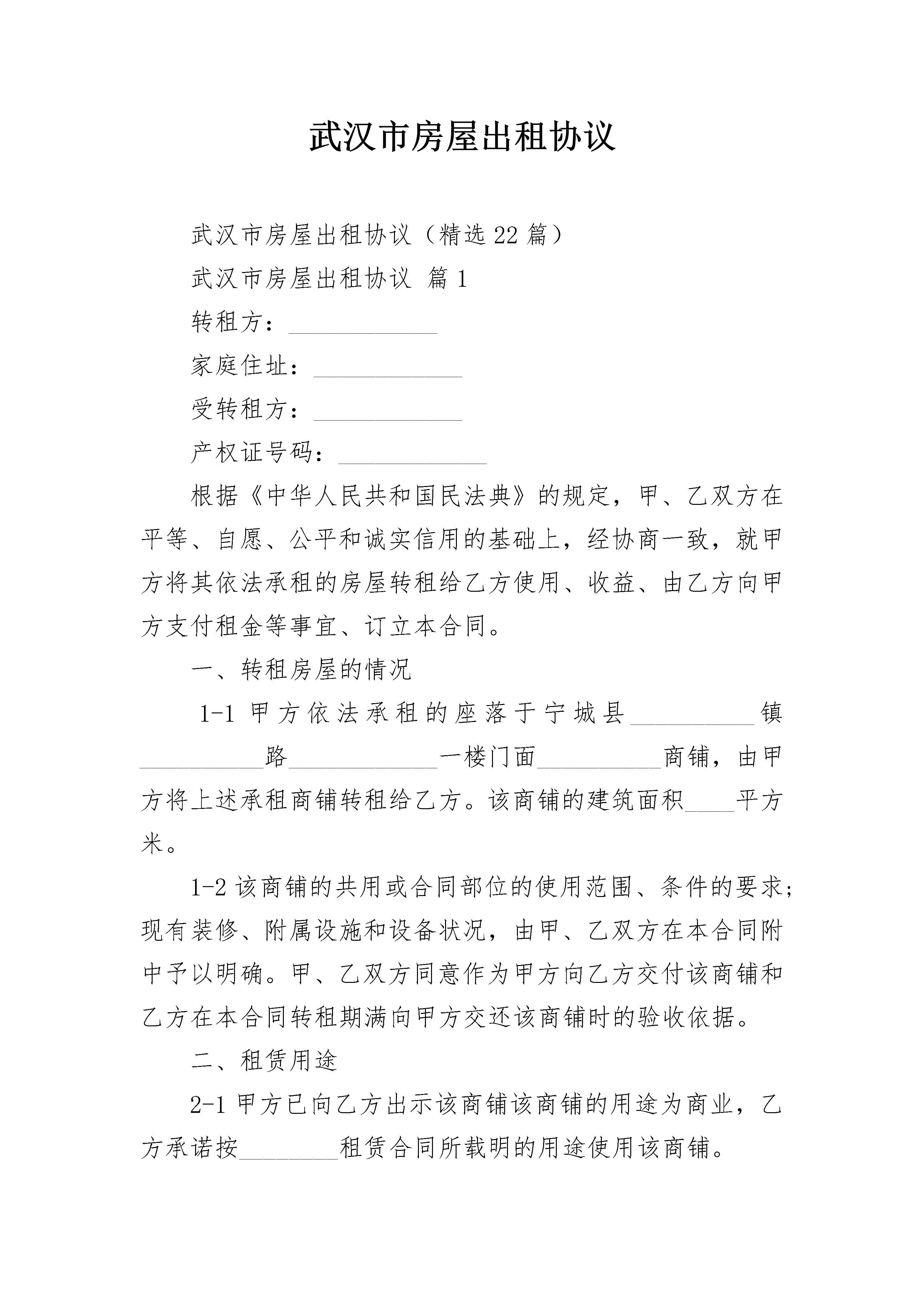 武汉市房屋出租协议武汉市房屋出租协议(精选22篇)武汉市房屋出租协议篇1转租方:____________家庭住址:____________受转租方:____________产权证号码:____________根据《中华人民共和国民法典》的规定,甲、乙双方在平等、自愿、公平和诚实信用的基础上,经协商一致,就甲方将其依法承租的房屋转租给乙方使用、收益、由乙方向甲方支付租金等事宜、订立本合同。一、转租房屋的情况1-1甲方依法承租的座落于宁城县__________镇__________路____________一楼门面__________商铺,由甲方将上述承租商铺转租给乙方。该商铺的建筑面积____平方米。1-2该商铺的共用或合同部位的使用范围、条件的要求;现有装修、附属设施和设备状况,由甲、乙双方在本合同附中予以明确。甲、乙双方同意作为甲方向乙方交付该商铺和乙方在本合同转租期满向甲方交还该商铺时的验收依据。二、租赁用途2-1甲方已向乙方出示该商铺该商铺的用途为商业,乙方承诺按________租赁合同所载明的用途使用该商铺。2-2乙方保证,在转租期间未事先通知甲方,并由甲方按租赁合同的约定取得产权所有人的书面同意以及按规定报经相关部门核准前,不擅自改变该商铺使用用途。三、转租期限及交付日期3-1甲、乙双方约定,甲方于__年__月__日前向乙方交付该商铺。转租期为__个月。自__年__月__日起至__年__月__日止。甲方保证该转租期限未超出租赁合同的租期。3-2转租期满,甲方有权收回该商铺,乙方应如期返还。在租赁合同约定的期限内,乙方需继续承租该商铺的,则应于转租期届满前一个月向甲方提出续租书面要求,经甲方同意后重新签订转租合同。本合同截止期限应与甲方与产权所有人签订的《租赁合同》一致。四、租金、支付方式和期限4-1甲、乙双方约定,该商铺转租费为人民币______元,承担。五、商铺使用要求和维修责任5-1在转租期间,乙方发现该商铺及其附属设施有损坏或故障时,应用时通知甲方;由甲方按租赁合同的约定,在接到乙方通知后的___日内实行维修。逾期不维修的,乙方可代为维修费用由甲方负责承担。5-2乙方应合理使用并爱护商铺及其附属设施。因乙方使用不当或不合理使用,致使该商铺及其附属设施损坏或发生故障的,乙方应负责修复。乙方拒不维修,甲方或出租人可代为维修,费用由乙方承担。5-3转租期间,甲方保证该商铺及其附属设施和设备处于正常的可使用和安全状态。甲方或商铺产权所有人要对该商铺实行检查、养护的,应提前__日通知乙方。检查养护时,乙方应予配合。如因乙方阻挠养护、维修而产生的后果,则概由乙方负责。5-4在转租期间,商铺产权所有人需要对该商铺实行改建、扩建或装修的,甲方负有告知乙方的义务。具体事宜可由甲、乙双方在条款中另行商定。5-5乙方需装修商铺或者增设附属设施和设备的,必须事先通知甲方,由甲方按租赁合同的约定征得商铺产权人的书面同意,按规定需经相关部门审批的则应报经相关部门核准后方可实行。六、商铺返还时的状态6-1除甲方同意乙方续租外、乙方应在本合同的租期届满后的__日内应返还该商铺,未经甲方同意逾期返还房屋的,每逾期一日,乙方应按人民币____元/平方米/日向甲方支付该房屋占用使用费。6-2乙方按本合同约定返还该商铺时,应经甲方验收认可,并相互结清各自的费用,方可办理退租手续。甲方:__________乙方:__________时间:__________武汉市房屋出租协议篇2出租人:___________承租人:___________根据《中华人民共和国民法典》及有关规定,为了明确出租人与承租人的权力义务关系,在平等、自愿的基础上,经双方协商一致达成如下协议:一、出租人愿意将座落在_________________________的房屋出租给承租人使用,承租人对此房屋现状已作充分了解,自愿租用。二、承租人保证此房屋仅用于仓库。如需另作它用,须征求出租人书面同意。三、房屋租赁期_____年,自_______年___月_____日起,至______年______月______日止。四、租金、履约保证金及支付方式约定:1、房屋租金每月人民币___________元。在签订本合同的同时,承租人需交纳履约保证金人民币________元,用于租赁房屋房租、小区物业管理费、垃圾费等的履约保证,如房屋租赁期间履约被扣收,承租人应在______日内补足履约保证金。2、承租人分两次交纳房屋租金。以半年为期预交房屋租金,即签订合同时交付前半年租金,前半年租期结束之前再提前交纳后半年租金。承租人可将租金打到出租人提供的相应银行账户上或以现金方式支付给出租人,出租人出具收据,承租人以此作为已支付当期房屋租金的凭据。3、承租人违约逾期不交租金,出租人有权收回租赁房屋,并没